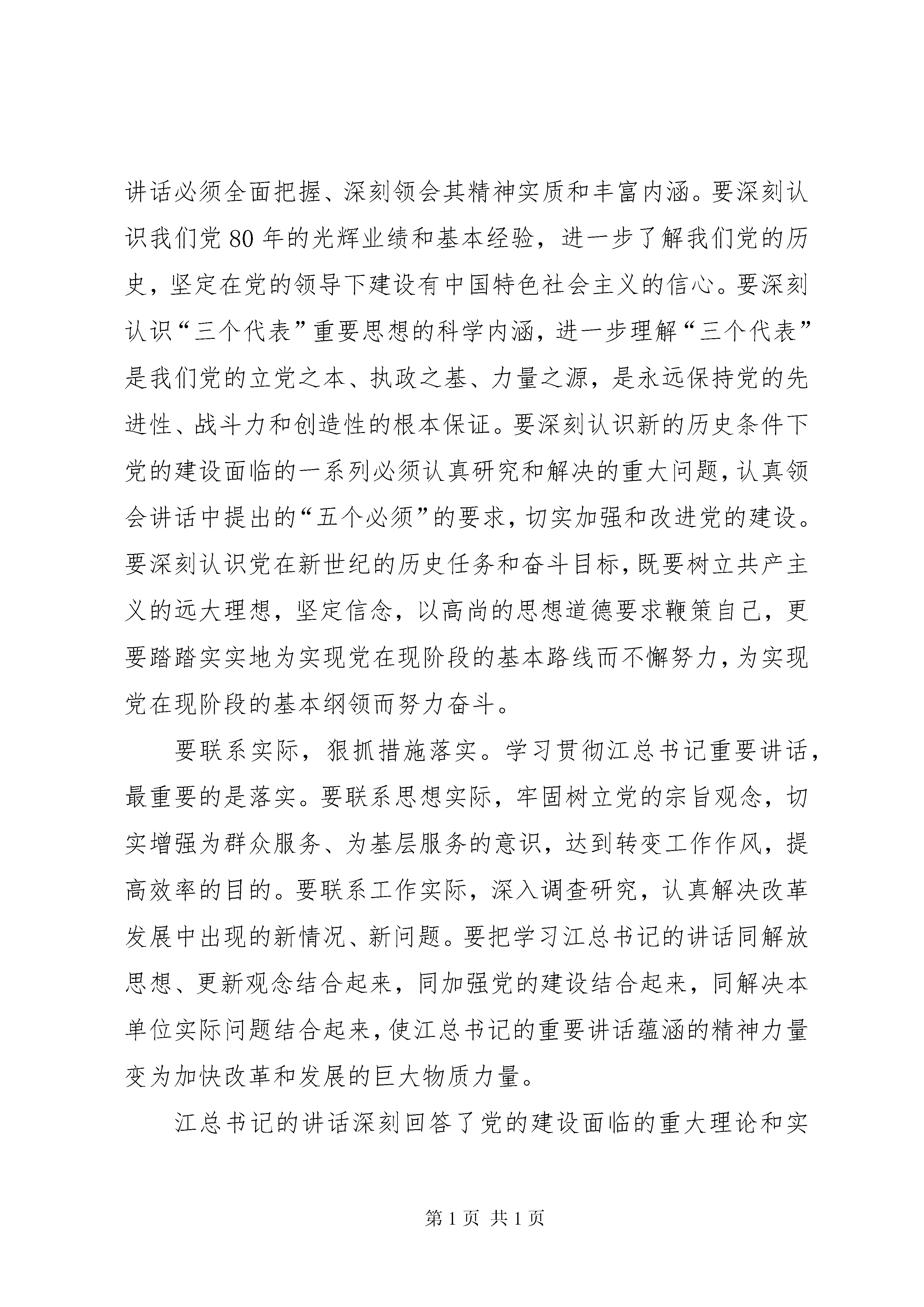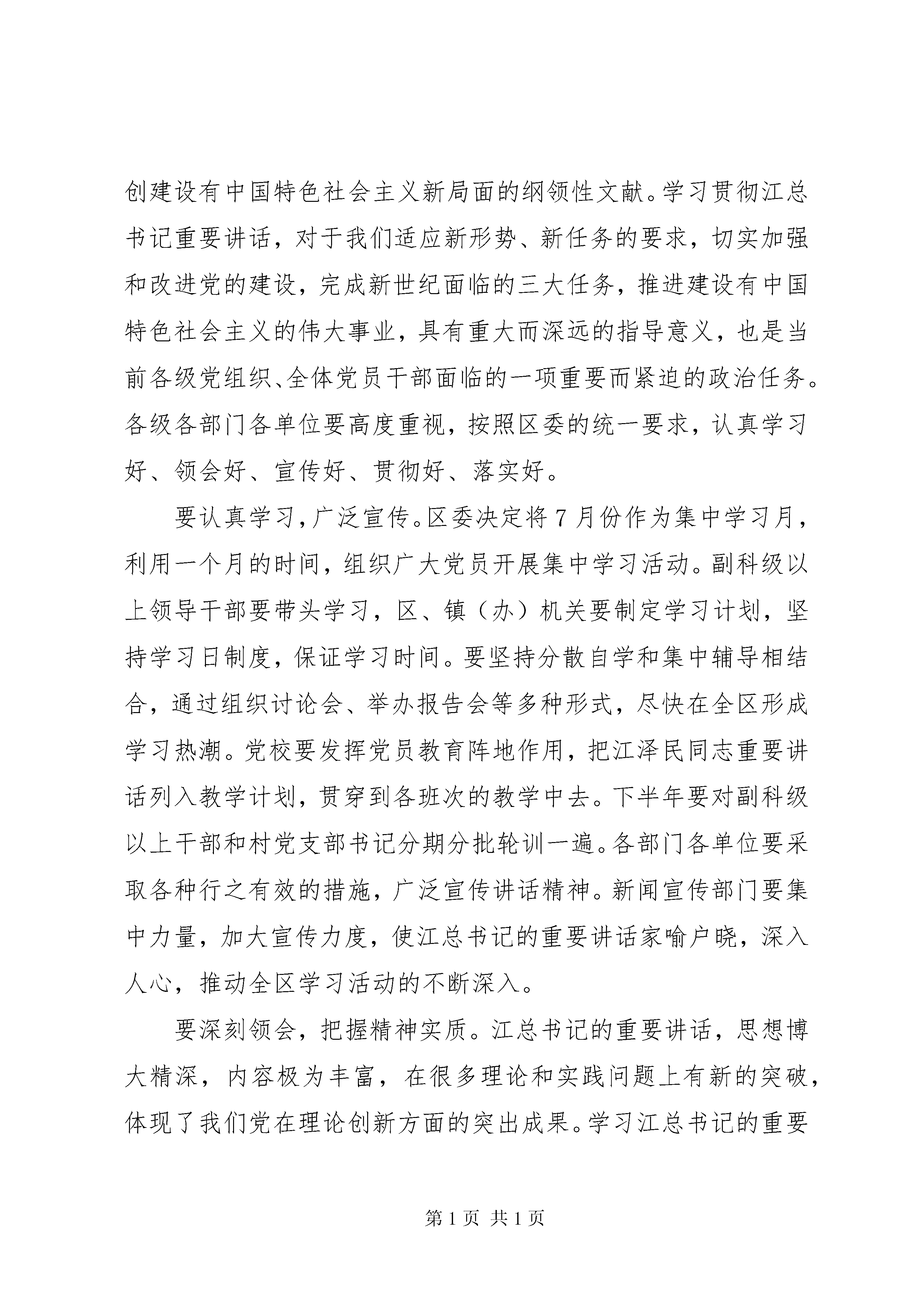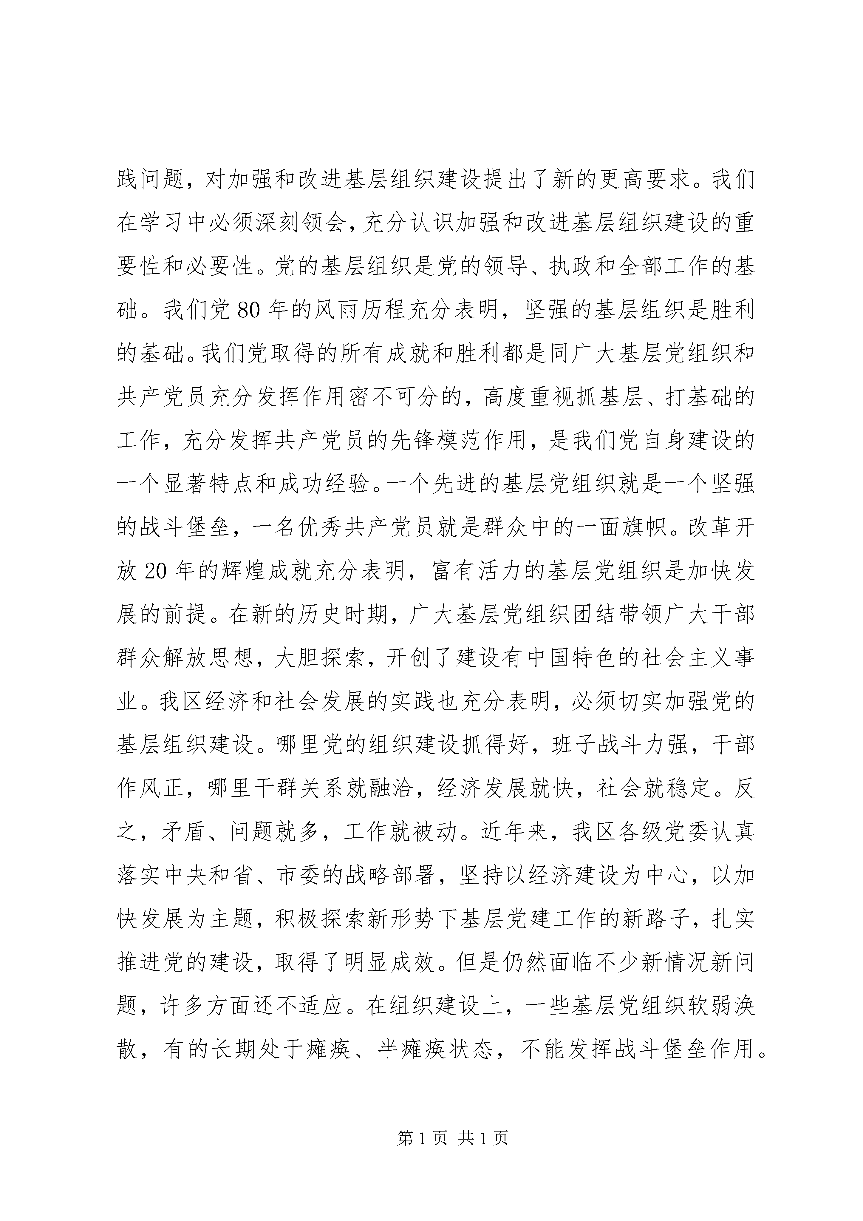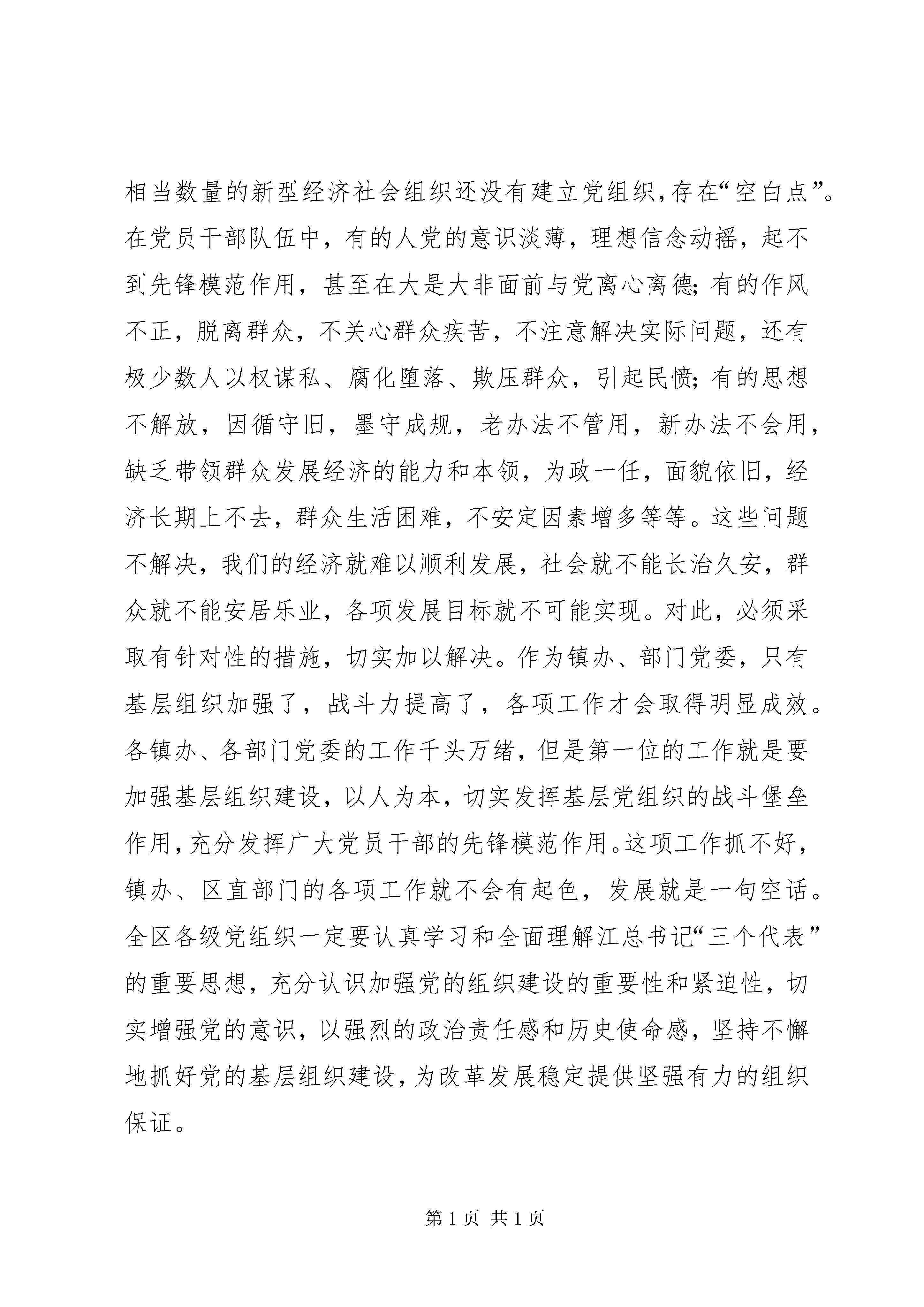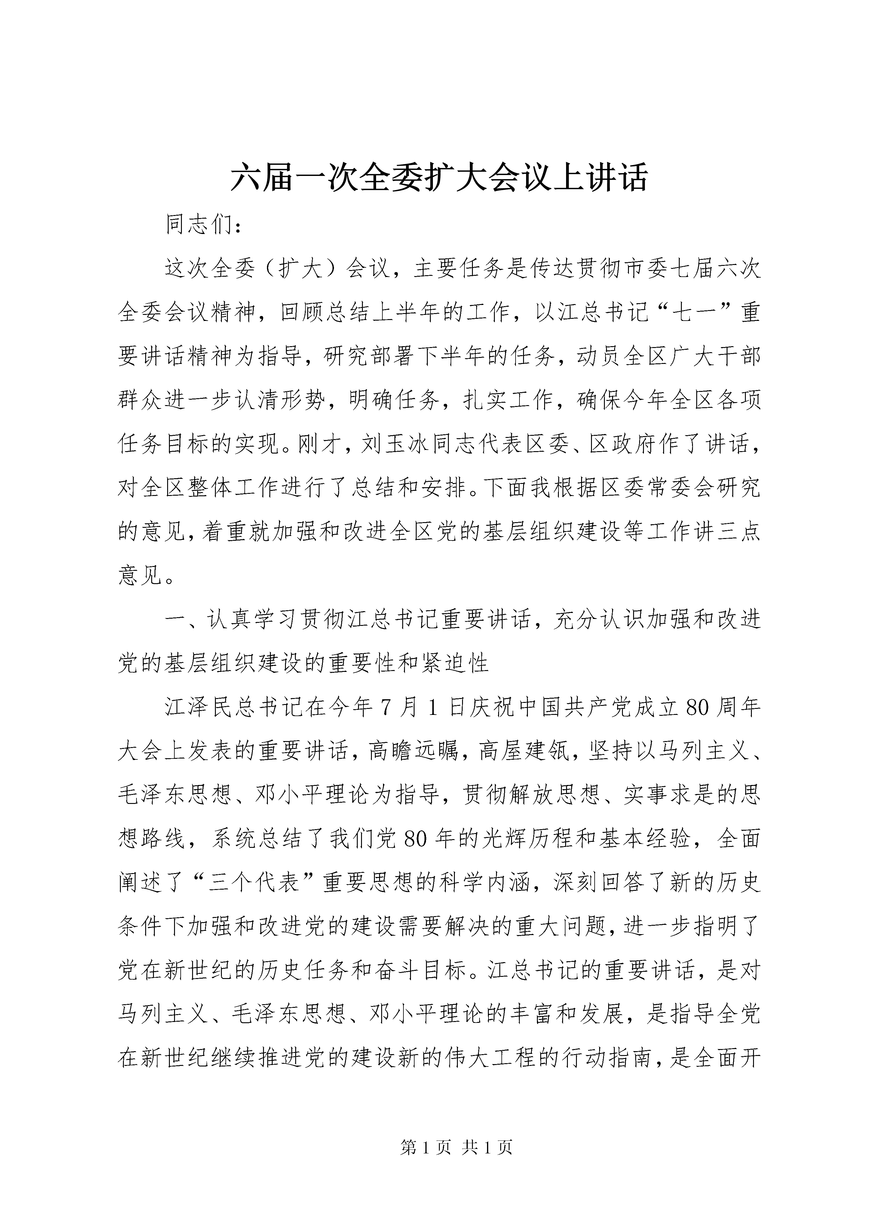 六届一次全委扩大会议上讲话同志们:这次全委(扩大)会议,主要任务是传达贯彻市委七届六次全委会议精神,回顾总结上半年的工作,以江总书记“七一”重要讲话精神为指导,研究部署下半年的任务,动员全区广大干部群众进一步认清形势,明确任务,扎实工作,确保今年全区各项任务目标的实现。刚才,刘玉冰同志代表区委、区政府作了讲话,对全区整体工作进行了总结和安排。下面我根据区委常委会研究的意见,着重就加强和改进全区党的基层组织建设等工作讲三点意见。一、认真学习贯彻江总书记重要讲话,充分认识加强和改进党的基层组织建设的重要性和紧迫性江泽民总书记在今年7月1日庆祝中国共产党成立80周年大会上发表的重要讲话,高瞻远瞩,高屋建瓴,坚持以马列主义、毛泽东思想、邓小平理论为指导,贯彻解放思想、实事求是的思想路线,系统总结了我们党80年的光辉历程和基本经验,全面阐述了“三个代表”重要思想的科学内涵,深刻回答了新的历史条件下加强和改进党的建设需要解决的重大问题,进一步指明了党在新世纪的历史任务和奋斗目标。江总书记的重要讲话,是对马列主义、毛泽东思想、邓小平理论的丰富和发展,是指导全党在新世纪继续推进党的建设新的伟大工程的行动指南,是全面开创建设有中国特色社会主义新局面的纲领性文献。学习贯彻江总书记重要讲话,对于我们适应新形势、新任务的要求,切实加强和改进党的建设,完成新世纪面临的三大任务,推进建设有中国特色社会主义的伟大事业,具有重大而深远的指导意义,也是当前各级党组织、全体党员干部面临的一项重要而紧迫的政治任务。各级各部门各单位要高度重视,按照区委的统一要求,认真学习好、领会好、宣传好、贯彻好、落实好。要认真学习,广泛宣传。区委决定将7月份作为集中学习月,利用一个月的时间,组织广大党员开展集中学习活动。副科级以上领导干部要带头学习,区、镇(办)机关要制定学习计划,坚持学习日制度,保证学习时间。要坚持分散自学和集中辅导相结合,通过组织讨论会、举办报告会等多种形式,尽快在全区形成学习热潮。党校要发挥党员教育阵地作用,把江泽民同志重要讲话列入教学计划,贯穿到各班次的教学中去。下半年要对副科级以上干部和村党支部书记分期分批轮训一遍。各部门各单位要采取各种行之有效的措施,广泛宣传讲话精神。新闻宣传部门要集中力量,加大宣传力度,使江总书记的重要讲话家喻户晓,深入人心,推动全区学习活动的不断深入。要深刻领会,把握精神实质。江总书记的重要讲话,思想博大精深,内容极为丰富,在很多理论和实践问题上有新的突破,体现了我们党在理论创新方面的突出成果。学习江总书记的重要讲话必须全面把握、深刻领会其精神实质和丰富内涵。要深刻认识我们党80年的光辉业绩和基本经验,进一步了解我们党的历史,坚定在党的领导下建设有中国特色社会主义的信心。要深刻认识“三个代表”重要思想的科学内涵,进一步理解“三个代表”是我们党的立党之本、执政之基、力量之源,是永远保持党的先进性、战斗力和创造性的根本保证。要深刻认识新的历史条件下党的建设面临的一系列必须认真研究和解决的重大问题,认真领会讲话中提出的“五个必须”的要求,切实加强和改进党的建设。要深刻认识党在新世纪的历史任务和奋斗目标,既要树立共产主义的远大理想,坚定信念,以高尚的思想道德要求鞭策自己,更要踏踏实实地为实现党在现阶段的基本路线而不懈努力,为实现党在现阶段的基本纲领而努力奋斗。要联系实际,狠抓措施落实。学习贯彻江总书记重要讲话,最重要的是落实。要联系思想实际,牢固树立党的宗旨观念,切实增强为群众服务、为基层服务的意识,达到转变工作作风,提高效率的目的。要联系工作实际,深入调查研究,认真解决改革发展中出现的新情况、新问题。要把学习江总书记的讲话同解放思想、更新观念结合起来,同加强党的建设结合起来,同解决本单位实际问题结合起来,使江总书记的重要讲话蕴涵的精神力量变为加快改革和发展的巨大物质力量。江总书记的讲话深刻回答了党的建设面临的重大理论和实践问题,对加强和改进基层组织建设提出了新的更高要求。我们在学习中必须深刻领会,充分认识加强和改进基层组织建设的重要性和必要性。党的基层组织是党的领导、执政和全部工作的基础。我们党80年的风雨历程充分表明,坚强的基层组织是胜利的基础。我们党取得的所有成就和胜利都是同广大基层党组织和共产党员充分发挥作用密不可分的,高度重视抓基层、打基础的工作,充分发挥共产党员的先锋模范作用,是我们党自身建设的一个显著特点和成功经验。一个先进的基层党组织就是一个坚强的战斗堡垒,一名优秀共产党员就是群众中的一面旗帜。改革开放20年的辉煌成就充分表明,富有活力的基层党组织是加快发展的前提。在新的历史时期,广大基层党组织团结带领广大干部群众解放思想,大胆探索,开创了建设有中国特色的社会主义事业。我区经济和社会发展的实践也充