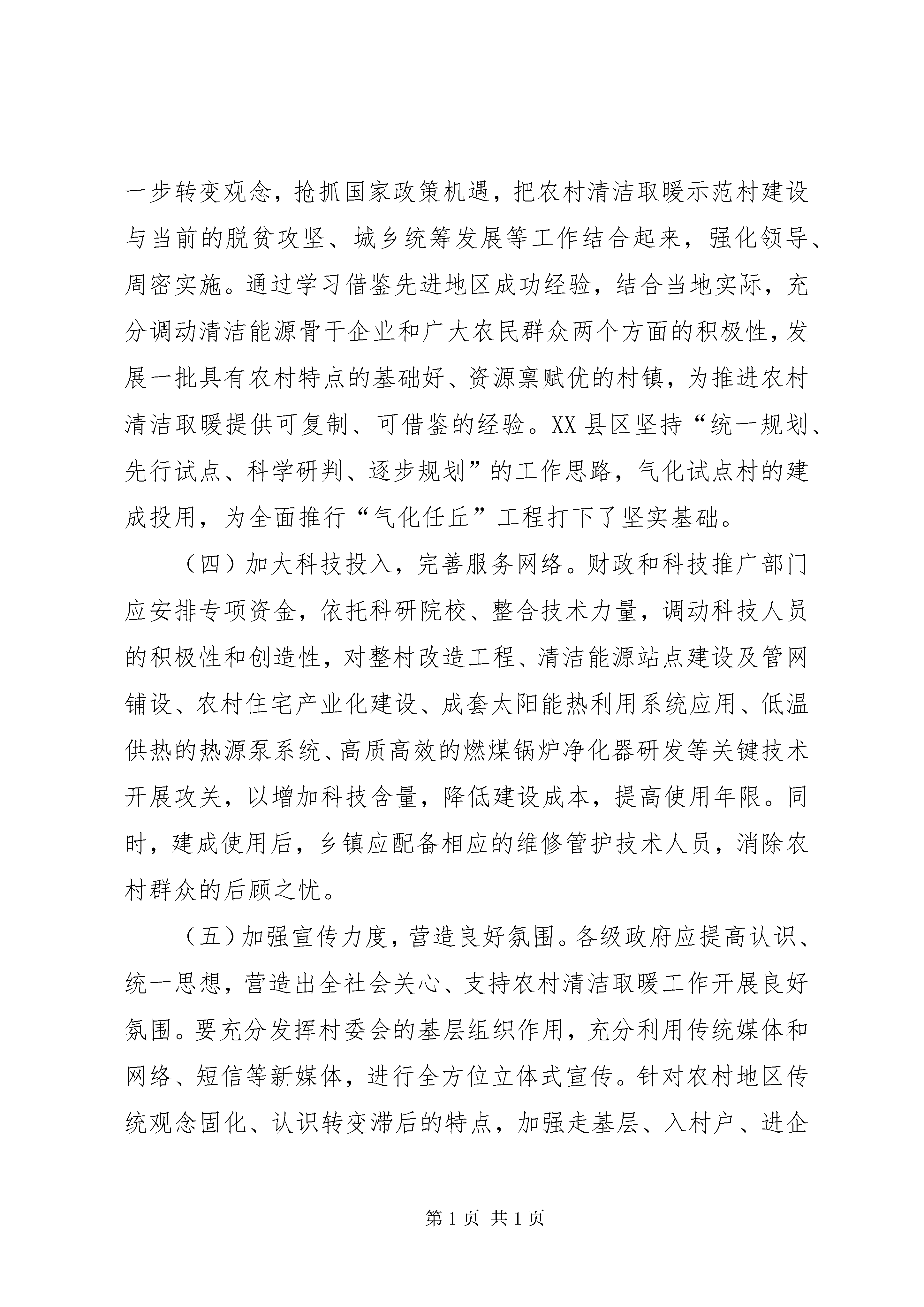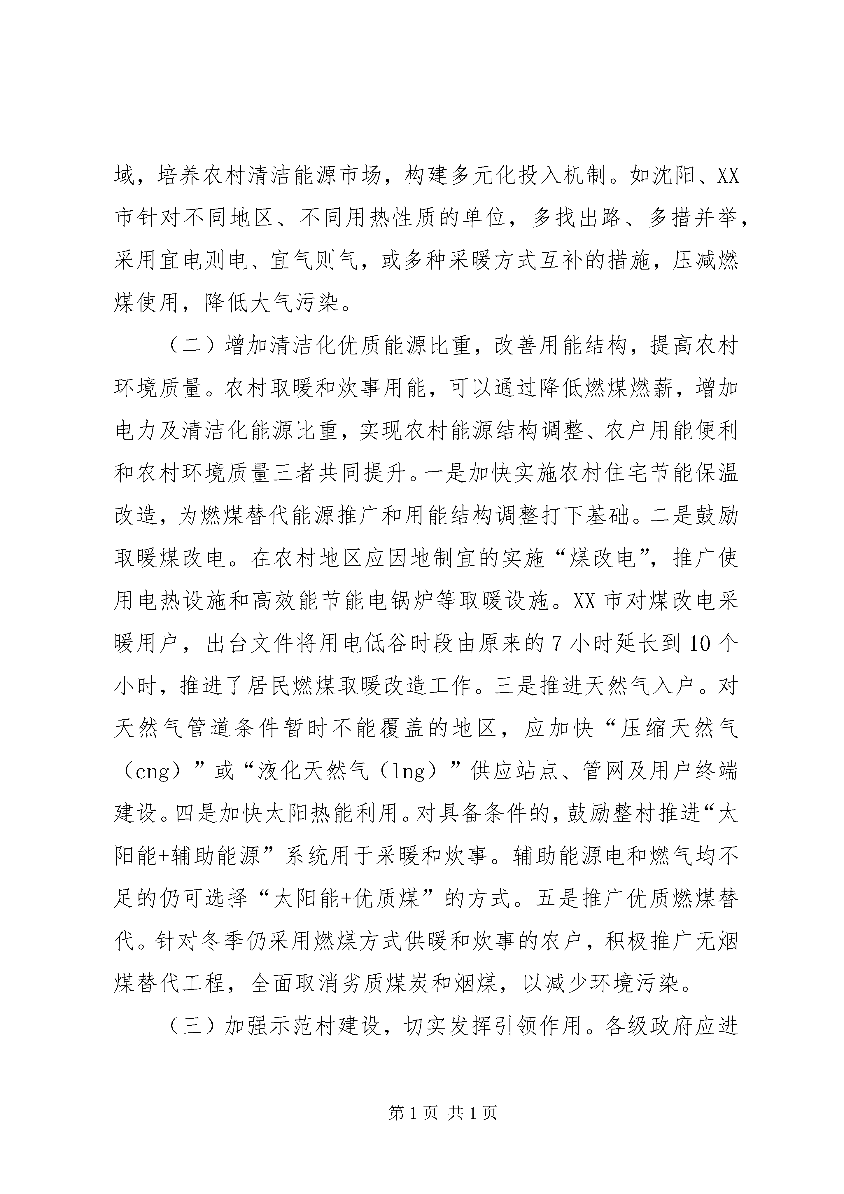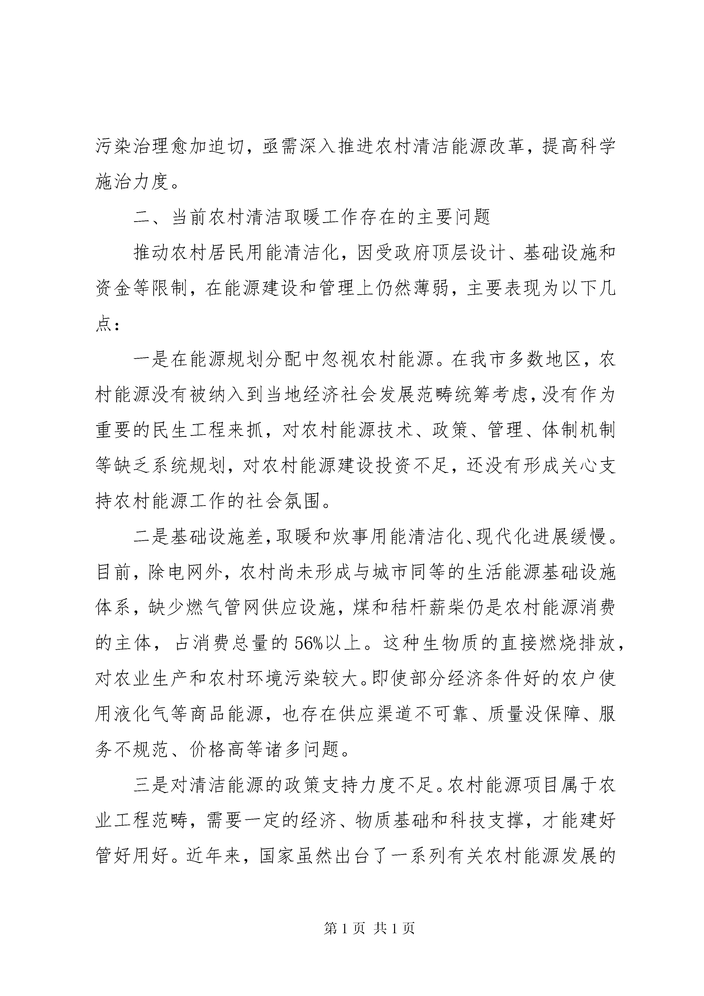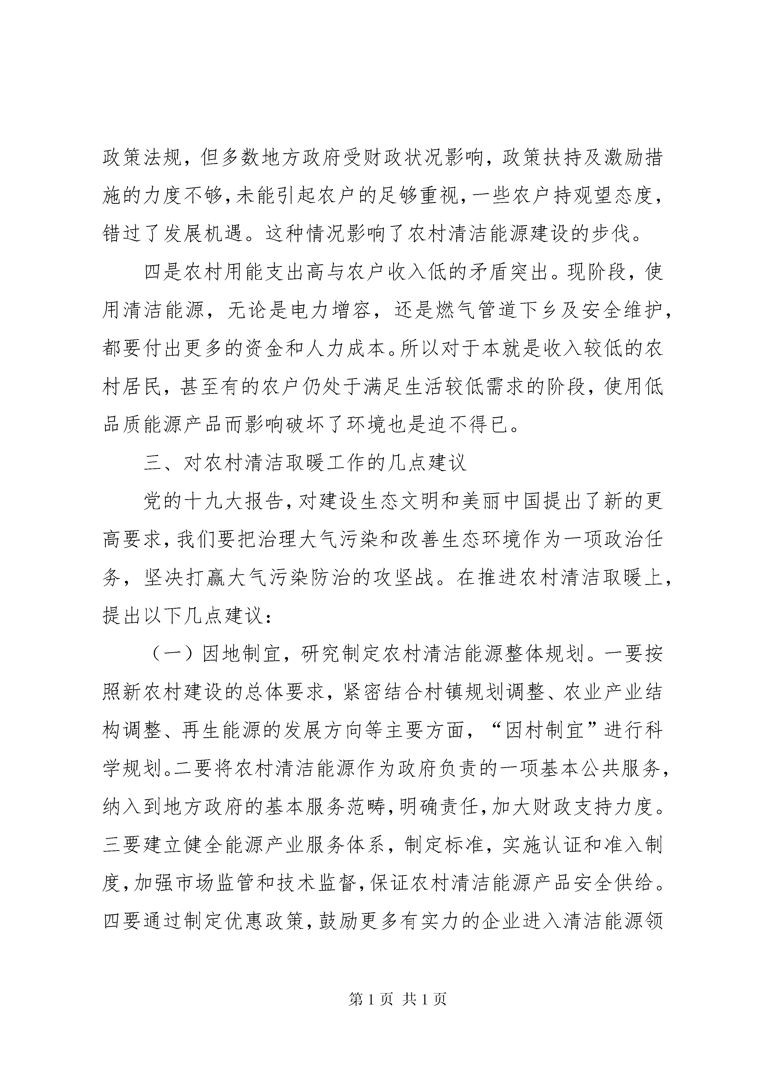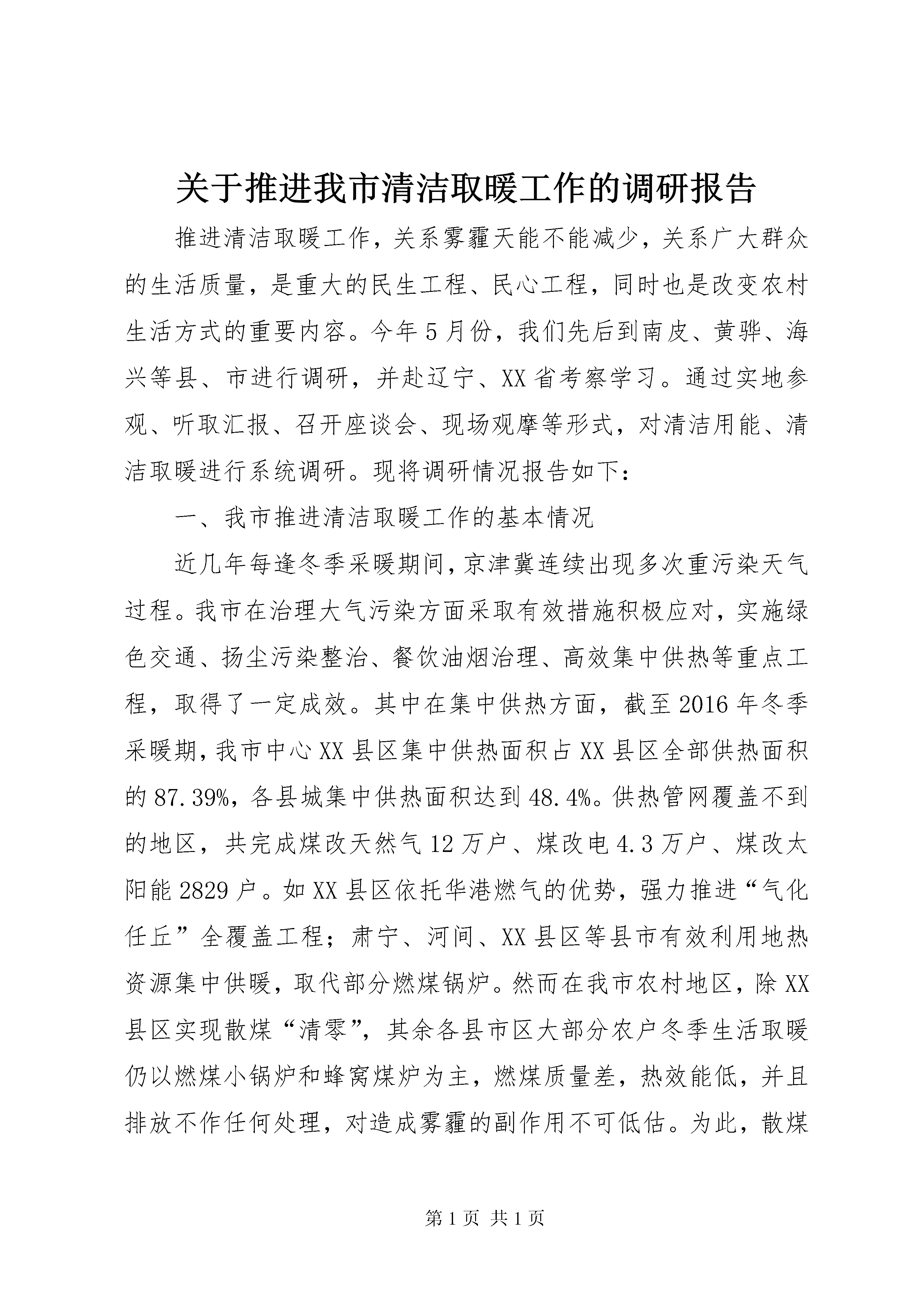关于推进我市清洁取暖工作的调研报告推进清洁取暖工作,关系雾霾天能不能减少,关系广大群众的生活质量,是重大的民生工程、民心工程,同时也是改变农村生活方式的重要内容。今年5月份,我们先后到南皮、黄骅、海兴等县、市进行调研,并赴辽宁、XX省考察学习。通过实地参观、听取汇报、召开座谈会、现场观摩等形式,对清洁用能、清洁取暖进行系统调研。现将调研情况报告如下:一、我市推进清洁取暖工作的基本情况近几年每逢冬季采暖期间,京津冀连续出现多次重污染天气过程。我市在治理大气污染方面采取有效措施积极应对,实施绿色交通、扬尘污染整治、餐饮油烟治理、高效集中供热等重点工程,取得了一定成效。其中在集中供热方面,截至2016年冬季采暖期,我市中心XX县区集中供热面积占XX县区全部供热面积的87.39%,各县城集中供热面积达到48.4%。供热管网覆盖不到的地区,共完成煤改天然气12万户、煤改电4.3万户、煤改太阳能2829户。如XX县区依托华港燃气的优势,强力推进“气化任丘”全覆盖工程;肃宁、河间、XX县区等县市有效利用地热资源集中供暖,取代部分燃煤锅炉。然而在我市农村地区,除XX县区实现散煤“清零”,其余各县市区大部分农户冬季生活取暖仍以燃煤小锅炉和蜂窝煤炉为主,燃煤质量差,热效能低,并且排放不作任何处理,对造成雾霾的副作用不可低估。为此,散煤污染治理愈加迫切,亟需深入推进农村清洁能源改革,提高科学施治力度。二、当前农村清洁取暖工作存在的主要问题推动农村居民用能清洁化,因受政府顶层设计、基础设施和资金等限制,在能源建设和管理上仍然薄弱,主要表现为以下几点:一是在能源规划分配中忽视农村能源。在我市多数地区,农村能源没有被纳入到当地经济社会发展范畴统筹考虑,没有作为重要的民生工程来抓,对农村能源技术、政策、管理、体制机制等缺乏系统规划,对农村能源建设投资不足,还没有形成关心支持农村能源工作的社会氛围。二是基础设施差,取暖和炊事用能清洁化、现代化进展缓慢。目前,除电网外,农村尚未形成与城市同等的生活能源基础设施体系,缺少燃气管网供应设施,煤和秸杆薪柴仍是农村能源消费的主体,占消费总量的56%以上。这种生物质的直接燃烧排放,对农业生产和农村环境污染较大。即使部分经济条件好的农户使用液化气等商品能源,也存在供应渠道不可靠、质量没保障、服务不规范、价格高等诸多问题。三是对清洁能源的政策支持力度不足。农村能源项目属于农业工程范畴,需要一定的经济、物质基础和科技支撑,才能建好管好用好。近年来,国家虽然出台了一系列有关农村能源发展的政策法规,但多数地方政府受财政状况影响,政策扶持及激励措施的力度不够,未能引起农户的足够重视,一些农户持观望态度,错过了发展机遇。这种情况影响了农村清洁能源建设的步伐。四是农村用能支出高与农户收入低的矛盾突出。现阶段,使用清洁能源,无论是电力增容,还是燃气管道下乡及安全维护,都要付出更多的资金和人力成本。所以对于本就是收入较低的农村居民,甚至有的农户仍处于满足生活较低需求的阶段,使用低品质能源产品而影响破坏了环境也是迫不得已。三、对农村清洁取暖工作的几点建议党的十九大报告,对建设生态文明和美丽中国提出了新的更高要求,我们要把治理大气污染和改善生态环境作为一项政治任务,坚决打赢大气污染防治的攻坚战。在推进农村清洁取暖上,提出以下几点建议:(一)因地制宜,研究制定农村清洁能源整体规划。一要按照新农村建设的总体要求,紧密结合村镇规划调整、农业产业结构调整、再生能源的发展方向等主要方面,“因村制宜”进行科学规划。二要将农村清洁能源作为政府负责的一项基本公共服务,纳入到地方政府的基本服务范畴,明确责任,加大财政支持力度。三要建立健全能源产业服务体系,制定标准,实施认证和准入制度,加强市场监管和技术监督,保证农村清洁能源产品安全供给。四要通过制定优惠政策,鼓励更多有实力的企业进入清洁能源领域,培养农村清洁能源市场,构建多元化投入机制。如沈阳、XX市针对不同地区、不同用热性质的单位,多找出路、多措并举,采用宜电则电、宜气则气,或多种采暖方式互补的措施,压减燃煤使用,降低大气污染。(二)增加清洁化优质能源比重,改善用能结构,提高农村环境质量。农村取暖和炊事用能,可以通过降低燃煤燃薪,增加电力及清洁化能源比重,实现农村能源结构调整、农户用能便利和农村环境质量三者共同提升。一是加快实施农村住宅节能保温改造,为燃煤替代能源推广和用能结构调整打下基础。二是鼓励取暖煤改电。在农村地区应因地制宜的实施“煤改电”,推广使用电热设施和高效能节能电锅炉等取暖设施。XX市对煤改电采暖用户,出台文件将用电低谷时段由原来的7小时延长到10个小时,推进了居民燃煤取暖改造工作。三是推进天然气入户。对天然气管道条件暂时不能覆盖的地区,应加快“压缩天然气(cng)”或