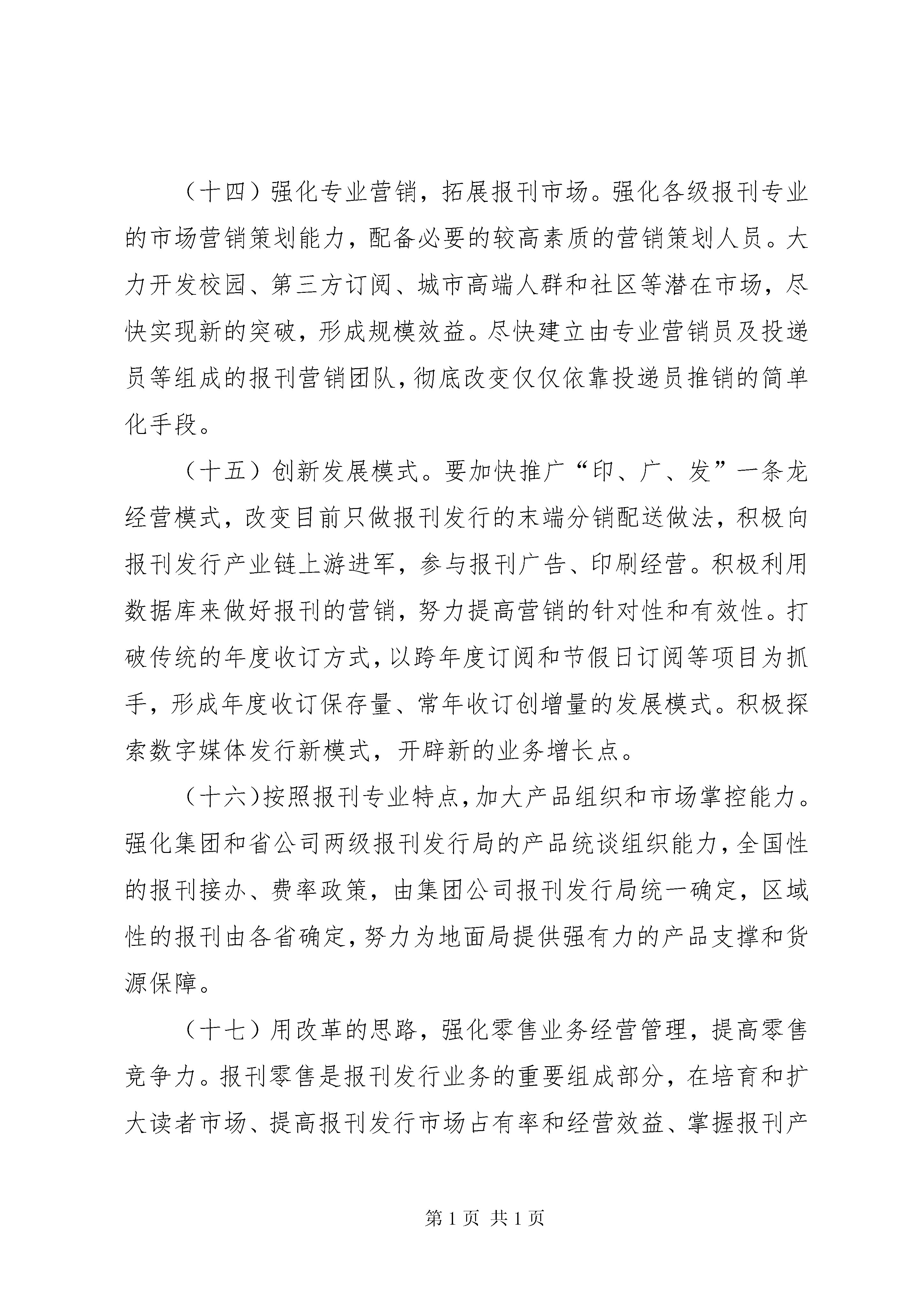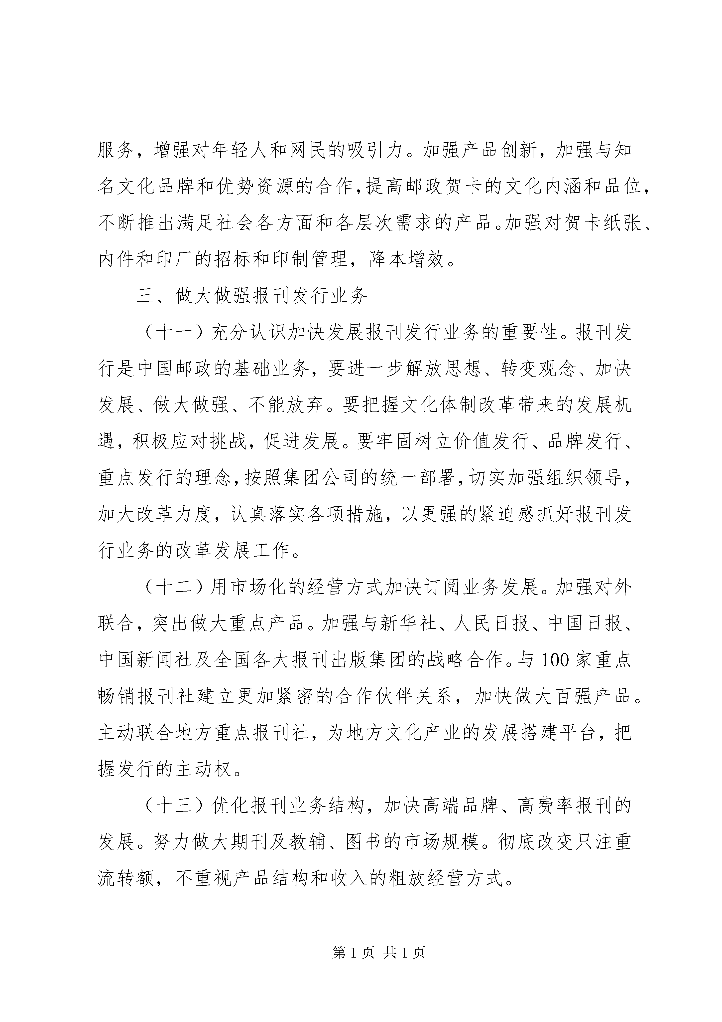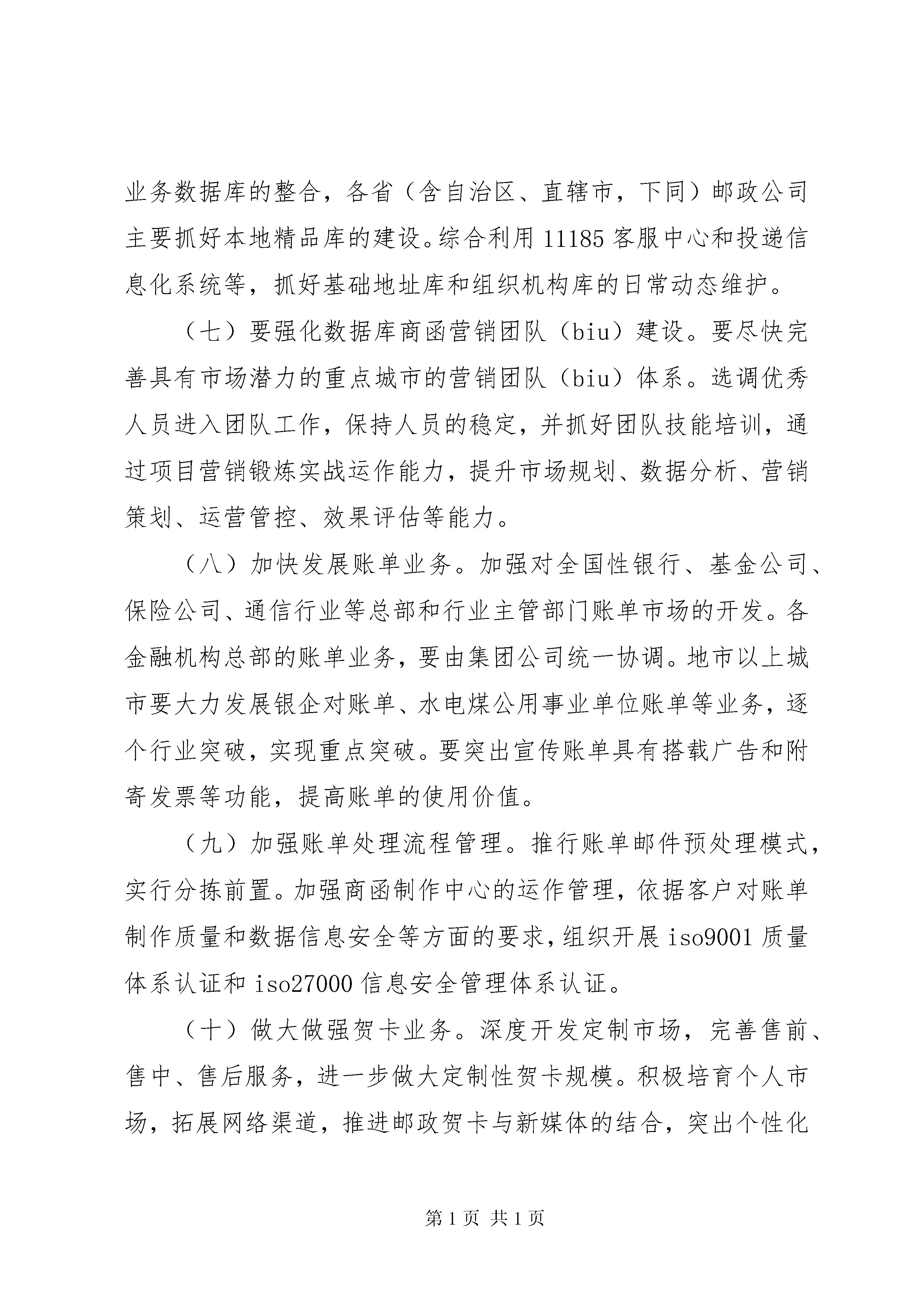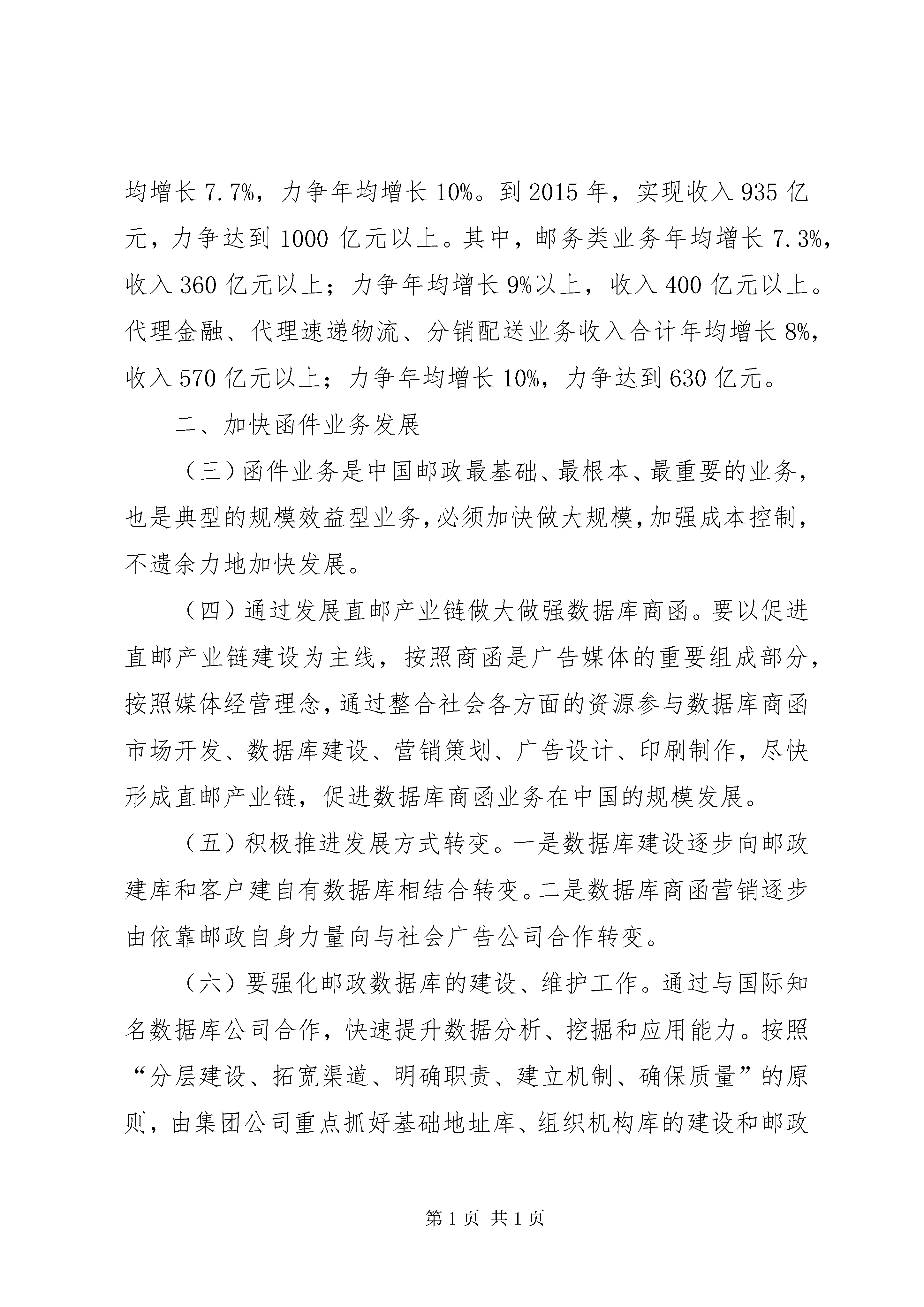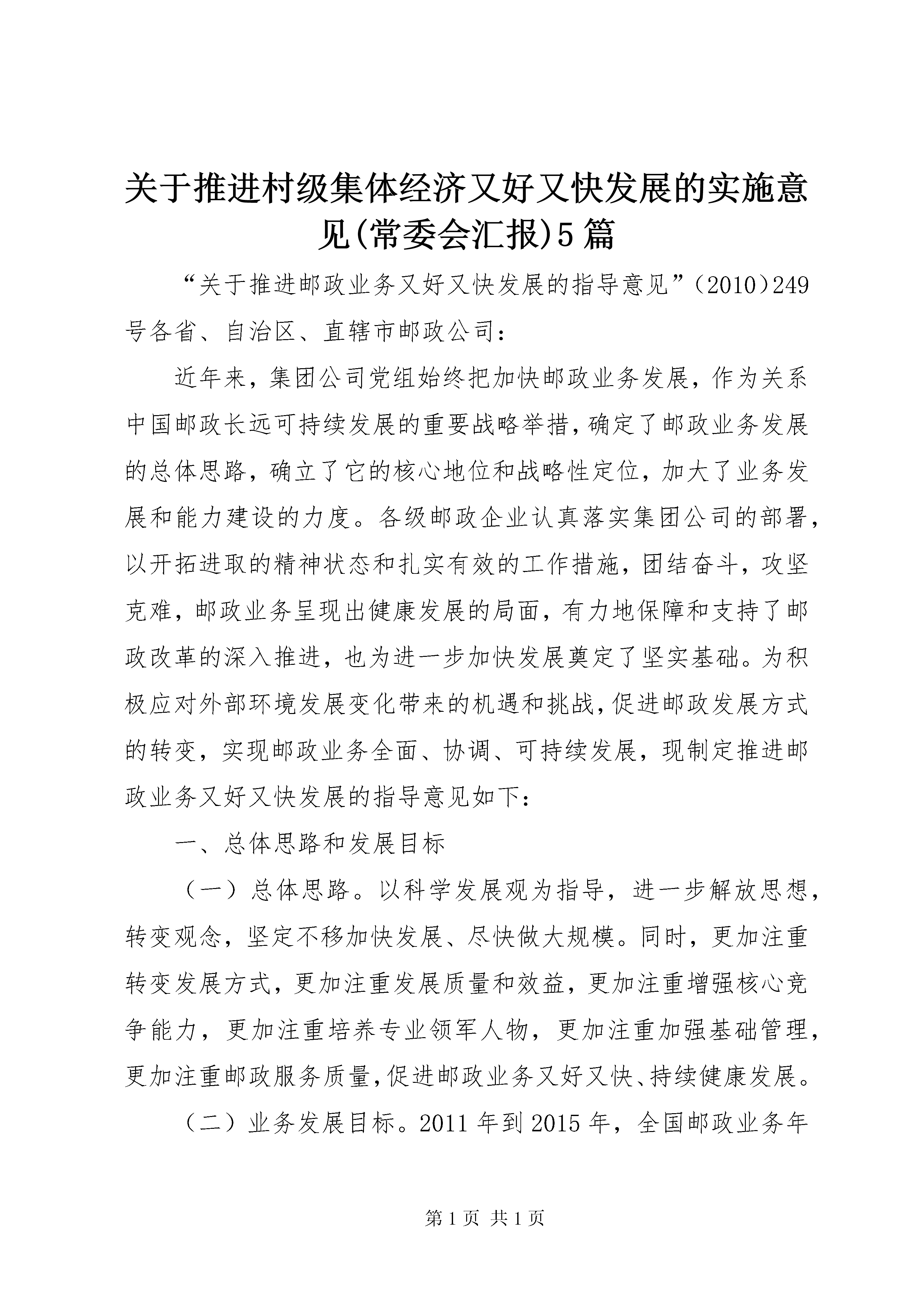 关于推进村级集体经济又好又快发展的实施意见(常委会汇报)5篇“关于推进邮政业务又好又快发展的指导意见”(2010)249号各省、自治区、直辖市邮政公司:近年来,集团公司党组始终把加快邮政业务发展,作为关系中国邮政长远可持续发展的重要战略举措,确定了邮政业务发展的总体思路,确立了它的核心地位和战略性定位,加大了业务发展和能力建设的力度。各级邮政企业认真落实集团公司的部署,以开拓进取的精神状态和扎实有效的工作措施,团结奋斗,攻坚克难,邮政业务呈现出健康发展的局面,有力地保障和支持了邮政改革的深入推进,也为进一步加快发展奠定了坚实基础。为积极应对外部环境发展变化带来的机遇和挑战,促进邮政发展方式的转变,实现邮政业务全面、协调、可持续发展,现制定推进邮政业务又好又快发展的指导意见如下:一、总体思路和发展目标(一)总体思路。以科学发展观为指导,进一步解放思想,转变观念,坚定不移加快发展、尽快做大规模。同时,更加注重转变发展方式,更加注重发展质量和效益,更加注重增强核心竞争能力,更加注重培养专业领军人物,更加注重加强基础管理,更加注重邮政服务质量,促进邮政业务又好又快、持续健康发展。(二)业务发展目标。2011年到2015年,全国邮政业务年均增长7.7%,力争年均增长10%。到2015年,实现收入935亿元,力争达到1000亿元以上。其中,邮务类业务年均增长7.3%,收入360亿元以上;力争年均增长9%以上,收入400亿元以上。代理金融、代理速递物流、分销配送业务收入合计年均增长8%,收入570亿元以上;力争年均增长10%,力争达到630亿元。二、加快函件业务发展(三)函件业务是中国邮政最基础、最根本、最重要的业务,也是典型的规模效益型业务,必须加快做大规模,加强成本控制,不遗余力地加快发展。(四)通过发展直邮产业链做大做强数据库商函。要以促进直邮产业链建设为主线,按照商函是广告媒体的重要组成部分,按照媒体经营理念,通过整合社会各方面的资源参与数据库商函市场开发、数据库建设、营销策划、广告设计、印刷制作,尽快形成直邮产业链,促进数据库商函业务在中国的规模发展。(五)积极推进发展方式转变。一是数据库建设逐步向邮政建库和客户建自有数据库相结合转变。二是数据库商函营销逐步由依靠邮政自身力量向与社会广告公司合作转变。(六)要强化邮政数据库的建设、维护工作。通过与国际知名数据库公司合作,快速提升数据分析、挖掘和应用能力。按照“分层建设、拓宽渠道、明确职责、建立机制、确保质量”的原则,由集团公司重点抓好基础地址库、组织机构库的建设和邮政业务数据库的整合,各省(含自治区、直辖市,下同)邮政公司主要抓好本地精品库的建设。综合利用11185客服中心和投递信息化系统等,抓好基础地址库和组织机构库的日常动态维护。(七)要强化数据库商函营销团队(biu)建设。要尽快完善具有市场潜力的重点城市的营销团队(biu)体系。选调优秀人员进入团队工作,保持人员的稳定,并抓好团队技能培训,通过项目营销锻炼实战运作能力,提升市场规划、数据分析、营销策划、运营管控、效果评估等能力。(八)加快发展账单业务。加强对全国性银行、基金公司、保险公司、通信行业等总部和行业主管部门账单市场的开发。各金融机构总部的账单业务,要由集团公司统一协调。地市以上城市要大力发展银企对账单、水电煤公用事业单位账单等业务,逐个行业突破,实现重点突破。要突出宣传账单具有搭载广告和附寄发票等功能,提高账单的使用价值。(九)加强账单处理流程管理。推行账单邮件预处理模式,实行分拣前置。加强商函制作中心的运作管理,依据客户对账单制作质量和数据信息安全等方面的要求,组织开展iso9001质量体系认证和iso27000信息安全管理体系认证。(十)做大做强贺卡业务。深度开发定制市场,完善售前、售中、售后服务,进一步做大定制性贺卡规模。积极培育个人市场,拓展网络渠道,推进邮政贺卡与新媒体的结合,突出个性化服务,增强对年轻人和网民的吸引力。加强产品创新,加强与知名文化品牌和优势资源的合作,提高邮政贺卡的文化内涵和品位,不断推出满足社会各方面和各层次需求的产品。加强对贺卡纸张、内件和印厂的招标和印制管理,降本增效。三、做大做强报刊发行业务(十一)充分认识加快发展报刊发行业务的重要性。报刊发行是中国邮政的基础业务,要进一步解放思想、转变观念、加快发展、做大做强、不能放弃。要把握文化体制改革带来的发展机遇,积极应对挑战,促进发展。要牢固树立价值发行、品牌发行、重点发行的理念,按照集团公司的统一部署,切实加强组织领导,加大改革力度,认真落实各项措施,以更强的紧迫感抓好报刊发行业务的改革发展工作。(十二)用市场化的经营方式加快订阅业务发展。加强对外联合,突出做大重点产品。加强与新华社、人民日报、中国日报、中国