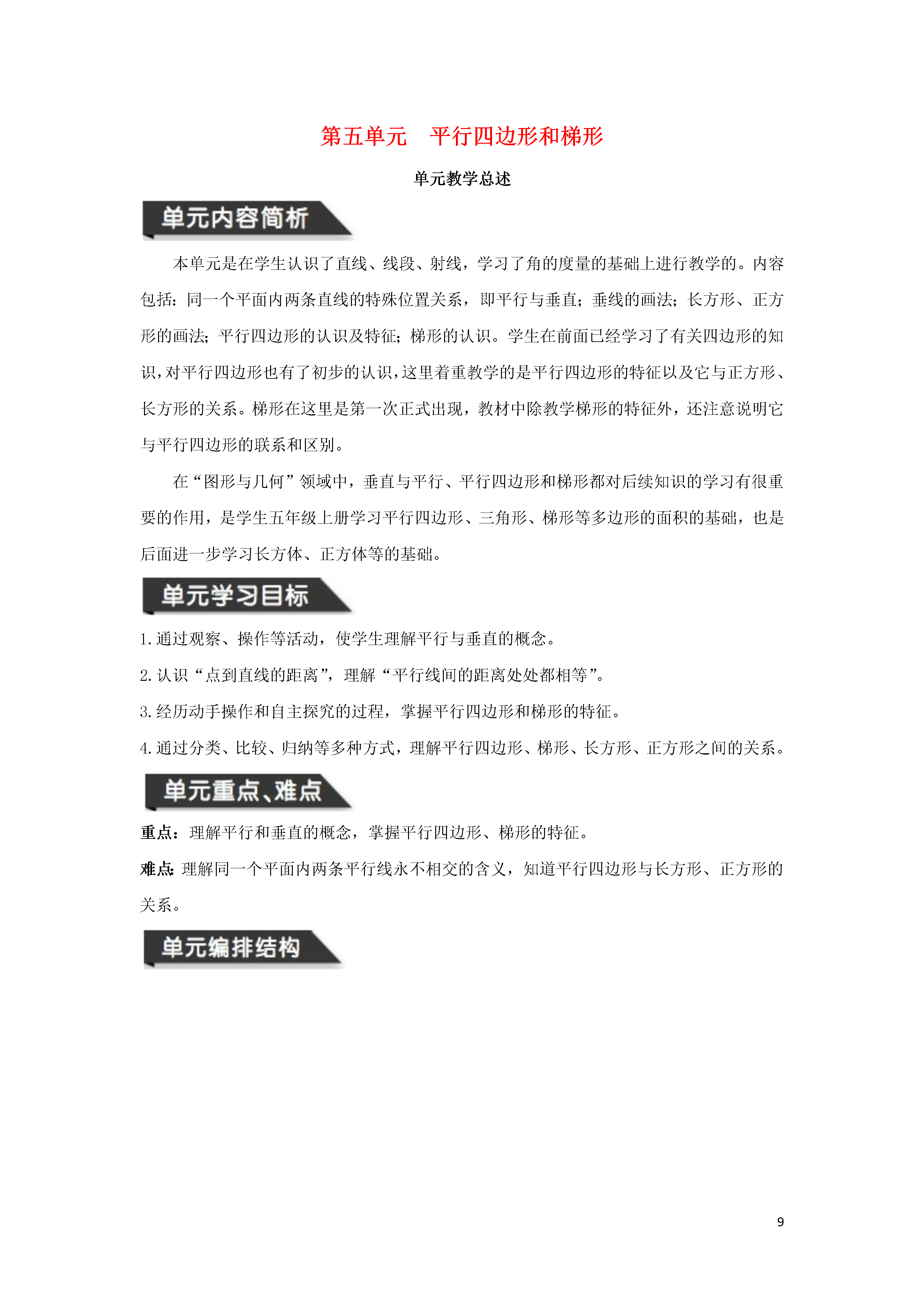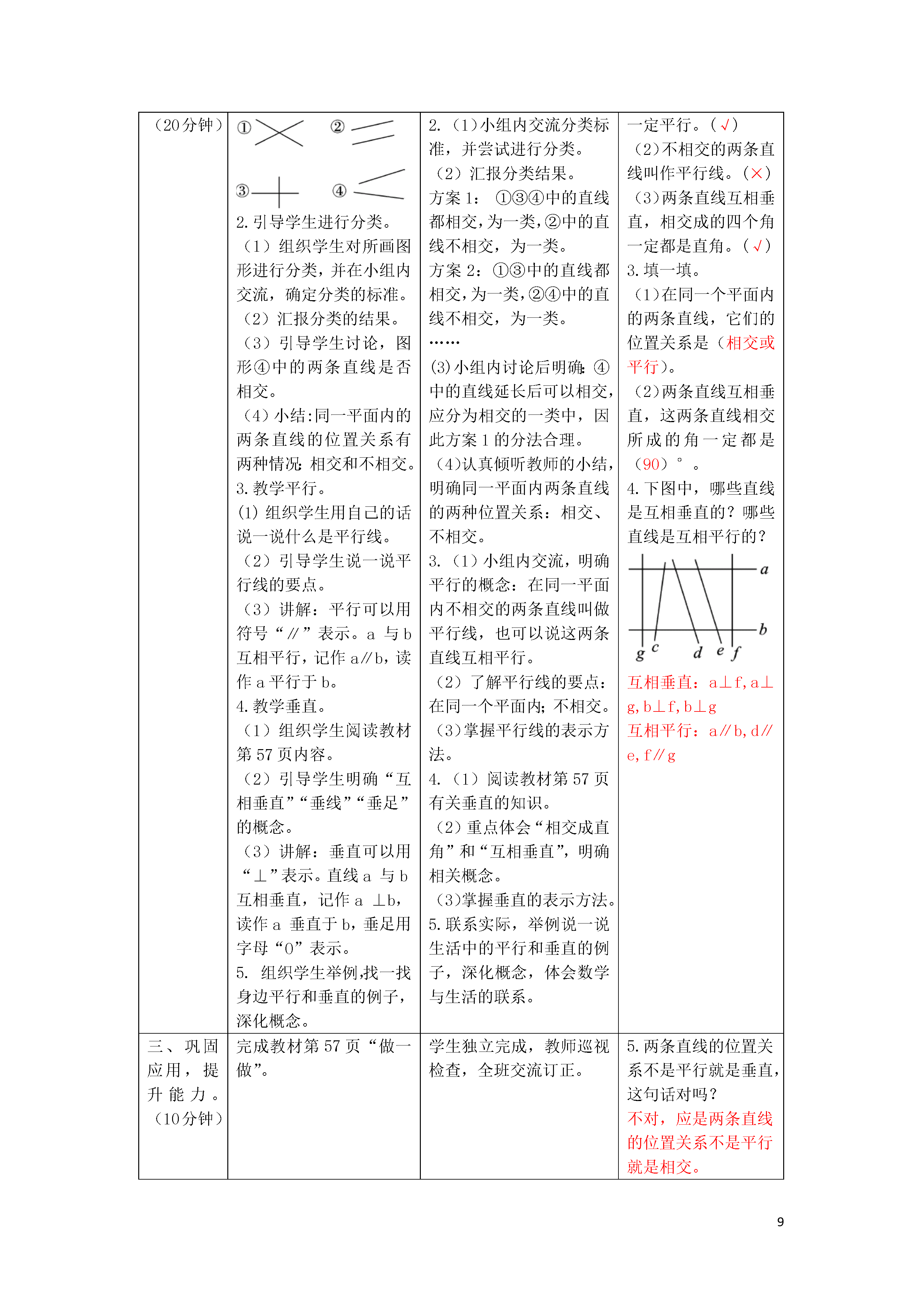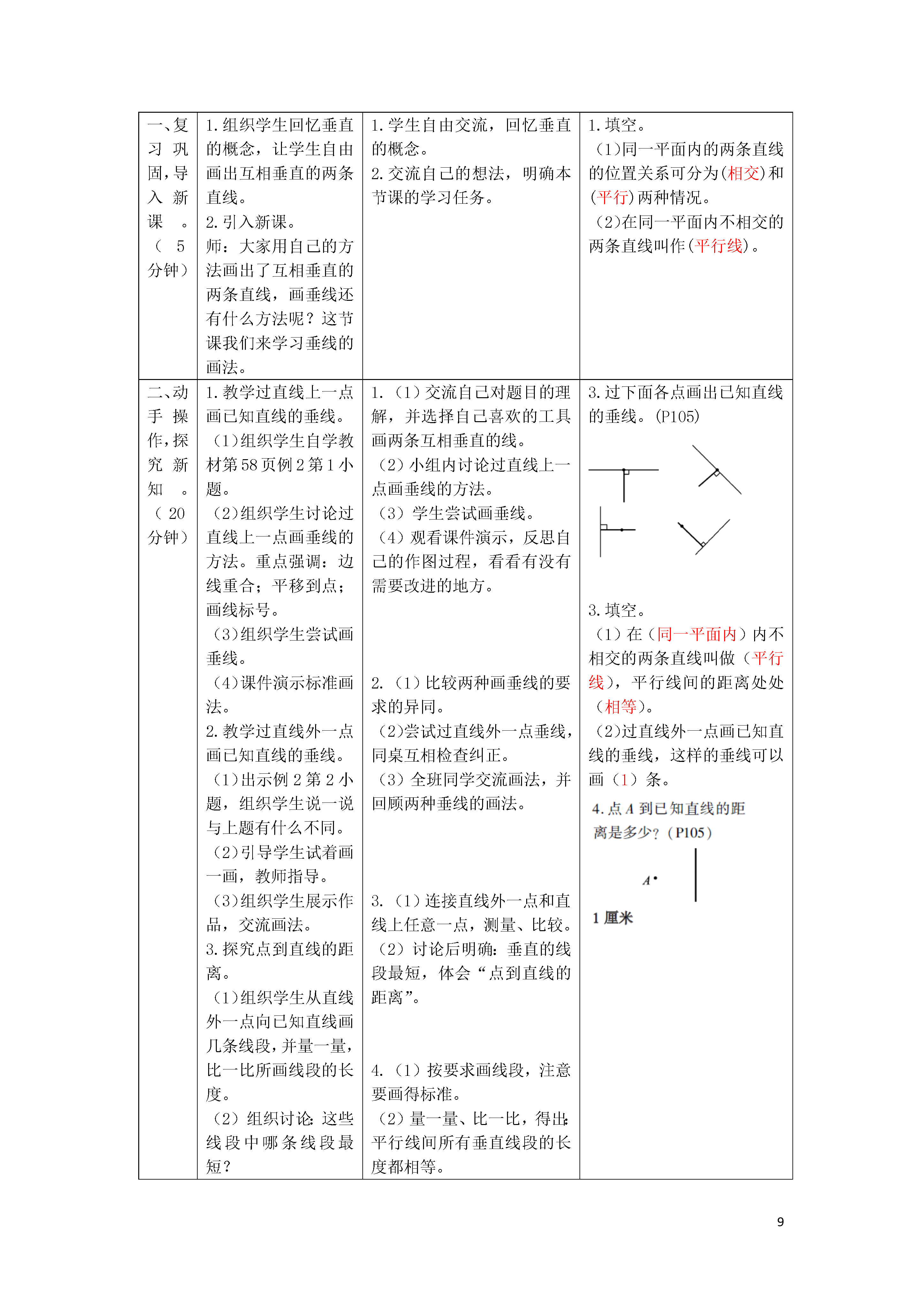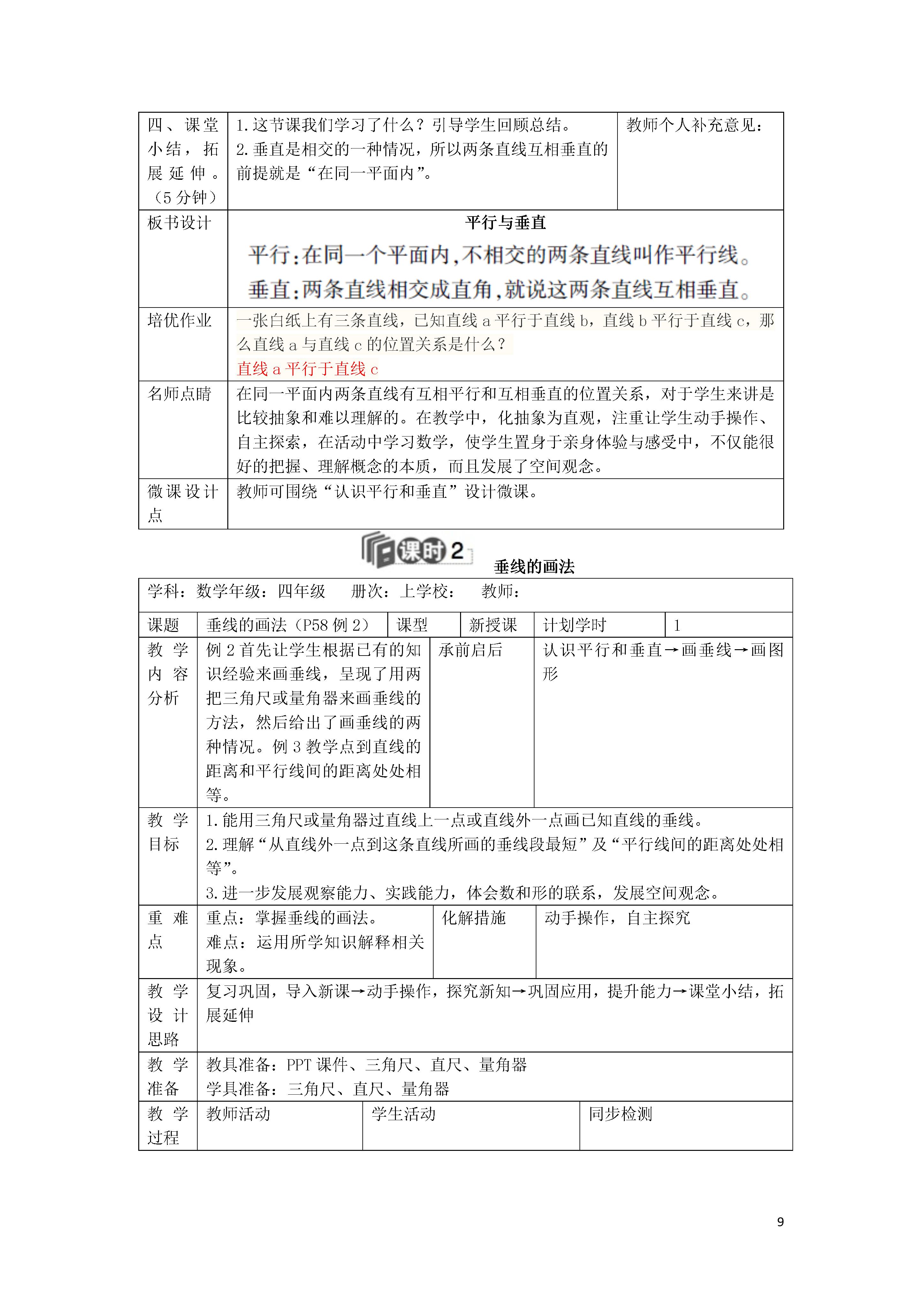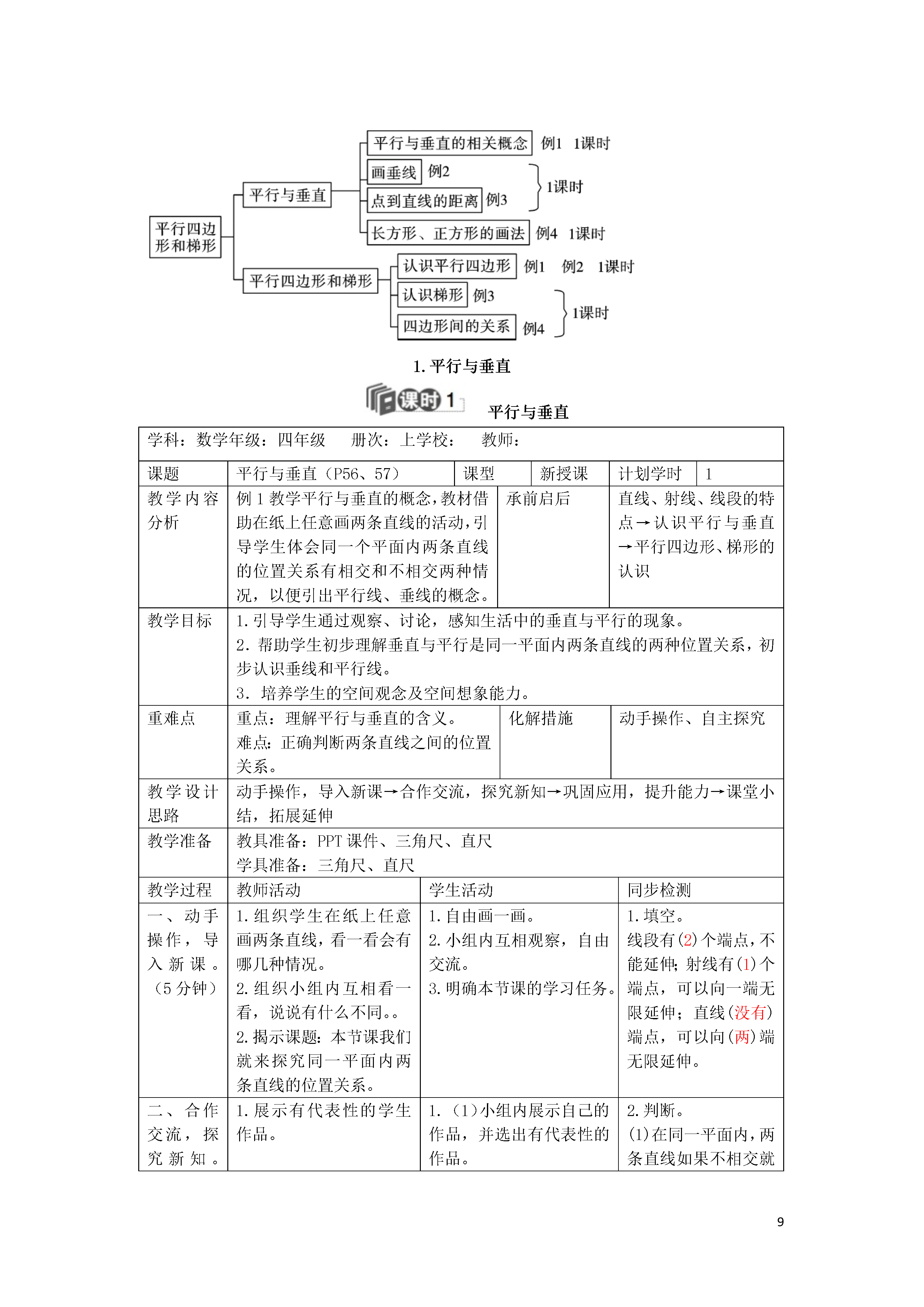 9第五单元平行四边形和梯形单元教学总述本单元是在学生认识了直线、线段、射线,学习了角的度量的基础上进行教学的。内容包括:同一个平面内两条直线的特殊位置关系,即平行与垂直;垂线的画法;长方形、正方形的画法;平行四边形的认识及特征;梯形的认识。学生在前面已经学习了有关四边形的知识,对平行四边形也有了初步的认识,这里着重教学的是平行四边形的特征以及它与正方形、长方形的关系。梯形在这里是第一次正式出现,教材中除教学梯形的特征外,还注意说明它与平行四边形的联系和区别。在“图形与几何”领域中,垂直与平行、平行四边形和梯形都对后续知识的学习有很重要的作用,是学生五年级上册学习平行四边形、三角形、梯形等多边形的面积的基础,也是后面进一步学习长方体、正方体等的基础。1.通过观察、操作等活动,使学生理解平行与垂直的概念。2.认识“点到直线的距离”,理解“平行线间的距离处处都相等”。3.经历动手操作和自主探究的过程,掌握平行四边形和梯形的特征。4.通过分类、比较、归纳等多种方式,理解平行四边形、梯形、长方形、正方形之间的关系。重点:理解平行和垂直的概念,掌握平行四边形、梯形的特征。难点:理解同一个平面内两条平行线永不相交的含义,知道平行四边形与长方形、正方形的关系。1.平行与垂直平行与垂直学科:数学年级:四年级册次:上学校:教师:课题平行与垂直(P56、57)课型新授课计划学时1教学内容分析例1教学平行与垂直的概念,教材借助在纸上任意画两条直线的活动,引导学生体会同一个平面内两条直线的位置关系有相交和不相交两种情况,以便引出平行线、垂线的概念。承前启后直线、射线、线段的特点→认识平行与垂直→平行四边形、梯形的认识教学目标1.引导学生通过观察、讨论,感知生活中的垂直与平行的现象。2.帮助学生初步理解垂直与平行是同一平面内两条直线的两种位置关系,初步认识垂线和平行线。3.培养学生的空间观念及空间想象能力。重难点重点:理解平行与垂直的含义。难点:正确判断两条直线之间的位置关系。化解措施动手操作、自主探究教学设计思路动手操作,导入新课→合作交流,探究新知→巩固应用,提升能力→课堂小结,拓展延伸教学准备教具准备:PPT课件、三角尺、直尺学具准备:三角尺、直尺教学过程教师活动学生活动同步检测一、动手操作,导入新课。(5分钟)1.组织学生在纸上任意画两条直线,看一看会有哪几种情况。2.组织小组内互相看一看,说说有什么不同。。2.揭示课题:本节课我们就来探究同一平面内两条直线的位置关系。1.自由画一画。2.小组内互相观察,自由交流。3.明确本节课的学习任务。1.填空。线段有(2)个端点,不能延伸;射线有(1)个端点,可以向一端无限延伸;直线(没有)端点,可以向(两)端无限延伸。二、合作交流,探究新知。(20分钟)1.展示有代表性的学生作品。2.引导学生进行分类。(1)组织学生对所画图形进行分类,并在小组内交流,确定分类的标准。(2)汇报分类的结果。(3)引导学生讨论,图形④中的两条直线是否相交。(4)小结:同一平面内的两条直线的位置关系有两种情况:相交和不相交。3.教学平行。(1)组织学生用自己的话说一说什么是平行线。(2)引导学生说一说平行线的要点。(3)讲解:平行可以用符号“∥”表示。a与b互相平行,记作a∥b,读作a平行于b。4.教学垂直。(1)组织学生阅读教材内容。(2)引导学生明确“互相垂直”“垂线”“垂足”的概念。(3)讲解:垂直可以用“⊥”表示。直线a与b互相垂直,记作a⊥b,读作a垂直于b,垂足用字母“O”表示。5.组织学生举例,找一找身边平行和垂直的例子,深化概念。1.(1)小组内展示自己的作品,并选出有代表性的作品。2.(1)小组内交流分类标准,并尝试进行分类。(2)汇报分类结果。方案1:①③④中的直线都相交,为一类,②中的直线不相交,为一类。方案2:①③中的直线都相交,为一类,②④中的直线不相交,为一类。……(3)小组内讨论后明确:④中的直线延长后可以相交,应分为相交的一类中,因此方案1的分法合理。(4)认真倾听教师的小结,明确同一平面内两条直线的两种位置关系:相交、不相交。3.(1)小组内交流,明确平行的概念:在同一平面内不相交的两条直线叫做平行线,也可以说这两条直线互相平行。(2)了解平行线的要点:在同一个平面内;不相交。(3)掌握平行线的表示方法。4.(1)阅读教材有关垂直的知识。(2)重点体会“相交成直角”和“互相垂直”,明确相关概念。(3)掌握垂直的表示方法。5.联系实际,举例说一说生活中的平行和垂直的例子,深化概念,体会数学与生活的联系。2.判断。(1)在同一平面内,两条直线如果不相交就一定平行。