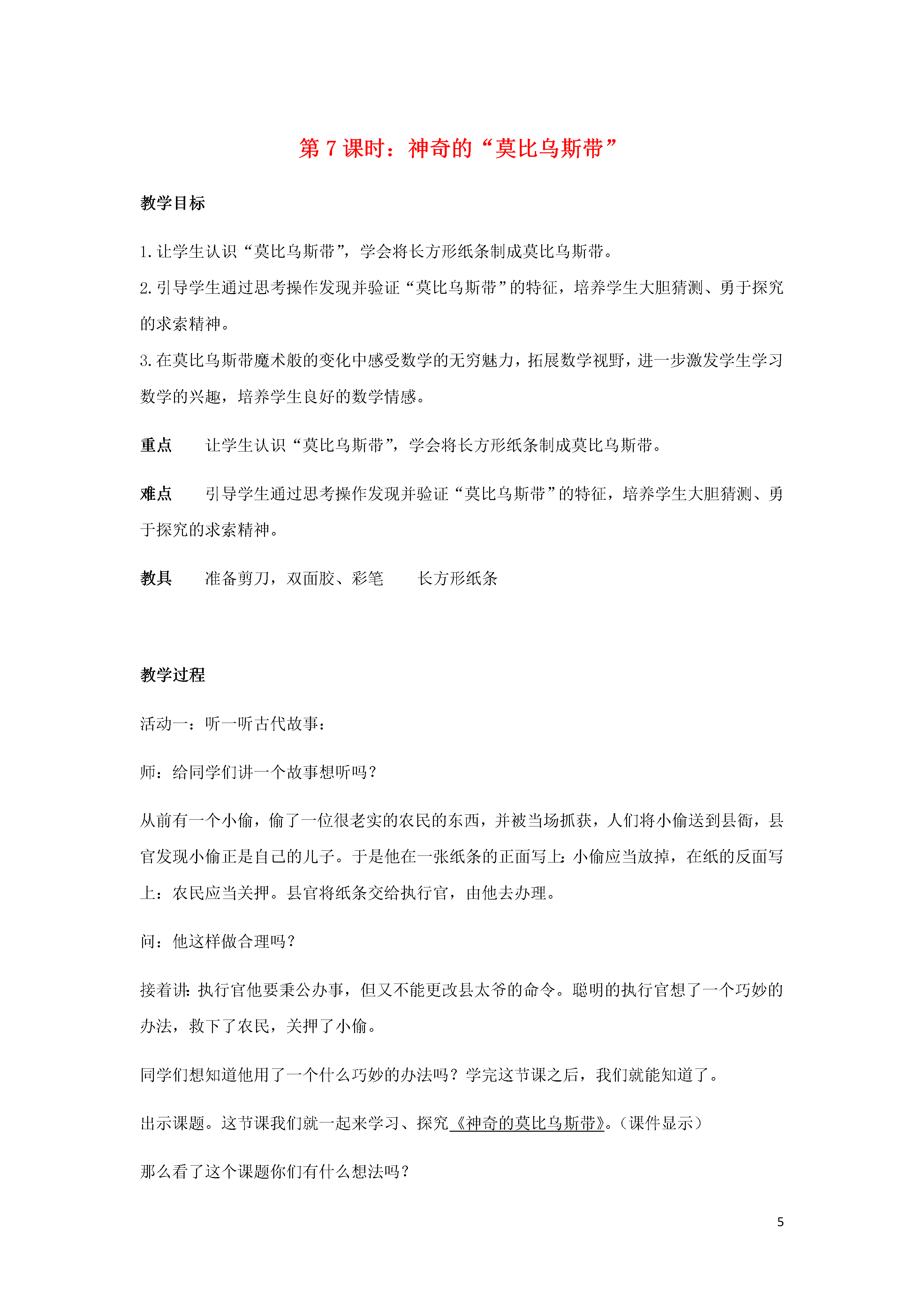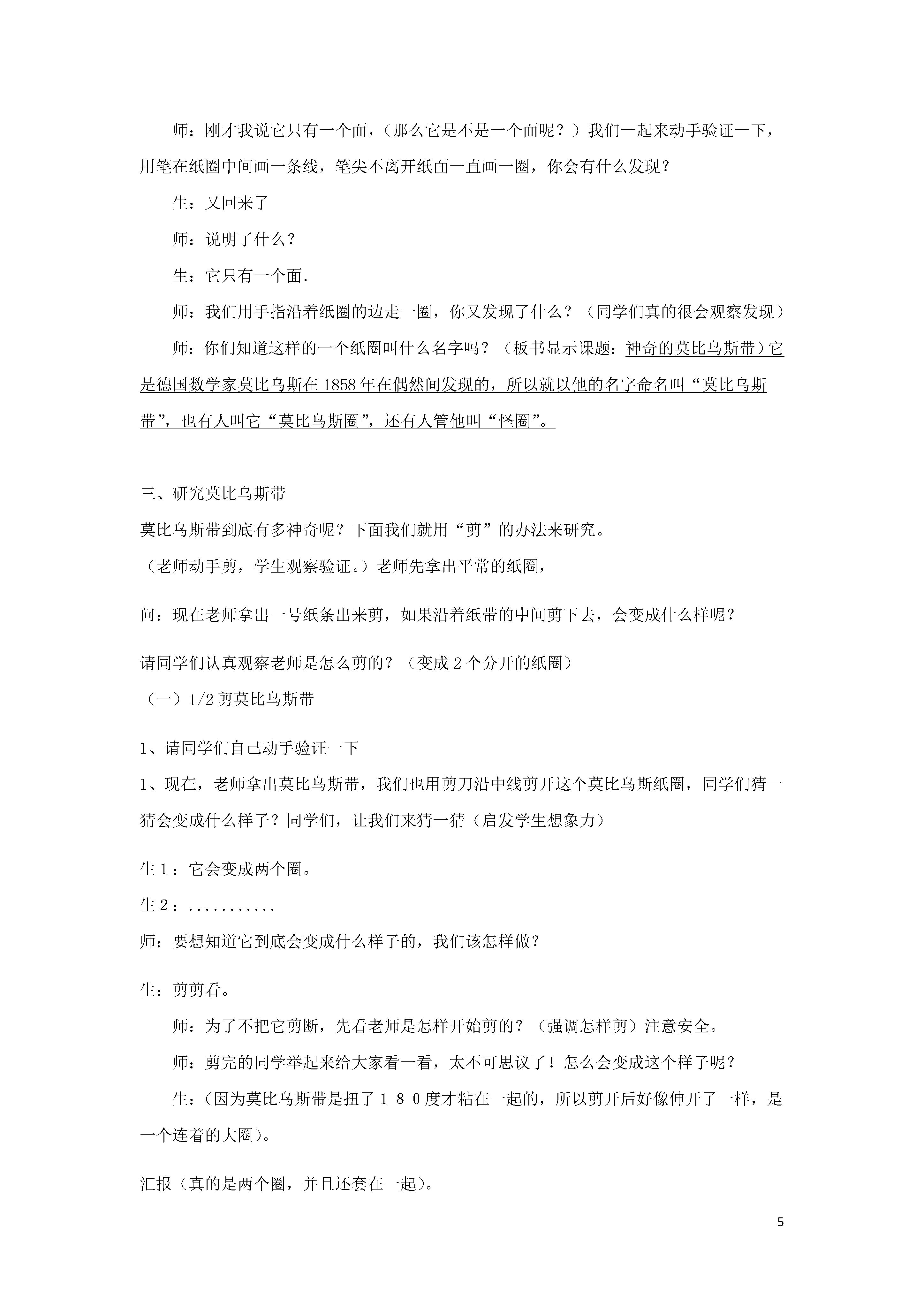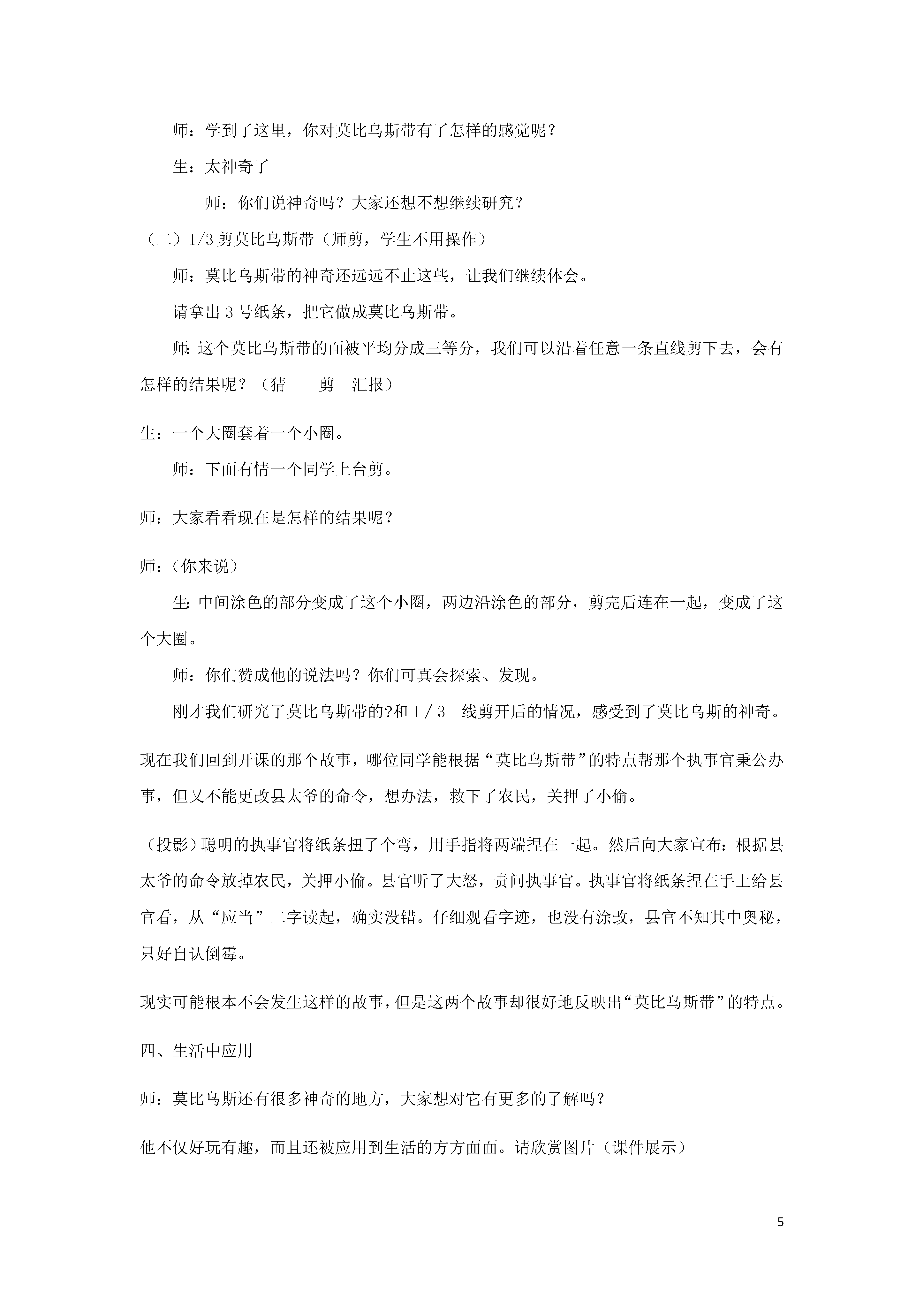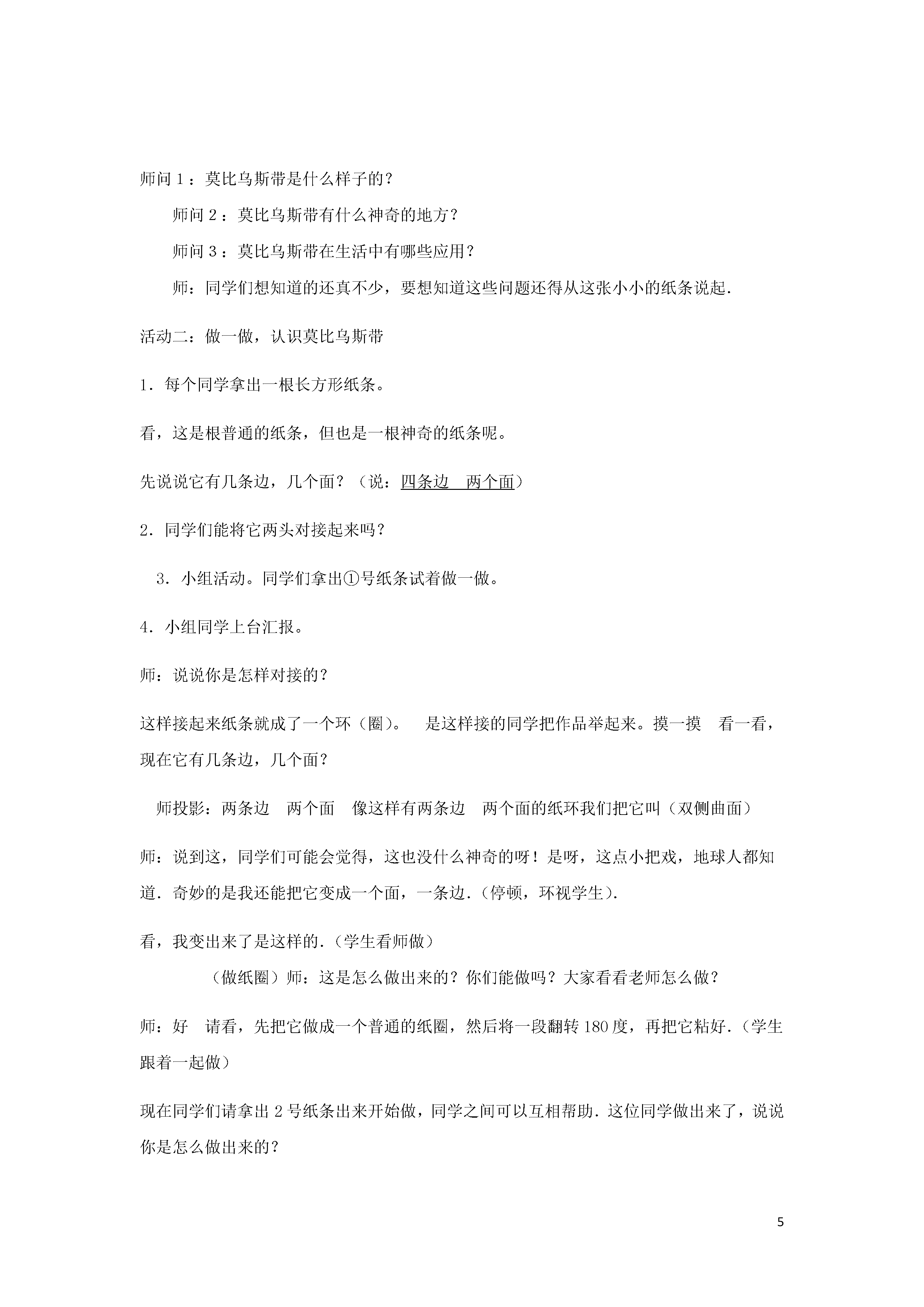 5第7课时:神奇的“莫比乌斯带”教学目标1.让学生认识“莫比乌斯带”,学会将长方形纸条制成莫比乌斯带。2.引导学生通过思考操作发现并验证“莫比乌斯带”的特征,培养学生大胆猜测、勇于探究的求索精神。3.在莫比乌斯带魔术般的变化中感受数学的无穷魅力,拓展数学视野,进一步激发学生学习数学的兴趣,培养学生良好的数学情感。重点让学生认识“莫比乌斯带”,学会将长方形纸条制成莫比乌斯带。难点引导学生通过思考操作发现并验证“莫比乌斯带”的特征,培养学生大胆猜测、勇于探究的求索精神。教具准备剪刀,双面胶、彩笔长方形纸条教学过程活动一:听一听古代故事:师:给同学们讲一个故事想听吗?从前有一个小偷,偷了一位很老实的农民的东西,并被当场抓获,人们将小偷送到县衙,县官发现小偷正是自己的儿子。于是他在一张纸条的正面写上:小偷应当放掉,在纸的反面写上:农民应当关押。县官将纸条交给执行官,由他去办理。问:他这样做合理吗?接着讲:执行官他要秉公办事,但又不能更改县太爷的命令。聪明的执行官想了一个巧妙的办法,救下了农民,关押了小偷。同学们想知道他用了一个什么巧妙的办法吗?学完这节课之后,我们就能知道了。出示课题。这节课我们就一起来学习、探究《神奇的莫比乌斯带》。(课件显示)那么看了这个课题你们有什么想法吗?师问1:莫比乌斯带是什么样子的?师问2:莫比乌斯带有什么神奇的地方?师问3:莫比乌斯带在生活中有哪些应用?师:同学们想知道的还真不少,要想知道这些问题还得从这张小小的纸条说起.活动二:做一做,认识莫比乌斯带1.每个同学拿出一根长方形纸条。看,这是根普通的纸条,但也是一根神奇的纸条呢。先说说它有几条边,几个面?(说:四条边两个面)2.同学们能将它两头对接起来吗?3.小组活动。同学们拿出①号纸条试着做一做。4.小组同学上台汇报。师:说说你是怎样对接的?这样接起来纸条就成了一个环(圈)。是这样接的同学把作品举起来。摸一摸看一看,现在它有几条边,几个面?师投影:两条边两个面像这样有两条边两个面的纸环我们把它叫(双侧曲面)师:说到这,同学们可能会觉得,这也没什么神奇的呀!是呀,这点小把戏,地球人都知道.奇妙的是我还能把它变成一个面,一条边.(停顿,环视学生).看,我变出来了是这样的.(学生看师做)(做纸圈)师:这是怎么做出来的?你们能做吗?大家看看老师怎么做?师:好请看,先把它做成一个普通的纸圈,然后将一段翻转180度,再把它粘好.(学生跟着一起做)现在同学们请拿出2号纸条出来开始做,同学之间可以互相帮助.这位同学做出来了,说说你是怎么做出来的?师:刚才我说它只有一个面,(那么它是不是一个面呢?)我们一起来动手验证一下,用笔在纸圈中间画一条线,笔尖不离开纸面一直画一圈,你会有什么发现?生:又回来了师:说明了什么?生:它只有一个面.师:我们用手指沿着纸圈的边走一圈,你又发现了什么?(同学们真的很会观察发现)师:你们知道这样的一个纸圈叫什么名字吗?(板书显示课题:神奇的莫比乌斯带)它是德国数学家莫比乌斯在1858年在偶然间发现的,所以就以他的名字命名叫“莫比乌斯带”,也有人叫它“莫比乌斯圈”,还有人管他叫“怪圈”。三、研究莫比乌斯带莫比乌斯带到底有多神奇呢?下面我们就用“剪”的办法来研究。(老师动手剪,学生观察验证。)老师先拿出平常的纸圈,问:现在老师拿出一号纸条出来剪,如果沿着纸带的中间剪下去,会变成什么样呢?请同学们认真观察老师是怎么剪的?(变成2个分开的纸圈)(一)1/2剪莫比乌斯带1、请同学们自己动手验证一下1、现在,老师拿出莫比乌斯带,我们也用剪刀沿中线剪开这个莫比乌斯纸圈,同学们猜一猜会变成什么样子?同学们,让我们来猜一猜(启发学生想象力)生1:它会变成两个圈。生2:...........师:要想知道它到底会变成什么样子的,我们该怎样做?生:剪剪看。师:为了不把它剪断,先看老师是怎样开始剪的?(强调怎样剪)注意安全。师:剪完的同学举起来给大家看一看,太不可思议了!怎么会变成这个样子呢?生:(因为莫比乌斯带是扭了180度才粘在一起的,所以剪开后好像伸开了一样,是一个连着的大圈)。汇报(真的是两个圈,并且还套在一起)。师:学到了这里,你对莫比乌斯带有了怎样的感觉呢?生:太神奇了师:你们说神奇吗?大家还想不想继续研究?(二)1/3剪莫比乌斯带(师剪,学生不用操作)师:莫比乌斯带的神奇还远远不止这些,让我们继续体会。请拿出3号纸条,把它做成莫比乌斯带。师:这个莫比乌斯带的面被平均分成三等分,我们可以沿着任意一条直线剪下去,会有怎样的结果呢?(猜剪汇报)生:一个大圈套着一个小圈。师:下面有情一个同学上台剪。师:大家看看现在是怎样的结果呢?师: