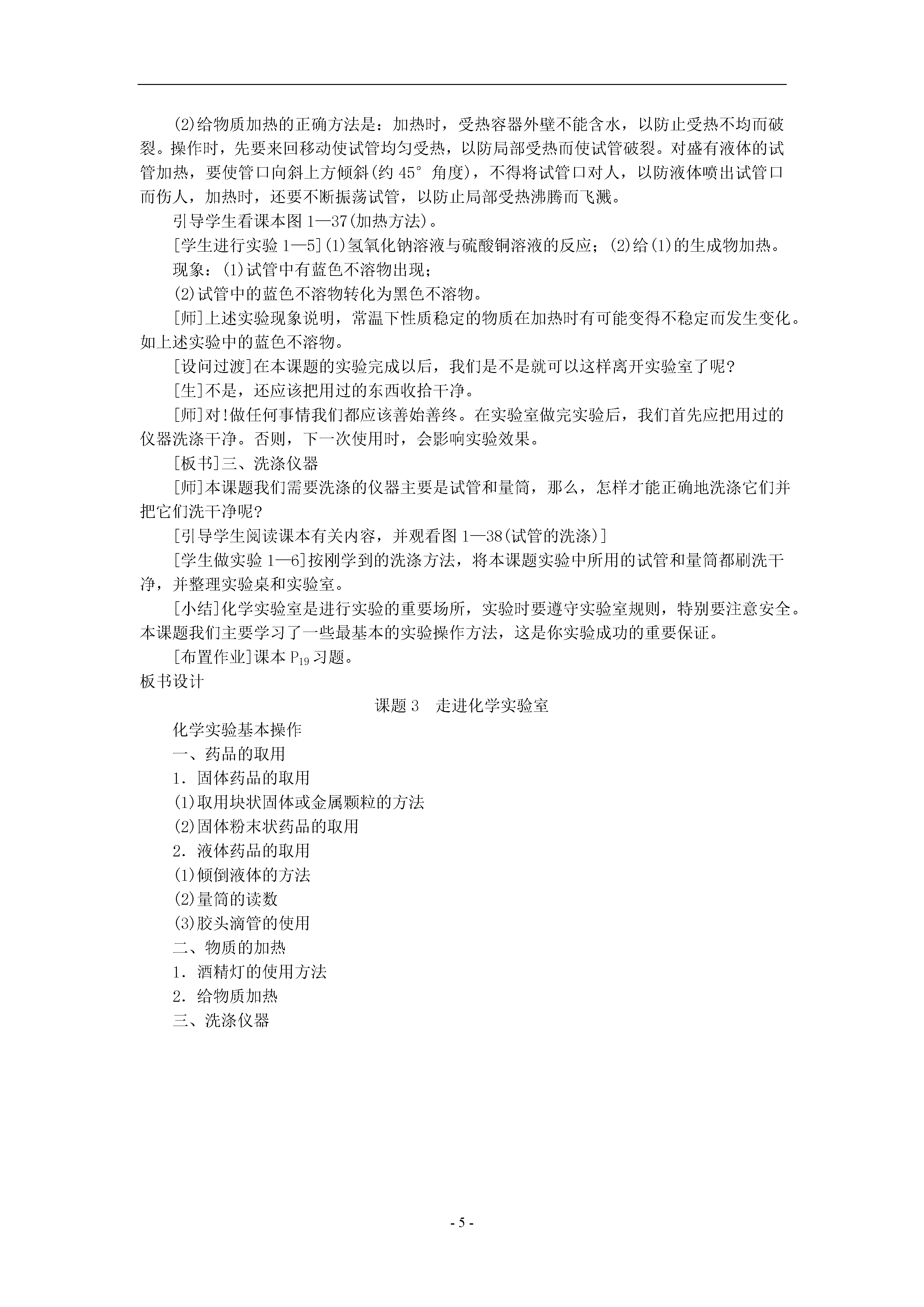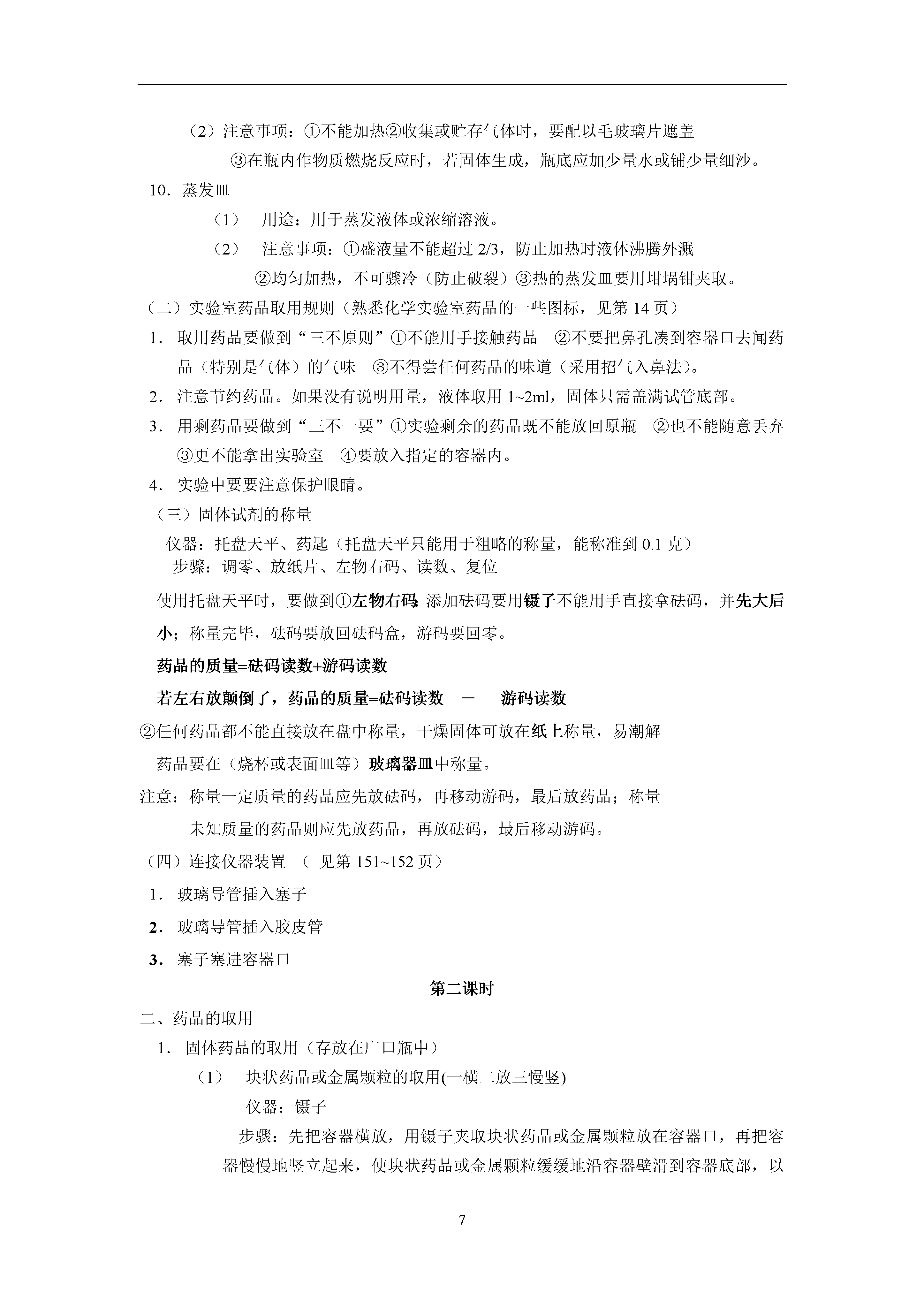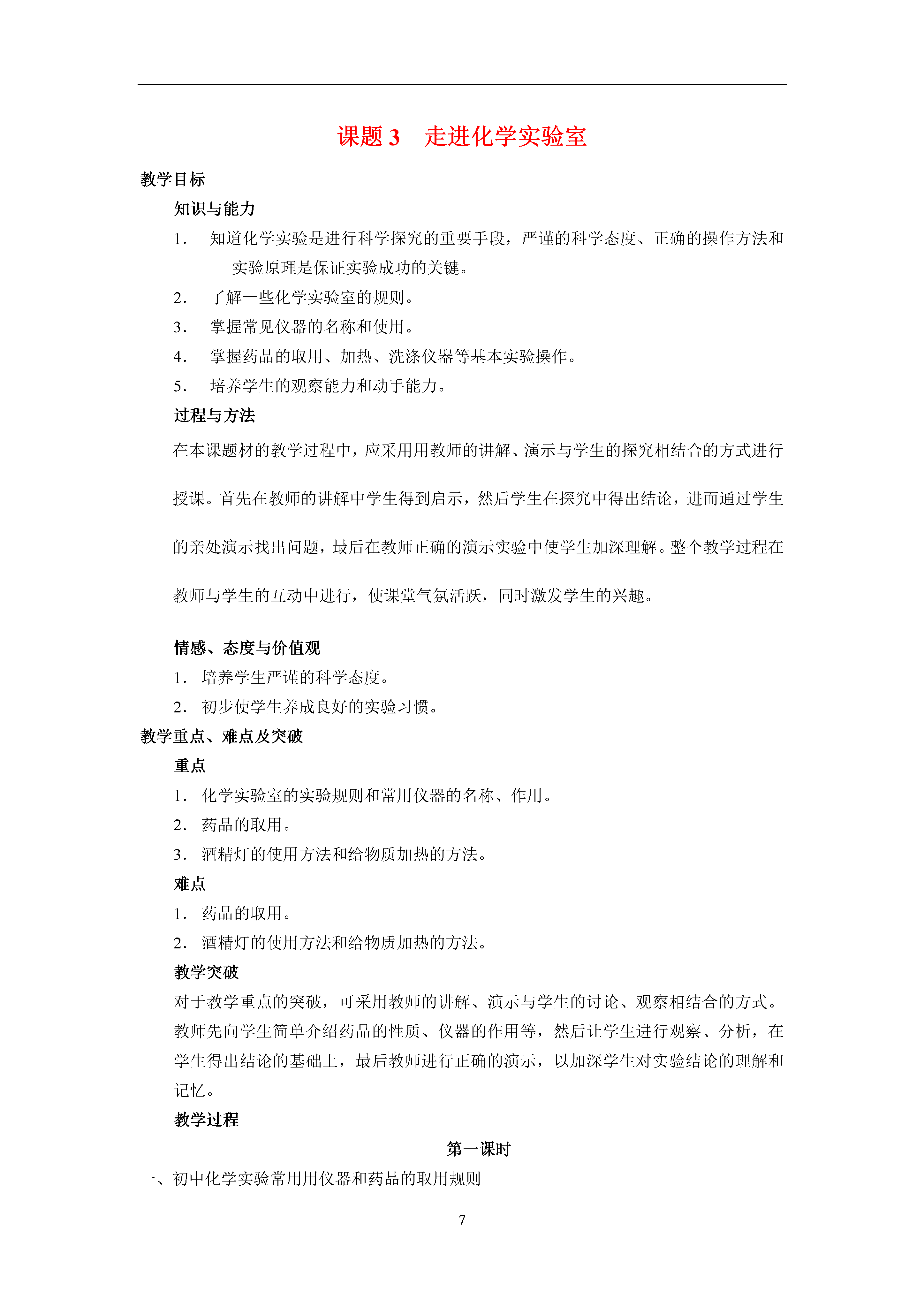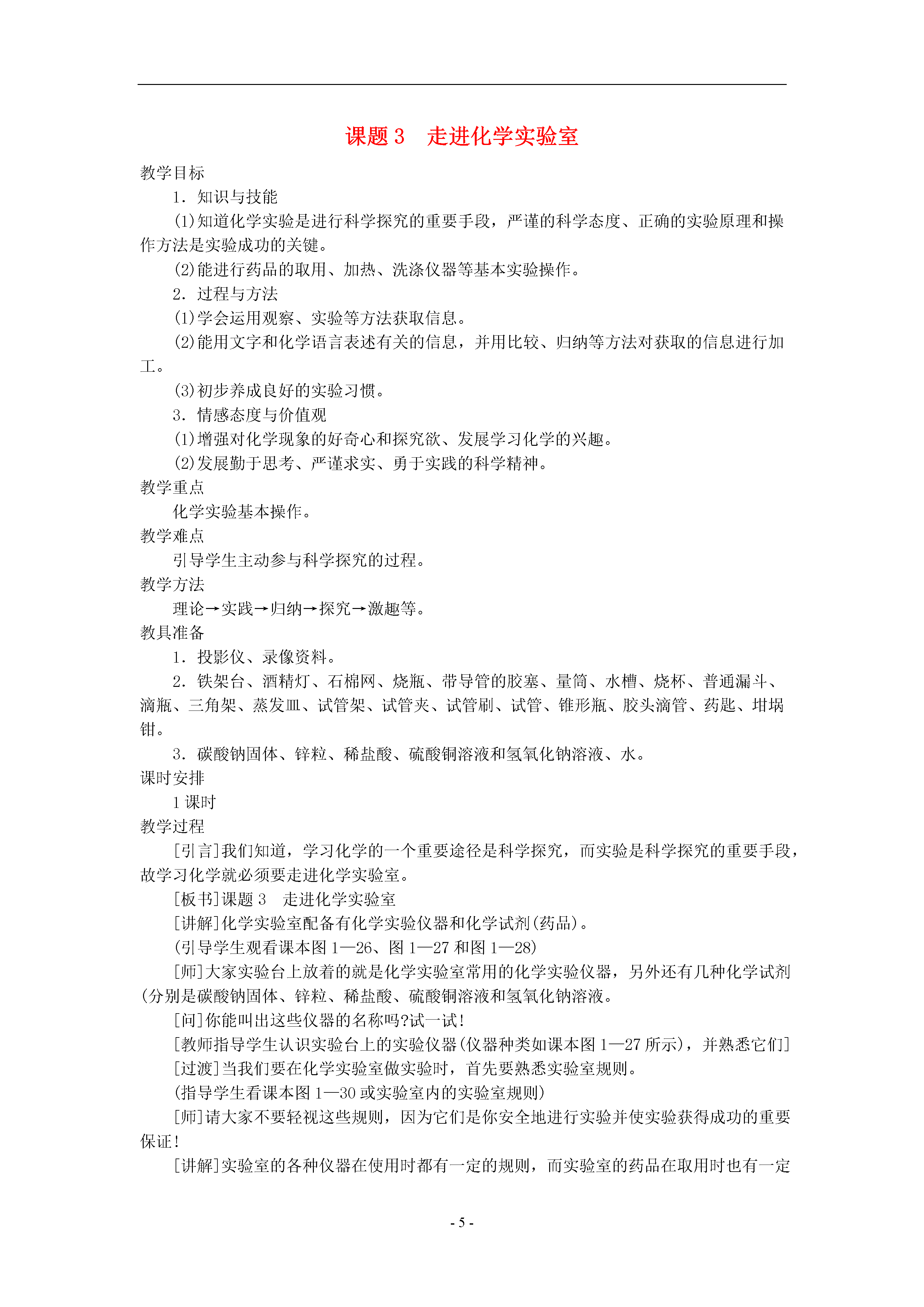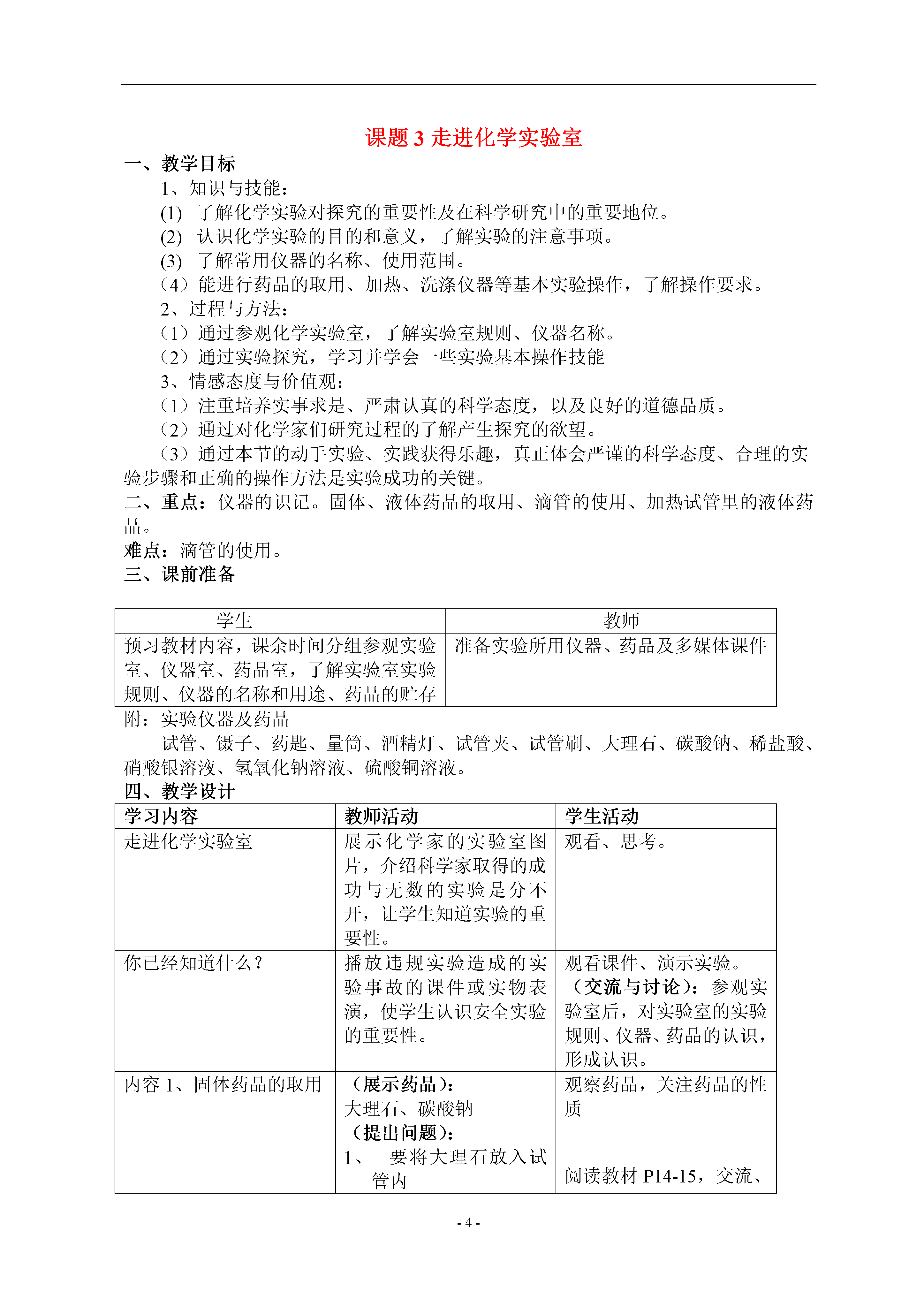 7课题3走进化学实验室教学目标知识与能力知道化学实验是进行科学探究的重要手段,严谨的科学态度、正确的操作方法和实验原理是保证实验成功的关键。了解一些化学实验室的规则。掌握常见仪器的名称和使用。掌握药品的取用、加热、洗涤仪器等基本实验操作。培养学生的观察能力和动手能力。过程与方法在本课题材的教学过程中,应采用用教师的讲解、演示与学生的探究相结合的方式进行授课。首先在教师的讲解中学生得到启示,然后学生在探究中得出结论,进而通过学生的亲处演示找出问题,最后在教师正确的演示实验中使学生加深理解。整个教学过程在教师与学生的互动中进行,使课堂气氛活跃,同时激发学生的兴趣。情感、态度与价值观培养学生严谨的科学态度。初步使学生养成良好的实验习惯。教学重点、难点及突破重点化学实验室的实验规则和常用仪器的名称、作用。药品的取用。酒精灯的使用方法和给物质加热的方法。难点药品的取用。酒精灯的使用方法和给物质加热的方法。教学突破对于教学重点的突破,可采用教师的讲解、演示与学生的讨论、观察相结合的方式。教师先向学生简单介绍药品的性质、仪器的作用等,然后让学生进行观察、分析,在学生得出结论的基础上,最后教师进行正确的演示,以加深学生对实验结论的理解和记忆。教学过程第一课时一、初中化学实验常用用仪器和药品的取用规则(一)初中化学实验常用用仪器反应容器可直接受热的:试管、蒸发皿、燃烧匙、坩埚等能间接受热的:烧杯、烧瓶(加热时,需加石棉网)常存放药品的仪器:广口瓶(固体)、细口瓶(液体)、滴瓶(少量液体)、集气瓶(气体)用加热仪器:酒精灯计量仪器:托盘天平(称量)、量筒(量体积)仪分离仪器:漏斗取用仪器:药匙(粉末或小晶粒状)、镊子(块状或较大颗粒)、胶头器滴管(少量液体)夹持仪器:试管夹、铁架台(带铁夹、铁圈)、坩埚钳其他仪器:长颈漏斗、石棉网、玻璃棒、试管刷、水槽试管用途:a、在常温或加热时,用作少量试剂的反应容器。b、溶解少量固体c、收集少量气体注意事项:a、加热时外壁必须干燥,不能骤热骤冷,一般要先均匀受热,然后才能集中受热,防止试管受热不均而破裂。b、加热时,试管要先用铁夹夹持固定在铁架台上(短时间加热也可用试管夹夹持)。c、加热固体时,试管口要略向下倾斜,且未冷前试管不能直立,避免管口冷凝水倒流使试管炸裂。d、加热液体时,盛液量一般不超过试管容积的1/3(防止液体受热溢出),使试管与桌面约成45°的角度(增大受热面积,防止暴沸),管口不能对着自己或别人(防止液体喷出伤人)。试管夹用途:夹持试管注意事项:①从底部往上套,夹在距管口1/3处(防止杂质落入试管)②不要把拇指按在试管夹短柄上。玻璃棒(1)用途:搅拌、引流(过滤或转移液体)。(2)注意事项:①搅拌不要碰撞容器壁②用后及时擦洗干净酒精灯(1)用途:化学实验室常用的加热仪器(2)注意事项:①使用时先将灯放稳,灯帽取下直立在灯的右侧,以防止滚动和便于取用。②使用前检查并调整灯芯(保证更地燃烧,火焰保持较高的的温度)。③灯体内的酒精不可超过灯容积的3/4,也不应少于1/4(酒精过多,在加热或移动时易溢出;太少,加热酒精蒸气易引起爆炸)。④禁止向燃着的酒精灯内添加酒精(防止酒精洒出引起火灾)⑤禁止用燃着的酒精灯直接点燃另一酒精灯,应用火柴从侧面点燃酒精灯(防止酒精洒出引起火灾)。⑥应用外焰加热(外焰温度最高)。⑦用完酒精灯后,必须用灯帽盖灭,不可用嘴吹熄。(防止将火焰沿着灯颈吹入灯内)⑧用完后,立即盖上灯帽(防止酒精挥发和灯芯吸水而不易点燃)。⑨不要碰倒酒精灯,若有酒精洒到桌面并燃烧起来,应立即用湿布扑盖或撒沙土扑灭火焰,不能用水冲,以免火势蔓延。[演示实验1~4]胶头滴管、滴瓶用途:①胶头滴管用于吸取和滴加少量液体。②滴瓶用于盛放少量液体药品。注意事项:①先排空再吸液②悬空垂直放在试管口上方,以免沾污染滴管③吸取液体后,应保持胶头在上,不能向下或平放,防止液体倒流,沾污试剂或腐蚀胶头;④除吸同一试剂外,用过后应立即洗净,再去吸取其他药品(防止试剂相互污染。⑤滴瓶上的滴管与瓶配套使用,滴液后应立即插入原瓶内,不得弄脏,也不必用水冲冼。铁架台(包括铁夹和铁圈)用途:用于固定和支持各种仪器,一般常用于过滤、加热等实验操作。注意事项:a、铁夹和十字夹缺口位置要向上,以便于操作和保证安全。b、重物要固定在铁架台底座大面一侧,使重心落在底座内。烧杯用途:用于溶解或配制溶液和较大量试剂的反应容器。注意事项:受热时外壁要干燥,并放在石棉网上使其受热均匀(防止受热不均使烧杯炸裂),加液量一般不超过容积的1/3(防止加热沸腾使液体外溢)。量筒