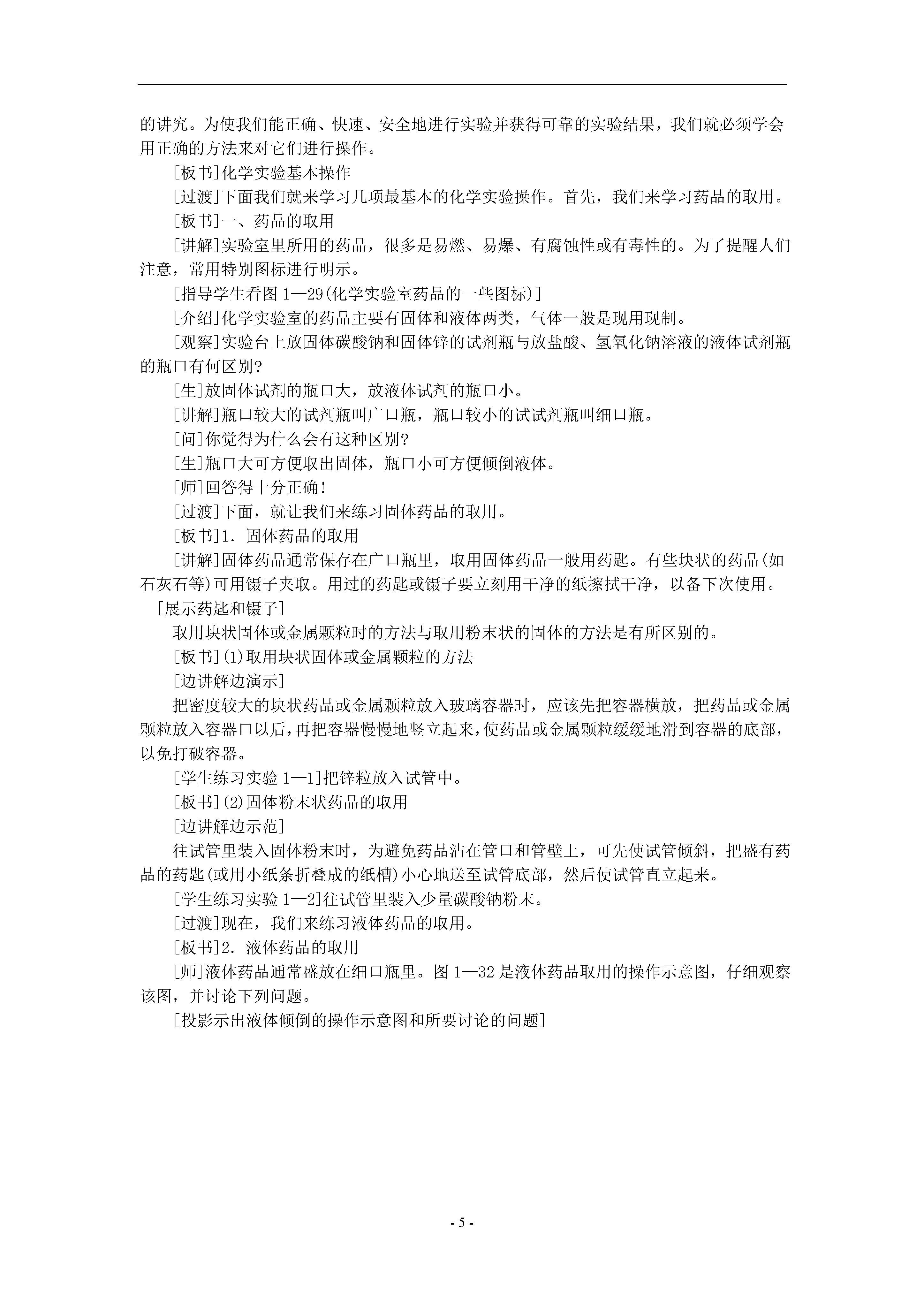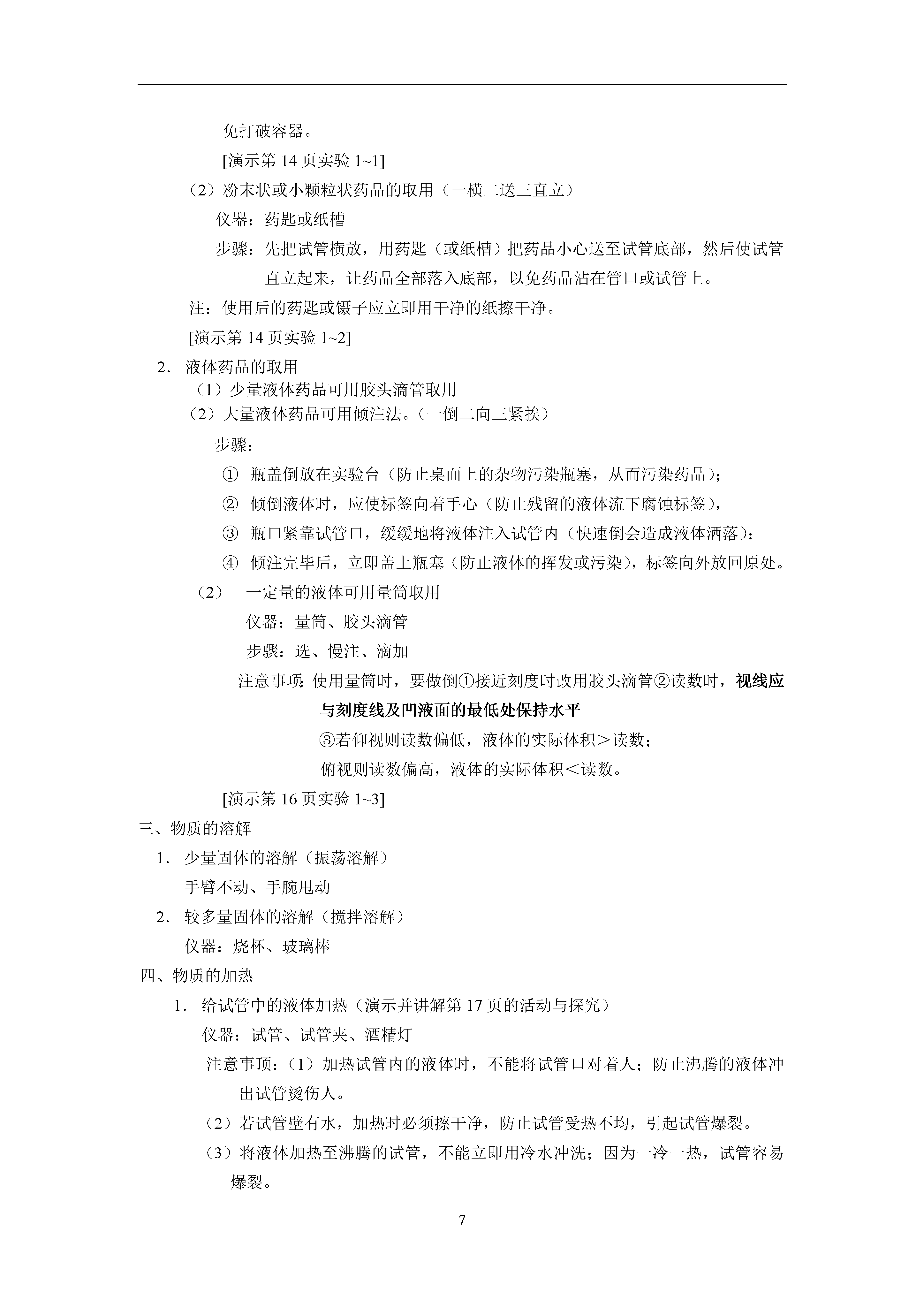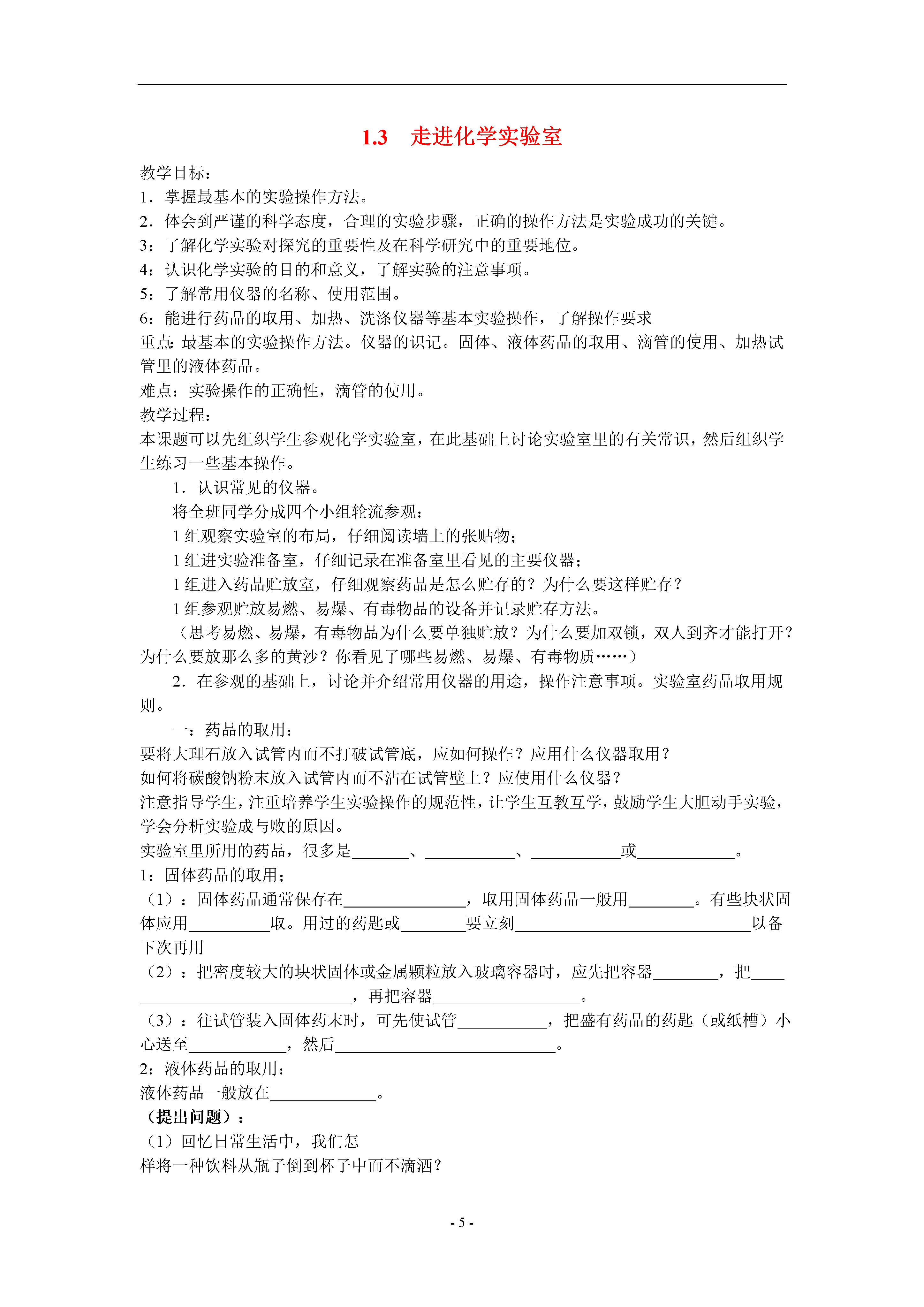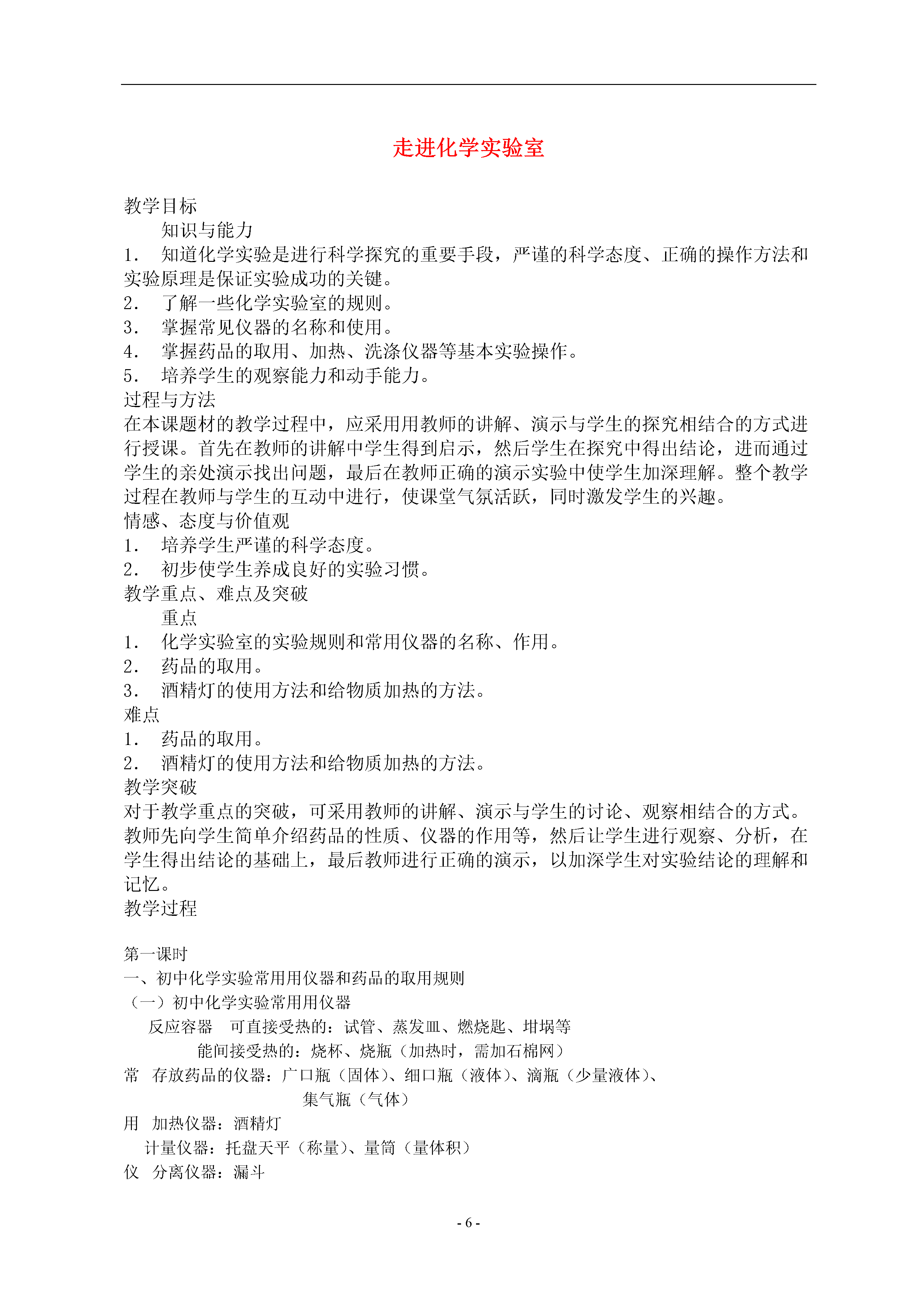 7课题3走进化学实验室教学目标知识与能力知道化学实验是进行科学探究的重要手段,严谨的科学态度、正确的操作方法和实验原理是保证实验成功的关键。了解一些化学实验室的规则。掌握常见仪器的名称和使用。掌握药品的取用、加热、洗涤仪器等基本实验操作。培养学生的观察能力和动手能力。过程与方法在本课题材的教学过程中,应采用用教师的讲解、演示与学生的探究相结合的方式进行授课。首先在教师的讲解中学生得到启示,然后学生在探究中得出结论,进而通过学生的亲处演示找出问题,最后在教师正确的演示实验中使学生加深理解。整个教学过程在教师与学生的互动中进行,使课堂气氛活跃,同时激发学生的兴趣。情感、态度与价值观培养学生严谨的科学态度。初步使学生养成良好的实验习惯。教学重点、难点及突破重点化学实验室的实验规则和常用仪器的名称、作用。药品的取用。酒精灯的使用方法和给物质加热的方法。难点药品的取用。酒精灯的使用方法和给物质加热的方法。教学突破对于教学重点的突破,可采用教师的讲解、演示与学生的讨论、观察相结合的方式。教师先向学生简单介绍药品的性质、仪器的作用等,然后让学生进行观察、分析,在学生得出结论的基础上,最后教师进行正确的演示,以加深学生对实验结论的理解和记忆。教学过程第一课时一、初中化学实验常用用仪器和药品的取用规则(一)初中化学实验常用用仪器反应容器可直接受热的:试管、蒸发皿、燃烧匙、坩埚等能间接受热的:烧杯、烧瓶(加热时,需加石棉网)常存放药品的仪器:广口瓶(固体)、细口瓶(液体)、滴瓶(少量液体)、集气瓶(气体)用加热仪器:酒精灯计量仪器:托盘天平(称量)、量筒(量体积)仪分离仪器:漏斗取用仪器:药匙(粉末或小晶粒状)、镊子(块状或较大颗粒)、胶头器滴管(少量液体)夹持仪器:试管夹、铁架台(带铁夹、铁圈)、坩埚钳其他仪器:长颈漏斗、石棉网、玻璃棒、试管刷、水槽试管用途:a、在常温或加热时,用作少量试剂的反应容器。b、溶解少量固体c、收集少量气体注意事项:a、加热时外壁必须干燥,不能骤热骤冷,一般要先均匀受热,然后才能集中受热,防止试管受热不均而破裂。b、加热时,试管要先用铁夹夹持固定在铁架台上(短时间加热也可用试管夹夹持)。c、加热固体时,试管口要略向下倾斜,且未冷前试管不能直立,避免管口冷凝水倒流使试管炸裂。d、加热液体时,盛液量一般不超过试管容积的1/3(防止液体受热溢出),使试管与桌面约成45°的角度(增大受热面积,防止暴沸),管口不能对着自己或别人(防止液体喷出伤人)。试管夹用途:夹持试管注意事项:①从底部往上套,夹在距管口1/3处(防止杂质落入试管)②不要把拇指按在试管夹短柄上。玻璃棒(1)用途:搅拌、引流(过滤或转移液体)。(2)注意事项:①搅拌不要碰撞容器壁②用后及时擦洗干净酒精灯(1)用途:化学实验室常用的加热仪器(2)注意事项:①使用时先将灯放稳,灯帽取下直立在灯的右侧,以防止滚动和便于取用。②使用前检查并调整灯芯(保证更地燃烧,火焰保持较高的的温度)。③灯体内的酒精不可超过灯容积的3/4,也不应少于1/4(酒精过多,在加热或移动时易溢出;太少,加热酒精蒸气易引起爆炸)。④禁止向燃着的酒精灯内添加酒精(防止酒精洒出引起火灾)⑤禁止用燃着的酒精灯直接点燃另一酒精灯,应用火柴从侧面点燃酒精灯(防止酒精洒出引起火灾)。⑥应用外焰加热(外焰温度最高)。⑦用完酒精灯后,必须用灯帽盖灭,不可用嘴吹熄。(防止将火焰沿着灯颈吹入灯内)⑧用完后,立即盖上灯帽(防止酒精挥发和灯芯吸水而不易点燃)。⑨不要碰倒酒精灯,若有酒精洒到桌面并燃烧起来,应立即用湿布扑盖或撒沙土扑灭火焰,不能用水冲,以免火势蔓延。[演示实验1~4]胶头滴管、滴瓶用途:①胶头滴管用于吸取和滴加少量液体。②滴瓶用于盛放少量液体药品。注意事项:①先排空再吸液②悬空垂直放在试管口上方,以免沾污染滴管③吸取液体后,应保持胶头在上,不能向下或平放,防止液体倒流,沾污试剂或腐蚀胶头;④除吸同一试剂外,用过后应立即洗净,再去吸取其他药品(防止试剂相互污染。⑤滴瓶上的滴管与瓶配套使用,滴液后应立即插入原瓶内,不得弄脏,也不必用水冲冼。铁架台(包括铁夹和铁圈)用途:用于固定和支持各种仪器,一般常用于过滤、加热等实验操作。注意事项:a、铁夹和十字夹缺口位置要向上,以便于操作和保证安全。b、重物要固定在铁架台底座大面一侧,使重心落在底座内。烧杯用途:用于溶解或配制溶液和较大量试剂的反应容器。注意事项:受热时外壁要干燥,并放在石棉网上使其受热均匀(防止受热不均使烧杯炸裂),加液量一般不超过容积的1/3(防止加热沸腾使液体外溢)。量筒