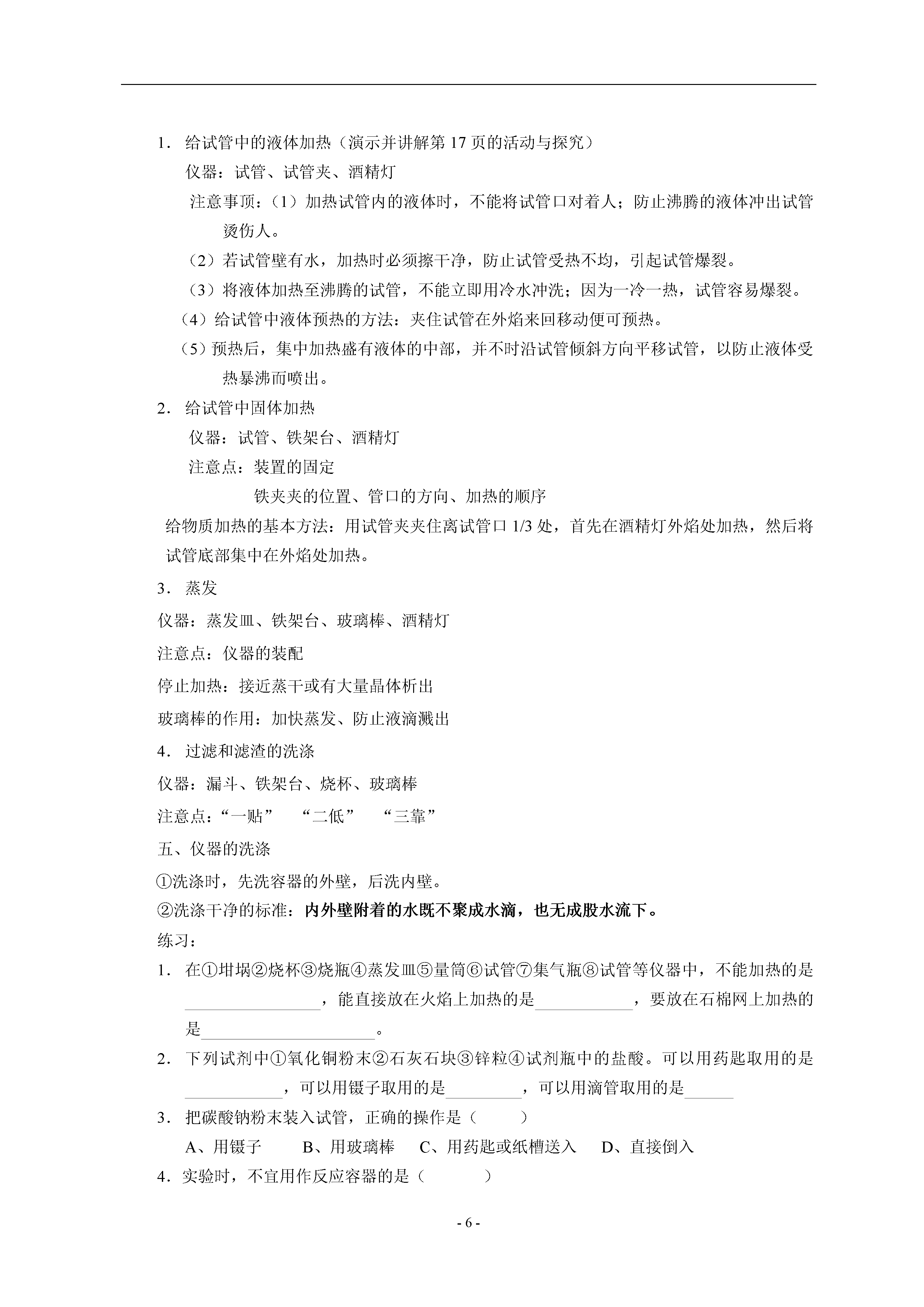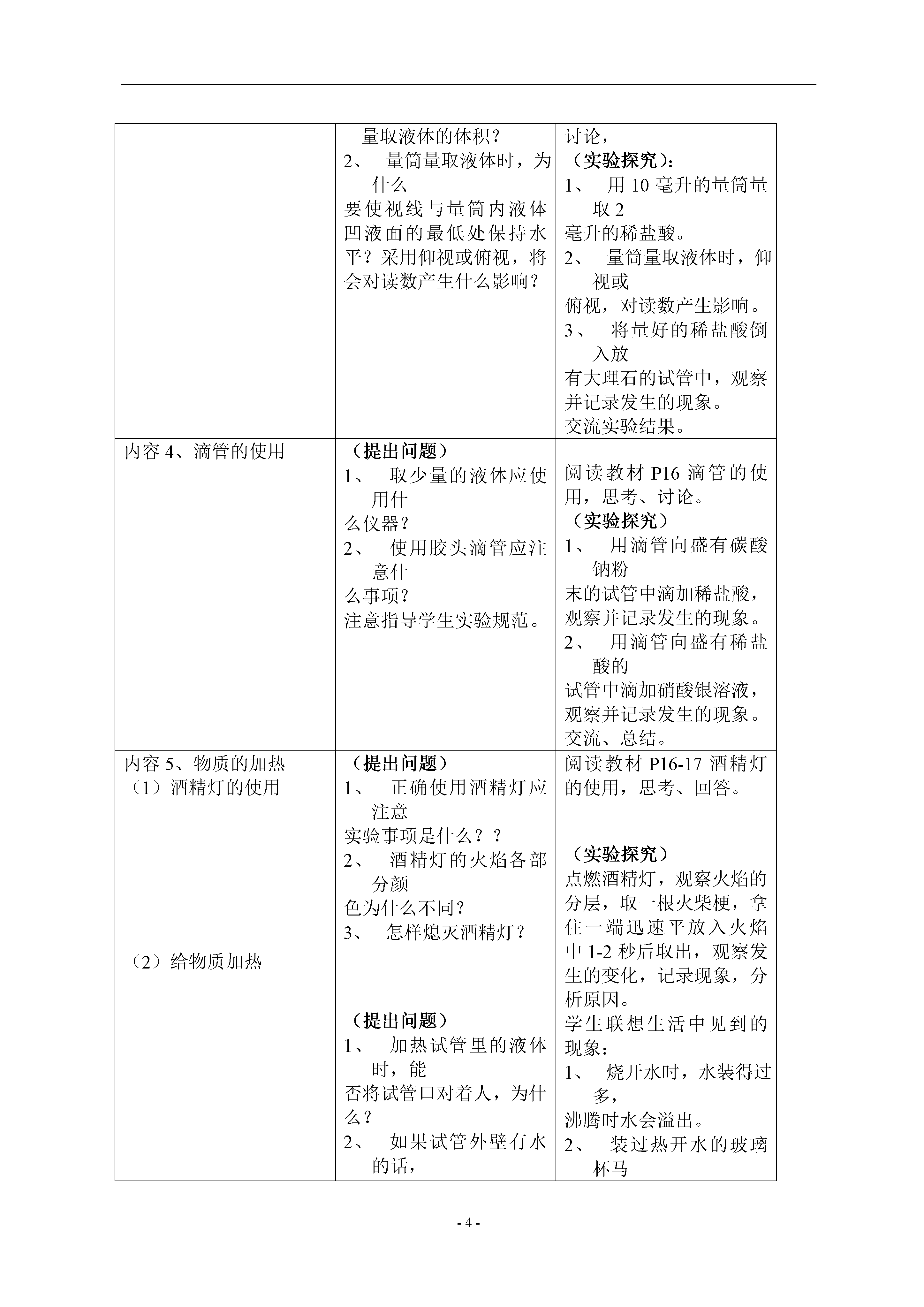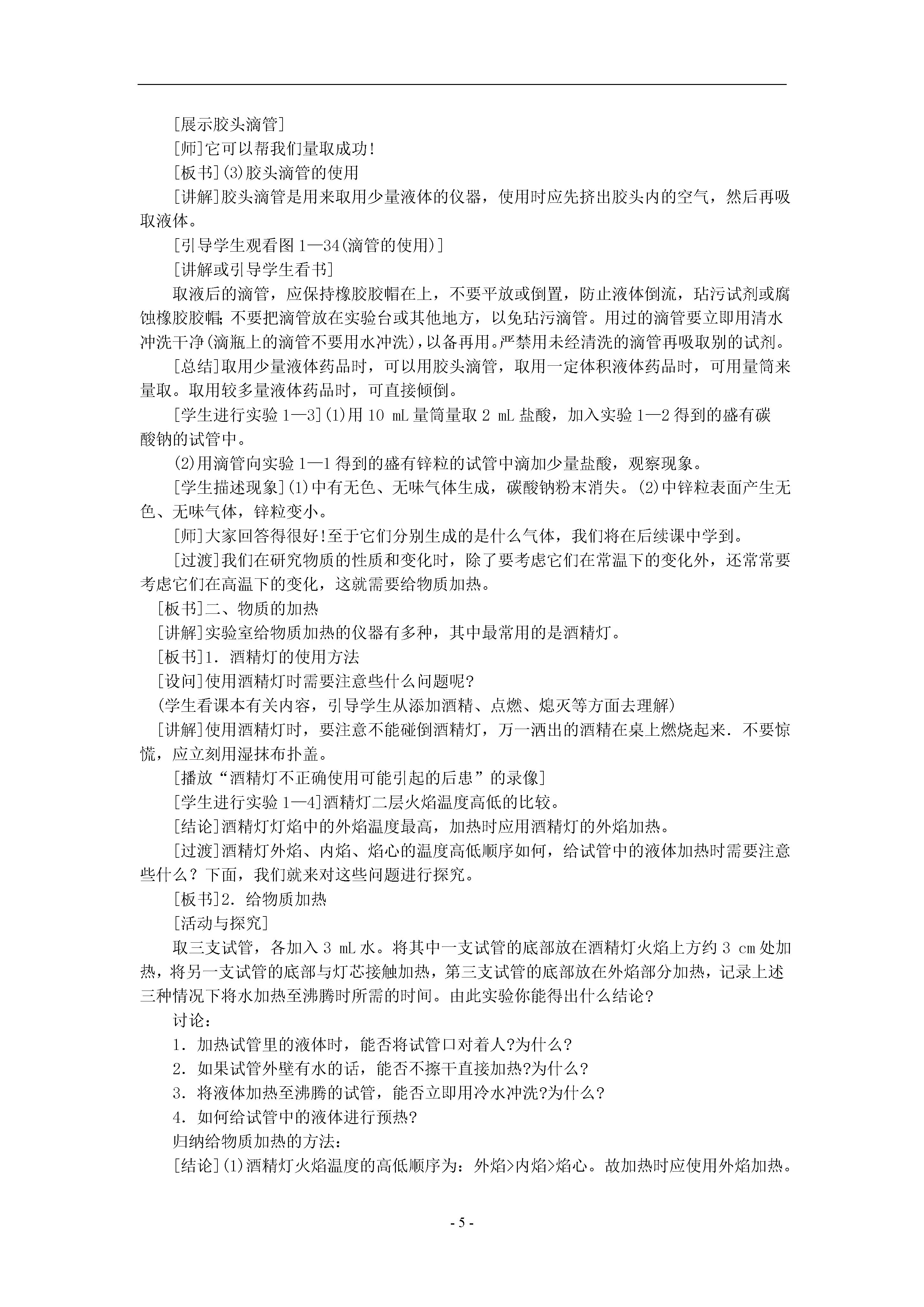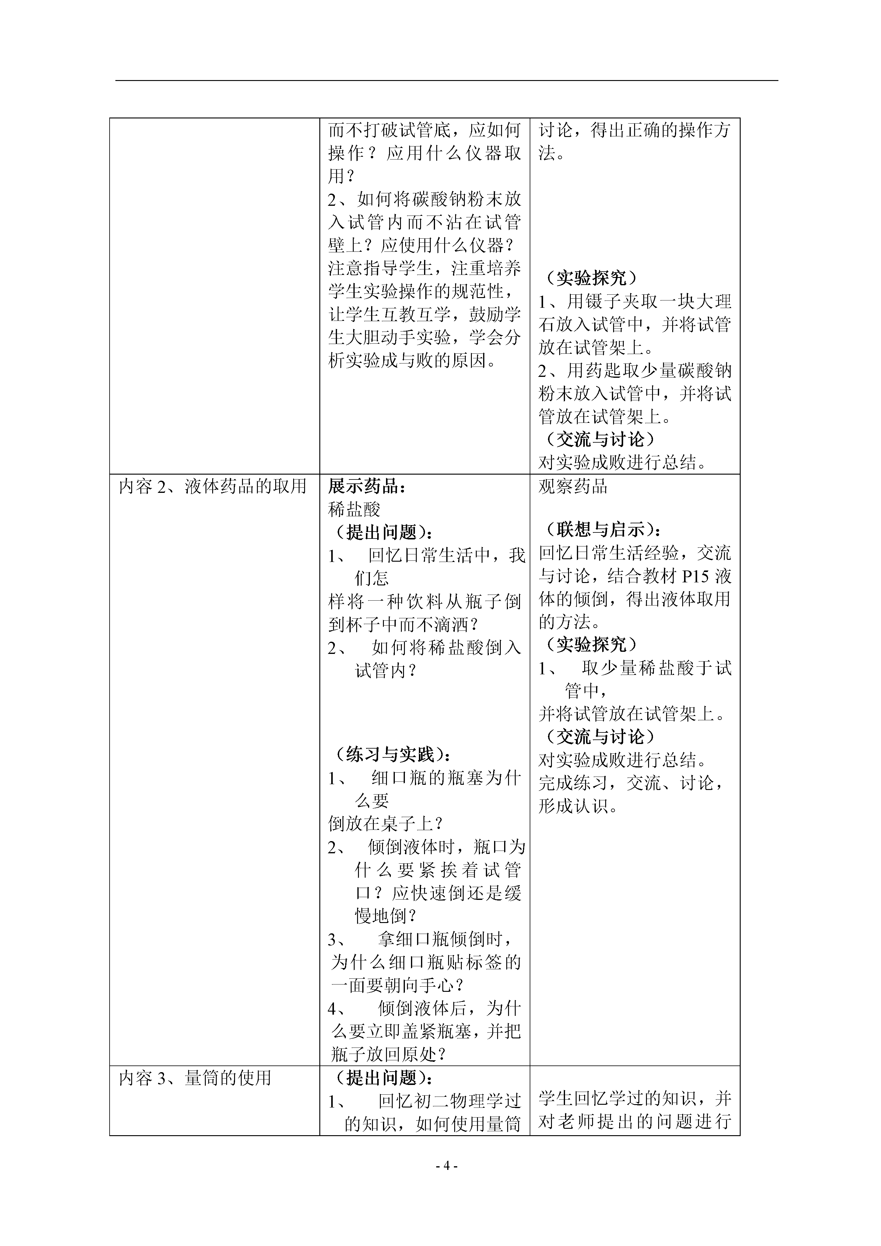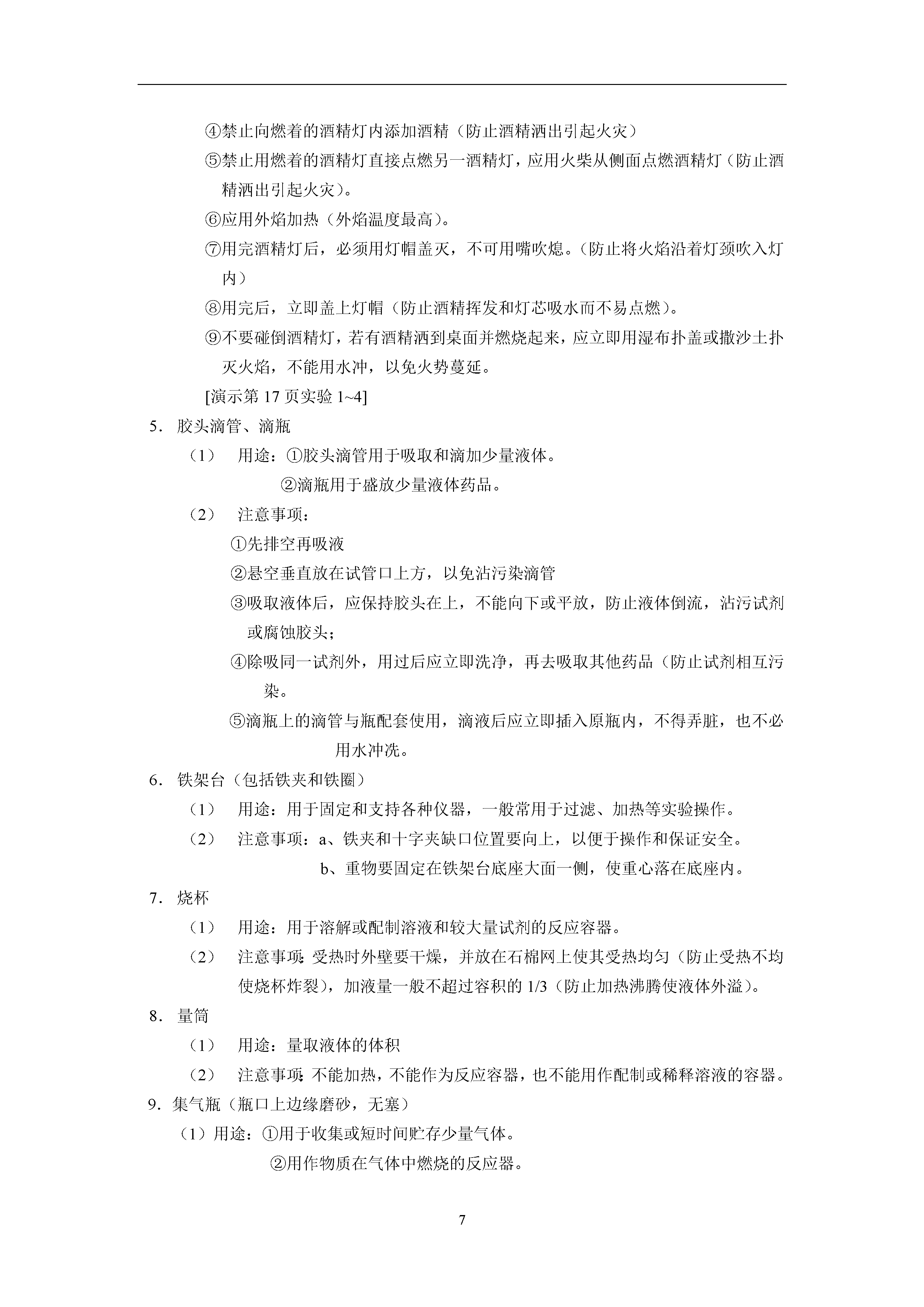 7课题3走进化学实验室教学目标知识与能力知道化学实验是进行科学探究的重要手段,严谨的科学态度、正确的操作方法和实验原理是保证实验成功的关键。了解一些化学实验室的规则。掌握常见仪器的名称和使用。掌握药品的取用、加热、洗涤仪器等基本实验操作。培养学生的观察能力和动手能力。过程与方法在本课题材的教学过程中,应采用用教师的讲解、演示与学生的探究相结合的方式进行授课。首先在教师的讲解中学生得到启示,然后学生在探究中得出结论,进而通过学生的亲处演示找出问题,最后在教师正确的演示实验中使学生加深理解。整个教学过程在教师与学生的互动中进行,使课堂气氛活跃,同时激发学生的兴趣。情感、态度与价值观培养学生严谨的科学态度。初步使学生养成良好的实验习惯。教学重点、难点及突破重点化学实验室的实验规则和常用仪器的名称、作用。药品的取用。酒精灯的使用方法和给物质加热的方法。难点药品的取用。酒精灯的使用方法和给物质加热的方法。教学突破对于教学重点的突破,可采用教师的讲解、演示与学生的讨论、观察相结合的方式。教师先向学生简单介绍药品的性质、仪器的作用等,然后让学生进行观察、分析,在学生得出结论的基础上,最后教师进行正确的演示,以加深学生对实验结论的理解和记忆。教学过程第一课时一、初中化学实验常用用仪器和药品的取用规则(一)初中化学实验常用用仪器反应容器可直接受热的:试管、蒸发皿、燃烧匙、坩埚等能间接受热的:烧杯、烧瓶(加热时,需加石棉网)常存放药品的仪器:广口瓶(固体)、细口瓶(液体)、滴瓶(少量液体)、集气瓶(气体)用加热仪器:酒精灯计量仪器:托盘天平(称量)、量筒(量体积)仪分离仪器:漏斗取用仪器:药匙(粉末或小晶粒状)、镊子(块状或较大颗粒)、胶头器滴管(少量液体)夹持仪器:试管夹、铁架台(带铁夹、铁圈)、坩埚钳其他仪器:长颈漏斗、石棉网、玻璃棒、试管刷、水槽试管用途:a、在常温或加热时,用作少量试剂的反应容器。b、溶解少量固体c、收集少量气体注意事项:a、加热时外壁必须干燥,不能骤热骤冷,一般要先均匀受热,然后才能集中受热,防止试管受热不均而破裂。b、加热时,试管要先用铁夹夹持固定在铁架台上(短时间加热也可用试管夹夹持)。c、加热固体时,试管口要略向下倾斜,且未冷前试管不能直立,避免管口冷凝水倒流使试管炸裂。d、加热液体时,盛液量一般不超过试管容积的1/3(防止液体受热溢出),使试管与桌面约成45°的角度(增大受热面积,防止暴沸),管口不能对着自己或别人(防止液体喷出伤人)。试管夹用途:夹持试管注意事项:①从底部往上套,夹在距管口1/3处(防止杂质落入试管)②不要把拇指按在试管夹短柄上。玻璃棒(1)用途:搅拌、引流(过滤或转移液体)。(2)注意事项:①搅拌不要碰撞容器壁②用后及时擦洗干净酒精灯(1)用途:化学实验室常用的加热仪器(2)注意事项:①使用时先将灯放稳,灯帽取下直立在灯的右侧,以防止滚动和便于取用。②使用前检查并调整灯芯(保证更地燃烧,火焰保持较高的的温度)。③灯体内的酒精不可超过灯容积的3/4,也不应少于1/4(酒精过多,在加热或移动时易溢出;太少,加热酒精蒸气易引起爆炸)。④禁止向燃着的酒精灯内添加酒精(防止酒精洒出引起火灾)⑤禁止用燃着的酒精灯直接点燃另一酒精灯,应用火柴从侧面点燃酒精灯(防止酒精洒出引起火灾)。⑥应用外焰加热(外焰温度最高)。⑦用完酒精灯后,必须用灯帽盖灭,不可用嘴吹熄。(防止将火焰沿着灯颈吹入灯内)⑧用完后,立即盖上灯帽(防止酒精挥发和灯芯吸水而不易点燃)。⑨不要碰倒酒精灯,若有酒精洒到桌面并燃烧起来,应立即用湿布扑盖或撒沙土扑灭火焰,不能用水冲,以免火势蔓延。[演示实验1~4]胶头滴管、滴瓶用途:①胶头滴管用于吸取和滴加少量液体。②滴瓶用于盛放少量液体药品。注意事项:①先排空再吸液②悬空垂直放在试管口上方,以免沾污染滴管③吸取液体后,应保持胶头在上,不能向下或平放,防止液体倒流,沾污试剂或腐蚀胶头;④除吸同一试剂外,用过后应立即洗净,再去吸取其他药品(防止试剂相互污染。⑤滴瓶上的滴管与瓶配套使用,滴液后应立即插入原瓶内,不得弄脏,也不必用水冲冼。铁架台(包括铁夹和铁圈)用途:用于固定和支持各种仪器,一般常用于过滤、加热等实验操作。注意事项:a、铁夹和十字夹缺口位置要向上,以便于操作和保证安全。b、重物要固定在铁架台底座大面一侧,使重心落在底座内。烧杯用途:用于溶解或配制溶液和较大量试剂的反应容器。注意事项:受热时外壁要干燥,并放在石棉网上使其受热均匀(防止受热不均使烧杯炸裂),加液量一般不超过容积的1/3(防止加热沸腾使液体外溢)。量筒