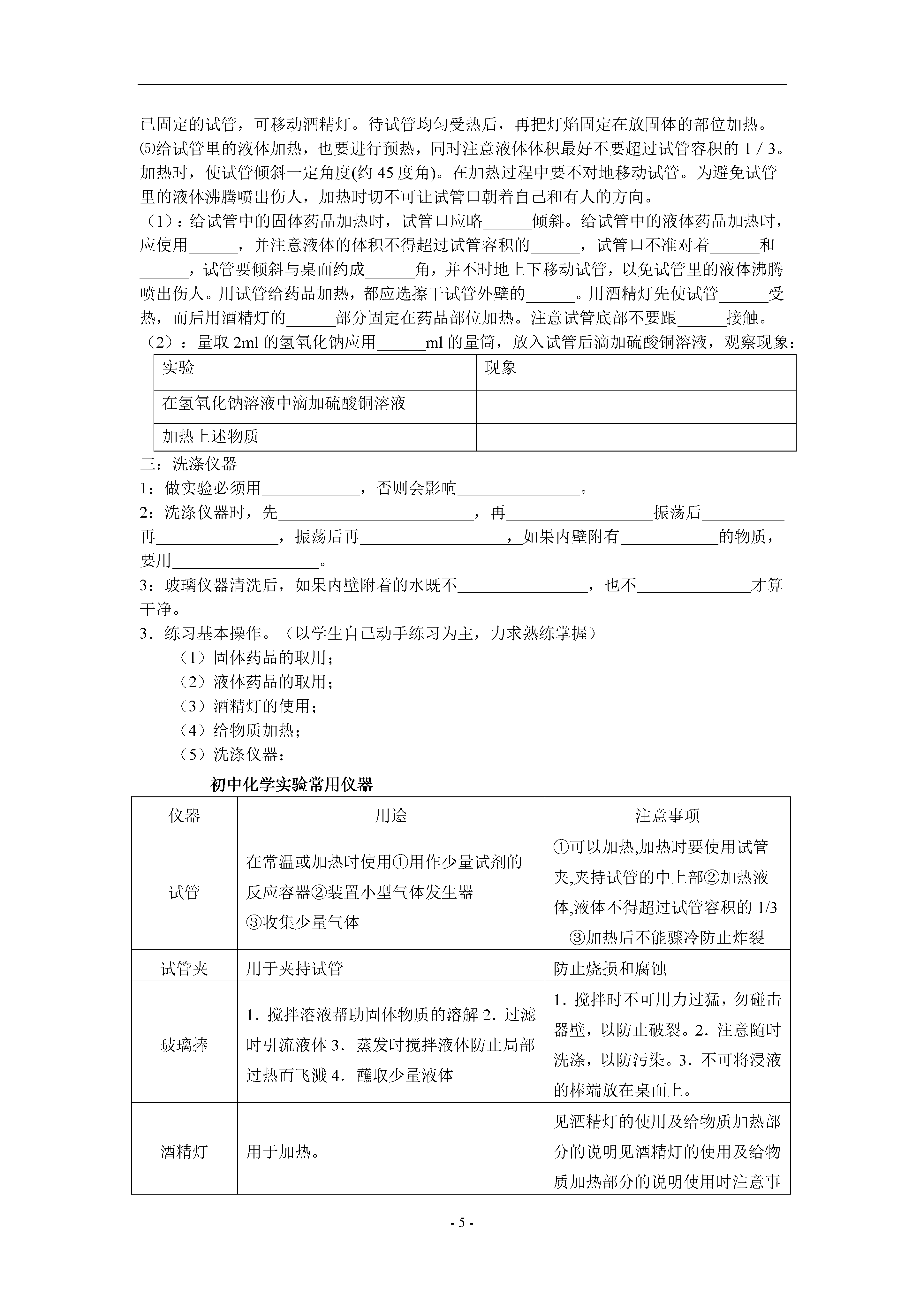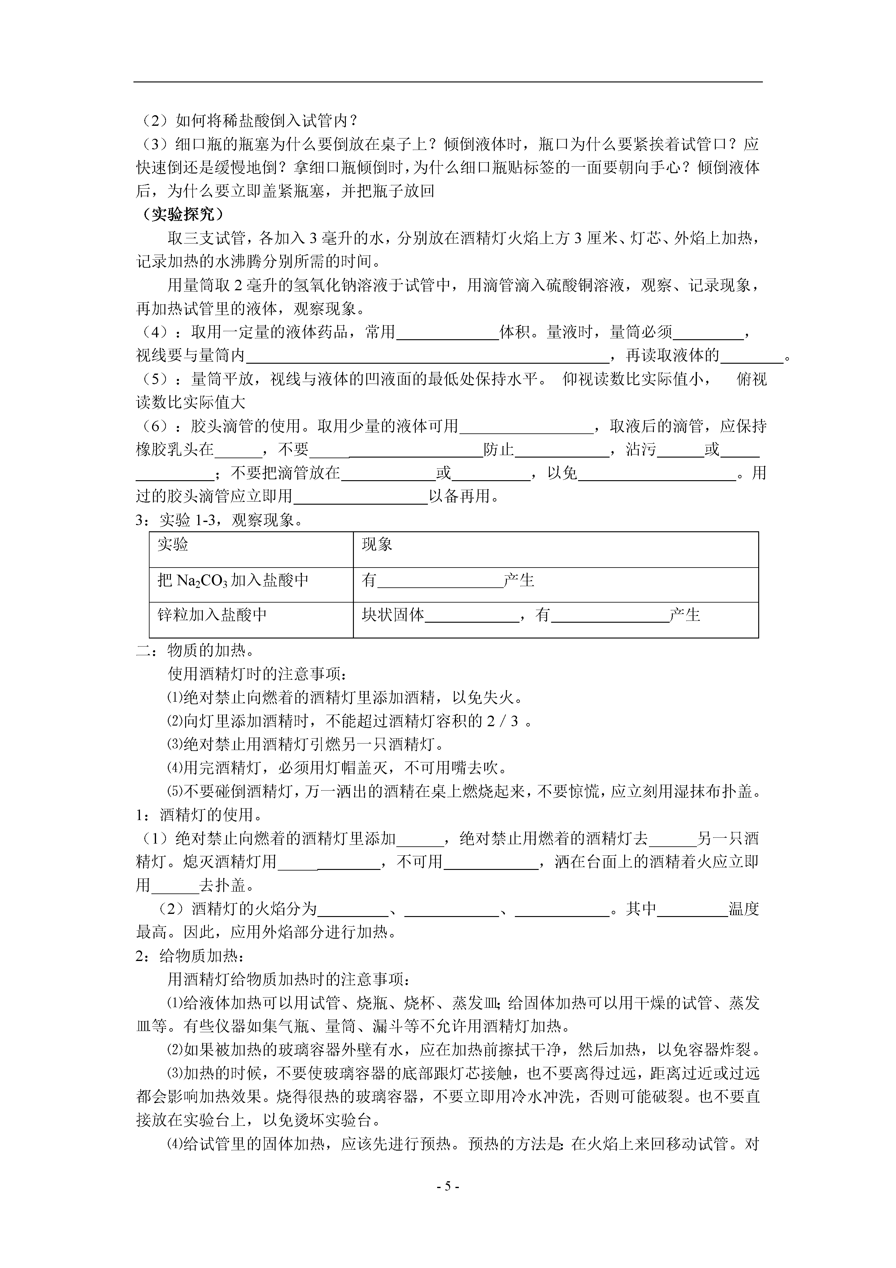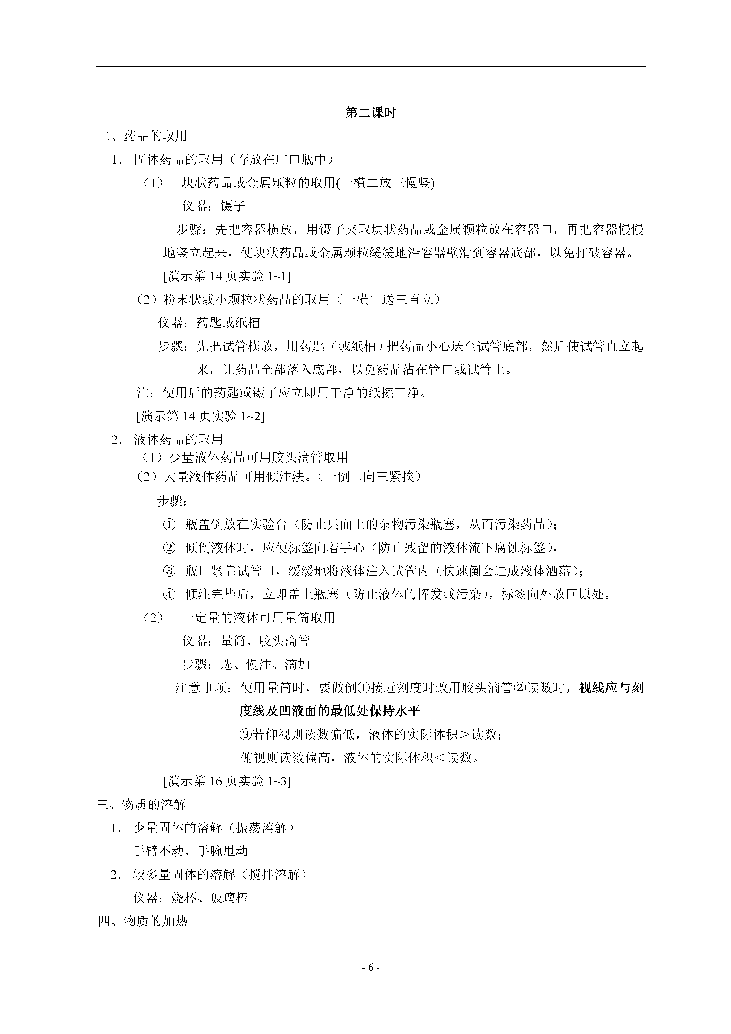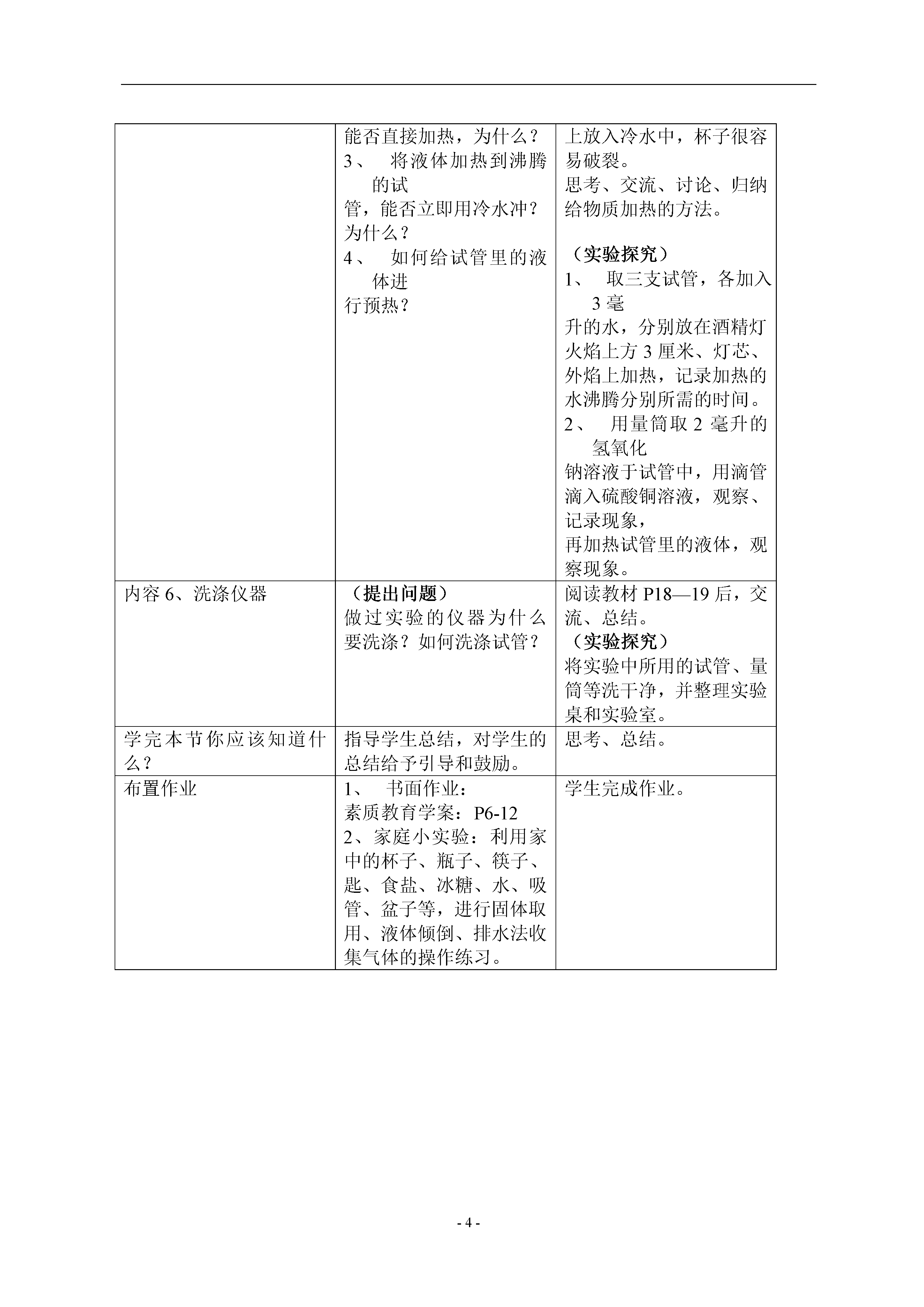 7课题3走进化学实验室教学目标知识与能力知道化学实验是进行科学探究的重要手段,严谨的科学态度、正确的操作方法和实验原理是保证实验成功的关键。了解一些化学实验室的规则。掌握常见仪器的名称和使用。掌握药品的取用、加热、洗涤仪器等基本实验操作。培养学生的观察能力和动手能力。过程与方法在本课题材的教学过程中,应采用用教师的讲解、演示与学生的探究相结合的方式进行授课。首先在教师的讲解中学生得到启示,然后学生在探究中得出结论,进而通过学生的亲处演示找出问题,最后在教师正确的演示实验中使学生加深理解。整个教学过程在教师与学生的互动中进行,使课堂气氛活跃,同时激发学生的兴趣。情感、态度与价值观培养学生严谨的科学态度。初步使学生养成良好的实验习惯。教学重点、难点及突破重点化学实验室的实验规则和常用仪器的名称、作用。药品的取用。酒精灯的使用方法和给物质加热的方法。难点药品的取用。酒精灯的使用方法和给物质加热的方法。教学突破对于教学重点的突破,可采用教师的讲解、演示与学生的讨论、观察相结合的方式。教师先向学生简单介绍药品的性质、仪器的作用等,然后让学生进行观察、分析,在学生得出结论的基础上,最后教师进行正确的演示,以加深学生对实验结论的理解和记忆。教学过程第一课时一、初中化学实验常用用仪器和药品的取用规则(一)初中化学实验常用用仪器反应容器可直接受热的:试管、蒸发皿、燃烧匙、坩埚等能间接受热的:烧杯、烧瓶(加热时,需加石棉网)常存放药品的仪器:广口瓶(固体)、细口瓶(液体)、滴瓶(少量液体)、集气瓶(气体)用加热仪器:酒精灯计量仪器:托盘天平(称量)、量筒(量体积)仪分离仪器:漏斗取用仪器:药匙(粉末或小晶粒状)、镊子(块状或较大颗粒)、胶头器滴管(少量液体)夹持仪器:试管夹、铁架台(带铁夹、铁圈)、坩埚钳其他仪器:长颈漏斗、石棉网、玻璃棒、试管刷、水槽试管用途:a、在常温或加热时,用作少量试剂的反应容器。b、溶解少量固体c、收集少量气体注意事项:a、加热时外壁必须干燥,不能骤热骤冷,一般要先均匀受热,然后才能集中受热,防止试管受热不均而破裂。b、加热时,试管要先用铁夹夹持固定在铁架台上(短时间加热也可用试管夹夹持)。c、加热固体时,试管口要略向下倾斜,且未冷前试管不能直立,避免管口冷凝水倒流使试管炸裂。d、加热液体时,盛液量一般不超过试管容积的1/3(防止液体受热溢出),使试管与桌面约成45°的角度(增大受热面积,防止暴沸),管口不能对着自己或别人(防止液体喷出伤人)。试管夹用途:夹持试管注意事项:①从底部往上套,夹在距管口1/3处(防止杂质落入试管)②不要把拇指按在试管夹短柄上。玻璃棒(1)用途:搅拌、引流(过滤或转移液体)。(2)注意事项:①搅拌不要碰撞容器壁②用后及时擦洗干净酒精灯(1)用途:化学实验室常用的加热仪器(2)注意事项:①使用时先将灯放稳,灯帽取下直立在灯的右侧,以防止滚动和便于取用。②使用前检查并调整灯芯(保证更地燃烧,火焰保持较高的的温度)。③灯体内的酒精不可超过灯容积的3/4,也不应少于1/4(酒精过多,在加热或移动时易溢出;太少,加热酒精蒸气易引起爆炸)。④禁止向燃着的酒精灯内添加酒精(防止酒精洒出引起火灾)⑤禁止用燃着的酒精灯直接点燃另一酒精灯,应用火柴从侧面点燃酒精灯(防止酒精洒出引起火灾)。⑥应用外焰加热(外焰温度最高)。⑦用完酒精灯后,必须用灯帽盖灭,不可用嘴吹熄。(防止将火焰沿着灯颈吹入灯内)⑧用完后,立即盖上灯帽(防止酒精挥发和灯芯吸水而不易点燃)。⑨不要碰倒酒精灯,若有酒精洒到桌面并燃烧起来,应立即用湿布扑盖或撒沙土扑灭火焰,不能用水冲,以免火势蔓延。[演示实验1~4]胶头滴管、滴瓶用途:①胶头滴管用于吸取和滴加少量液体。②滴瓶用于盛放少量液体药品。注意事项:①先排空再吸液②悬空垂直放在试管口上方,以免沾污染滴管③吸取液体后,应保持胶头在上,不能向下或平放,防止液体倒流,沾污试剂或腐蚀胶头;④除吸同一试剂外,用过后应立即洗净,再去吸取其他药品(防止试剂相互污染。⑤滴瓶上的滴管与瓶配套使用,滴液后应立即插入原瓶内,不得弄脏,也不必用水冲冼。铁架台(包括铁夹和铁圈)用途:用于固定和支持各种仪器,一般常用于过滤、加热等实验操作。注意事项:a、铁夹和十字夹缺口位置要向上,以便于操作和保证安全。b、重物要固定在铁架台底座大面一侧,使重心落在底座内。烧杯用途:用于溶解或配制溶液和较大量试剂的反应容器。注意事项:受热时外壁要干燥,并放在石棉网上使其受热均匀(防止受热不均使烧杯炸裂),加液量一般不超过容积的1/3(防止加热沸腾使液体外溢)。量筒