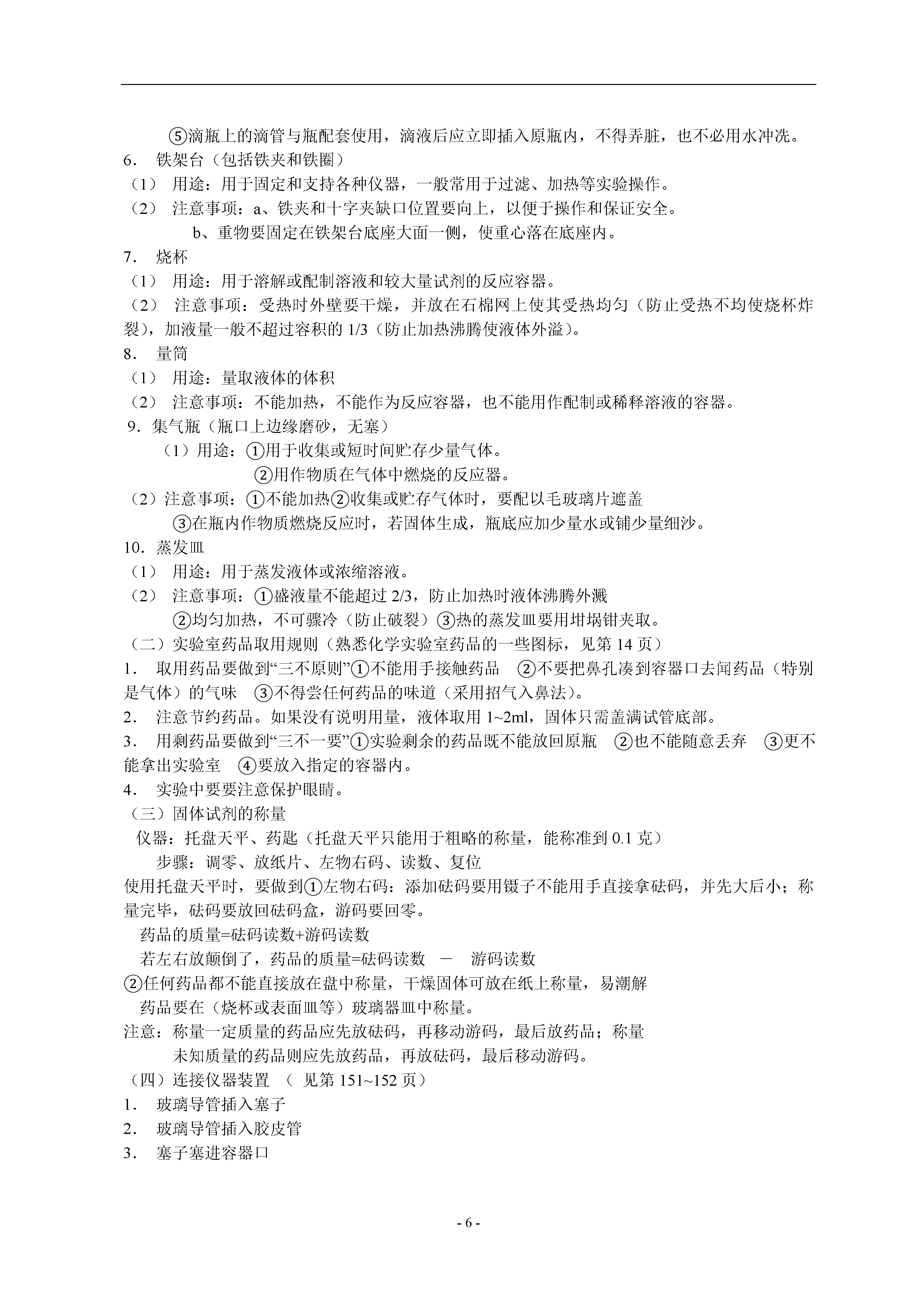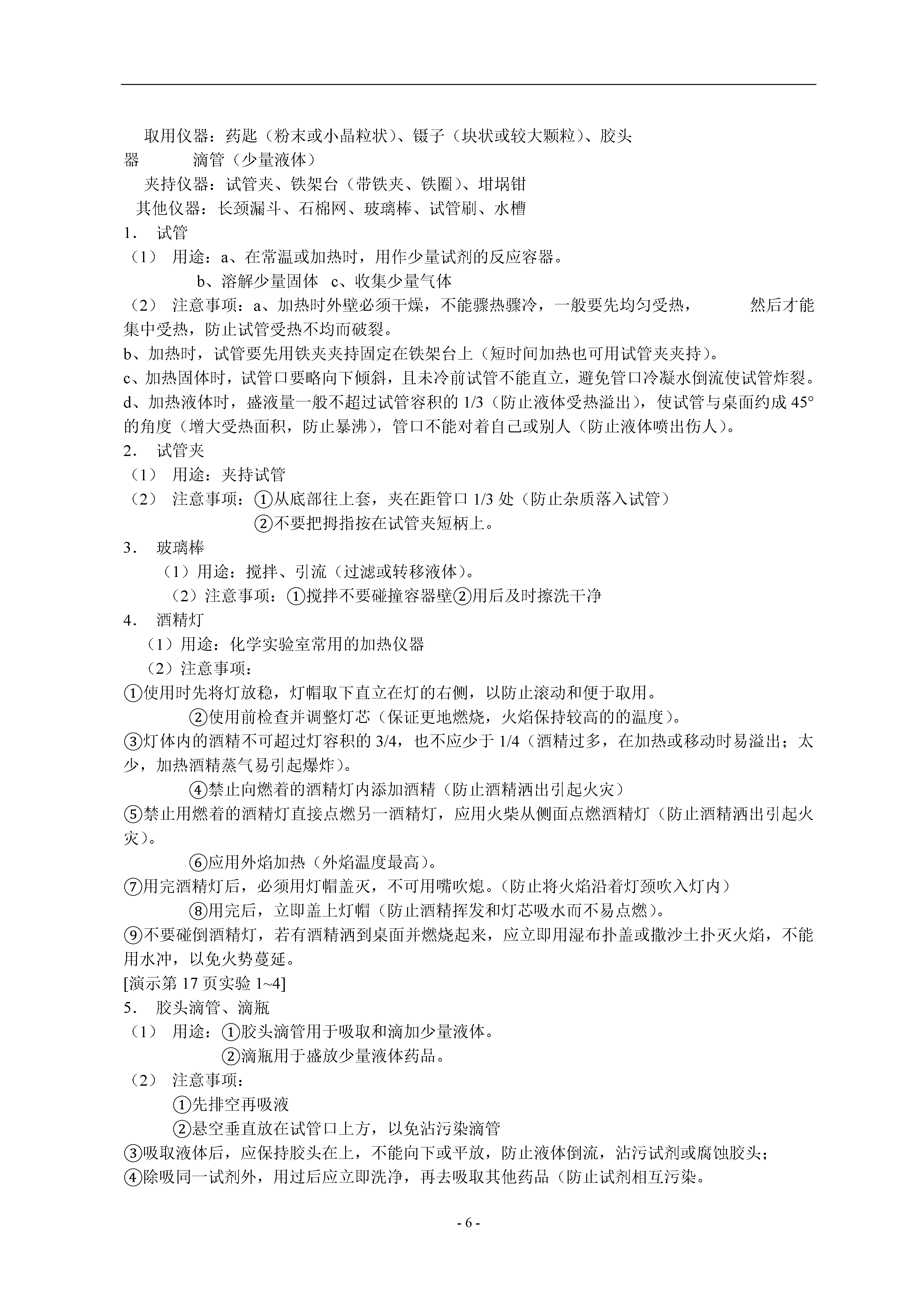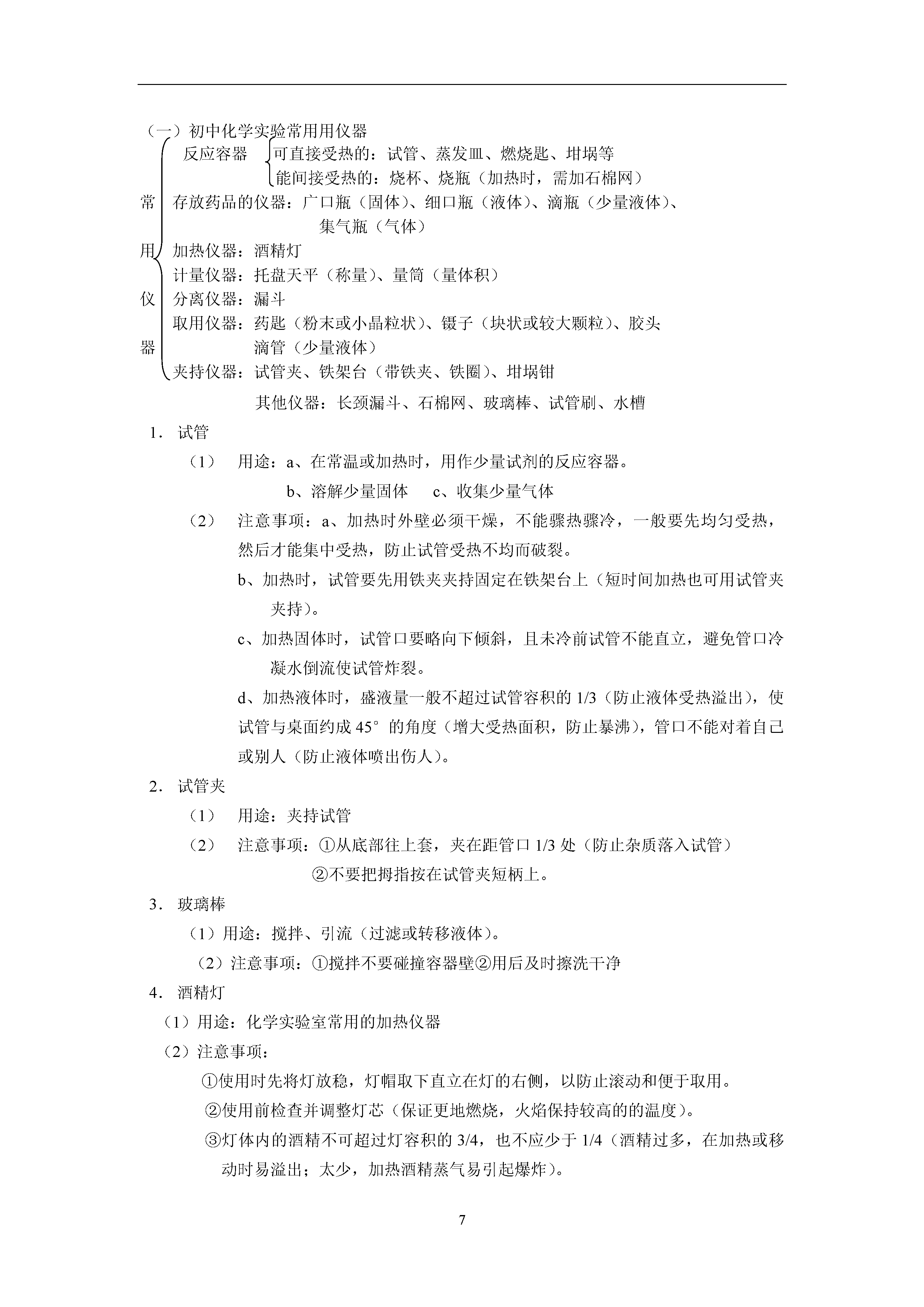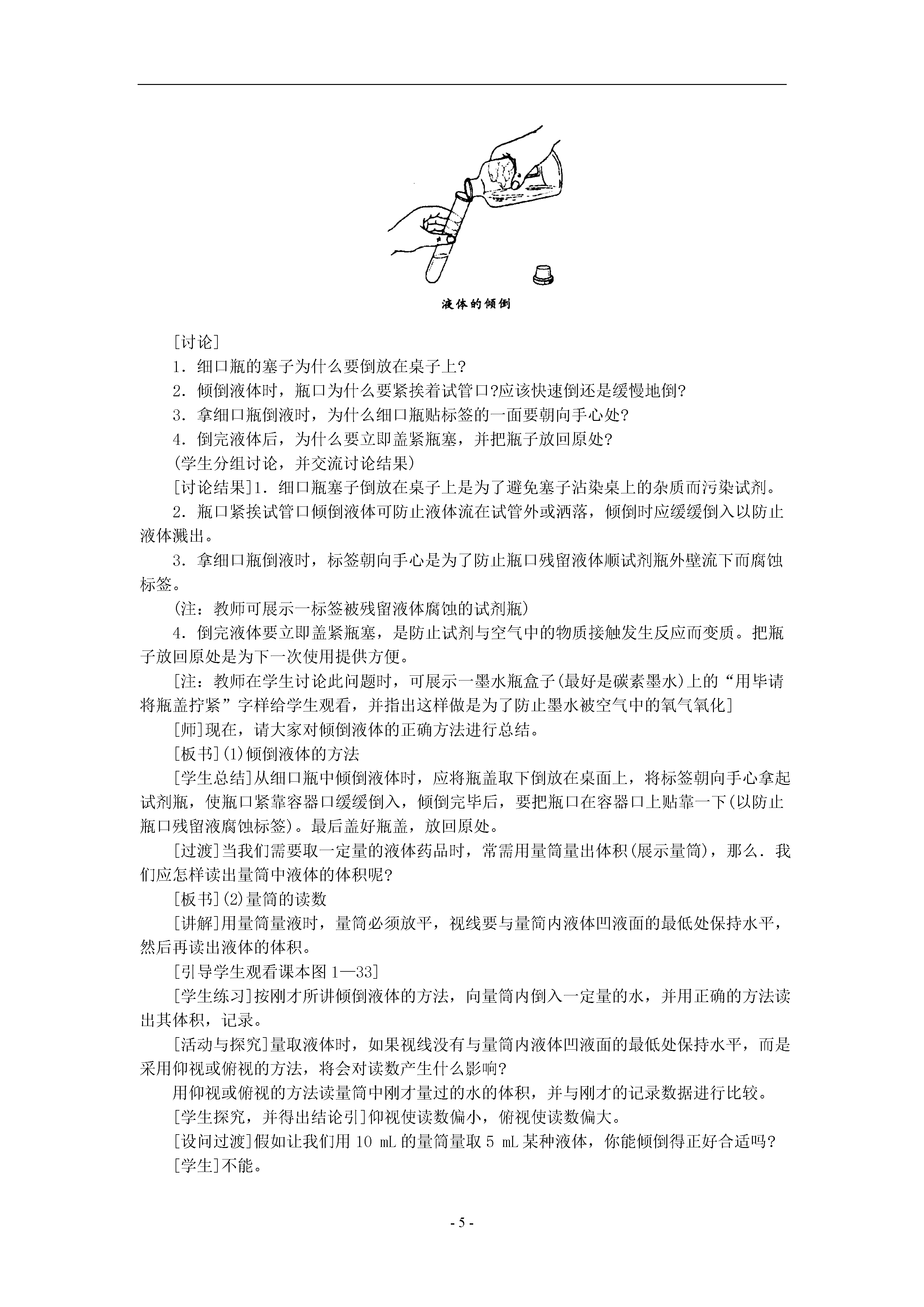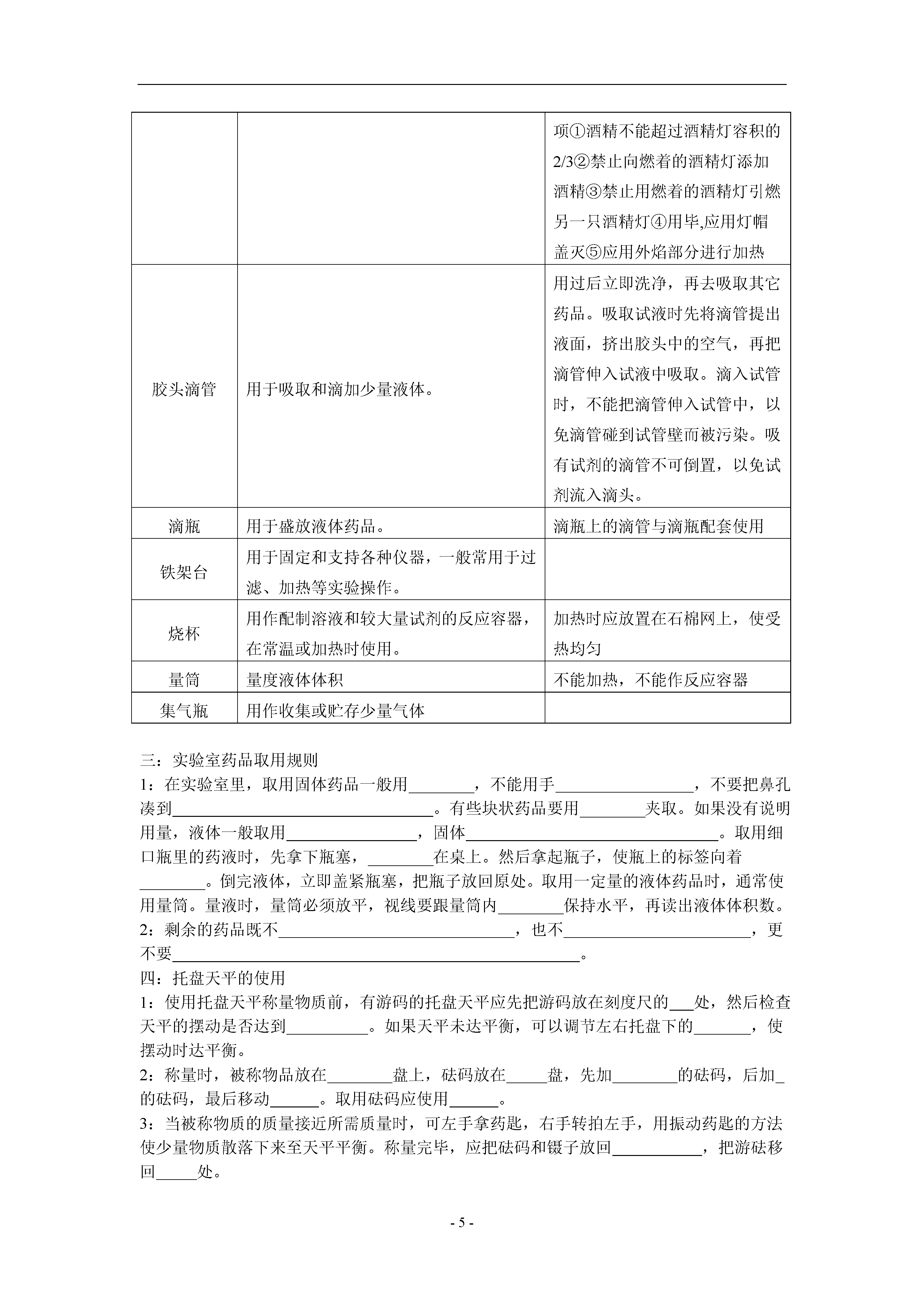 7课题3走进化学实验室教学目标知识与能力知道化学实验是进行科学探究的重要手段,严谨的科学态度、正确的操作方法和实验原理是保证实验成功的关键。了解一些化学实验室的规则。掌握常见仪器的名称和使用。掌握药品的取用、加热、洗涤仪器等基本实验操作。培养学生的观察能力和动手能力。过程与方法在本课题材的教学过程中,应采用用教师的讲解、演示与学生的探究相结合的方式进行授课。首先在教师的讲解中学生得到启示,然后学生在探究中得出结论,进而通过学生的亲处演示找出问题,最后在教师正确的演示实验中使学生加深理解。整个教学过程在教师与学生的互动中进行,使课堂气氛活跃,同时激发学生的兴趣。情感、态度与价值观培养学生严谨的科学态度。初步使学生养成良好的实验习惯。教学重点、难点及突破重点化学实验室的实验规则和常用仪器的名称、作用。药品的取用。酒精灯的使用方法和给物质加热的方法。难点药品的取用。酒精灯的使用方法和给物质加热的方法。教学突破对于教学重点的突破,可采用教师的讲解、演示与学生的讨论、观察相结合的方式。教师先向学生简单介绍药品的性质、仪器的作用等,然后让学生进行观察、分析,在学生得出结论的基础上,最后教师进行正确的演示,以加深学生对实验结论的理解和记忆。教学过程第一课时一、初中化学实验常用用仪器和药品的取用规则(一)初中化学实验常用用仪器反应容器可直接受热的:试管、蒸发皿、燃烧匙、坩埚等能间接受热的:烧杯、烧瓶(加热时,需加石棉网)常存放药品的仪器:广口瓶(固体)、细口瓶(液体)、滴瓶(少量液体)、集气瓶(气体)用加热仪器:酒精灯计量仪器:托盘天平(称量)、量筒(量体积)仪分离仪器:漏斗取用仪器:药匙(粉末或小晶粒状)、镊子(块状或较大颗粒)、胶头器滴管(少量液体)夹持仪器:试管夹、铁架台(带铁夹、铁圈)、坩埚钳其他仪器:长颈漏斗、石棉网、玻璃棒、试管刷、水槽试管用途:a、在常温或加热时,用作少量试剂的反应容器。b、溶解少量固体c、收集少量气体注意事项:a、加热时外壁必须干燥,不能骤热骤冷,一般要先均匀受热,然后才能集中受热,防止试管受热不均而破裂。b、加热时,试管要先用铁夹夹持固定在铁架台上(短时间加热也可用试管夹夹持)。c、加热固体时,试管口要略向下倾斜,且未冷前试管不能直立,避免管口冷凝水倒流使试管炸裂。d、加热液体时,盛液量一般不超过试管容积的1/3(防止液体受热溢出),使试管与桌面约成45°的角度(增大受热面积,防止暴沸),管口不能对着自己或别人(防止液体喷出伤人)。试管夹用途:夹持试管注意事项:①从底部往上套,夹在距管口1/3处(防止杂质落入试管)②不要把拇指按在试管夹短柄上。玻璃棒(1)用途:搅拌、引流(过滤或转移液体)。(2)注意事项:①搅拌不要碰撞容器壁②用后及时擦洗干净酒精灯(1)用途:化学实验室常用的加热仪器(2)注意事项:①使用时先将灯放稳,灯帽取下直立在灯的右侧,以防止滚动和便于取用。②使用前检查并调整灯芯(保证更地燃烧,火焰保持较高的的温度)。③灯体内的酒精不可超过灯容积的3/4,也不应少于1/4(酒精过多,在加热或移动时易溢出;太少,加热酒精蒸气易引起爆炸)。④禁止向燃着的酒精灯内添加酒精(防止酒精洒出引起火灾)⑤禁止用燃着的酒精灯直接点燃另一酒精灯,应用火柴从侧面点燃酒精灯(防止酒精洒出引起火灾)。⑥应用外焰加热(外焰温度最高)。⑦用完酒精灯后,必须用灯帽盖灭,不可用嘴吹熄。(防止将火焰沿着灯颈吹入灯内)⑧用完后,立即盖上灯帽(防止酒精挥发和灯芯吸水而不易点燃)。⑨不要碰倒酒精灯,若有酒精洒到桌面并燃烧起来,应立即用湿布扑盖或撒沙土扑灭火焰,不能用水冲,以免火势蔓延。[演示实验1~4]胶头滴管、滴瓶用途:①胶头滴管用于吸取和滴加少量液体。②滴瓶用于盛放少量液体药品。注意事项:①先排空再吸液②悬空垂直放在试管口上方,以免沾污染滴管③吸取液体后,应保持胶头在上,不能向下或平放,防止液体倒流,沾污试剂或腐蚀胶头;④除吸同一试剂外,用过后应立即洗净,再去吸取其他药品(防止试剂相互污染。⑤滴瓶上的滴管与瓶配套使用,滴液后应立即插入原瓶内,不得弄脏,也不必用水冲冼。铁架台(包括铁夹和铁圈)用途:用于固定和支持各种仪器,一般常用于过滤、加热等实验操作。注意事项:a、铁夹和十字夹缺口位置要向上,以便于操作和保证安全。b、重物要固定在铁架台底座大面一侧,使重心落在底座内。烧杯用途:用于溶解或配制溶液和较大量试剂的反应容器。注意事项:受热时外壁要干燥,并放在石棉网上使其受热均匀(防止受热不均使烧杯炸裂),加液量一般不超过容积的1/3(防止加热沸腾使液体外溢)。量筒