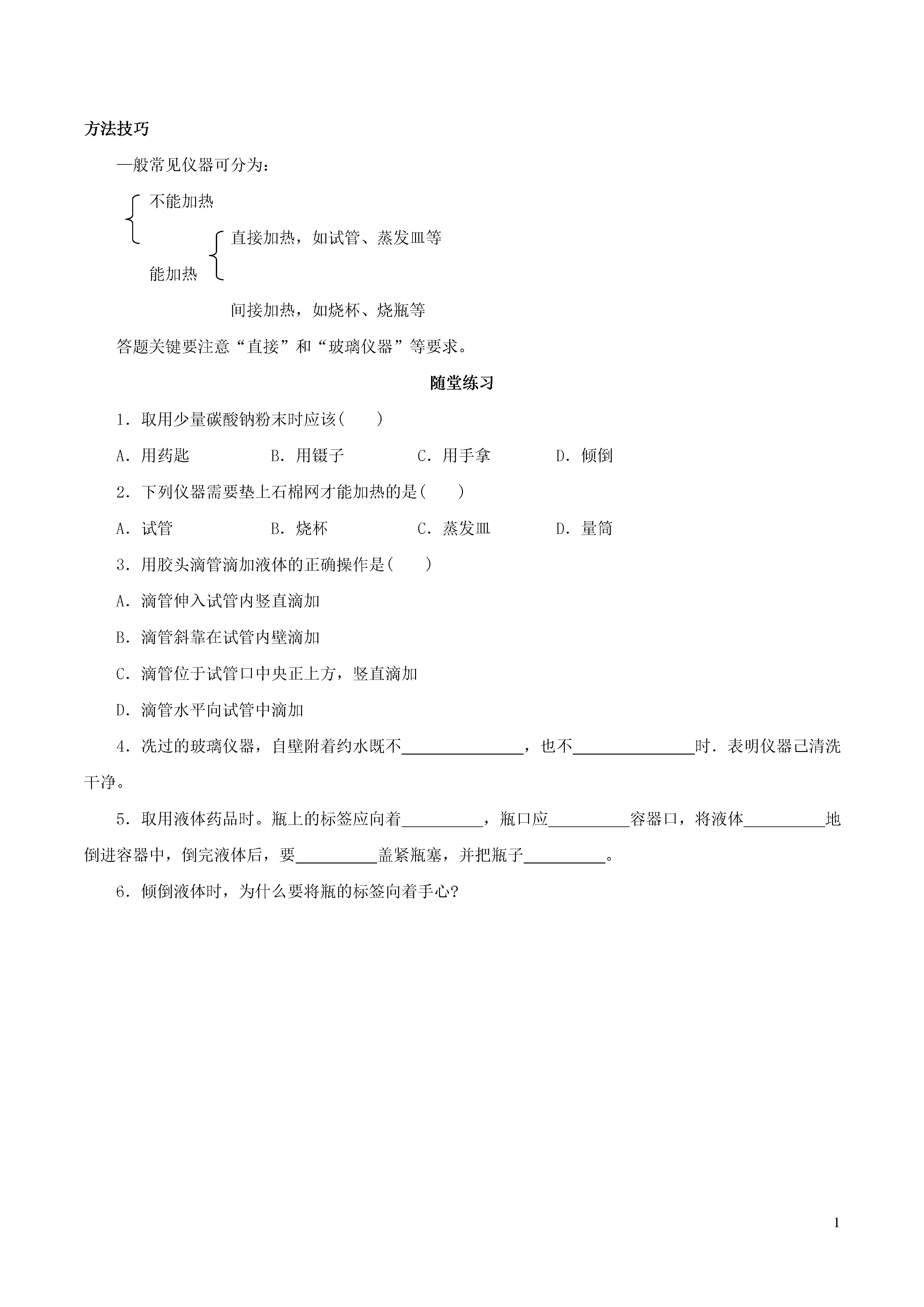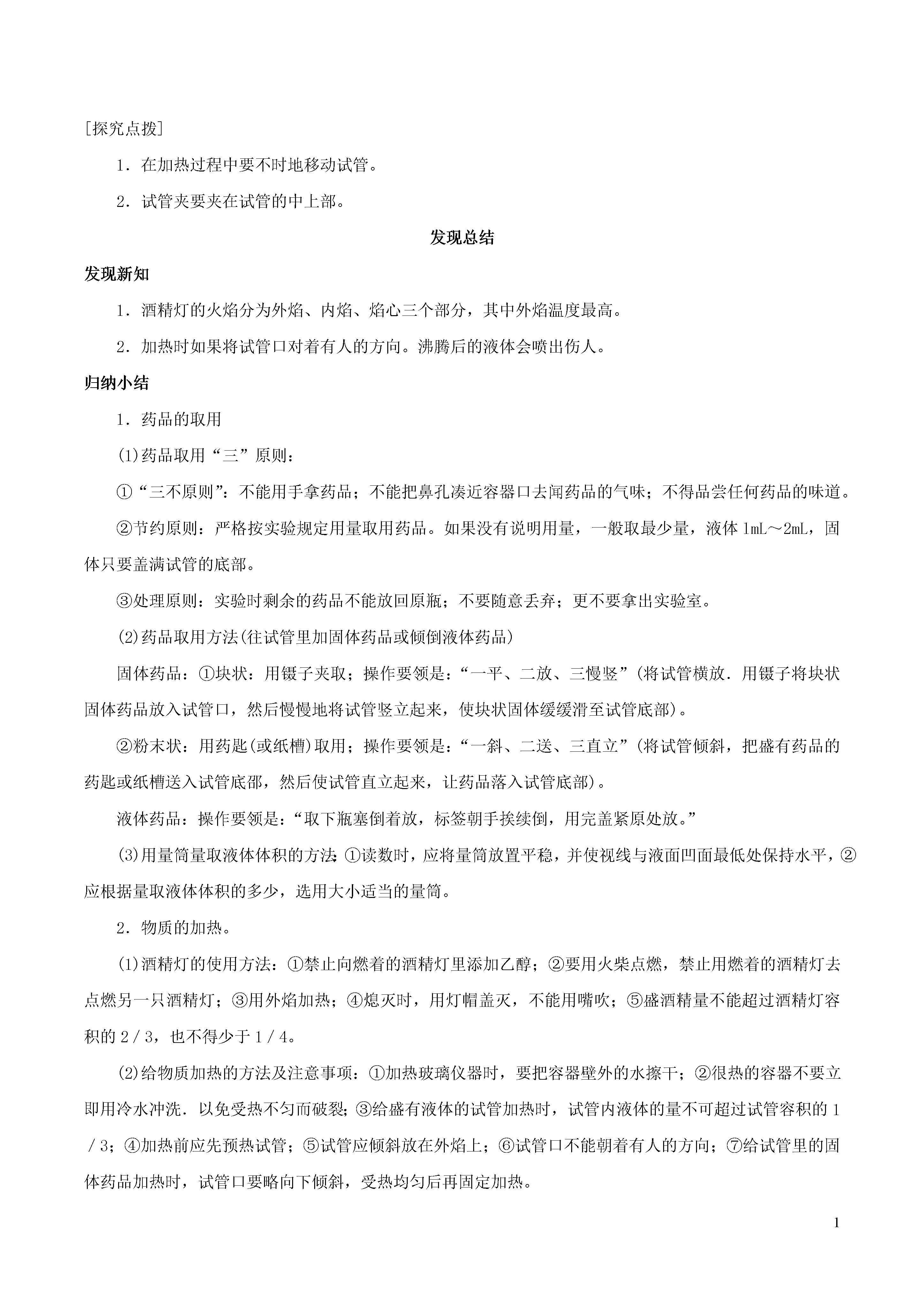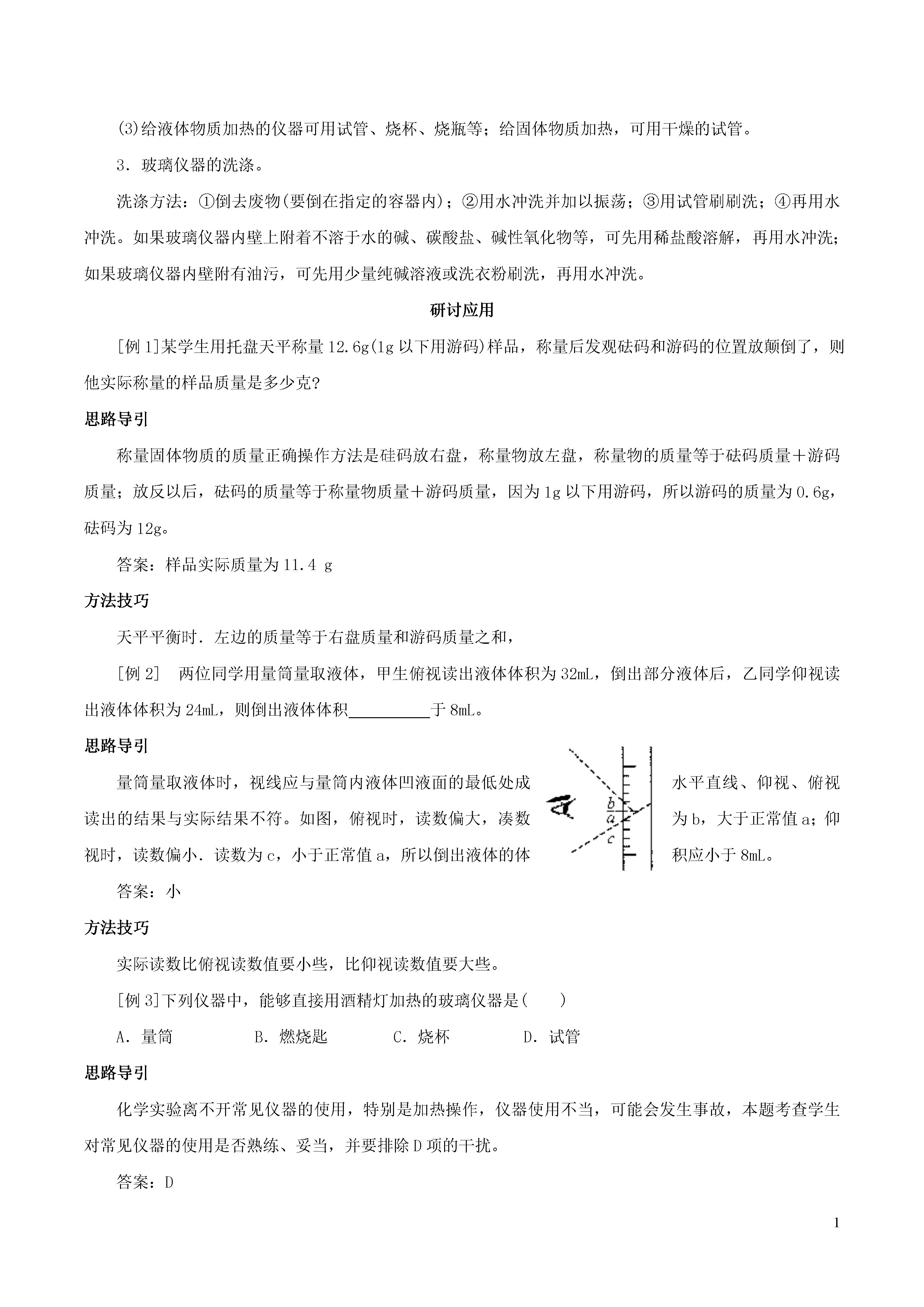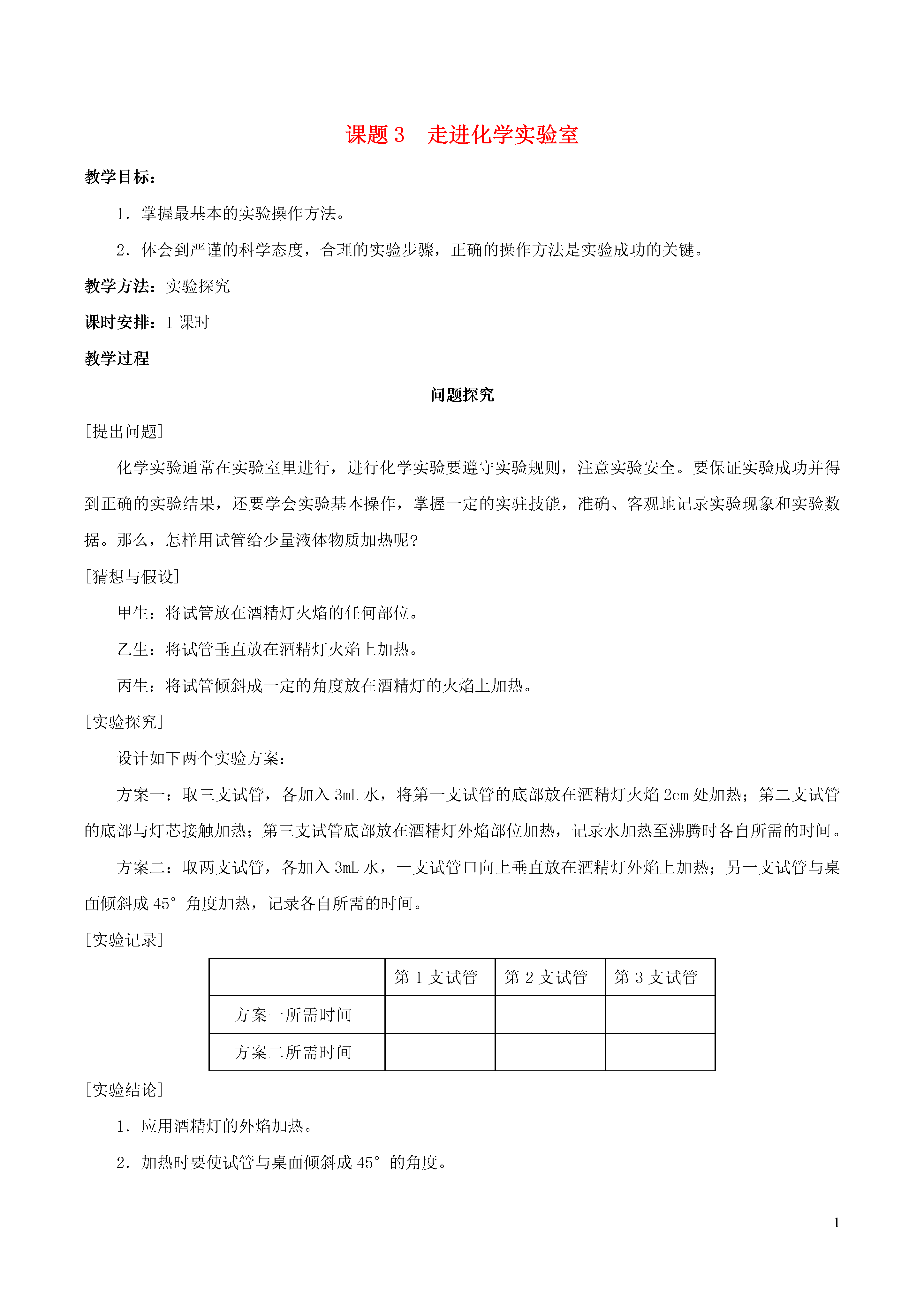 1课题3走进化学实验室教学目标:1.掌握最基本的实验操作方法。2.体会到严谨的科学态度,合理的实验步骤,正确的操作方法是实验成功的关键。教学方法:实验探究课时安排:1课时教学过程问题探究[提出问题]化学实验通常在实验室里进行,进行化学实验要遵守实验规则,注意实验安全。要保证实验成功并得到正确的实验结果,还要学会实验基本操作,掌握一定的实驻技能,准确、客观地记录实验现象和实验数据。那么,怎样用试管给少量液体物质加热呢?[猜想与假设]甲生:将试管放在酒精灯火焰的任何部位。乙生:将试管垂直放在酒精灯火焰上加热。丙生:将试管倾斜成一定的角度放在酒精灯的火焰上加热。[实验探究]设计如下两个实验方案:方案一:取三支试管,各加入3mL水,将第一支试管的底部放在酒精灯火焰2cm处加热;第二支试管的底部与灯芯接触加热;第三支试管底部放在酒精灯外焰部位加热,记录水加热至沸腾时各自所需的时间。方案二:取两支试管,各加入3mL水,一支试管口向上垂直放在酒精灯外焰上加热;另一支试管与桌面倾斜成45°角度加热,记录各自所需的时间。[实验记录]第1支试管第2支试管第3支试管方案一所需时间方案二所需时间[实验结论]1.应用酒精灯的外焰加热。2.加热时要使试管与桌面倾斜成45°的角度。[探究点拨]1.在加热过程中要不时地移动试管。2.试管夹要夹在试管的中上部。发现总结发现新知1.酒精灯的火焰分为外焰、内焰、焰心三个部分,其中外焰温度最高。2.加热时如果将试管口对着有人的方向。沸腾后的液体会喷出伤人。归纳小结1.药品的取用(1)药品取用“三”原则:①“三不原则”:不能用手拿药品;不能把鼻孔凑近容器口去闻药品的气味;不得品尝任何药品的味道。②节约原则:严格按实验规定用量取用药品。如果没有说明用量,一般取最少量,液体lmL~2mL,固体只要盖满试管的底部。③处理原则:实验时剩余的药品不能放回原瓶;不要随意丢弃;更不要拿出实验室。(2)药品取用方法(往试管里加固体药品或倾倒液体药品)固体药品:①块状:用镊子夹取;操作要领是:“一平、二放、三慢竖”(将试管横放.用镊子将块状固体药品放入试管口,然后慢慢地将试管竖立起来,使块状固体缓缓滑至试管底部)。②粉末状:用药匙(或纸槽)取用;操作要领是:“一斜、二送、三直立”(将试管倾斜,把盛有药品的药匙或纸槽送入试管底邵,然后使试管直立起来,让药品落入试管底部)。液体药品:操作要领是:“取下瓶塞倒着放,标签朝手挨续倒,用完盖紧原处放。”(3)用量筒量取液体体积的方法:①读数时,应将量筒放置平稳,并使视线与液面凹面最低处保持水平,②应根据量取液体体积的多少,选用大小适当的量筒。2.物质的加热。(1)酒精灯的使用方法:①禁止向燃着的酒精灯里添加乙醇;②要用火柴点燃,禁止用燃着的酒精灯去点燃另一只酒精灯;③用外焰加热;④熄灭时,用灯帽盖灭,不能用嘴吹;⑤盛酒精量不能超过酒精灯容积的2/3,也不得少于1/4。(2)给物质加热的方法及注意事项:①加热玻璃仪器时,要把容器壁外的水擦干;②很热的容器不要立即用冷水冲洗.以免受热不匀而破裂;③给盛有液体的试管加热时,试管内液体的量不可超过试管容积的1/3;④加热前应先预热试管;⑤试管应倾斜放在外焰上;⑥试管口不能朝着有人的方向;⑦给试管里的固体药品加热时,试管口要略向下倾斜,受热均匀后再固定加热。(3)给液体物质加热的仪器可用试管、烧杯、烧瓶等;给固体物质加热,可用干燥的试管。3.玻璃仪器的洗涤。洗涤方法:①倒去废物(要倒在指定的容器内);②用水冲洗并加以振荡;③用试管刷刷洗;④再用水冲洗。如果玻璃仪器内壁上附着不溶于水的碱、碳酸盐、碱性氧化物等,可先用稀盐酸溶解,再用水冲洗;如果玻璃仪器内壁附有油污,可先用少量纯碱溶液或洗衣粉刷洗,再用水冲洗。研讨应用[例1]某学生用托盘天平称量12.6g(1g以下用游码)样品,称量后发观砝码和游码的位置放颠倒了,则他实际称量的样品质量是多少克?思路导引称量固体物质的质量正确操作方法是硅码放右盘,称量物放左盘,称量物的质量等于砝码质量+游码质量;放反以后,砝码的质量等于称量物质量+游码质量,因为1g以下用游码,所以游码的质量为0.6g,砝码为12g。答案:样品实际质量为11.4g方法技巧天平平衡时.左边的质量等于右盘质量和游码质量之和,[例2]两位同学用量筒量取液体,甲生俯视读出液体体积为32mL,倒出部分液体后,乙同学仰视读出液体体积为24mL,则倒出液体体积于8mL。思路导引量筒量取液体时,视线应与量筒内液体凹液面的最低处成水平直线、仰视、俯视读出的结果与实际结果不符。如图,俯视时,读数偏大,凑数为b,大于正常值a;仰视时,读数偏小