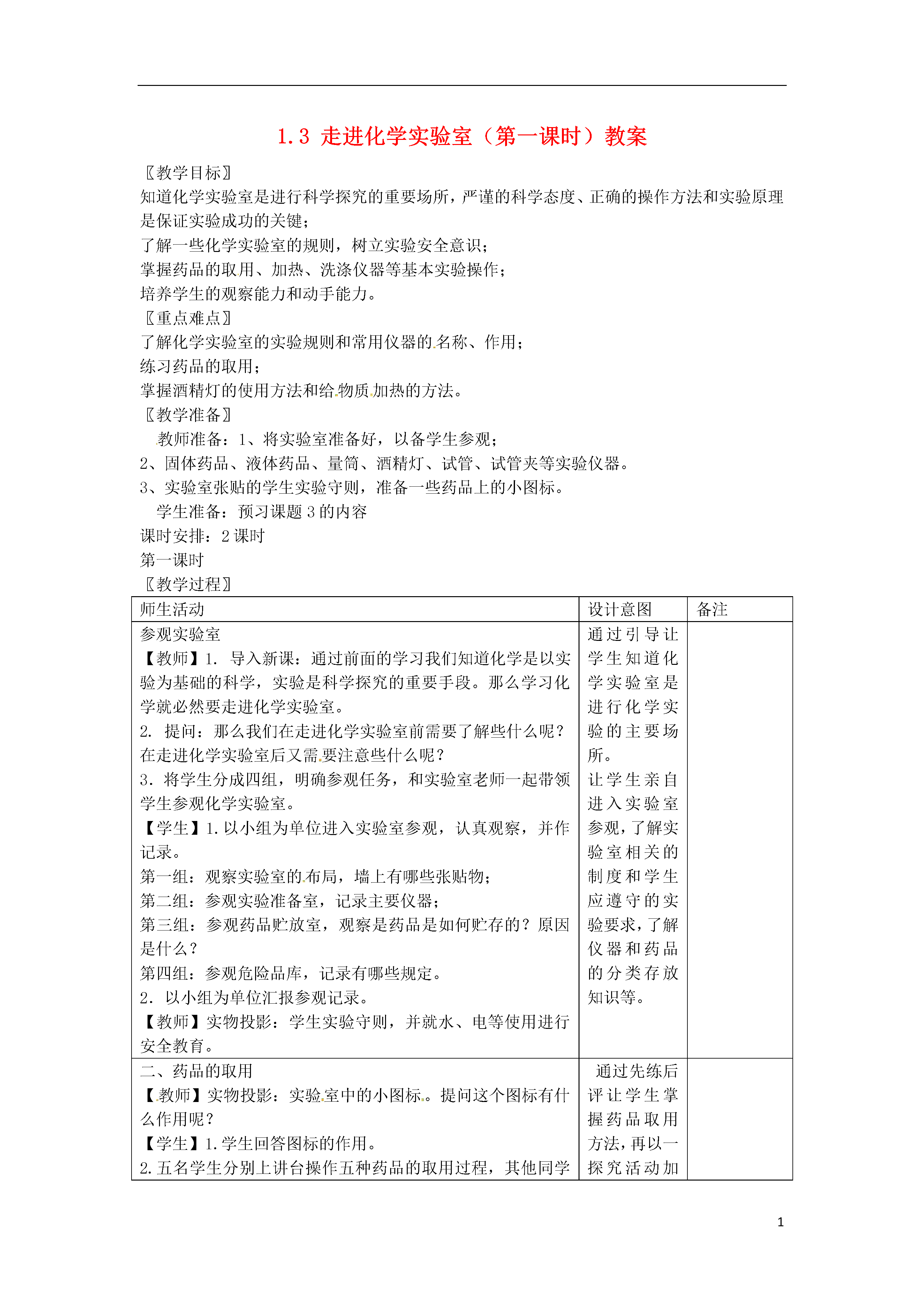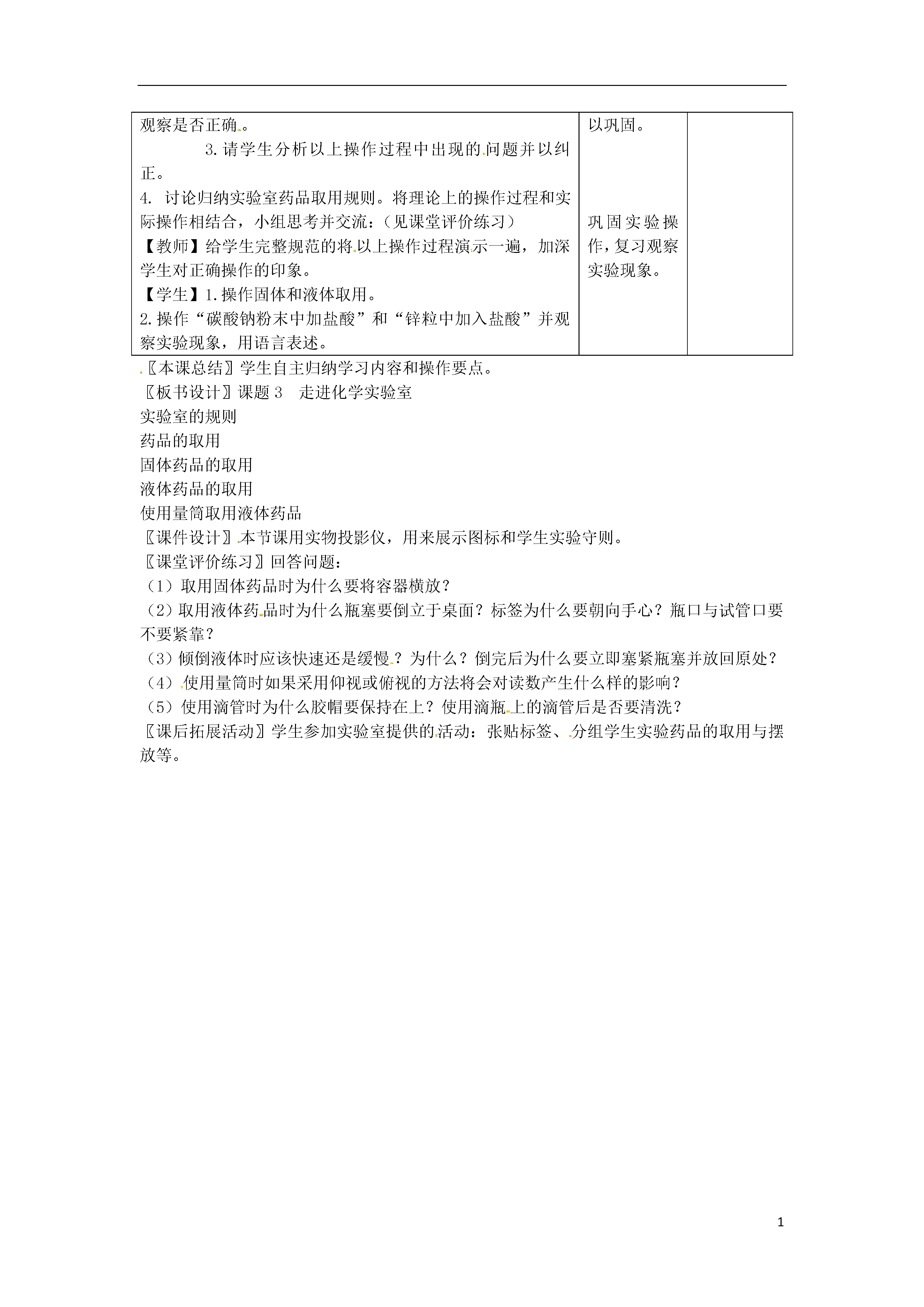 11.3走进化学实验室(第一课时)教案〖教学目标〗知道化学实验室是进行科学探究的重要场所,严谨的科学态度、正确的操作方法和实验原理是保证实验成功的关键;了解一些化学实验室的规则,树立实验安全意识;掌握药品的取用、加热、洗涤仪器等基本实验操作;培养学生的观察能力和动手能力。〖重点难点〗了解化学实验室的实验规则和常用仪器的名称、作用;练习药品的取用;掌握酒精灯的使用方法和给物质加热的方法。〖教学准备〗教师准备:1、将实验室准备好,以备学生参观;2、固体药品、液体药品、量筒、酒精灯、试管、试管夹等实验仪器。3、实验室张贴的学生实验守则,准备一些药品上的小图标。学生准备:预习课题3的内容课时安排:2课时第一课时〖教学过程〗师生活动设计意图备注参观实验室【教师】1.导入新课:通过前面的学习我们知道化学是以实验为基础的科学,实验是科学探究的重要手段。那么学习化学就必然要走进化学实验室。2.提问:那么我们在走进化学实验室前需要了解些什么呢?在走进化学实验室后又需要注意些什么呢?3.将学生分成四组,明确参观任务,和实验室老师一起带领学生参观化学实验室。【学生】1.以小组为单位进入实验室参观,认真观察,并作记录。第一组:观察实验室的布局,墙上有哪些张贴物;第二组:参观实验准备室,记录主要仪器;第三组:参观药品贮放室,观察是药品是如何贮存的?原因是什么?第四组:参观危险品库,记录有哪些规定。2.以小组为单位汇报参观记录。【教师】实物投影:学生实验守则,并就水、电等使用进行安全教育。通过引导让学生知道化学实验室是进行化学实验的主要场所。让学生亲自进入实验室参观,了解实验室相关的制度和学生应遵守的实验要求,了解仪器和药品的分类存放知识等。二、药品的取用【教师】实物投影:实验室中的小图标。提问这个图标有什么作用呢?【学生】1.学生回答图标的作用。2.五名学生分别上讲台操作五种药品的取用过程,其他同学观察是否正确。3.请学生分析以上操作过程中出现的问题并以纠正。4.讨论归纳实验室药品取用规则。将理论上的操作过程和实际操作相结合,小组思考并交流:(见课堂评价练习)【教师】给学生完整规范的将以上操作过程演示一遍,加深学生对正确操作的印象。【学生】1.操作固体和液体取用。2.操作“碳酸钠粉末中加盐酸”和“锌粒中加入盐酸”并观察实验现象,用语言表述。通过先练后评让学生掌握药品取用方法,再以一探究活动加以巩固。巩固实验操作,复习观察实验现象。〖本课总结〗学生自主归纳学习内容和操作要点。〖板书设计〗课题3走进化学实验室实验室的规则药品的取用固体药品的取用液体药品的取用使用量筒取用液体药品〖课件设计〗本节课用实物投影仪,用来展示图标和学生实验守则。〖课堂评价练习〗回答问题:(1)取用固体药品时为什么要将容器横放?(2)取用液体药品时为什么瓶塞要倒立于桌面?标签为什么要朝向手心?瓶口与试管口要不要紧靠?(3)倾倒液体时应该快速还是缓慢?为什么?倒完后为什么要立即塞紧瓶塞并放回原处?(4)使用量筒时如果采用仰视或俯视的方法将会对读数产生什么样的影响?(5)使用滴管时为什么胶帽要保持在上?使用滴瓶上的滴管后是否要清洗?〖课后拓展活动〗学生参加实验室提供的活动:张贴标签、分组学生实验药品的取用与摆放等。
