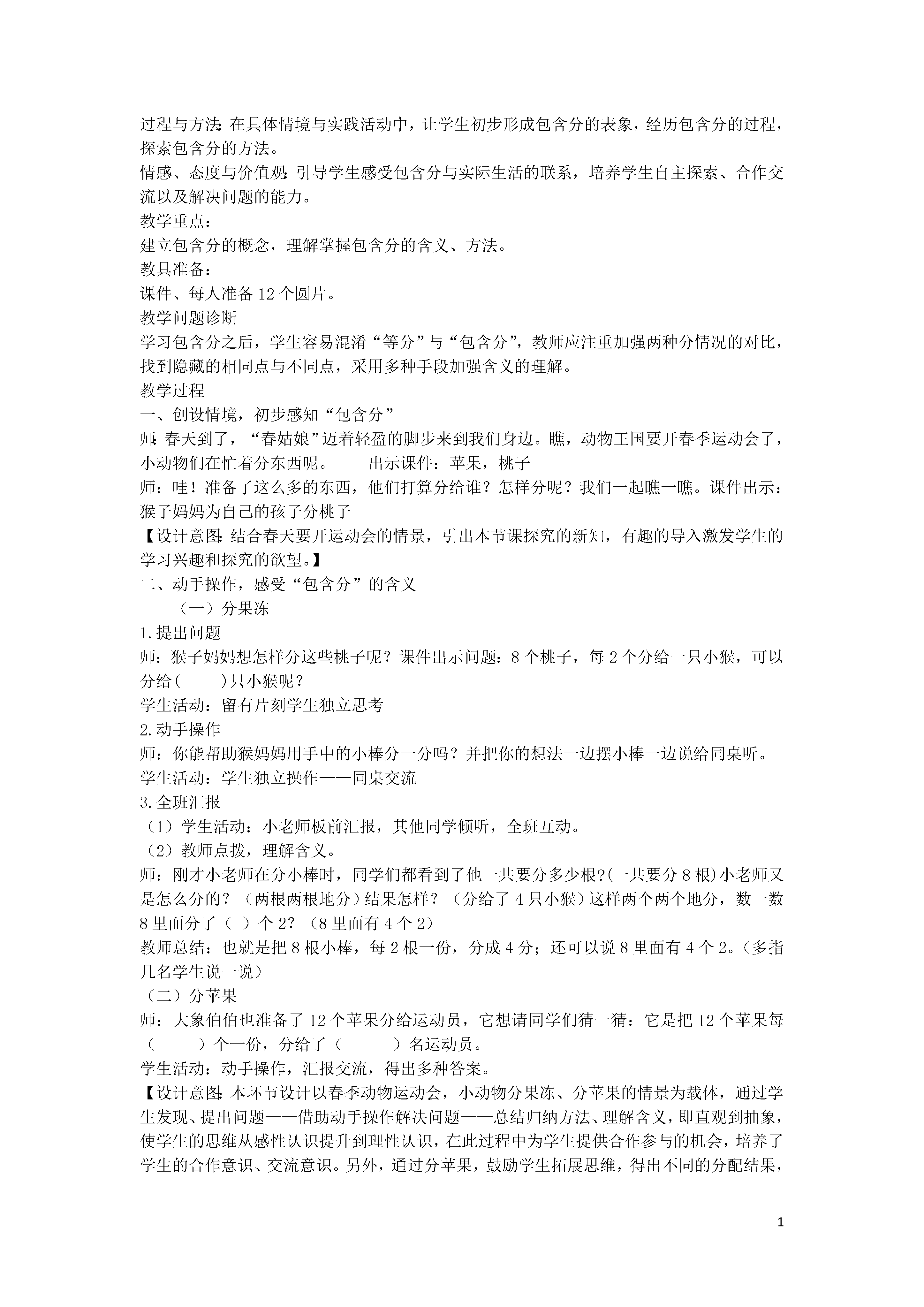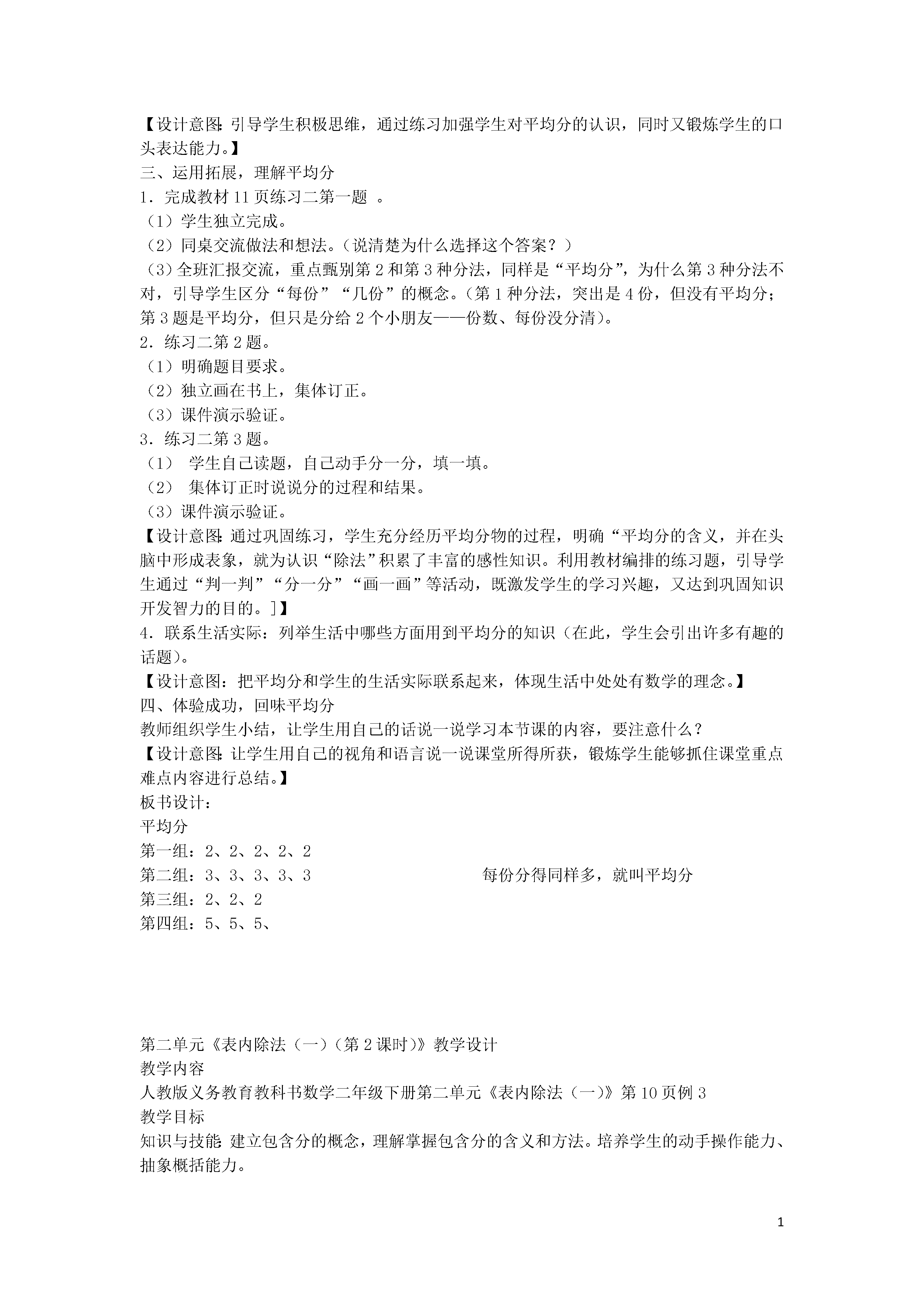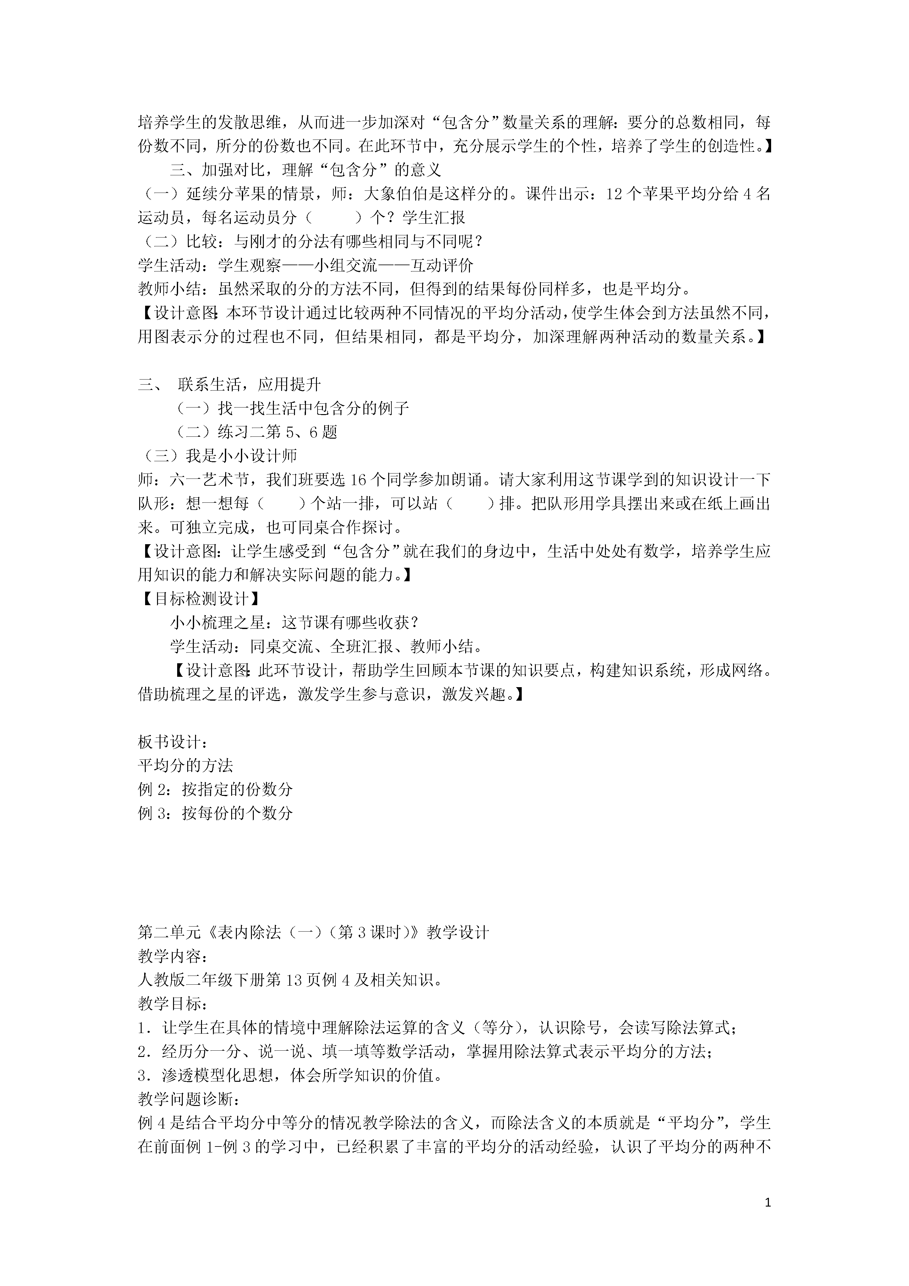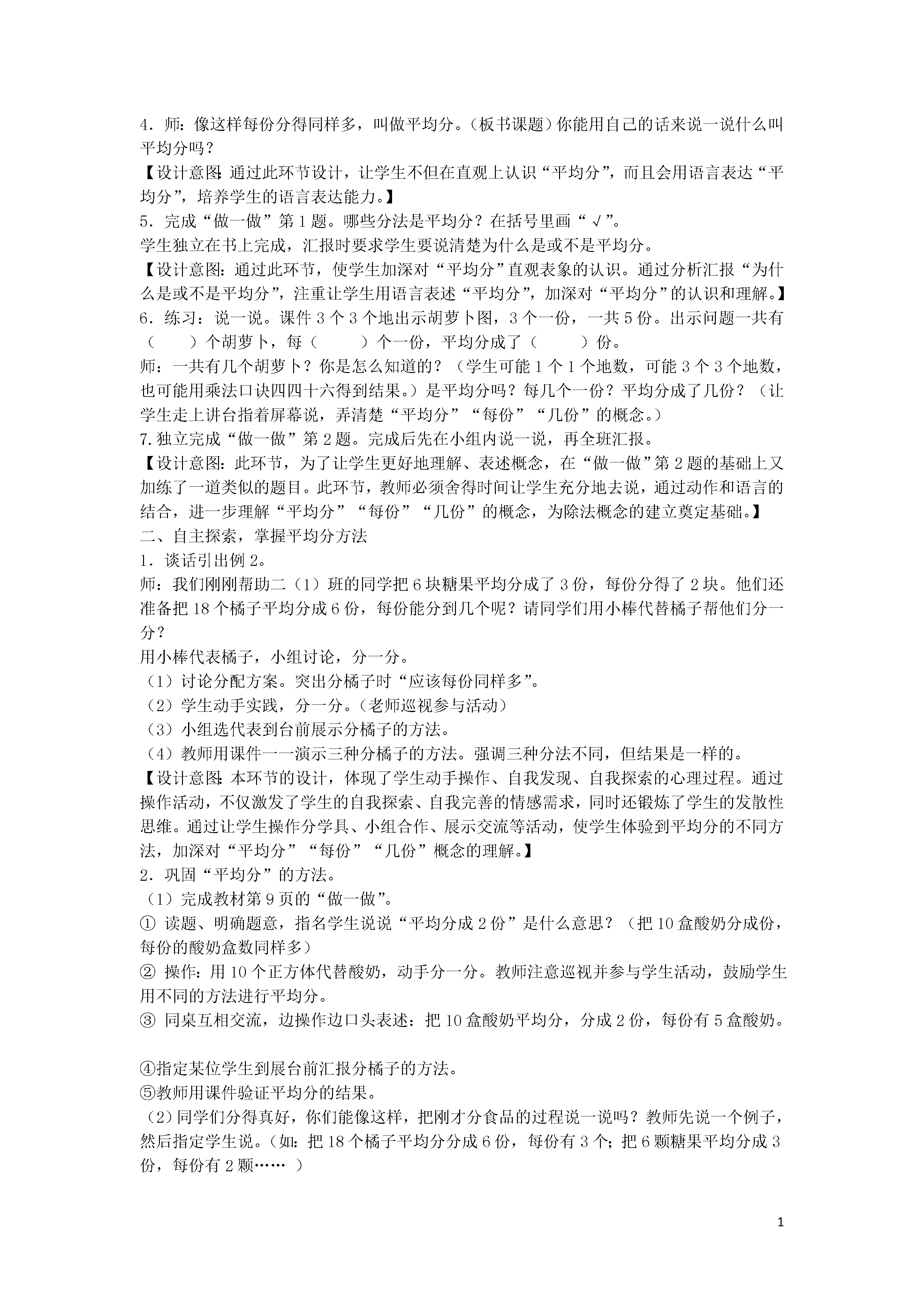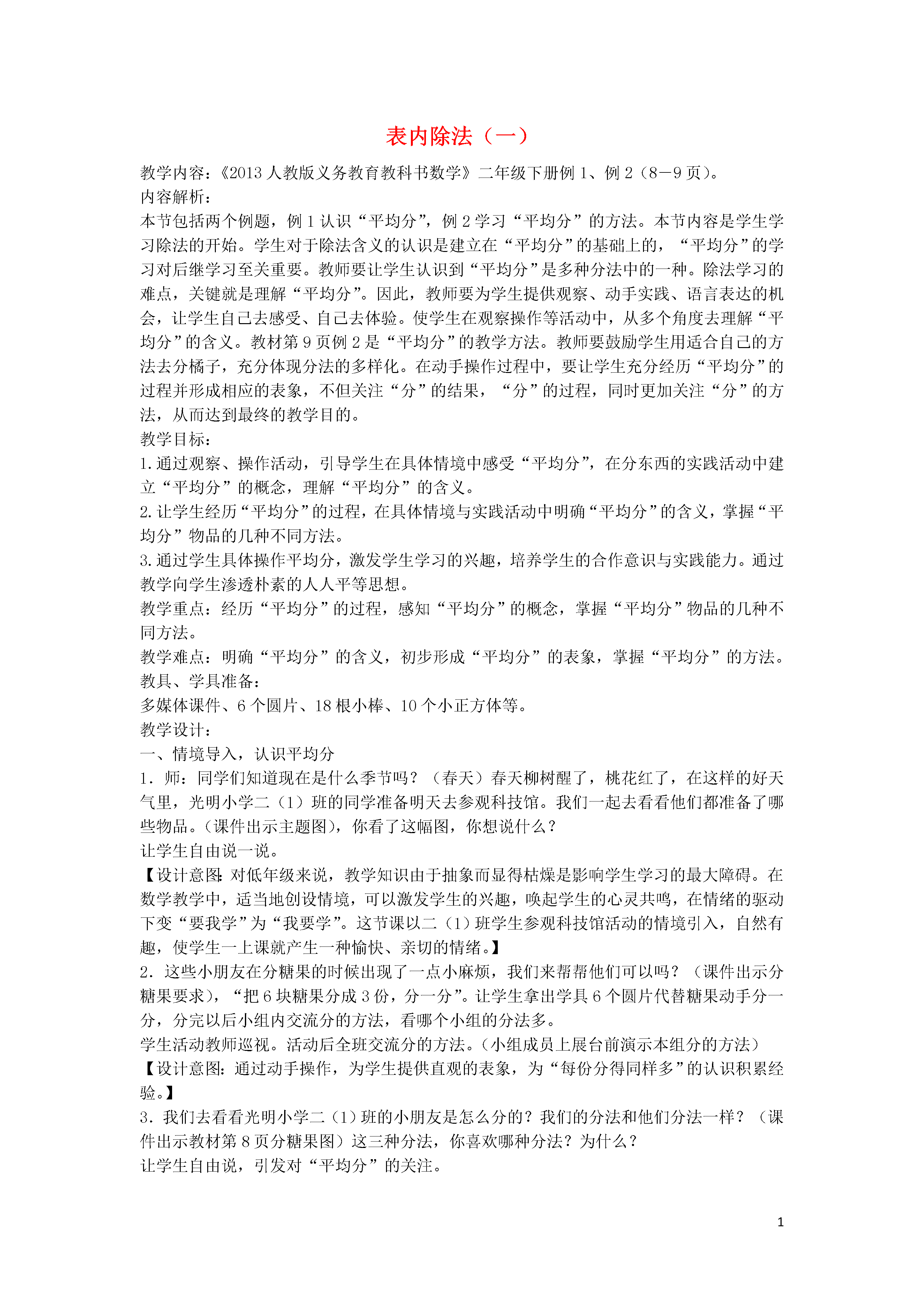 1表内除法(一)教学内容:《2013人教版义务教育教科书数学》二年级下册例1、例2(8-9页)。内容解析:本节包括两个例题,例1认识“平均分”,例2学习“平均分”的方法。本节内容是学生学习除法的开始。学生对于除法含义的认识是建立在“平均分”的基础上的,“平均分”的学习对后继学习至关重要。教师要让学生认识到“平均分”是多种分法中的一种。除法学习的难点,关键就是理解“平均分”。因此,教师要为学生提供观察、动手实践、语言表达的机会,让学生自己去感受、自己去体验。使学生在观察操作等活动中,从多个角度去理解“平均分”的含义。教材例2是“平均分”的教学方法。教师要鼓励学生用适合自己的方法去分橘子,充分体现分法的多样化。在动手操作过程中,要让学生充分经历“平均分”的过程并形成相应的表象,不但关注“分”的结果,“分”的过程,同时更加关注“分”的方法,从而达到最终的教学目的。教学目标:1.通过观察、操作活动,引导学生在具体情境中感受“平均分”,在分东西的实践活动中建立“平均分”的概念,理解“平均分”的含义。2.让学生经历“平均分”的过程,在具体情境与实践活动中明确“平均分”的含义,掌握“平均分”物品的几种不同方法。3.通过学生具体操作平均分,激发学生学习的兴趣,培养学生的合作意识与实践能力。通过教学向学生渗透朴素的人人平等思想。教学重点:经历“平均分”的过程,感知“平均分”的概念,掌握“平均分”物品的几种不同方法。教学难点:明确“平均分”的含义,初步形成“平均分”的表象,掌握“平均分”的方法。教具、学具准备:多媒体课件、6个圆片、18根小棒、10个小正方体等。教学设计:一、情境导入,认识平均分1.师:同学们知道现在是什么季节吗?(春天)春天柳树醒了,桃花红了,在这样的好天气里,光明小学二(1)班的同学准备明天去参观科技馆。我们一起去看看他们都准备了哪些物品。(课件出示主题图),你看了这幅图,你想说什么?让学生自由说一说。【设计意图:对低年级来说,教学知识由于抽象而显得枯燥是影响学生学习的最大障碍。在数学教学中,适当地创设情境,可以激发学生的兴趣,唤起学生的心灵共鸣,在情绪的驱动下变“要我学”为“我要学”。这节课以二(1)班学生参观科技馆活动的情境引入,自然有趣,使学生一上课就产生一种愉快、亲切的情绪。】2.这些小朋友在分糖果的时候出现了一点小麻烦,我们来帮帮他们可以吗?(课件出示分糖果要求),“把6块糖果分成3份,分一分”。让学生拿出学具6个圆片代替糖果动手分一分,分完以后小组内交流分的方法,看哪个小组的分法多。学生活动教师巡视。活动后全班交流分的方法。(小组成员上展台前演示本组分的方法)【设计意图:通过动手操作,为学生提供直观的表象,为“每份分得同样多”的认识积累经验。】3.我们去看看光明小学二(1)班的小朋友是怎么分的?我们的分法和他们分法一样?(课件出示教材分糖果图)这三种分法,你喜欢哪种分法?为什么?让学生自由说,引发对“平均分”的关注。4.师:像这样每份分得同样多,叫做平均分。(板书课题)你能用自己的话来说一说什么叫平均分吗?【设计意图:通过此环节设计,让学生不但在直观上认识“平均分”,而且会用语言表达“平均分”,培养学生的语言表达能力。】5.完成“做一做”第1题。哪些分法是平均分?在括号里画“√”。学生独立在书上完成,汇报时要求学生要说清楚为什么是或不是平均分。【设计意图:通过此环节,使学生加深对“平均分”直观表象的认识。通过分析汇报“为什么是或不是平均分”,注重让学生用语言表述“平均分”,加深对“平均分”的认识和理解。】6.练习:说一说。课件3个3个地出示胡萝卜图,3个一份,一共5份。出示问题一共有()个胡萝卜,每()个一份,平均分成了()份。师:一共有几个胡萝卜?你是怎么知道的?(学生可能1个1个地数,可能3个3个地数,也可能用乘法口诀四四十六得到结果。)是平均分吗?每几个一份?平均分成了几份?(让学生走上讲台指着屏幕说,弄清楚“平均分”“每份”“几份”的概念。)7.独立完成“做一做”第2题。完成后先在小组内说一说,再全班汇报。【设计意图:此环节,为了让学生更好地理解、表述概念,在“做一做”第2题的基础上又加练了一道类似的题目。此环节,教师必须舍得时间让学生充分地去说,通过动作和语言的结合,进一步理解“平均分”“每份”“几份”的概念,为除法概念的建立奠定基础。】二、自主探索,掌握平均分方法1.谈话引出例2。师:我们刚刚帮助二(1)班的同学把6块糖果平均分成了3份,每份分得了2块。他们还准备把18个橘子平均分成6份,每份能分到几个呢?请同学们用小棒代替橘子帮他们分一分?用小棒代表橘子,小组讨论,分一分。(1)讨论分配方案。突出分橘子时“应该每份同样多”。(2)学生动手实践,分一分。(老