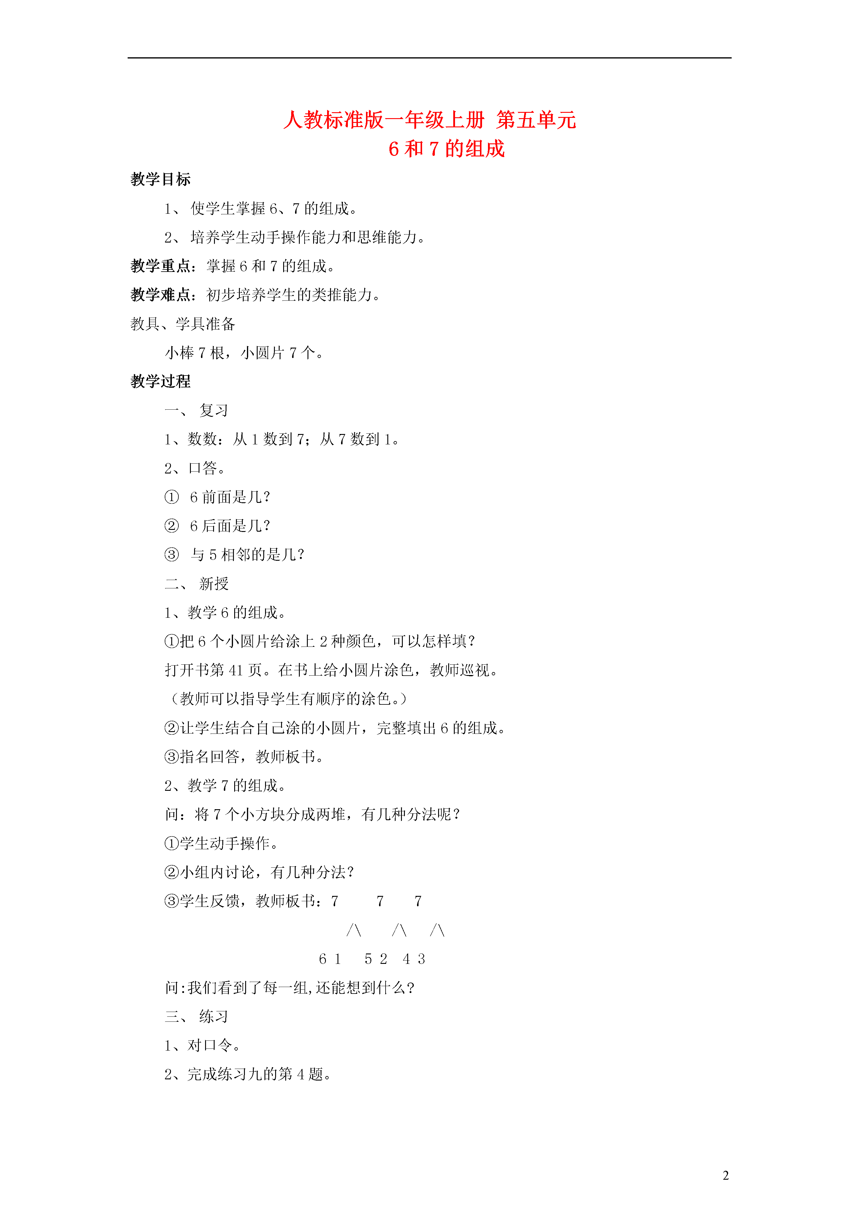 2人教标准版一年级上册第五单元6和7的组成教学目标使学生掌握6、7的组成。培养学生动手操作能力和思维能力。教学重点:掌握6和7的组成。教学难点:初步培养学生的类推能力。教具、学具准备小棒7根,小圆片7个。教学过程复习1、数数:从1数到7;从7数到1。2、口答。6前面是几?6后面是几?与5相邻的是几?新授1、教学6的组成。①把6个小圆片给涂上2种颜色,可以怎样填?打开书。在书上给小圆片涂色,教师巡视。(教师可以指导学生有顺序的涂色。)②让学生结合自己涂的小圆片,完整填出6的组成。③指名回答,教师板书。2、教学7的组成。问:将7个小方块分成两堆,有几种分法呢?①学生动手操作。②小组内讨论,有几种分法?③学生反馈,教师板书:777/\/\/\615243问:我们看到了每一组,还能想到什么?练习1、对口令。2、完成练习九的第4题。板书设计教学反思;