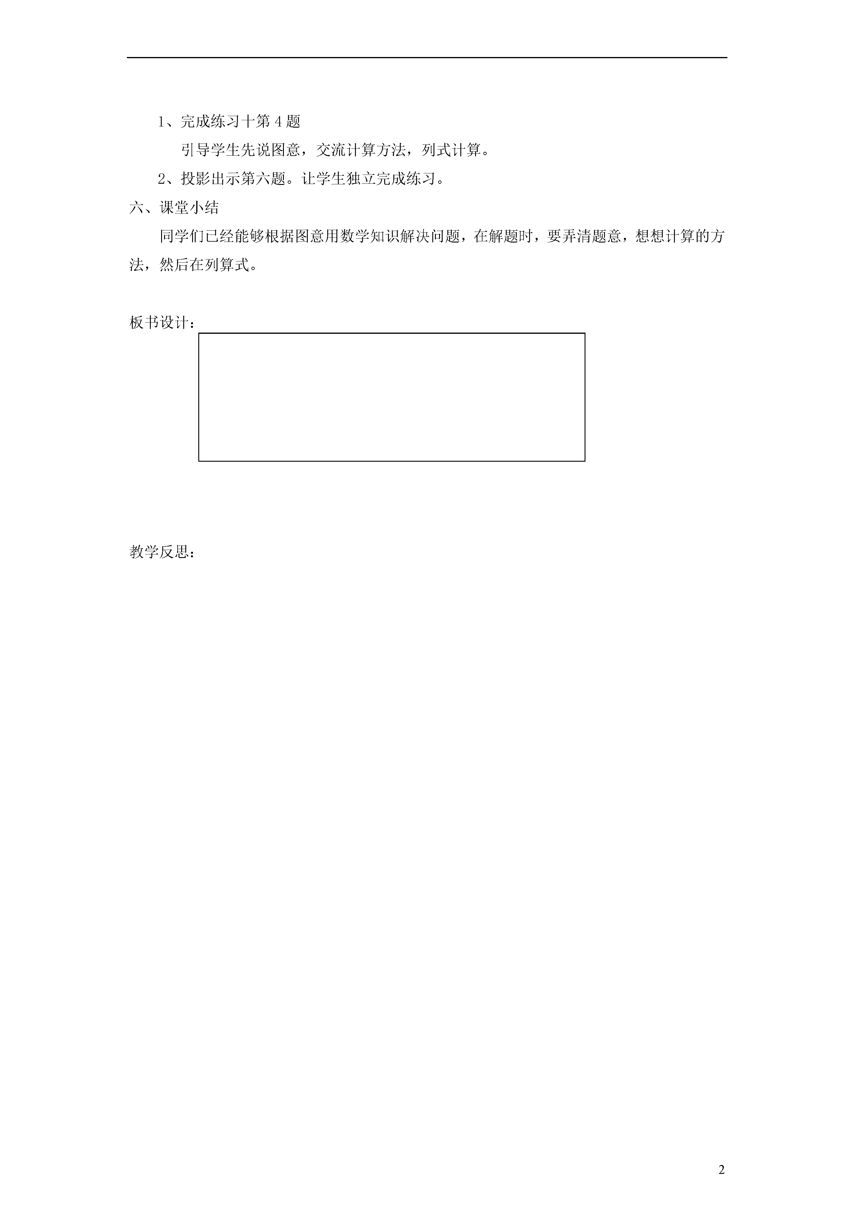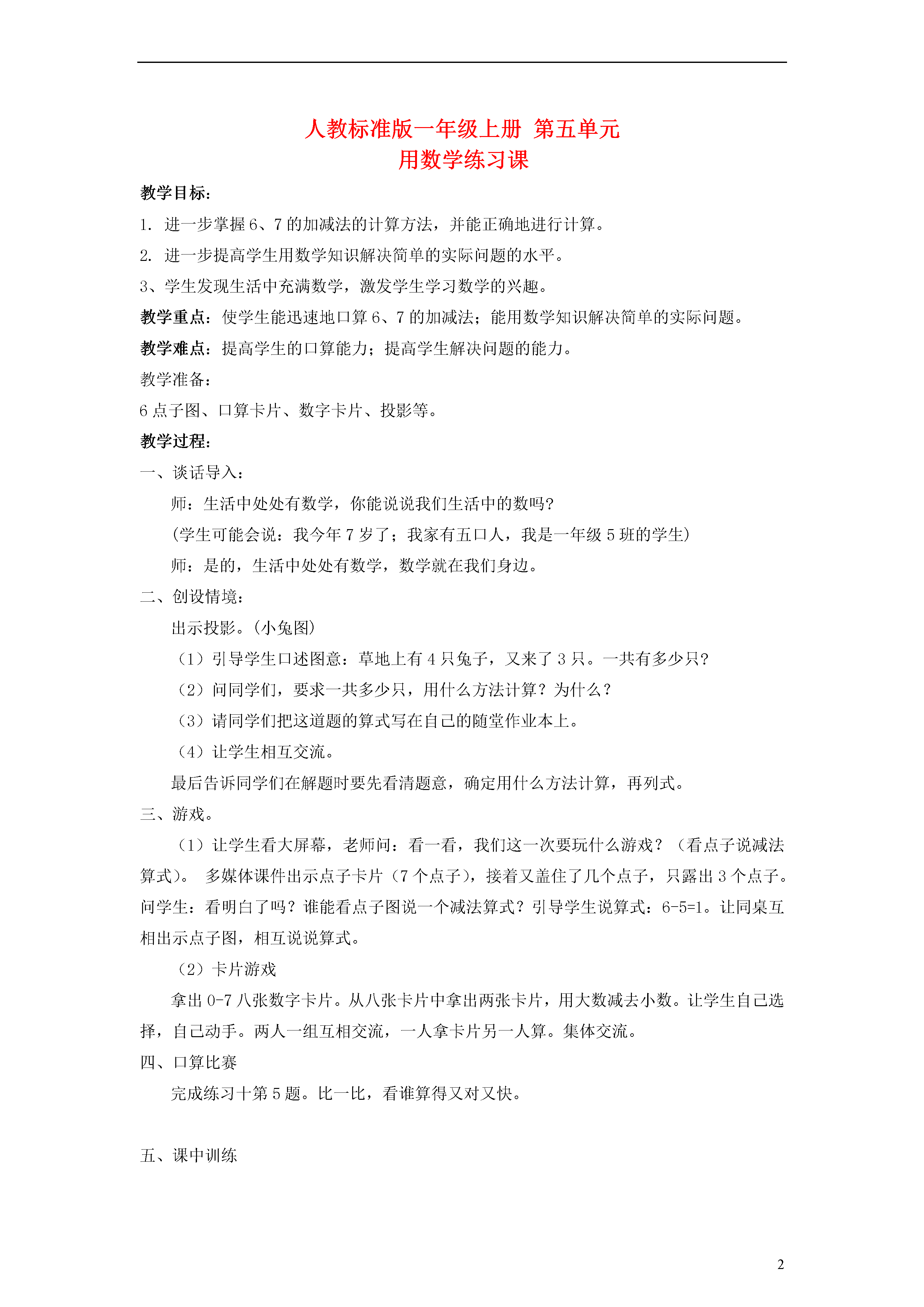 2人教标准版一年级上册第五单元用数学练习课教学目标:1.进一步掌握6、7的加减法的计算方法,并能正确地进行计算。2.进一步提高学生用数学知识解决简单的实际问题的水平。3、学生发现生活中充满数学,激发学生学习数学的兴趣。教学重点:使学生能迅速地口算6、7的加减法;能用数学知识解决简单的实际问题。教学难点:提高学生的口算能力;提高学生解决问题的能力。教学准备:6点子图、口算卡片、数字卡片、投影等。教学过程:一、谈话导入:师:生活中处处有数学,你能说说我们生活中的数吗?(学生可能会说:我今年7岁了;我家有五口人,我是一年级5班的学生)师:是的,生活中处处有数学,数学就在我们身边。二、创设情境:出示投影。(小兔图)(1)引导学生口述图意:草地上有4只兔子,又来了3只。一共有多少只?(2)问同学们,要求一共多少只,用什么方法计算?为什么?(3)请同学们把这道题的算式写在自己的随堂作业本上。(4)让学生相互交流。最后告诉同学们在解题时要先看清题意,确定用什么方法计算,再列式。三、游戏。(1)让学生看大屏幕,老师问:看一看,我们这一次要玩什么游戏?(看点子说减法算式)。多媒体课件出示点子卡片(7个点子),接着又盖住了几个点子,只露出3个点子。问学生:看明白了吗?谁能看点子图说一个减法算式?引导学生说算式:6-5=1。让同桌互相出示点子图,相互说说算式。(2)卡片游戏拿出0-7八张数字卡片。从八张卡片中拿出两张卡片,用大数减去小数。让学生自己选择,自己动手。两人一组互相交流,一人拿卡片另一人算。集体交流。四、口算比赛完成练习十第5题。比一比,看谁算得又对又快。五、课中训练1、完成练习十第4题引导学生先说图意,交流计算方法,列式计算。2、投影出示第六题。让学生独立完成练习。六、课堂小结同学们已经能够根据图意用数学知识解决问题,在解题时,要弄清题意,想想计算的方法,然后在列算式。板书设计:教学反思: