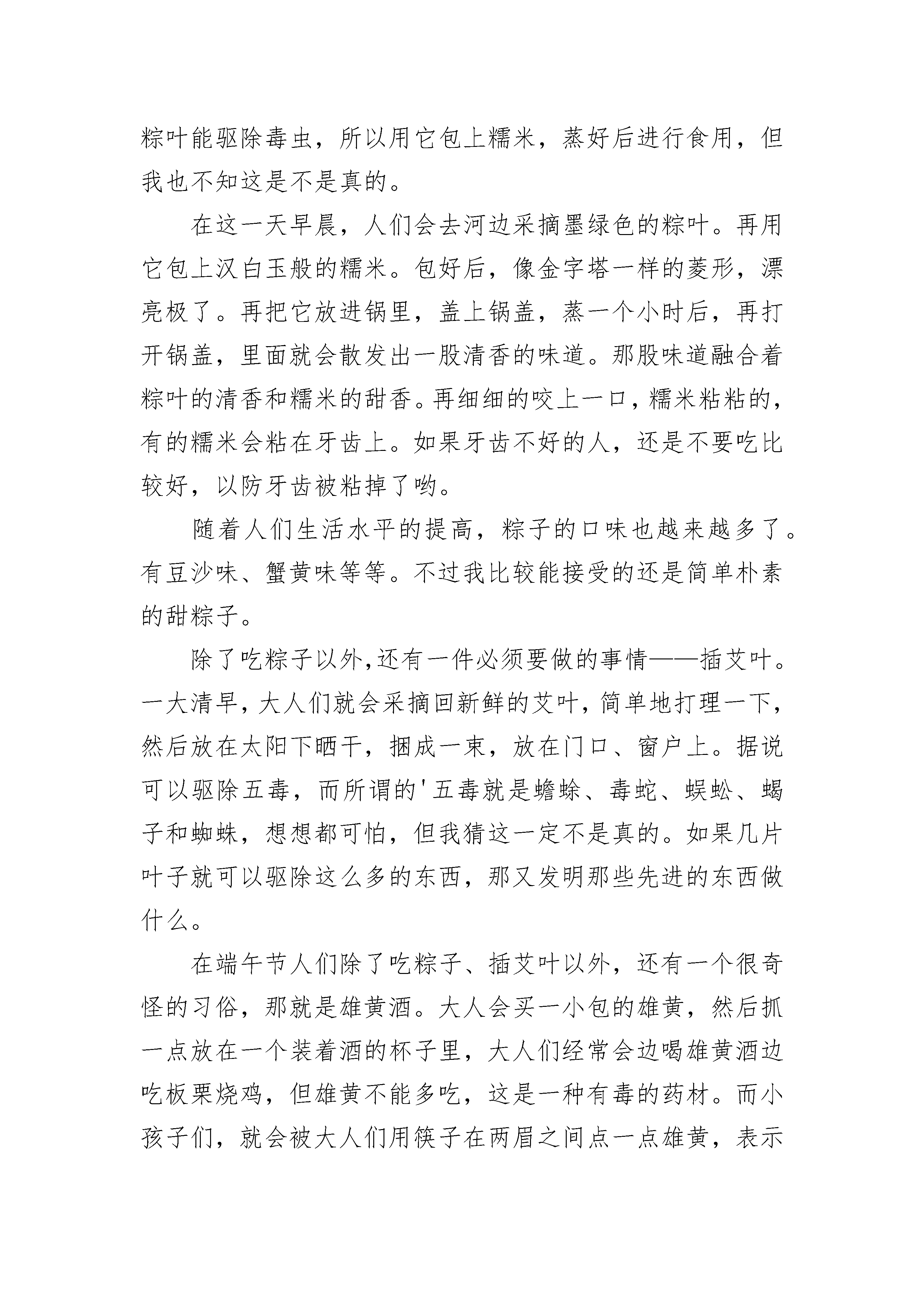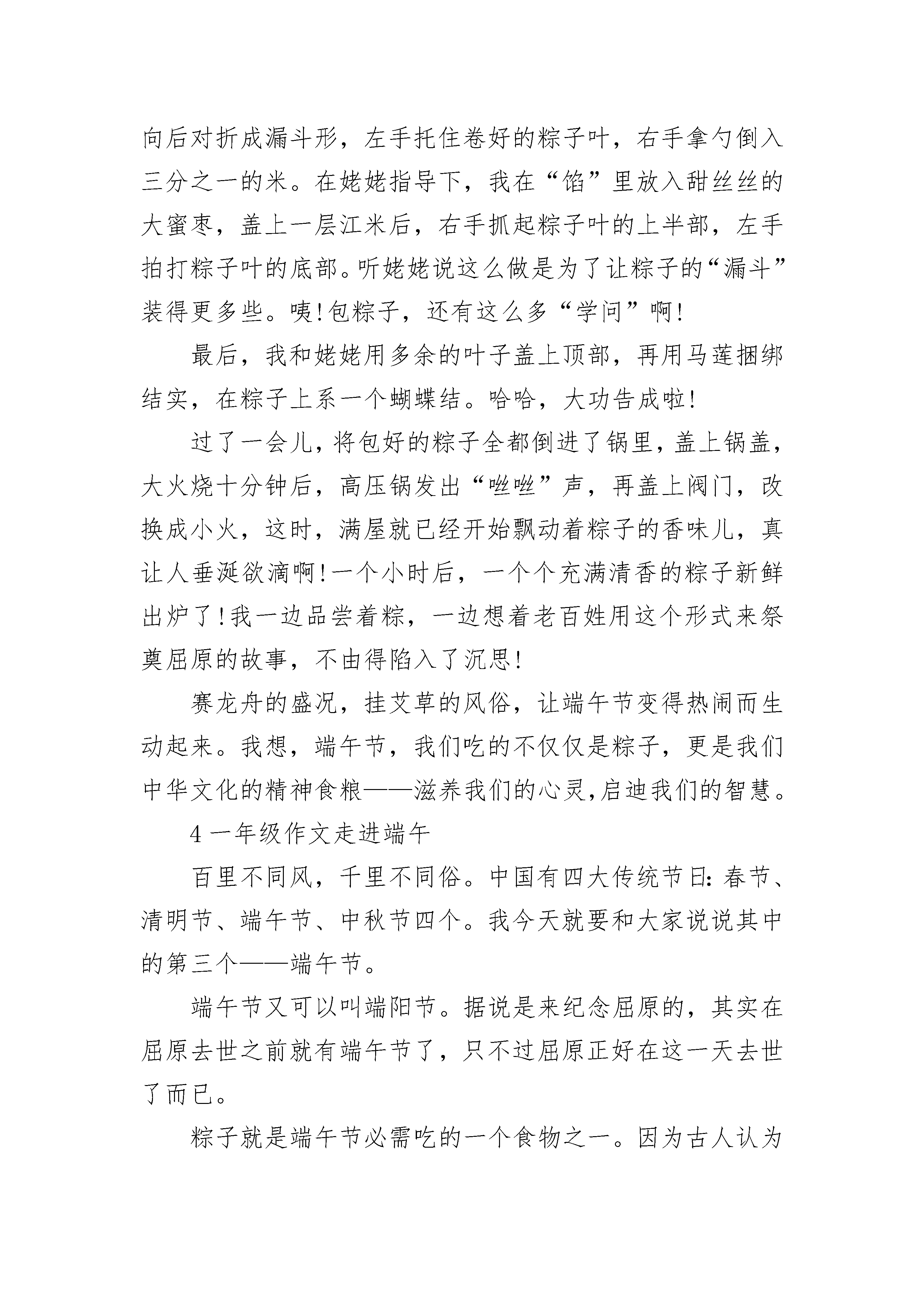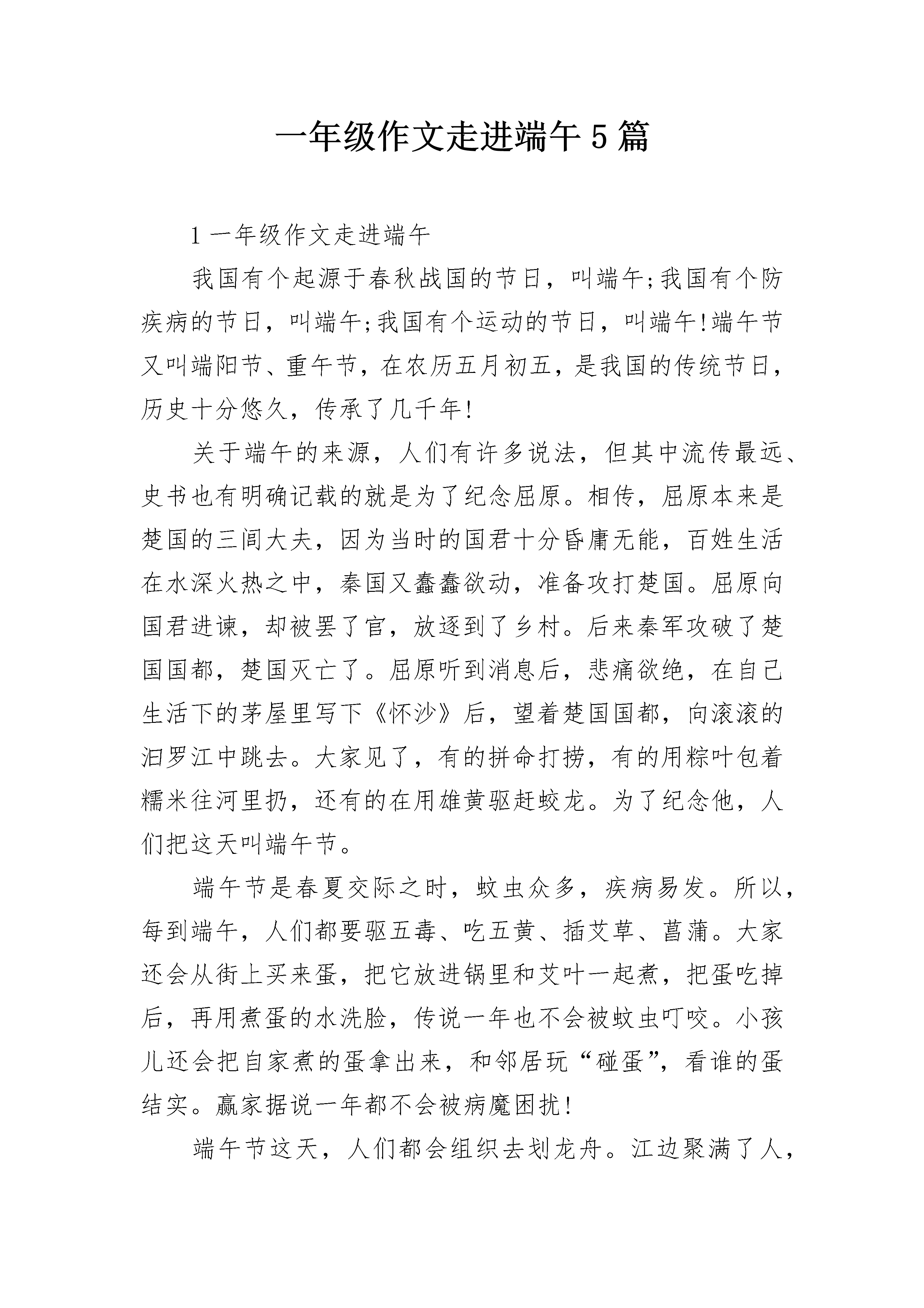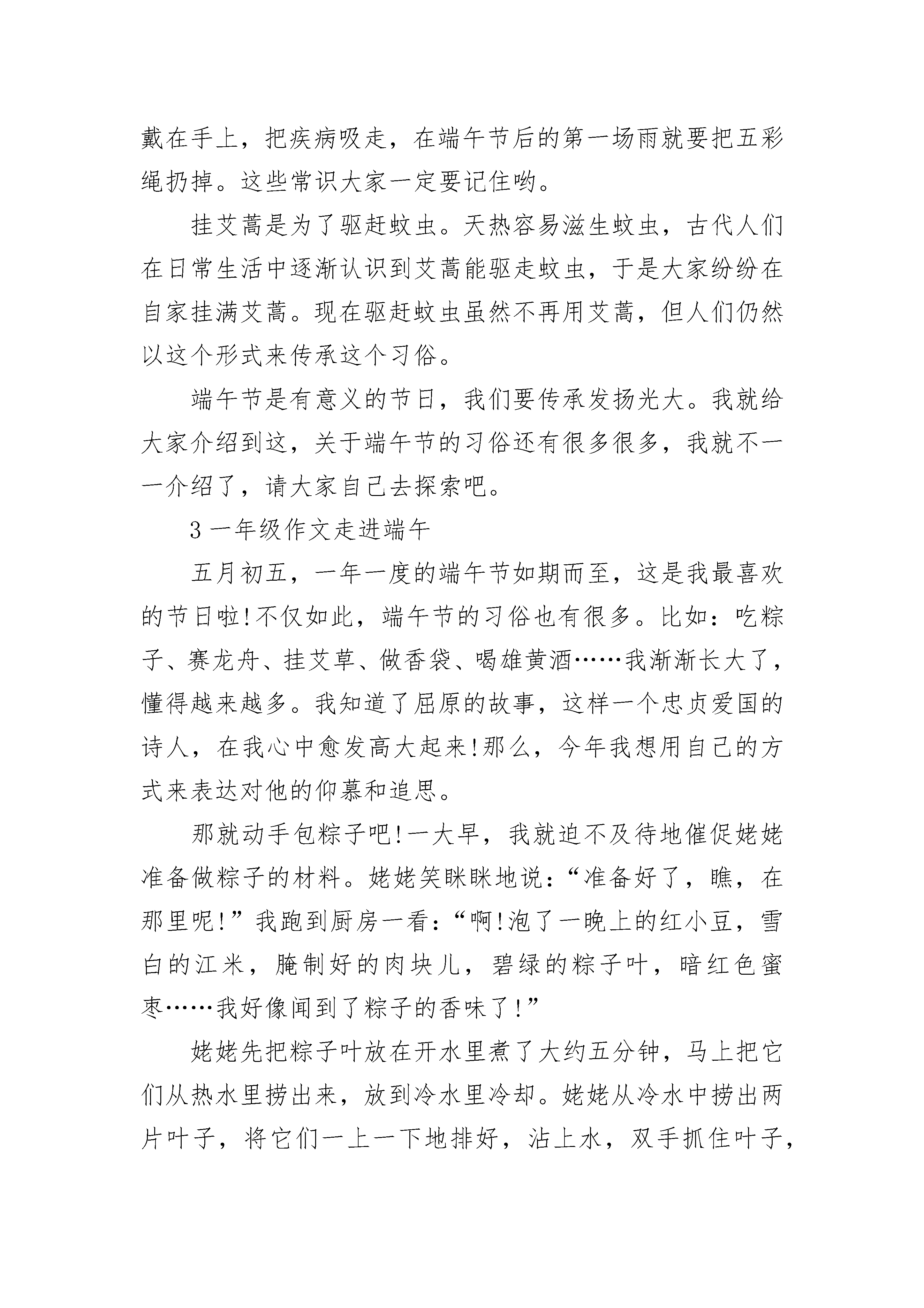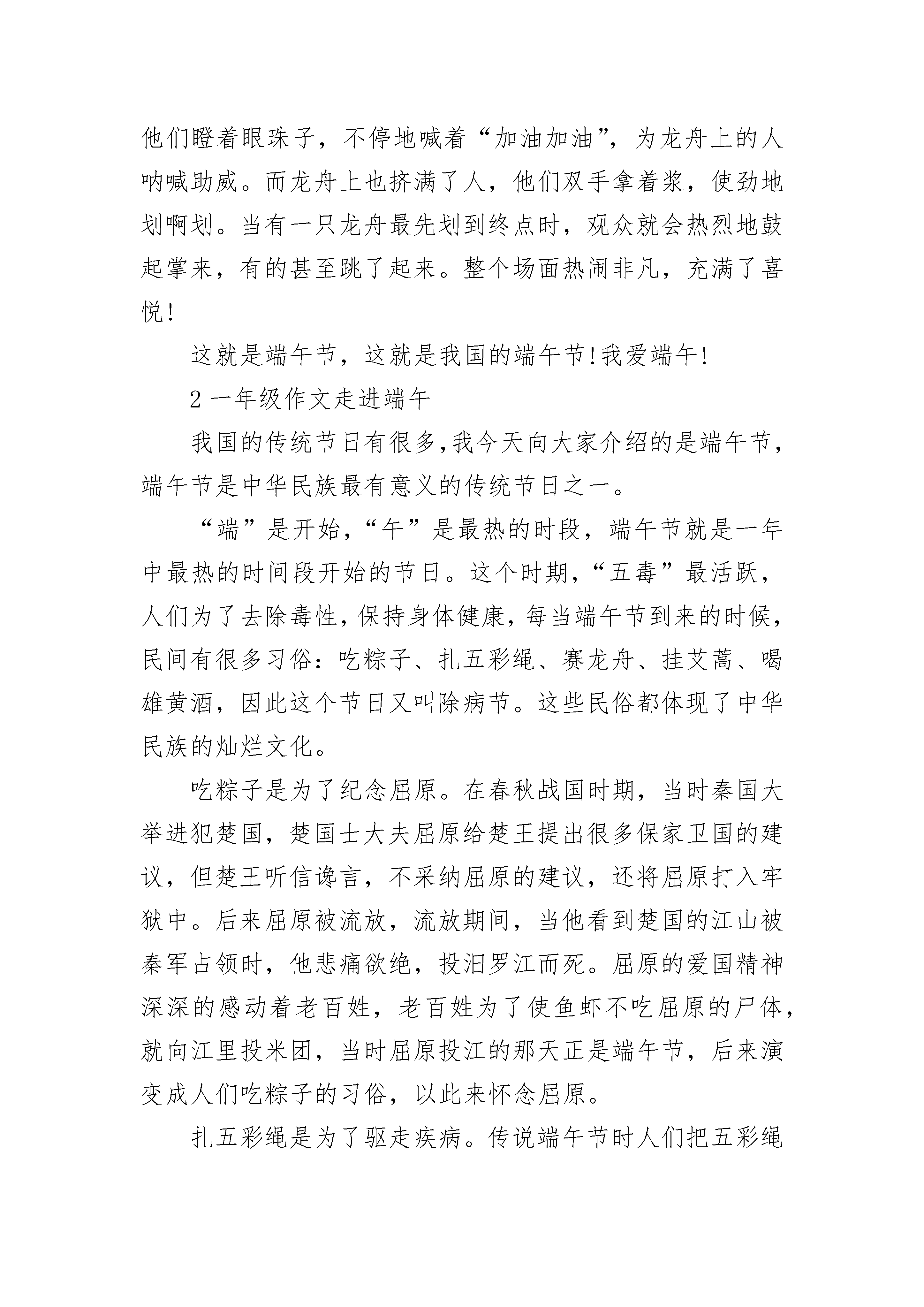 一年级作文走进端午5篇1一年级作文走进端午我国有个起源于春秋战国的节日,叫端午;我国有个防疾病的节日,叫端午;我国有个运动的节日,叫端午!端午节又叫端阳节、重午节,在农历五月初五,是我国的传统节日,历史十分悠久,传承了几千年!关于端午的来源,人们有许多说法,但其中流传最远、史书也有明确记载的就是为了纪念屈原。相传,屈原本来是楚国的三闾大夫,因为当时的国君十分昏庸无能,百姓生活在水深火热之中,秦国又蠢蠢欲动,准备攻打楚国。屈原向国君进谏,却被罢了官,放逐到了乡村。后来秦军攻破了楚国国都,楚国灭亡了。屈原听到消息后,悲痛欲绝,在自己生活下的茅屋里写下《怀沙》后,望着楚国国都,向滚滚的汩罗江中跳去。大家见了,有的拼命打捞,有的用粽叶包着糯米往河里扔,还有的在用雄黄驱赶蛟龙。为了纪念他,人们把这天叫端午节。端午节是春夏交际之时,蚊虫众多,疾病易发。所以,每到端午,人们都要驱五毒、吃五黄、插艾草、菖蒲。大家还会从街上买来蛋,把它放进锅里和艾叶一起煮,把蛋吃掉后,再用煮蛋的水洗脸,传说一年也不会被蚊虫叮咬。小孩儿还会把自家煮的蛋拿出来,和邻居玩“碰蛋”,看谁的蛋结实。赢家据说一年都不会被病魔困扰!端午节这天,人们都会组织去划龙舟。江边聚满了人,他们瞪着眼珠子,不停地喊着“加油加油”,为龙舟上的人呐喊助威。而龙舟上也挤满了人,他们双手拿着浆,使劲地划啊划。当有一只龙舟最先划到终点时,观众就会热烈地鼓起掌来,有的甚至跳了起来。整个场面热闹非凡,充满了喜悦!这就是端午节,这就是我国的端午节!我爱端午!2一年级作文走进端午我国的传统节日有很多,我今天向大家介绍的是端午节,端午节是中华民族最有意义的传统节日之一。“端”是开始,“午”是最热的时段,端午节就是一年中最热的时间段开始的节日。这个时期,“五毒”最活跃,人们为了去除毒性,保持身体健康,每当端午节到来的时候,民间有很多习俗:吃粽子、扎五彩绳、赛龙舟、挂艾蒿、喝雄黄酒,因此这个节日又叫除病节。这些民俗都体现了中华民族的灿烂文化。吃粽子是为了纪念屈原。在春秋战国时期,当时秦国大举进犯楚国,楚国士大夫屈原给楚王提出很多保家卫国的建议,但楚王听信谗言,不采纳屈原的建议,还将屈原打入牢狱中。后来屈原被流放,流放期间,当他看到楚国的江山被秦军占领时,他悲痛欲绝,投汨罗江而死。屈原的爱国精神深深的感动着老百姓,老百姓为了使鱼虾不吃屈原的尸体,就向江里投米团,当时屈原投江的那天正是端午节,后来演变成人们吃粽子的习俗,以此来怀念屈原。扎五彩绳是为了驱走疾病。传说端午节时人们把五彩绳戴在手上,把疾病吸走,在端午节后的第一场雨就要把五彩绳扔掉。这些常识大家一定要记住哟。挂艾蒿是为了驱赶蚊虫。天热容易滋生蚊虫,古代人们在日常生活中逐渐认识到艾蒿能驱走蚊虫,于是大家纷纷在自家挂满艾蒿。现在驱赶蚊虫虽然不再用艾蒿,但人们仍然以这个形式来传承这个习俗。端午节是有意义的节日,我们要传承发扬光大。我就给大家介绍到这,关于端午节的习俗还有很多很多,我就不一一介绍了,请大家自己去探索吧。3一年级作文走进端午五月初五,一年一度的端午节如期而至,这是我最喜欢的节日啦!不仅如此,端午节的习俗也有很多。比如:吃粽子、赛龙舟、挂艾草、做香袋、喝雄黄酒……我渐渐长大了,懂得越来越多。我知道了屈原的故事,这样一个忠贞爱国的诗人,在我心中愈发高大起来!那么,今年我想用自己的方式来表达对他的仰慕和追思。那就动手包粽子吧!一大早,我就迫不及待地催促姥姥准备做粽子的材料。姥姥笑眯眯地说:“准备好了,瞧,在那里呢!”我跑到厨房一看:“啊!泡了一晚上的红小豆,雪白的江米,腌制好的肉块儿,碧绿的粽子叶,暗红色蜜枣……我好像闻到了粽子的香味了!”姥姥先把粽子叶放在开水里煮了大约五分钟,马上把它们从热水里捞出来,放到冷水里冷却。姥姥从冷水中捞出两片叶子,将它们一上一下地排好,沾上水,双手抓住叶子,向后对折成漏斗形,左手托住卷好的粽子叶,右手拿勺倒入三分之一的米。在姥姥指导下,我在“馅”里放入甜丝丝的大蜜枣,盖上一层江米后,右手抓起粽子叶的上半部,左手拍打粽子叶的底部。听姥姥说这么做是为了让粽子的“漏斗”装得更多些。咦!包粽子,还有这么多“学问”啊!最后,我和姥姥用多余的叶子盖上顶部,再用马莲捆绑结实,在粽子上系一个蝴蝶结。哈哈,大功告成啦!过了一会儿,将包好的粽子全都倒进了锅里,盖上锅盖,大火烧十分钟后,高压锅发出“咝咝”声,再盖上阀门,改换成小火,这时,满屋就已经开始飘动着粽子的香味儿,真让人垂涎欲滴啊!一个小时后,一个个充满清香的粽子新鲜出炉了!我一边品尝着粽,一边想着老百姓用这个形式来祭奠屈原的故事,不由得陷入了沉思!赛龙舟的盛况,挂艾草的风俗,让端午节变得热闹而生动起来。我想,端午节,我们吃的不仅仅是粽子,更是我们中华文化的精神食粮——滋养我们的心灵