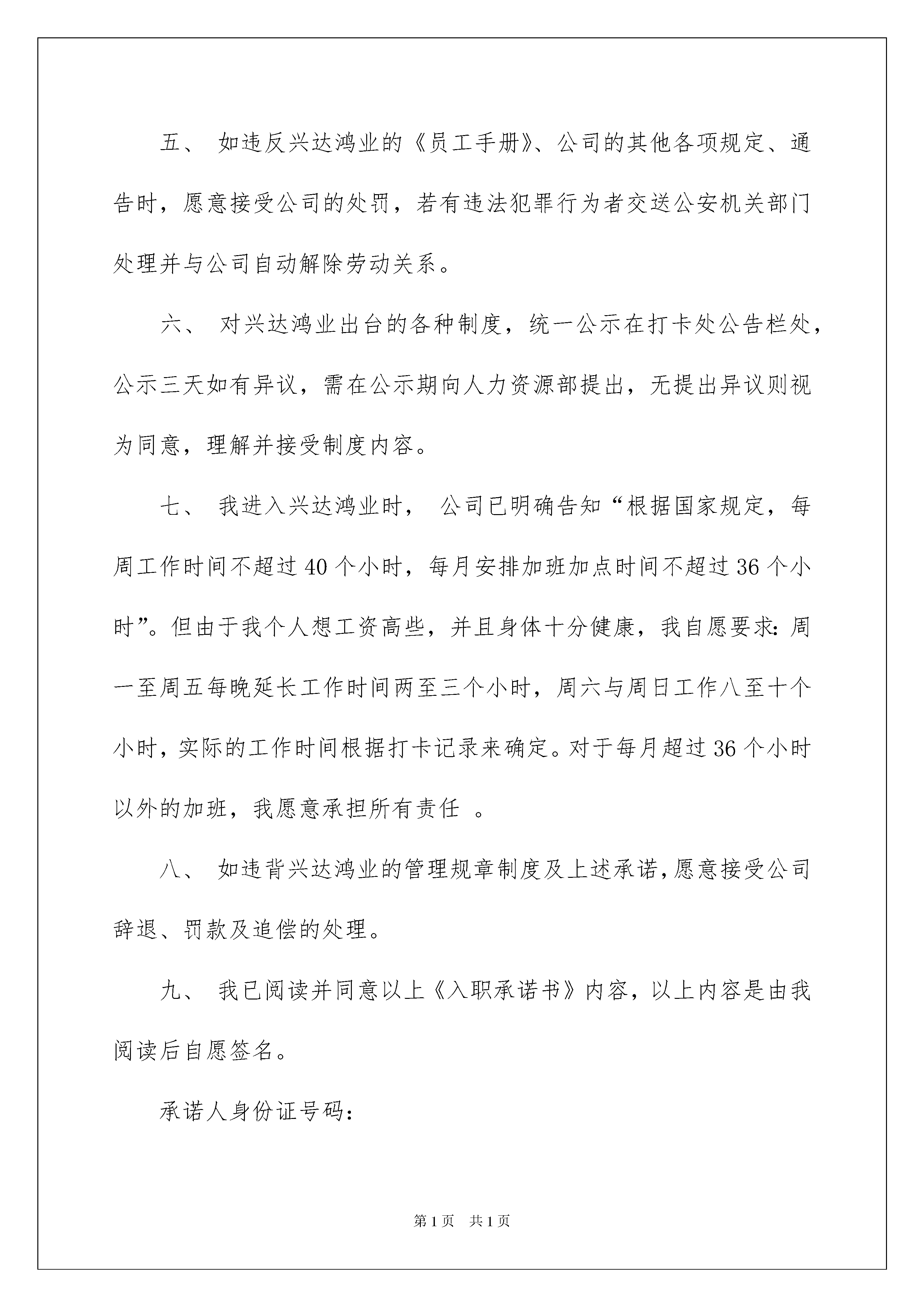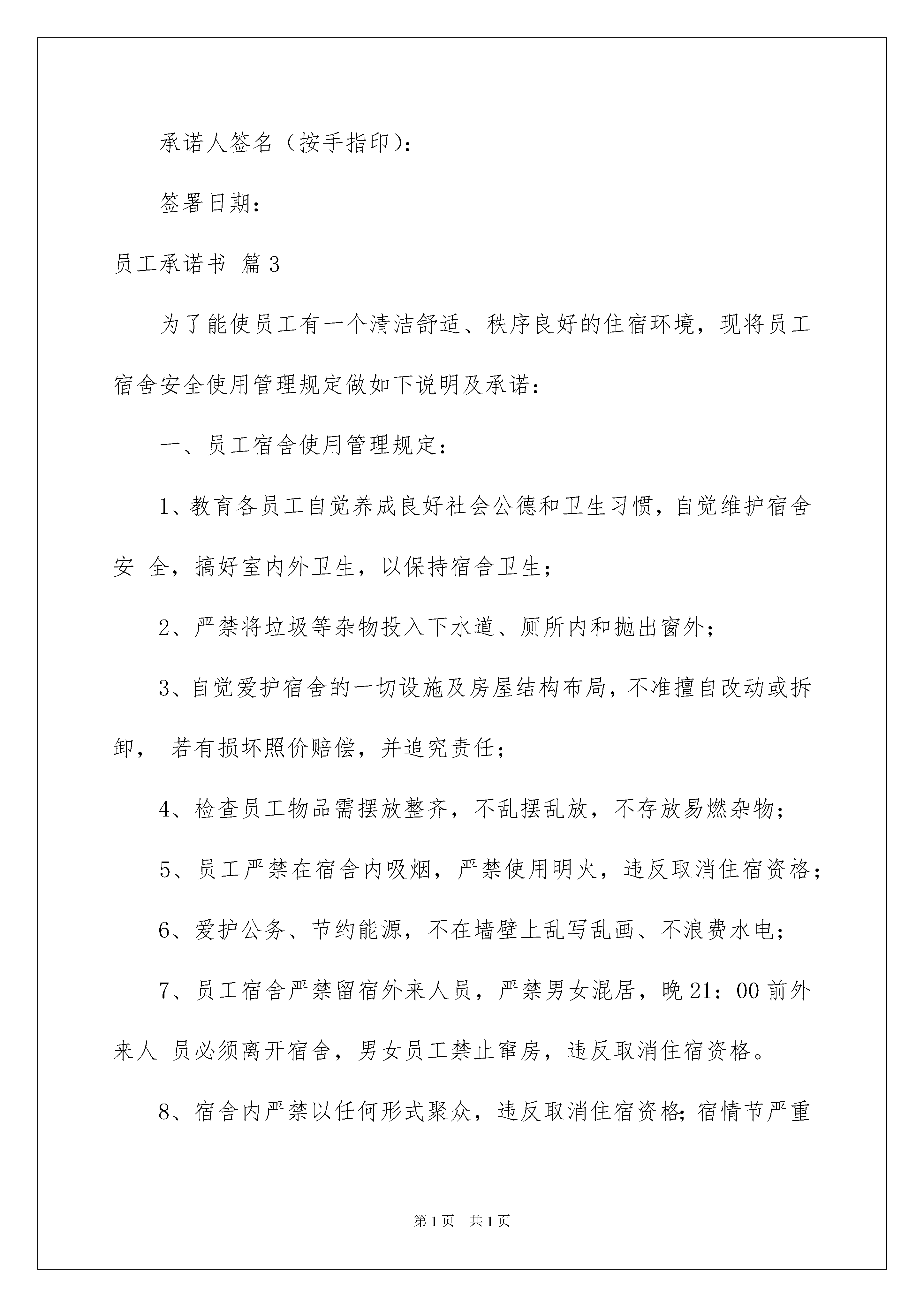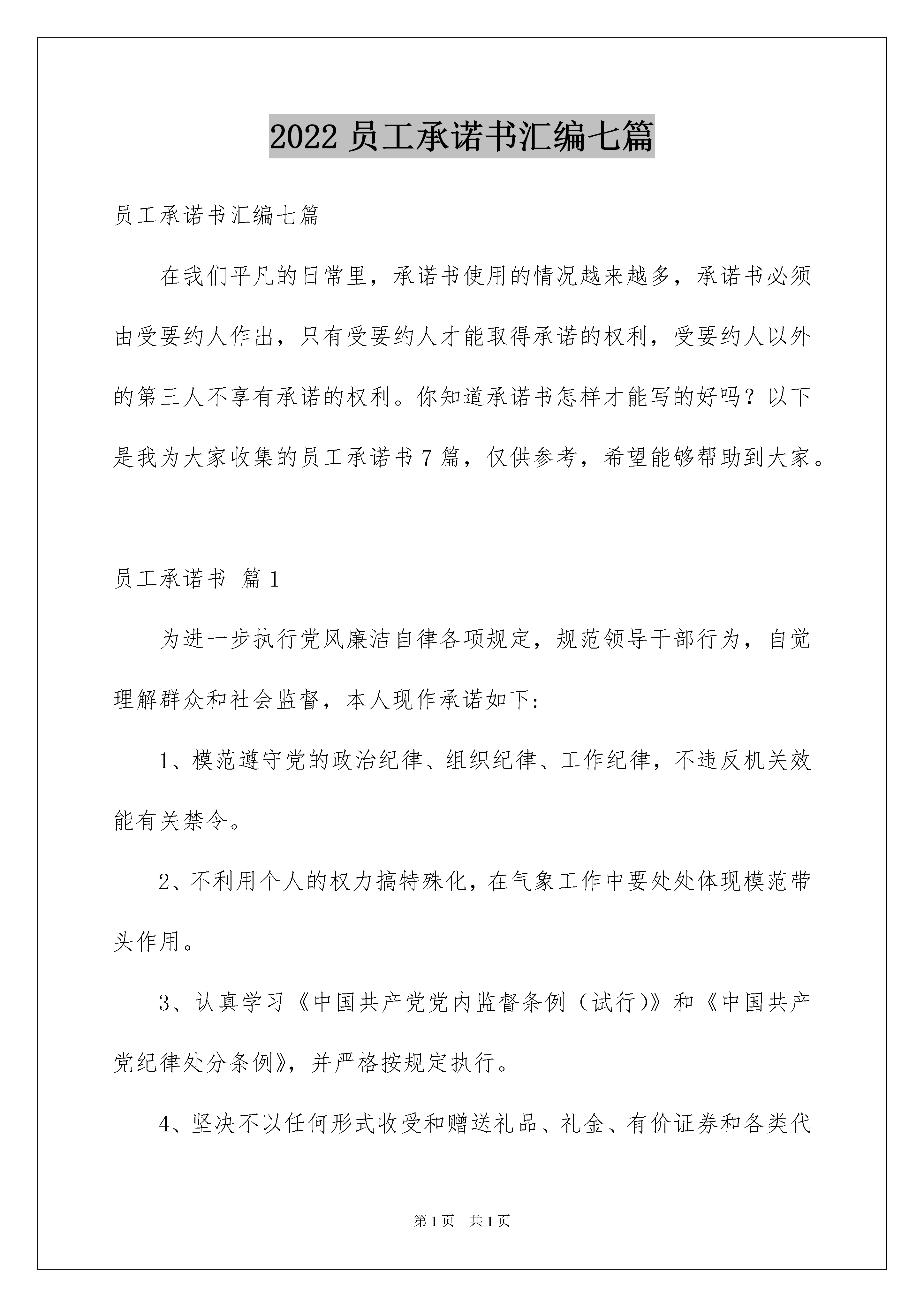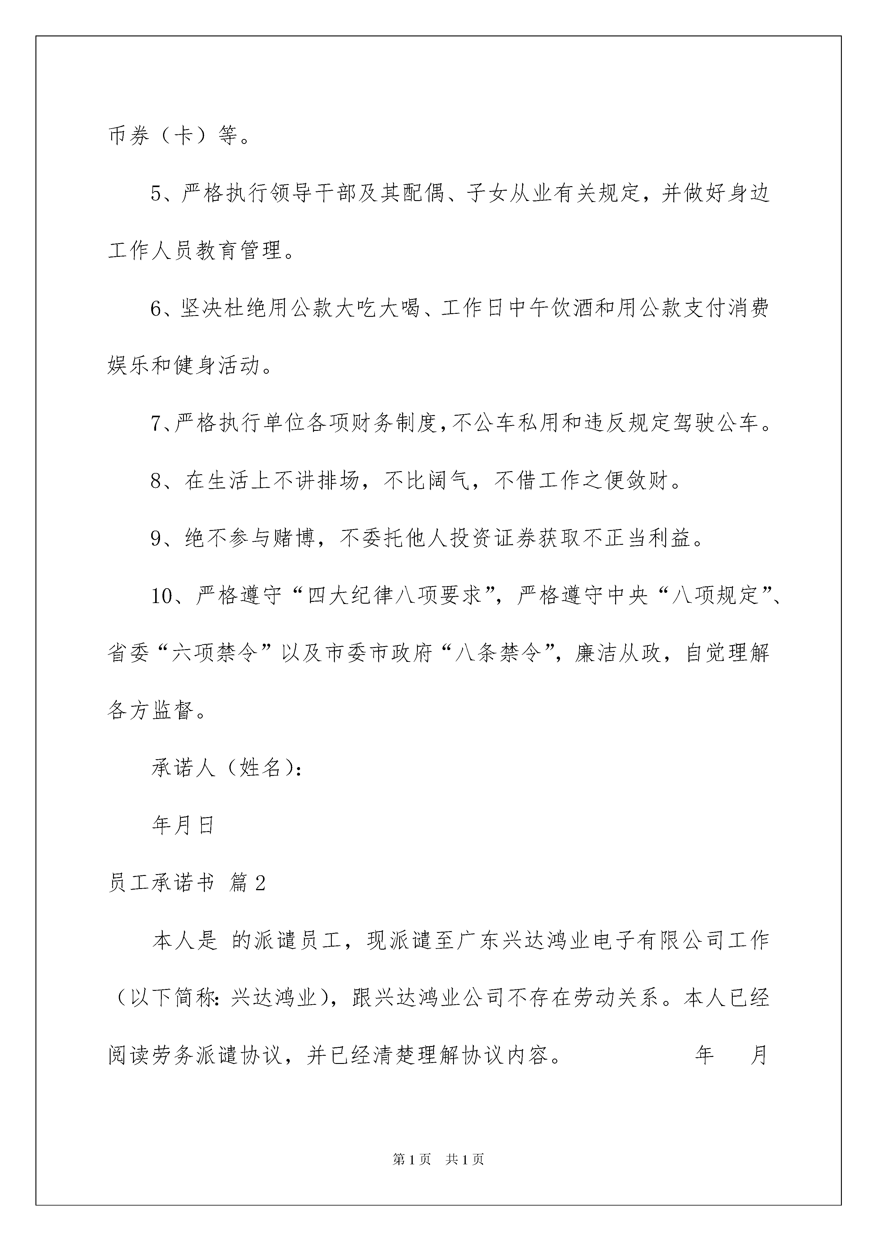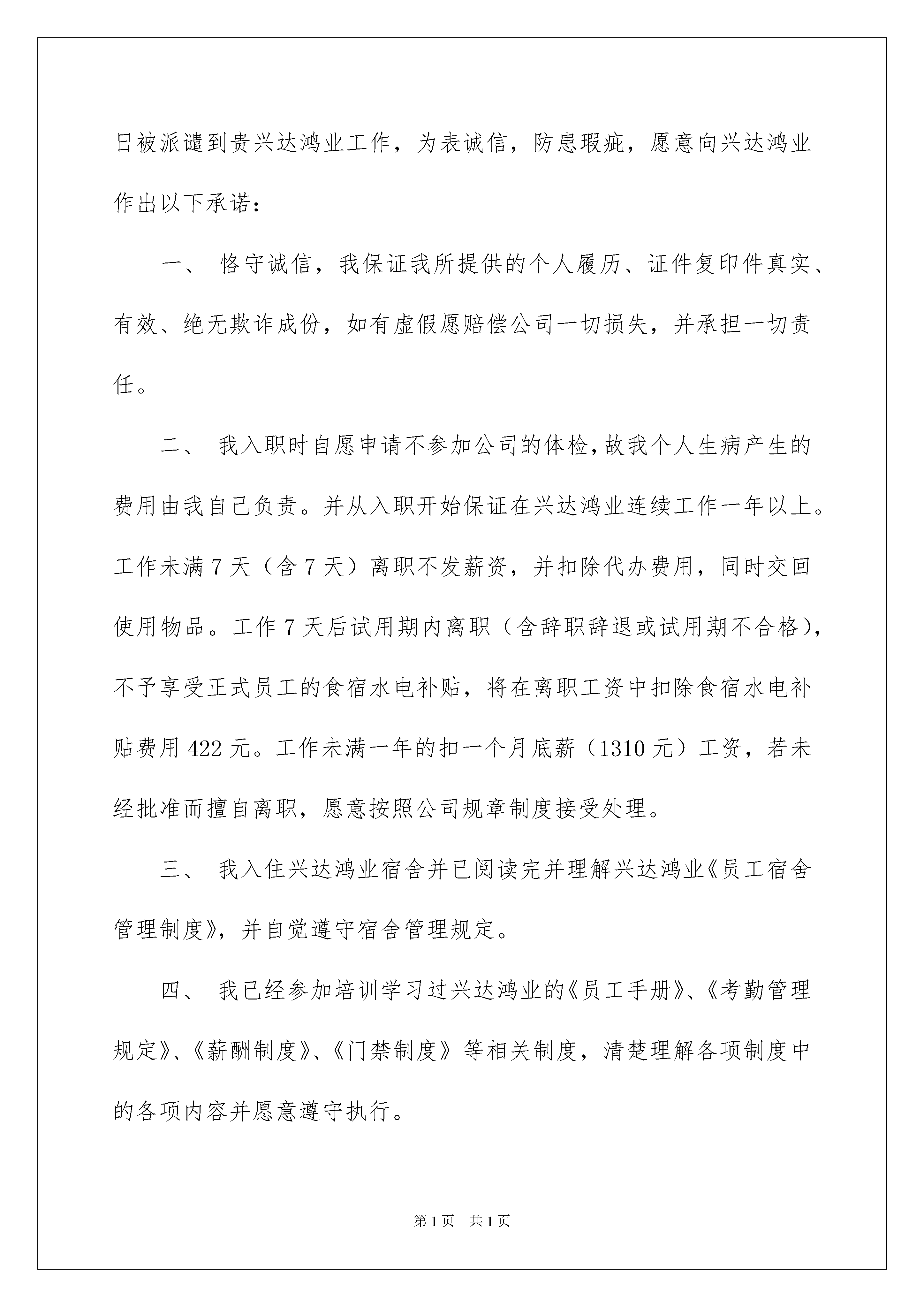 2022员工承诺书汇编七篇员工承诺书汇编七篇在我们平凡的日常里,承诺书使用的情况越来越多,承诺书必须由受要约人作出,只有受要约人才能取得承诺的权利,受要约人以外的第三人不享有承诺的权利。你知道承诺书怎样才能写的好吗?以下是我为大家收集的员工承诺书7篇,仅供参考,希望能够帮助到大家。员工承诺书篇1为进一步执行党风廉洁自律各项规定,规范领导干部行为,自觉理解群众和社会监督,本人现作承诺如下:1、模范遵守党的政治纪律、组织纪律、工作纪律,不违反机关效能有关禁令。2、不利用个人的权力搞特殊化,在气象工作中要处处体现模范带头作用。3、认真学习《中国共产党党内监督条例(试行)》和《中国共产党纪律处分条例》,并严格按规定执行。4、坚决不以任何形式收受和赠送礼品、礼金、有价证券和各类代币券(卡)等。5、严格执行领导干部及其配偶、子女从业有关规定,并做好身边工作人员教育管理。6、坚决杜绝用公款大吃大喝、工作日中午饮酒和用公款支付消费娱乐和健身活动。7、严格执行单位各项财务制度,不公车私用和违反规定驾驶公车。8、在生活上不讲排场,不比阔气,不借工作之便敛财。9、绝不参与赌博,不委托他人投资证券获取不正当利益。10、严格遵守“四大纪律八项要求”,严格遵守中央“八项规定”、省委“六项禁令”以及市委市政府“八条禁令”,廉洁从政,自觉理解各方监督。承诺人(姓名):年月日员工承诺书篇2本人是的派谴员工,现派谴至广东兴达鸿业电子有限公司工作(以下简称:兴达鸿业),跟兴达鸿业公司不存在劳动关系。本人已经阅读劳务派谴协议,并已经清楚理解协议内容。年月日被派谴到贵兴达鸿业工作,为表诚信,防患瑕疵,愿意向兴达鸿业作出以下承诺:一、恪守诚信,我保证我所提供的个人履历、证件复印件真实、有效、绝无欺诈成份,如有虚假愿赔偿公司一切损失,并承担一切责任。二、我入职时自愿申请不参加公司的体检,故我个人生病产生的费用由我自己负责。并从入职开始保证在兴达鸿业连续工作一年以上。工作未满7天(含7天)离职不发薪资,并扣除代办费用,同时交回使用物品。工作7天后试用期内离职(含辞职辞退或试用期不合格),不予享受正式员工的食宿水电补贴,将在离职工资中扣除食宿水电补贴费用422元。工作未满一年的扣一个月底薪(1310元)工资,若未经批准而擅自离职,愿意按照公司规章制度接受处理。三、我入住兴达鸿业宿舍并已阅读完并理解兴达鸿业《员工宿舍管理制度》,并自觉遵守宿舍管理规定。四、我已经参加培训学习过兴达鸿业的《员工手册》、《考勤管理规定》、《薪酬制度》、《门禁制度》等相关制度,清楚理解各项制度中的各项内容并愿意遵守执行。五、如违反兴达鸿业的《员工手册》、公司的其他各项规定、通告时,愿意接受公司的处罚,若有违法犯罪行为者交送公安机关部门处理并与公司自动解除劳动关系。六、对兴达鸿业出台的各种制度,统一公示在打卡处公告栏处,公示三天如有异议,需在公示期向人力资源部提出,无提出异议则视为同意,理解并接受制度内容。七、我进入兴达鸿业时,公司已明确告知“根据国家规定,每周工作时间不超过40个小时,每月安排加班加点时间不超过36个小时”。但由于我个人想工资高些,并且身体十分健康,我自愿要求:周一至周五每晚延长工作时间两至三个小时,周六与周日工作八至十个小时,实际的工作时间根据打卡记录来确定。对于每月超过36个小时以外的加班,我愿意承担所有责任。八、如违背兴达鸿业的管理规章制度及上述承诺,愿意接受公司辞退、罚款及追偿的处理。九、我已阅读并同意以上《入职承诺书》内容,以上内容是由我阅读后自愿签名。承诺人身份证号码:承诺人签名(按手指印):签署日期:员工承诺书篇3为了能使员工有一个清洁舒适、秩序良好的住宿环境,现将员工宿舍安全使用管理规定做如下说明及承诺:一、员工宿舍使用管理规定:1、教育各员工自觉养成良好社会公德和卫生习惯,自觉维护宿舍安全,搞好室内外卫生,以保持宿舍卫生;2、严禁将垃圾等杂物投入下水道、厕所内和抛出窗外;3、自觉爱护宿舍的一切设施及房屋结构布局,不准擅自改动或拆卸,若有损坏照价赔偿,并追究责任;4、检查员工物品需摆放整齐,不乱摆乱放,不存放易燃杂物;5、员工严禁在宿舍内吸烟,严禁使用明火,违反取消住宿资格;6、爱护公务、节约能源,不在墙壁上乱写乱画、不浪费水电;7、员工宿舍严禁留宿外来人员,严禁男女混居,晚21:00前外来人员必须离开宿舍,男女员工禁止窜房,违反取消住宿资格。8、宿舍内严禁以任何形式聚众,违反取消住宿资格;宿情节严重者送交公安机关处理;9、未经同意不得私自用别人物品、以免造成误会,引起不必要的纠纷。偷盗他人财物之行为,一经发现开除