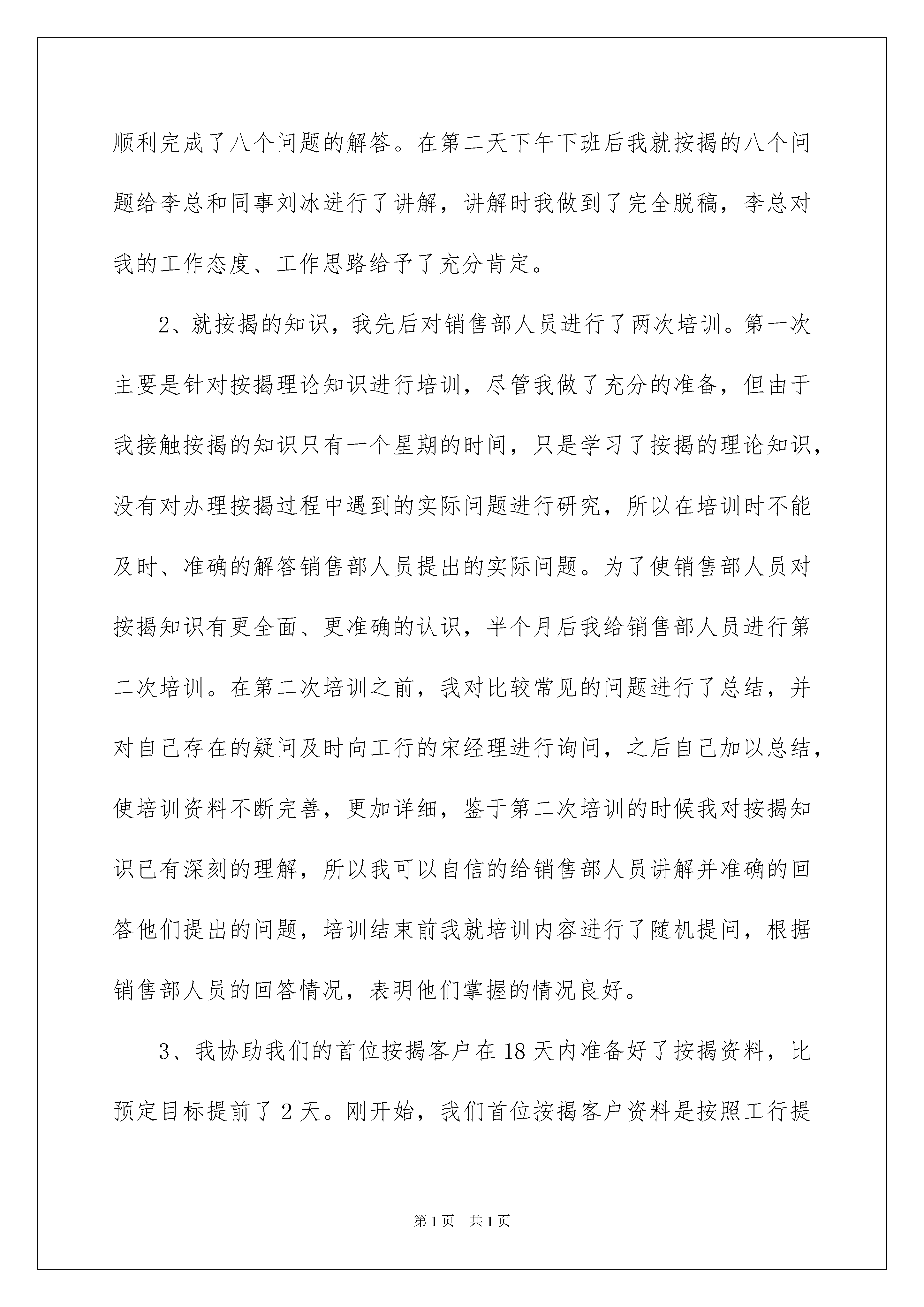 2022员工试用期述职报告合集6篇员工试用期述职报告合集6篇在现在社会,报告使用的次数愈发增长,报告根据用途的不同也有着不同的类型。你所见过的报告是什么样的呢?下面是我帮大家整理的员工试用期述职报告6篇,欢迎阅读与收藏。员工试用期述职报告篇1我是北京冠xx地产咨询有限公司商务部总监助理杜xx,我于20xx年10月21日进入公司,开始为期三天的无薪试用,20xx年10月26日正式进入试用期,届时试用期已满一个月,特向公司提出转正申请。下面我主要就我的工作内容、工作目标、执行计划、执行效果、执行总结及转正后工作展望五个方面进行汇报:一、工作内容进入试用期以来,我的工作主要是:1、掌握按揭的相关知识,并给销售部人员培训;2、协助我们的按揭客户准备办理按揭所需资料;3、及时更新销售状态的记录。二、工作目标有目标才会有前进的方向。试用期中,我的业务目标是在15天内有能力给销售部人员培训按揭的知识;在20天内协助我们的首位按揭客户准备好按揭资料;确保房源销售状态、签约信息、回款情况以及月度销售签约资金回收统计一致。试用期中,我的个人目标是在20天内可以有思路的安排自己的工作事项;一个月后能够顺利转正。三、执行计划为了实现工作目标,我的执行计划如下:1、工作前三天上网搜索按揭的相关知识,并整理成资料。2、工作7日内就我了解的按揭知识对销售部人员进行理论知识的培训。工作思路是:在培训之前整理好培训资料,为方便讲解,制作成PPT。培训后,总结销售部人员期望了解的按揭问题,并在一周内整理出来。3、通知我们的首位按揭客户准备办理按揭资料,拟定在20天内准备齐全。由于之前没有经验,协助我们的首位按揭客户准备按揭资料,主要是在"通路",一方面了解办理按揭需提供什么资料、怎样准备资料,一方面与工行负责按揭的曹主任、宋经理建立良好的友谊,树立好公司形象和个人形象。4、工作15日内有能力为销售部人员培训按揭的知识,并让他们感觉到我很专业。工作思路是:在第二次培训之前,对比较常见的问题进行总结,并对自己存在的疑问及时向工行的宋经理询问、总结,使培训资料不断完善、更加准确、有理有据。5、在3天内,结合认购单、签约单、收据制定出签约信息统计表、回款情况统计表及月度销售签约资金回收统计表,保证内容一致。6、在试用期,端正学习态度,做好自己的本职工作。做到不迟到、不早退、不旷工,并自愿加班学习专业知识,以求顺利开展工作及顺利转正。四、执行效果"华人管理教育第一人"余世维曾经说过"决战商场,赢在执行!"这说明了执行力在工作中的重要性,换言之,一个人的工作业绩和他对工作的执行情况是密切相关的。现将我对工作的执行情况总结如下:1、我超额完成了"无薪试用"的工作任务。刚进入公司,李总给我出了按揭的八个问题,包括按揭的含义、按揭出现的原因、办理按揭的条件、流程、所需资料、按揭还款方式、按揭客户能否提前还款、二次购房按揭的规定,要求我在三天内完成。实际上,我在第一天就顺利完成了八个问题的解答。在第二天下午下班后我就按揭的八个问题给李总和同事刘冰进行了讲解,讲解时我做到了完全脱稿,李总对我的工作态度、工作思路给予了充分肯定。2、就按揭的知识,我先后对销售部人员进行了两次培训。第一次主要是针对按揭理论知识进行培训,尽管我做了充分的准备,但由于我接触按揭的知识只有一个星期的时间,只是学习了按揭的理论知识,没有对办理按揭过程中遇到的实际问题进行研究,所以在培训时不能及时、准确的解答销售部人员提出的实际问题。为了使销售部人员对按揭知识有更全面、更准确的认识,半个月后我给销售部人员进行第二次培训。在第二次培训之前,我对比较常见的问题进行了总结,并对自己存在的疑问及时向工行的宋经理进行询问,之后自己加以总结,使培训资料不断完善,更加详细,鉴于第二次培训的时候我对按揭知识已有深刻的理解,所以我可以自信的给销售部人员讲解并准确的回答他们提出的问题,培训结束前我就培训内容进行了随机提问,根据销售部人员的回答情况,表明他们掌握的情况良好。3、我协助我们的首位按揭客户在18天内准备好了按揭资料,比预定目标提前了2天。刚开始,我们首位按揭客户资料是按照工行提供的《资料清单》准备的,拿到工行审核,工行宋经理基于我们的首位按揭客户无法提交个人收入符合银行要求的证明,又由于他是企业法人代表,所以让其补充公司资料,我一方面通知客户补充资料,一方面完善《办理按揭资料清单》,把学到的知识添加到资料清单中。三天后,我拿着该客户的`资料到工行请宋经理再次审核,宋经理又提出了新的问题:验资报告需整本复印、造三个月工资表,之后我再联系客户,再完善《办理按揭资料清单》,并