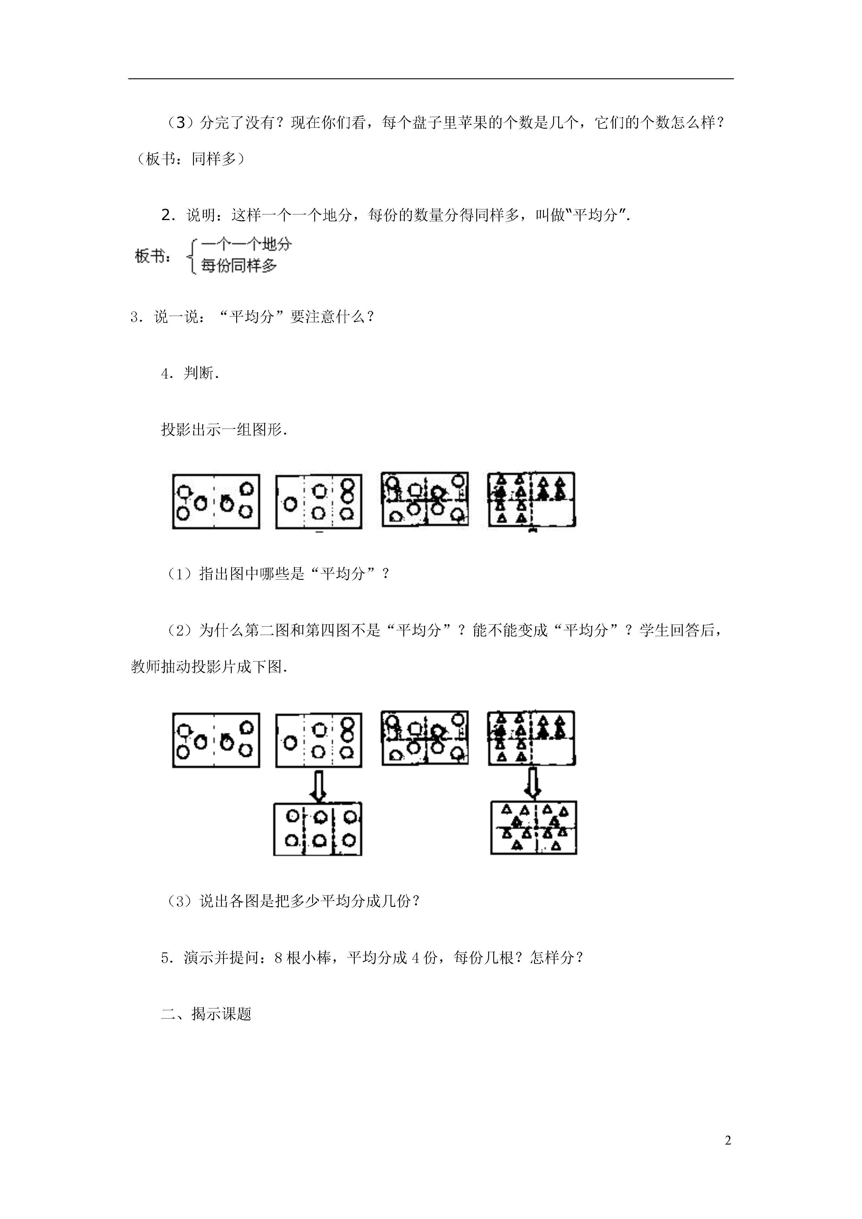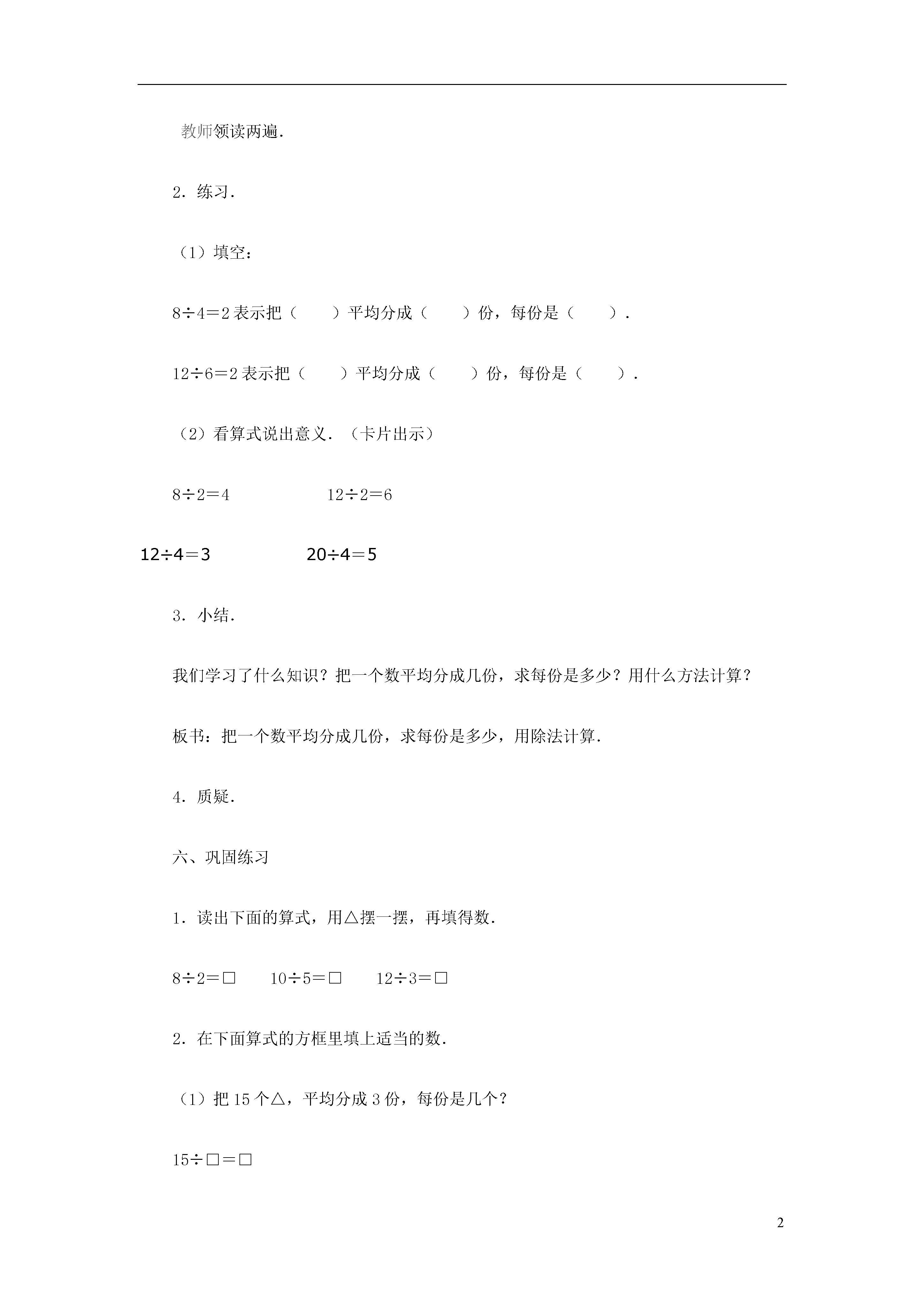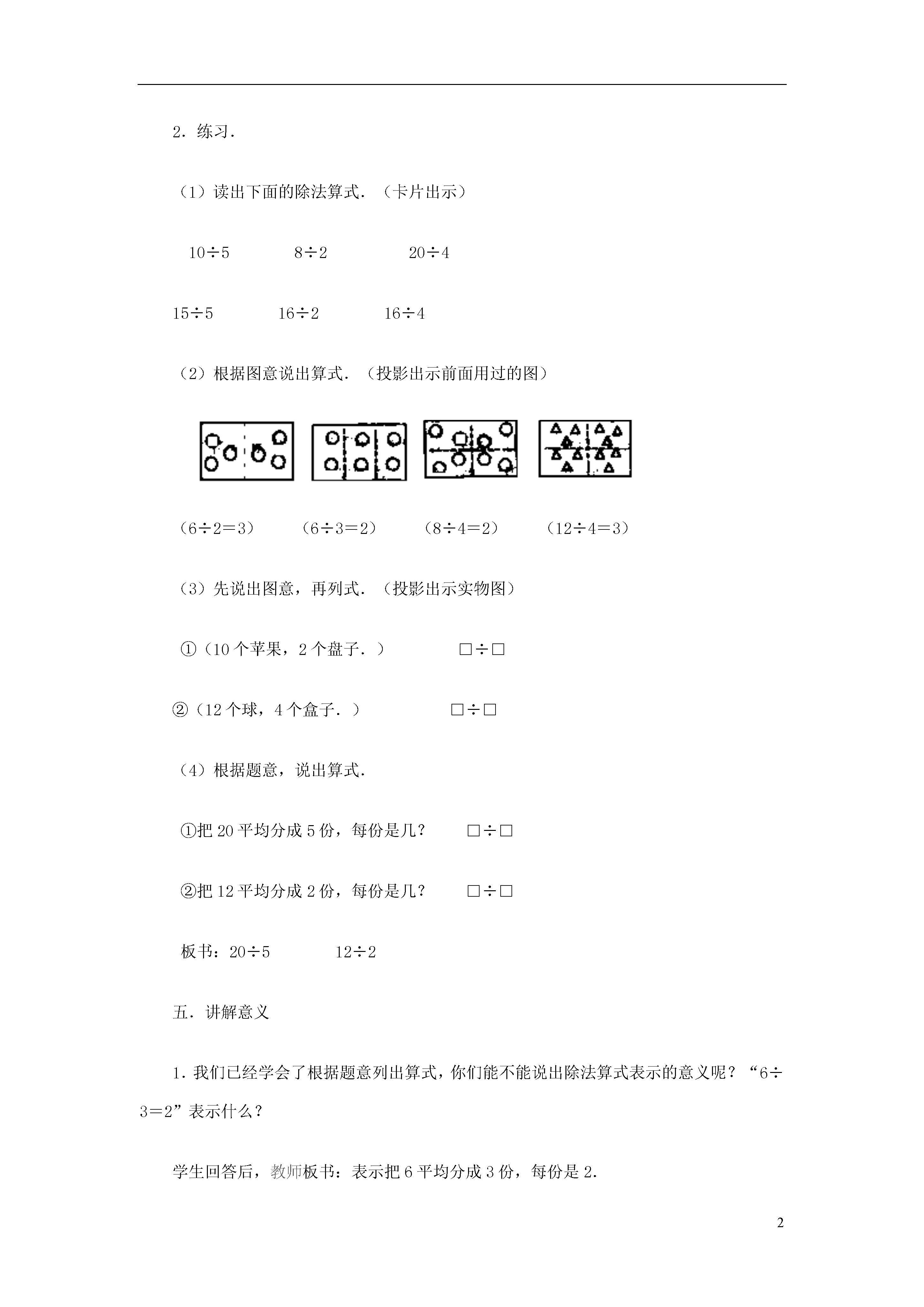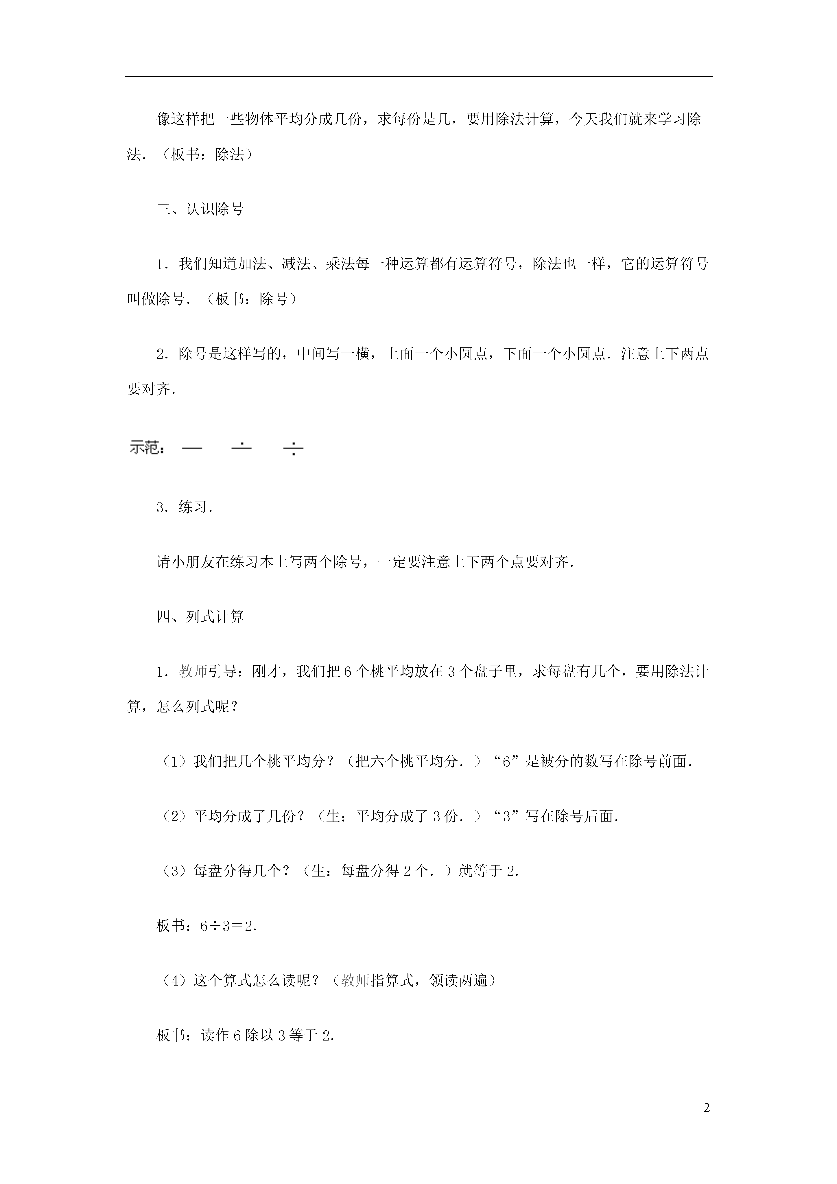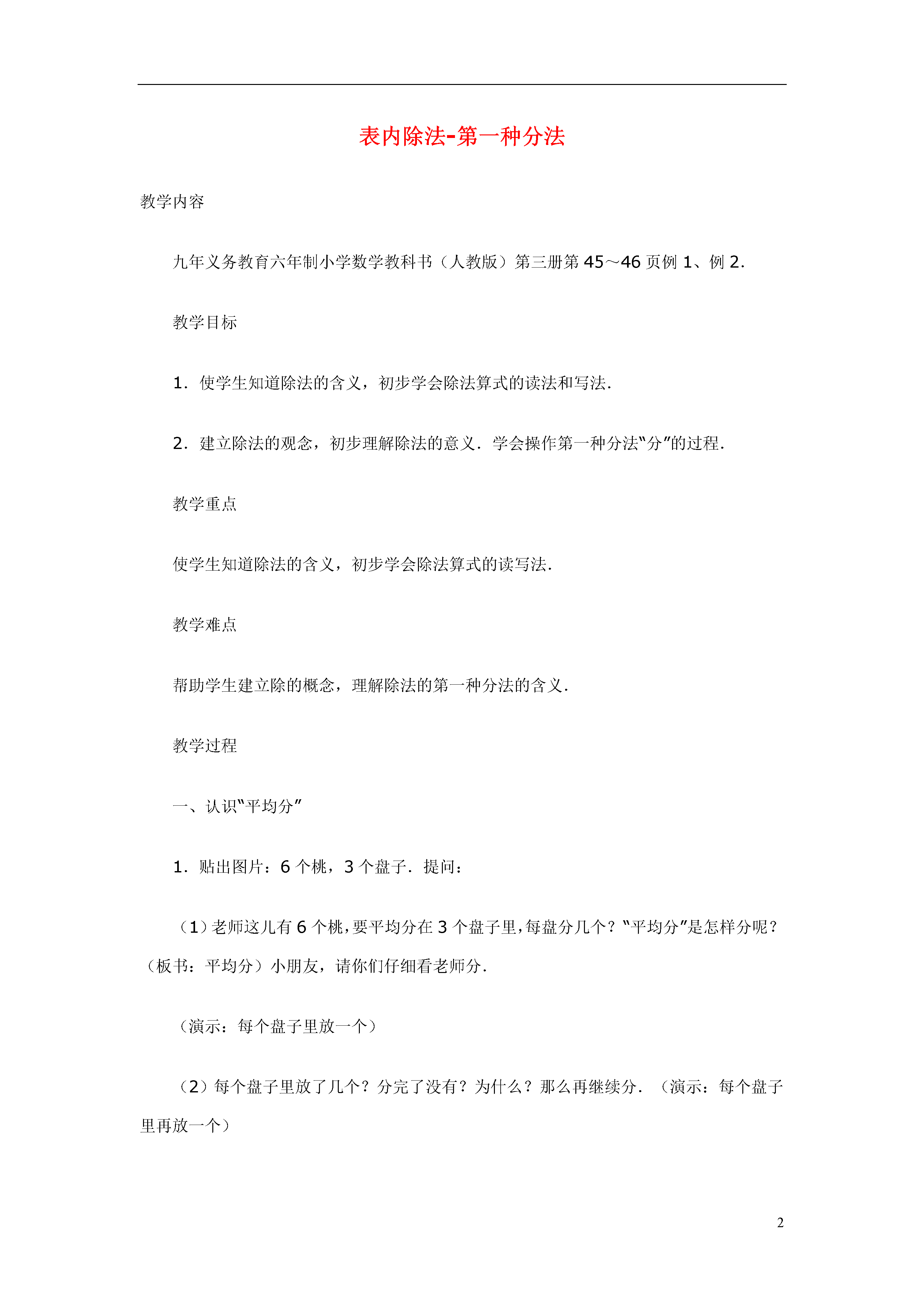 2表内除法-第一种分法教学内容九年义务教育六年制小学数学教科书(人教版)第三册第45~46页例1、例2.教学目标1.使学生知道除法的含义,初步学会除法算式的读法和写法.2.建立除法的观念,初步理解除法的意义.学会操作第一种分法“分”的过程.教学重点使学生知道除法的含义,初步学会除法算式的读写法.教学难点帮助学生建立除的概念,理解除法的第一种分法的含义.教学过程一、认识“平均分”1.贴出图片:6个桃,3个盘子.提问:(1)老师这儿有6个桃,要平均分在3个盘子里,每盘分几个?“平均分”是怎样分呢?(板书:平均分)小朋友,请你们仔细看老师分.(演示:每个盘子里放一个)(2)每个盘子里放了几个?分完了没有?为什么?那么再继续分.(演示:每个盘子里再放一个)(3)分完了没有?现在你们看,每个盘子里苹果的个数是几个,它们的个数怎么样?(板书:同样多)2.说明:这样一个一个地分,每份的数量分得同样多,叫做“平均分”.3.说一说:“平均分”要注意什么?4.判断.投影出示一组图形.(1)指出图中哪些是“平均分”?(2)为什么第二图和第四图不是“平均分”?能不能变成“平均分”?学生回答后,教师抽动投影片成下图.(3)说出各图是把多少平均分成几份?5.演示并提问:8根小棒,平均分成4份,每份几根?怎样分?二、揭示课题像这样把一些物体平均分成几份,求每份是几,要用除法计算,今天我们就来学习除法.(板书:除法)三、认识除号1.我们知道加法、减法、乘法每一种运算都有运算符号,除法也一样,它的运算符号叫做除号.(板书:除号)2.除号是这样写的,中间写一横,上面一个小圆点,下面一个小圆点.注意上下两点要对齐.3.练习.请小朋友在练习本上写两个除号,一定要注意上下两个点要对齐.四、列式计算1.教师引导:刚才,我们把6个桃平均放在3个盘子里,求每盘有几个,要用除法计算,怎么列式呢?(1)我们把几个桃平均分?(把六个桃平均分.)“6”是被分的数写在除号前面.(2)平均分成了几份?(生:平均分成了3份.)“3”写在除号后面.(3)每盘分得几个?(生:每盘分得2个.)就等于2.板书:6÷3=2.(4)这个算式怎么读呢?(教师指算式,领读两遍)板书:读作6除以3等于2.2.练习.(1)读出下面的除法算式.(卡片出示)10÷58÷220÷415÷516÷216÷4(2)根据图意说出算式.(投影出示前面用过的图)(6÷2=3)(6÷3=2)(8÷4=2)(12÷4=3)(3)先说出图意,再列式.(投影出示实物图)①(10个苹果,2个盘子.)□÷□②(12个球,4个盒子.)□÷□(4)根据题意,说出算式.①把20平均分成5份,每份是几?□÷□②把12平均分成2份,每份是几?□÷□板书:20÷512÷2五.讲解意义1.我们已经学会了根据题意列出算式,你们能不能说出除法算式表示的意义呢?“6÷3=2”表示什么?学生回答后,教师板书:表示把6平均分成3份,每份是2.教师领读两遍.2.练习.(1)填空:8÷4=2表示把()平均分成()份,每份是().12÷6=2表示把()平均分成()份,每份是().(2)看算式说出意义.(卡片出示)8÷2=412÷2=612÷4=320÷4=53.小结.我们学习了什么知识?把一个数平均分成几份,求每份是多少?用什么方法计算?板书:把一个数平均分成几份,求每份是多少,用除法计算.4.质疑.六、巩固练习1.读出下面的算式,用△摆一摆,再填得数.8÷2=□10÷5=□12÷3=□2.在下面算式的方框里填上适当的数.(1)把15个△,平均分成3份,每份是几个?15÷□=□(2)把15个△,平均分成5份,每份是几个?□÷□=□3.根据题目说出算式.(1)把12棵树,平均捆成3捆,每捆有几棵?(2)小冬把8只兔子,平均关在4个笼子里,每个笼子关几只?(3)妈妈买来8个苹果,平均分给爷爷和奶奶,每人分几个?讨论:为什么列式是“8÷2”,“2”是从哪里来的.(4)把10个苹果平均分给5个人吃,每人吃几个?(5)把5个苹果平均分给10个人吃,每人吃几个?讨论:上面两题为什么一个列式是“10÷5”,一个列式是“5÷10”?4.游戏.教师出示12朵花.请学生把12朵花平均分成不同的份数,再列出算式,看谁的分法多.七、课堂小结同学们学得都很好,今天我们对除法有了一个“初步的认识”(补充板书课题),所学的分法,我们把它叫做“第一种分法”(板书),下节课我们还要学习除法的第二种分法.板书设计略教案点评:除法的初步认识是教学中的一个难点.本节课教学的“把一个数平均分成几份,