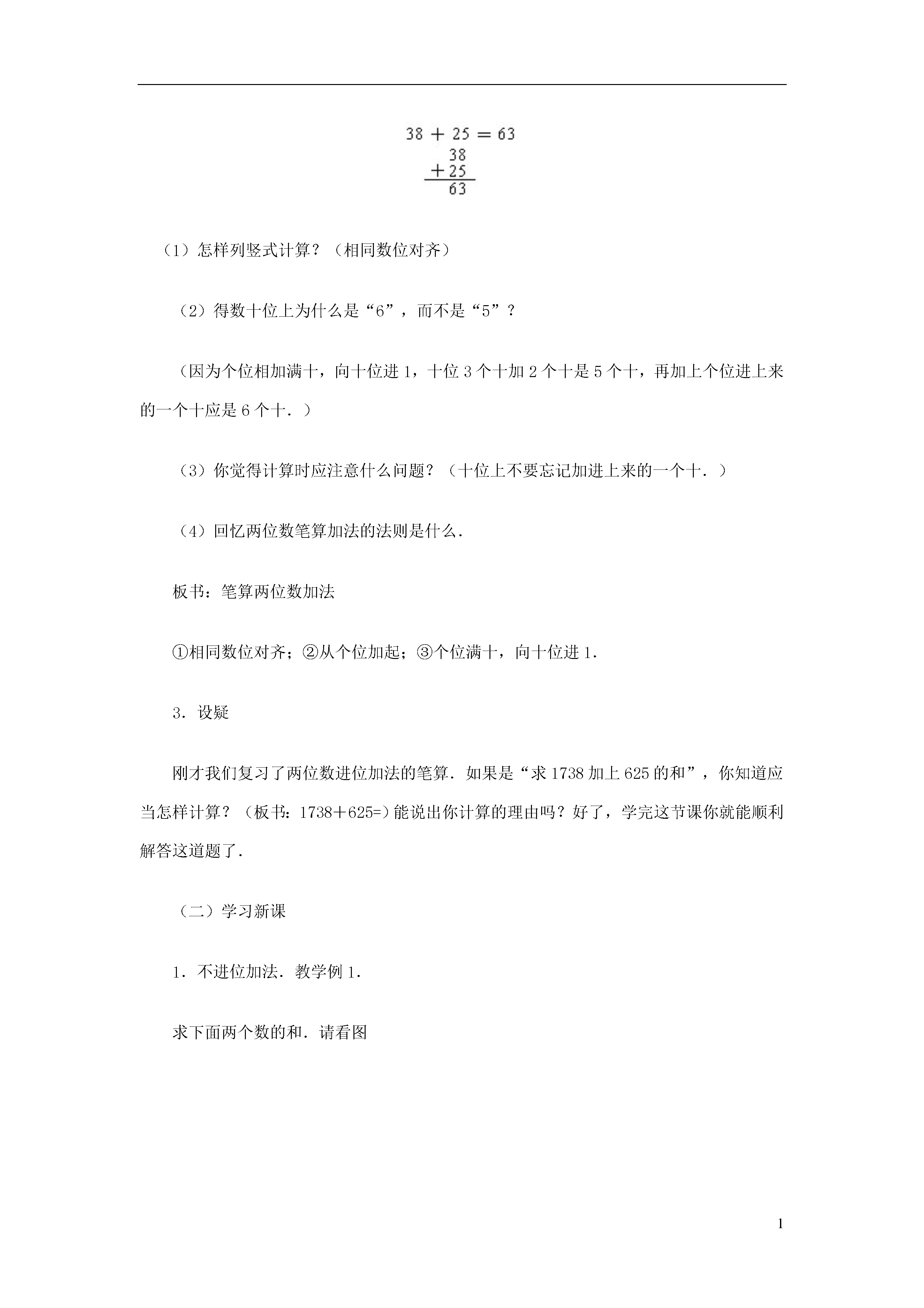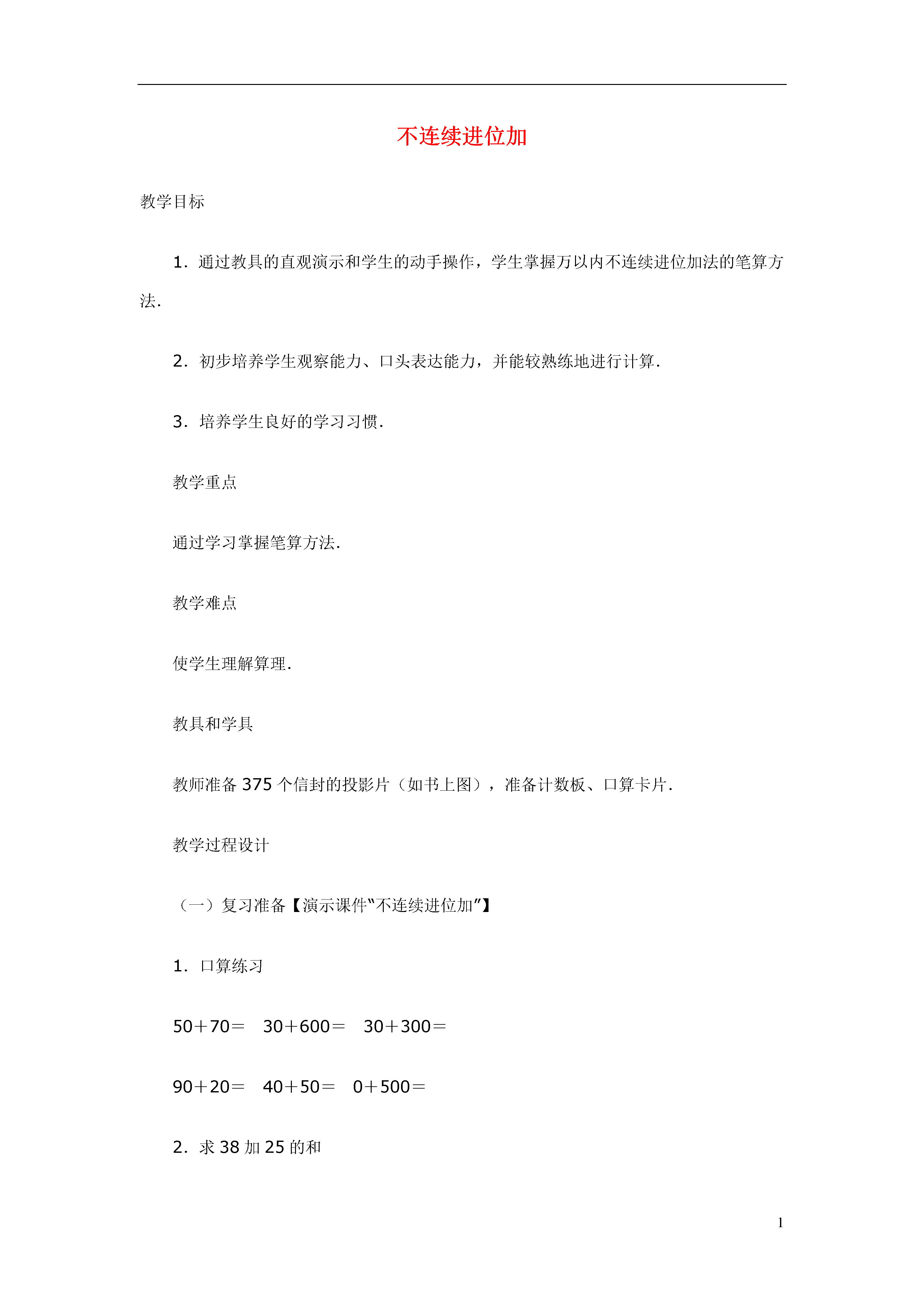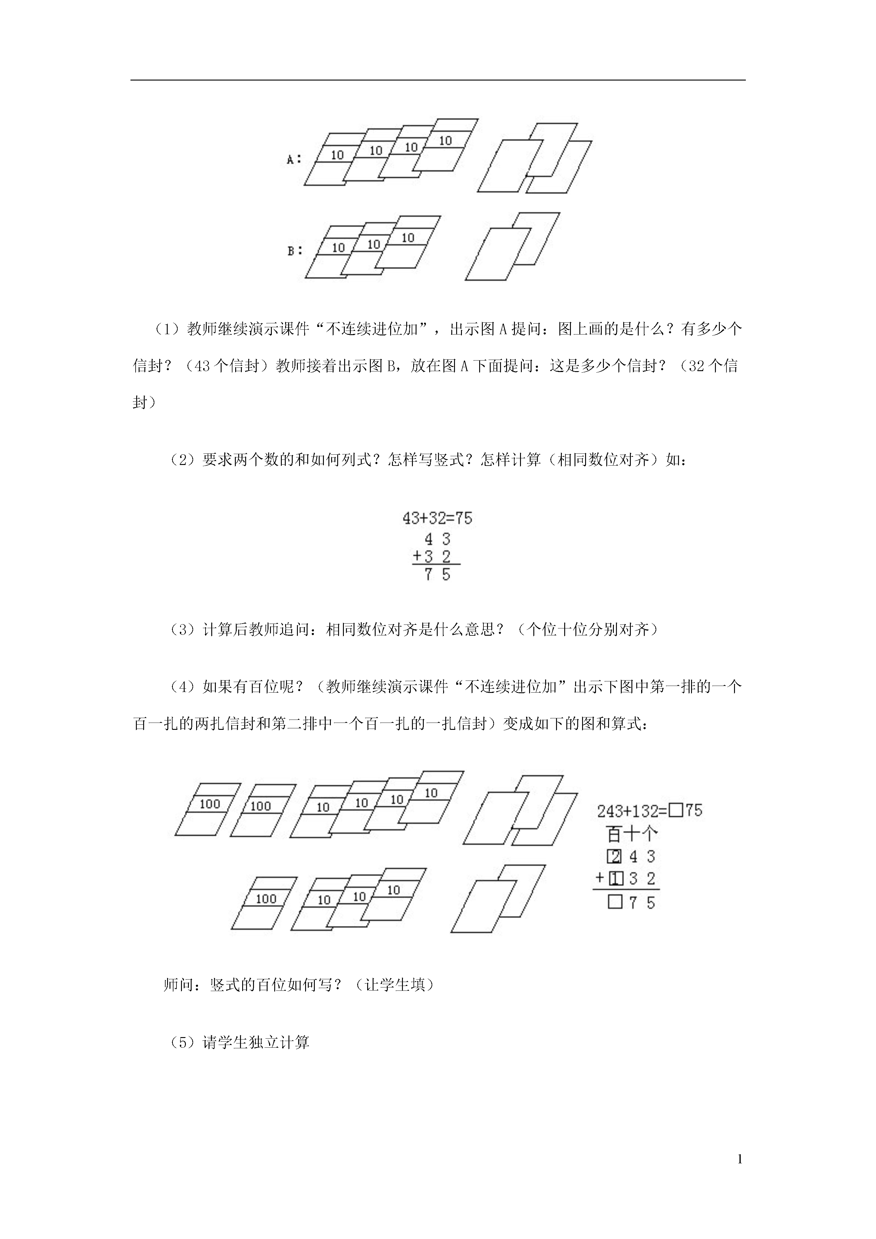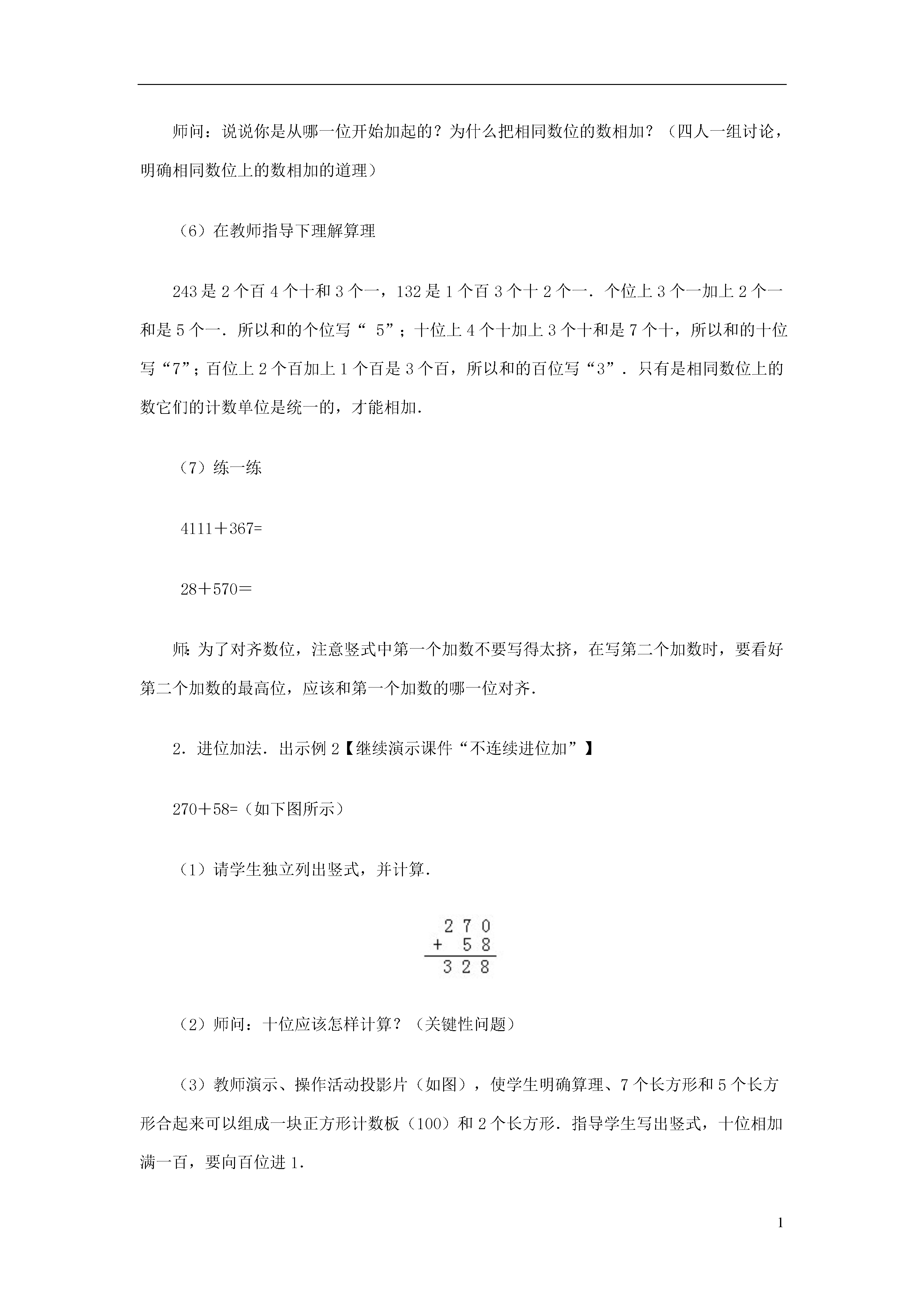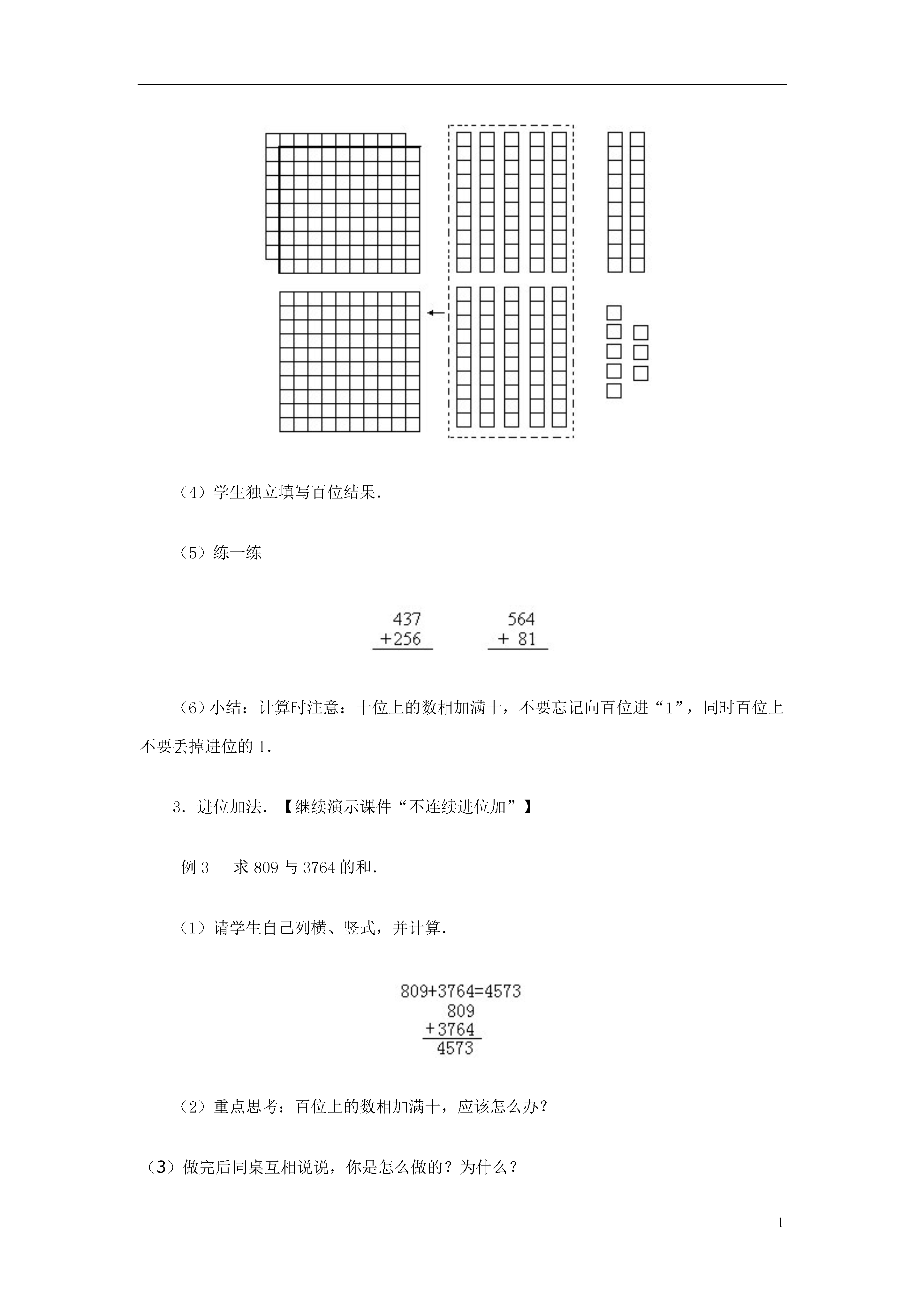 1不连续进位加教学目标1.通过教具的直观演示和学生的动手操作,学生掌握万以内不连续进位加法的笔算方法.2.初步培养学生观察能力、口头表达能力,并能较熟练地进行计算.3.培养学生良好的学习习惯.教学重点通过学习掌握笔算方法.教学难点使学生理解算理.教具和学具教师准备375个信封的投影片(如书上图),准备计数板、口算卡片.教学过程设计(一)复习准备【演示课件“不连续进位加”】1.口算练习50+70=30+600=30+300=90+20=40+50=0+500=2.求38加25的和(1)怎样列竖式计算?(相同数位对齐)(2)得数十位上为什么是“6”,而不是“5”?(因为个位相加满十,向十位进1,十位3个十加2个十是5个十,再加上个位进上来的一个十应是6个十.)(3)你觉得计算时应注意什么问题?(十位上不要忘记加进上来的一个十.)(4)回忆两位数笔算加法的法则是什么.板书:笔算两位数加法①相同数位对齐;②从个位加起;③个位满十,向十位进1.3.设疑刚才我们复习了两位数进位加法的笔算.如果是“求1738加上625的和”,你知道应当怎样计算?(板书:1738+625=)能说出你计算的理由吗?好了,学完这节课你就能顺利解答这道题了.(二)学习新课1.不进位加法.教学例1.求下面两个数的和.请看图(1)教师继续演示课件“不连续进位加”,出示图A提问:图上画的是什么?有多少个信封?(43个信封)教师接着出示图B,放在图A下面提问:这是多少个信封?(32个信封)(2)要求两个数的和如何列式?怎样写竖式?怎样计算(相同数位对齐)如:(3)计算后教师追问:相同数位对齐是什么意思?(个位十位分别对齐)(4)如果有百位呢?(教师继续演示课件“不连续进位加”出示下图中第一排的一个百一扎的两扎信封和第二排中一个百一扎的一扎信封)变成如下的图和算式:师问:竖式的百位如何写?(让学生填)(5)请学生独立计算师问:说说你是从哪一位开始加起的?为什么把相同数位的数相加?(四人一组讨论,明确相同数位上的数相加的道理)(6)在教师指导下理解算理243是2个百4个十和3个一,132是1个百3个十2个一.个位上3个一加上2个一和是5个一.所以和的个位写“5”;十位上4个十加上3个十和是7个十,所以和的十位写“7”;百位上2个百加上1个百是3个百,所以和的百位写“3”.只有是相同数位上的数它们的计数单位是统一的,才能相加.(7)练一练4111+367=28+570=师:为了对齐数位,注意竖式中第一个加数不要写得太挤,在写第二个加数时,要看好第二个加数的最高位,应该和第一个加数的哪一位对齐.2.进位加法.出示例2【继续演示课件“不连续进位加”】270+58=(如下图所示)(1)请学生独立列出竖式,并计算.(2)师问:十位应该怎样计算?(关键性问题)(3)教师演示、操作活动投影片(如图),使学生明确算理、7个长方形和5个长方形合起来可以组成一块正方形计数板(100)和2个长方形.指导学生写出竖式,十位相加满一百,要向百位进1.(4)学生独立填写百位结果.(5)练一练(6)小结:计算时注意:十位上的数相加满十,不要忘记向百位进“1”,同时百位上不要丢掉进位的1.3.进位加法.【继续演示课件“不连续进位加”】例3求809与3764的和.(1)请学生自己列横、竖式,并计算.(2)重点思考:百位上的数相加满十,应该怎么办?(3)做完后同桌互相说说,你是怎么做的?为什么?(4)讨论:“三、四位数的加法和两位数加法有什么相同点和不同点?”(相同点:三、四位数的加法和两位数的加法一样,都是相同数位对齐,从个位加起,而且哪一位上的数相加满十,向前一位进1.不同点:加数的位数不同)(5)总结三、四位数加法的法则.(在原法则板书上改)标题的“两位数”改为“三、四位数”.第③条“个位满十,向十位进1”改成“哪一位上的数相加满十,要向前一位进1”.(三)巩固反馈【继续演示课件“不连续进位加”】1.直接在竖式上计算2.列竖式计算238+326=1629+527=715+8605=3.判断正误并改正.4.课后总结(1)今天学的是什么知识?(出示课题)计算法则是什么?说说计算时应该注意什么.(2)解疑我们已学完本节知识,请大家做一做开始的那道题,看谁会做并能做对.1738+625=