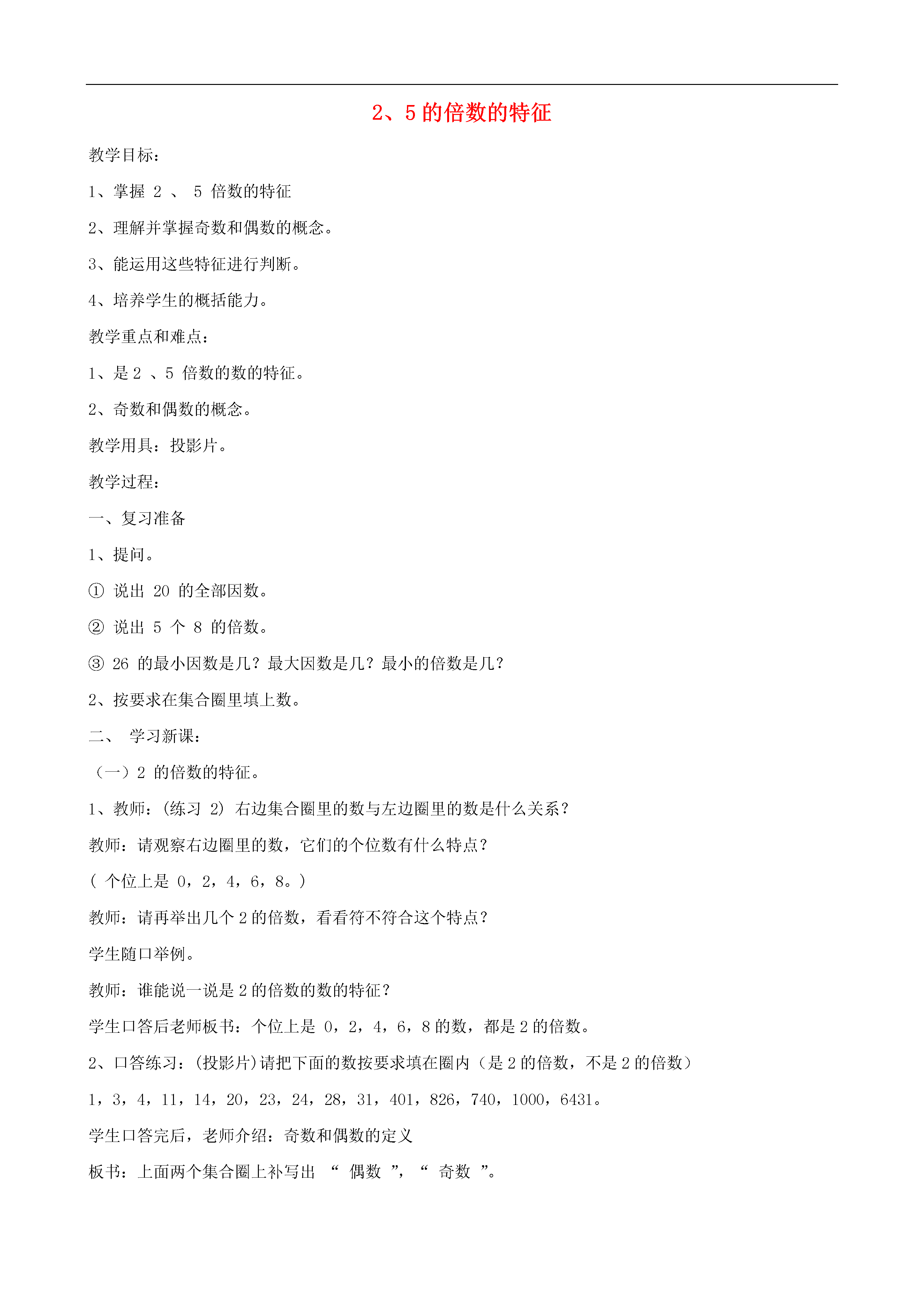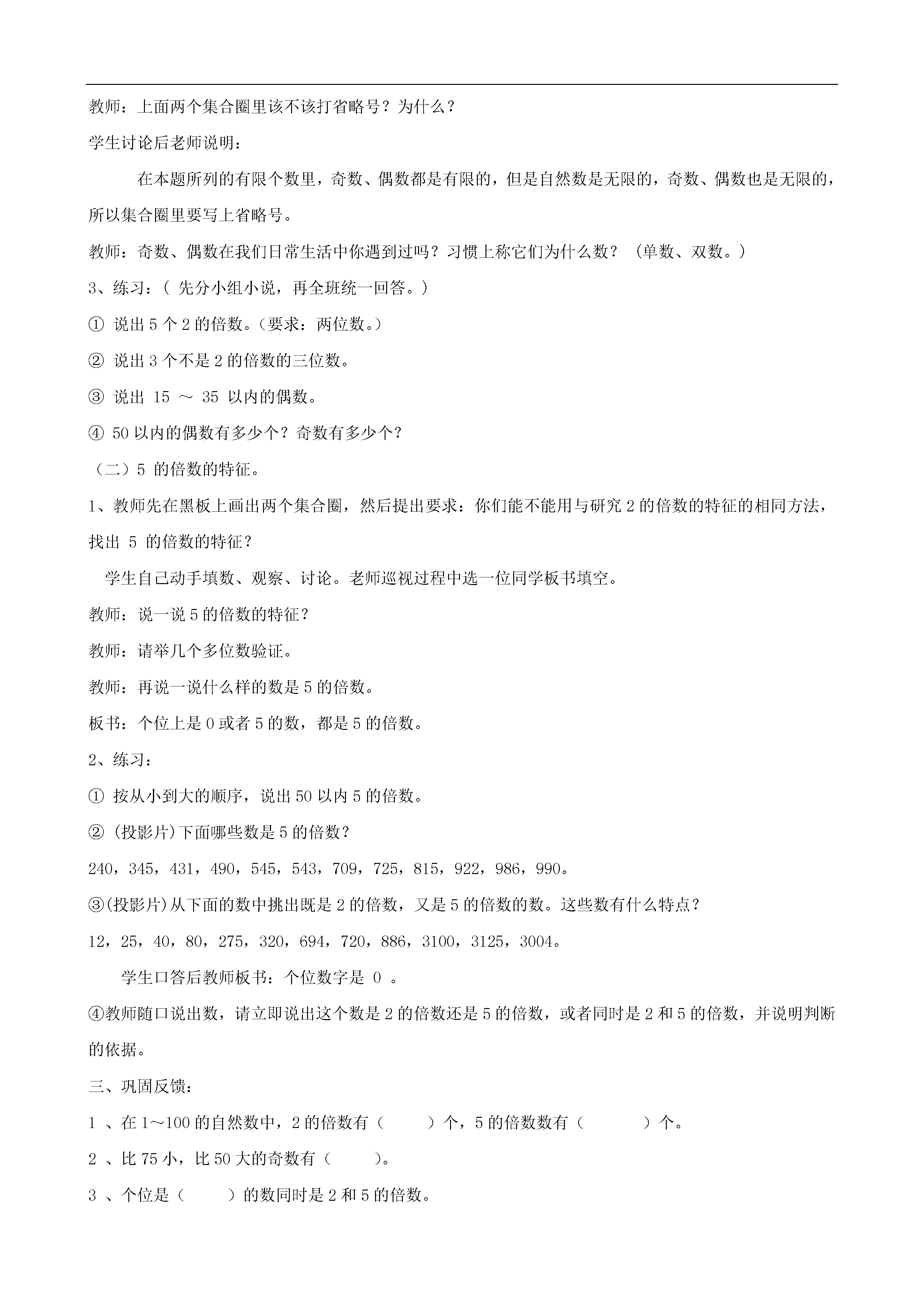 2、5的倍数的特征教学目标:1、掌握2、5倍数的特征2、理解并掌握奇数和偶数的概念。3、能运用这些特征进行判断。4、培养学生的概括能力。教学重点和难点:1、是2、5倍数的数的特征。2、奇数和偶数的概念。教学用具:投影片。教学过程:一、复习准备1、提问。①说出20的全部因数。②说出5个8的倍数。③26的最小因数是几?最大因数是几?最小的倍数是几?2、按要求在集合圈里填上数。二、学习新课:(一)2的倍数的特征。1、教师:(练习2)右边集合圈里的数与左边圈里的数是什么关系?教师:请观察右边圈里的数,它们的个位数有什么特点?(个位上是0,2,4,6,8。)教师:请再举出几个2的倍数,看看符不符合这个特点?学生随口举例。教师:谁能说一说是2的倍数的数的特征?学生口答后老师板书:个位上是0,2,4,6,8的数,都是2的倍数。2、口答练习:(投影片)请把下面的数按要求填在圈内(是2的倍数,不是2的倍数)1,3,4,11,14,20,23,24,28,31,401,826,740,1000,6431。学生口答完后,老师介绍:奇数和偶数的定义板书:上面两个集合圈上补写出“偶数”,“奇数”。教师:上面两个集合圈里该不该打省略号?为什么?学生讨论后老师说明:在本题所列的有限个数里,奇数、偶数都是有限的,但是自然数是无限的,奇数、偶数也是无限的,所以集合圈里要写上省略号。教师:奇数、偶数在我们日常生活中你遇到过吗?习惯上称它们为什么数?(单数、双数。)3、练习:(先分小组小说,再全班统一回答。)①说出5个2的倍数。(要求:两位数。)②说出3个不是2的倍数的三位数。③说出15~35以内的偶数。④50以内的偶数有多少个?奇数有多少个?(二)5的倍数的特征。1、教师先在黑板上画出两个集合圈,然后提出要求:你们能不能用与研究2的倍数的特征的相同方法,找出5的倍数的特征?学生自己动手填数、观察、讨论。老师巡视过程中选一位同学板书填空。教师:说一说5的倍数的特征?教师:请举几个多位数验证。教师:再说一说什么样的数是5的倍数。板书:个位上是0或者5的数,都是5的倍数。2、练习:①按从小到大的顺序,说出50以内5的倍数。②(投影片)下面哪些数是5的倍数?240,345,431,490,545,543,709,725,815,922,986,990。③(投影片)从下面的数中挑出既是2的倍数,又是5的倍数的数。这些数有什么特点?12,25,40,80,275,320,694,720,886,3100,3125,3004。学生口答后教师板书:个位数字是0。④教师随口说出数,请立即说出这个数是2的倍数还是5的倍数,或者同时是2和5的倍数,并说明判断的依据。三、巩固反馈:1、在1~100的自然数中,2的倍数有()个,5的倍数数有()个。2、比75小,比50大的奇数有()。3、个位是()的数同时是2和5的倍数。4、用0,7,4,5,9五个数字组成2的倍数;5的倍数;同时是2和5的倍数的数。四、全课总结:这节课你学会了什么?有什么收获?