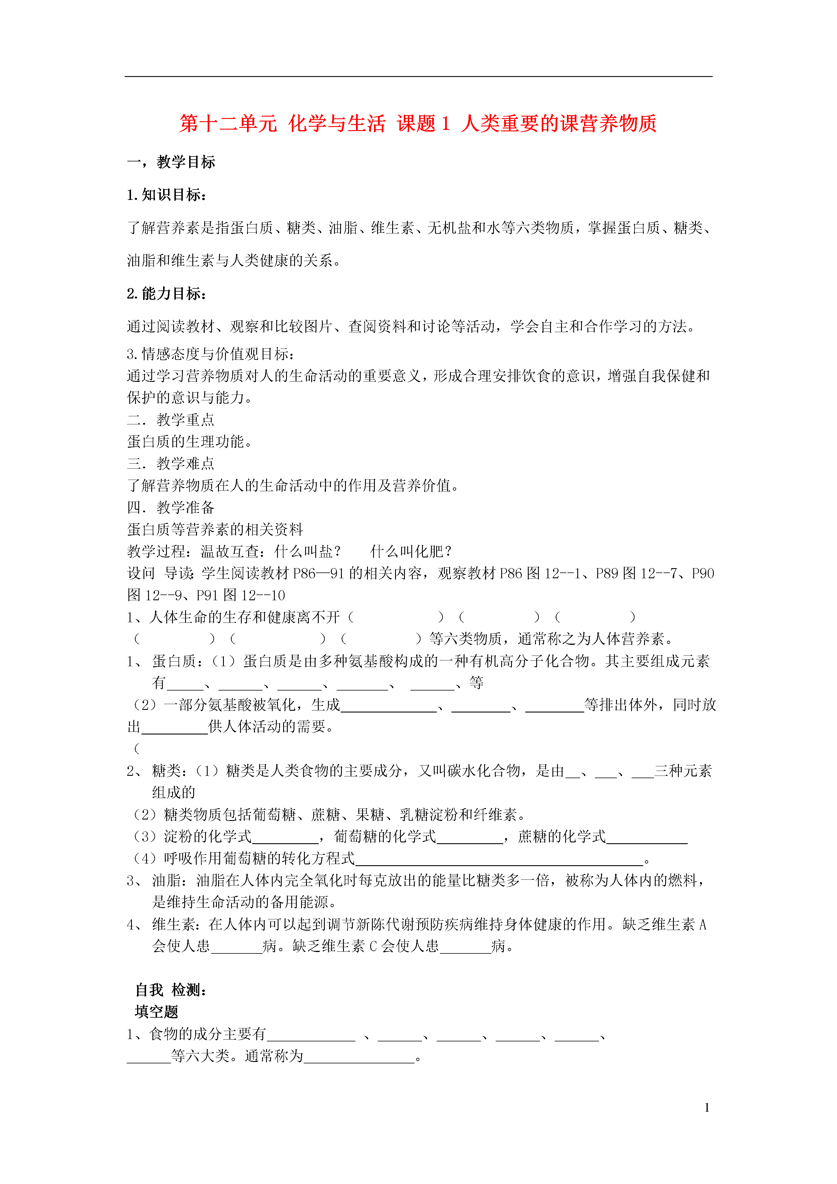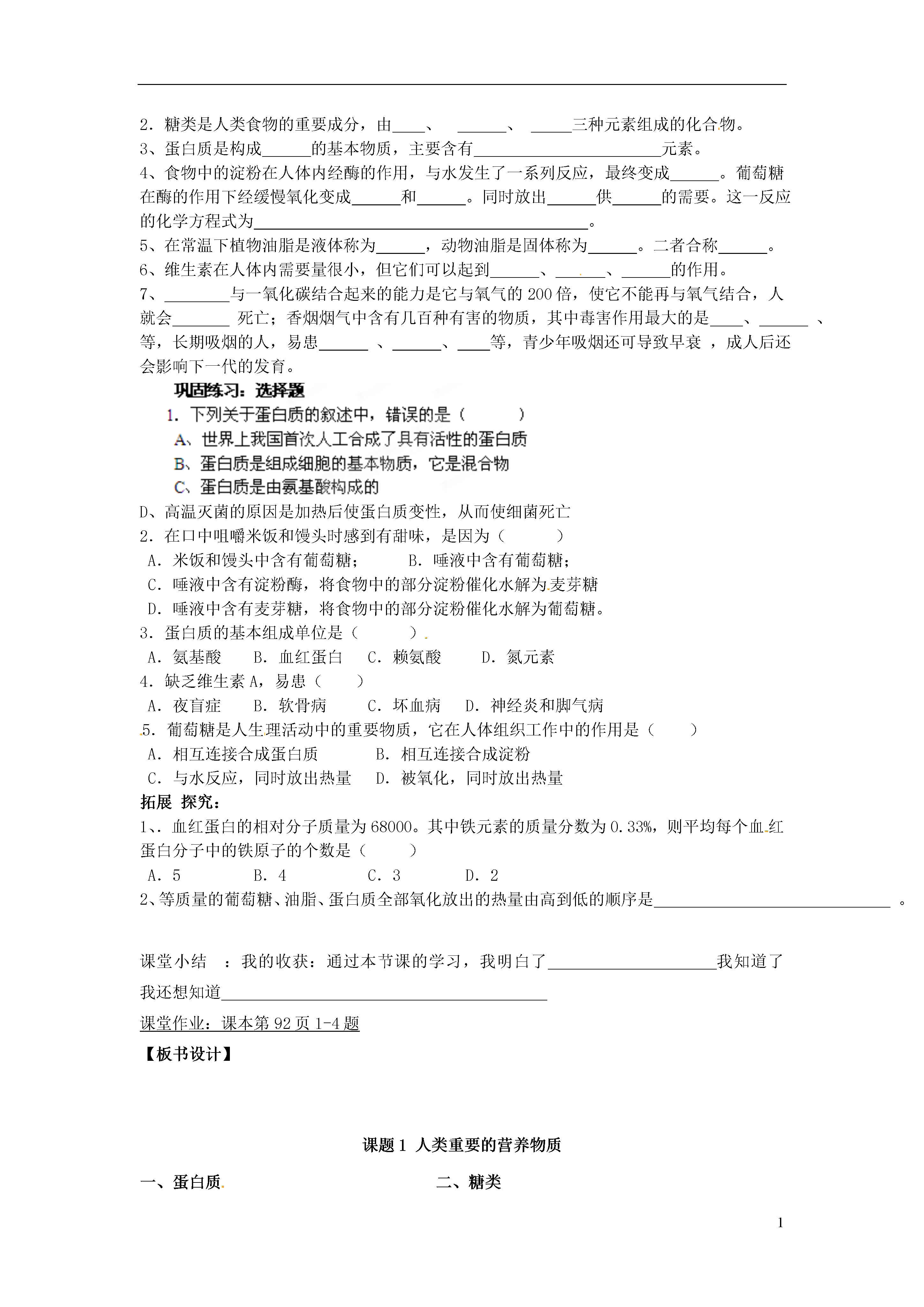 1第十二单元化学与生活课题1人类重要的课营养物质一,教学目标1.知识目标:了解营养素是指蛋白质、糖类、油脂、维生素、无机盐和水等六类物质,掌握蛋白质、糖类、油脂和维生素与人类健康的关系。2.能力目标:通过阅读教材、观察和比较图片、查阅资料和讨论等活动,学会自主和合作学习的方法。3.情感态度与价值观目标:通过学习营养物质对人的生命活动的重要意义,形成合理安排饮食的意识,增强自我保健和保护的意识与能力。二.教学重点蛋白质的生理功能。三.教学难点了解营养物质在人的生命活动中的作用及营养价值。四.教学准备蛋白质等营养素的相关资料教学过程:温故互查:什么叫盐?什么叫化肥?设问导读:学生阅读教材P86—91的相关内容,观察教材P86图12--1、P89图12--7、P90图12--9、P91图12--101、人体生命的生存和健康离不开()()()()()()等六类物质,通常称之为人体营养素。蛋白质:(1)蛋白质是由多种氨基酸构成的一种有机高分子化合物。其主要组成元素有、、、、、等(2)一部分氨基酸被氧化,生成、、等排出体外,同时放出供人体活动的需要。(糖类:(1)糖类是人类食物的主要成分,又叫碳水化合物,是由、、三种元素组成的(2)糖类物质包括葡萄糖、蔗糖、果糖、乳糖淀粉和纤维素。(3)淀粉的化学式,葡萄糖的化学式,蔗糖的化学式(4)呼吸作用葡萄糖的转化方程式。油脂:油脂在人体内完全氧化时每克放出的能量比糖类多一倍,被称为人体内的燃料,是维持生命活动的备用能源。维生素:在人体内可以起到调节新陈代谢预防疾病维持身体健康的作用。缺乏维生素A会使人患病。缺乏维生素C会使人患病。自我检测:填空题1、食物的成分主要有、、、、、等六大类。通常称为。2.糖类是人类食物的重要成分,由、、三种元素组成的化合物。3、蛋白质是构成的基本物质,主要含有元素。4、食物中的淀粉在人体内经酶的作用,与水发生了一系列反应,最终变成。葡萄糖在酶的作用下经缓慢氧化变成和。同时放出供的需要。这一反应的化学方程式为。5、在常温下植物油脂是液体称为,动物油脂是固体称为。二者合称。6、维生素在人体内需要量很小,但它们可以起到、、的作用。7、与一氧化碳结合起来的能力是它与氧气的200倍,使它不能再与氧气结合,人就会死亡;香烟烟气中含有几百种有害的物质,其中毒害作用最大的是、、等,长期吸烟的人,易患、、等,青少年吸烟还可导致早衰,成人后还会影响下一代的发育。D、高温灭菌的原因是加热后使蛋白质变性,从而使细菌死亡2.在口中咀嚼米饭和馒头时感到有甜味,是因为()A.米饭和馒头中含有葡萄糖;B.唾液中含有葡萄糖;C.唾液中含有淀粉酶,将食物中的部分淀粉催化水解为麦芽糖D.唾液中含有麦芽糖,将食物中的部分淀粉催化水解为葡萄糖。3.蛋白质的基本组成单位是()A.氨基酸B.血红蛋白C.赖氨酸D.氮元素4.缺乏维生素A,易患()A.夜盲症B.软骨病C.坏血病D.神经炎和脚气病5.葡萄糖是人生理活动中的重要物质,它在人体组织工作中的作用是()A.相互连接合成蛋白质B.相互连接合成淀粉C.与水反应,同时放出热量D.被氧化,同时放出热量拓展探究:1、.血红蛋白的相对分子质量为68000。其中铁元素的质量分数为0.33%,则平均每个血红蛋白分子中的铁原子的个数是()A.5B.4C.3D.22、等质量的葡萄糖、油脂、蛋白质全部氧化放出的热量由高到低的顺序是。课堂小结:我的收获:通过本节课的学习,我明白了我知道了我还想知道课堂作业:课本1-4题【板书设计】课题1人类重要的营养物质一、蛋白质二、糖类1、功能1、组成2、存在2、常见的糖3、构成三、油脂4、人体蛋白质代谢1、分类5、几种蛋白质2、功能6、蛋白质的变性四、维生素1、存在2、作用教学反思: