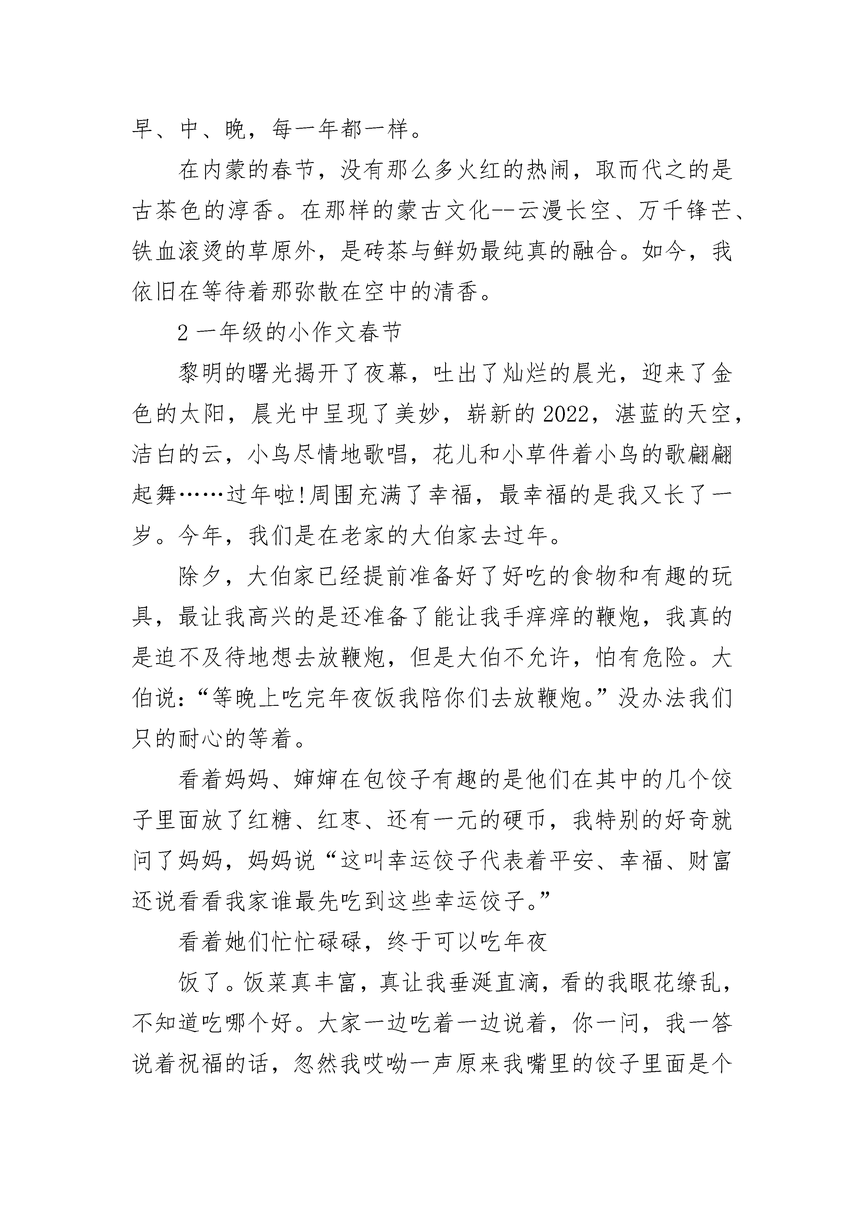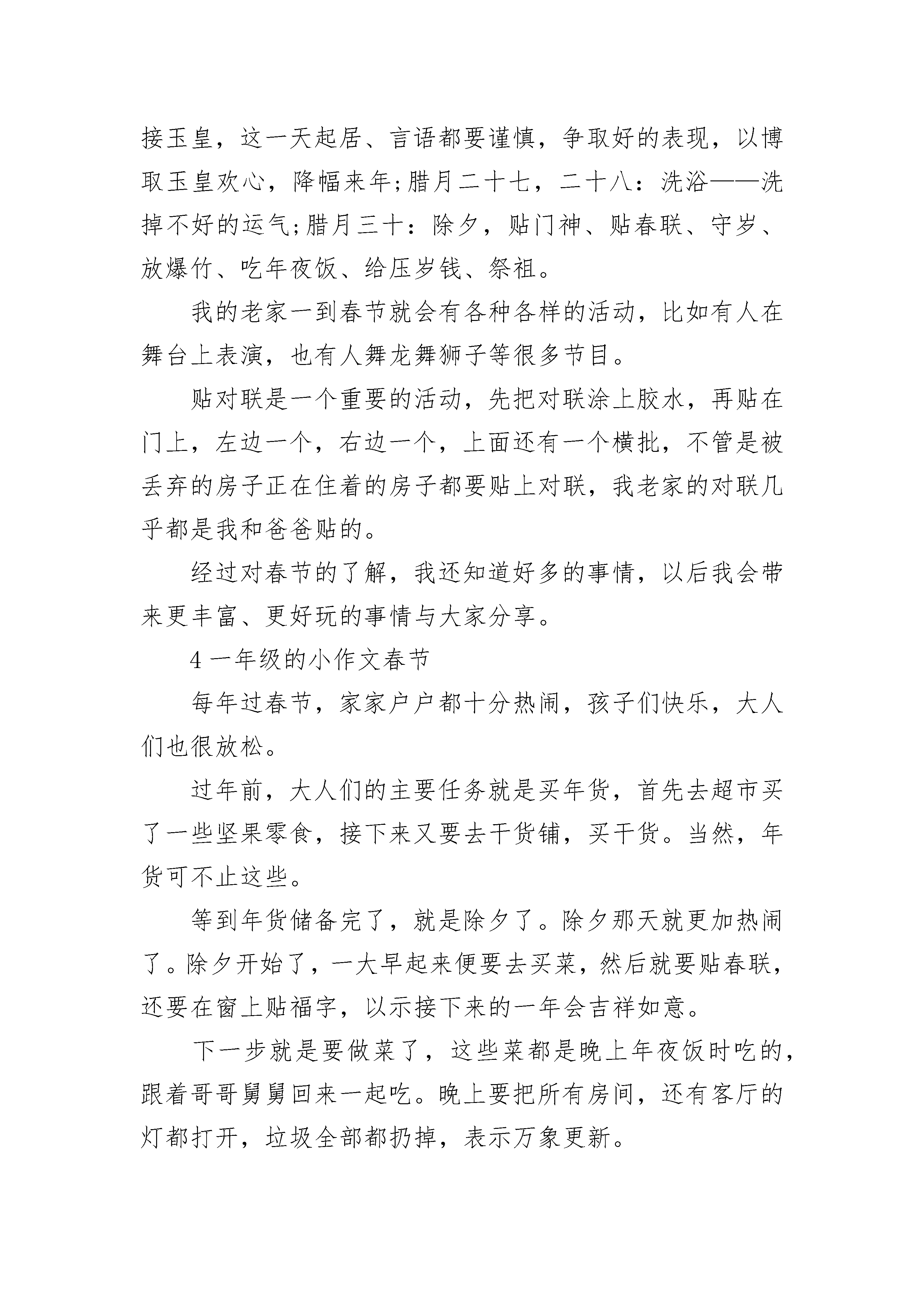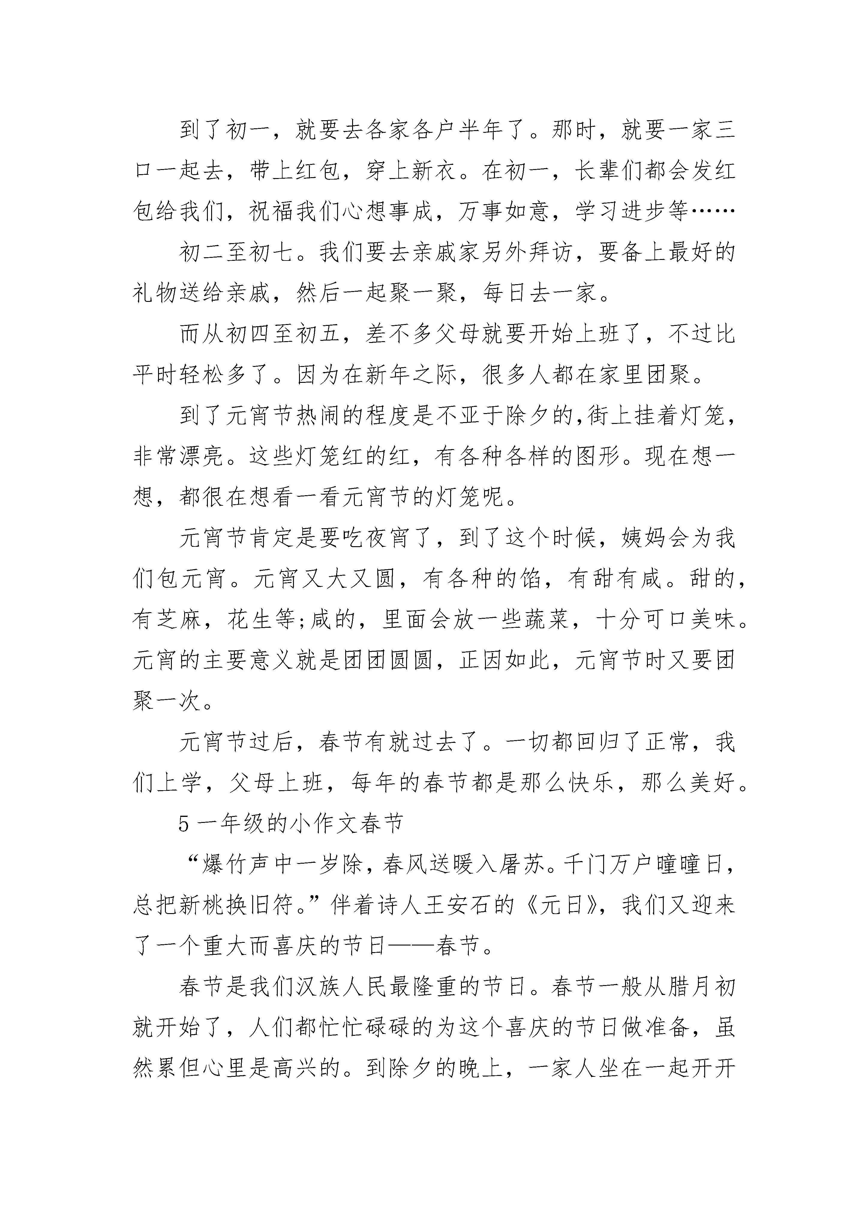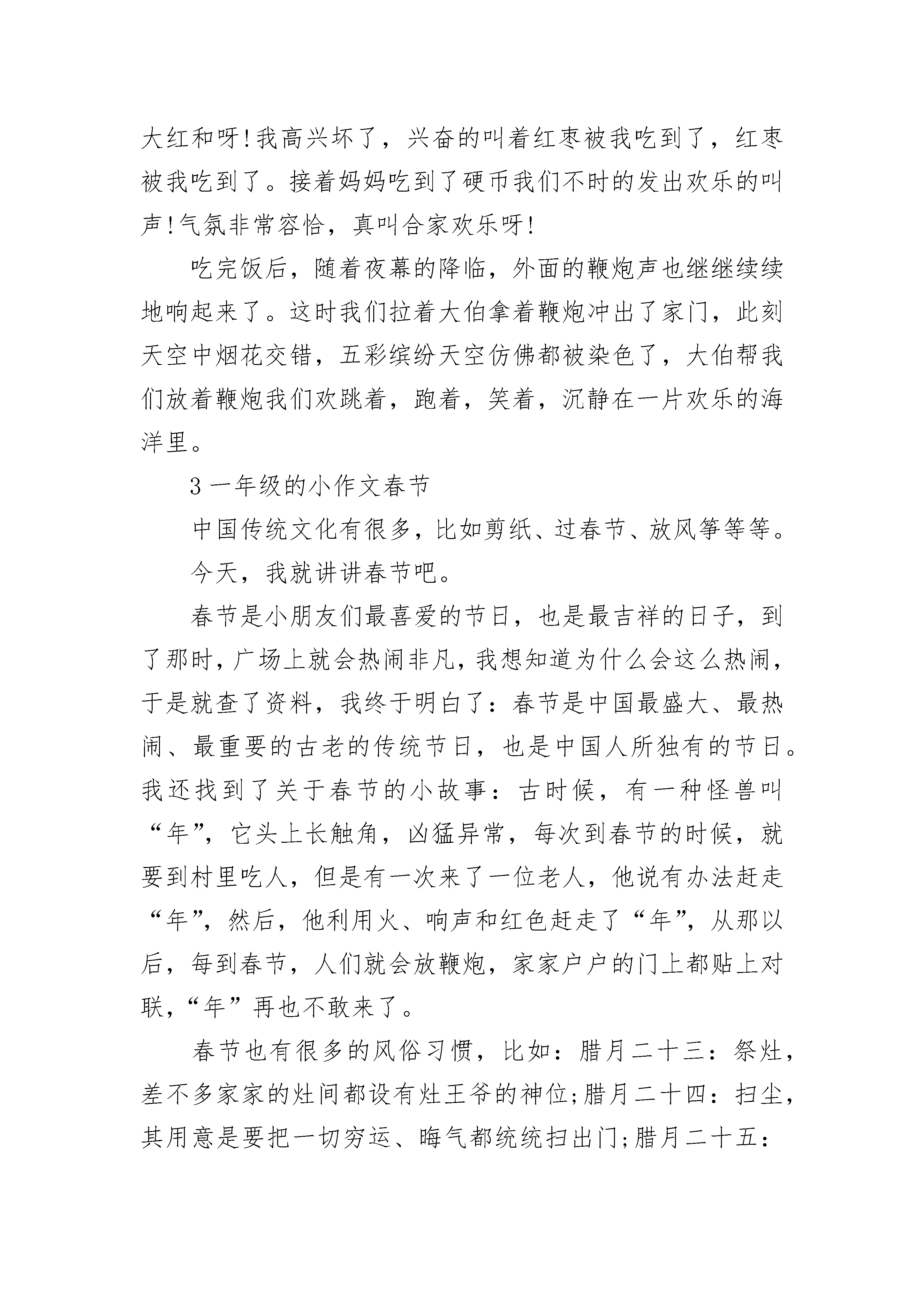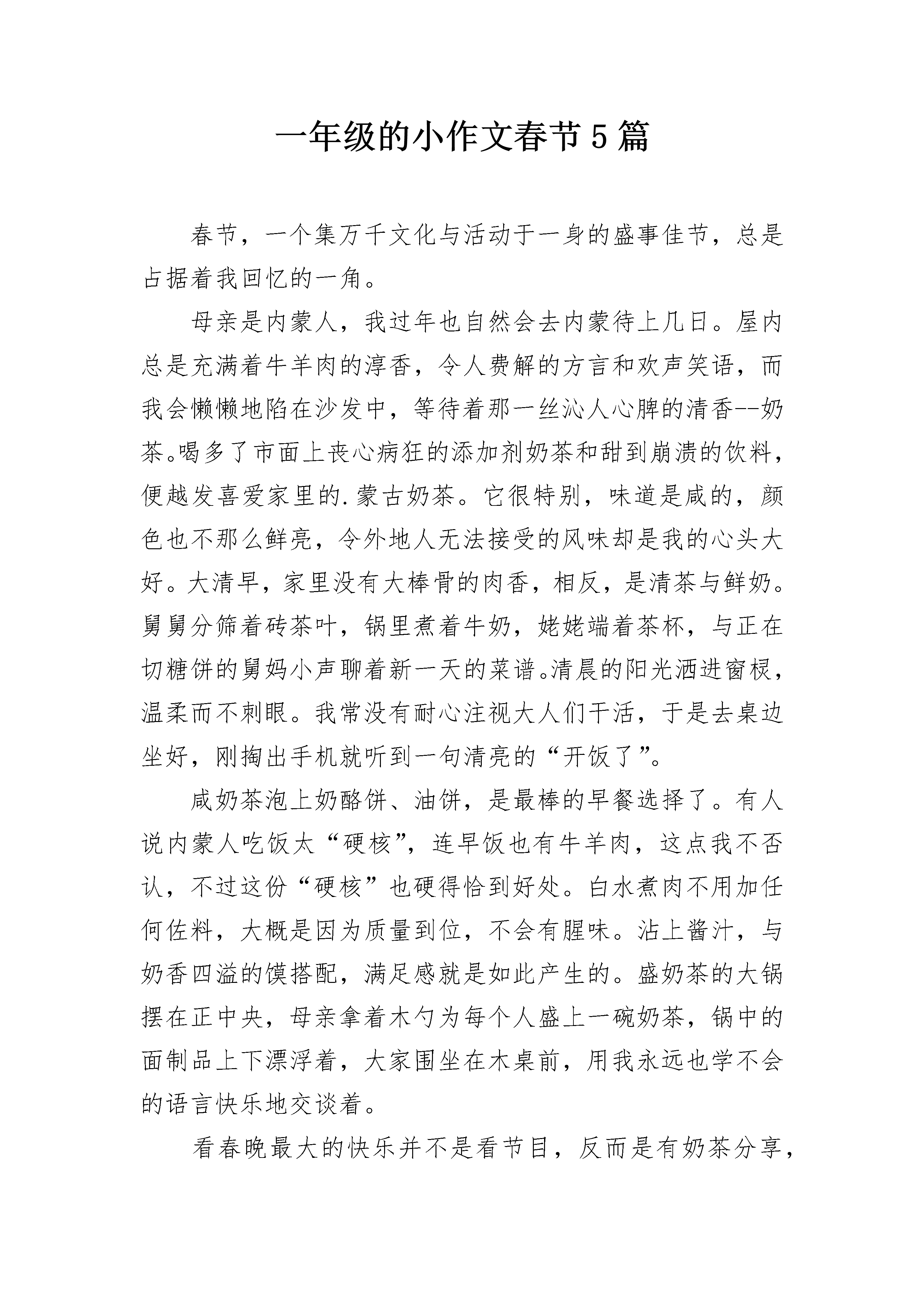一年级的小作文春节5篇春节,一个集万千文化与活动于一身的盛事佳节,总是占据着我回忆的一角。母亲是内蒙人,我过年也自然会去内蒙待上几日。屋内总是充满着牛羊肉的淳香,令人费解的方言和欢声笑语,而我会懒懒地陷在沙发中,等待着那一丝沁人心脾的清香--奶茶。喝多了市面上丧心病狂的添加剂奶茶和甜到崩溃的饮料,便越发喜爱家里的.蒙古奶茶。它很特别,味道是咸的,颜色也不那么鲜亮,令外地人无法接受的风味却是我的心头大好。大清早,家里没有大棒骨的肉香,相反,是清茶与鲜奶。舅舅分筛着砖茶叶,锅里煮着牛奶,姥姥端着茶杯,与正在切糖饼的舅妈小声聊着新一天的菜谱。清晨的阳光洒进窗棂,温柔而不刺眼。我常没有耐心注视大人们干活,于是去桌边坐好,刚掏出手机就听到一句清亮的“开饭了”。咸奶茶泡上奶酪饼、油饼,是最棒的早餐选择了。有人说内蒙人吃饭太“硬核”,连早饭也有牛羊肉,这点我不否认,不过这份“硬核”也硬得恰到好处。白水煮肉不用加任何佐料,大概是因为质量到位,不会有腥味。沾上酱汁,与奶香四溢的馍搭配,满足感就是如此产生的。盛奶茶的大锅摆在正中央,母亲拿着木勺为每个人盛上一碗奶茶,锅中的面制品上下漂浮着,大家围坐在木桌前,用我永远也学不会的语言快乐地交谈着。看春晚最大的快乐并不是看节目,反而是有奶茶分享,早、中、晚,每一年都一样。在内蒙的春节,没有那么多火红的热闹,取而代之的是古茶色的淳香。在那样的蒙古文化--云漫长空、万千锋芒、铁血滚烫的草原外,是砖茶与鲜奶最纯真的融合。如今,我依旧在等待着那弥散在空中的清香。2一年级的小作文春节黎明的曙光揭开了夜幕,吐出了灿烂的晨光,迎来了金色的太阳,晨光中呈现了美妙,崭新的2022,湛蓝的天空,洁白的云,小鸟尽情地歌唱,花儿和小草件着小鸟的歌翩翩起舞……过年啦!周围充满了幸福,最幸福的是我又长了一岁。今年,我们是在老家的大伯家去过年。除夕,大伯家已经提前准备好了好吃的食物和有趣的玩具,最让我高兴的是还准备了能让我手痒痒的鞭炮,我真的是迫不及待地想去放鞭炮,但是大伯不允许,怕有危险。大伯说:“等晚上吃完年夜饭我陪你们去放鞭炮。”没办法我们只的耐心的等着。看着妈妈、婶婶在包饺子有趣的是他们在其中的几个饺子里面放了红糖、红枣、还有一元的硬币,我特别的好奇就问了妈妈,妈妈说“这叫幸运饺子代表着平安、幸福、财富还说看看我家谁最先吃到这些幸运饺子。”看着她们忙忙碌碌,终于可以吃年夜饭了。饭菜真丰富,真让我垂涎直滴,看的我眼花缭乱,不知道吃哪个好。大家一边吃着一边说着,你一问,我一答说着祝福的话,忽然我哎呦一声原来我嘴里的饺子里面是个大红和呀!我高兴坏了,兴奋的叫着红枣被我吃到了,红枣被我吃到了。接着妈妈吃到了硬币我们不时的发出欢乐的叫声!气氛非常容恰,真叫合家欢乐呀!吃完饭后,随着夜幕的降临,外面的鞭炮声也继继续续地响起来了。这时我们拉着大伯拿着鞭炮冲出了家门,此刻天空中烟花交错,五彩缤纷天空仿佛都被染色了,大伯帮我们放着鞭炮我们欢跳着,跑着,笑着,沉静在一片欢乐的海洋里。3一年级的小作文春节中国传统文化有很多,比如剪纸、过春节、放风筝等等。今天,我就讲讲春节吧。春节是小朋友们最喜爱的节日,也是最吉祥的日子,到了那时,广场上就会热闹非凡,我想知道为什么会这么热闹,于是就查了资料,我终于明白了:春节是中国最盛大、最热闹、最重要的古老的传统节日,也是中国人所独有的节日。我还找到了关于春节的小故事:古时候,有一种怪兽叫“年”,它头上长触角,凶猛异常,每次到春节的时候,就要到村里吃人,但是有一次来了一位老人,他说有办法赶走“年”,然后,他利用火、响声和红色赶走了“年”,从那以后,每到春节,人们就会放鞭炮,家家户户的门上都贴上对联,“年”再也不敢来了。春节也有很多的风俗习惯,比如:腊月二十三:祭灶,差不多家家的灶间都设有灶王爷的神位;腊月二十四:扫尘,其用意是要把一切穷运、晦气都统统扫出门;腊月二十五:接玉皇,这一天起居、言语都要谨慎,争取好的表现,以博取玉皇欢心,降幅来年;腊月二十七,二十八:洗浴——洗掉不好的运气;腊月三十:除夕,贴门神、贴春联、守岁、放爆竹、吃年夜饭、给压岁钱、祭祖。我的老家一到春节就会有各种各样的活动,比如有人在舞台上表演,也有人舞龙舞狮子等很多节目。贴对联是一个重要的活动,先把对联涂上胶水,再贴在门上,左边一个,右边一个,上面还有一个横批,不管是被丢弃的房子正在住着的房子都要贴上对联,我老家的对联几乎都是我和爸爸贴的。经过对春节的了解,我还知道好多的事情,以后我会带来更丰富、更好玩的事情与大家分享。4一年级的小作文春节每年过春节,家家户户都十分热闹,孩子们快乐,大人们也很放松。过年前,大人们的主要任务就是买年货,首先去超市买了一些坚果零食,接下来又要去干货铺,买干货。当然,年货可不止这些。等到年货储备完了,就是除夕
