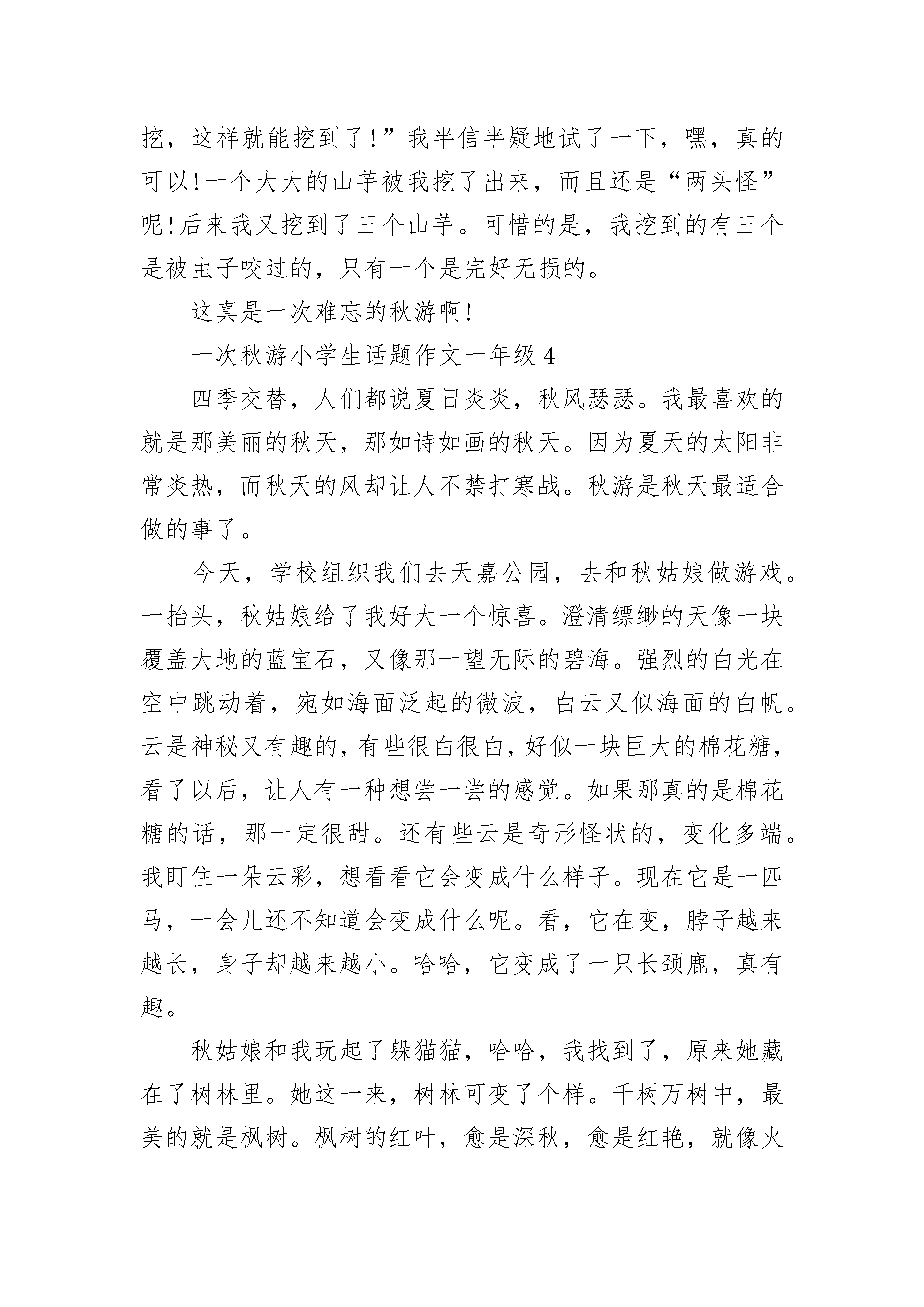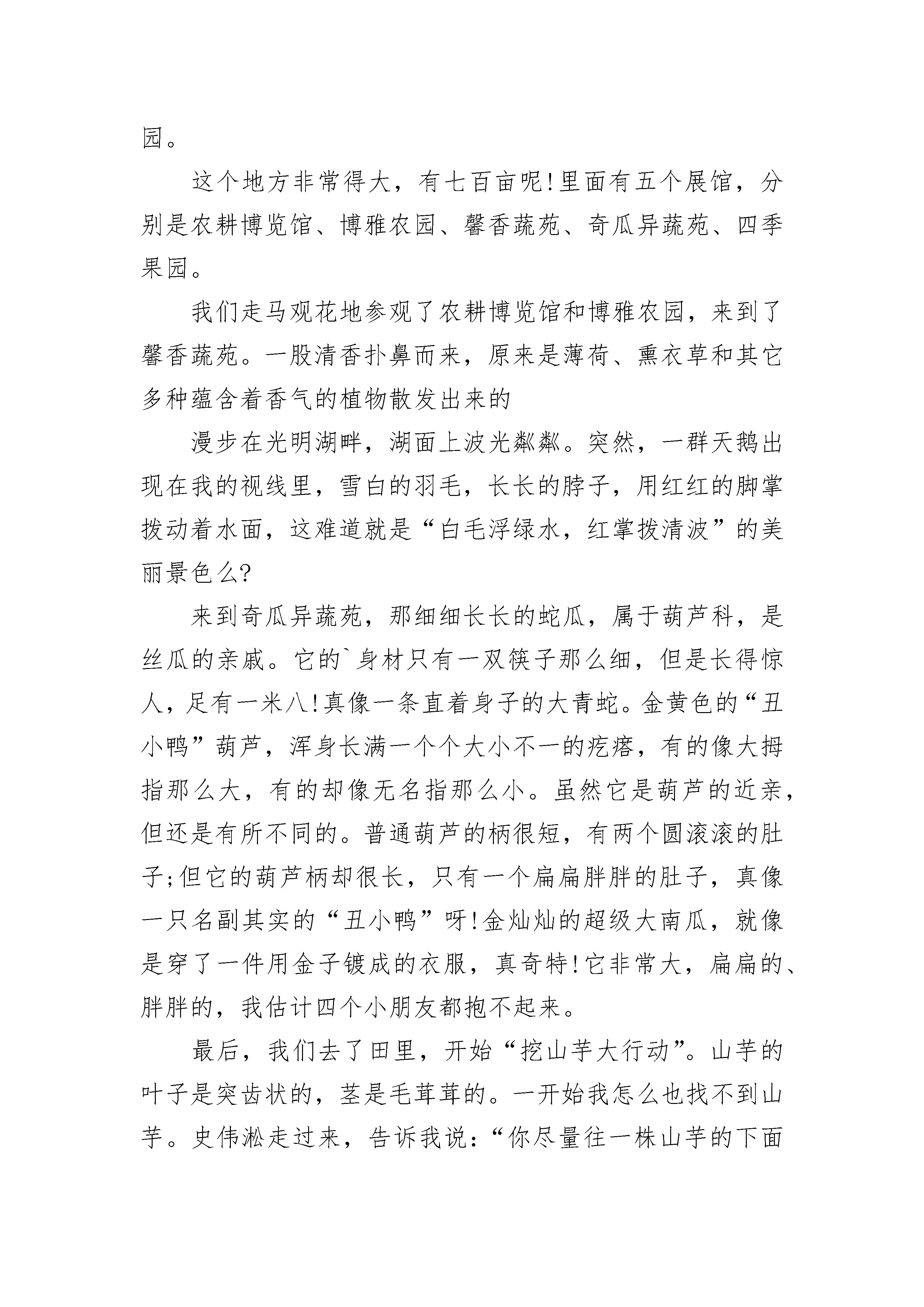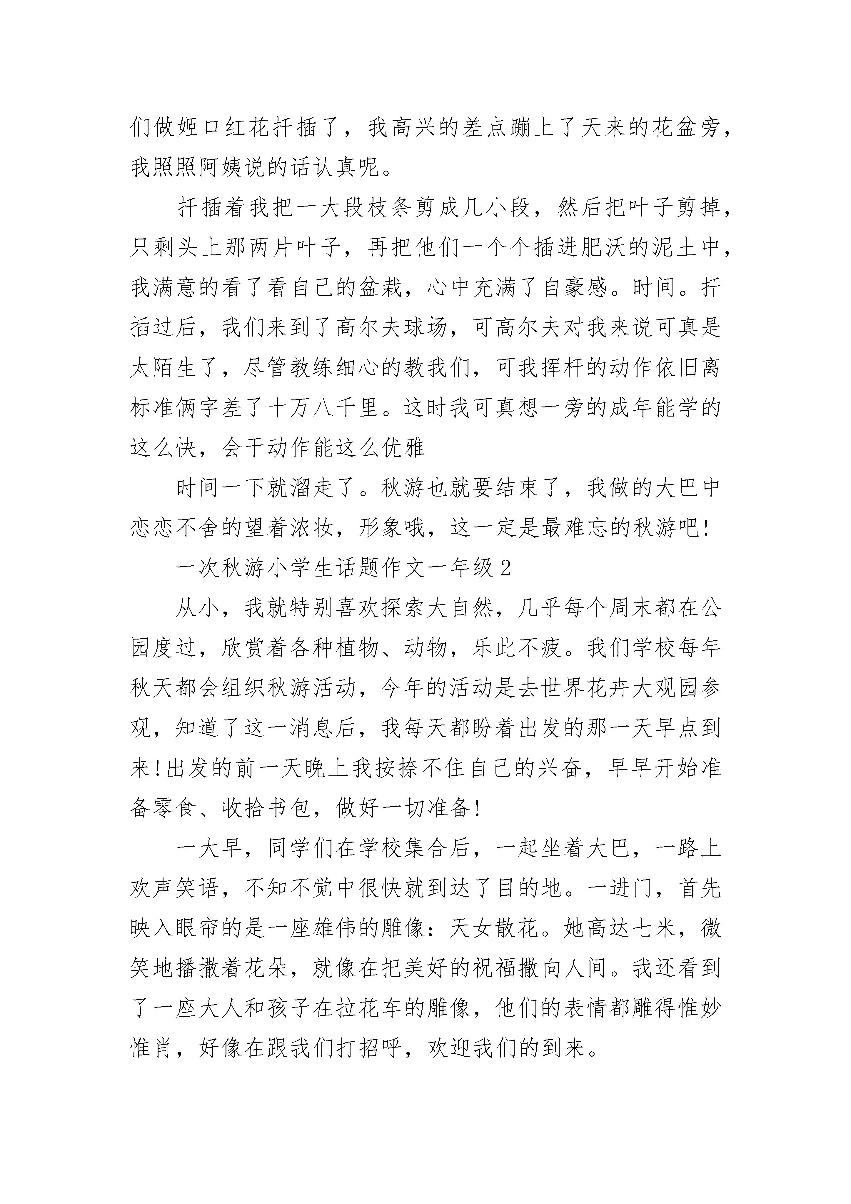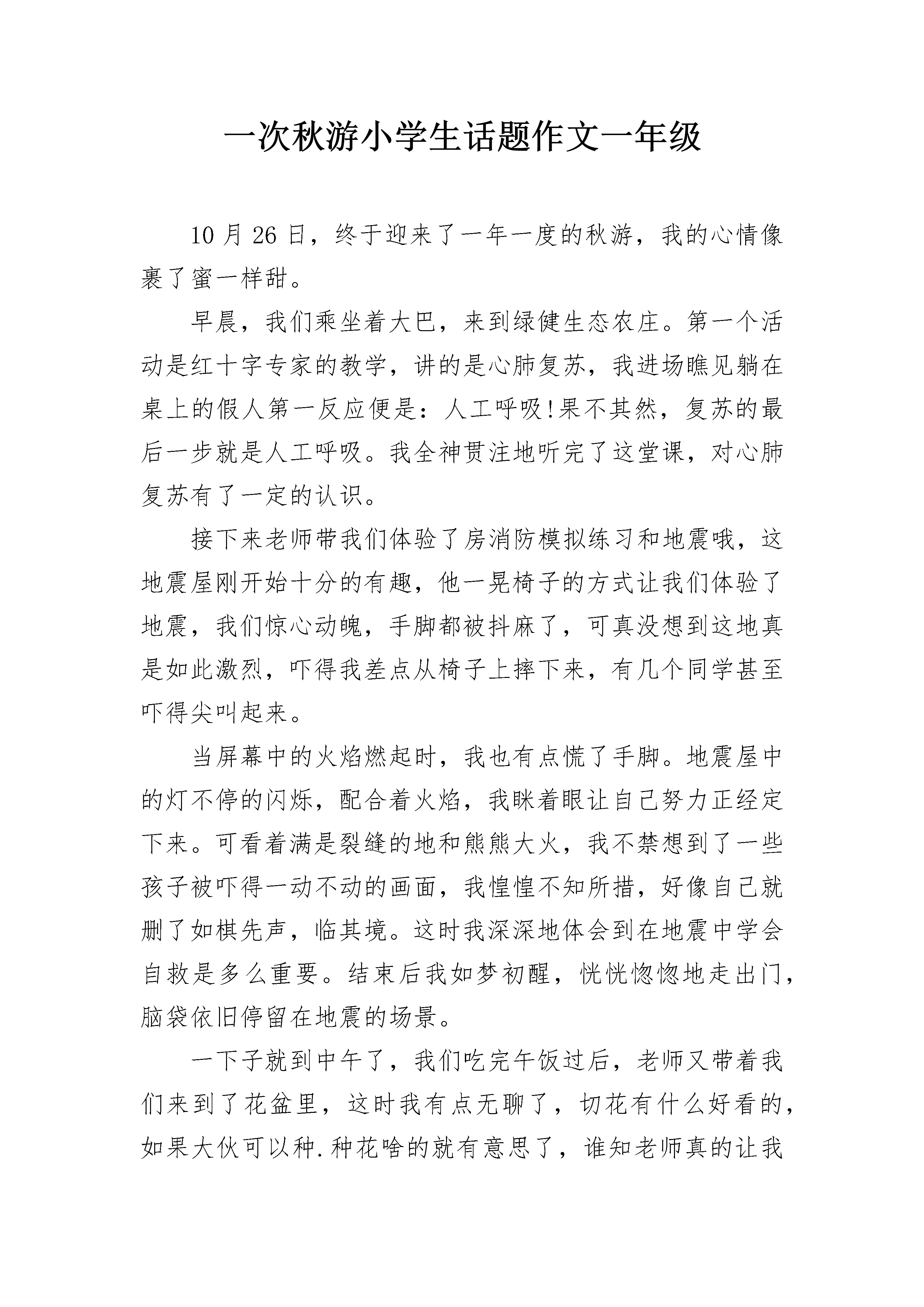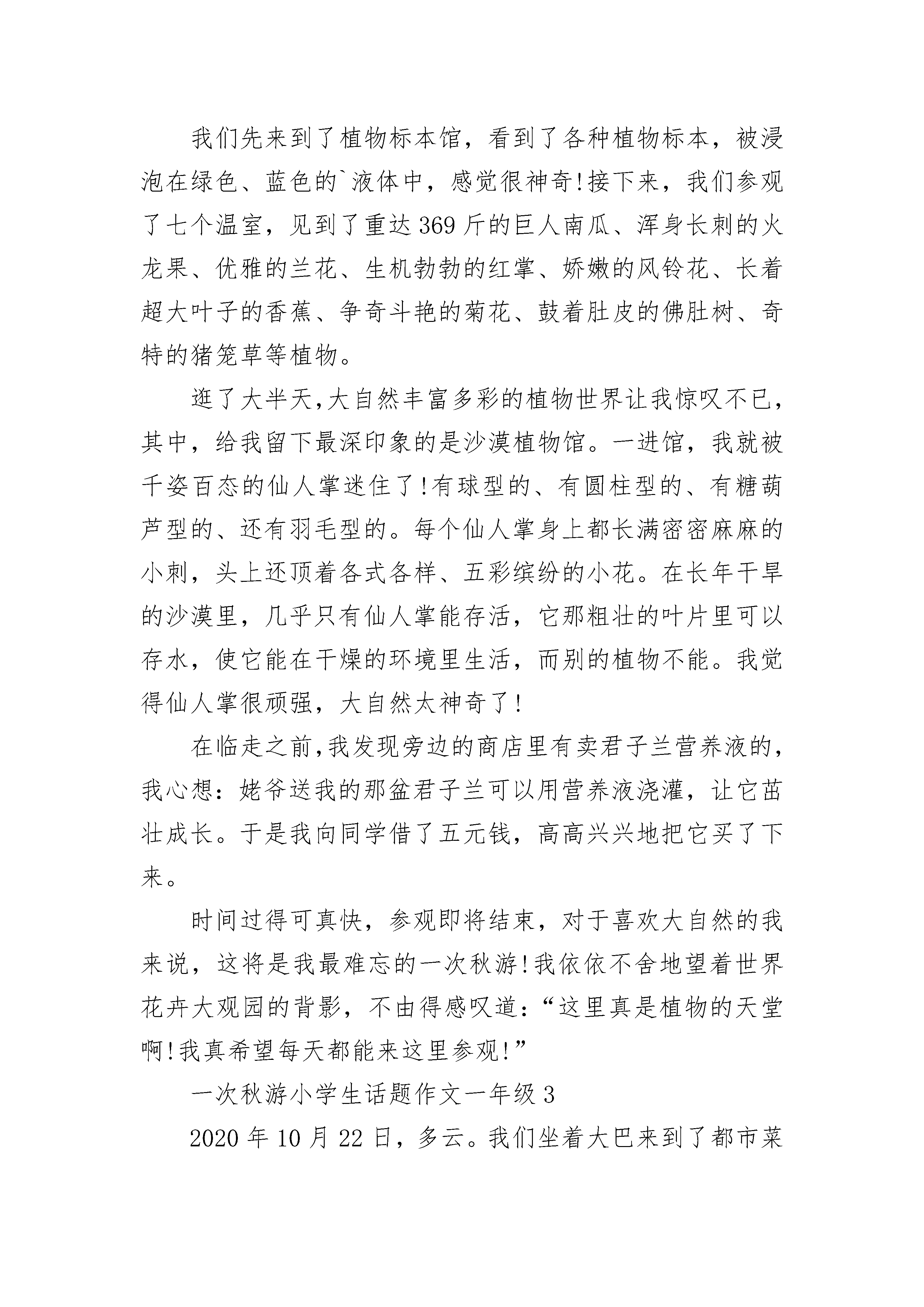 一次秋游小学生话题作文一年级10月26日,终于迎来了一年一度的秋游,我的心情像裹了蜜一样甜。早晨,我们乘坐着大巴,来到绿健生态农庄。第一个活动是红十字专家的教学,讲的是心肺复苏,我进场瞧见躺在桌上的假人第一反应便是:人工呼吸!果不其然,复苏的最后一步就是人工呼吸。我全神贯注地听完了这堂课,对心肺复苏有了一定的认识。接下来老师带我们体验了房消防模拟练习和地震哦,这地震屋刚开始十分的有趣,他一晃椅子的方式让我们体验了地震,我们惊心动魄,手脚都被抖麻了,可真没想到这地真是如此激烈,吓得我差点从椅子上摔下来,有几个同学甚至吓得尖叫起来。当屏幕中的火焰燃起时,我也有点慌了手脚。地震屋中的灯不停的闪烁,配合着火焰,我眯着眼让自己努力正经定下来。可看着满是裂缝的地和熊熊大火,我不禁想到了一些孩子被吓得一动不动的画面,我惶惶不知所措,好像自己就删了如棋先声,临其境。这时我深深地体会到在地震中学会自救是多么重要。结束后我如梦初醒,恍恍惚惚地走出门,脑袋依旧停留在地震的场景。一下子就到中午了,我们吃完午饭过后,老师又带着我们来到了花盆里,这时我有点无聊了,切花有什么好看的,如果大伙可以种.种花啥的就有意思了,谁知老师真的让我们做姬口红花扦插了,我高兴的差点蹦上了天来的花盆旁,我照照阿姨说的话认真呢。扦插着我把一大段枝条剪成几小段,然后把叶子剪掉,只剩头上那两片叶子,再把他们一个个插进肥沃的泥土中,我满意的看了看自己的盆栽,心中充满了自豪感。时间。扦插过后,我们来到了高尔夫球场,可高尔夫对我来说可真是太陌生了,尽管教练细心的教我们,可我挥杆的动作依旧离标准俩字差了十万八千里。这时我可真想一旁的成年能学的这么快,会干动作能这么优雅时间一下就溜走了。秋游也就要结束了,我做的大巴中恋恋不舍的望着浓妆,形象哦,这一定是最难忘的秋游吧!一次秋游小学生话题作文一年级2从小,我就特别喜欢探索大自然,几乎每个周末都在公园度过,欣赏着各种植物、动物,乐此不疲。我们学校每年秋天都会组织秋游活动,今年的活动是去世界花卉大观园参观,知道了这一消息后,我每天都盼着出发的那一天早点到来!出发的前一天晚上我按捺不住自己的兴奋,早早开始准备零食、收拾书包,做好一切准备!一大早,同学们在学校集合后,一起坐着大巴,一路上欢声笑语,不知不觉中很快就到达了目的地。一进门,首先映入眼帘的是一座雄伟的雕像:天女散花。她高达七米,微笑地播撒着花朵,就像在把美好的祝福撒向人间。我还看到了一座大人和孩子在拉花车的雕像,他们的表情都雕得惟妙惟肖,好像在跟我们打招呼,欢迎我们的到来。我们先来到了植物标本馆,看到了各种植物标本,被浸泡在绿色、蓝色的`液体中,感觉很神奇!接下来,我们参观了七个温室,见到了重达369斤的巨人南瓜、浑身长刺的火龙果、优雅的兰花、生机勃勃的红掌、娇嫩的风铃花、长着超大叶子的香蕉、争奇斗艳的菊花、鼓着肚皮的佛肚树、奇特的猪笼草等植物。逛了大半天,大自然丰富多彩的植物世界让我惊叹不已,其中,给我留下最深印象的是沙漠植物馆。一进馆,我就被千姿百态的仙人掌迷住了!有球型的、有圆柱型的、有糖葫芦型的、还有羽毛型的。每个仙人掌身上都长满密密麻麻的小刺,头上还顶着各式各样、五彩缤纷的小花。在长年干旱的沙漠里,几乎只有仙人掌能存活,它那粗壮的叶片里可以存水,使它能在干燥的环境里生活,而别的植物不能。我觉得仙人掌很顽强,大自然太神奇了!在临走之前,我发现旁边的商店里有卖君子兰营养液的,我心想:姥爷送我的那盆君子兰可以用营养液浇灌,让它茁壮成长。于是我向同学借了五元钱,高高兴兴地把它买了下来。时间过得可真快,参观即将结束,对于喜欢大自然的我来说,这将是我最难忘的一次秋游!我依依不舍地望着世界花卉大观园的背影,不由得感叹道:“这里真是植物的天堂啊!我真希望每天都能来这里参观!”一次秋游小学生话题作文一年级32020年10月22日,多云。我们坐着大巴来到了都市菜园。这个地方非常得大,有七百亩呢!里面有五个展馆,分别是农耕博览馆、博雅农园、馨香蔬苑、奇瓜异蔬苑、四季果园。我们走马观花地参观了农耕博览馆和博雅农园,来到了馨香蔬苑。一股清香扑鼻而来,原来是薄荷、熏衣草和其它多种蕴含着香气的植物散发出来的漫步在光明湖畔,湖面上波光粼粼。突然,一群天鹅出现在我的视线里,雪白的羽毛,长长的脖子,用红红的脚掌拨动着水面,这难道就是“白毛浮绿水,红掌拨清波”的美丽景色么?来到奇瓜异蔬苑,那细细长长的蛇瓜,属于葫芦科,是丝瓜的亲戚。它的`身材只有一双筷子那么细,但是长得惊人,足有一米八!真像一条直着身子的大青蛇。金黄色的“丑小鸭”葫芦,浑身长满一个个大小不一的疙瘩,有的像大拇指那么大,有的却像无名指那么小。虽然它是葫芦的近亲,但还是有所不同的。普通葫芦的柄很短,有两个圆滚滚的肚子;但它的葫芦柄却很长,只有一个扁扁胖