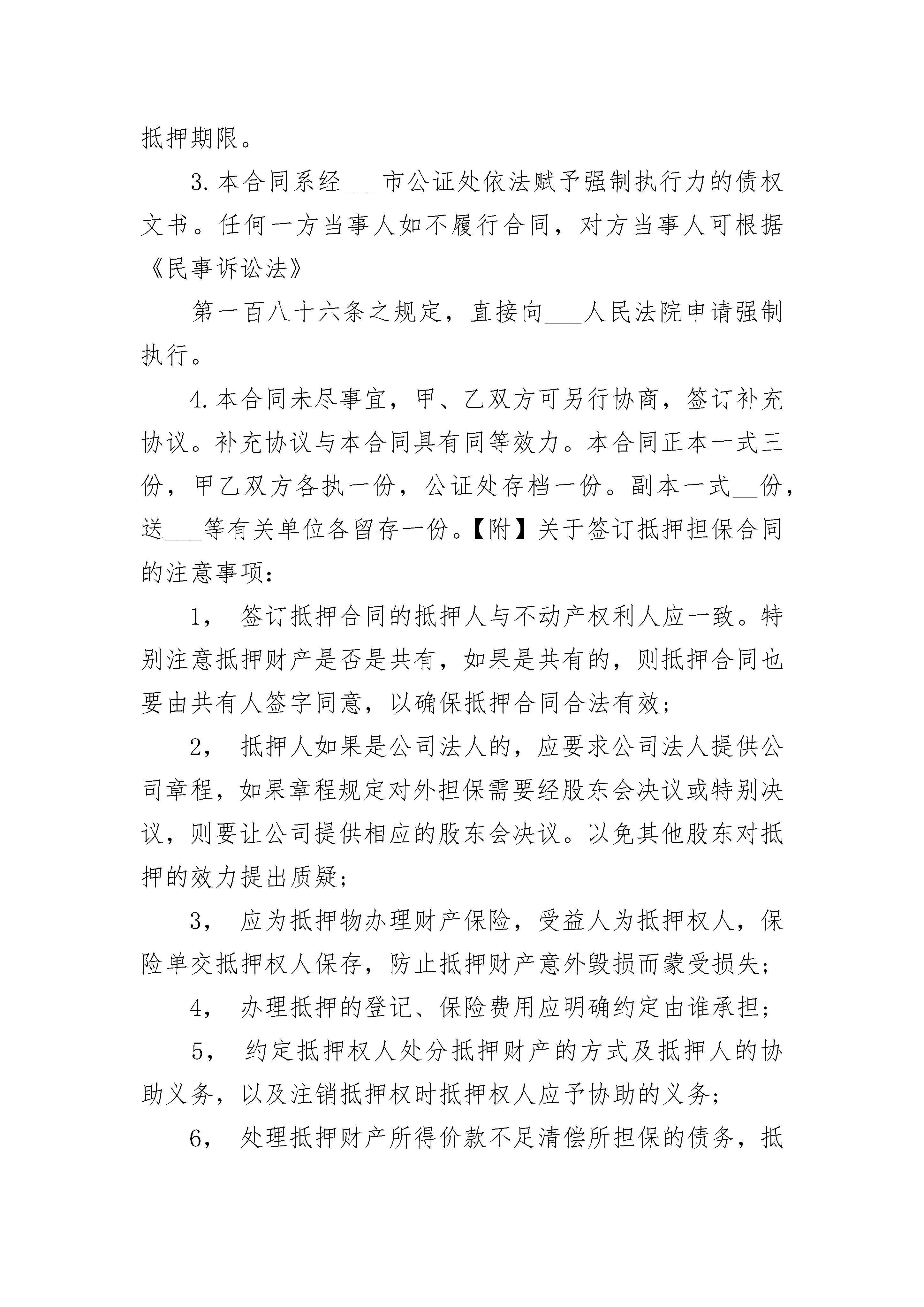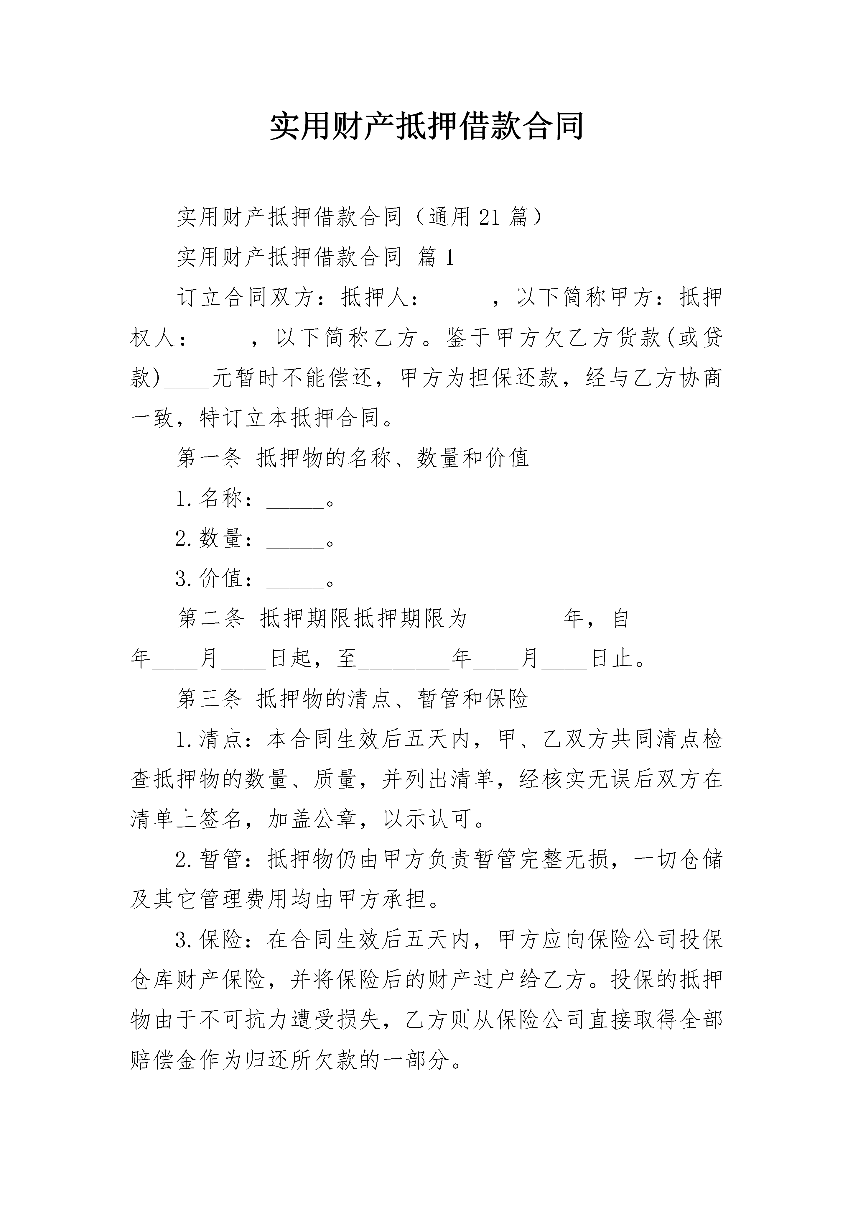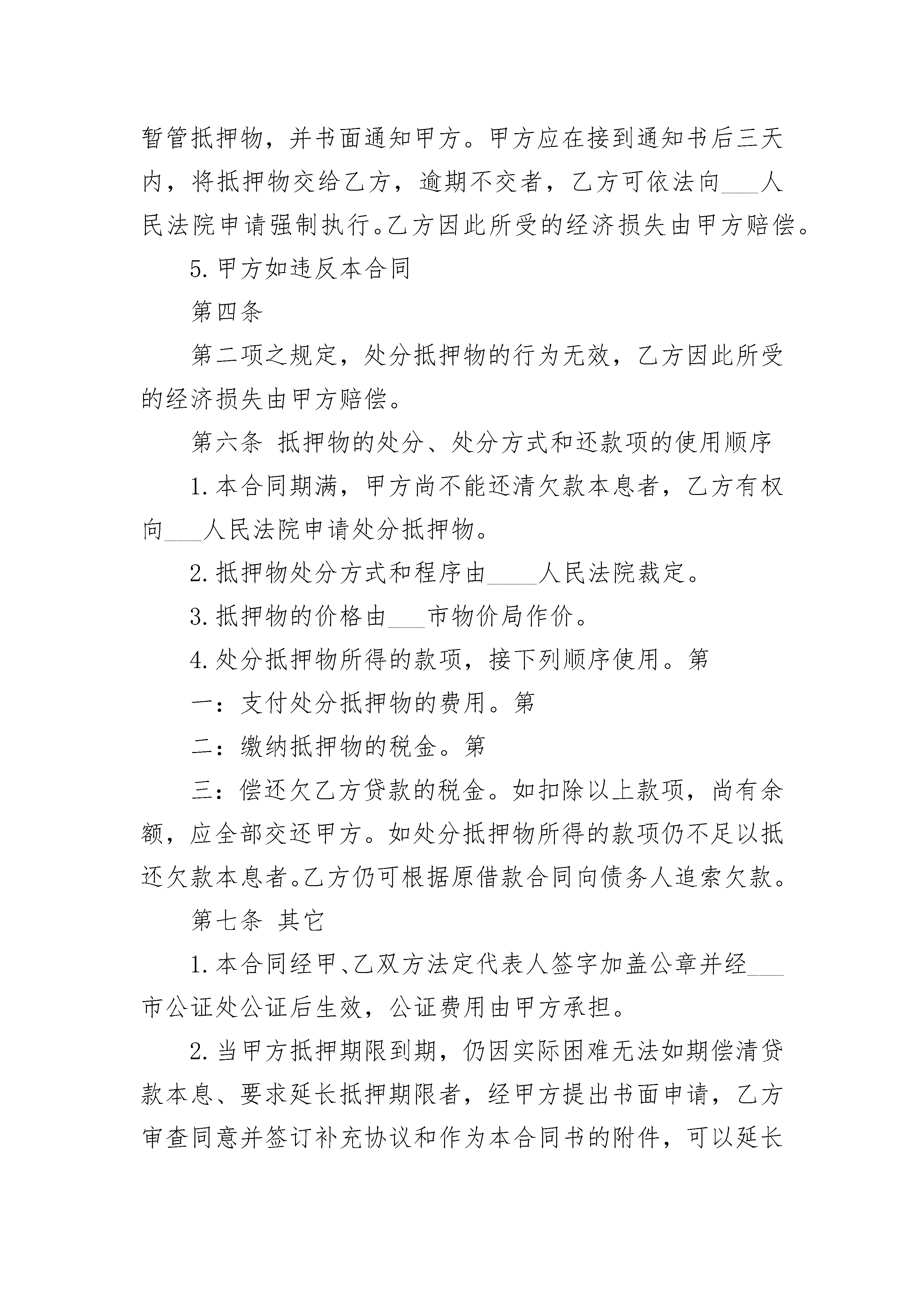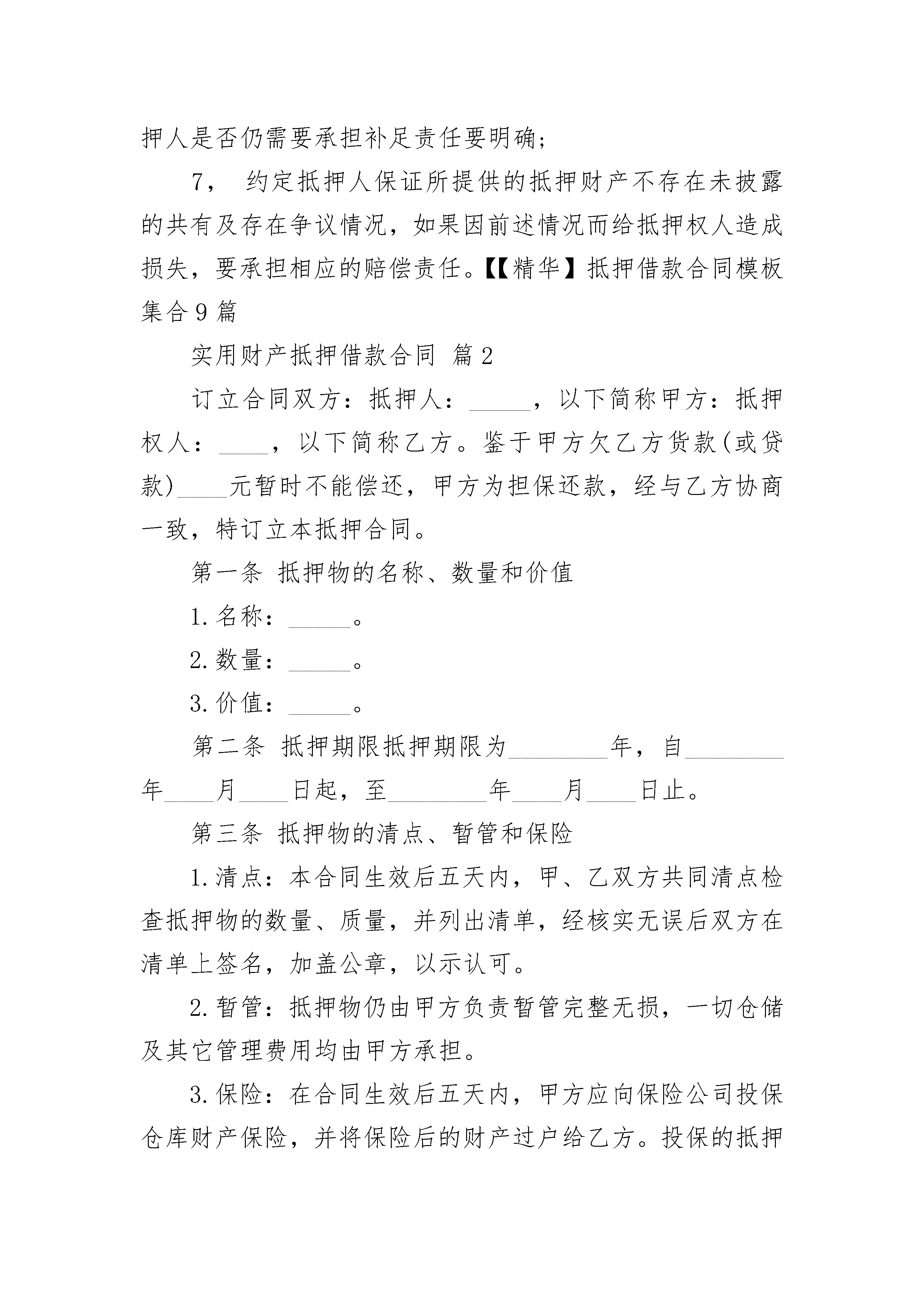 实用财产抵押借款合同实用财产抵押借款合同(通用21篇)实用财产抵押借款合同篇1订立合同双方:抵押人:_____,以下简称甲方:抵押权人:____,以下简称乙方。鉴于甲方欠乙方货款(或贷款)____元暂时不能偿还,甲方为担保还款,经与乙方协商一致,特订立本抵押合同。第一条抵押物的名称、数量和价值1.名称:_____。2.数量:_____。3.价值:_____。第二条抵押期限抵押期限为________年,自________年____月____日起,至________年____月____日止。第三条抵押物的清点、暂管和保险1.清点:本合同生效后五天内,甲、乙双方共同清点检查抵押物的数量、质量,并列出清单,经核实无误后双方在清单上签名,加盖公章,以示认可。2.暂管:抵押物仍由甲方负责暂管完整无损,一切仓储及其它管理费用均由甲方承担。3.保险:在合同生效后五天内,甲方应向保险公司投保仓库财产保险,并将保险后的财产过户给乙方。投保的抵押物由于不可抗力遭受损失,乙方则从保险公司直接取得全部赔偿金作为归还所欠款的一部分。第四条抵押物在抵押期限内的销售和监督1.抵押物的销售,仍由甲方负责,甲方应组织人员积极推销,并将所销售的货款直接交入乙方指定的账户,作为偿还欠款本息的资金来源之一。2.甲方在与需方签订供销合同时,应在合同中写明款项汇入___银行___分行___账户,即乙方指定的账户。甲方在发货之前,应提前三个工作日将销售合同提交乙方审,在外地签订的销售合同,应及时将合同副本或影印件提交甲方审定后方可发货。3.甲方每月应向乙方提供财务计划、物资库存、财务会计报表及有关经济资料,乙方认为必要时,有权进行检查抵押物的库存,销售情况以及与抵押物有关的帐目资料,甲方应给予协助。第五条甲方的义务及违约责任1.甲方应保证是该抵押的合法所有权人,今后如因该抵押物的所有权归属问题发生纠纷,并因此而引起乙方的损失时,甲方应负责赔偿。2.在本合同签订之后,甲方应将与抵押物有关的一切原始单证、票据交给乙方。3.甲方应妥善保管抵押物,不得遗失、毁损,甲方如因故意或过失造成抵押物毁损,应在十五天内向乙方提供新的抵押物。4.甲方未经乙方同意,不得将抵押物转让、出售、再抵押或以其它方式处分。甲方如违反前款规定,乙方有权立即暂管抵押物,并书面通知甲方。甲方应在接到通知书后三天内,将抵押物交给乙方,逾期不交者,乙方可依法向___人民法院申请强制执行。乙方因此所受的经济损失由甲方赔偿。5.甲方如违反本合同第四条第二项之规定,处分抵押物的行为无效,乙方因此所受的经济损失由甲方赔偿。第六条抵押物的处分、处分方式和还款项的使用顺序1.本合同期满,甲方尚不能还清欠款本息者,乙方有权向___人民法院申请处分抵押物。2.抵押物处分方式和程序由____人民法院裁定。3.抵押物的价格由___市物价局作价。4.处分抵押物所得的款项,接下列顺序使用。第一:支付处分抵押物的费用。第二:缴纳抵押物的税金。第三:偿还欠乙方贷款的税金。如扣除以上款项,尚有余额,应全部交还甲方。如处分抵押物所得的款项仍不足以抵还欠款本息者。乙方仍可根据原借款合同向债务人追索欠款。第七条其它1.本合同经甲、乙双方法定代表人签字加盖公章并经___市公证处公证后生效,公证费用由甲方承担。2.当甲方抵押期限到期,仍因实际困难无法如期偿清贷款本息、要求延长抵押期限者,经甲方提出书面申请,乙方审查同意并签订补充协议和作为本合同书的附件,可以延长抵押期限。3.本合同系经___市公证处依法赋予强制执行力的债权文书。任何一方当事人如不履行合同,对方当事人可根据《民事诉讼法》第一百八十六条之规定,直接向___人民法院申请强制执行。4.本合同未尽事宜,甲、乙双方可另行协商,签订补充协议。补充协议与本合同具有同等效力。本合同正本一式三份,甲乙双方各执一份,公证处存档一份。副本一式__份,送___等有关单位各留存一份。【附】关于签订抵押担保合同的注意事项:1,签订抵押合同的抵押人与不动产权利人应一致。特别注意抵押财产是否是共有,如果是共有的,则抵押合同也要由共有人签字同意,以确保抵押合同合法有效;2,抵押人如果是公司法人的,应要求公司法人提供公司章程,如果章程规定对外担保需要经股东会决议或特别决议,则要让公司提供相应的股东会决议。以免其他股东对抵押的效力提出质疑;3,应为抵押物办理财产保险,受益人为抵押权人,保险单交抵押权人保存,防止抵押财产意外毁损而蒙受损失;4,办理抵押的登记、保险费用应明确约定由谁承担;5,约定抵押权人处分抵押财产的方式及抵押人的协助义务,以及注销抵押权时抵押权人应予协助的义务;6,处理抵押财产所得价款不足清偿所担保的债务,抵押人是否仍需要承担补足责任要明确;7,约定抵押人保证所提供的抵押财产不存在未披露的共有及存在争议情况