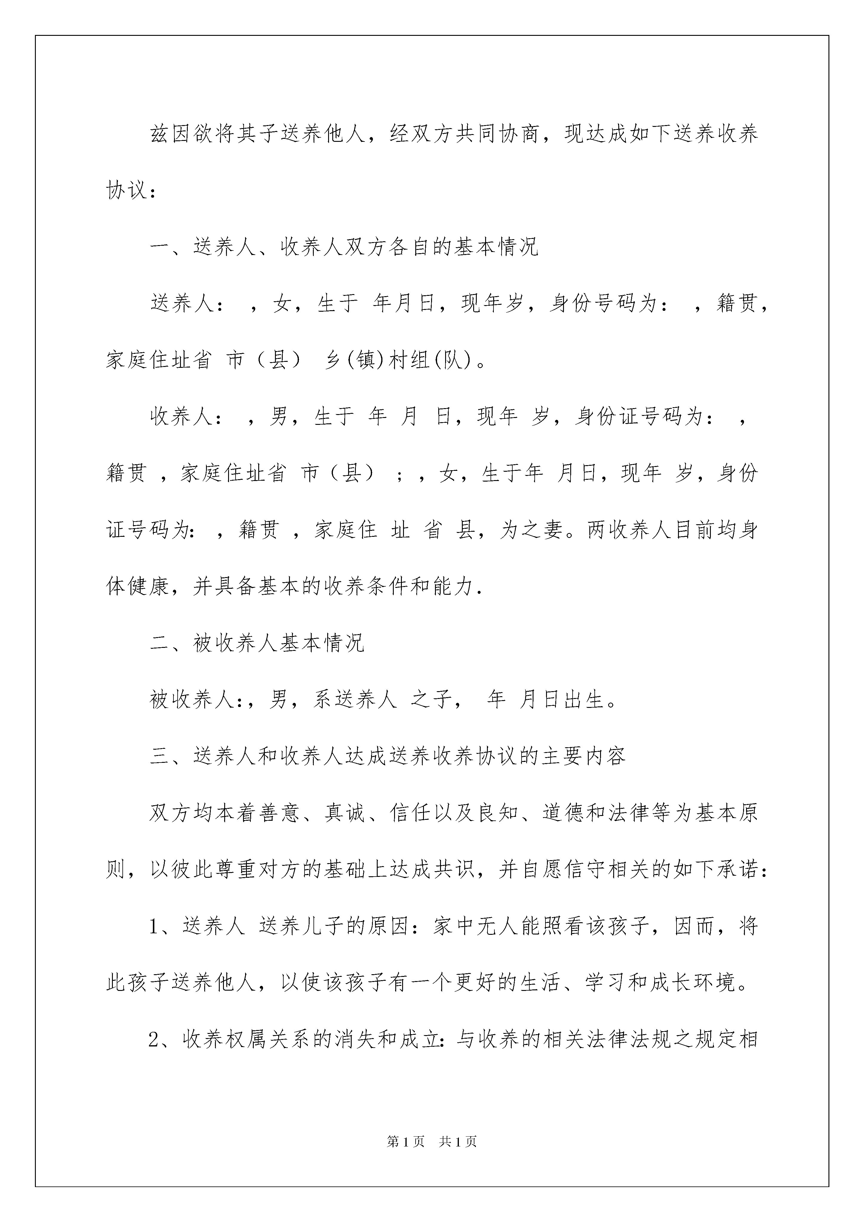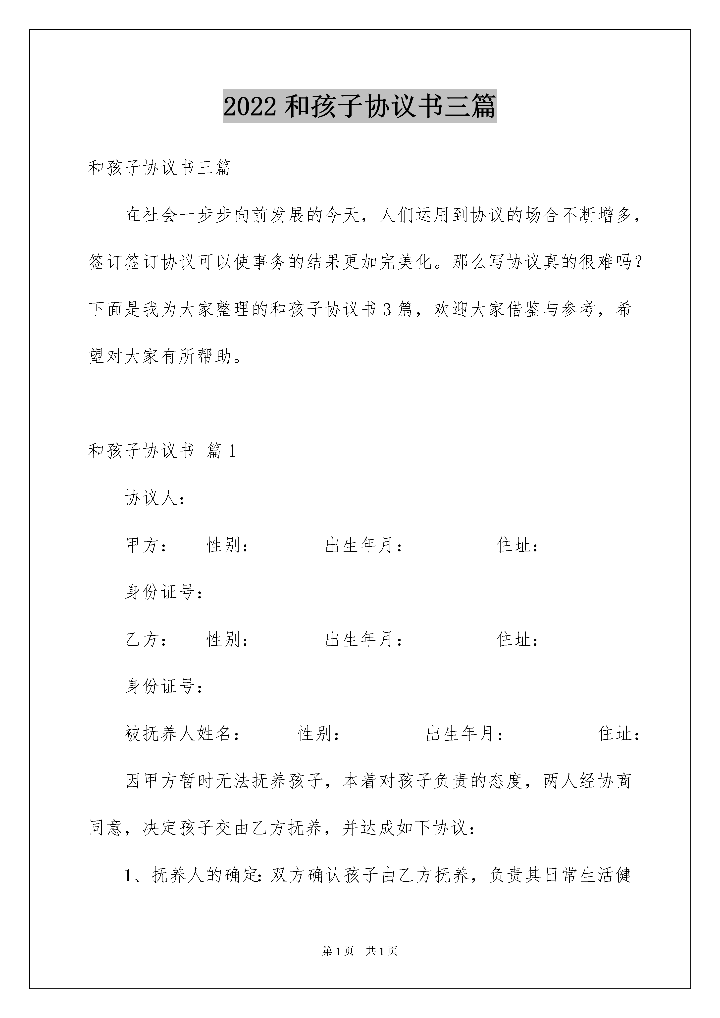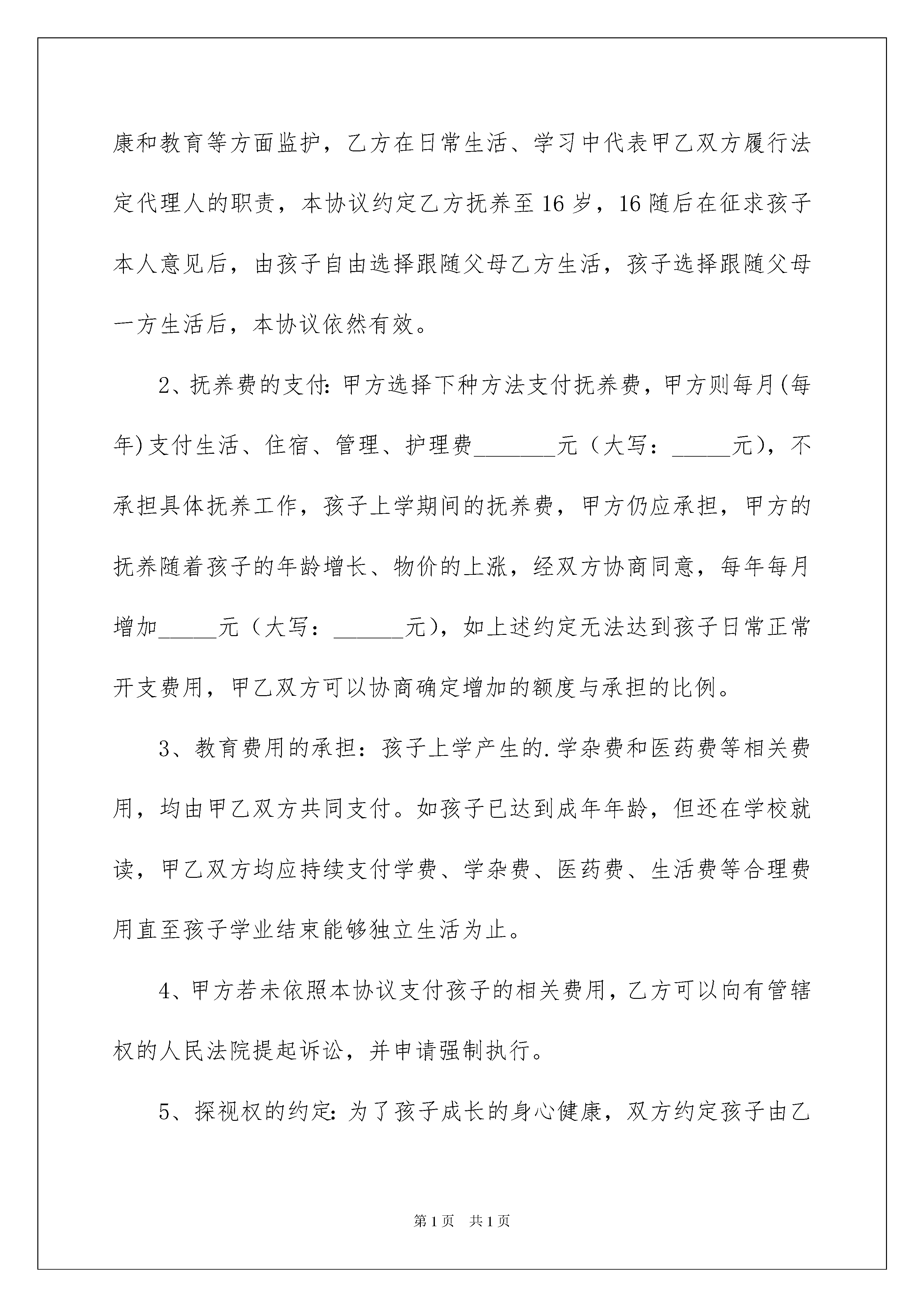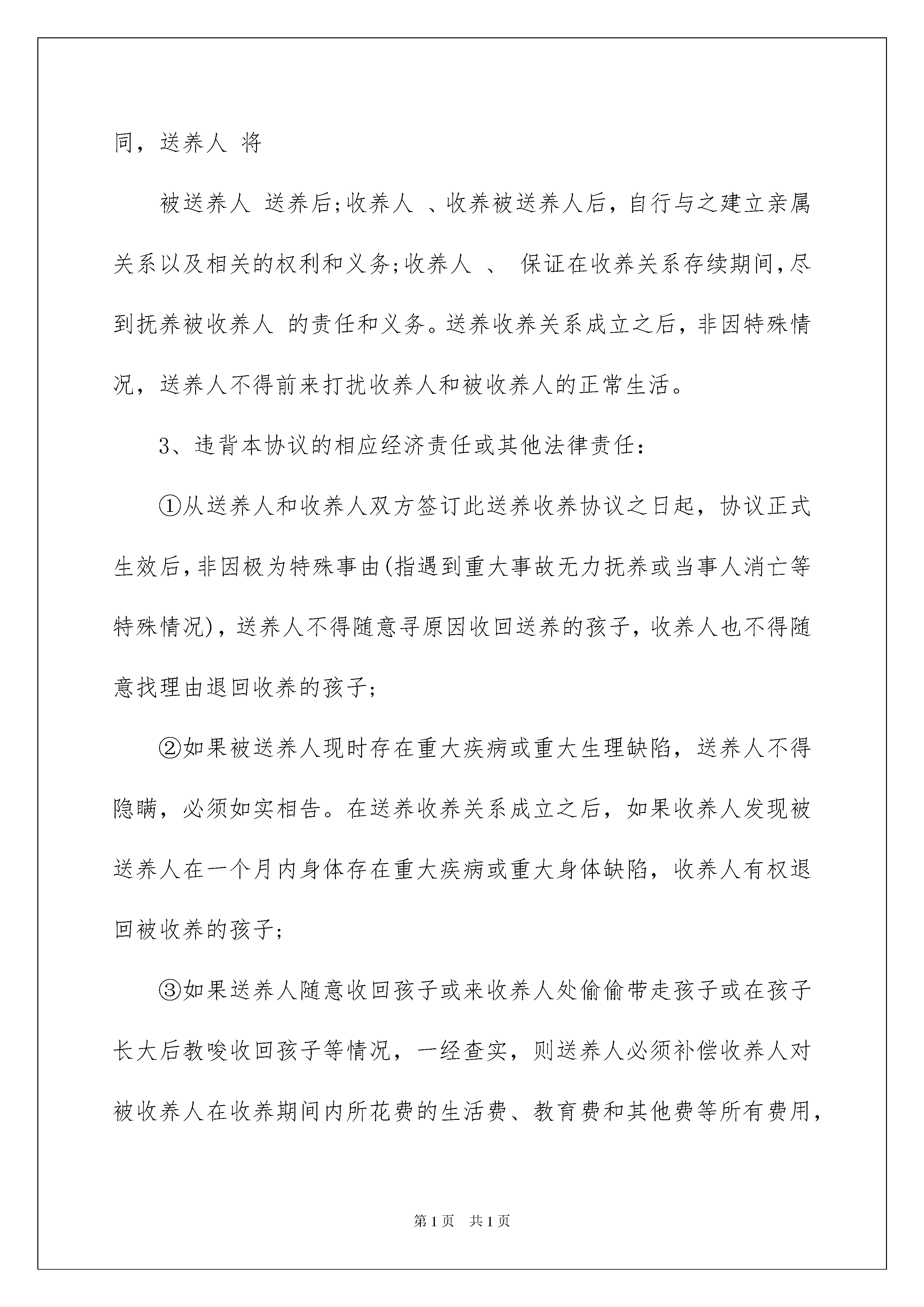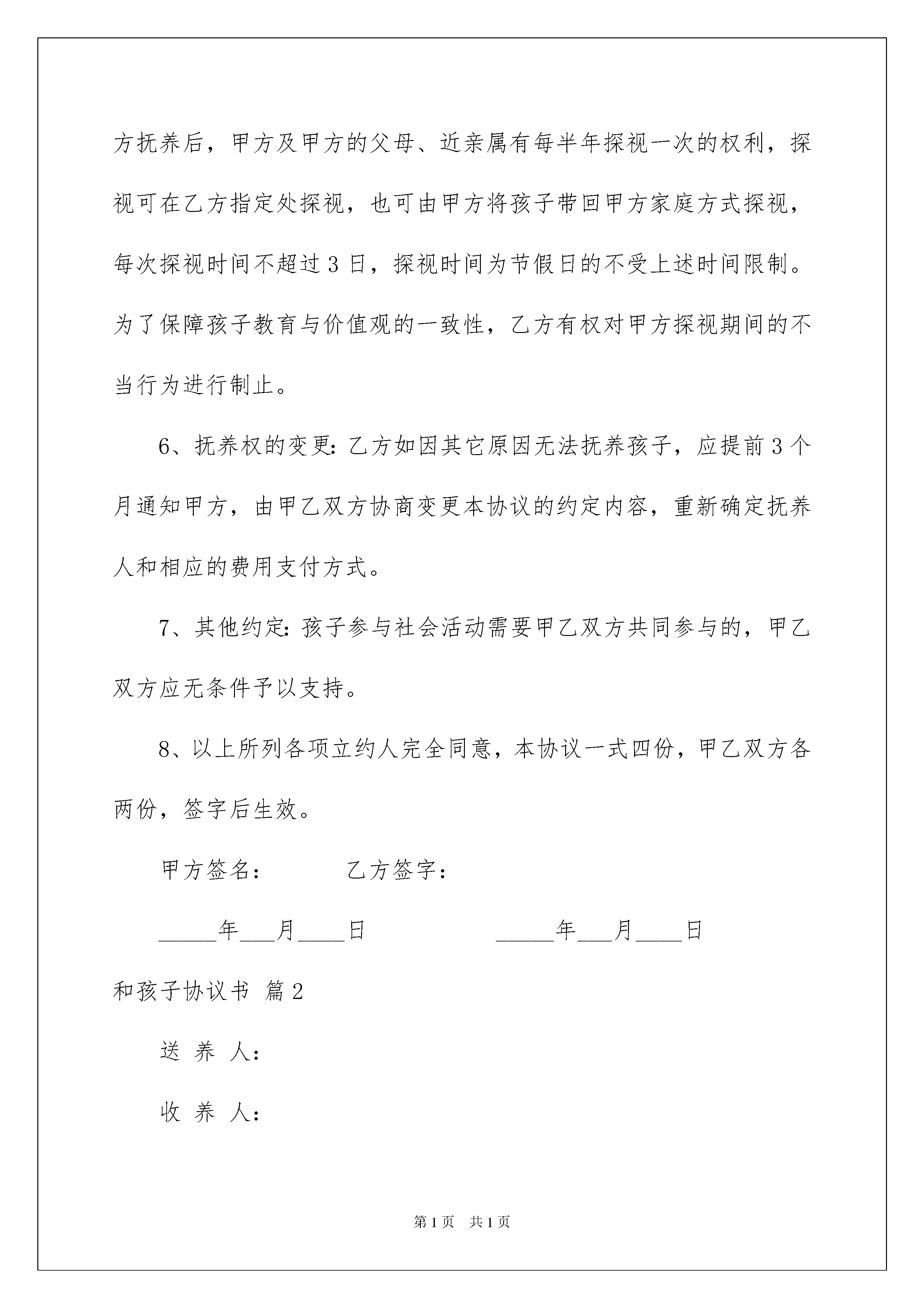 2022和孩子协议书三篇和孩子协议书三篇在社会一步步向前发展的今天,人们运用到协议的场合不断增多,签订签订协议可以使事务的结果更加完美化。那么写协议真的很难吗?下面是我为大家整理的和孩子协议书3篇,欢迎大家借鉴与参考,希望对大家有所帮助。和孩子协议书篇1协议人:甲方:性别:出生年月:住址:身份证号:乙方:性别:出生年月:住址:身份证号:被抚养人姓名:性别:出生年月:住址:因甲方暂时无法抚养孩子,本着对孩子负责的态度,两人经协商同意,决定孩子交由乙方抚养,并达成如下协议:1、抚养人的确定:双方确认孩子由乙方抚养,负责其日常生活健康和教育等方面监护,乙方在日常生活、学习中代表甲乙双方履行法定代理人的职责,本协议约定乙方抚养至16岁,16随后在征求孩子本人意见后,由孩子自由选择跟随父母乙方生活,孩子选择跟随父母一方生活后,本协议依然有效。2、抚养费的支付:甲方选择下种方法支付抚养费,甲方则每月(每年)支付生活、住宿、管理、护理费_______元(大写:_____元),不承担具体抚养工作,孩子上学期间的抚养费,甲方仍应承担,甲方的抚养随着孩子的年龄增长、物价的上涨,经双方协商同意,每年每月增加_____元(大写:______元),如上述约定无法达到孩子日常正常开支费用,甲乙双方可以协商确定增加的额度与承担的比例。3、教育费用的承担:孩子上学产生的.学杂费和医药费等相关费用,均由甲乙双方共同支付。如孩子已达到成年年龄,但还在学校就读,甲乙双方均应持续支付学费、学杂费、医药费、生活费等合理费用直至孩子学业结束能够独立生活为止。4、甲方若未依照本协议支付孩子的相关费用,乙方可以向有管辖权的人民法院提起诉讼,并申请强制执行。5、探视权的约定:为了孩子成长的身心健康,双方约定孩子由乙方抚养后,甲方及甲方的父母、近亲属有每半年探视一次的权利,探视可在乙方指定处探视,也可由甲方将孩子带回甲方家庭方式探视,每次探视时间不超过3日,探视时间为节假日的不受上述时间限制。为了保障孩子教育与价值观的一致性,乙方有权对甲方探视期间的不当行为进行制止。6、抚养权的变更:乙方如因其它原因无法抚养孩子,应提前3个月通知甲方,由甲乙双方协商变更本协议的约定内容,重新确定抚养人和相应的费用支付方式。7、其他约定:孩子参与社会活动需要甲乙双方共同参与的,甲乙双方应无条件予以支持。8、以上所列各项立约人完全同意,本协议一式四份,甲乙双方各两份,签字后生效。甲方签名:乙方签字:_____年___月____日_____年___月____日和孩子协议书篇2送养人:收养人:兹因欲将其子送养他人,经双方共同协商,现达成如下送养收养协议:一、送养人、收养人双方各自的基本情况送养人:,女,生于年月日,现年岁,身份号码为:,籍贯,家庭住址省市(县)乡(镇)村组(队)。收养人:,男,生于年月日,现年岁,身份证号码为:,籍贯,家庭住址省市(县);,女,生于年月日,现年岁,身份证号码为:,籍贯,家庭住址省县,为之妻。两收养人目前均身体健康,并具备基本的收养条件和能力.二、被收养人基本情况被收养人:,男,系送养人之子,年月日出生。三、送养人和收养人达成送养收养协议的主要内容双方均本着善意、真诚、信任以及良知、道德和法律等为基本原则,以彼此尊重对方的基础上达成共识,并自愿信守相关的如下承诺:1、送养人送养儿子的原因:家中无人能照看该孩子,因而,将此孩子送养他人,以使该孩子有一个更好的生活、学习和成长环境。2、收养权属关系的消失和成立:与收养的相关法律法规之规定相同,送养人将被送养人送养后;收养人、收养被送养人后,自行与之建立亲属关系以及相关的权利和义务;收养人、保证在收养关系存续期间,尽到抚养被收养人的责任和义务。送养收养关系成立之后,非因特殊情况,送养人不得前来打扰收养人和被收养人的正常生活。3、违背本协议的相应经济责任或其他法律责任:①从送养人和收养人双方签订此送养收养协议之日起,协议正式生效后,非因极为特殊事由(指遇到重大事故无力抚养或当事人消亡等特殊情况),送养人不得随意寻原因收回送养的孩子,收养人也不得随意找理由退回收养的孩子;②如果被送养人现时存在重大疾病或重大生理缺陷,送养人不得隐瞒,必须如实相告。在送养收养关系成立之后,如果收养人发现被送养人在一个月内身体存在重大疾病或重大身体缺陷,收养人有权退回被收养的孩子;③如果送养人随意收回孩子或来收养人处偷偷带走孩子或在孩子长大后教唆收回孩子等情况,一经查实,则送养人必须补偿收养人对被收养人在收养期间内所花费的生活费、教育费和其他费等所有费用,并赔偿相应的精神损失费,另外,如果在已经有“