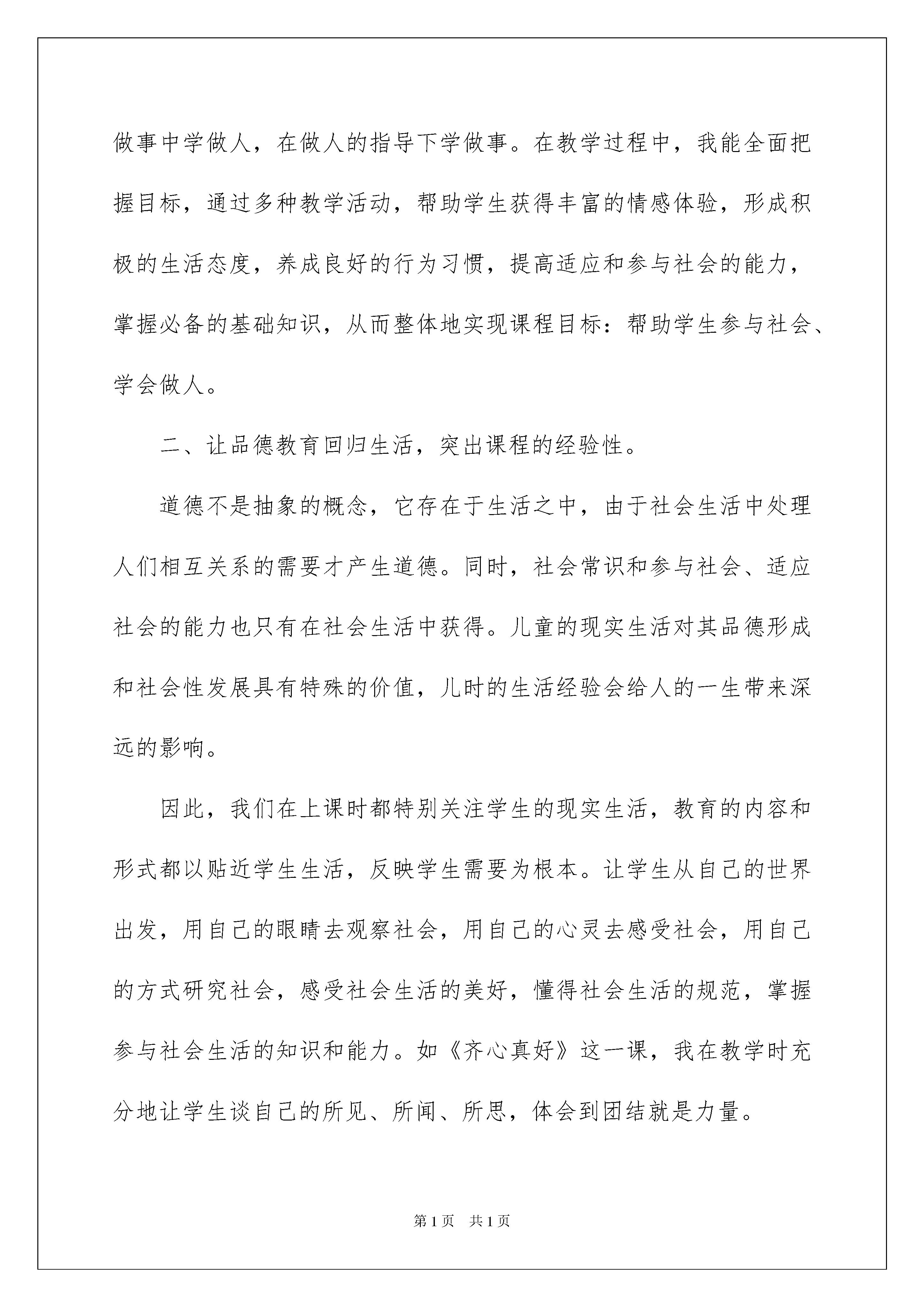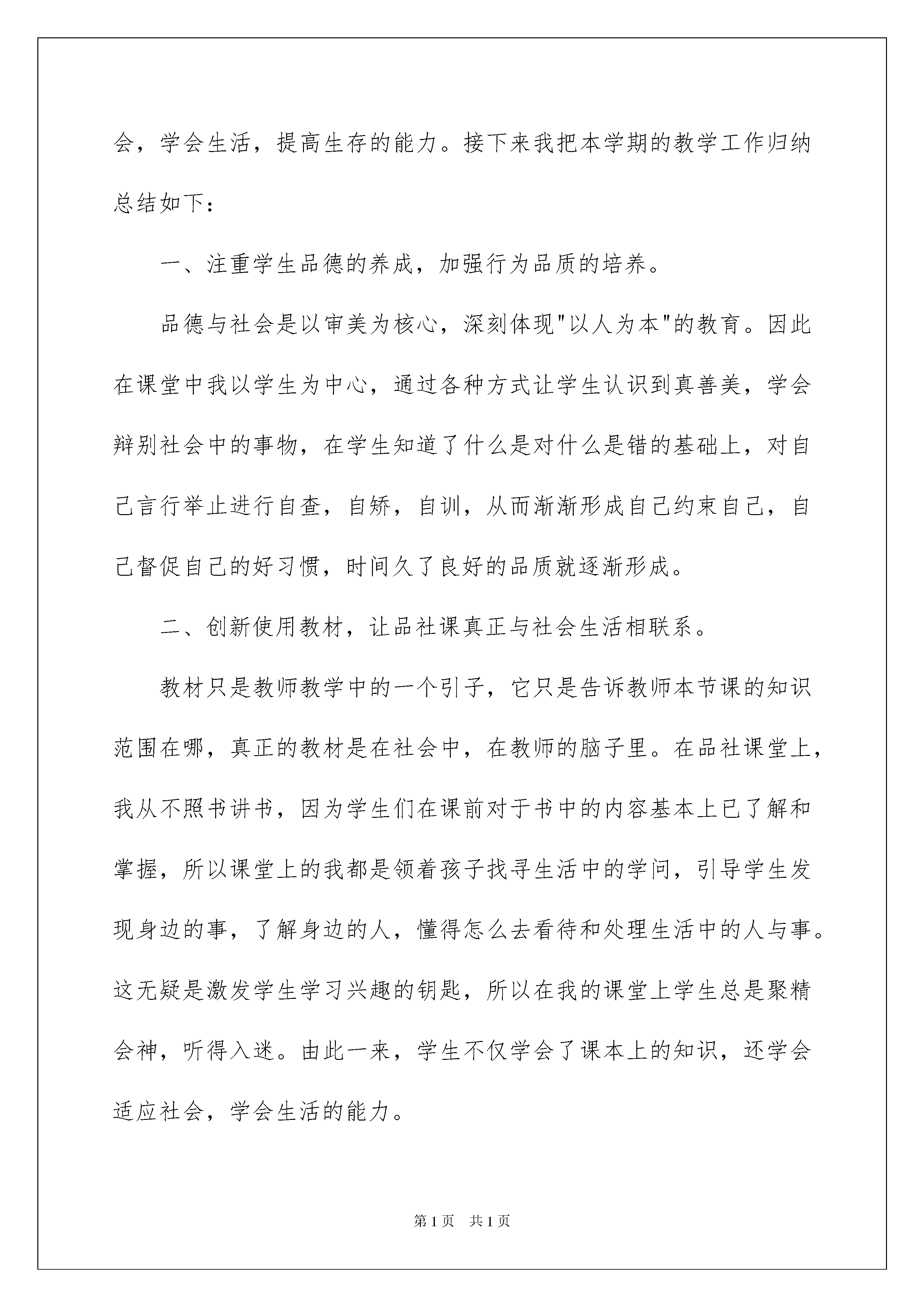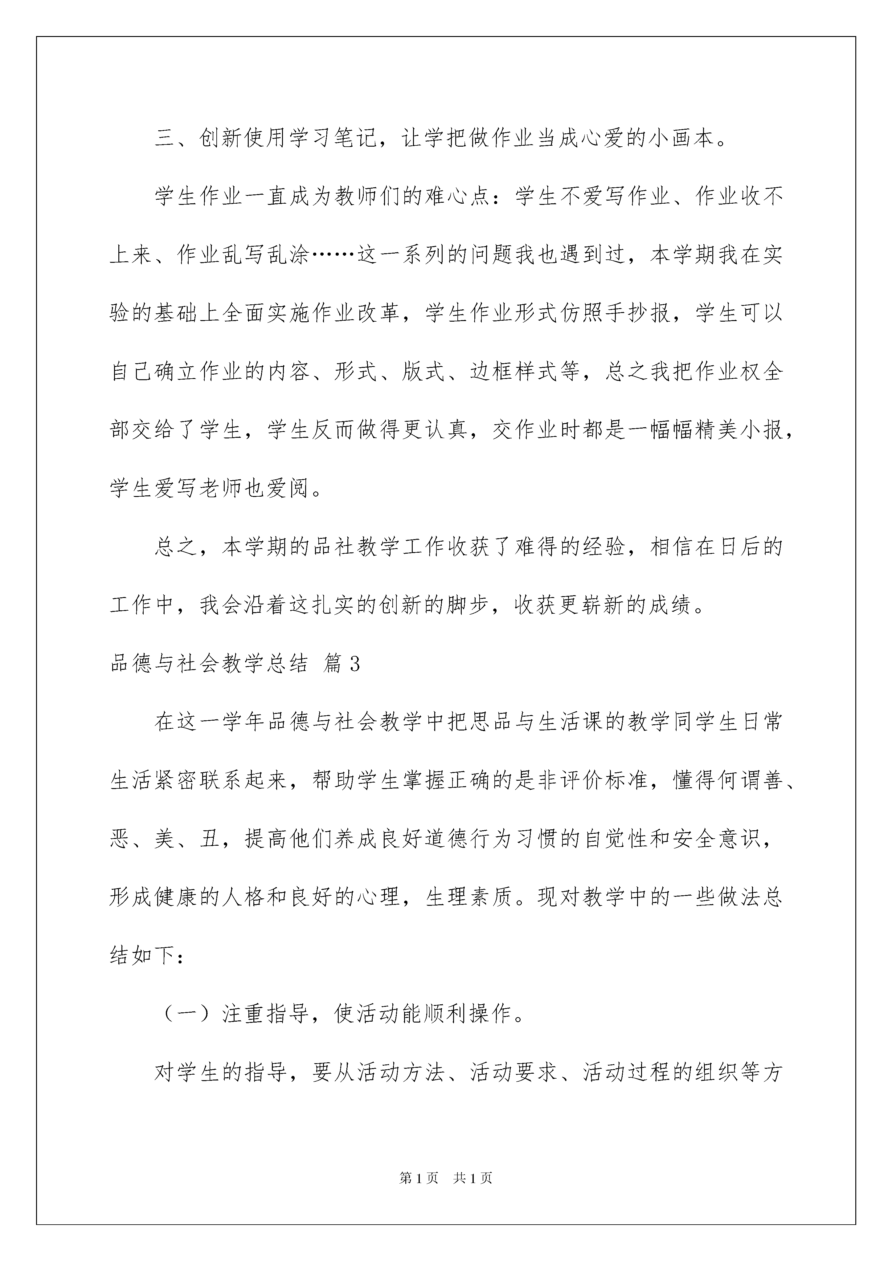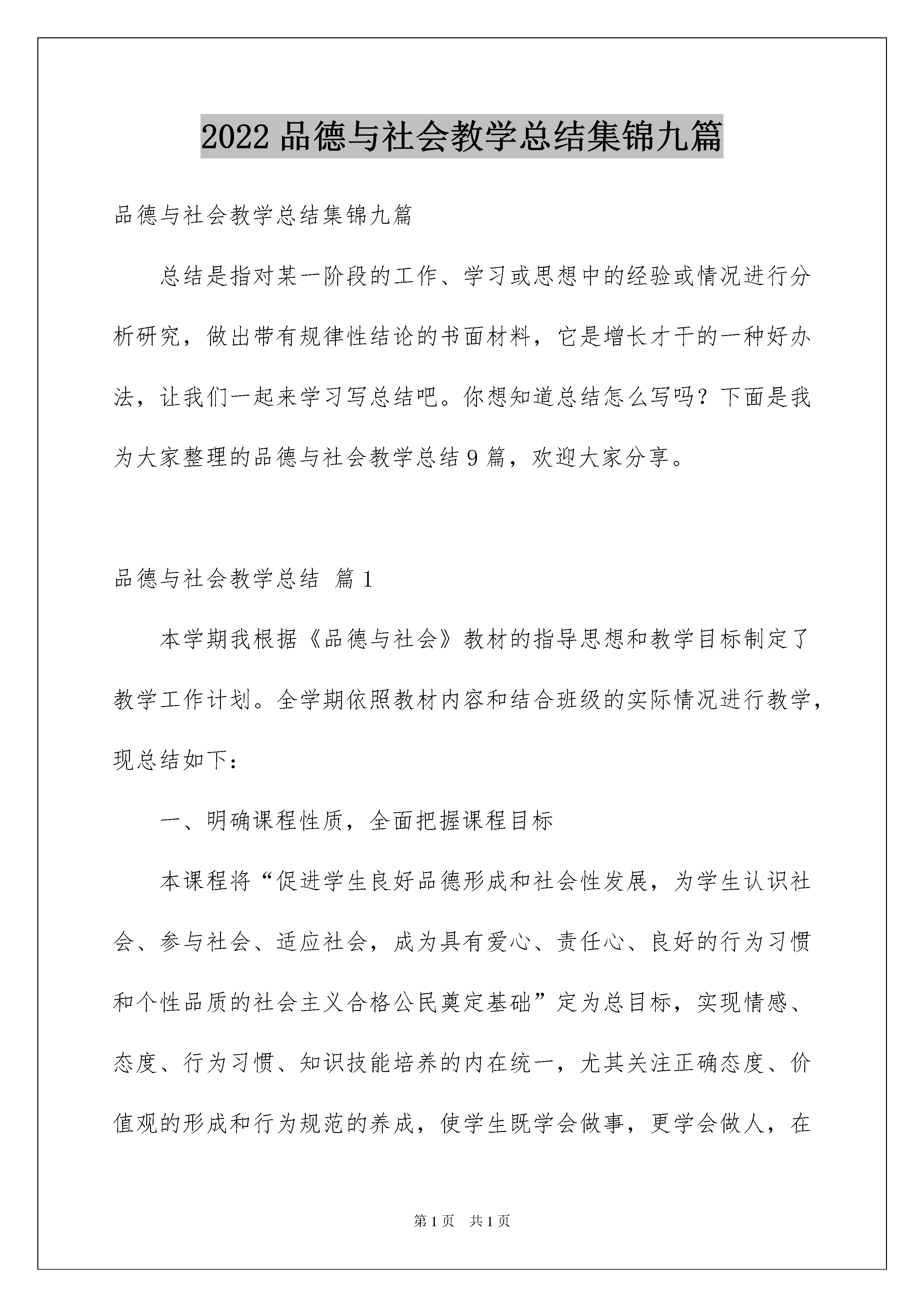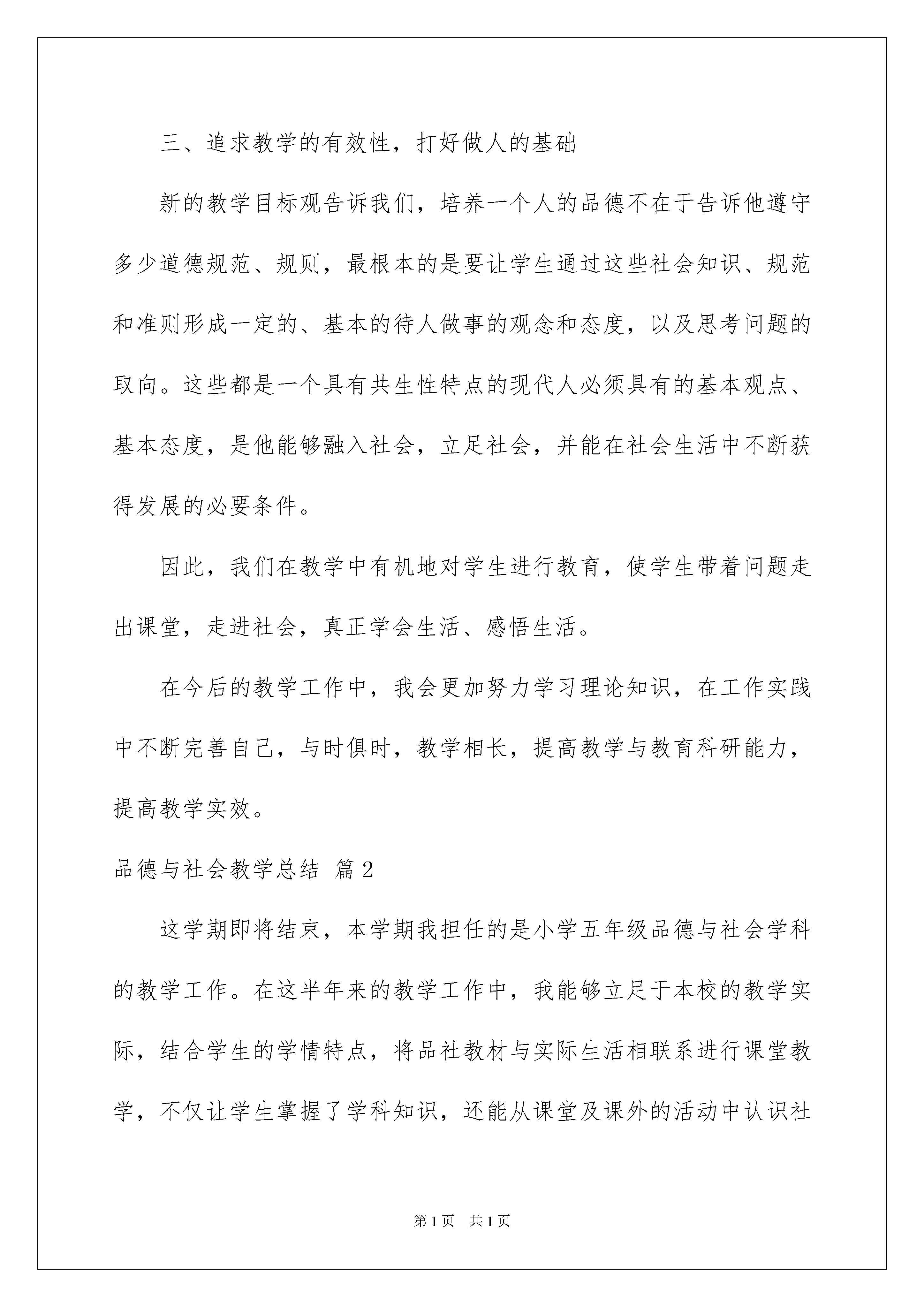 2022品德与社会教学总结集锦九篇品德与社会教学总结集锦九篇总结是指对某一阶段的工作、学习或思想中的经验或情况进行分析研究,做出带有规律性结论的书面材料,它是增长才干的一种好办法,让我们一起来学习写总结吧。你想知道总结怎么写吗?下面是我为大家整理的品德与社会教学总结9篇,欢迎大家分享。品德与社会教学总结篇1本学期我根据《品德与社会》教材的指导思想和教学目标制定了教学工作计划。全学期依照教材内容和结合班级的实际情况进行教学,现总结如下:一、明确课程性质,全面把握课程目标本课程将“促进学生良好品德形成和社会性发展,为学生认识社会、参与社会、适应社会,成为具有爱心、责任心、良好的行为习惯和个性品质的社会主义合格公民奠定基础”定为总目标,实现情感、态度、行为习惯、知识技能培养的内在统一,尤其关注正确态度、价值观的形成和行为规范的养成,使学生既学会做事,更学会做人,在做事中学做人,在做人的指导下学做事。在教学过程中,我能全面把握目标,通过多种教学活动,帮助学生获得丰富的情感体验,形成积极的生活态度,养成良好的行为习惯,提高适应和参与社会的能力,掌握必备的基础知识,从而整体地实现课程目标:帮助学生参与社会、学会做人。二、让品德教育回归生活,突出课程的经验性。道德不是抽象的概念,它存在于生活之中,由于社会生活中处理人们相互关系的需要才产生道德。同时,社会常识和参与社会、适应社会的能力也只有在社会生活中获得。儿童的现实生活对其品德形成和社会性发展具有特殊的价值,儿时的生活经验会给人的一生带来深远的影响。因此,我们在上课时都特别关注学生的现实生活,教育的内容和形式都以贴近学生生活,反映学生需要为根本。让学生从自己的世界出发,用自己的眼睛去观察社会,用自己的心灵去感受社会,用自己的方式研究社会,感受社会生活的美好,懂得社会生活的规范,掌握参与社会生活的知识和能力。如《齐心真好》这一课,我在教学时充分地让学生谈自己的所见、所闻、所思,体会到团结就是力量。三、追求教学的有效性,打好做人的基础新的教学目标观告诉我们,培养一个人的品德不在于告诉他遵守多少道德规范、规则,最根本的是要让学生通过这些社会知识、规范和准则形成一定的、基本的待人做事的观念和态度,以及思考问题的取向。这些都是一个具有共生性特点的现代人必须具有的基本观点、基本态度,是他能够融入社会,立足社会,并能在社会生活中不断获得发展的必要条件。因此,我们在教学中有机地对学生进行教育,使学生带着问题走出课堂,走进社会,真正学会生活、感悟生活。在今后的教学工作中,我会更加努力学习理论知识,在工作实践中不断完善自己,与时俱时,教学相长,提高教学与教育科研能力,提高教学实效。品德与社会教学总结篇2这学期即将结束,本学期我担任的是小学五年级品德与社会学科的教学工作。在这半年来的教学工作中,我能够立足于本校的教学实际,结合学生的学情特点,将品社教材与实际生活相联系进行课堂教学,不仅让学生掌握了学科知识,还能从课堂及课外的活动中认识社会,学会生活,提高生存的能力。接下来我把本学期的教学工作归纳总结如下:一、注重学生品德的养成,加强行为品质的培养。品德与社会是以审美为核心,深刻体现"以人为本"的教育。因此在课堂中我以学生为中心,通过各种方式让学生认识到真善美,学会辩别社会中的事物,在学生知道了什么是对什么是错的基础上,对自己言行举止进行自查,自矫,自训,从而渐渐形成自己约束自己,自己督促自己的好习惯,时间久了良好的品质就逐渐形成。二、创新使用教材,让品社课真正与社会生活相联系。教材只是教师教学中的一个引子,它只是告诉教师本节课的知识范围在哪,真正的教材是在社会中,在教师的脑子里。在品社课堂上,我从不照书讲书,因为学生们在课前对于书中的内容基本上已了解和掌握,所以课堂上的我都是领着孩子找寻生活中的学问,引导学生发现身边的事,了解身边的人,懂得怎么去看待和处理生活中的人与事。这无疑是激发学生学习兴趣的钥匙,所以在我的课堂上学生总是聚精会神,听得入迷。由此一来,学生不仅学会了课本上的知识,还学会适应社会,学会生活的能力。三、创新使用学习笔记,让学把做作业当成心爱的小画本。学生作业一直成为教师们的难心点:学生不爱写作业、作业收不上来、作业乱写乱涂……这一系列的问题我也遇到过,本学期我在实验的基础上全面实施作业改革,学生作业形式仿照手抄报,学生可以自己确立作业的内容、形式、版式、边框样式等,总之我把作业权全部交给了学生,学生反而做得更认真,交作业时都是一幅幅精美小报,学生爱写老师也爱阅。总之,本学期的品社教学工作收获了难得的经验,相信在日后的工作中,我会沿着这扎实的