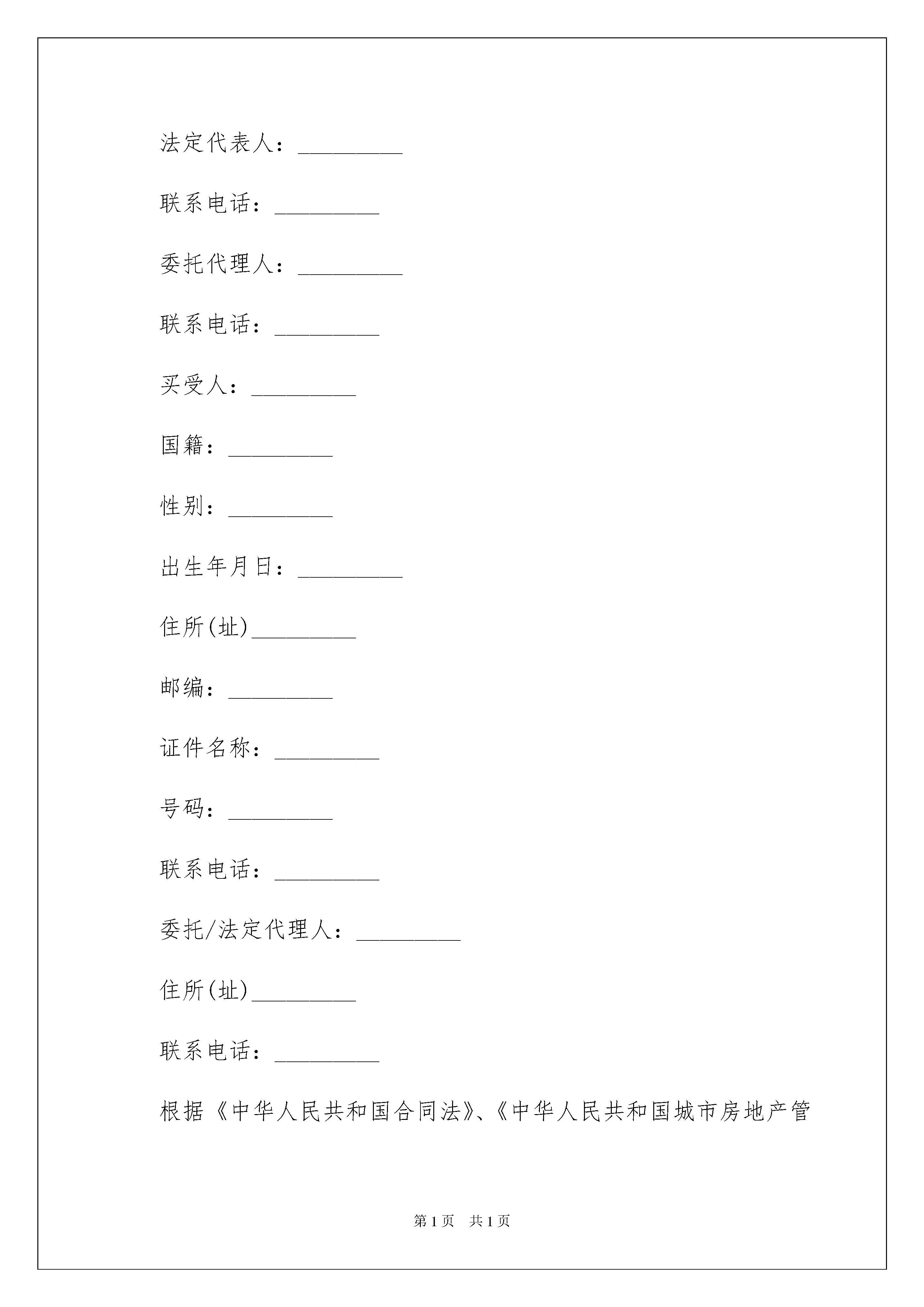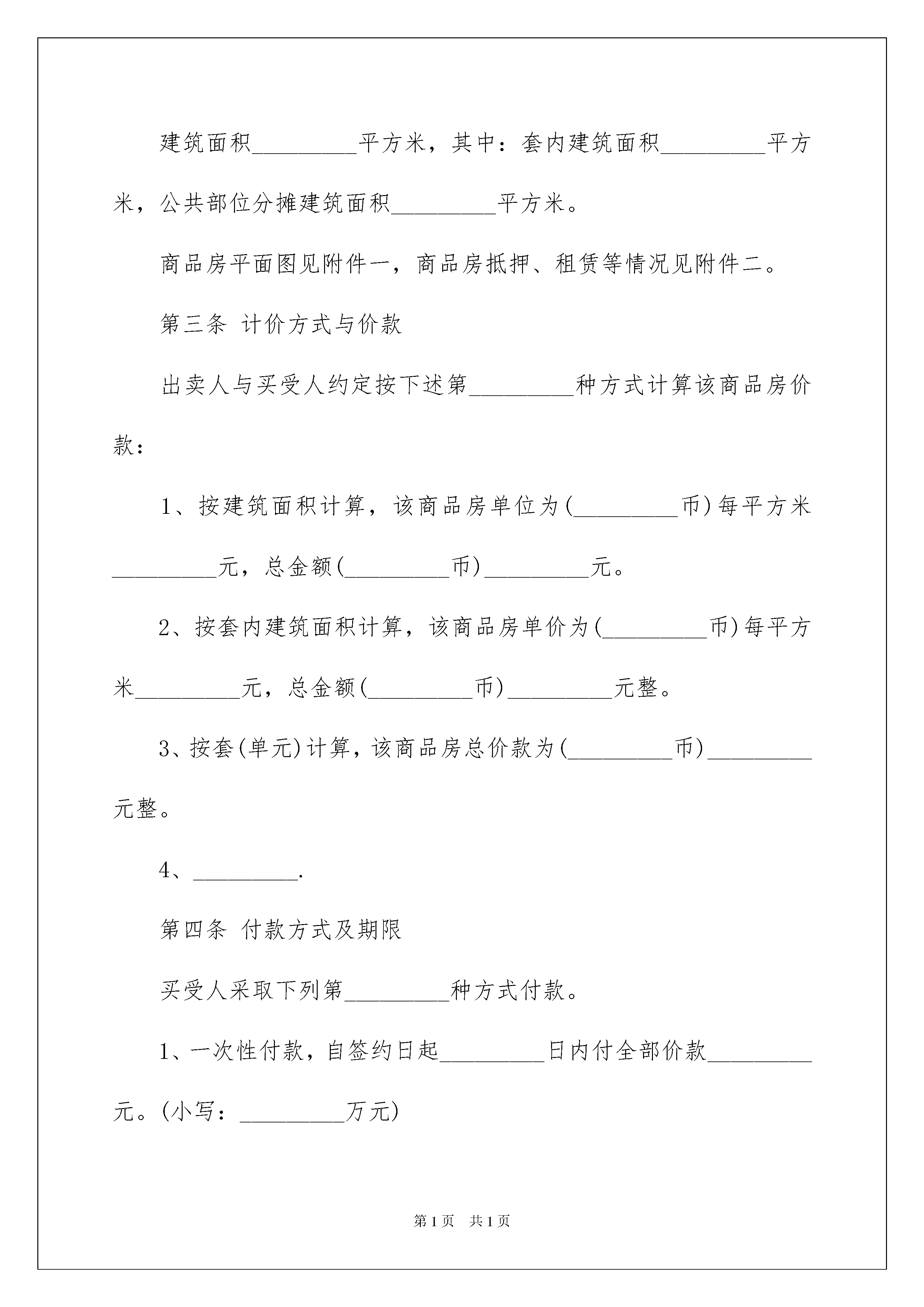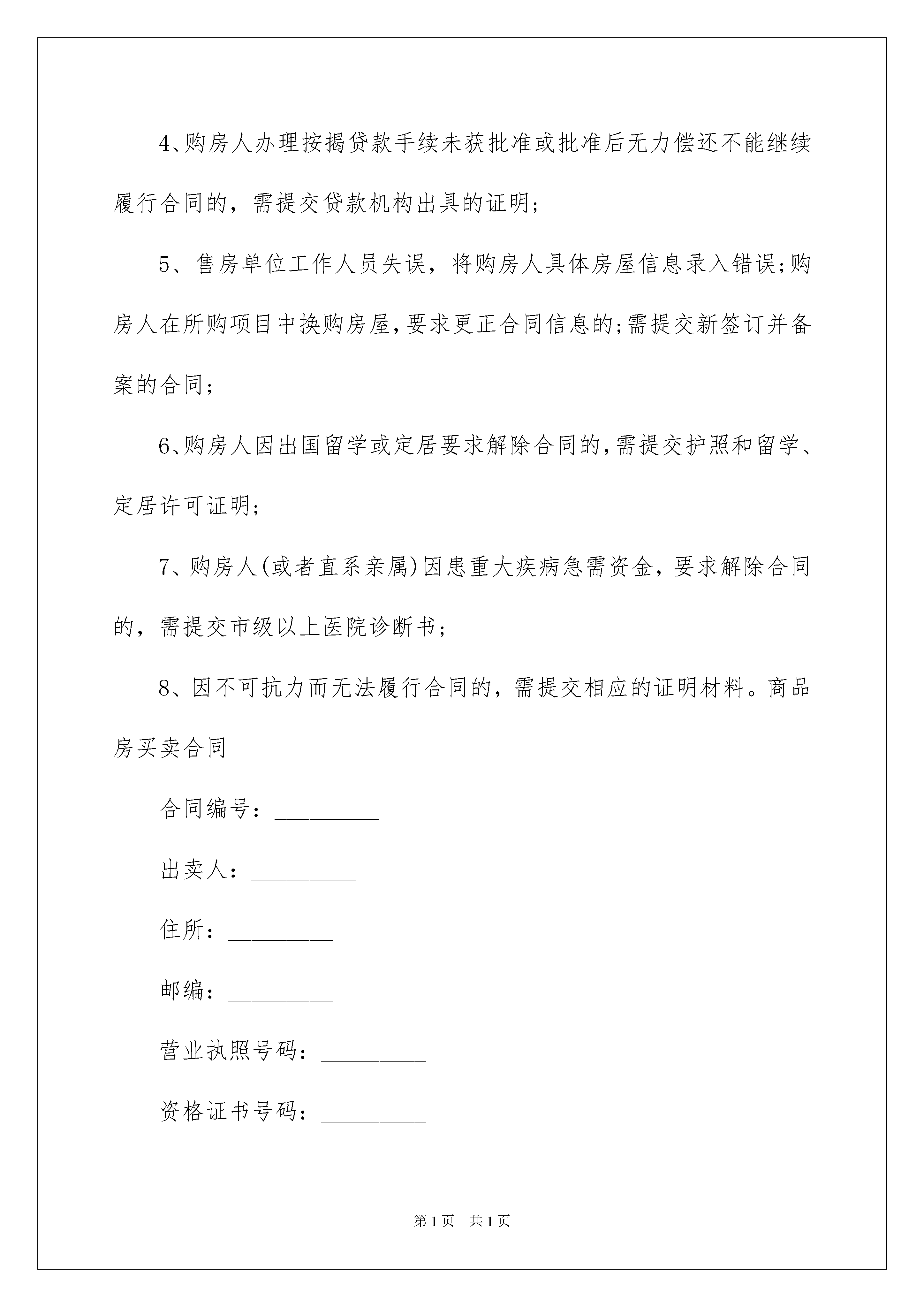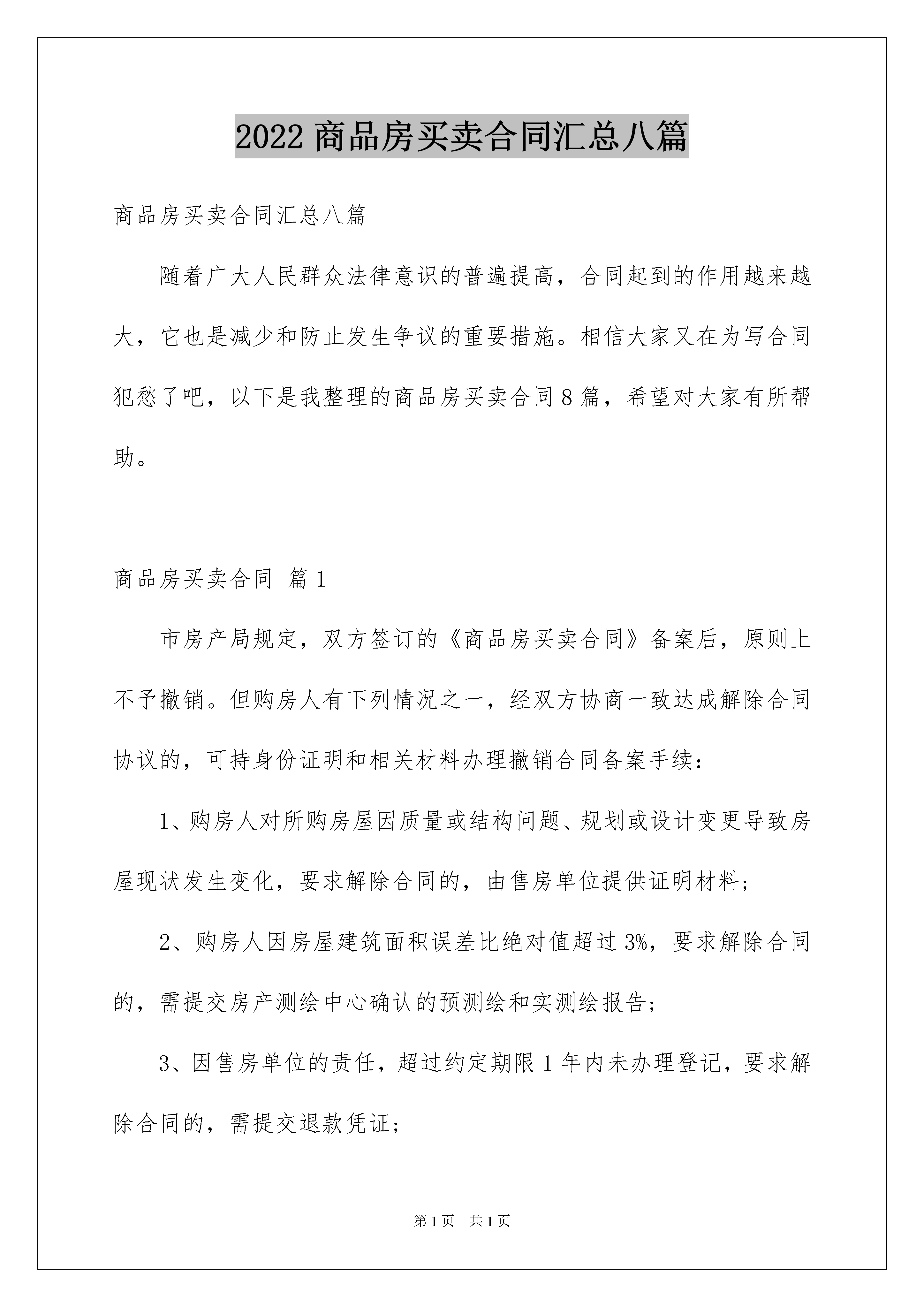 2022商品房买卖合同汇总八篇商品房买卖合同汇总八篇随着广大人民群众法律意识的普遍提高,合同起到的作用越来越大,它也是减少和防止发生争议的重要措施。相信大家又在为写合同犯愁了吧,以下是我整理的商品房买卖合同8篇,希望对大家有所帮助。商品房买卖合同篇1市房产局规定,双方签订的《商品房买卖合同》备案后,原则上不予撤销。但购房人有下列情况之一,经双方协商一致达成解除合同协议的,可持身份证明和相关材料办理撤销合同备案手续:1、购房人对所购房屋因质量或结构问题、规划或设计变更导致房屋现状发生变化,要求解除合同的,由售房单位提供证明材料;2、购房人因房屋建筑面积误差比绝对值超过3%,要求解除合同的,需提交房产测绘中心确认的预测绘和实测绘报告;3、因售房单位的责任,超过约定期限1年内未办理登记,要求解除合同的,需提交退款凭证;4、购房人办理按揭贷款手续未获批准或批准后无力偿还不能继续履行合同的,需提交贷款机构出具的证明;5、售房单位工作人员失误,将购房人具体房屋信息录入错误;购房人在所购项目中换购房屋,要求更正合同信息的;需提交新签订并备案的合同;6、购房人因出国留学或定居要求解除合同的,需提交护照和留学、定居许可证明;7、购房人(或者直系亲属)因患重大疾病急需资金,要求解除合同的,需提交市级以上医院诊断书;8、因不可抗力而无法履行合同的,需提交相应的证明材料。商品房买卖合同合同编号:_________出卖人:_________住所:_________邮编:_________营业执照号码:_________资格证书号码:_________法定代表人:_________联系电话:_________委托代理人:_________联系电话:_________买受人:_________国籍:_________性别:_________出生年月日:_________住所(址)_________邮编:_________证件名称:_________号码:_________联系电话:_________委托/法定代理人:_________住所(址)_________联系电话:_________根据《中华人民共和国合同法》、《中华人民共和国城市房地产管理法》及其他有关法律、法规之规定,买受人和出卖人在平等、自愿、协商一致的基础上就买卖商品房达成如下协议:第一条项目建设依据1、出卖人以方式取得座落于_________地块的国有土地使用权。2、该地块为:_________,土地使用权面积为:_________,买受人购买的商品房(以下简称该商品房)所在土地用途为:_________,土地使用年限自_________年_________月_________日至_________年_________月_________日止。3、出卖人经批准,在上述地块上建设的商品房为:_________,建设工程规划许可证号为:_________,建筑工程施工许可证号为:_________,建设工程施工合同约定的开工日期为:_________,建设工程施工合同约定的竣工日期为:_________.第二条商品房情况该商品房销售许可证号:_________.商品房座落:_________区_________县_________路、道、街。设计用途_________;建筑结构_________;建筑层数为_________层。建筑面积_________平方米,其中:套内建筑面积_________平方米,公共部位分摊建筑面积_________平方米。商品房平面图见附件一,商品房抵押、租赁等情况见附件二。第三条计价方式与价款出卖人与买受人约定按下述第_________种方式计算该商品房价款:1、按建筑面积计算,该商品房单位为(_________币)每平方米_________元,总金额(_________币)_________元。2、按套内建筑面积计算,该商品房单价为(_________币)每平方米_________元,总金额(_________币)_________元整。3、按套(单元)计算,该商品房总价款为(_________币)_________元整。4、_________.第四条付款方式及期限买受人采取下列第_________种方式付款。1、一次性付款,自签约日起_________日内付全部价款_________元。(小写:_________万元)2、分期付款。(1)第一次付款自签约日起_________日内付全部价款的_________%;________商品房买卖合同篇2「内容提要」最高人民法院《关于审理商品房买卖合同纠纷案件适用