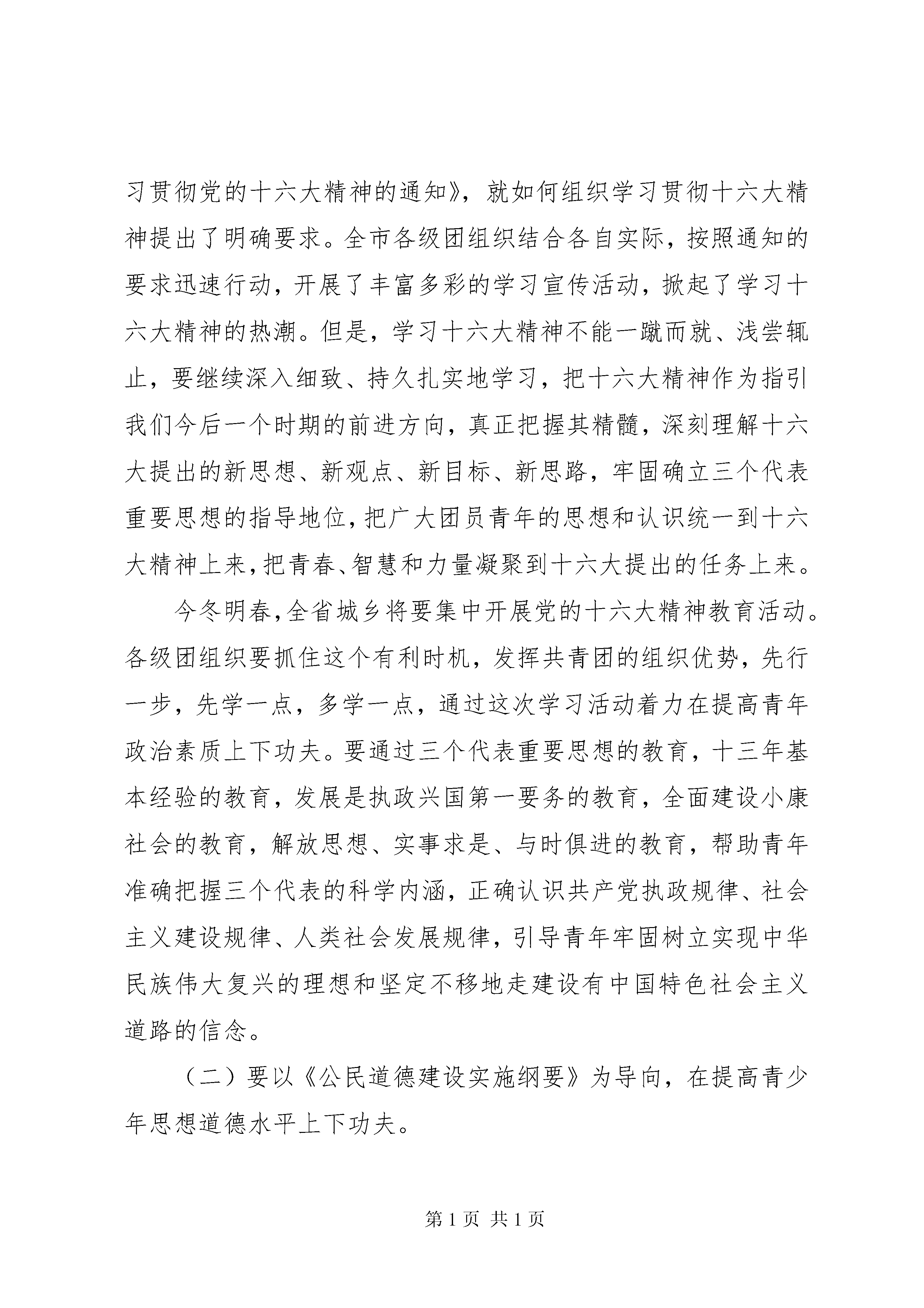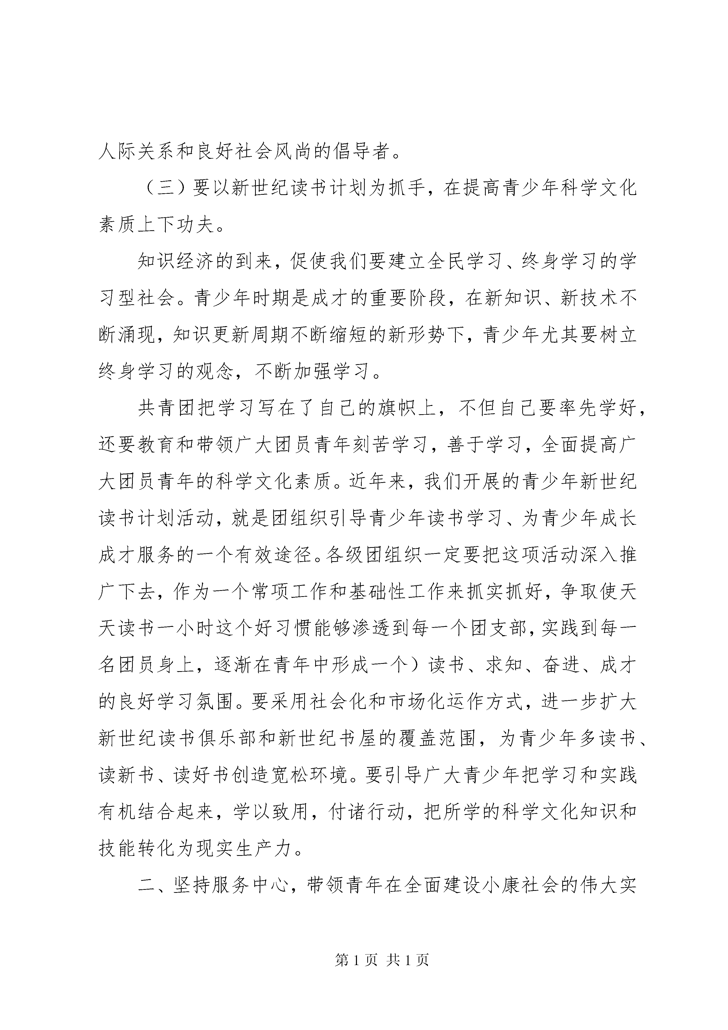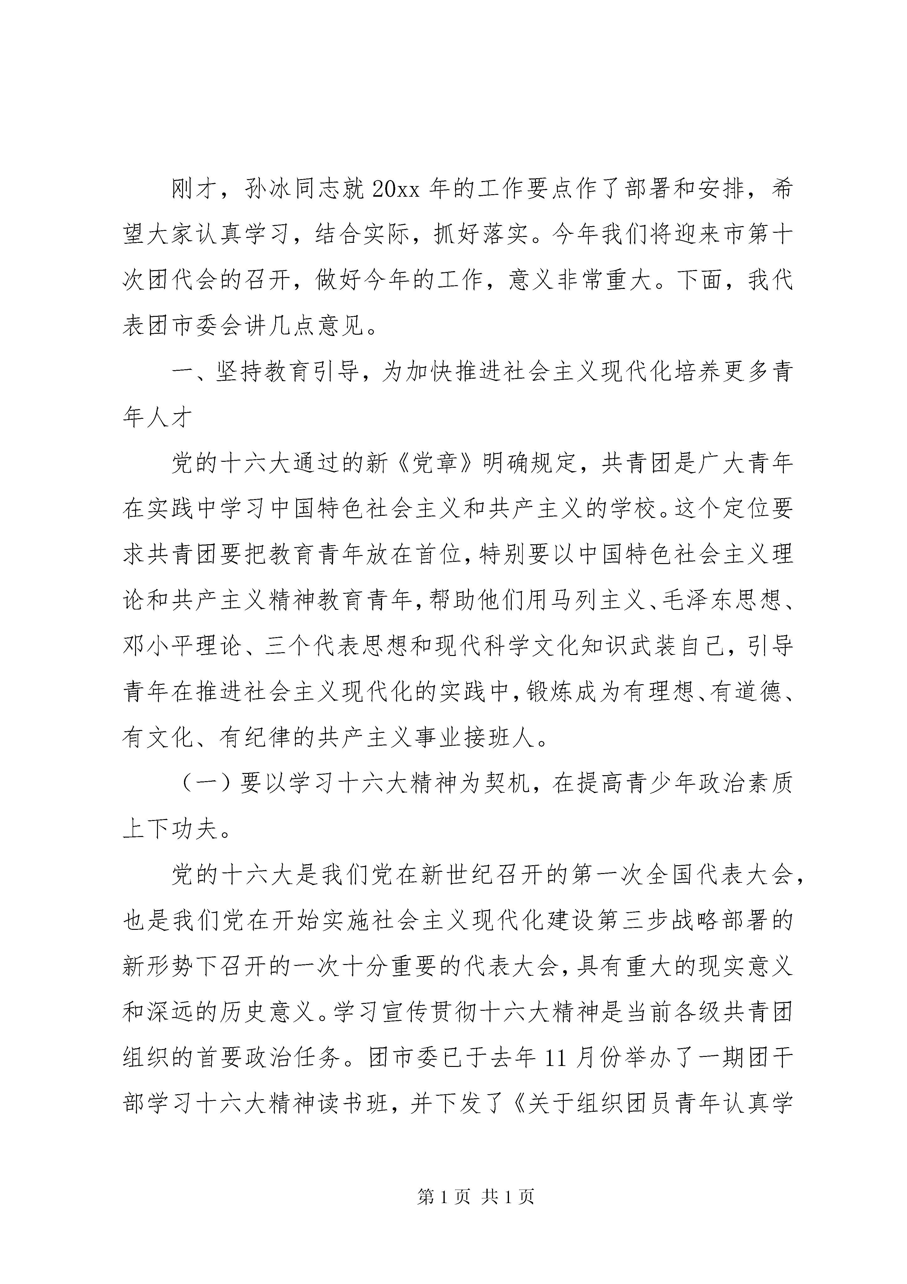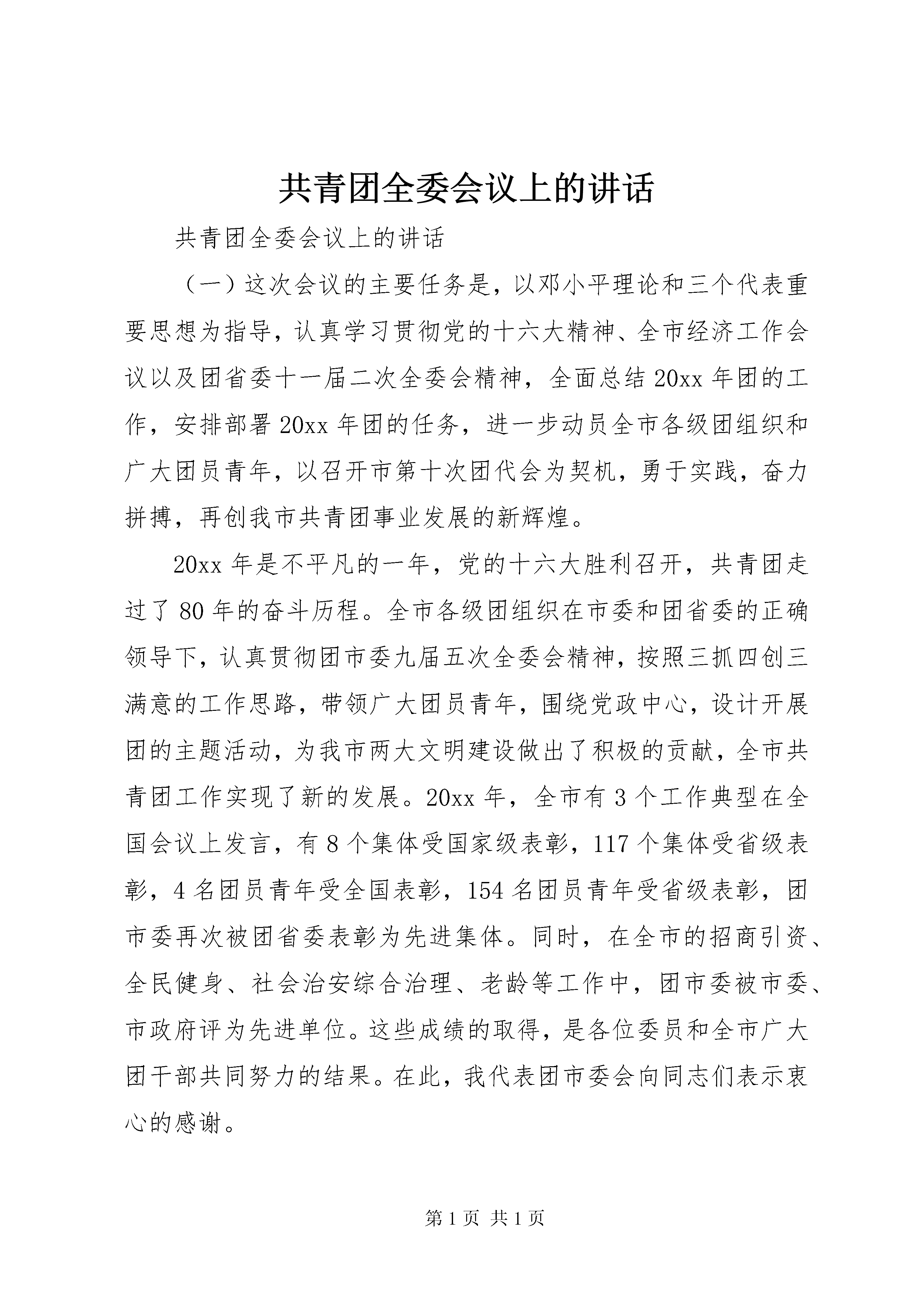 共青团全委会议上的讲话共青团全委会议上的讲话(一)这次会议的主要任务是,以邓小平理论和三个代表重要思想为指导,认真学习贯彻党的十六大精神、全市经济工作会议以及团省委十一届二次全委会精神,全面总结20xx年团的工作,安排部署20xx年团的任务,进一步动员全市各级团组织和广大团员青年,以召开市第十次团代会为契机,勇于实践,奋力拼搏,再创我市共青团事业发展的新辉煌。20xx年是不平凡的一年,党的十六大胜利召开,共青团走过了80年的奋斗历程。全市各级团组织在市委和团省委的正确领导下,认真贯彻团市委九届五次全委会精神,按照三抓四创三满意的工作思路,带领广大团员青年,围绕党政中心,设计开展团的主题活动,为我市两大文明建设做出了积极的贡献,全市共青团工作实现了新的发展。20xx年,全市有3个工作典型在全国会议上发言,有8个集体受国家级表彰,117个集体受省级表彰,4名团员青年受全国表彰,154名团员青年受省级表彰,团市委再次被团省委表彰为先进集体。同时,在全市的招商引资、全民健身、社会治安综合治理、老龄等工作中,团市委被市委、市政府评为先进单位。这些成绩的取得,是各位委员和全市广大团干部共同努力的结果。在此,我代表团市委会向同志们表示衷心的感谢。刚才,孙冰同志就20xx年的工作要点作了部署和安排,希望大家认真学习,结合实际,抓好落实。今年我们将迎来市第十次团代会的召开,做好今年的工作,意义非常重大。下面,我代表团市委会讲几点意见。一、坚持教育引导,为加快推进社会主义现代化培养更多青年人才党的十六大通过的新《党章》明确规定,共青团是广大青年在实践中学习中国特色社会主义和共产主义的学校。这个定位要求共青团要把教育青年放在首位,特别要以中国特色社会主义理论和共产主义精神教育青年,帮助他们用马列主义、毛泽东思想、邓小平理论、三个代表思想和现代科学文化知识武装自己,引导青年在推进社会主义现代化的实践中,锻炼成为有理想、有道德、有文化、有纪律的共产主义事业接班人。(一)要以学习十六大精神为契机,在提高青少年政治素质上下功夫。党的十六大是我们党在新世纪召开的第一次全国代表大会,也是我们党在开始实施社会主义现代化建设第三步战略部署的新形势下召开的一次十分重要的代表大会,具有重大的现实意义和深远的历史意义。学习宣传贯彻十六大精神是当前各级共青团组织的首要政治任务。团市委已于去年11月份举办了一期团干部学习十六大精神读书班,并下发了《关于组织团员青年认真学习贯彻党的十六大精神的通知》,就如何组织学习贯彻十六大精神提出了明确要求。全市各级团组织结合各自实际,按照通知的要求迅速行动,开展了丰富多彩的学习宣传活动,掀起了学习十六大精神的热潮。但是,学习十六大精神不能一蹴而就、浅尝辄止,要继续深入细致、持久扎实地学习,把十六大精神作为指引我们今后一个时期的前进方向,真正把握其精髓,深刻理解十六大提出的新思想、新观点、新目标、新思路,牢固确立三个代表重要思想的指导地位,把广大团员青年的思想和认识统一到十六大精神上来,把青春、智慧和力量凝聚到十六大提出的任务上来。今冬明春,全省城乡将要集中开展党的十六大精神教育活动。各级团组织要抓住这个有利时机,发挥共青团的组织优势,先行一步,先学一点,多学一点,通过这次学习活动着力在提高青年政治素质上下功夫。要通过三个代表重要思想的教育,十三年基本经验的教育,发展是执政兴国第一要务的教育,全面建设小康社会的教育,解放思想、实事求是、与时俱进的教育,帮助青年准确把握三个代表的科学内涵,正确认识共产党执政规律、社会主义建设规律、人类社会发展规律,引导青年牢固树立实现中华民族伟大复兴的理想和坚定不移地走建设有中国特色社会主义道路的信念。(二)要以《公民道德建设实施纲要》为导向,在提高青少年思想道德水平上下功夫。党中央颁布的《公民道德建设实施纲要》,将公民的道德素质教育作为实现中华民族伟大复兴的一项战略任务,摆上重要议事日程。江泽民同志提出了以德治国的思想,并在十六大报告中强调特别要加强青少年的思想道德建设。青少年时期可塑性大,是人生的起步阶段,是品德养成的关键时期。以德治国,必须从青少年抓起;贯彻实施《公民道德建设实施纲要》,也必须从青少年抓起。因此,加强和改进青少年思想道德建设成为了社会发展的迫切需要。全市各级团组织务必要进一步提高认识,强化措施,狠抓落实,以《公民道德建设实施纲要》为导向,着力在提高全市青少年思想道德水平上下功夫。工作中,要紧紧抓住构建新时期青少年思想道德体系这个中心环节,体现出时代要求,以建设有中国特色的社会主义理论为指导,把爱国主义、集体主义、社会主义教育和法制教育相结合,帮助青少年树立法治与德治并重的观念;要引导青少年以德修身,努力学习和汲取中华传统美德、革命优良传统和人类共同的基本道德规范