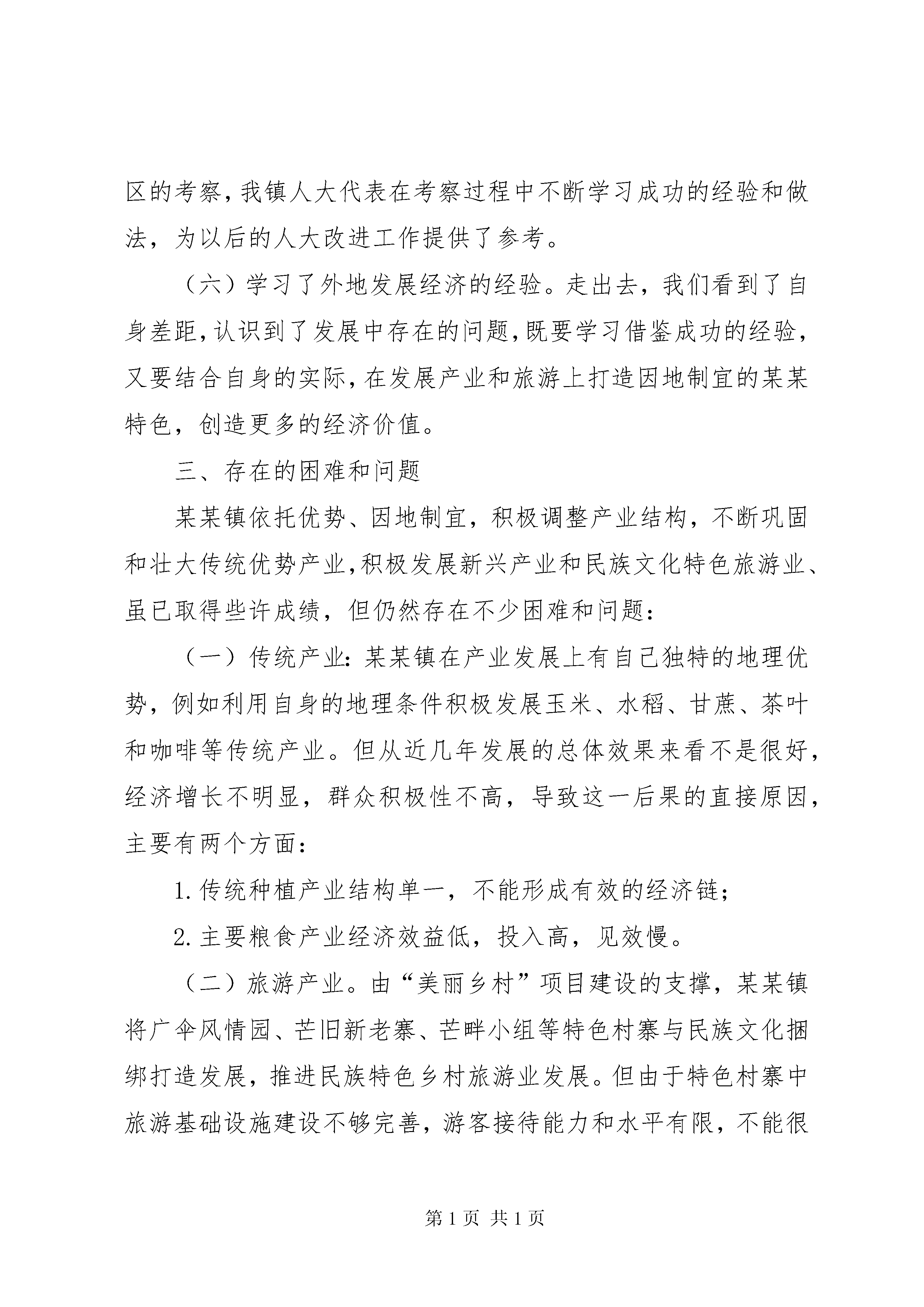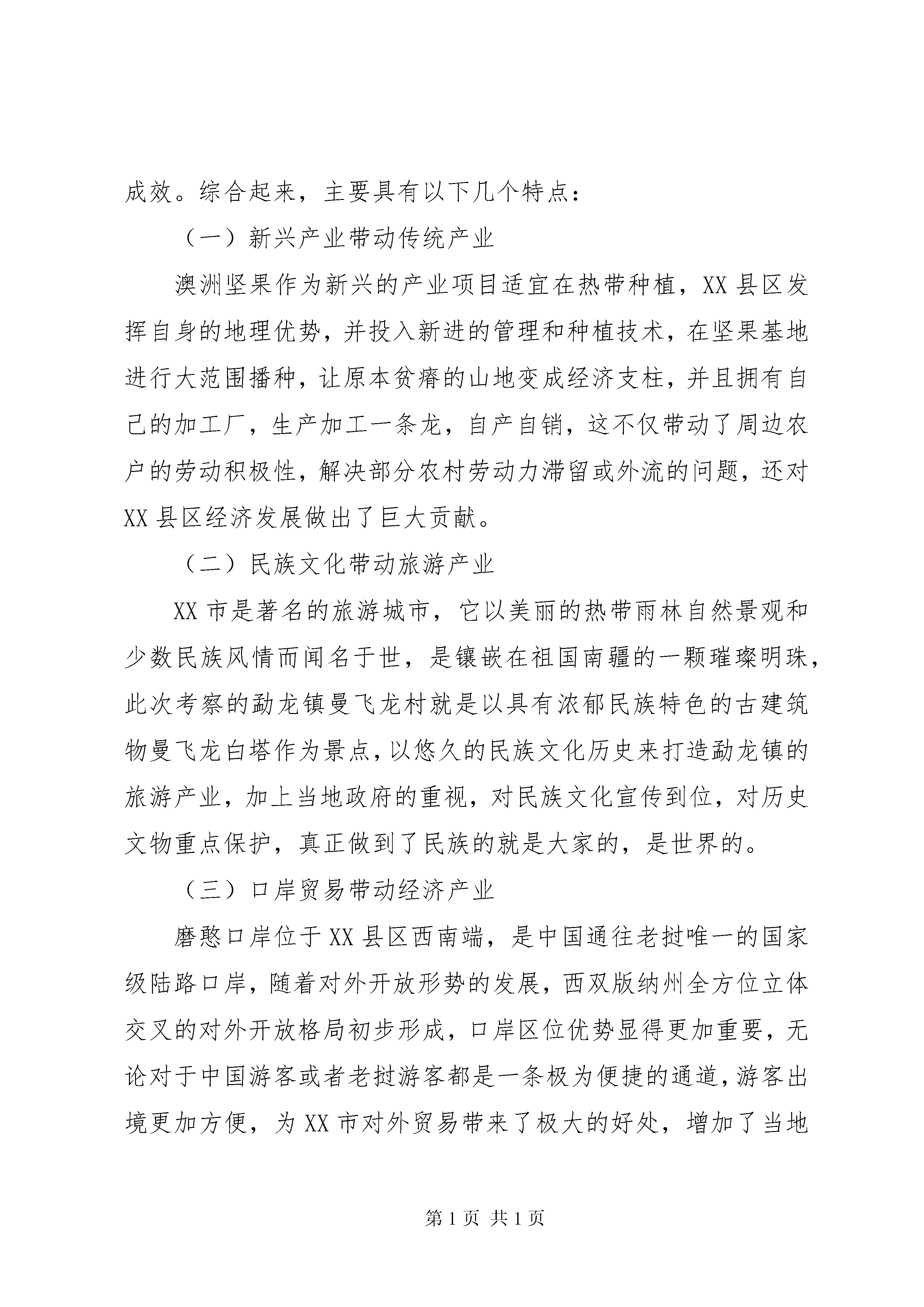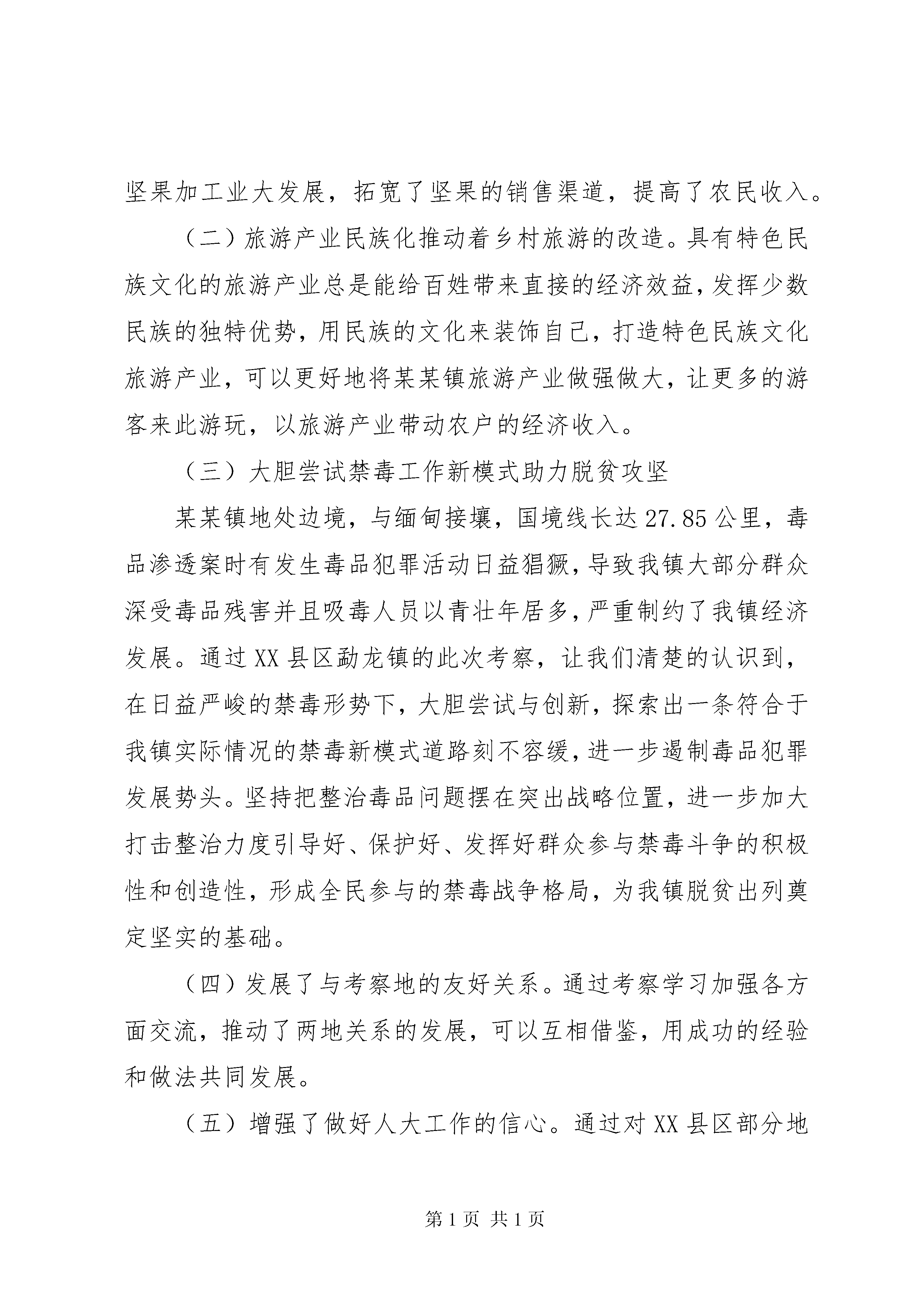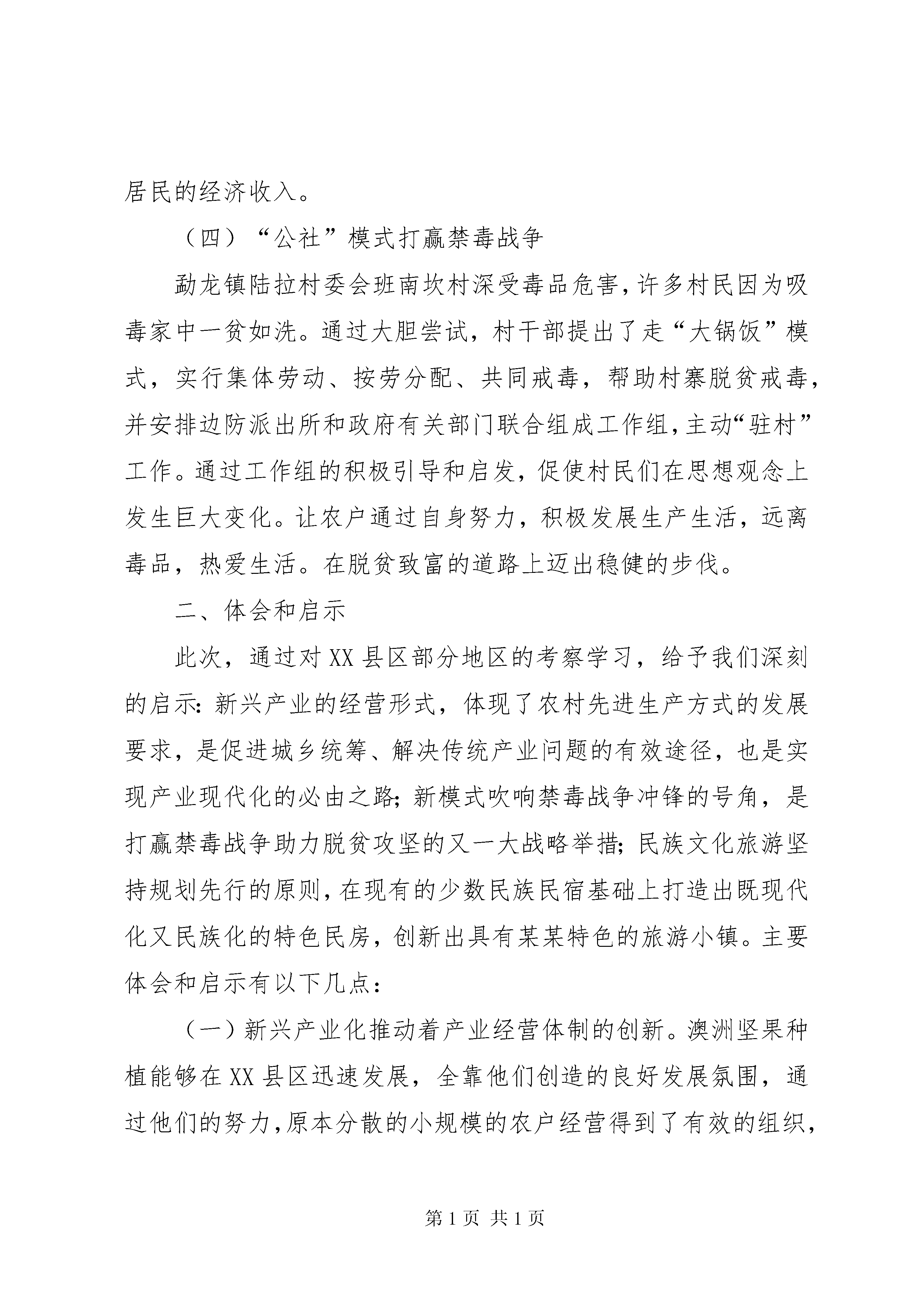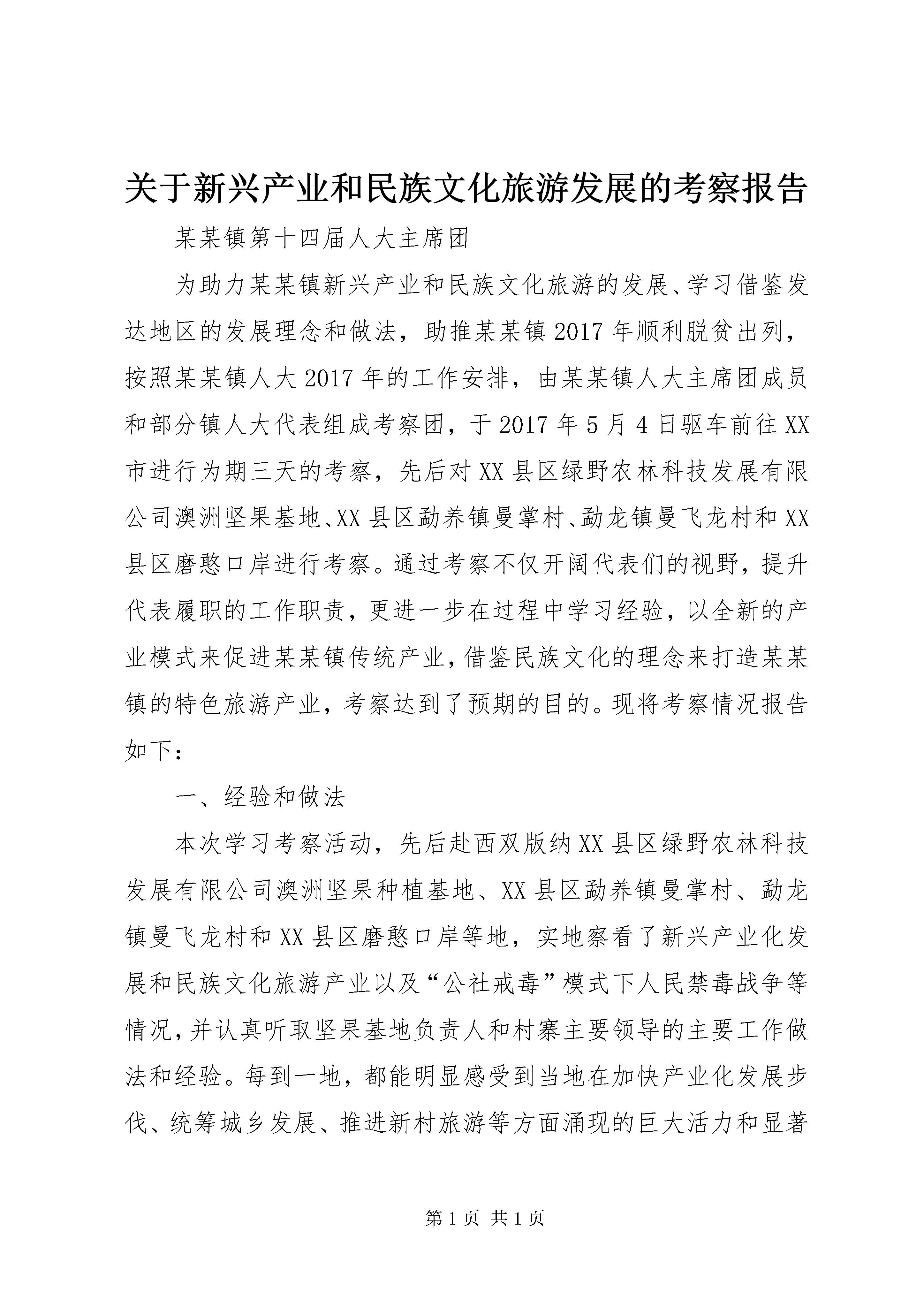 关于新兴产业和民族文化旅游发展的考察报告某某镇第十四届人大主席团为助力某某镇新兴产业和民族文化旅游的发展、学习借鉴发达地区的发展理念和做法,助推某某镇2017年顺利脱贫出列,按照某某镇人大2017年的工作安排,由某某镇人大主席团成员和部分镇人大代表组成考察团,于2017年5月4日驱车前往XX市进行为期三天的考察,先后对XX县区绿野农林科技发展有限公司澳洲坚果基地、XX县区勐养镇曼掌村、勐龙镇曼飞龙村和XX县区磨憨口岸进行考察。通过考察不仅开阔代表们的视野,提升代表履职的工作职责,更进一步在过程中学习经验,以全新的产业模式来促进某某镇传统产业,借鉴民族文化的理念来打造某某镇的特色旅游产业,考察达到了预期的目的。现将考察情况报告如下:一、经验和做法本次学习考察活动,先后赴西双版纳XX县区绿野农林科技发展有限公司澳洲坚果种植基地、XX县区勐养镇曼掌村、勐龙镇曼飞龙村和XX县区磨憨口岸等地,实地察看了新兴产业化发展和民族文化旅游产业以及“公社戒毒”模式下人民禁毒战争等情况,并认真听取坚果基地负责人和村寨主要领导的主要工作做法和经验。每到一地,都能明显感受到当地在加快产业化发展步伐、统筹城乡发展、推进新村旅游等方面涌现的巨大活力和显著成效。综合起来,主要具有以下几个特点:(一)新兴产业带动传统产业澳洲坚果作为新兴的产业项目适宜在热带种植,XX县区发挥自身的地理优势,并投入新进的管理和种植技术,在坚果基地进行大范围播种,让原本贫瘠的山地变成经济支柱,并且拥有自己的加工厂,生产加工一条龙,自产自销,这不仅带动了周边农户的劳动积极性,解决部分农村劳动力滞留或外流的问题,还对XX县区经济发展做出了巨大贡献。(二)民族文化带动旅游产业XX市是著名的旅游城市,它以美丽的热带雨林自然景观和少数民族风情而闻名于世,是镶嵌在祖国南疆的一颗璀璨明珠,此次考察的勐龙镇曼飞龙村就是以具有浓郁民族特色的古建筑物曼飞龙白塔作为景点,以悠久的民族文化历史来打造勐龙镇的旅游产业,加上当地政府的重视,对民族文化宣传到位,对历史文物重点保护,真正做到了民族的就是大家的,是世界的。(三)口岸贸易带动经济产业磨憨口岸位于XX县区西南端,是中国通往老挝唯一的国家级陆路口岸,随着对外开放形势的发展,西双版纳州全方位立体交叉的对外开放格局初步形成,口岸区位优势显得更加重要,无论对于中国游客或者老挝游客都是一条极为便捷的通道,游客出境更加方便,为XX市对外贸易带来了极大的好处,增加了当地居民的经济收入。(四)“公社”模式打赢禁毒战争勐龙镇陆拉村委会班南坎村深受毒品危害,许多村民因为吸毒家中一贫如洗。通过大胆尝试,村干部提出了走“大锅饭”模式,实行集体劳动、按劳分配、共同戒毒,帮助村寨脱贫戒毒,并安排边防派出所和政府有关部门联合组成工作组,主动“驻村”工作。通过工作组的积极引导和启发,促使村民们在思想观念上发生巨大变化。让农户通过自身努力,积极发展生产生活,远离毒品,热爱生活。在脱贫致富的道路上迈出稳健的步伐。二、体会和启示此次,通过对XX县区部分地区的考察学习,给予我们深刻的启示:新兴产业的经营形式,体现了农村先进生产方式的发展要求,是促进城乡统筹、解决传统产业问题的有效途径,也是实现产业现代化的必由之路;新模式吹响禁毒战争冲锋的号角,是打赢禁毒战争助力脱贫攻坚的又一大战略举措;民族文化旅游坚持规划先行的原则,在现有的少数民族民宿基础上打造出既现代化又民族化的特色民房,创新出具有某某特色的旅游小镇。主要体会和启示有以下几点:(一)新兴产业化推动着产业经营体制的创新。澳洲坚果种植能够在XX县区迅速发展,全靠他们创造的良好发展氛围,通过他们的努力,原本分散的小规模的农户经营得到了有效的组织,坚果加工业大发展,拓宽了坚果的销售渠道,提高了农民收入。(二)旅游产业民族化推动着乡村旅游的改造。具有特色民族文化的旅游产业总是能给百姓带来直接的经济效益,发挥少数民族的独特优势,用民族的文化来装饰自己,打造特色民族文化旅游产业,可以更好地将某某镇旅游产业做强做大,让更多的游客来此游玩,以旅游产业带动农户的经济收入。(三)大胆尝试禁毒工作新模式助力脱贫攻坚某某镇地处边境,与缅甸接壤,国境线长达27.85公里,毒品渗透案时有发生毒品犯罪活动日益猖獗,导致我镇大部分群众深受毒品残害并且吸毒人员以青壮年居多,严重制约了我镇经济发展。通过XX县区勐龙镇的此次考察,让我们清楚的认识到,在日益严峻的禁毒形势下,大胆尝试与创新,探索出一条符合于我镇实际情况的禁毒新模式道路刻不容缓,进一步遏制毒品犯罪发展势头。坚持把整治毒品问题摆在突出战略位置,进一步加大打击整治力度引导好、保护好、发挥好群众参与禁毒斗争的积极性和创造性,形成全民参与的禁毒战争格局,为我镇脱贫出列奠定坚实的基础。(四)发展了