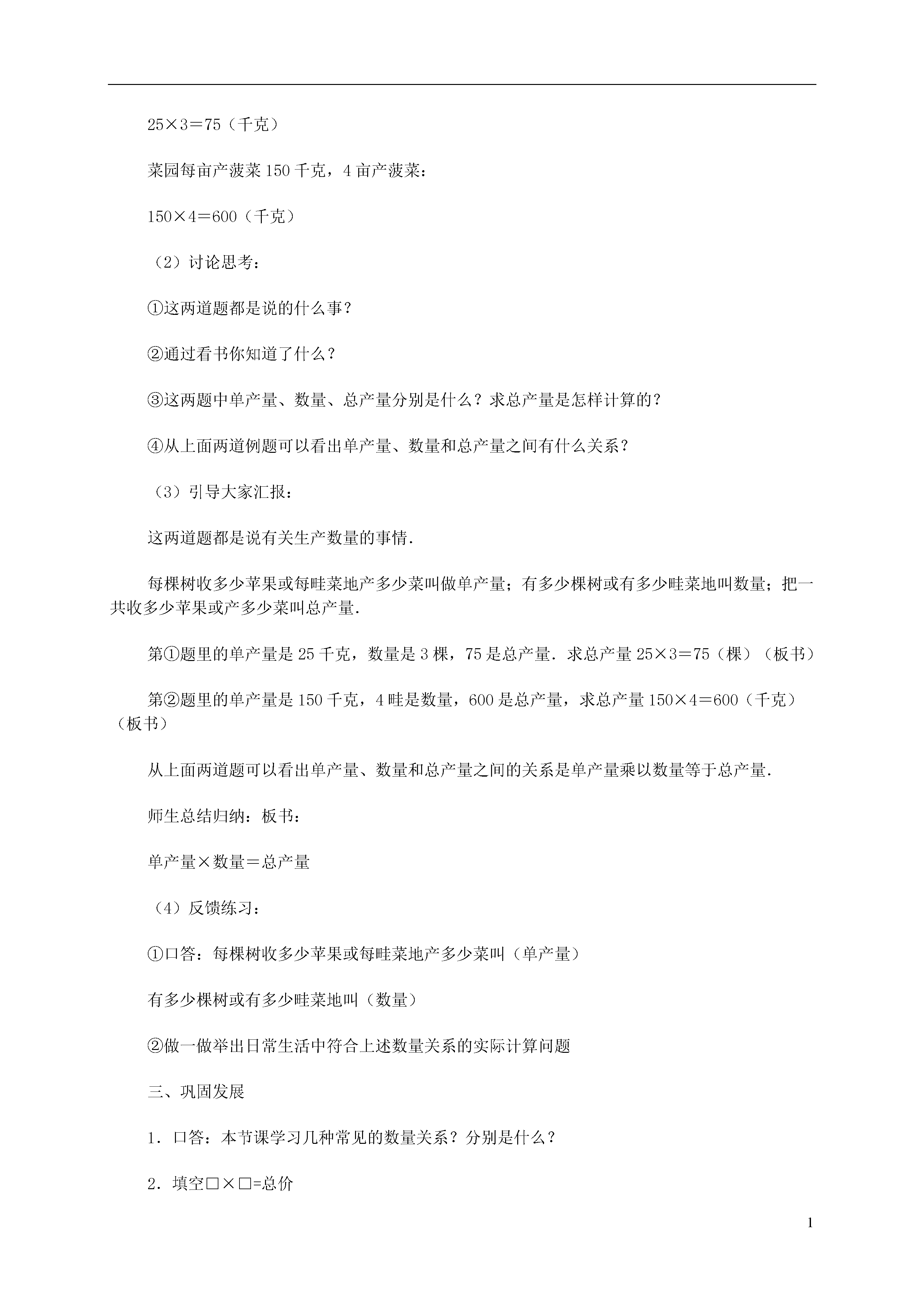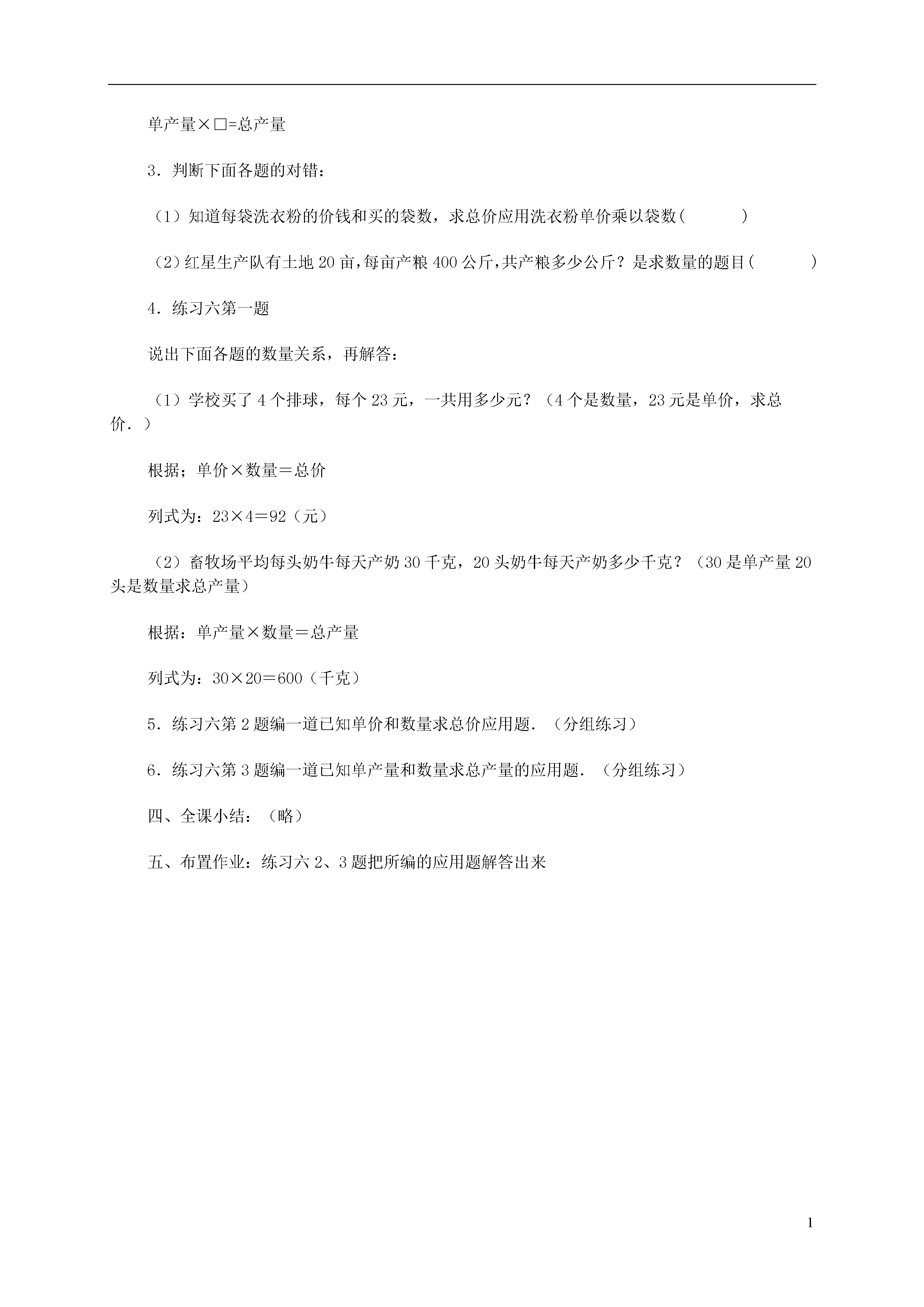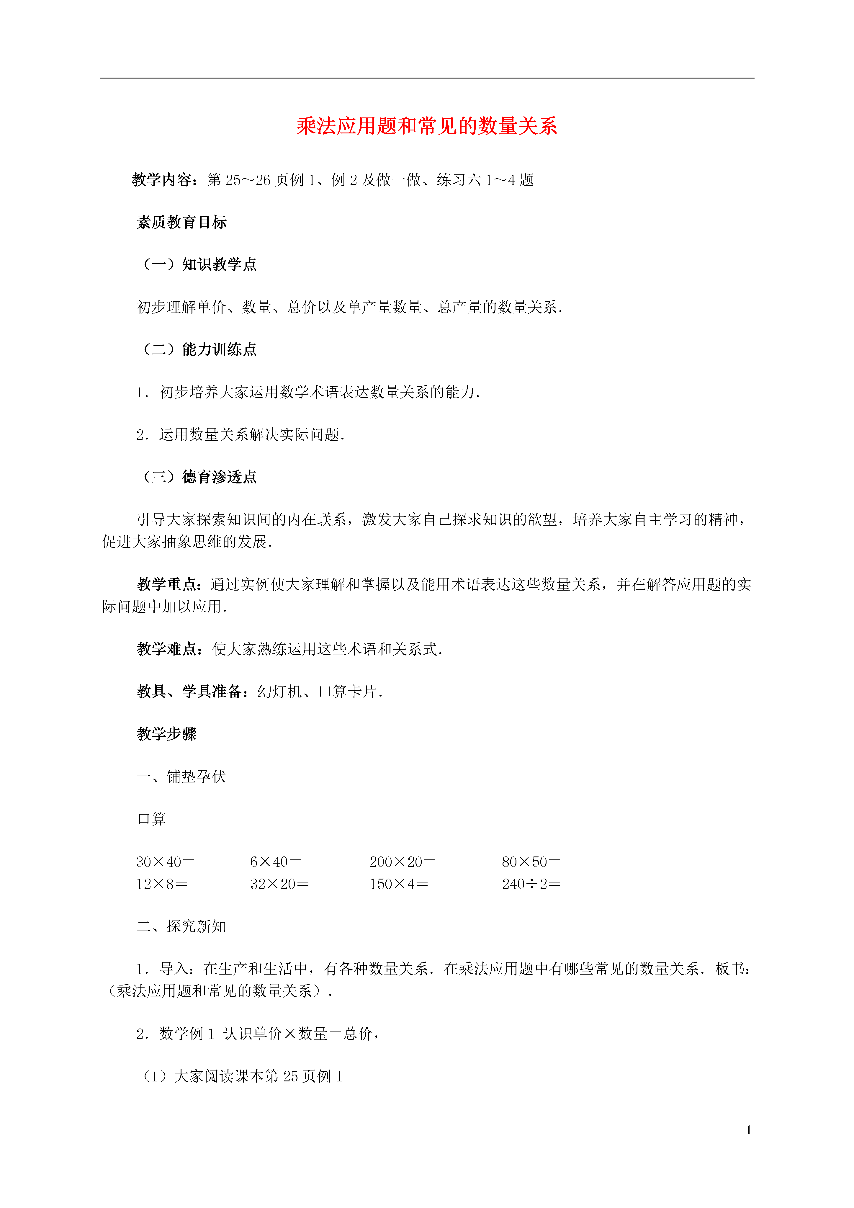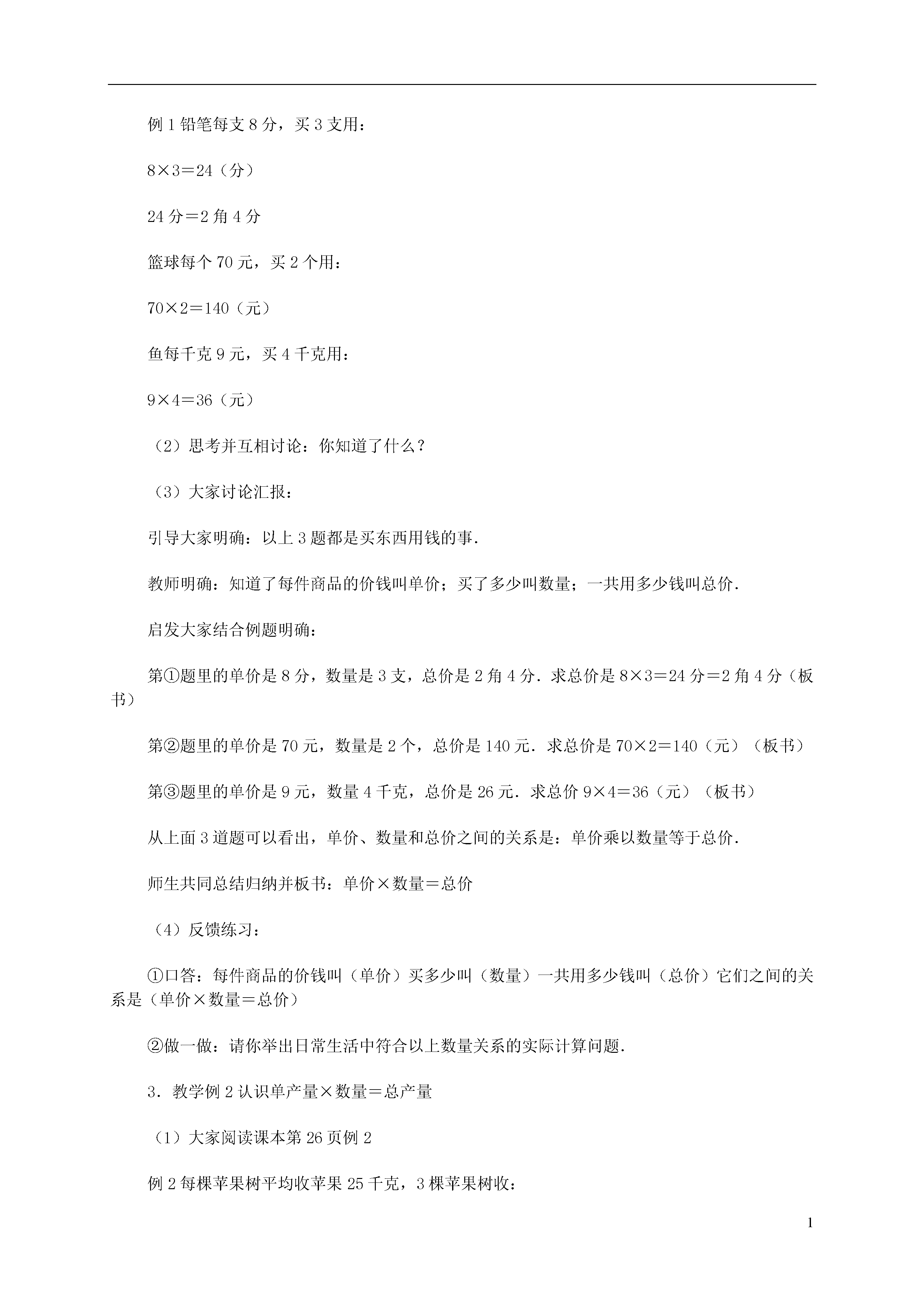 1乘法应用题和常见的数量关系教学内容:第25~26页例1、例2及做一做、练习六1~4题素质教育目标(一)知识教学点初步理解单价、数量、总价以及单产量数量、总产量的数量关系.(二)能力训练点1.初步培养大家运用数学术语表达数量关系的能力.2.运用数量关系解决实际问题.(三)德育渗透点引导大家探索知识间的内在联系,激发大家自己探求知识的欲望,培养大家自主学习的精神,促进大家抽象思维的发展.教学重点:通过实例使大家理解和掌握以及能用术语表达这些数量关系,并在解答应用题的实际问题中加以应用.教学难点:使大家熟练运用这些术语和关系式.教具、学具准备:幻灯机、口算卡片.教学步骤一、铺垫孕伏口算30×40=6×40=200×20=80×50=12×8=32×20=150×4=240÷2=二、探究新知1.导入:在生产和生活中,有各种数量关系.在乘法应用题中有哪些常见的数量关系.板书:(乘法应用题和常见的数量关系).2.数学例1认识单价×数量=总价,(1)大家阅读课本例1例1铅笔每支8分,买3支用:8×3=24(分)24分=2角4分篮球每个70元,买2个用:70×2=140(元)鱼每千克9元,买4千克用:9×4=36(元)(2)思考并互相讨论:你知道了什么?(3)大家讨论汇报:引导大家明确:以上3题都是买东西用钱的事.教师明确:知道了每件商品的价钱叫单价;买了多少叫数量;一共用多少钱叫总价.启发大家结合例题明确:第①题里的单价是8分,数量是3支,总价是2角4分.求总价是8×3=24分=2角4分(板书)第②题里的单价是70元,数量是2个,总价是140元.求总价是70×2=140(元)(板书)第③题里的单价是9元,数量4千克,总价是26元.求总价9×4=36(元)(板书)从上面3道题可以看出,单价、数量和总价之间的关系是:单价乘以数量等于总价.师生共同总结归纳并板书:单价×数量=总价(4)反馈练习:①口答:每件商品的价钱叫(单价)买多少叫(数量)一共用多少钱叫(总价)它们之间的关系是(单价×数量=总价)②做一做:请你举出日常生活中符合以上数量关系的实际计算问题.3.教学例2认识单产量×数量=总产量(1)大家阅读课本例2例2每棵苹果树平均收苹果25千克,3棵苹果树收:25×3=75(千克)菜园每亩产菠菜150千克,4亩产菠菜:150×4=600(千克)(2)讨论思考:①这两道题都是说的什么事?②通过看书你知道了什么?③这两题中单产量、数量、总产量分别是什么?求总产量是怎样计算的?④从上面两道例题可以看出单产量、数量和总产量之间有什么关系?(3)引导大家汇报:这两道题都是说有关生产数量的事情.每棵树收多少苹果或每畦菜地产多少菜叫做单产量;有多少棵树或有多少畦菜地叫数量;把一共收多少苹果或产多少菜叫总产量.第①题里的单产量是25千克,数量是3棵,75是总产量.求总产量25×3=75(棵)(板书)第②题里的单产量是150千克,4畦是数量,600是总产量,求总产量150×4=600(千克)(板书)从上面两道题可以看出单产量、数量和总产量之间的关系是单产量乘以数量等于总产量.师生总结归纳:板书:单产量×数量=总产量(4)反馈练习:①口答:每棵树收多少苹果或每畦菜地产多少菜叫(单产量)有多少棵树或有多少畦菜地叫(数量)②做一做举出日常生活中符合上述数量关系的实际计算问题三、巩固发展1.口答:本节课学习几种常见的数量关系?分别是什么?2.填空□×□=总价单产量×□=总产量3.判断下面各题的对错:(1)知道每袋洗衣粉的价钱和买的袋数,求总价应用洗衣粉单价乘以袋数()(2)红星生产队有土地20亩,每亩产粮400公斤,共产粮多少公斤?是求数量的题目()4.练习六第一题说出下面各题的数量关系,再解答:(1)学校买了4个排球,每个23元,一共用多少元?(4个是数量,23元是单价,求总价.)根据;单价×数量=总价列式为:23×4=92(元)(2)畜牧场平均每头奶牛每天产奶30千克,20头奶牛每天产奶多少千克?(30是单产量20头是数量求总产量)根据:单产量×数量=总产量列式为:30×20=600(千克)5.练习六第2题编一道已知单价和数量求总价应用题.(分组练习)6.练习六第3题编一道已知单产量和数量求总产量的应用题.(分组练习)四、全课小结:(略)五、布置作业:练习六2、3题把所编的应用题解答出来