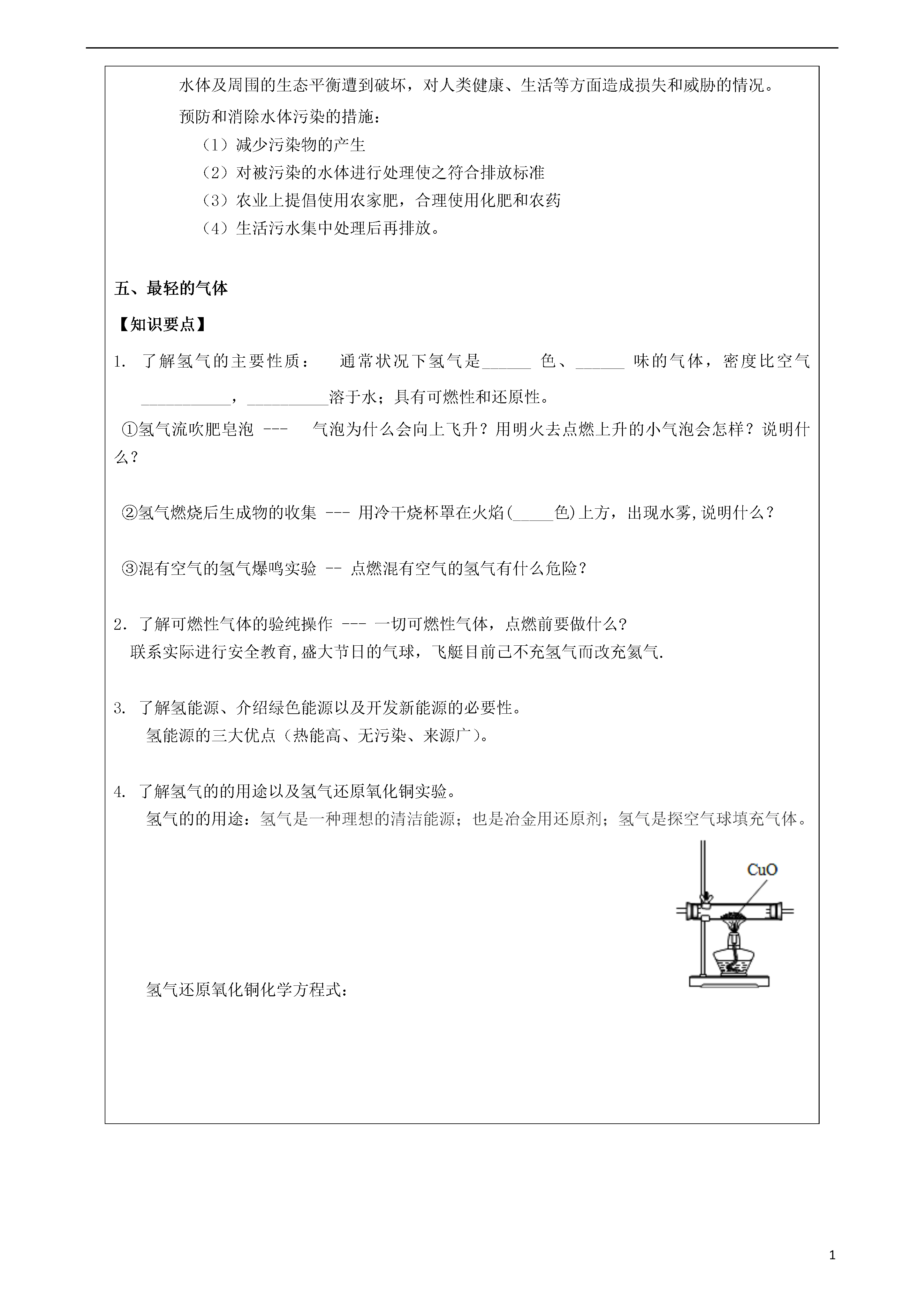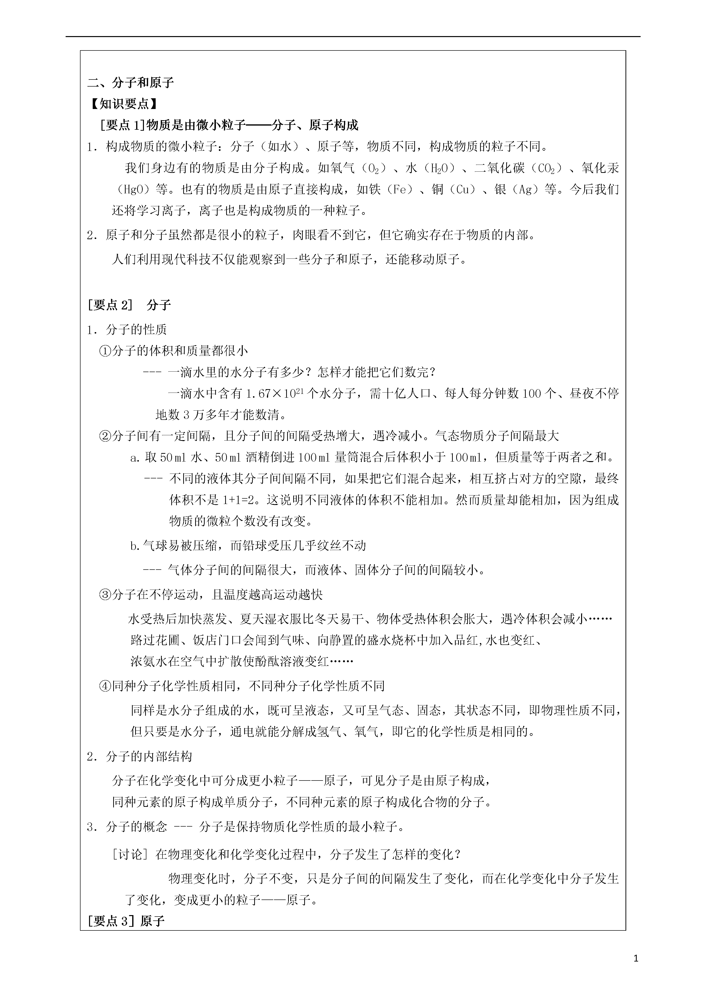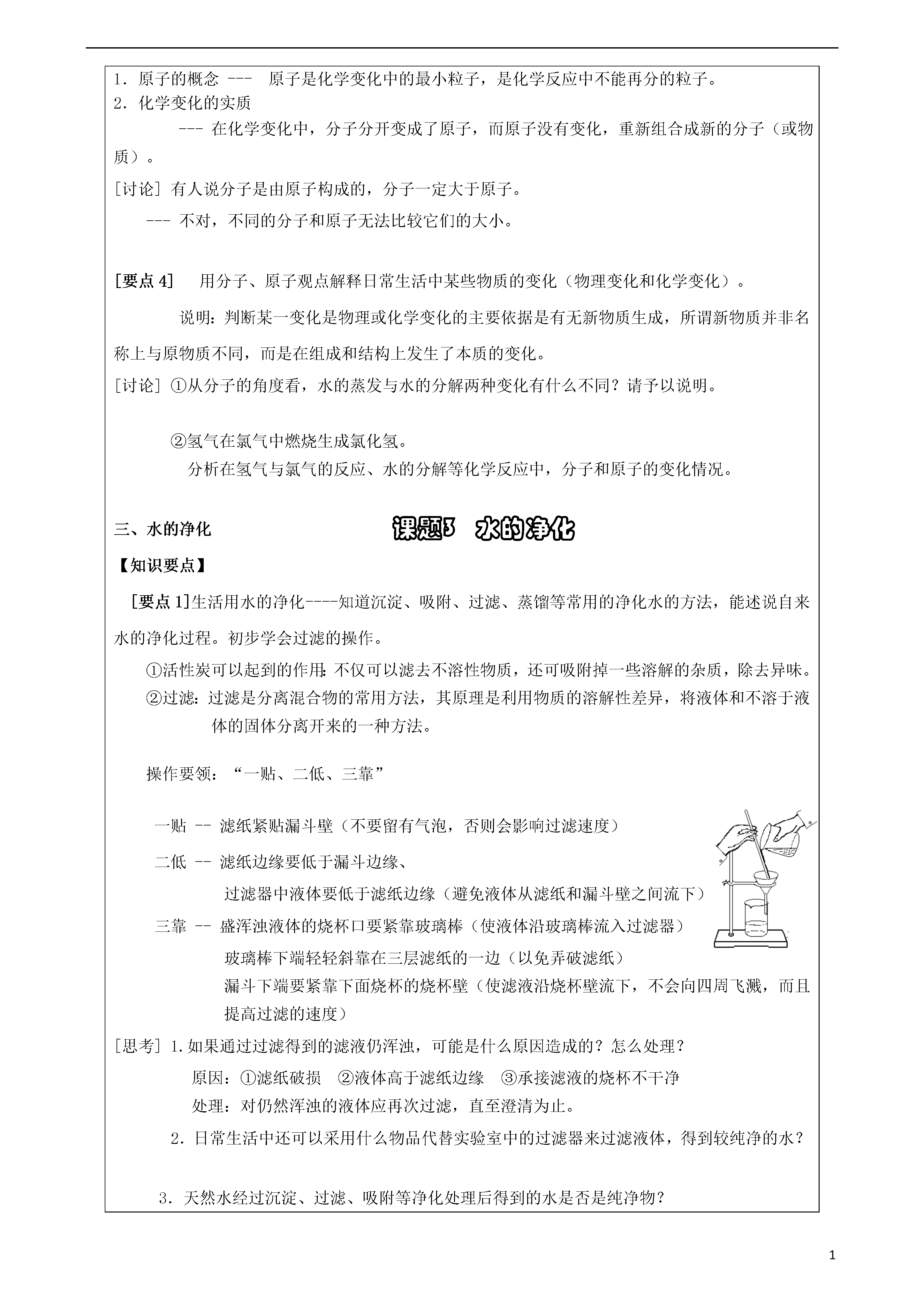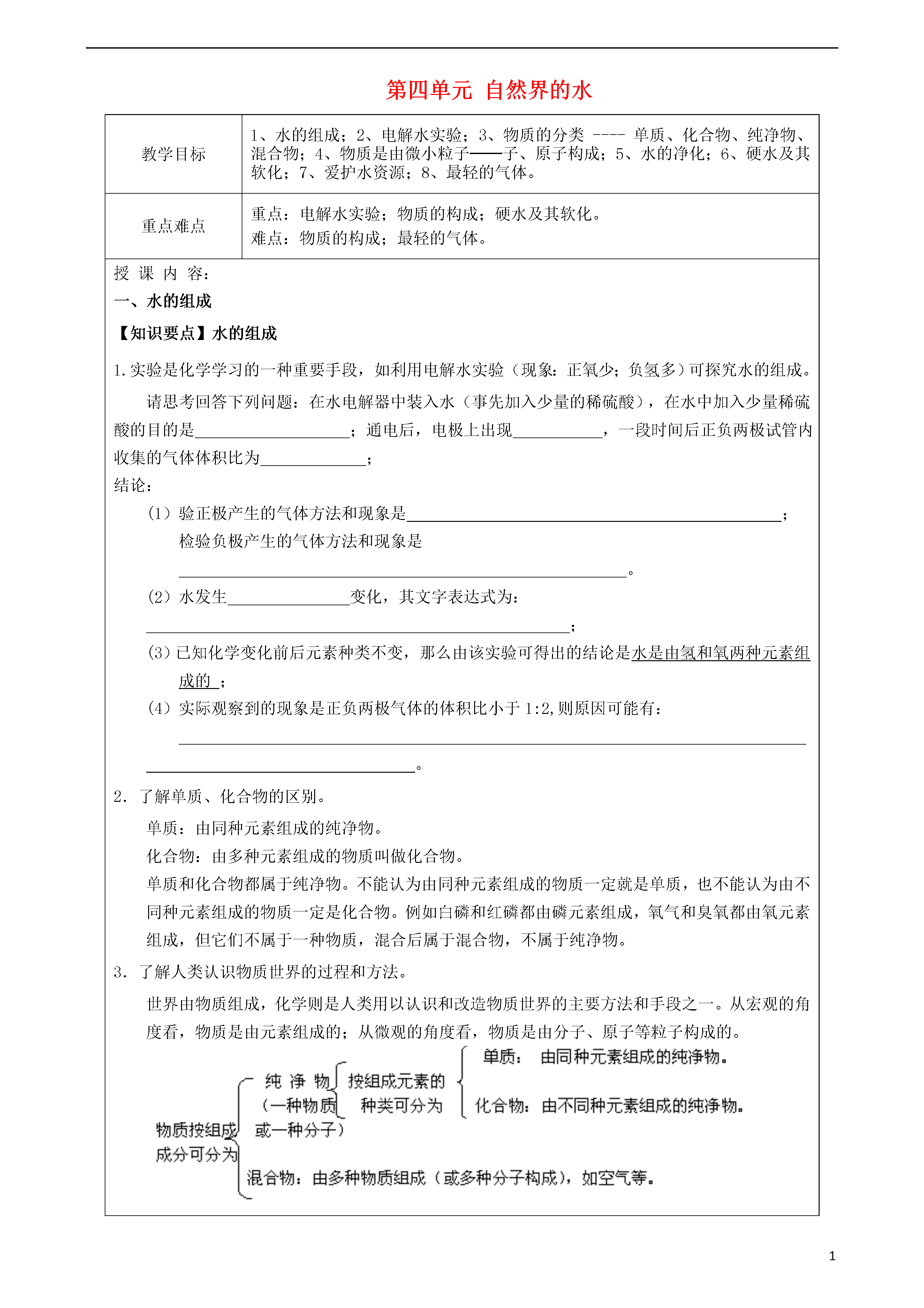 131第四单元自然界的水教学目标1、水的组成;2、电解水实验;3、物质的分类----单质、化合物、纯净物、混合物;4、物质是由微小粒子──子、原子构成;5、水的净化;6、硬水及其软化;7、爱护水资源;8、最轻的气体。重点难点重点:电解水实验;物质的构成;硬水及其软化。难点:物质的构成;最轻的气体。授课内容:一、水的组成【知识要点】水的组成1.实验是化学学习的一种重要手段,如利用电解水实验(现象:正氧少;负氢多)可探究水的组成。请思考回答下列问题:在水电解器中装入水(事先加入少量的稀硫酸),在水中加入少量稀硫酸的目的是;通电后,电极上出现,一段时间后正负两极试管内收集的气体体积比为;结论:(1)验正极产生的气体方法和现象是;检验负极产生的气体方法和现象是。(2)水发生变化,其文字表达式为:;(3)已知化学变化前后元素种类不变,那么由该实验可得出的结论是水是由氢和氧两种元素组成的;(4)实际观察到的现象是正负两极气体的体积比小于1:2,则原因可能有:。2.了解单质、化合物的区别。单质:由同种元素组成的纯净物。化合物:由多种元素组成的物质叫做化合物。单质和化合物都属于纯净物。不能认为由同种元素组成的物质一定就是单质,也不能认为由不同种元素组成的物质一定是化合物。例如白磷和红磷都由磷元素组成,氧气和臭氧都由氧元素组成,但它们不属于一种物质,混合后属于混合物,不属于纯净物。3.了解人类认识物质世界的过程和方法。世界由物质组成,化学则是人类用以认识和改造物质世界的主要方法和手段之一。从宏观的角度看,物质是由元素组成的;从微观的角度看,物质是由分子、原子等粒子构成的。二、分子和原子【知识要点】[要点1]物质是由微小粒子──分子、原子构成1.构成物质的微小粒子:分子(如水)、原子等,物质不同,构成物质的粒子不同。我们身边有的物质是由分子构成。如氧气(O2)、水(H2O)、二氧化碳(CO2)、氧化汞(HgO)等。也有的物质是由原子直接构成,如铁(Fe)、铜(Cu)、银(Ag)等。今后我们还将学习离子,离子也是构成物质的一种粒子。2.原子和分子虽然都是很小的粒子,肉眼看不到它,但它确实存在于物质的内部。人们利用现代科技不仅能观察到一些分子和原子,还能移动原子。[要点2]分子1.分子的性质①分子的体积和质量都很小---一滴水里的水分子有多少?怎样才能把它们数完?一滴水中含有1.67×1021个水分子,需十亿人口、每人每分钟数100个、昼夜不停地数3万多年才能数清。②分子间有一定间隔,且分子间的间隔受热增大,遇冷减小。气态物质分子间隔最大a.取50ml水、50ml酒精倒进100ml量筒混合后体积小于100ml,但质量等于两者之和。---不同的液体其分子间间隔不同,如果把它们混合起来,相互挤占对方的空隙,最终体积不是1+1=2。这说明不同液体的体积不能相加。然而质量却能相加,因为组成物质的微粒个数没有改变。b.气球易被压缩,而铅球受压几乎纹丝不动---气体分子间的间隔很大,而液体、固体分子间的间隔较小。③分子在不停运动,且温度越高运动越快水受热后加快蒸发、夏天湿衣服比冬天易干、物体受热体积会胀大,遇冷体积会减小……路过花圃、饭店门口会闻到气味、向静置的盛水烧杯中加入品红,水也变红、浓氨水在空气中扩散使酚酞溶液变红……④同种分子化学性质相同,不同种分子化学性质不同同样是水分子组成的水,既可呈液态,又可呈气态、固态,其状态不同,即物理性质不同,但只要是水分子,通电就能分解成氢气、氧气,即它的化学性质是相同的。2.分子的内部结构分子在化学变化中可分成更小粒子——原子,可见分子是由原子构成,同种元素的原子构成单质分子,不同种元素的原子构成化合物的分子。3.分子的概念---分子是保持物质化学性质的最小粒子。[讨论]在物理变化和化学变化过程中,分子发生了怎样的变化?物理变化时,分子不变,只是分子间的间隔发生了变化,而在化学变化中分子发生了变化,变成更小的粒子——原子。[要点3]原子1.原子的概念---原子是化学变化中的最小粒子,是化学反应中不能再分的粒子。2.化学变化的实质---在化学变化中,分子分开变成了原子,而原子没有变化,重新组合成新的分子(或物质)。[讨论]有人说分子是由原子构成的,分子一定大于原子。---不对,不同的分子和原子无法比较它们的大小。[要点4]用分子、原子观点解释日常生活中某些物质的变化(物理变化和化学变化)。说明:判断某一