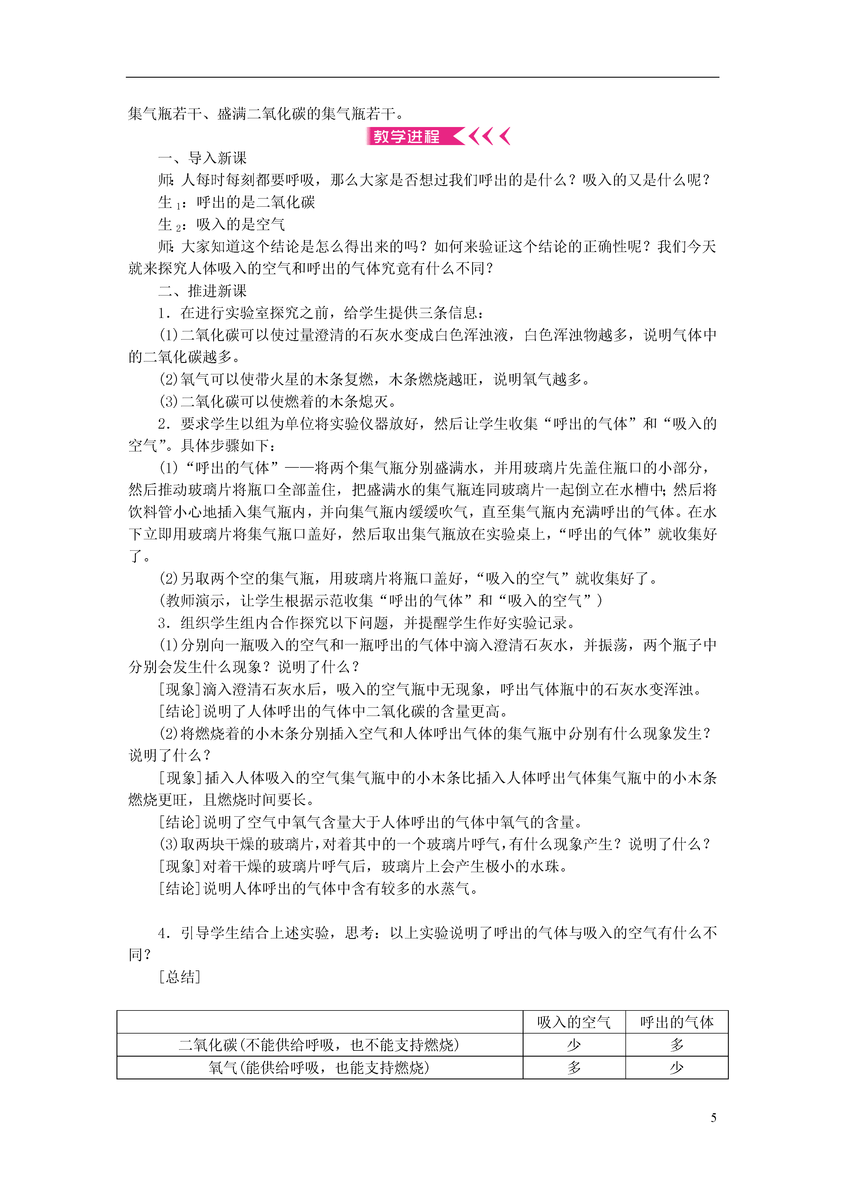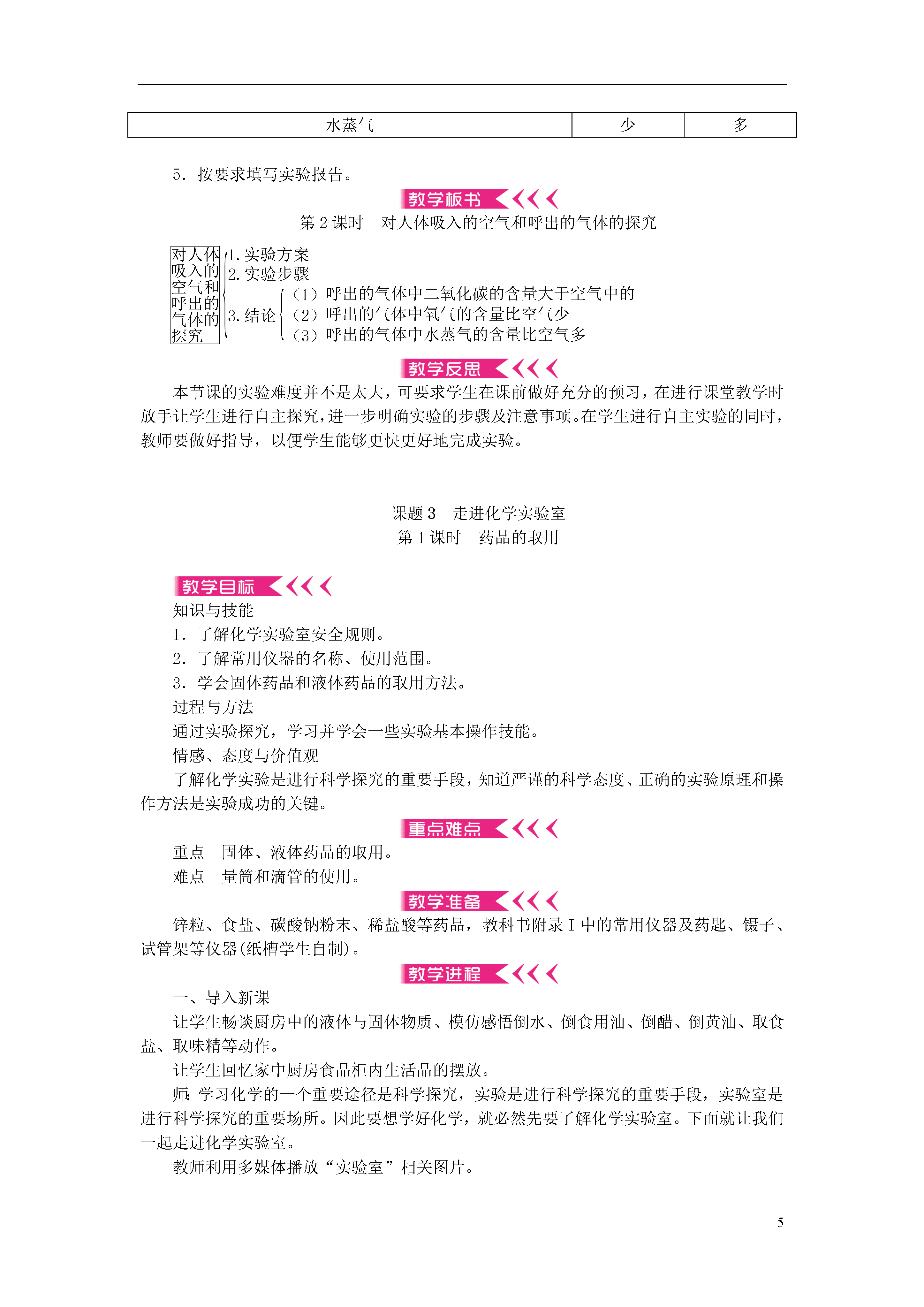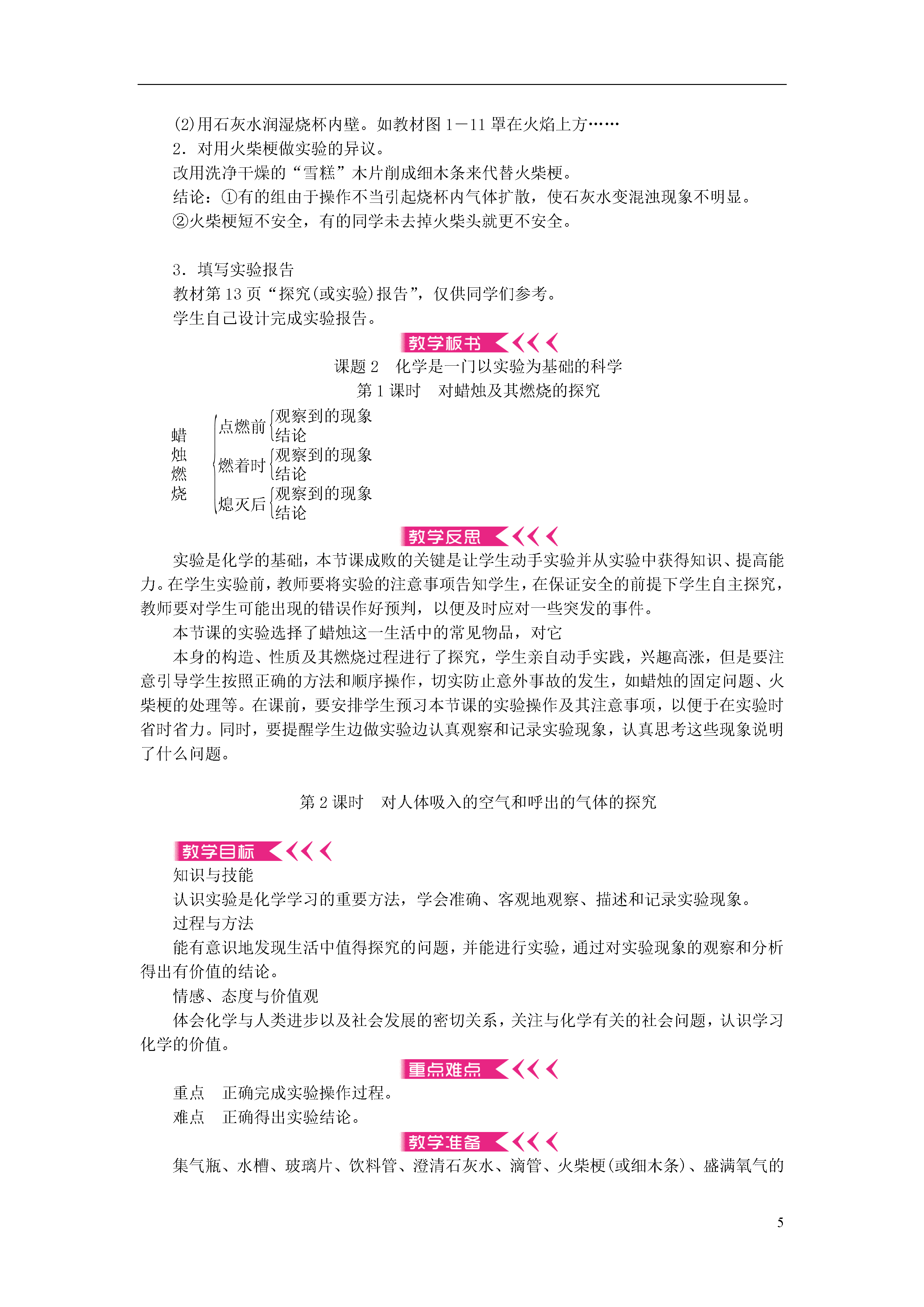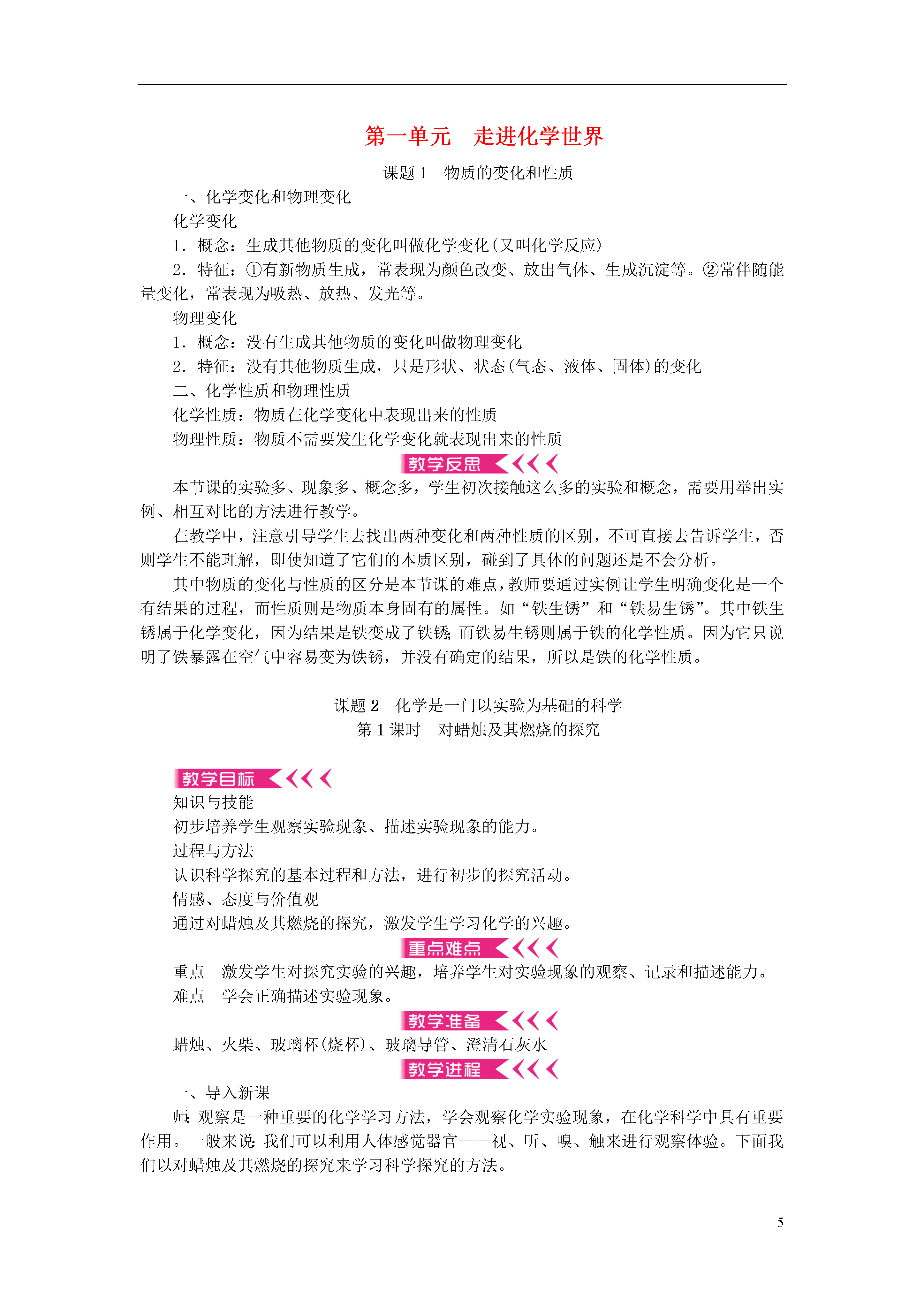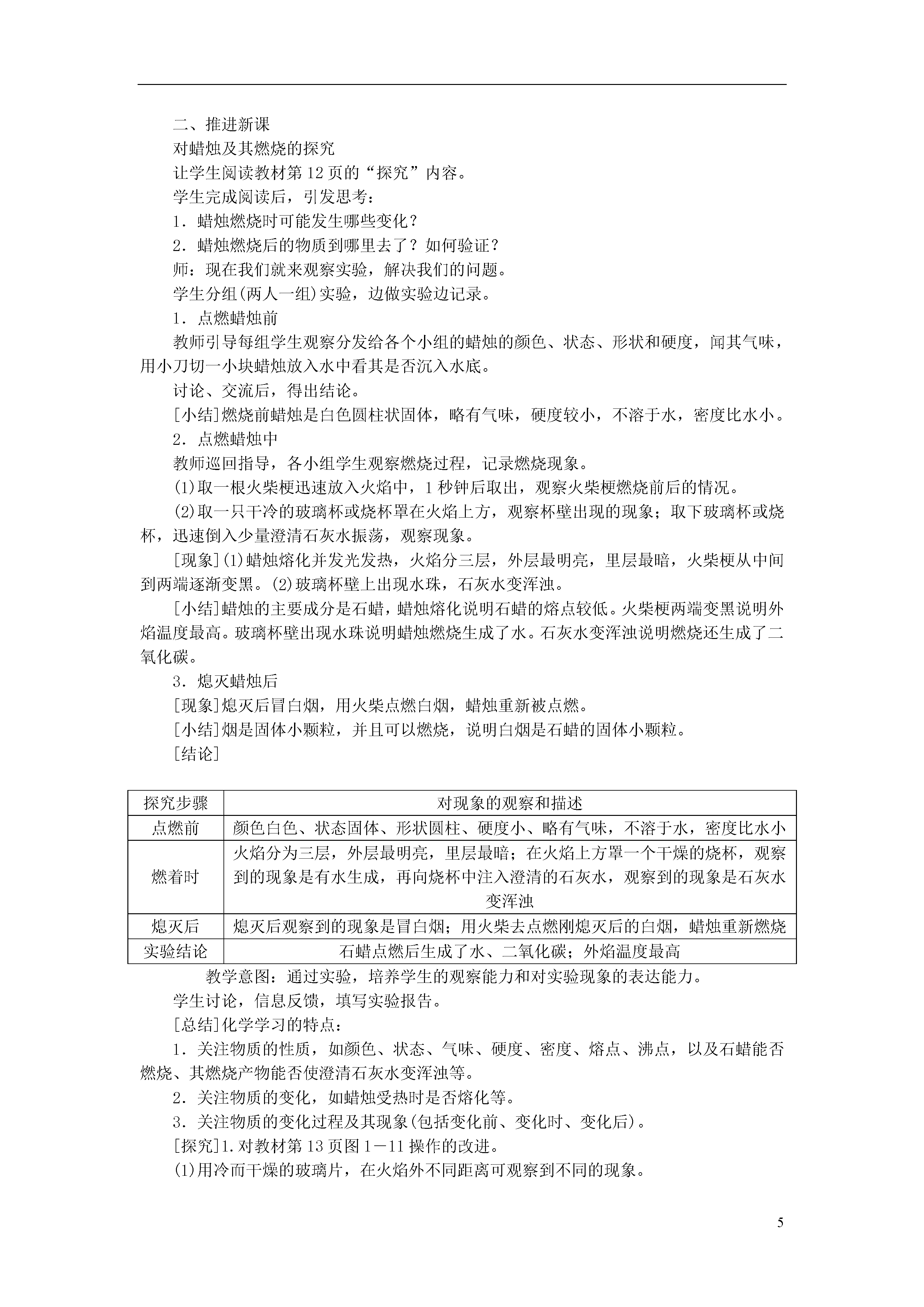 5第一单元走进化学世界课题1物质的变化和性质一、化学变化和物理变化化学变化1.概念:生成其他物质的变化叫做化学变化(又叫化学反应)2.特征:①有新物质生成,常表现为颜色改变、放出气体、生成沉淀等。②常伴随能量变化,常表现为吸热、放热、发光等。物理变化1.概念:没有生成其他物质的变化叫做物理变化2.特征:没有其他物质生成,只是形状、状态(气态、液体、固体)的变化二、化学性质和物理性质化学性质:物质在化学变化中表现出来的性质物理性质:物质不需要发生化学变化就表现出来的性质本节课的实验多、现象多、概念多,学生初次接触这么多的实验和概念,需要用举出实例、相互对比的方法进行教学。在教学中,注意引导学生去找出两种变化和两种性质的区别,不可直接去告诉学生,否则学生不能理解,即使知道了它们的本质区别,碰到了具体的问题还是不会分析。其中物质的变化与性质的区分是本节课的难点,教师要通过实例让学生明确变化是一个有结果的过程,而性质则是物质本身固有的属性。如“铁生锈”和“铁易生锈”。其中铁生锈属于化学变化,因为结果是铁变成了铁锈;而铁易生锈则属于铁的化学性质。因为它只说明了铁暴露在空气中容易变为铁锈,并没有确定的结果,所以是铁的化学性质。课题2化学是一门以实验为基础的科学第1课时对蜡烛及其燃烧的探究知识与技能初步培养学生观察实验现象、描述实验现象的能力。过程与方法认识科学探究的基本过程和方法,进行初步的探究活动。情感、态度与价值观通过对蜡烛及其燃烧的探究,激发学生学习化学的兴趣。重点激发学生对探究实验的兴趣,培养学生对实验现象的观察、记录和描述能力。难点学会正确描述实验现象。蜡烛、火柴、玻璃杯(烧杯)、玻璃导管、澄清石灰水一、导入新课师:观察是一种重要的化学学习方法,学会观察化学实验现象,在化学科学中具有重要作用。一般来说:我们可以利用人体感觉器官——视、听、嗅、触来进行观察体验。下面我们以对蜡烛及其燃烧的探究来学习科学探究的方法。二、推进新课对蜡烛及其燃烧的探究让学生阅读教材的“探究”内容。学生完成阅读后,引发思考:1.蜡烛燃烧时可能发生哪些变化?2.蜡烛燃烧后的物质到哪里去了?如何验证?师:现在我们就来观察实验,解决我们的问题。学生分组(两人一组)实验,边做实验边记录。1.点燃蜡烛前教师引导每组学生观察分发给各个小组的蜡烛的颜色、状态、形状和硬度,闻其气味,用小刀切一小块蜡烛放入水中看其是否沉入水底。讨论、交流后,得出结论。[小结]燃烧前蜡烛是白色圆柱状固体,略有气味,硬度较小,不溶于水,密度比水小。2.点燃蜡烛中教师巡回指导,各小组学生观察燃烧过程,记录燃烧现象。(1)取一根火柴梗迅速放入火焰中,1秒钟后取出,观察火柴梗燃烧前后的情况。(2)取一只干冷的玻璃杯或烧杯罩在火焰上方,观察杯壁出现的现象;取下玻璃杯或烧杯,迅速倒入少量澄清石灰水振荡,观察现象。[现象](1)蜡烛熔化并发光发热,火焰分三层,外层最明亮,里层最暗,火柴梗从中间到两端逐渐变黑。(2)玻璃杯壁上出现水珠,石灰水变浑浊。[小结]蜡烛的主要成分是石蜡,蜡烛熔化说明石蜡的熔点较低。火柴梗两端变黑说明外焰温度最高。玻璃杯壁出现水珠说明蜡烛燃烧生成了水。石灰水变浑浊说明燃烧还生成了二氧化碳。3.熄灭蜡烛后[现象]熄灭后冒白烟,用火柴点燃白烟,蜡烛重新被点燃。[小结]烟是固体小颗粒,并且可以燃烧,说明白烟是石蜡的固体小颗粒。[结论]探究步骤对现象的观察和描述点燃前颜色白色、状态固体、形状圆柱、硬度小、略有气味,不溶于水,密度比水小燃着时火焰分为三层,外层最明亮,里层最暗;在火焰上方罩一个干燥的烧杯,观察到的现象是有水生成,再向烧杯中注入澄清的石灰水,观察到的现象是石灰水变浑浊熄灭后熄灭后观察到的现象是冒白烟;用火柴去点燃刚熄灭后的白烟,蜡烛重新燃烧实验结论石蜡点燃后生成了水、二氧化碳;外焰温度最高教学意图:通过实验,培养学生的观察能力和对实验现象的表达能力。学生讨论,信息反馈,填写实验报告。[总结]化学学习的特点:1.关注物质的性质,如颜色、状态、气味、硬度、密度、熔点、沸点,以及石蜡能否燃烧、其燃烧产物能否使澄清石灰水变浑浊等。2.关注物质的变化,如蜡烛受热时是否熔化等。3.关注物质的变化过程及其现象(包括变化前、变化时、变化后)。[探究]1.对教材图1-11操作的改进。(1)用冷而干燥的玻璃片,在火焰外不同距离可观察到不同的现象。(2)用石灰水润湿烧杯内壁。如教材图1-11罩在火焰上方……2.对用火柴梗做实验的异议。改用洗净干燥的“雪糕”木片削成细木条来代替火柴梗。结论:①有的组由于操作不当引起烧杯内气体扩散,使石灰