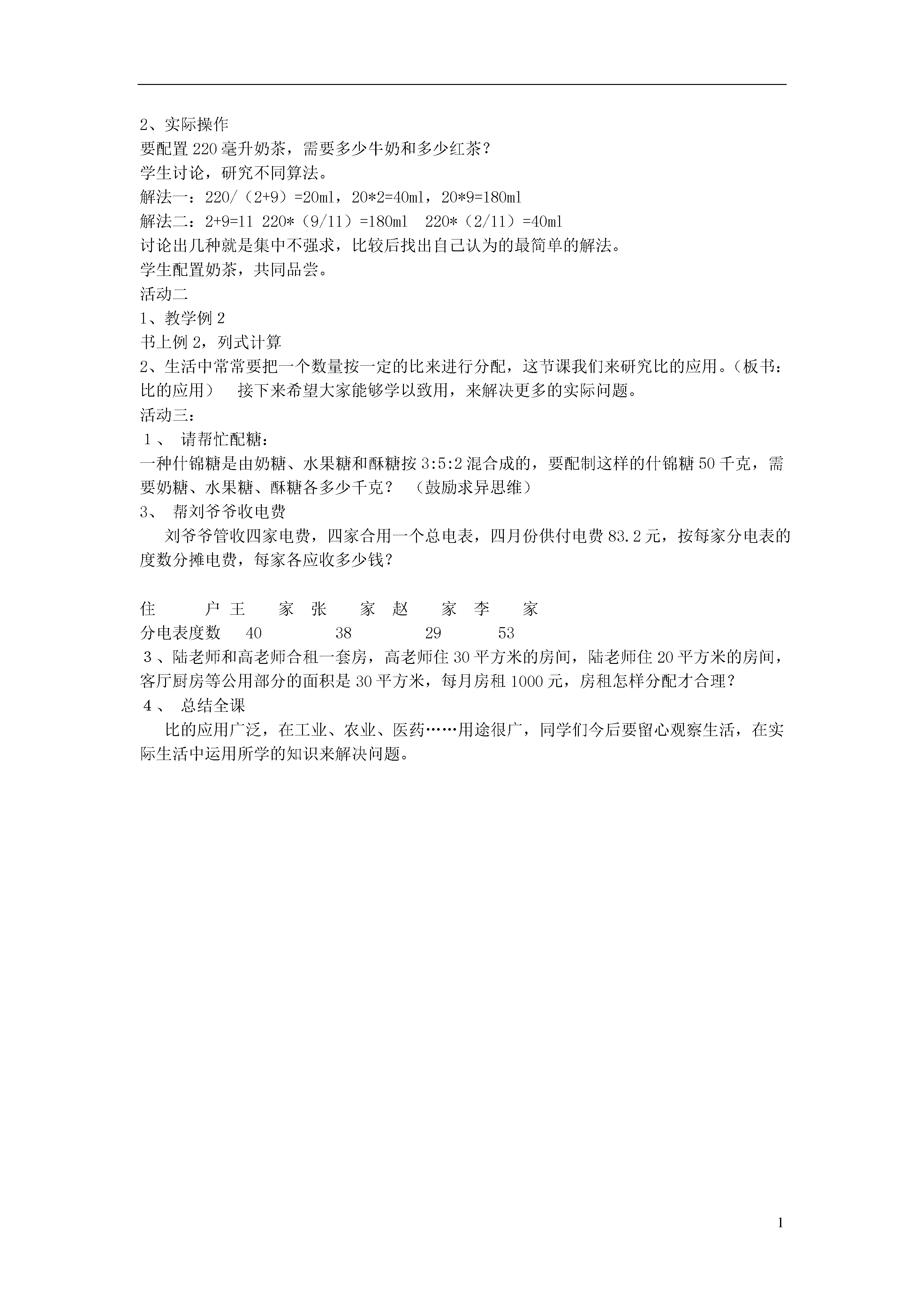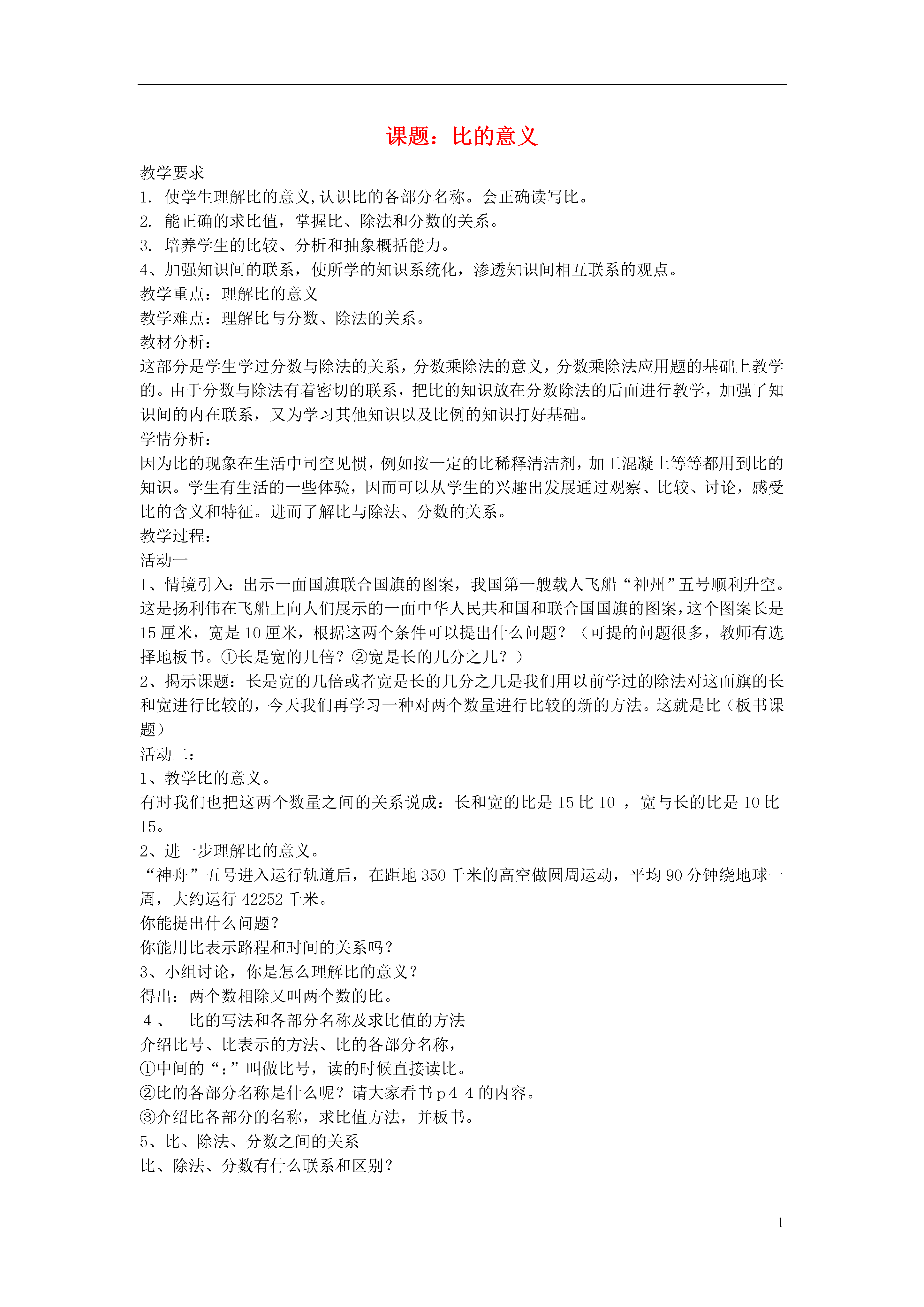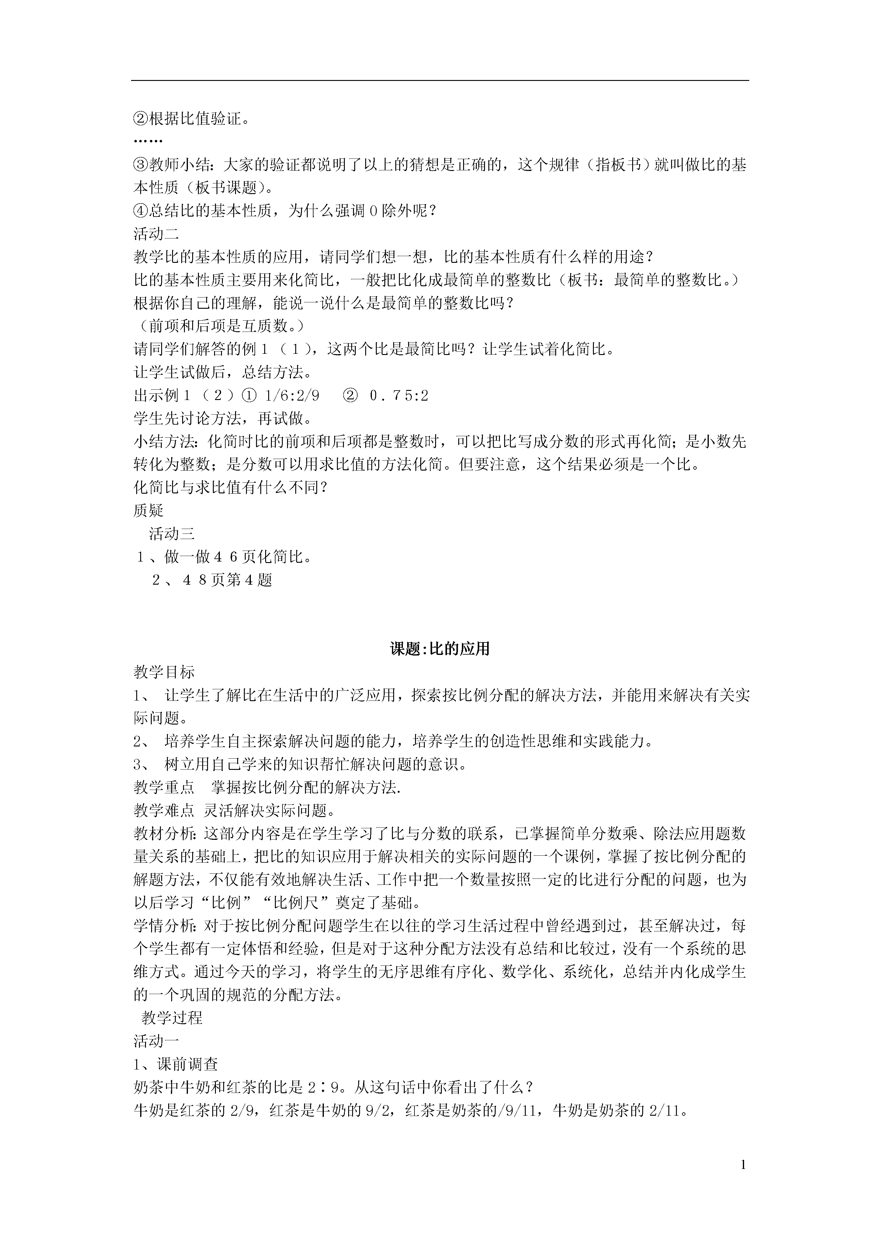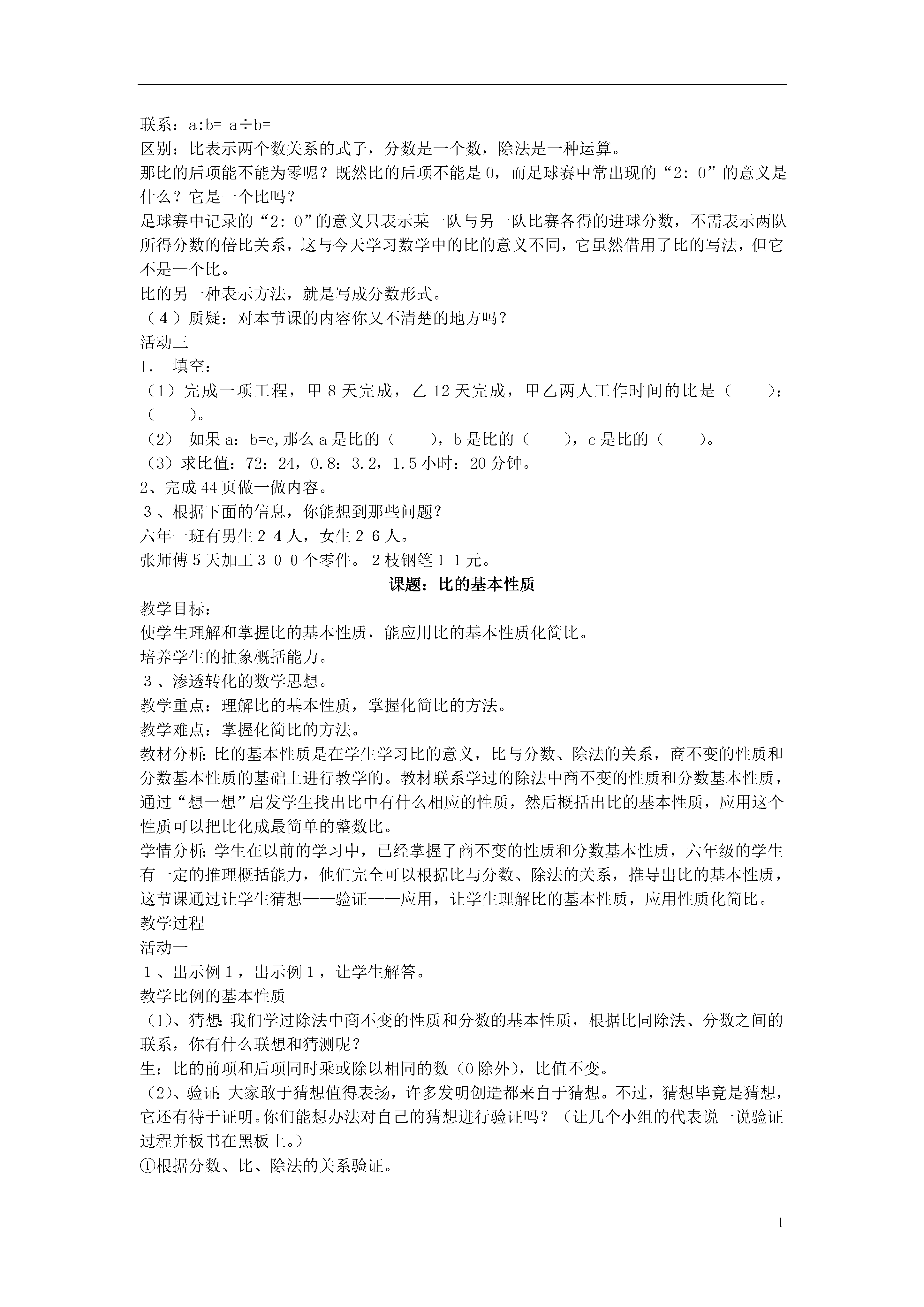 1课题:比的意义教学要求1.使学生理解比的意义,认识比的各部分名称。会正确读写比。2.能正确的求比值,掌握比、除法和分数的关系。3.培养学生的比较、分析和抽象概括能力。4、加强知识间的联系,使所学的知识系统化,渗透知识间相互联系的观点。教学重点:理解比的意义教学难点:理解比与分数、除法的关系。教材分析:这部分是学生学过分数与除法的关系,分数乘除法的意义,分数乘除法应用题的基础上教学的。由于分数与除法有着密切的联系,把比的知识放在分数除法的后面进行教学,加强了知识间的内在联系,又为学习其他知识以及比例的知识打好基础。学情分析:因为比的现象在生活中司空见惯,例如按一定的比稀释清洁剂,加工混凝土等等都用到比的知识。学生有生活的一些体验,因而可以从学生的兴趣出发展通过观察、比较、讨论,感受比的含义和特征。进而了解比与除法、分数的关系。教学过程:活动一1、情境引入:出示一面国旗联合国旗的图案,我国第一艘载人飞船“神州”五号顺利升空。这是扬利伟在飞船上向人们展示的一面中华人民共和国和联合国国旗的图案,这个图案长是15厘米,宽是10厘米,根据这两个条件可以提出什么问题?(可提的问题很多,教师有选择地板书。①长是宽的几倍?②宽是长的几分之几?)2、揭示课题:长是宽的几倍或者宽是长的几分之几是我们用以前学过的除法对这面旗的长和宽进行比较的,今天我们再学习一种对两个数量进行比较的新的方法。这就是比(板书课题)活动二:1、教学比的意义。有时我们也把这两个数量之间的关系说成:长和宽的比是15比10,宽与长的比是10比15。2、进一步理解比的意义。“神舟”五号进入运行轨道后,在距地350千米的高空做圆周运动,平均90分钟绕地球一周,大约运行42252千米。你能提出什么问题?你能用比表示路程和时间的关系吗?3、小组讨论,你是怎么理解比的意义?得出:两个数相除又叫两个数的比。4、比的写法和各部分名称及求比值的方法介绍比号、比表示的方法、比的各部分名称,①中间的“:”叫做比号,读的时候直接读比。②比的各部分名称是什么呢?请大家看书p44的内容。③介绍比各部分的名称,求比值方法,并板书。5、比、除法、分数之间的关系比、除法、分数有什么联系和区别?联系:a:b=a÷b=区别:比表示两个数关系的式子,分数是一个数,除法是一种运算。那比的后项能不能为零呢?既然比的后项不能是0,而足球赛中常出现的“2:0”的意义是什么?它是一个比吗?足球赛中记录的“2:0”的意义只表示某一队与另一队比赛各得的进球分数,不需表示两队所得分数的倍比关系,这与今天学习数学中的比的意义不同,它虽然借用了比的写法,但它不是一个比。比的另一种表示方法,就是写成分数形式。(4)质疑:对本节课的内容你又不清楚的地方吗?活动三1.填空:(1)完成一项工程,甲8天完成,乙12天完成,甲乙两人工作时间的比是():()。(2)如果a:b=c,那么a是比的(),b是比的(),c是比的()。(3)求比值:72:24,0.8:3.2,1.5小时:20分钟。2、完成44页做一做内容。3、根据下面的信息,你能想到那些问题?六年一班有男生24人,女生26人。张师傅5天加工300个零件。2枝钢笔11元。课题:比的基本性质教学目标:使学生理解和掌握比的基本性质,能应用比的基本性质化简比。培养学生的抽象概括能力。3、渗透转化的数学思想。教学重点:理解比的基本性质,掌握化简比的方法。教学难点:掌握化简比的方法。教材分析:比的基本性质是在学生学习比的意义,比与分数、除法的关系,商不变的性质和分数基本性质的基础上进行教学的。教材联系学过的除法中商不变的性质和分数基本性质,通过“想一想”启发学生找出比中有什么相应的性质,然后概括出比的基本性质,应用这个性质可以把比化成最简单的整数比。学情分析:学生在以前的学习中,已经掌握了商不变的性质和分数基本性质,六年级的学生有一定的推理概括能力,他们完全可以根据比与分数、除法的关系,推导出比的基本性质,这节课通过让学生猜想——验证——应用,让学生理解比的基本性质,应用性质化简比。教学过程活动一1、出示例1,出示例1,让学生解答。教学比例的基本性质(1)、猜想:我们学过除法中商不变的性质和分数的基本性质,根据比同除法、分数之间的联系,你有什么联想和猜测呢?生:比的前项和后项同时乘或除以相同的数(0除外),比值不变。(2)、验证:大家敢于猜想值得表扬,许多发明创造都来自于猜想。不过,猜想毕竟是猜想,它还有待于证明。你们能想办法对自己的猜想进行验证吗?(让几个小组的代表说一说验证过程并板书在黑板上。)①根据分数、比、除法的关系验证。②根据比值验证。