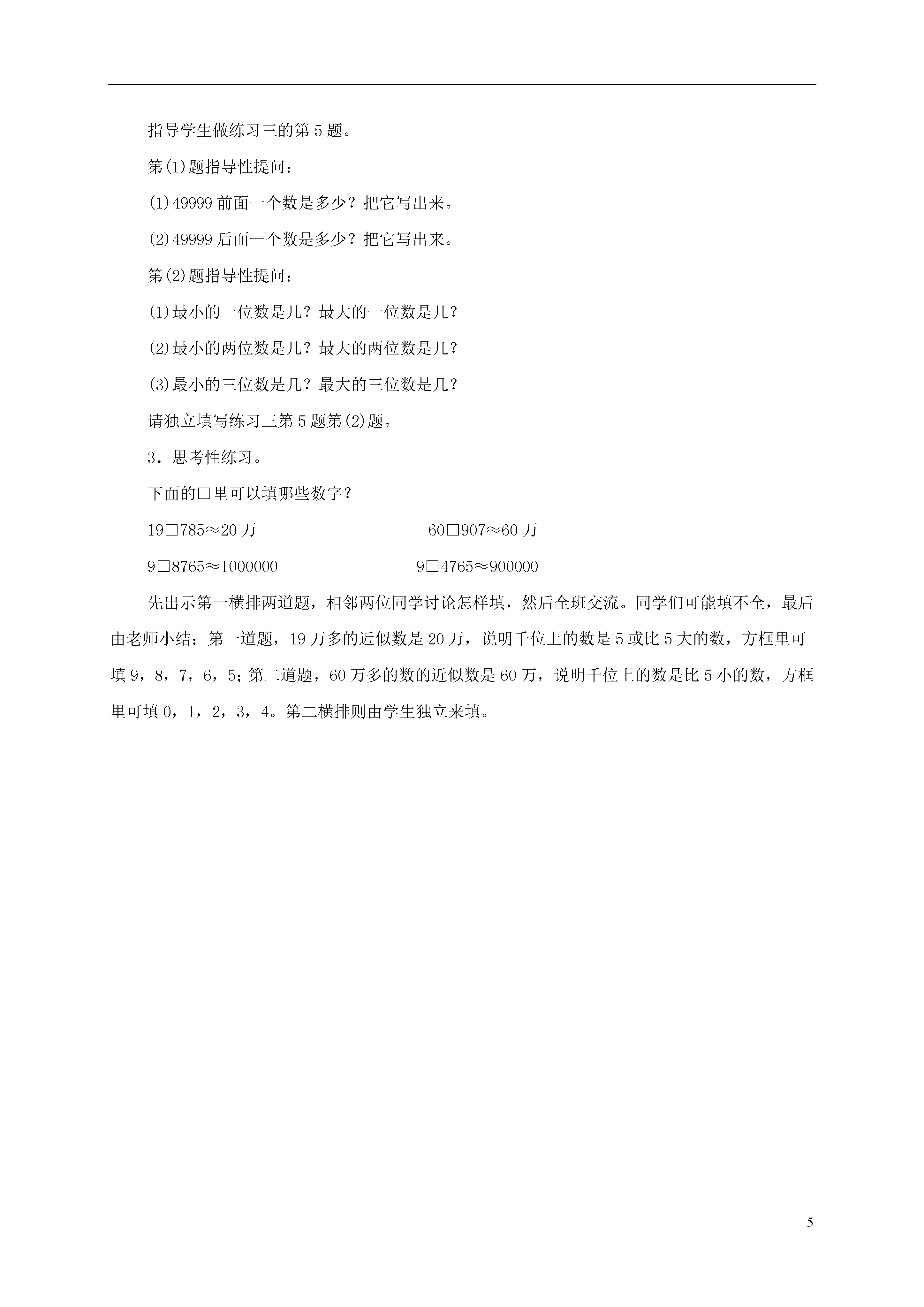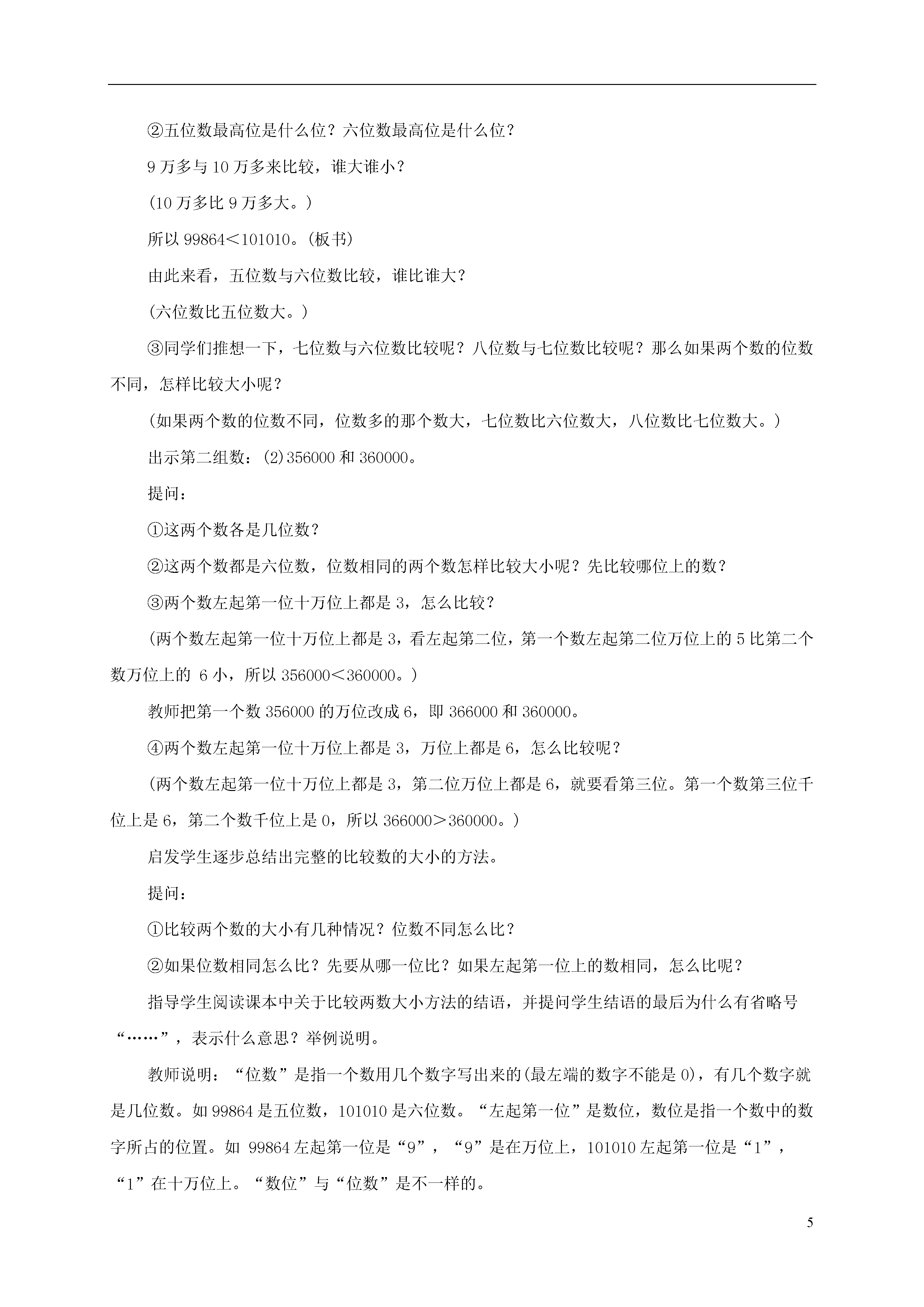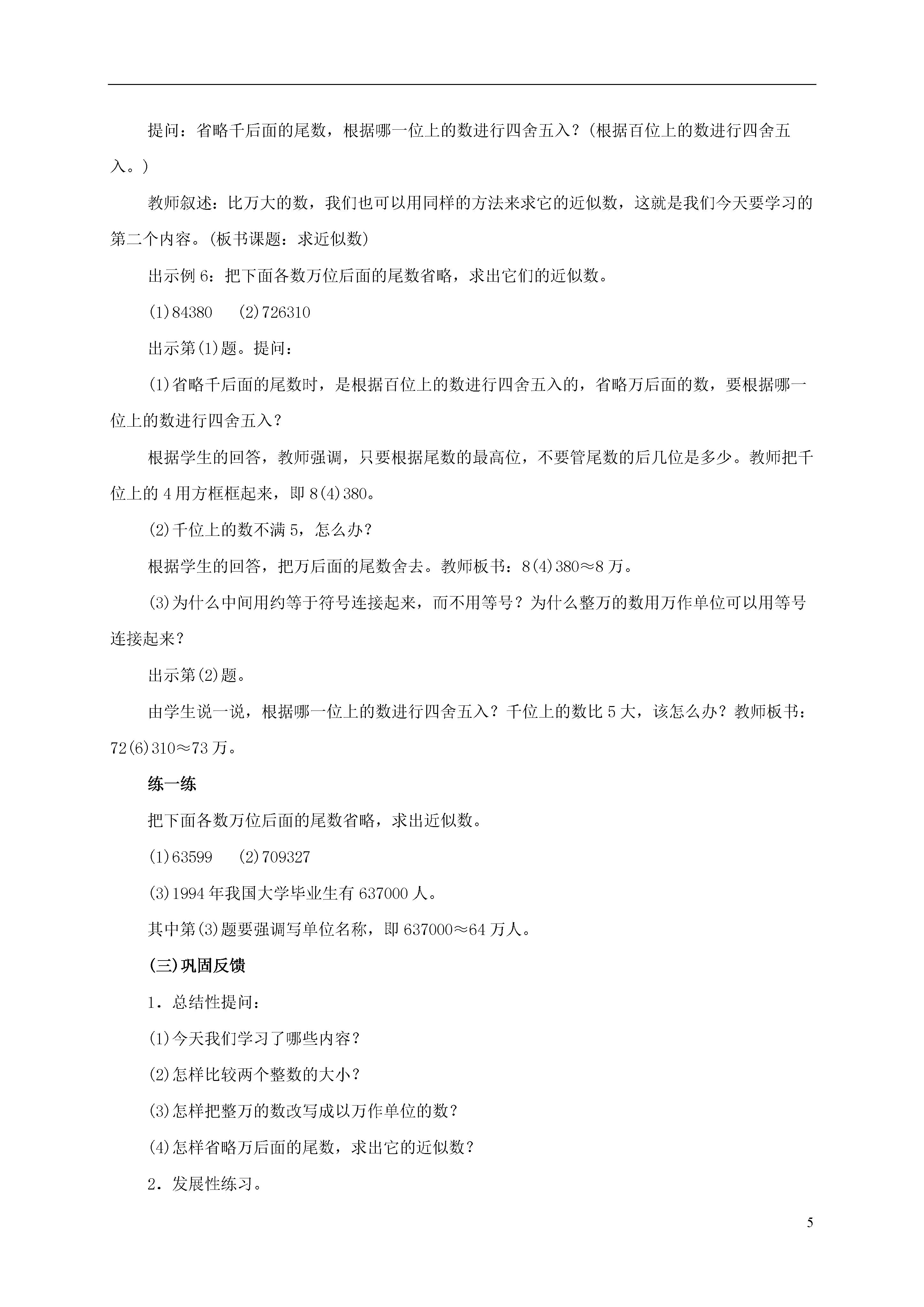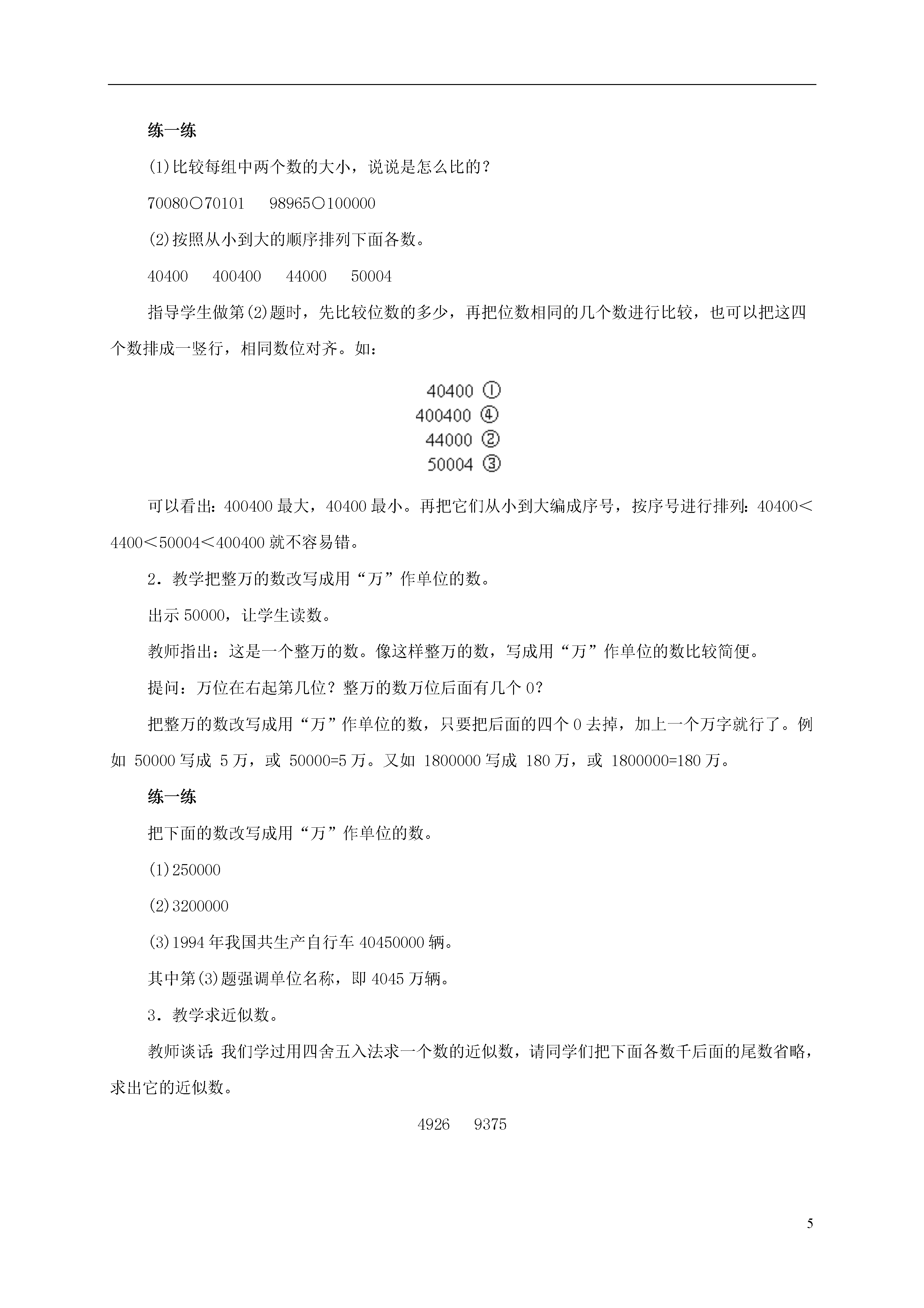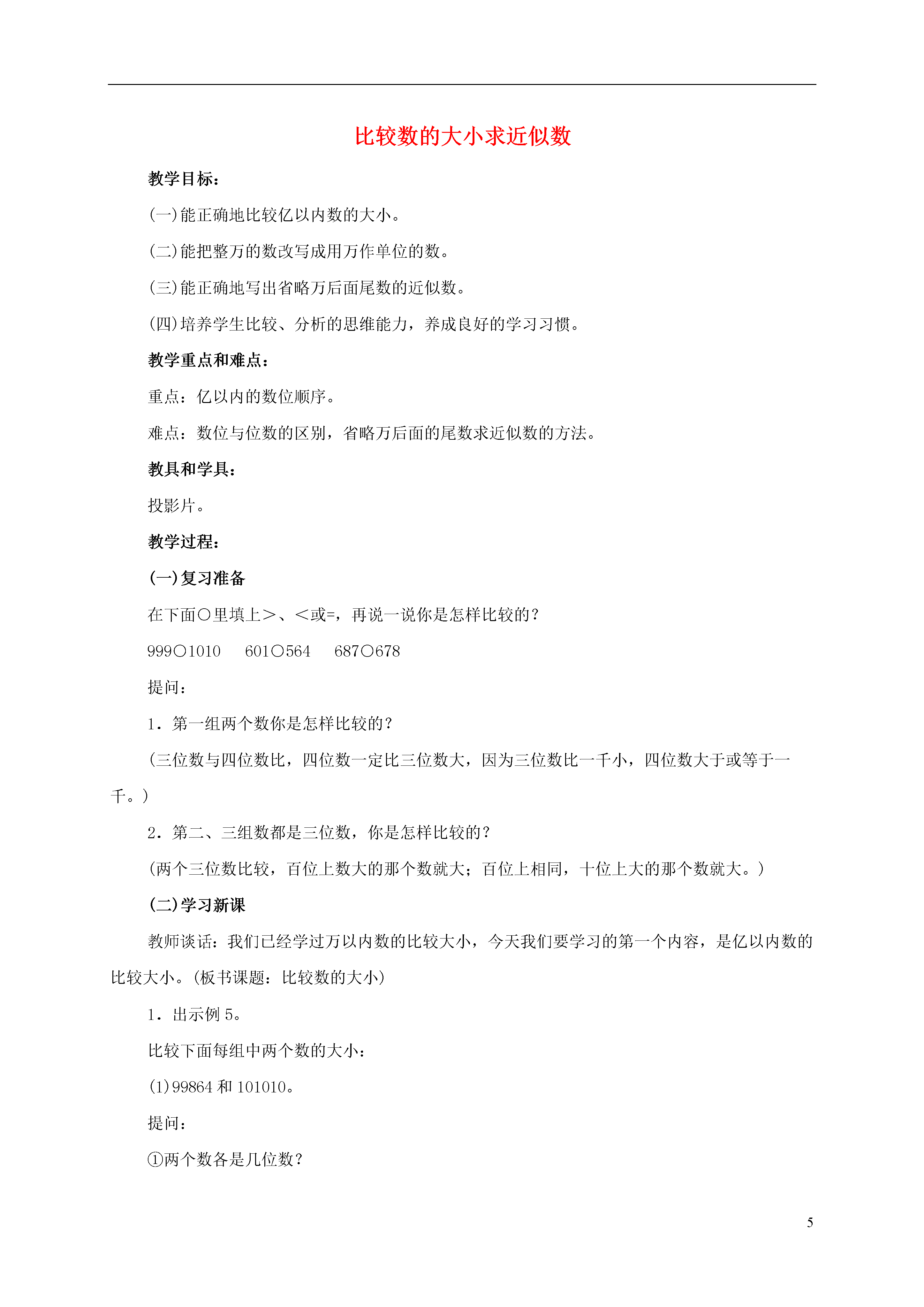 5比较数的大小求近似数教学目标:(一)能正确地比较亿以内数的大小。(二)能把整万的数改写成用万作单位的数。(三)能正确地写出省略万后面尾数的近似数。(四)培养学生比较、分析的思维能力,养成良好的学习习惯。教学重点和难点:重点:亿以内的数位顺序。难点:数位与位数的区别,省略万后面的尾数求近似数的方法。教具和学具:投影片。教学过程:(一)复习准备在下面○里填上>、<或=,再说一说你是怎样比较的?999○1010601○564687○678提问:1.第一组两个数你是怎样比较的?(三位数与四位数比,四位数一定比三位数大,因为三位数比一千小,四位数大于或等于一千。)2.第二、三组数都是三位数,你是怎样比较的?(两个三位数比较,百位上数大的那个数就大;百位上相同,十位上大的那个数就大。)(二)学习新课教师谈话:我们已经学过万以内数的比较大小,今天我们要学习的第一个内容,是亿以内数的比较大小。(板书课题:比较数的大小)1.出示例5。比较下面每组中两个数的大小:(1)99864和101010。提问:①两个数各是几位数?②五位数最高位是什么位?六位数最高位是什么位?9万多与10万多来比较,谁大谁小?(10万多比9万多大。)所以99864<101010。(板书)由此来看,五位数与六位数比较,谁比谁大?(六位数比五位数大。)③同学们推想一下,七位数与六位数比较呢?八位数与七位数比较呢?那么如果两个数的位数不同,怎样比较大小呢?(如果两个数的位数不同,位数多的那个数大,七位数比六位数大,八位数比七位数大。)出示第二组数:(2)356000和360000。提问:①这两个数各是几位数?②这两个数都是六位数,位数相同的两个数怎样比较大小呢?先比较哪位上的数?③两个数左起第一位十万位上都是3,怎么比较?(两个数左起第一位十万位上都是3,看左起第二位,第一个数左起第二位万位上的5比第二个数万位上的6小,所以356000<360000。)教师把第一个数356000的万位改成6,即366000和360000。④两个数左起第一位十万位上都是3,万位上都是6,怎么比较呢?(两个数左起第一位十万位上都是3,第二位万位上都是6,就要看第三位。第一个数第三位千位上是6,第二个数千位上是0,所以366000>360000。)启发学生逐步总结出完整的比较数的大小的方法。提问:①比较两个数的大小有几种情况?位数不同怎么比?②如果位数相同怎么比?先要从哪一位比?如果左起第一位上的数相同,怎么比呢?指导学生阅读课本中关于比较两数大小方法的结语,并提问学生结语的最后为什么有省略号“……”,表示什么意思?举例说明。教师说明:“位数”是指一个数用几个数字写出来的(最左端的数字不能是0),有几个数字就是几位数。如99864是五位数,101010是六位数。“左起第一位”是数位,数位是指一个数中的数字所占的位置。如99864左起第一位是“9”,“9”是在万位上,101010左起第一位是“1”,“1”在十万位上。“数位”与“位数”是不一样的。练一练(1)比较每组中两个数的大小,说说是怎么比的?70080○7010198965○100000(2)按照从小到大的顺序排列下面各数。404004004004400050004指导学生做第(2)题时,先比较位数的多少,再把位数相同的几个数进行比较,也可以把这四个数排成一竖行,相同数位对齐。如:可以看出:400400最大,40400最小。再把它们从小到大编成序号,按序号进行排列:40400<4400<50004<400400就不容易错。2.教学把整万的数改写成用“万”作单位的数。出示50000,让学生读数。教师指出:这是一个整万的数。像这样整万的数,写成用“万”作单位的数比较简便。提问:万位在右起第几位?整万的数万位后面有几个0?把整万的数改写成用“万”作单位的数,只要把后面的四个0去掉,加上一个万字就行了。例如50000写成5万,或50000=5万。又如1800000写成180万,或1800000=180万。练一练把下面的数改写成用“万”作单位的数。(1)250000(2)3200000(3)1994年我国共生产自行车40450000辆。其中第(3)题强调单位名称,即4045万辆。3.教学求近似数。教师谈话:我们学过用四舍五入法求一个数的近似数,请同学们把下面各数千后面的尾数省略,求出它的近似数。49269375提问:省略千后面的尾数,根据哪一位上的数进行四舍五入?(根据百位上的数进行四舍五入。)教师叙述:比万大的数,我们也可以用同样的方法来求它的近似数,这就是我们今天要学习的第二个内容。(板书课题