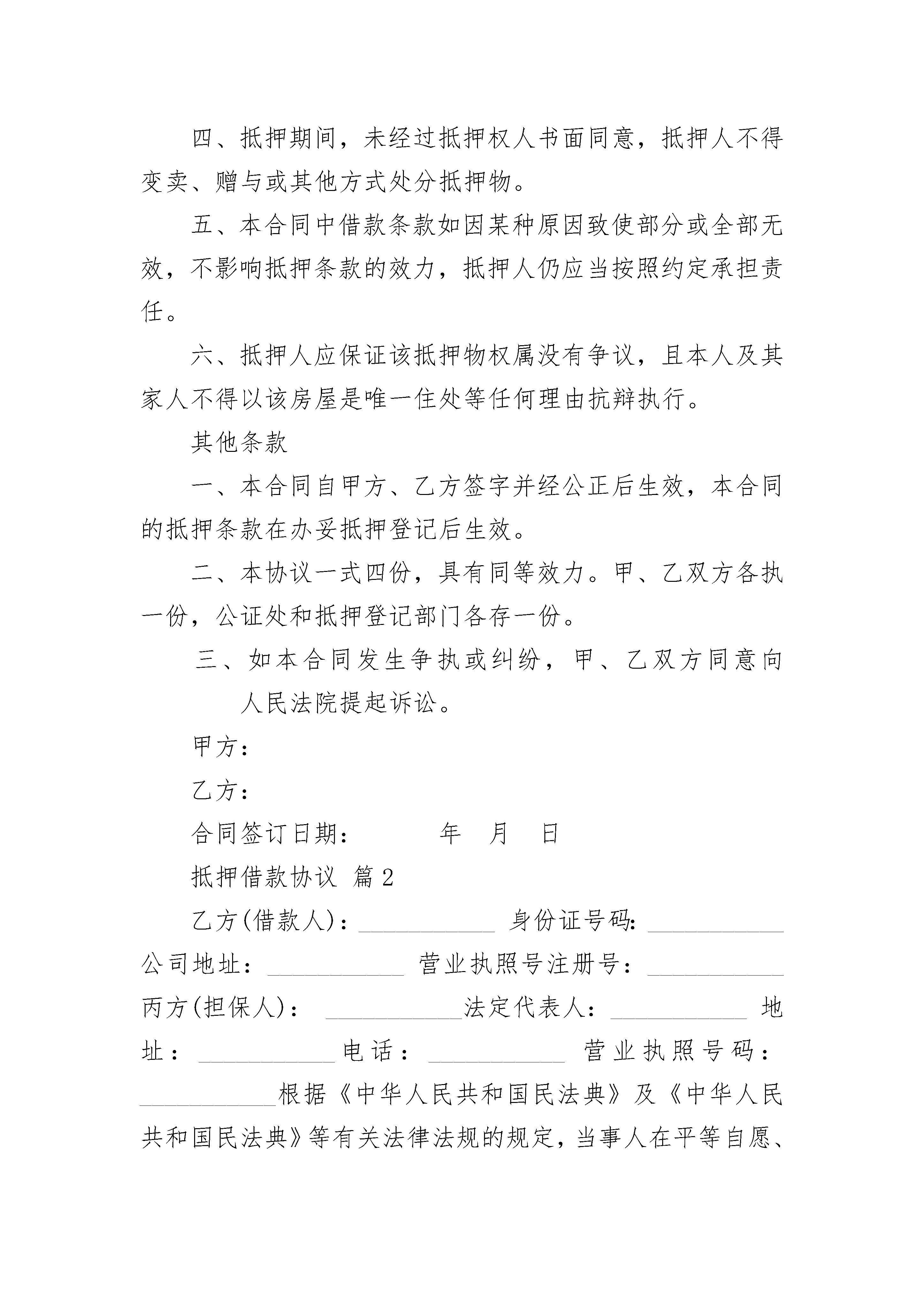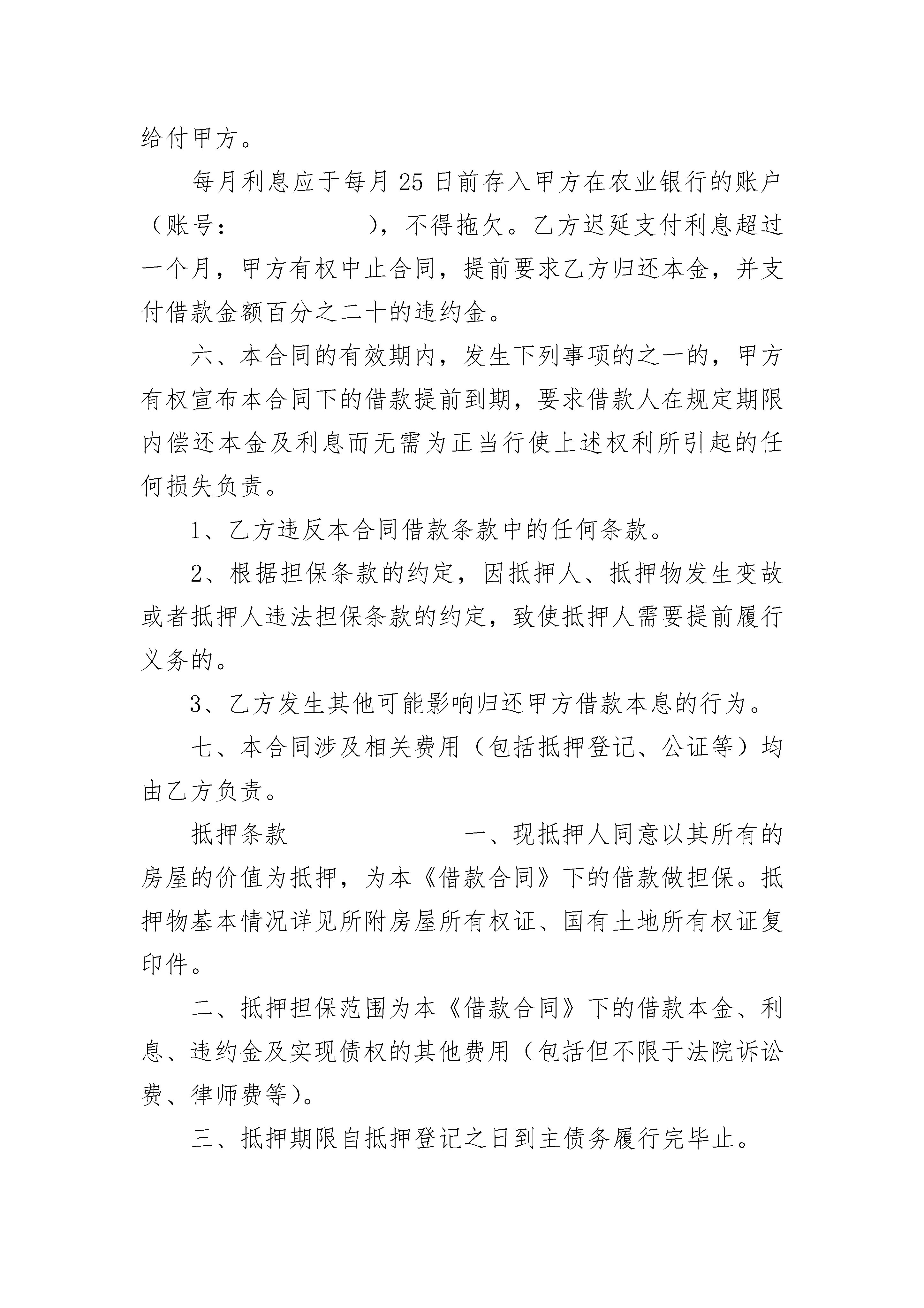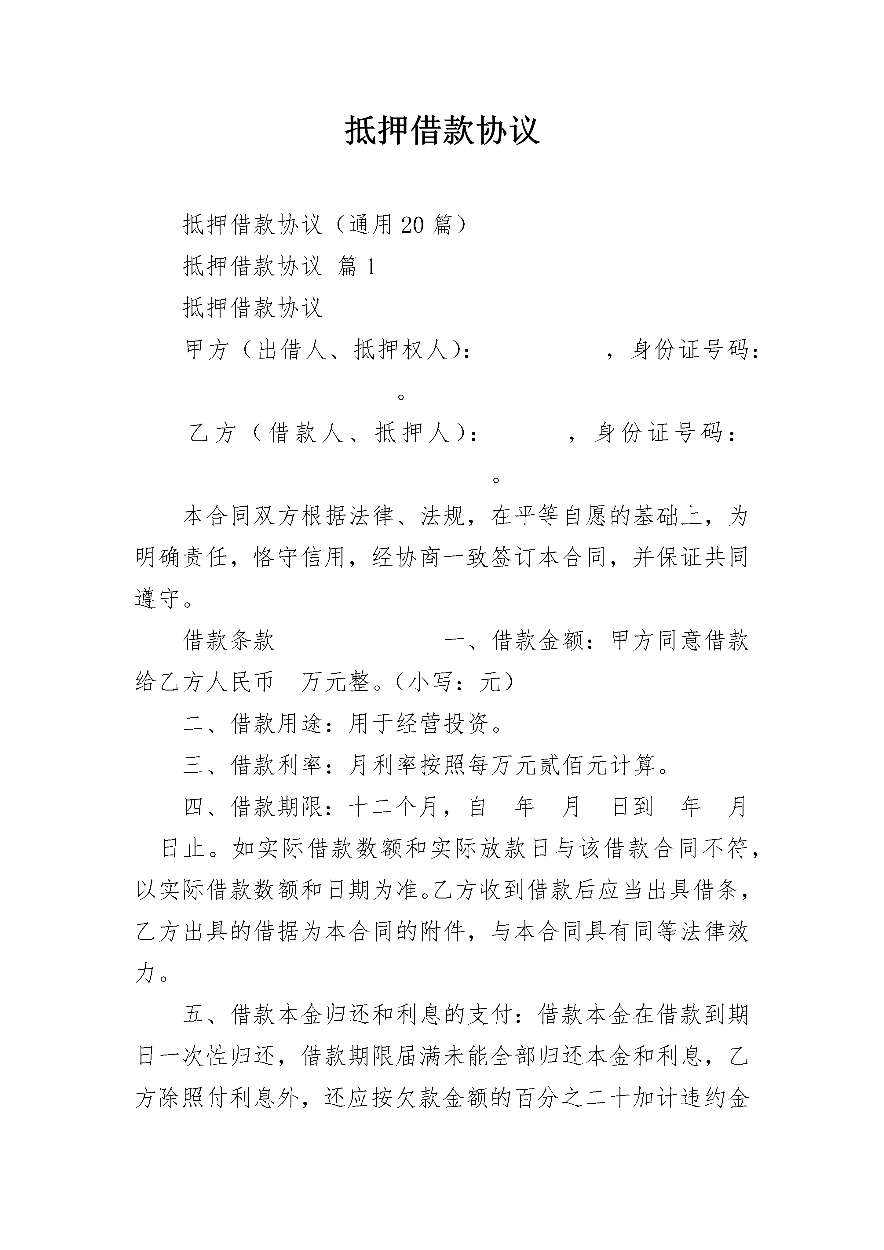 抵押借款协议抵押借款协议(通用20篇)抵押借款协议篇1抵押借款协议甲方(出借人、抵押权人):,身份证号码:。乙方(借款人、抵押人):,身份证号码:。本合同双方根据法律、法规,在平等自愿的基础上,为明确责任,恪守信用,经协商一致签订本合同,并保证共同遵守。借款条款一、借款金额:甲方同意借款给乙方人民币万元整。(小写:元)二、借款用途:用于经营投资。三、借款利率:月利率按照每万元贰佰元计算。四、借款期限:十二个月,自年月日到年月日止。如实际借款数额和实际放款日与该借款合同不符,以实际借款数额和日期为准。乙方收到借款后应当出具借条,乙方出具的借据为本合同的附件,与本合同具有同等法律效力。五、借款本金归还和利息的支付:借款本金在借款到期日一次性归还,借款期限届满未能全部归还本金和利息,乙方除照付利息外,还应按欠款金额的百分之二十加计违约金给付甲方。每月利息应于每月25日前存入甲方在农业银行的账户(账号:),不得拖欠。乙方迟延支付利息超过一个月,甲方有权中止合同,提前要求乙方归还本金,并支付借款金额百分之二十的违约金。六、本合同的有效期内,发生下列事项的之一的,甲方有权宣布本合同下的借款提前到期,要求借款人在规定期限内偿还本金及利息而无需为正当行使上述权利所引起的任何损失负责。1、乙方违反本合同借款条款中的任何条款。2、根据担保条款的约定,因抵押人、抵押物发生变故或者抵押人违法担保条款的约定,致使抵押人需要提前履行义务的。3、乙方发生其他可能影响归还甲方借款本息的行为。七、本合同涉及相关费用(包括抵押登记、公证等)均由乙方负责。抵押条款一、现抵押人同意以其所有的房屋的价值为抵押,为本《借款合同》下的借款做担保。抵押物基本情况详见所附房屋所有权证、国有土地所有权证复印件。二、抵押担保范围为本《借款合同》下的借款本金、利息、违约金及实现债权的其他费用(包括但不限于法院诉讼费、律师费等)。三、抵押期限自抵押登记之日到主债务履行完毕止。四、抵押期间,未经过抵押权人书面同意,抵押人不得变卖、赠与或其他方式处分抵押物。五、本合同中借款条款如因某种原因致使部分或全部无效,不影响抵押条款的效力,抵押人仍应当按照约定承担责任。六、抵押人应保证该抵押物权属没有争议,且本人及其家人不得以该房屋是唯一住处等任何理由抗辩执行。其他条款一、本合同自甲方、乙方签字并经公正后生效,本合同的抵押条款在办妥抵押登记后生效。二、本协议一式四份,具有同等效力。甲、乙双方各执一份,公证处和抵押登记部门各存一份。三、如本合同发生争执或纠纷,甲、乙双方同意向人民法院提起诉讼。甲方:乙方:合同签订日期:年月日抵押借款协议篇2乙方(借款人):___________身份证号码:___________公司地址:___________营业执照号注册号:___________丙方(担保人):___________法定代表人:___________地址:___________电话:___________营业执照号码:___________根据《中华人民共和国民法典》及《中华人民共和国民法典》等有关法律法规的规定,当事人在平等自愿、诚实信用的基础上,经协商一致,签订本合同。第一条:甲方(出借人)_________出借人民币_________,期限___个月,自________年____月____日至________年____月____日止。借款期限届满日为法定节假日、休息日的,顺延至节假日、休息日后的第一个工作日,利息按实际占有天数计算。第二条:借款利率为月息___‰,从出资人实际交付借款之日起计息至本金结清之日。第三条:乙方借款用途为经营周转。乙方承诺合法使用借款,不得用作违法活动。第四条:甲方应在合同签订后当日,一次性向乙方交付全部借款。具体借款金额和借款时间以支付凭证为准。第五条:乙方还款方式为:按月还息,每月____日为乙方的付息终结日。在每月____日至____日(含____日)期间借款的借款人需将第一个月利息直接交给出借人;____日之后借款的借款人应在次月的____日之前(含____日)支付的第一个利息。本金分期归还或到期后一次性归还,具体归还办法见还款计划书。第六条:根据乙方之请求,丙方愿对本合同项下甲方对乙方的全部债权承担连带保证责任。在借款到期之日起____日内如乙方未能足额将借款本金偿还甲方时,丙方保证将应付款项(包括借款本金、利息)偿付给甲方。第七条:因乙方不履行还款义务,丙方为乙方代为偿还借款后,甲方即将本合同项下的包括借款本金和利息等在内的所有债权转让给丙方,丙方即成为乙方新的债权人,丙方享有本合同中甲方对乙方享有的所有合同权利。第八条:本合同如