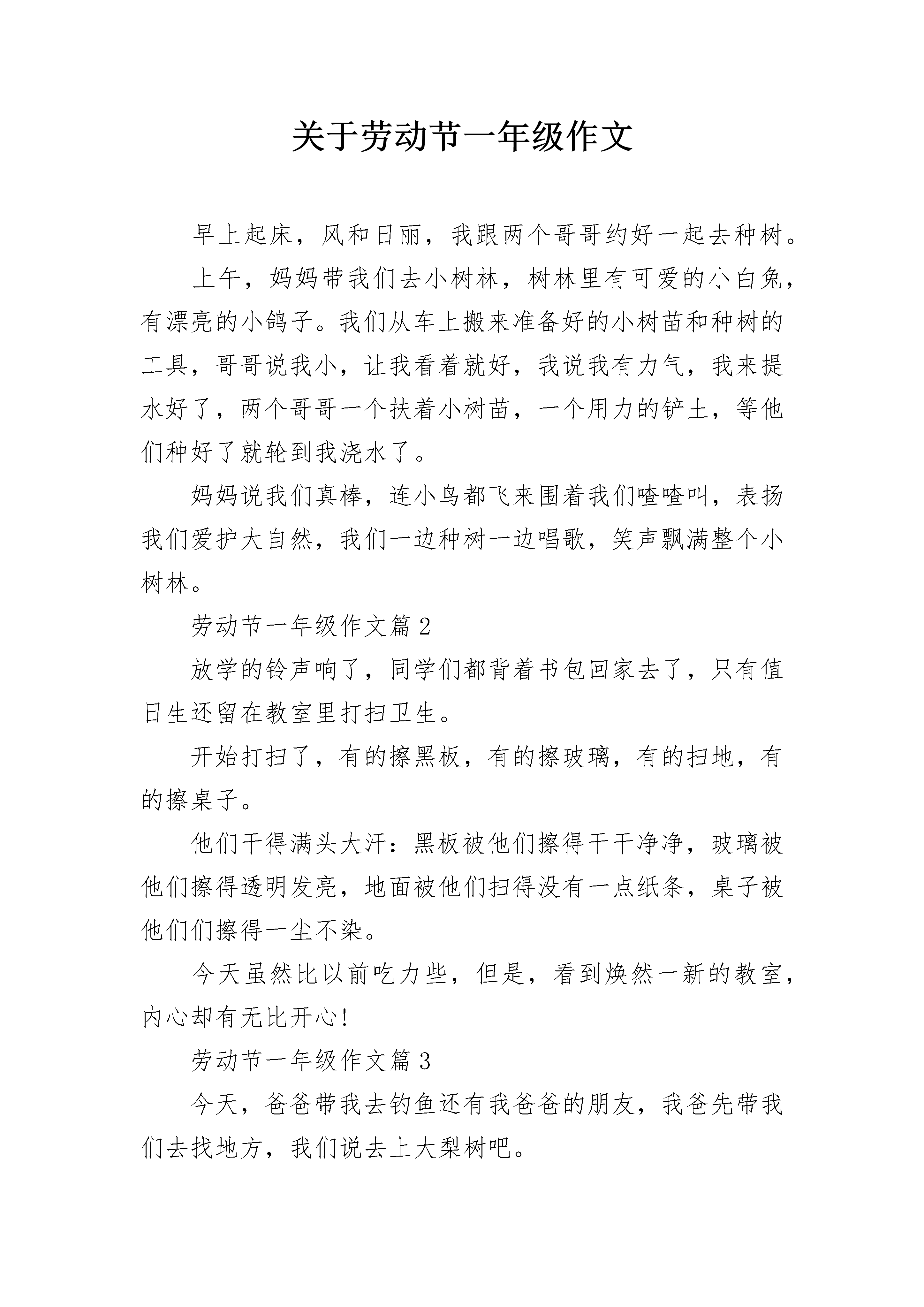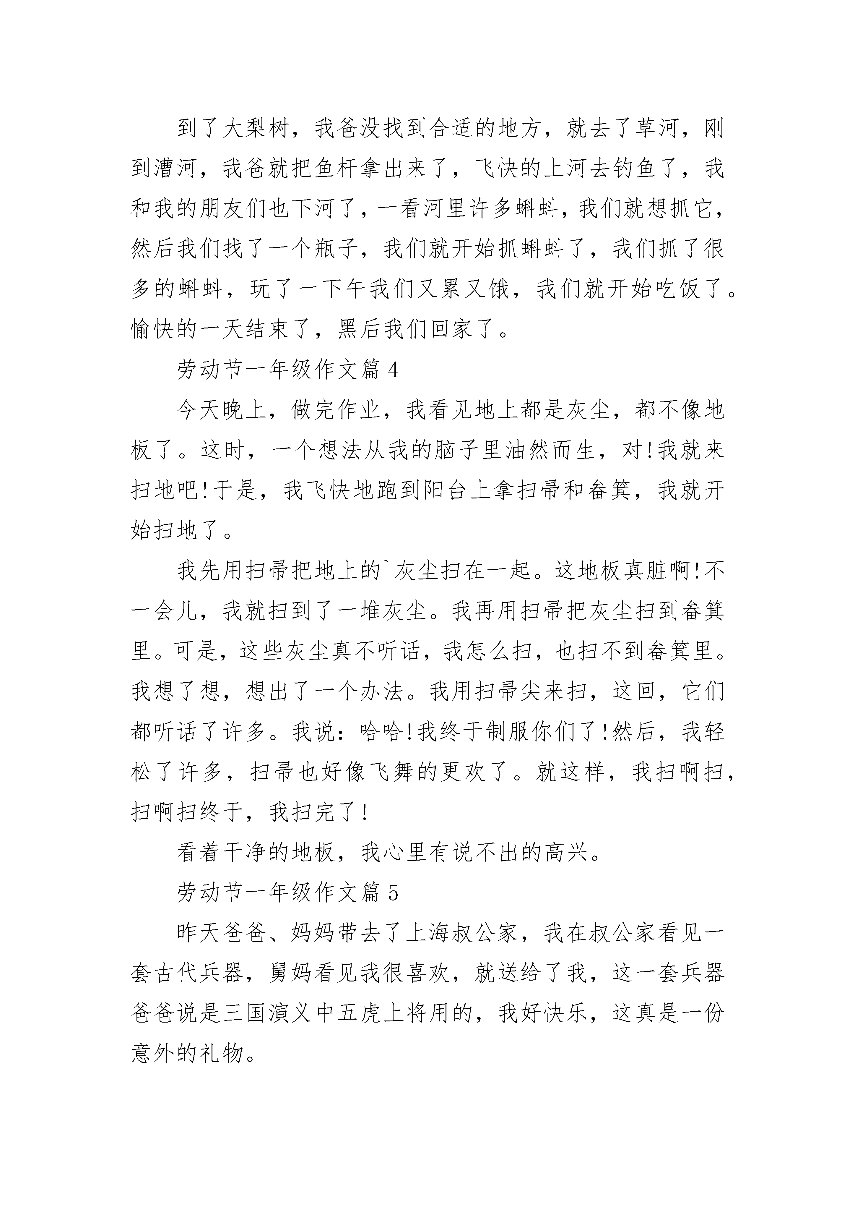 关于劳动节一年级作文早上起床,风和日丽,我跟两个哥哥约好一起去种树。上午,妈妈带我们去小树林,树林里有可爱的小白兔,有漂亮的小鸽子。我们从车上搬来准备好的小树苗和种树的工具,哥哥说我小,让我看着就好,我说我有力气,我来提水好了,两个哥哥一个扶着小树苗,一个用力的铲土,等他们种好了就轮到我浇水了。妈妈说我们真棒,连小鸟都飞来围着我们喳喳叫,表扬我们爱护大自然,我们一边种树一边唱歌,笑声飘满整个小树林。劳动节一年级作文篇2放学的铃声响了,同学们都背着书包回家去了,只有值日生还留在教室里打扫卫生。开始打扫了,有的擦黑板,有的擦玻璃,有的扫地,有的擦桌子。他们干得满头大汗:黑板被他们擦得干干净净,玻璃被他们擦得透明发亮,地面被他们扫得没有一点纸条,桌子被他们们擦得一尘不染。今天虽然比以前吃力些,但是,看到焕然一新的教室,内心却有无比开心!劳动节一年级作文篇3今天,爸爸带我去钓鱼还有我爸爸的朋友,我爸先带我们去找地方,我们说去上大梨树吧。到了大梨树,我爸没找到合适的地方,就去了草河,刚到漕河,我爸就把鱼杆拿出来了,飞快的上河去钓鱼了,我和我的朋友们也下河了,一看河里许多蝌蚪,我们就想抓它,然后我们找了一个瓶子,我们就开始抓蝌蚪了,我们抓了很多的蝌蚪,玩了一下午我们又累又饿,我们就开始吃饭了。愉快的一天结束了,黑后我们回家了。劳动节一年级作文篇4今天晚上,做完作业,我看见地上都是灰尘,都不像地板了。这时,一个想法从我的脑子里油然而生,对!我就来扫地吧!于是,我飞快地跑到阳台上拿扫帚和畚箕,我就开始扫地了。我先用扫帚把地上的`灰尘扫在一起。这地板真脏啊!不一会儿,我就扫到了一堆灰尘。我再用扫帚把灰尘扫到畚箕里。可是,这些灰尘真不听话,我怎么扫,也扫不到畚箕里。我想了想,想出了一个办法。我用扫帚尖来扫,这回,它们都听话了许多。我说:哈哈!我终于制服你们了!然后,我轻松了许多,扫帚也好像飞舞的更欢了。就这样,我扫啊扫,扫啊扫终于,我扫完了!看着干净的地板,我心里有说不出的高兴。劳动节一年级作文篇5昨天爸爸、妈妈带去了上海叔公家,我在叔公家看见一套古代兵器,舅妈看见我很喜欢,就送给了我,这一套兵器爸爸说是三国演义中五虎上将用的,我好快乐,这真是一份意外的礼物。下午我去了儿童博物馆,我先玩了潜水艇,通过潜水艇里的潜望镜,我看到了许多鲸鱼、鲨鱼,还有蟹老板和章鱼哥;我还观看了火箭发射;我还玩了过家家等等好多有趣的游戏。在玩的过程中,我增长了很多知识。下次我还要去那里玩。