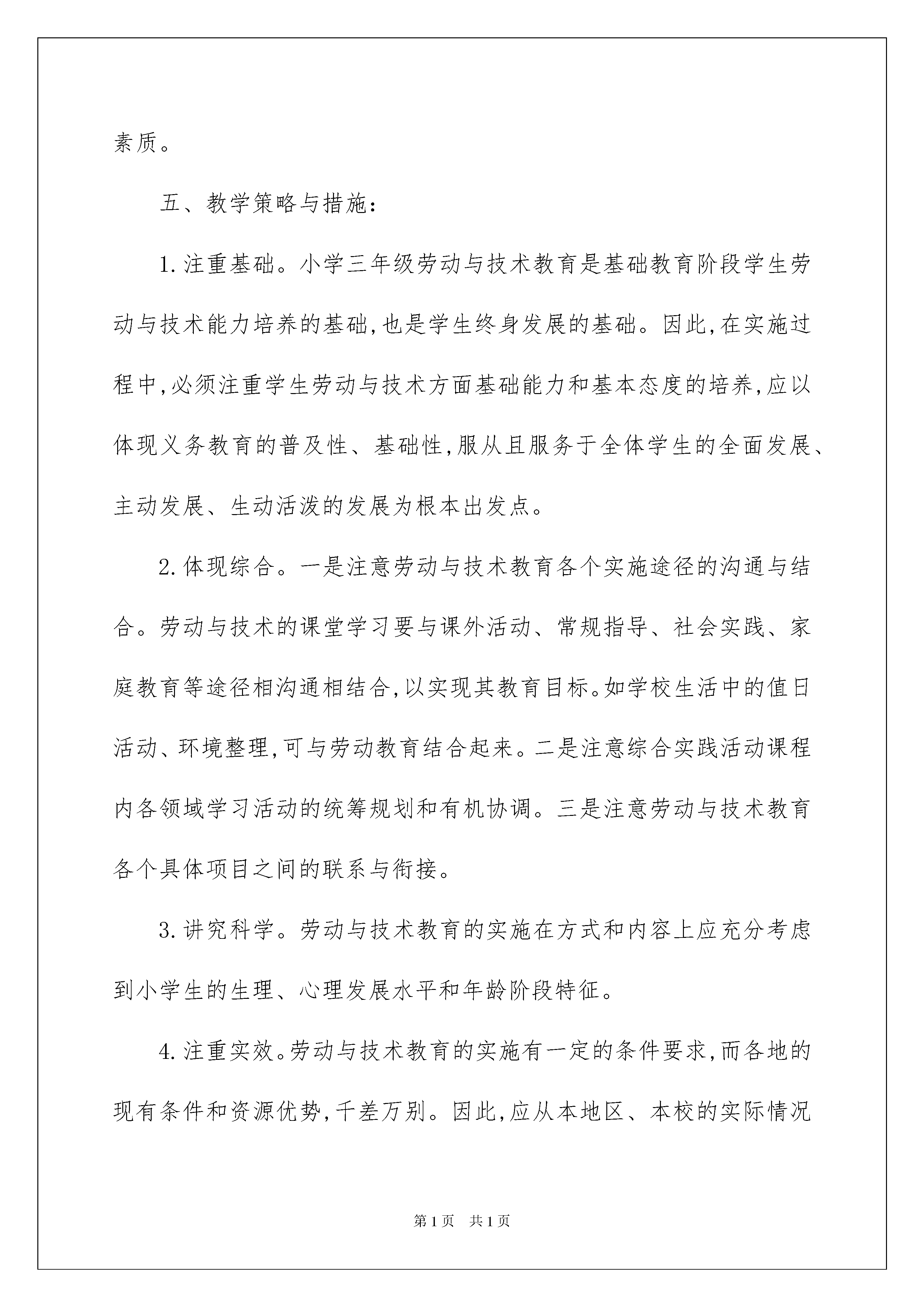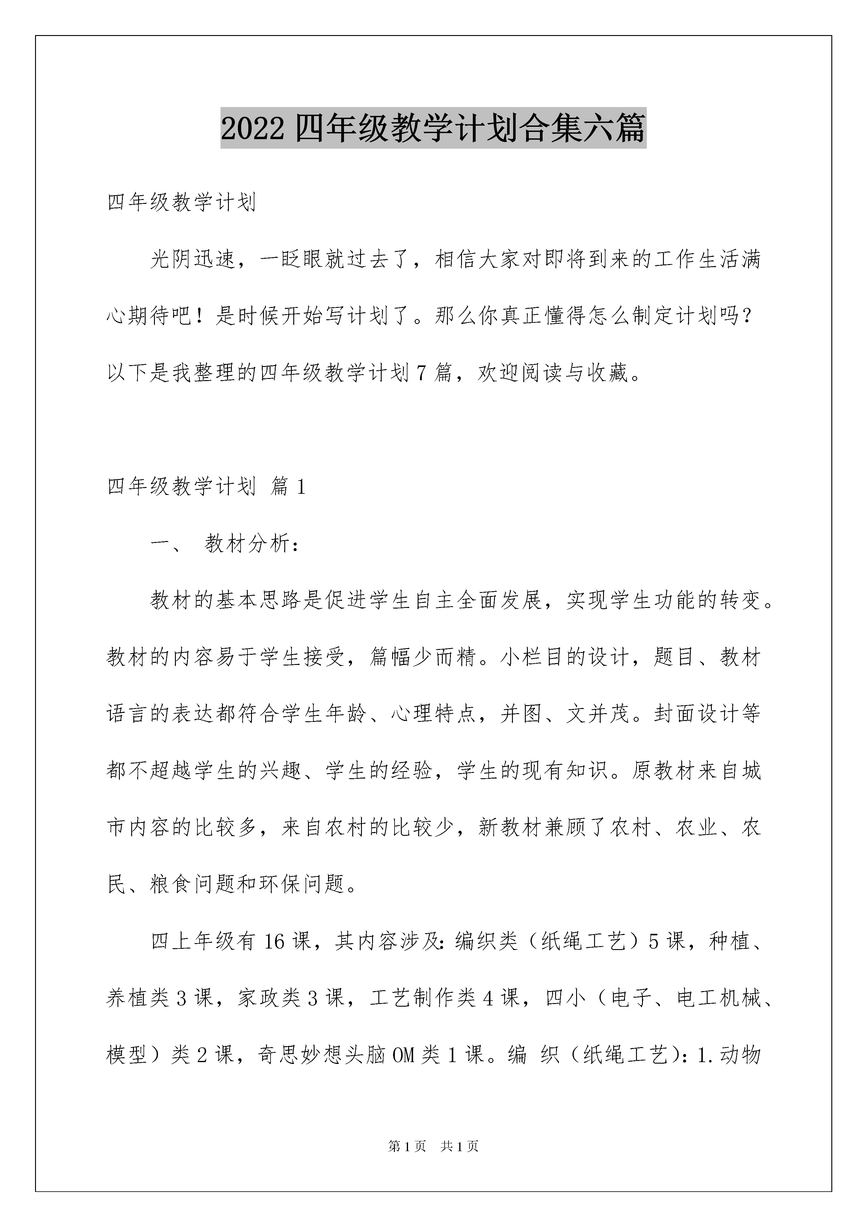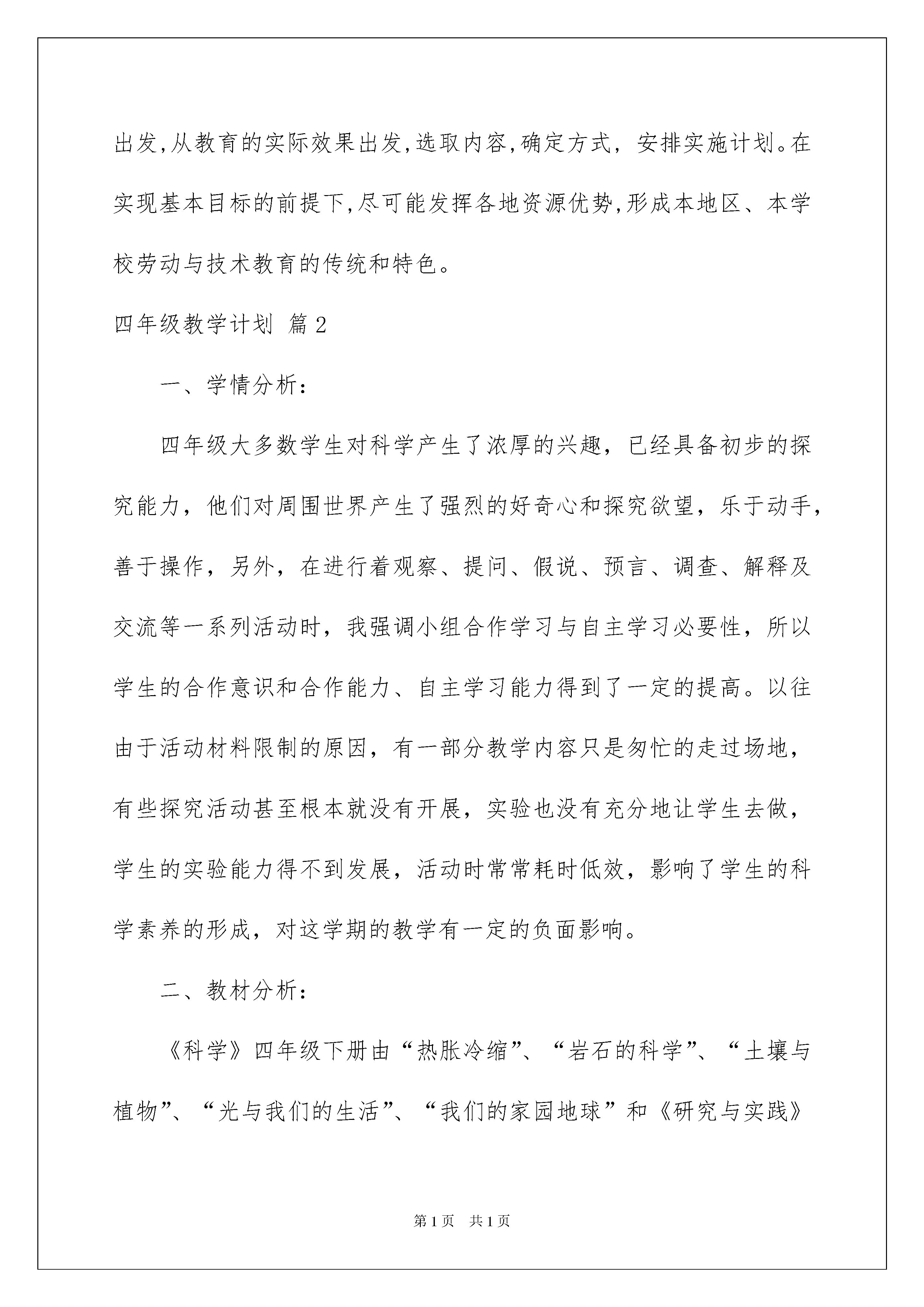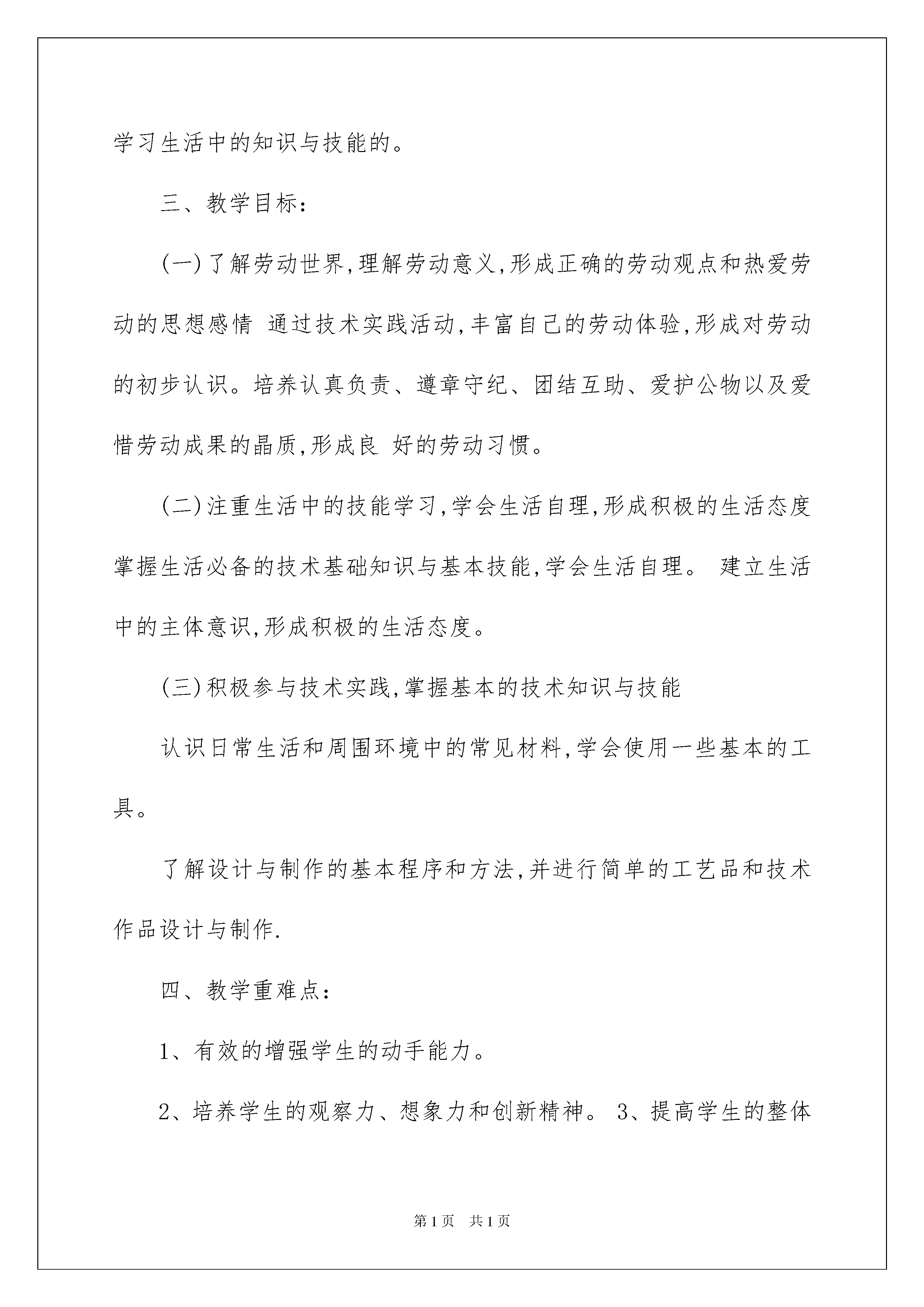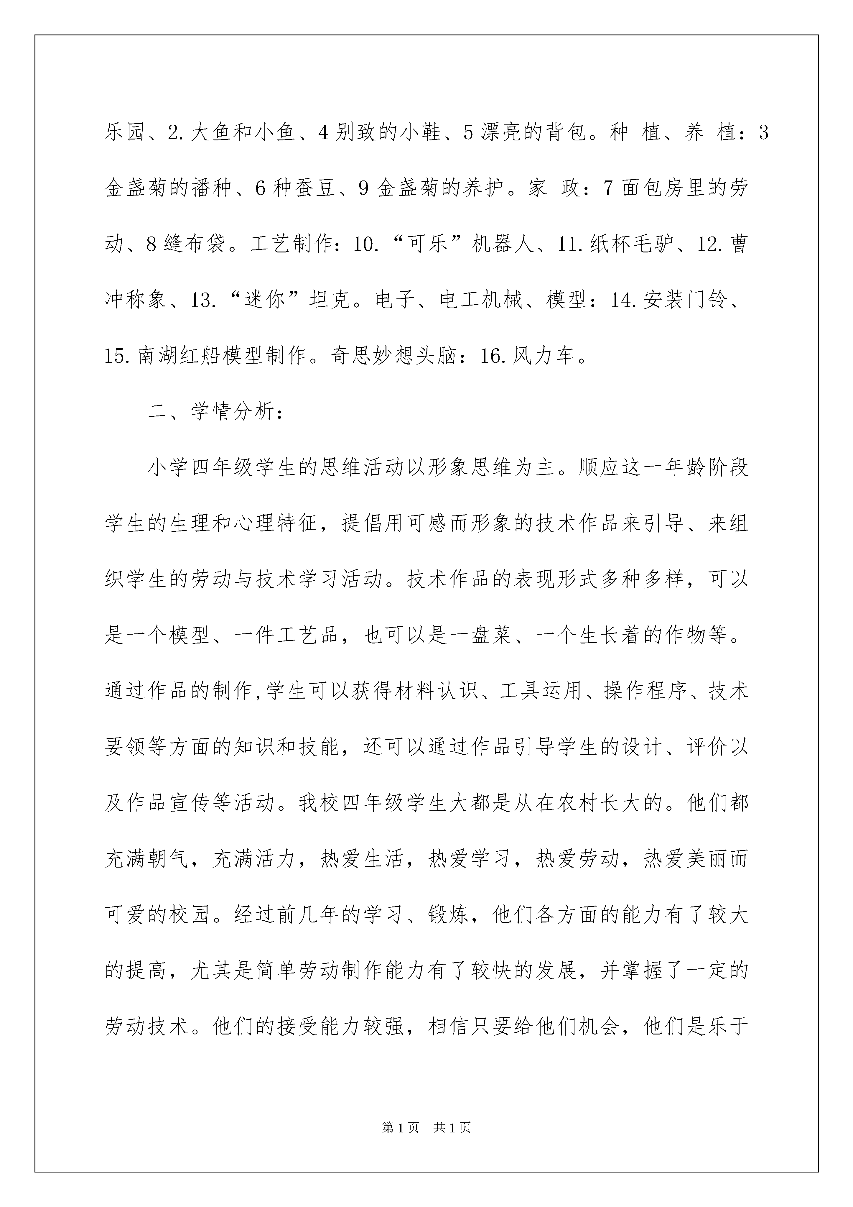 2022四年级教学计划合集六篇四年级教学计划光阴迅速,一眨眼就过去了,相信大家对即将到来的工作生活满心期待吧!是时候开始写计划了。那么你真正懂得怎么制定计划吗?以下是我整理的四年级教学计划7篇,欢迎阅读与收藏。四年级教学计划篇1一、教材分析:教材的基本思路是促进学生自主全面发展,实现学生功能的转变。教材的内容易于学生接受,篇幅少而精。小栏目的设计,题目、教材语言的表达都符合学生年龄、心理特点,并图、文并茂。封面设计等都不超越学生的兴趣、学生的经验,学生的现有知识。原教材来自城市内容的比较多,来自农村的比较少,新教材兼顾了农村、农业、农民、粮食问题和环保问题。四上年级有16课,其内容涉及:编织类(纸绳工艺)5课,种植、养植类3课,家政类3课,工艺制作类4课,四小(电子、电工机械、模型)类2课,奇思妙想头脑OM类1课。编织(纸绳工艺):1.动物乐园、2.大鱼和小鱼、4别致的小鞋、5漂亮的背包。种植、养植:3金盏菊的播种、6种蚕豆、9金盏菊的养护。家政:7面包房里的劳动、8缝布袋。工艺制作:10.“可乐”机器人、11.纸杯毛驴、12.曹冲称象、13.“迷你”坦克。电子、电工机械、模型:14.安装门铃、15.南湖红船模型制作。奇思妙想头脑:16.风力车。二、学情分析:小学四年级学生的思维活动以形象思维为主。顺应这一年龄阶段学生的生理和心理特征,提倡用可感而形象的技术作品来引导、来组织学生的劳动与技术学习活动。技术作品的表现形式多种多样,可以是一个模型、一件工艺品,也可以是一盘菜、一个生长着的作物等。通过作品的制作,学生可以获得材料认识、工具运用、操作程序、技术要领等方面的知识和技能,还可以通过作品引导学生的设计、评价以及作品宣传等活动。我校四年级学生大都是从在农村长大的。他们都充满朝气,充满活力,热爱生活,热爱学习,热爱劳动,热爱美丽而可爱的校园。经过前几年的学习、锻炼,他们各方面的能力有了较大的提高,尤其是简单劳动制作能力有了较快的发展,并掌握了一定的劳动技术。他们的接受能力较强,相信只要给他们机会,他们是乐于学习生活中的知识与技能的。三、教学目标:(一)了解劳动世界,理解劳动意义,形成正确的劳动观点和热爱劳动的思想感情通过技术实践活动,丰富自己的劳动体验,形成对劳动的初步认识。培养认真负责、遵章守纪、团结互助、爱护公物以及爱惜劳动成果的晶质,形成良好的劳动习惯。(二)注重生活中的技能学习,学会生活自理,形成积极的生活态度掌握生活必备的技术基础知识与基本技能,学会生活自理。建立生活中的主体意识,形成积极的生活态度。(三)积极参与技术实践,掌握基本的技术知识与技能认识日常生活和周围环境中的常见材料,学会使用一些基本的工具。了解设计与制作的基本程序和方法,并进行简单的工艺品和技术作品设计与制作.四、教学重难点:1、有效的增强学生的动手能力。2、培养学生的观察力、想象力和创新精神。3、提高学生的整体素质。五、教学策略与措施:1.注重基础。小学三年级劳动与技术教育是基础教育阶段学生劳动与技术能力培养的基础,也是学生终身发展的基础。因此,在实施过程中,必须注重学生劳动与技术方面基础能力和基本态度的培养,应以体现义务教育的普及性、基础性,服从且服务于全体学生的全面发展、主动发展、生动活泼的发展为根本出发点。2.体现综合。一是注意劳动与技术教育各个实施途径的沟通与结合。劳动与技术的课堂学习要与课外活动、常规指导、社会实践、家庭教育等途径相沟通相结合,以实现其教育目标。如学校生活中的值日活动、环境整理,可与劳动教育结合起来。二是注意综合实践活动课程内各领域学习活动的统筹规划和有机协调。三是注意劳动与技术教育各个具体项目之间的联系与衔接。3.讲究科学。劳动与技术教育的实施在方式和内容上应充分考虑到小学生的生理、心理发展水平和年龄阶段特征。4.注重实效。劳动与技术教育的实施有一定的条件要求,而各地的现有条件和资源优势,千差万别。因此,应从本地区、本校的实际情况出发,从教育的实际效果出发,选取内容,确定方式,安排实施计划。在实现基本目标的前提下,尽可能发挥各地资源优势,形成本地区、本学校劳动与技术教育的传统和特色。四年级教学计划篇2一、学情分析:四年级大多数学生对科学产生了浓厚的兴趣,已经具备初步的探究能力,他们对周围世界产生了强烈的好奇心和探究欲望,乐于动手,善于操作,另外,在进行着观察、提问、假说、预言、调查、解释及交流等一系列活动时,我强调小组合作学习与自主学习必要性,所以学生的合作意识和合作能力、自主学习能力得到了一定的提高。以往由于活动材料限制的原因,有一部分教学内容只是匆忙的走过场地,有