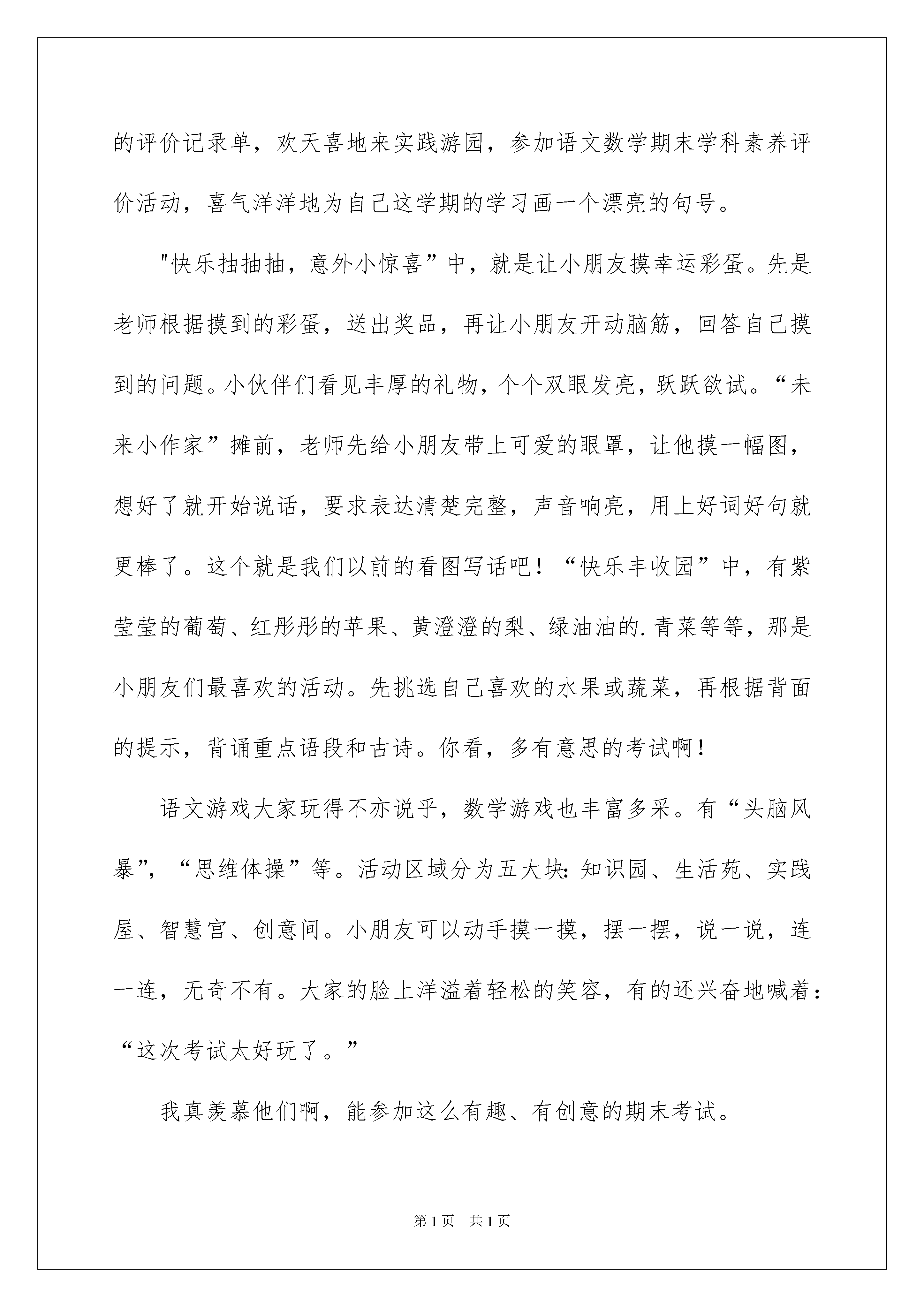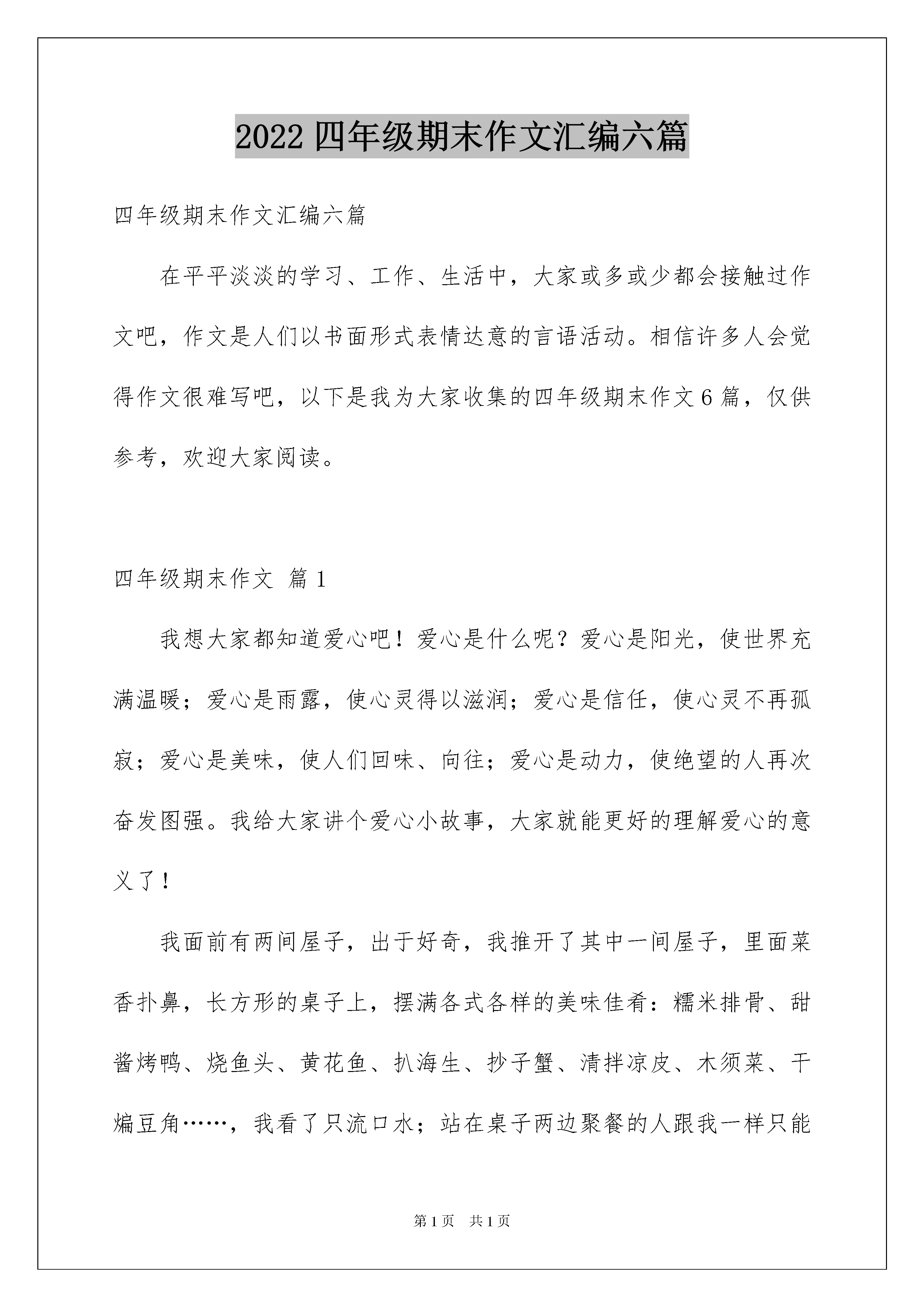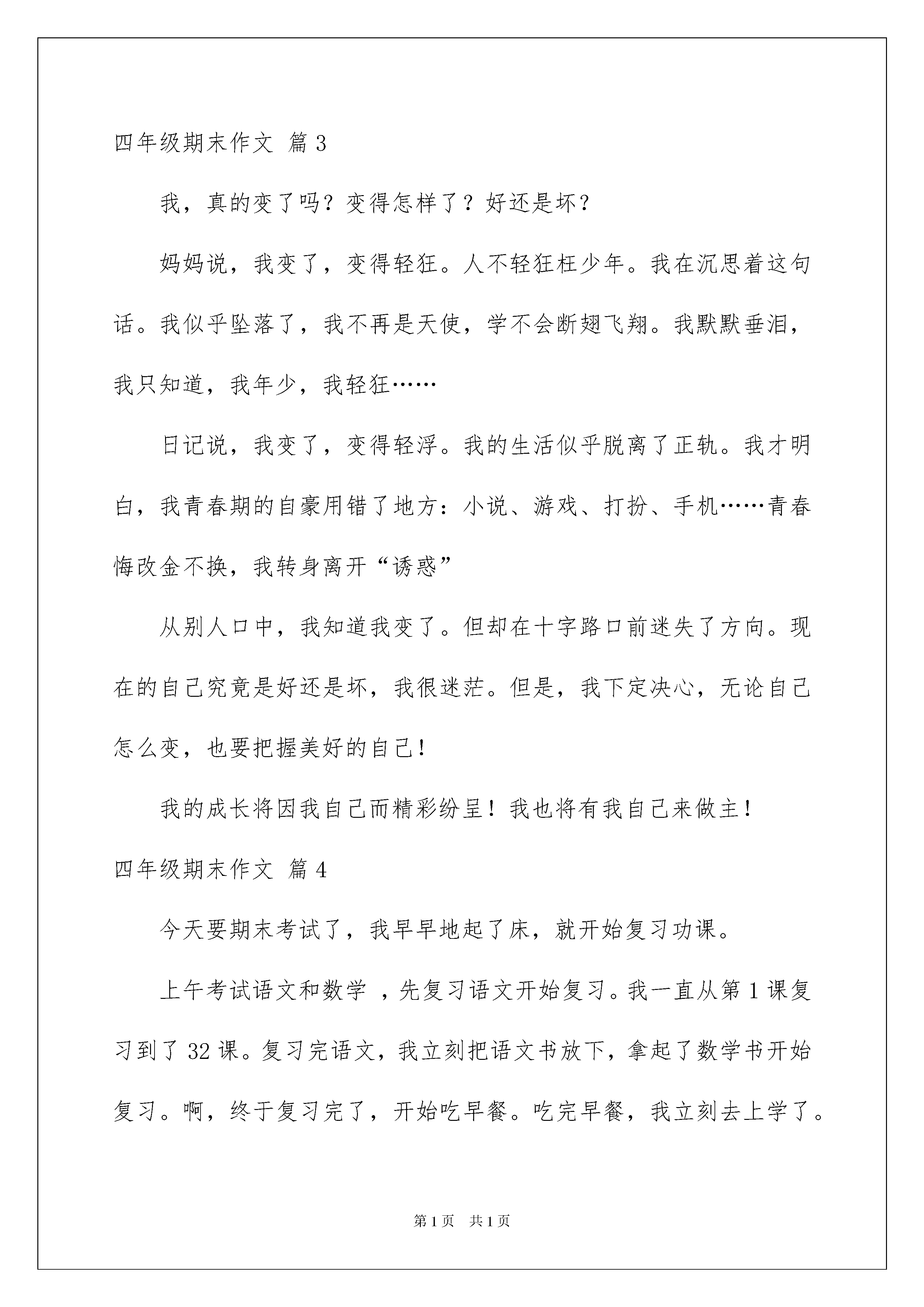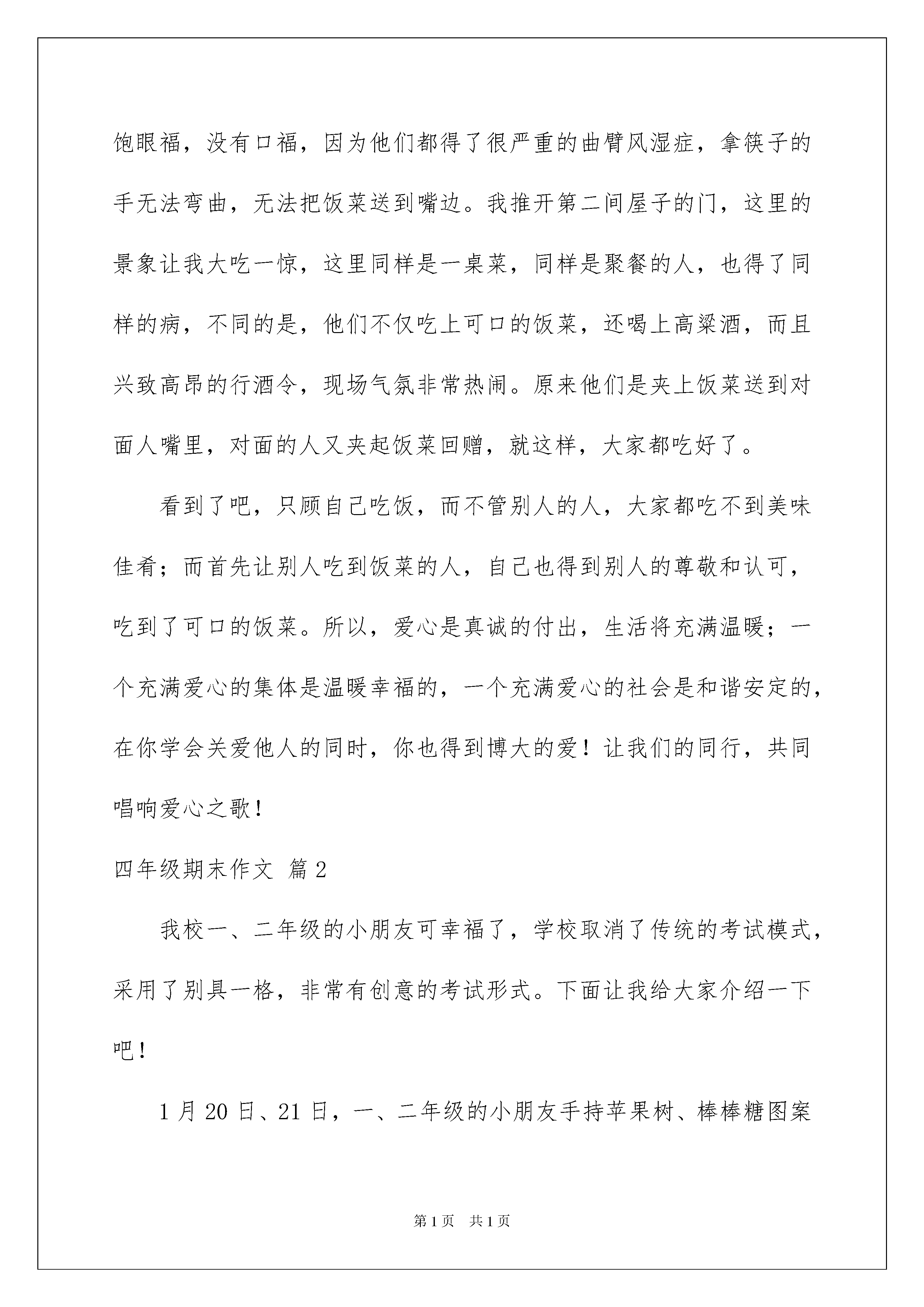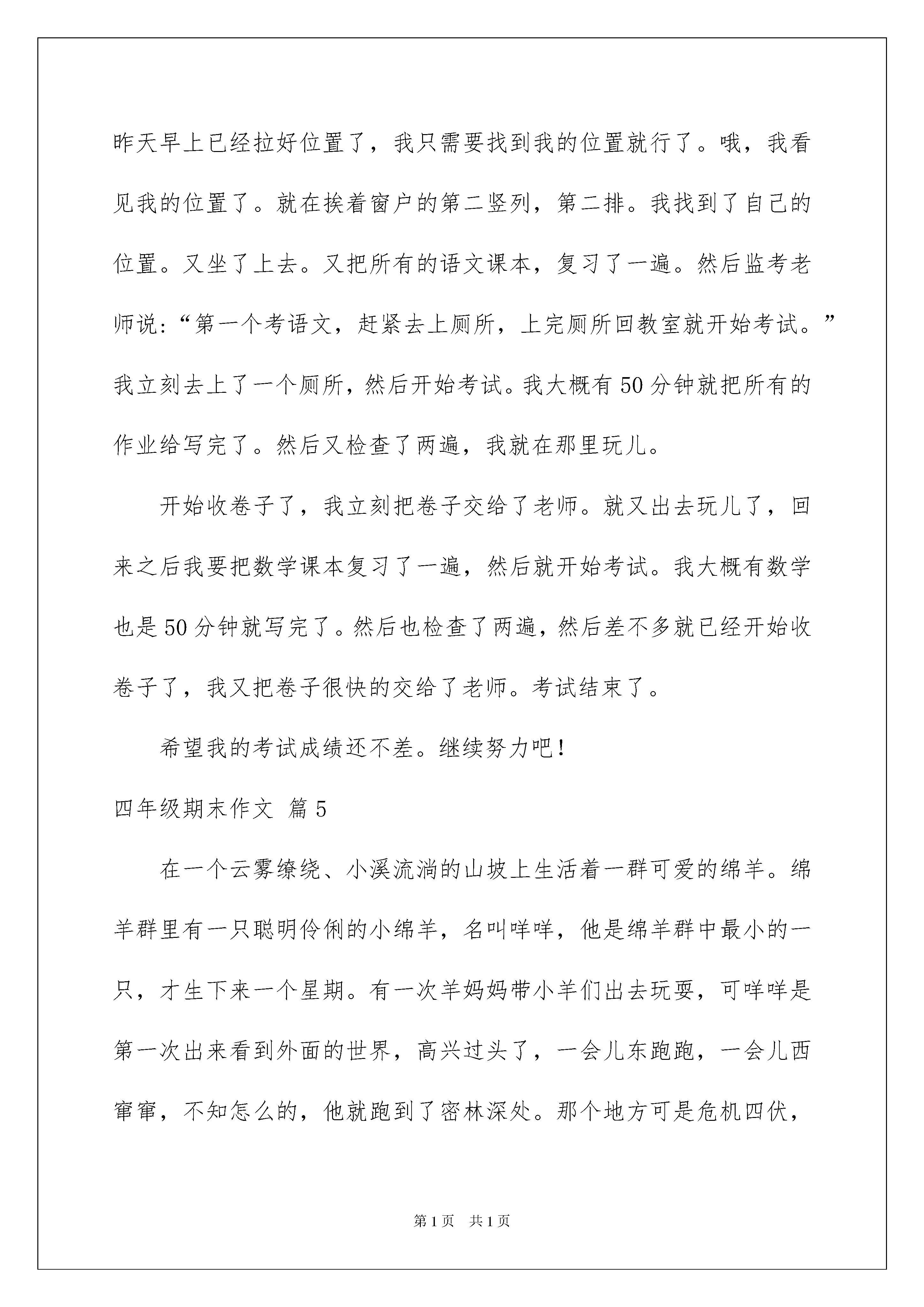 2022四年级期末作文汇编六篇四年级期末作文汇编六篇在平平淡淡的学习、工作、生活中,大家或多或少都会接触过作文吧,作文是人们以书面形式表情达意的言语活动。相信许多人会觉得作文很难写吧,以下是我为大家收集的四年级期末作文6篇,仅供参考,欢迎大家阅读。四年级期末作文篇1我想大家都知道爱心吧!爱心是什么呢?爱心是阳光,使世界充满温暖;爱心是雨露,使心灵得以滋润;爱心是信任,使心灵不再孤寂;爱心是美味,使人们回味、向往;爱心是动力,使绝望的人再次奋发图强。我给大家讲个爱心小故事,大家就能更好的理解爱心的意义了!我面前有两间屋子,出于好奇,我推开了其中一间屋子,里面菜香扑鼻,长方形的桌子上,摆满各式各样的美味佳肴:糯米排骨、甜酱烤鸭、烧鱼头、黄花鱼、扒海生、抄子蟹、清拌凉皮、木须菜、干煸豆角……,我看了只流口水;站在桌子两边聚餐的人跟我一样只能饱眼福,没有口福,因为他们都得了很严重的曲臂风湿症,拿筷子的手无法弯曲,无法把饭菜送到嘴边。我推开第二间屋子的门,这里的景象让我大吃一惊,这里同样是一桌菜,同样是聚餐的人,也得了同样的病,不同的是,他们不仅吃上可口的饭菜,还喝上高粱酒,而且兴致高昂的行酒令,现场气氛非常热闹。原来他们是夹上饭菜送到对面人嘴里,对面的人又夹起饭菜回赠,就这样,大家都吃好了。看到了吧,只顾自己吃饭,而不管别人的人,大家都吃不到美味佳肴;而首先让别人吃到饭菜的人,自己也得到别人的尊敬和认可,吃到了可口的饭菜。所以,爱心是真诚的付出,生活将充满温暖;一个充满爱心的集体是温暖幸福的,一个充满爱心的社会是和谐安定的,在你学会关爱他人的同时,你也得到博大的爱!让我们的同行,共同唱响爱心之歌!四年级期末作文篇2我校一、二年级的小朋友可幸福了,学校取消了传统的考试模式,采用了别具一格,非常有创意的考试形式。下面让我给大家介绍一下吧!1月20日、21日,一、二年级的小朋友手持苹果树、棒棒糖图案的评价记录单,欢天喜地来实践游园,参加语文数学期末学科素养评价活动,喜气洋洋地为自己这学期的学习画一个漂亮的句号。"快乐抽抽抽,意外小惊喜”中,就是让小朋友摸幸运彩蛋。先是老师根据摸到的彩蛋,送出奖品,再让小朋友开动脑筋,回答自己摸到的问题。小伙伴们看见丰厚的礼物,个个双眼发亮,跃跃欲试。“未来小作家”摊前,老师先给小朋友带上可爱的眼罩,让他摸一幅图,想好了就开始说话,要求表达清楚完整,声音响亮,用上好词好句就更棒了。这个就是我们以前的看图写话吧!“快乐丰收园”中,有紫莹莹的葡萄、红彤彤的苹果、黄澄澄的梨、绿油油的.青菜等等,那是小朋友们最喜欢的活动。先挑选自己喜欢的水果或蔬菜,再根据背面的提示,背诵重点语段和古诗。你看,多有意思的考试啊!语文游戏大家玩得不亦说乎,数学游戏也丰富多采。有“头脑风暴”,“思维体操”等。活动区域分为五大块:知识园、生活苑、实践屋、智慧宫、创意间。小朋友可以动手摸一摸,摆一摆,说一说,连一连,无奇不有。大家的脸上洋溢着轻松的笑容,有的还兴奋地喊着:“这次考试太好玩了。”我真羡慕他们啊,能参加这么有趣、有创意的期末考试。四年级期末作文篇3我,真的变了吗?变得怎样了?好还是坏?妈妈说,我变了,变得轻狂。人不轻狂枉少年。我在沉思着这句话。我似乎坠落了,我不再是天使,学不会断翅飞翔。我默默垂泪,我只知道,我年少,我轻狂……日记说,我变了,变得轻浮。我的生活似乎脱离了正轨。我才明白,我青春期的自豪用错了地方:小说、游戏、打扮、手机……青春悔改金不换,我转身离开“诱惑”从别人口中,我知道我变了。但却在十字路口前迷失了方向。现在的自己究竟是好还是坏,我很迷茫。但是,我下定决心,无论自己怎么变,也要把握美好的自己!我的成长将因我自己而精彩纷呈!我也将有我自己来做主!四年级期末作文篇4今天要期末考试了,我早早地起了床,就开始复习功课。上午考试语文和数学,先复习语文开始复习。我一直从第1课复习到了32课。复习完语文,我立刻把语文书放下,拿起了数学书开始复习。啊,终于复习完了,开始吃早餐。吃完早餐,我立刻去上学了。昨天早上已经拉好位置了,我只需要找到我的位置就行了。哦,我看见我的位置了。就在挨着窗户的第二竖列,第二排。我找到了自己的位置。又坐了上去。又把所有的语文课本,复习了一遍。然后监考老师说:“第一个考语文,赶紧去上厕所,上完厕所回教室就开始考试。”我立刻去上了一个厕所,然后开始考试。我大概有50分钟就把所有的作业给写完了。然后又检查了两遍,我就在那里玩儿。开始收卷子了,我立刻把卷子交给了老师。就又出去玩儿了,回来之后我要把数学课本复习了一遍,然后就开始考试。我大概有数学也是50分