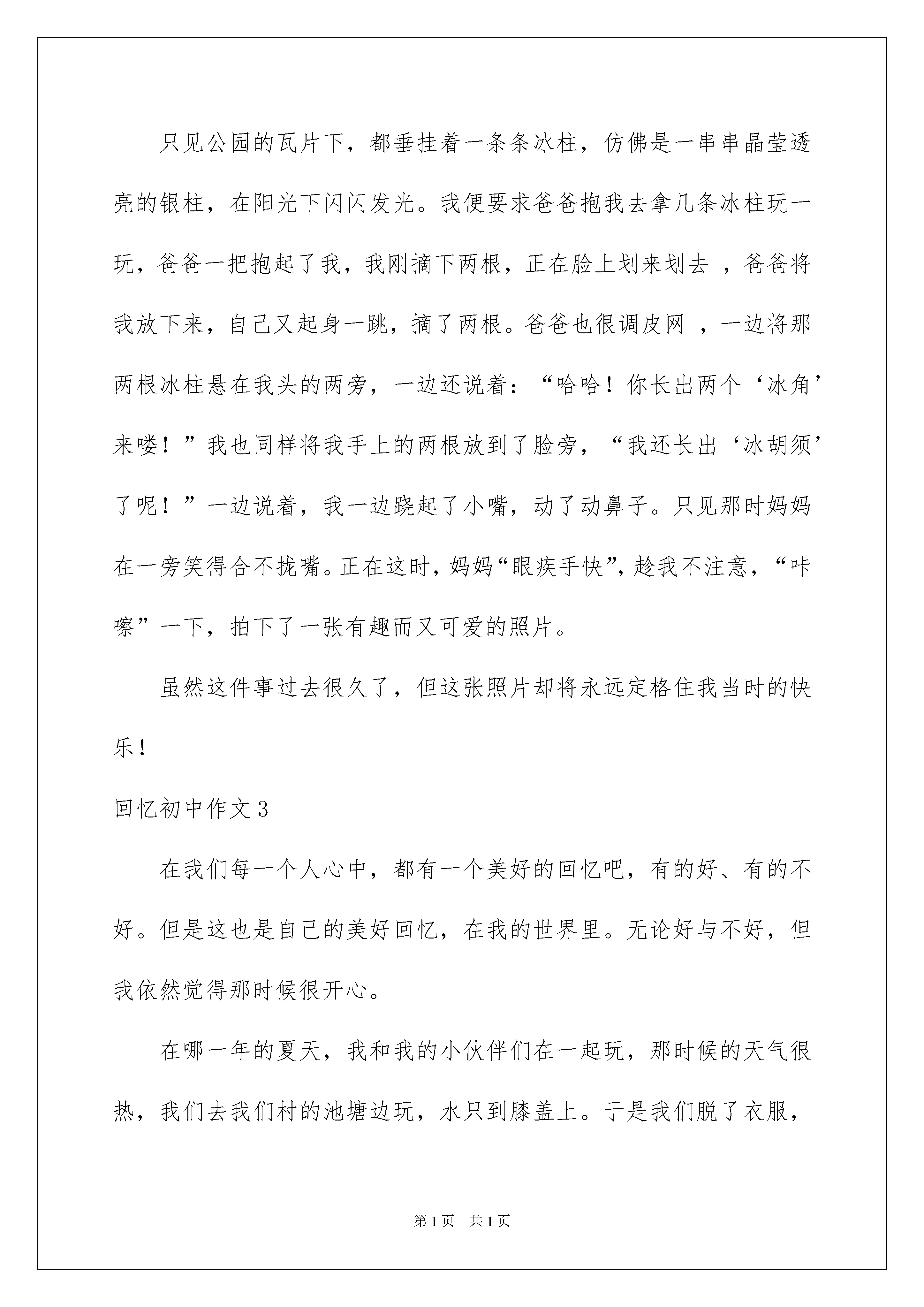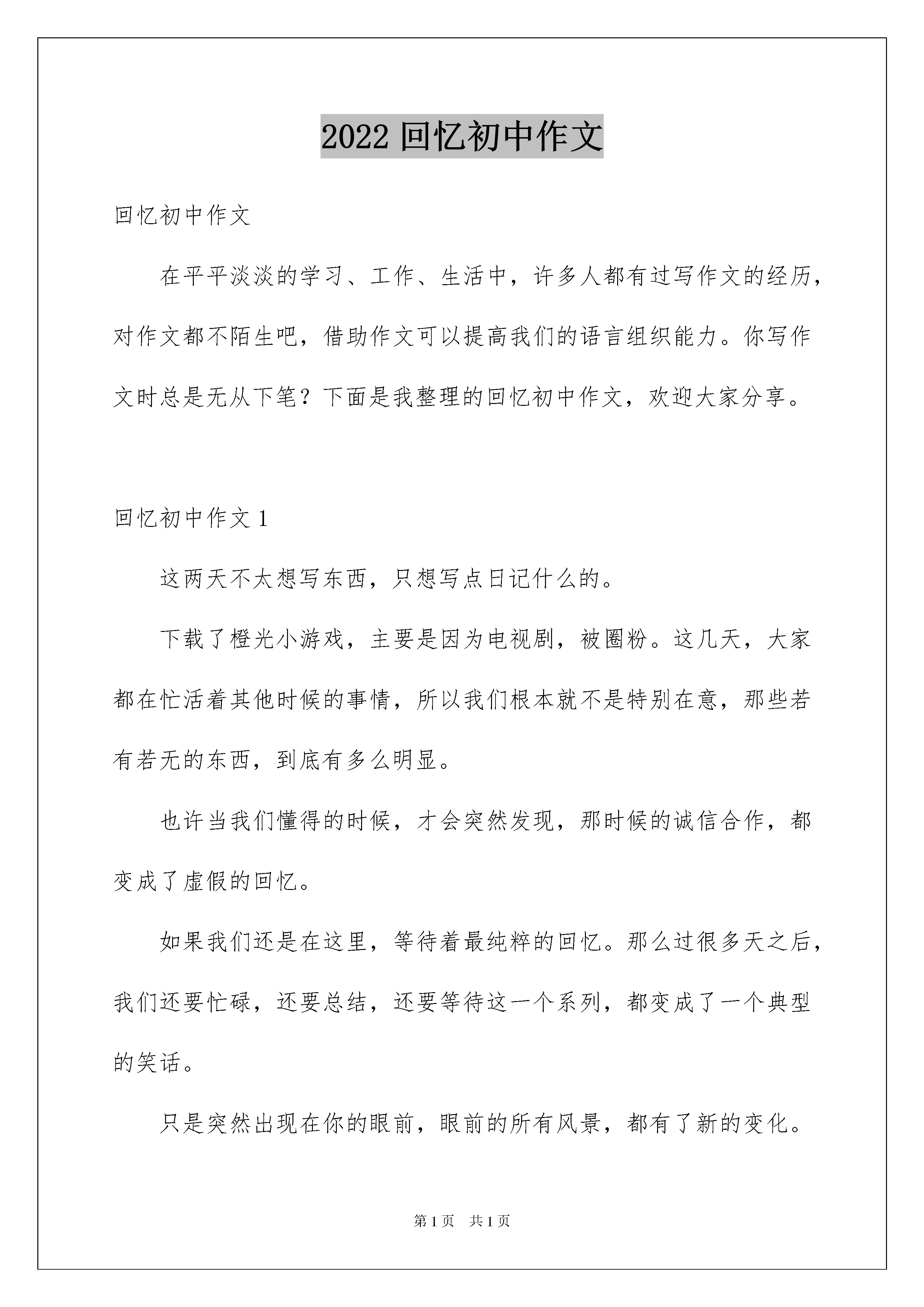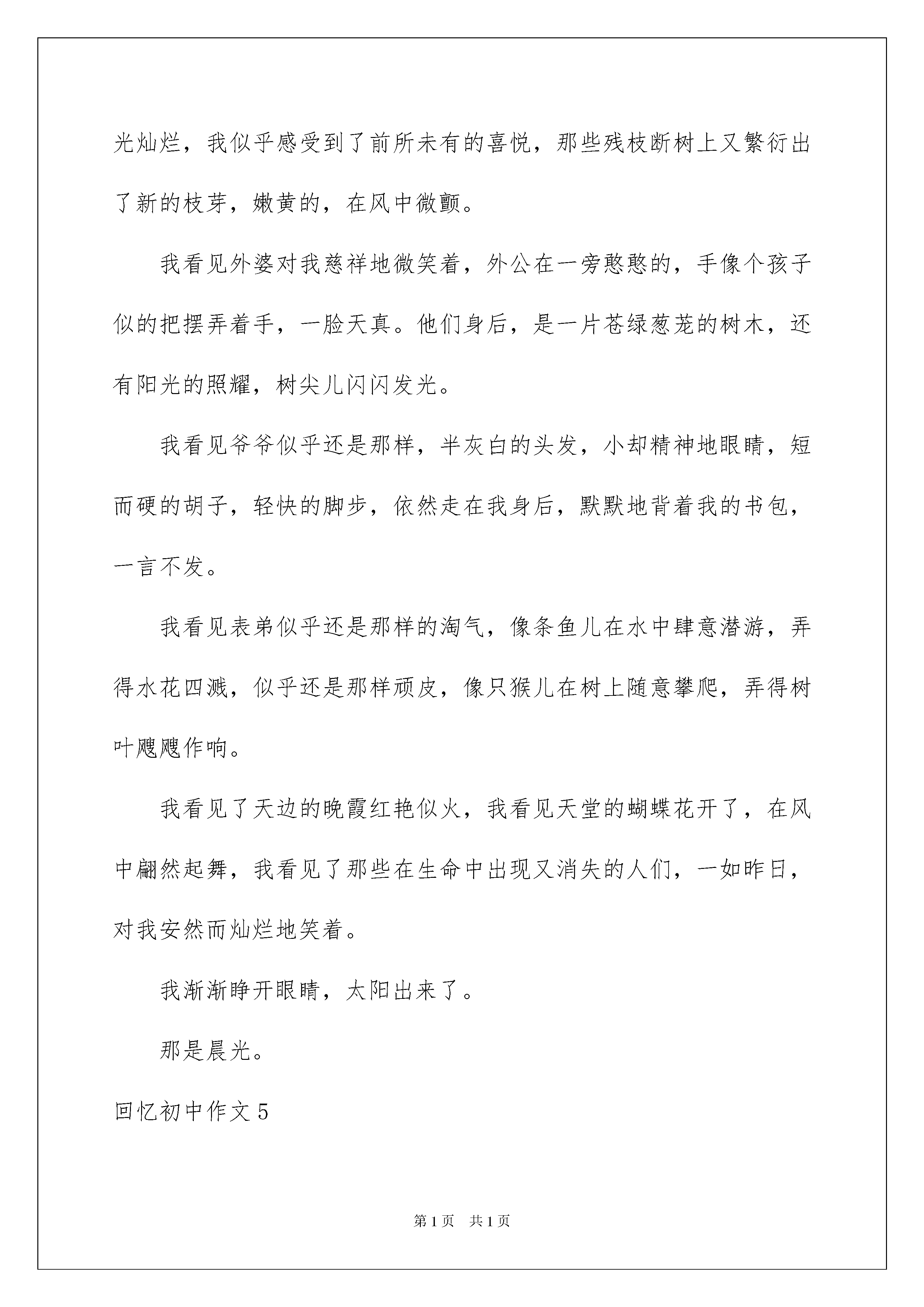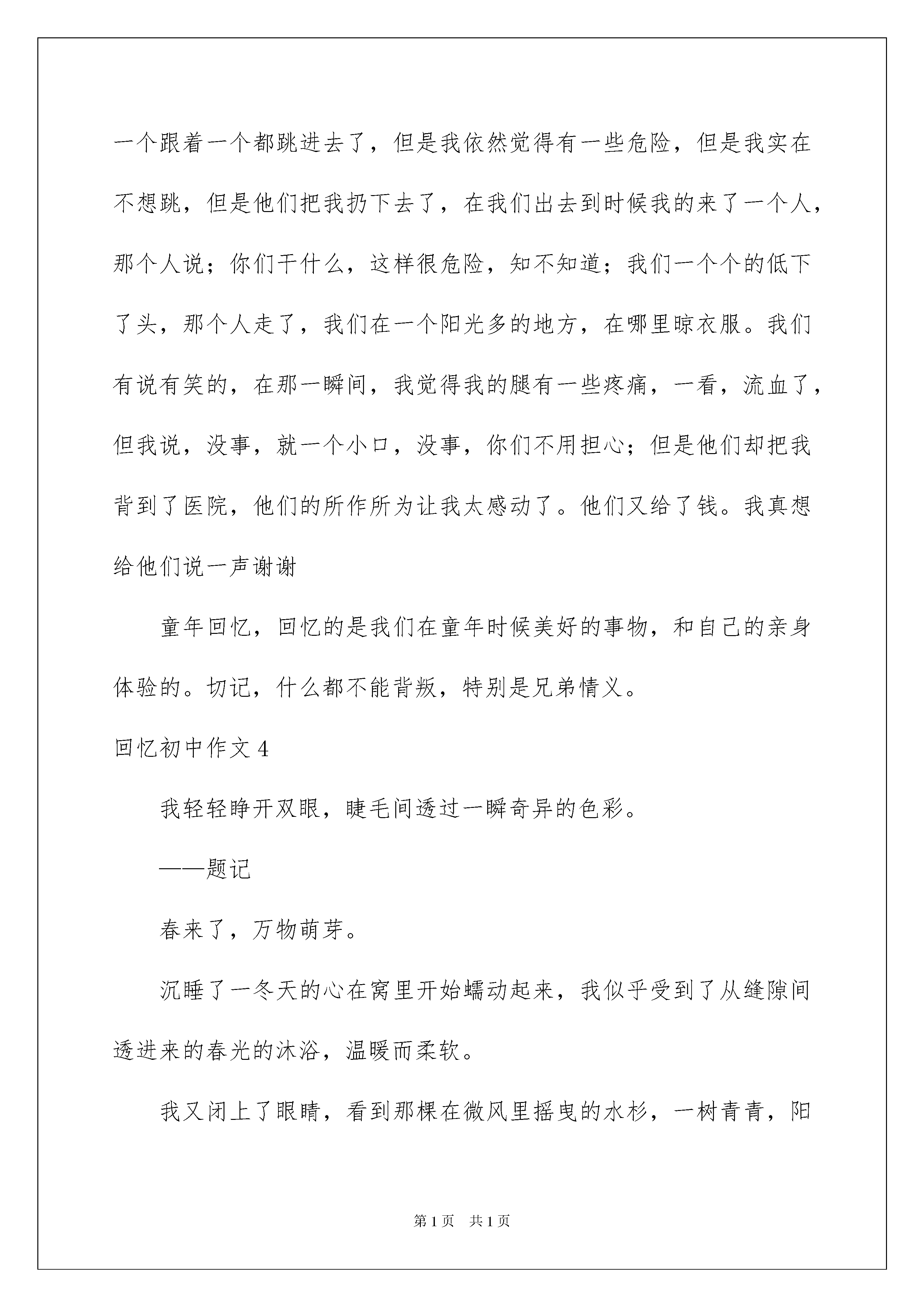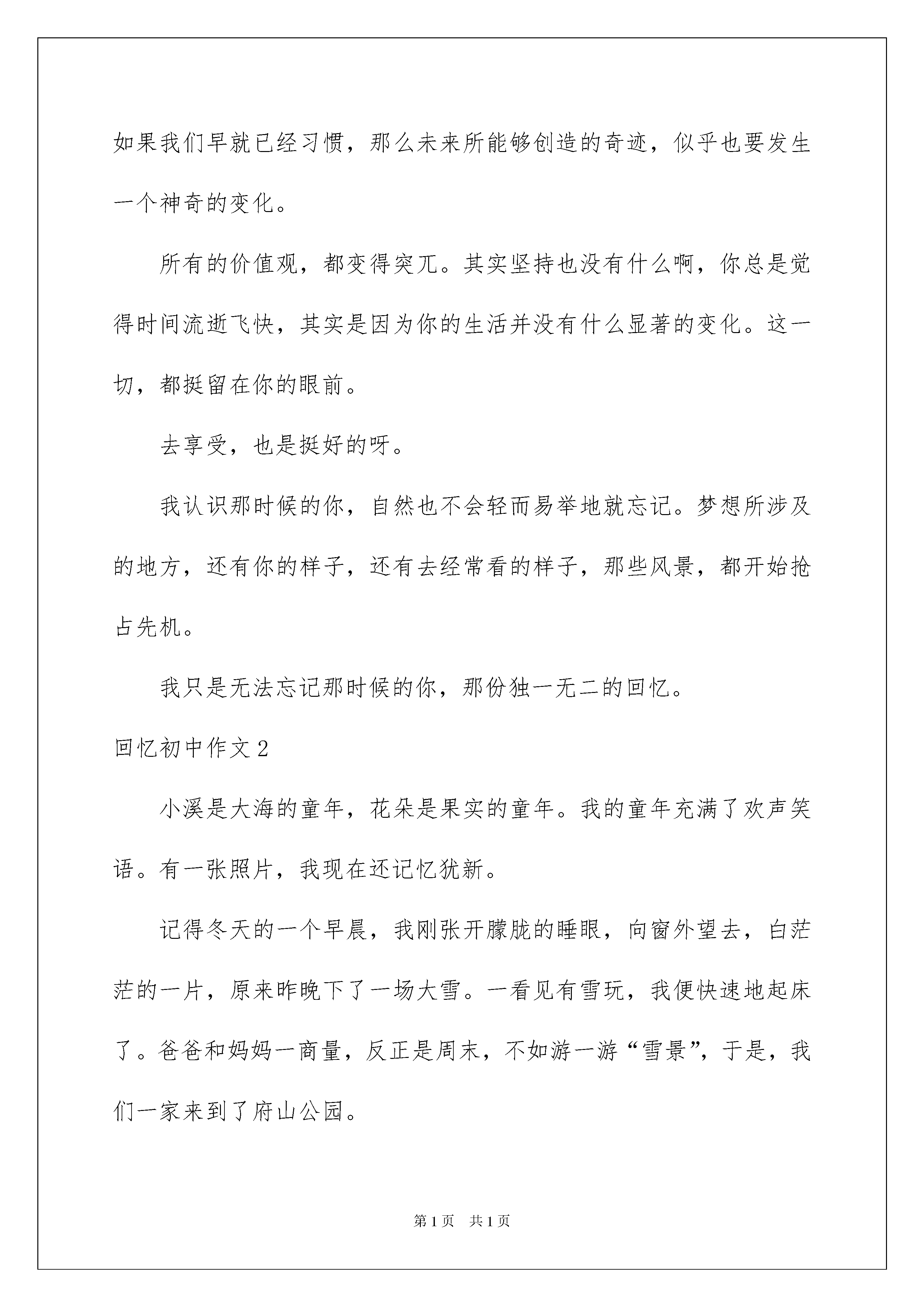 2022回忆初中作文回忆初中作文在平平淡淡的学习、工作、生活中,许多人都有过写作文的经历,对作文都不陌生吧,借助作文可以提高我们的语言组织能力。你写作文时总是无从下笔?下面是我整理的回忆初中作文,欢迎大家分享。回忆初中作文1这两天不太想写东西,只想写点日记什么的。下载了橙光小游戏,主要是因为电视剧,被圈粉。这几天,大家都在忙活着其他时候的事情,所以我们根本就不是特别在意,那些若有若无的东西,到底有多么明显。也许当我们懂得的时候,才会突然发现,那时候的诚信合作,都变成了虚假的回忆。如果我们还是在这里,等待着最纯粹的回忆。那么过很多天之后,我们还要忙碌,还要总结,还要等待这一个系列,都变成了一个典型的笑话。只是突然出现在你的眼前,眼前的所有风景,都有了新的变化。如果我们早就已经习惯,那么未来所能够创造的奇迹,似乎也要发生一个神奇的变化。所有的价值观,都变得突兀。其实坚持也没有什么啊,你总是觉得时间流逝飞快,其实是因为你的生活并没有什么显著的变化。这一切,都挺留在你的眼前。去享受,也是挺好的呀。我认识那时候的你,自然也不会轻而易举地就忘记。梦想所涉及的地方,还有你的样子,还有去经常看的样子,那些风景,都开始抢占先机。我只是无法忘记那时候的你,那份独一无二的回忆。回忆初中作文2小溪是大海的童年,花朵是果实的童年。我的童年充满了欢声笑语。有一张照片,我现在还记忆犹新。记得冬天的一个早晨,我刚张开朦胧的睡眼,向窗外望去,白茫茫的一片,原来昨晚下了一场大雪。一看见有雪玩,我便快速地起床了。爸爸和妈妈一商量,反正是周末,不如游一游“雪景”,于是,我们一家来到了府山公园。只见公园的瓦片下,都垂挂着一条条冰柱,仿佛是一串串晶莹透亮的银柱,在阳光下闪闪发光。我便要求爸爸抱我去拿几条冰柱玩一玩,爸爸一把抱起了我,我刚摘下两根,正在脸上划来划去,爸爸将我放下来,自己又起身一跳,摘了两根。爸爸也很调皮网,一边将那两根冰柱悬在我头的两旁,一边还说着:“哈哈!你长出两个‘冰角’来喽!”我也同样将我手上的两根放到了脸旁,“我还长出‘冰胡须’了呢!”一边说着,我一边跷起了小嘴,动了动鼻子。只见那时妈妈在一旁笑得合不拢嘴。正在这时,妈妈“眼疾手快”,趁我不注意,“咔嚓”一下,拍下了一张有趣而又可爱的照片。虽然这件事过去很久了,但这张照片却将永远定格住我当时的快乐!回忆初中作文3在我们每一个人心中,都有一个美好的回忆吧,有的好、有的不好。但是这也是自己的美好回忆,在我的世界里。无论好与不好,但我依然觉得那时候很开心。在哪一年的夏天,我和我的小伙伴们在一起玩,那时候的天气很热,我们去我们村的池塘边玩,水只到膝盖上。于是我们脱了衣服,一个跟着一个都跳进去了,但是我依然觉得有一些危险,但是我实在不想跳,但是他们把我扔下去了,在我们出去到时候我的来了一个人,那个人说;你们干什么,这样很危险,知不知道;我们一个个的低下了头,那个人走了,我们在一个阳光多的地方,在哪里晾衣服。我们有说有笑的,在那一瞬间,我觉得我的腿有一些疼痛,一看,流血了,但我说,没事,就一个小口,没事,你们不用担心;但是他们却把我背到了医院,他们的所作所为让我太感动了。他们又给了钱。我真想给他们说一声谢谢童年回忆,回忆的是我们在童年时候美好的事物,和自己的亲身体验的。切记,什么都不能背叛,特别是兄弟情义。回忆初中作文4我轻轻睁开双眼,睫毛间透过一瞬奇异的色彩。——题记春来了,万物萌芽。沉睡了一冬天的心在窝里开始蠕动起来,我似乎受到了从缝隙间透进来的春光的沐浴,温暖而柔软。我又闭上了眼睛,看到那棵在微风里摇曳的水杉,一树青青,阳光灿烂,我似乎感受到了前所未有的喜悦,那些残枝断树上又繁衍出了新的枝芽,嫩黄的,在风中微颤。我看见外婆对我慈祥地微笑着,外公在一旁憨憨的,手像个孩子似的把摆弄着手,一脸天真。他们身后,是一片苍绿葱茏的树木,还有阳光的照耀,树尖儿闪闪发光。我看见爷爷似乎还是那样,半灰白的头发,小却精神地眼睛,短而硬的胡子,轻快的脚步,依然走在我身后,默默地背着我的书包,一言不发。我看见表弟似乎还是那样的淘气,像条鱼儿在水中肆意潜游,弄得水花四溅,似乎还是那样顽皮,像只猴儿在树上随意攀爬,弄得树叶飕飕作响。我看见了天边的晚霞红艳似火,我看见天堂的蝴蝶花开了,在风中翩然起舞,我看见了那些在生命中出现又消失的人们,一如昨日,对我安然而灿烂地笑着。我渐渐睁开眼睛,太阳出来了。那是晨光。回忆初中作文5“朔风中,飘着雪花朵朵,如可爱的精灵,挽这冬爷爷的手。“此时虽已到了冬季,但天空似乎没有一点下雪的意思,这使我不由得想起了去年冬天时的情景。记得一次冬天,我刚一睁