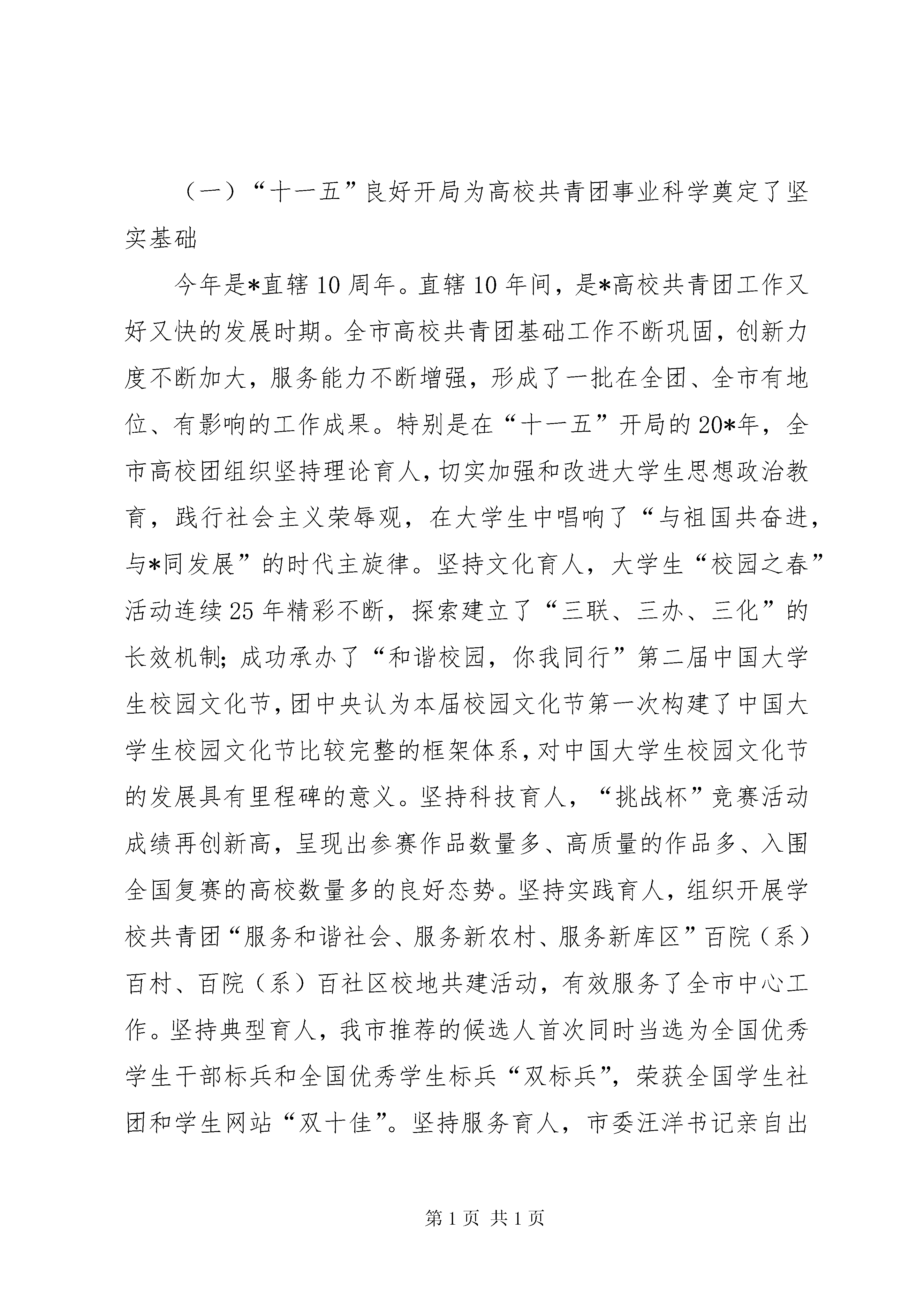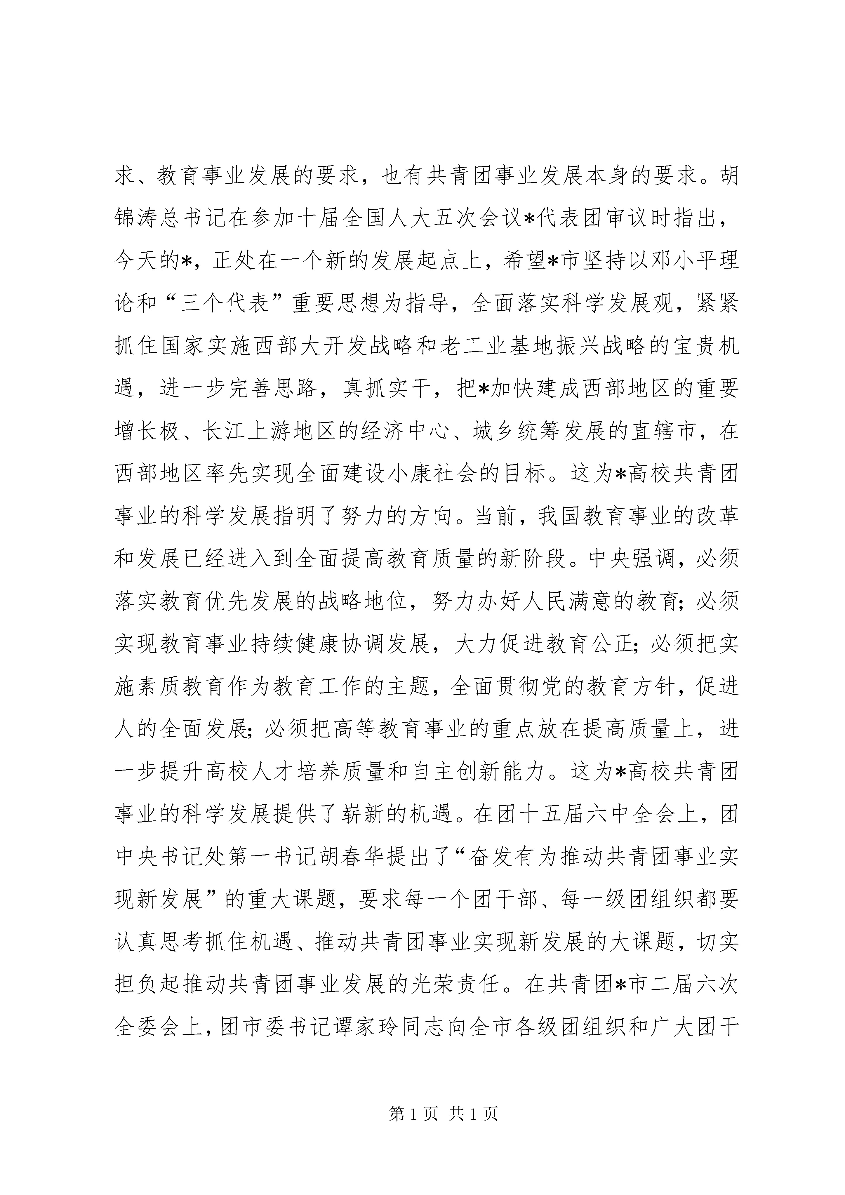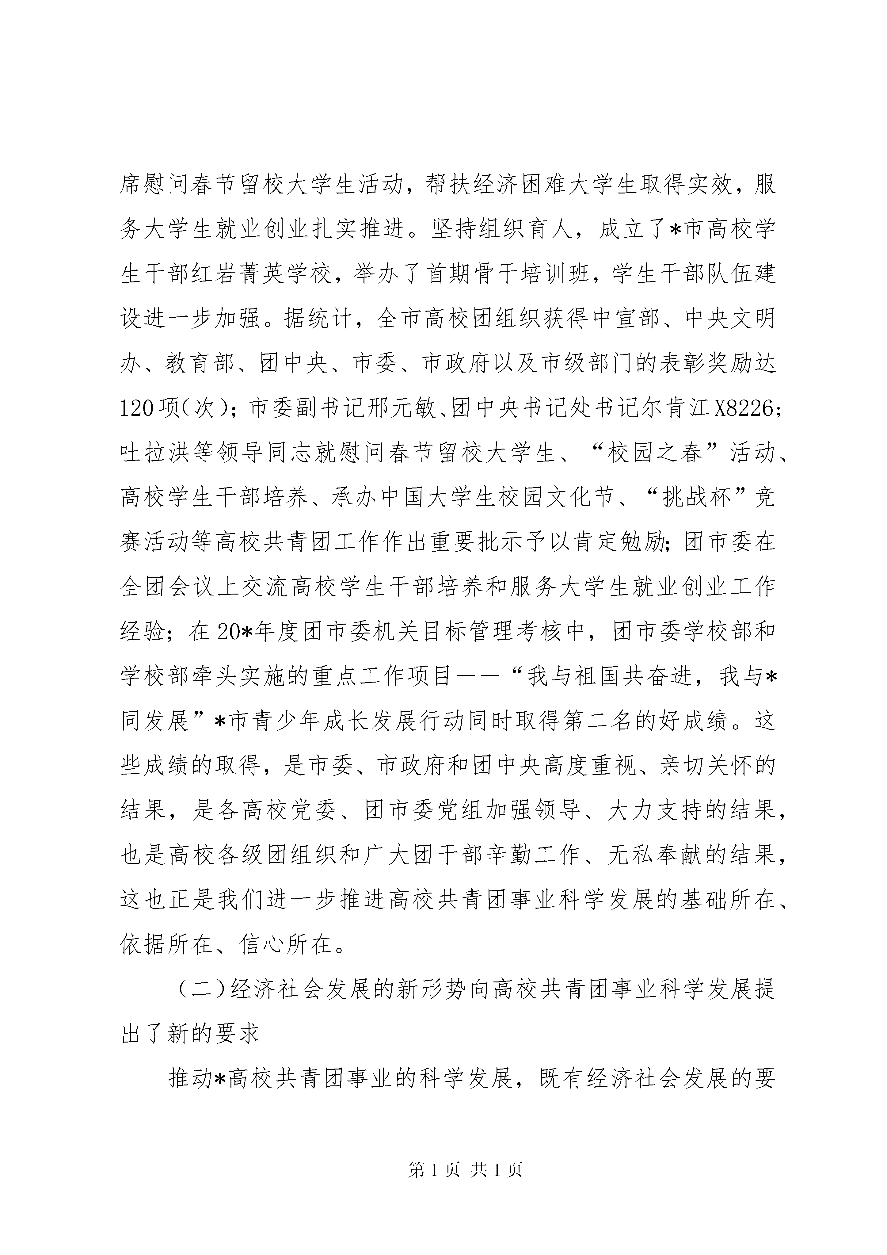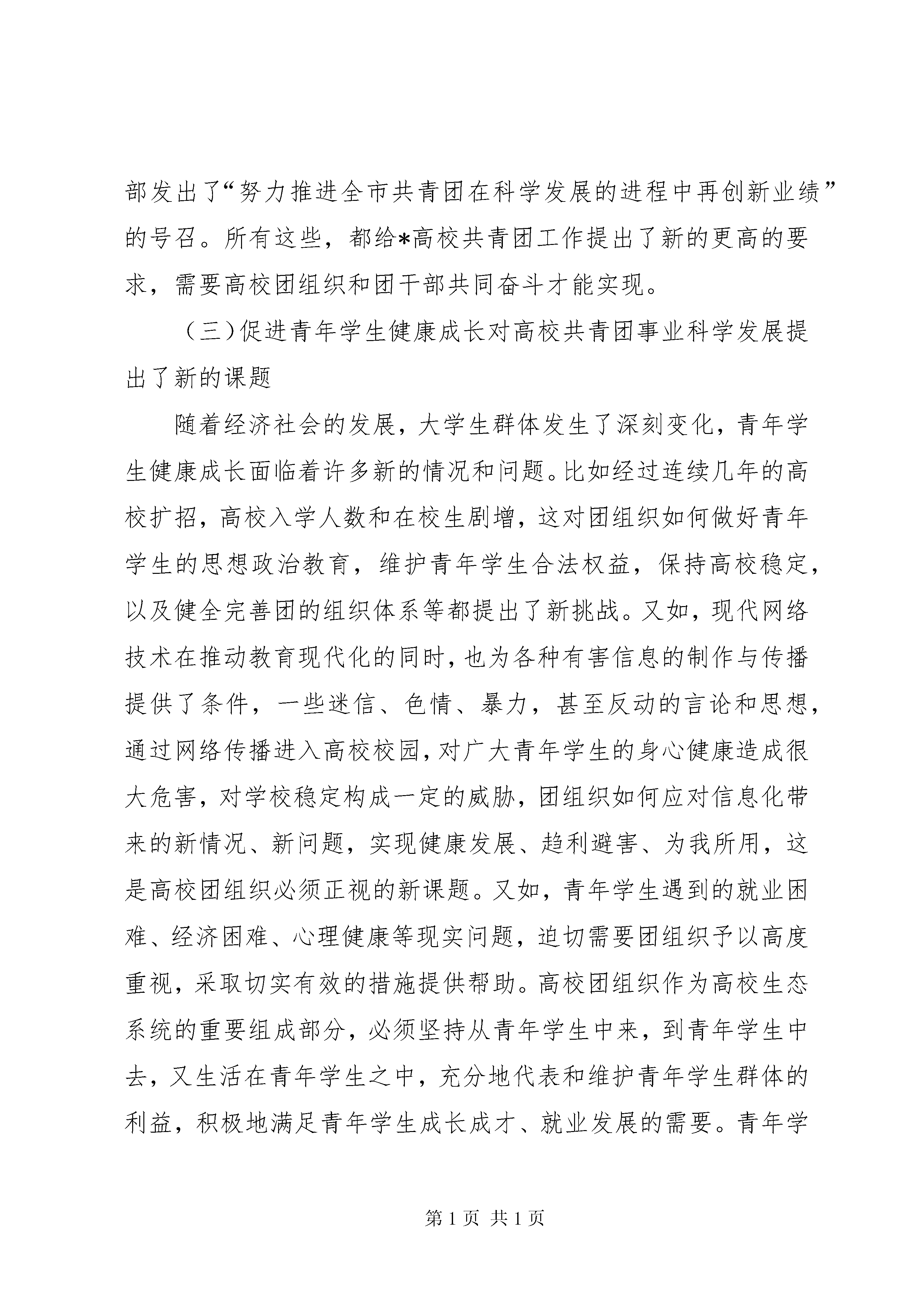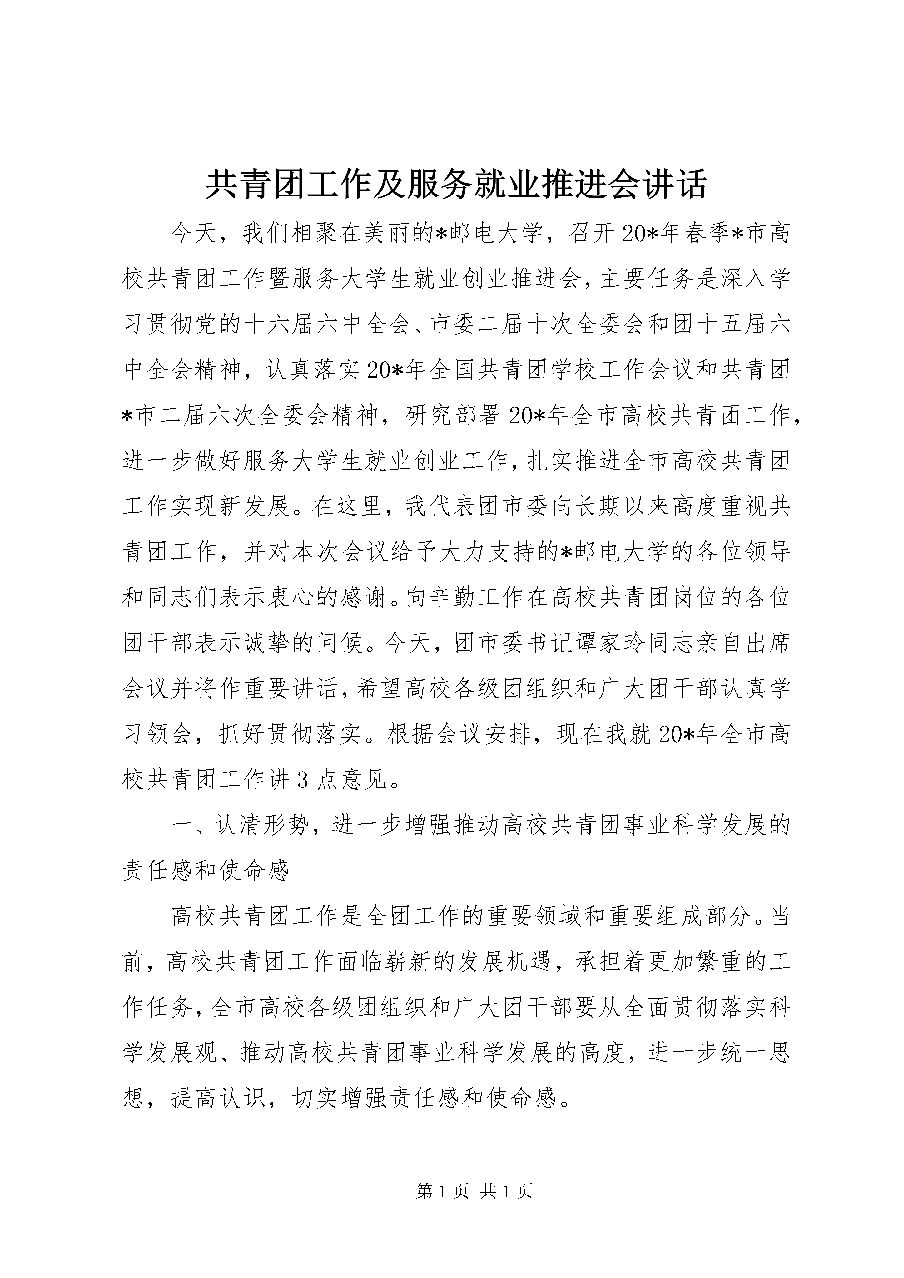 共青团工作及服务就业推进会讲话今天,我们相聚在美丽的*邮电大学,召开20*年春季*市高校共青团工作暨服务大学生就业创业推进会,主要任务是深入学习贯彻党的十六届六中全会、市委二届十次全委会和团十五届六中全会精神,认真落实20*年全国共青团学校工作会议和共青团*市二届六次全委会精神,研究部署20*年全市高校共青团工作,进一步做好服务大学生就业创业工作,扎实推进全市高校共青团工作实现新发展。在这里,我代表团市委向长期以来高度重视共青团工作,并对本次会议给予大力支持的*邮电大学的各位领导和同志们表示衷心的感谢。向辛勤工作在高校共青团岗位的各位团干部表示诚挚的问候。今天,团市委书记谭家玲同志亲自出席会议并将作重要讲话,希望高校各级团组织和广大团干部认真学习领会,抓好贯彻落实。根据会议安排,现在我就20*年全市高校共青团工作讲3点意见。一、认清形势,进一步增强推动高校共青团事业科学发展的责任感和使命感高校共青团工作是全团工作的重要领域和重要组成部分。当前,高校共青团工作面临崭新的发展机遇,承担着更加繁重的工作任务,全市高校各级团组织和广大团干部要从全面贯彻落实科学发展观、推动高校共青团事业科学发展的高度,进一步统一思想,提高认识,切实增强责任感和使命感。(一)“十一五”良好开局为高校共青团事业科学奠定了坚实基础今年是*直辖10周年。直辖10年间,是*高校共青团工作又好又快的发展时期。全市高校共青团基础工作不断巩固,创新力度不断加大,服务能力不断增强,形成了一批在全团、全市有地位、有影响的工作成果。特别是在“十一五”开局的20*年,全市高校团组织坚持理论育人,切实加强和改进大学生思想政治教育,践行社会主义荣辱观,在大学生中唱响了“与祖国共奋进,与*同发展”的时代主旋律。坚持文化育人,大学生“校园之春”活动连续25年精彩不断,探索建立了“三联、三办、三化”的长效机制;成功承办了“和谐校园,你我同行”第二届中国大学生校园文化节,团中央认为本届校园文化节第一次构建了中国大学生校园文化节比较完整的框架体系,对中国大学生校园文化节的发展具有里程碑的意义。坚持科技育人,“挑战杯”竞赛活动成绩再创新高,呈现出参赛作品数量多、高质量的作品多、入围全国复赛的高校数量多的良好态势。坚持实践育人,组织开展学校共青团“服务和谐社会、服务新农村、服务新库区”百院(系)百村、百院(系)百社区校地共建活动,有效服务了全市中心工作。坚持典型育人,我市推荐的候选人首次同时当选为全国优秀学生干部标兵和全国优秀学生标兵“双标兵”,荣获全国学生社团和学生网站“双十佳”。坚持服务育人,市委汪洋书记亲自出席慰问春节留校大学生活动,帮扶经济困难大学生取得实效,服务大学生就业创业扎实推进。坚持组织育人,成立了*市高校学生干部红岩菁英学校,举办了首期骨干培训班,学生干部队伍建设进一步加强。据统计,全市高校团组织获得中宣部、中央文明办、教育部、团中央、市委、市政府以及市级部门的表彰奖励达120项(次);市委副书记邢元敏、团中央书记处书记尔肯江X8226;吐拉洪等领导同志就慰问春节留校大学生、“校园之春”活动、高校学生干部培养、承办中国大学生校园文化节、“挑战杯”竞赛活动等高校共青团工作作出重要批示予以肯定勉励;团市委在全团会议上交流高校学生干部培养和服务大学生就业创业工作经验;在20*年度团市委机关目标管理考核中,团市委学校部和学校部牵头实施的重点工作项目――“我与祖国共奋进,我与*同发展”*市青少年成长发展行动同时取得第二名的好成绩。这些成绩的取得,是市委、市政府和团中央高度重视、亲切关怀的结果,是各高校党委、团市委党组加强领导、大力支持的结果,也是高校各级团组织和广大团干部辛勤工作、无私奉献的结果,这也正是我们进一步推进高校共青团事业科学发展的基础所在、依据所在、信心所在。(二)经济社会发展的新形势向高校共青团事业科学发展提出了新的要求推动*高校共青团事业的科学发展,既有经济社会发展的要求、教育事业发展的要求,也有共青团事业发展本身的要求。胡锦涛总书记在参加十届全国人大五次会议*代表团审议时指出,今天的*,正处在一个新的发展起点上,希望*市坚持以邓小平理论和“三个代表”重要思想为指导,全面落实科学发展观,紧紧抓住国家实施西部大开发战略和老工业基地振兴战略的宝贵机遇,进一步完善思路,真抓实干,把*加快建成西部地区的重要增长极、长江上游地区的经济中心、城乡统筹发展的直辖市,在西部地区率先实现全面建设小康社会的目标。这为*高校共青团事业的科学发展指明了努力的方向。当前,我国教育事业的改革和发展已经进入到全面提高教育质量的新阶段。中央强调,必须落实教育优先发展的战略地位,努力办好人民满意的教育;必须实现教育事业持续健康协调发展,大力促进教育公正;必须把实施素质教育作为教