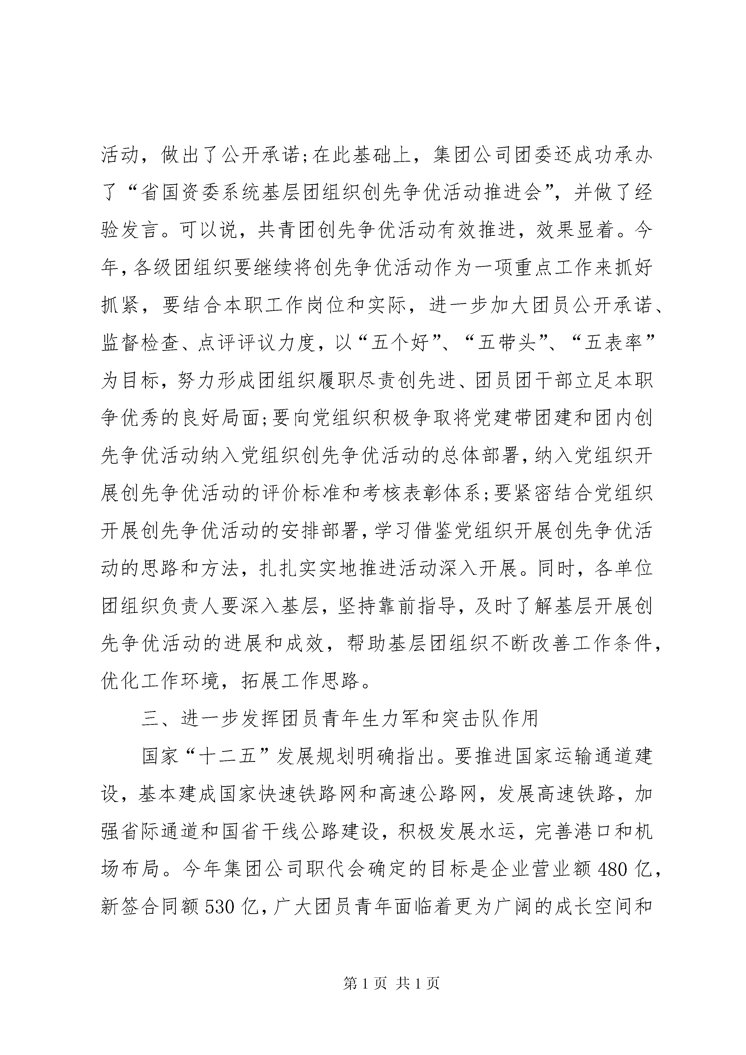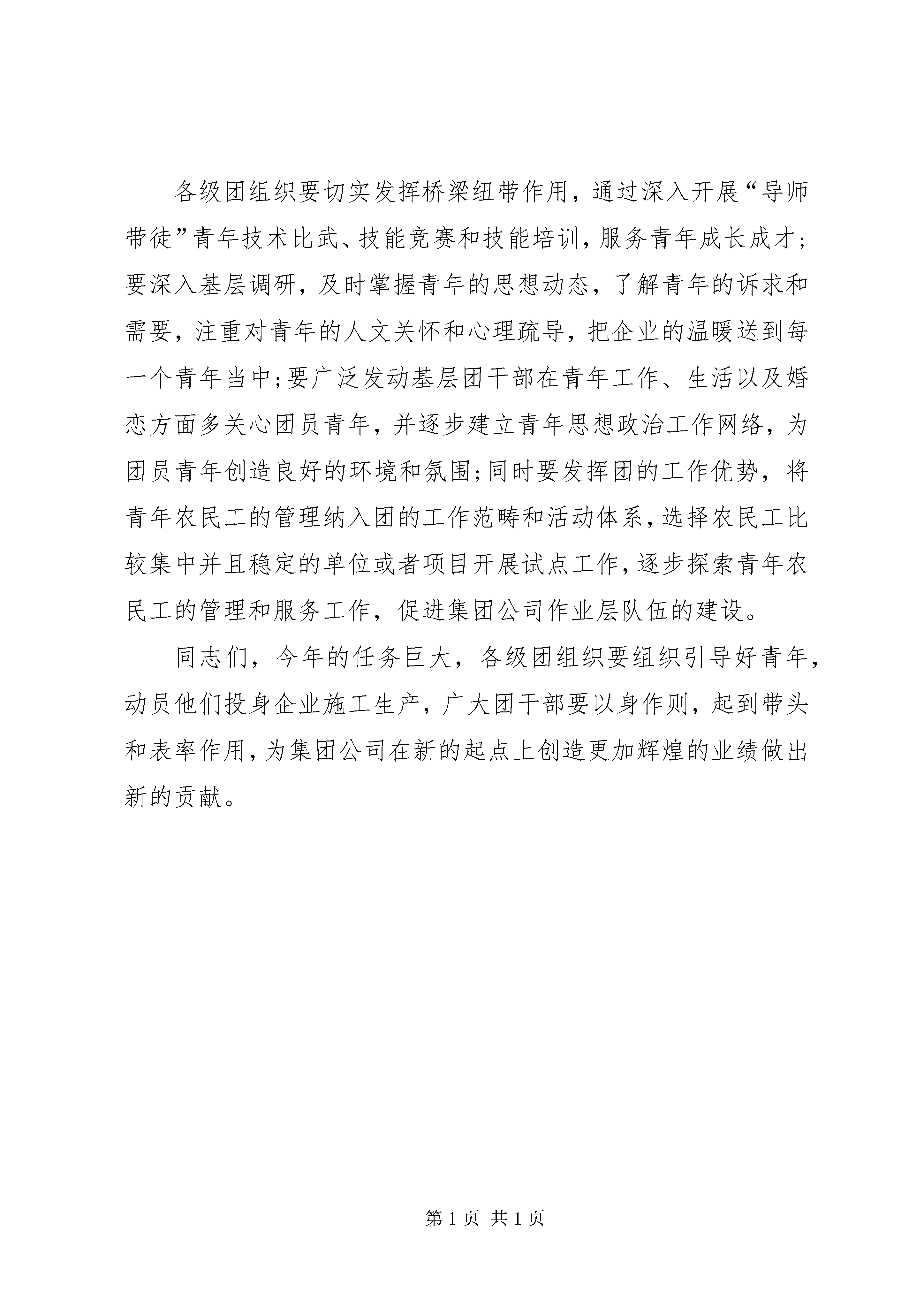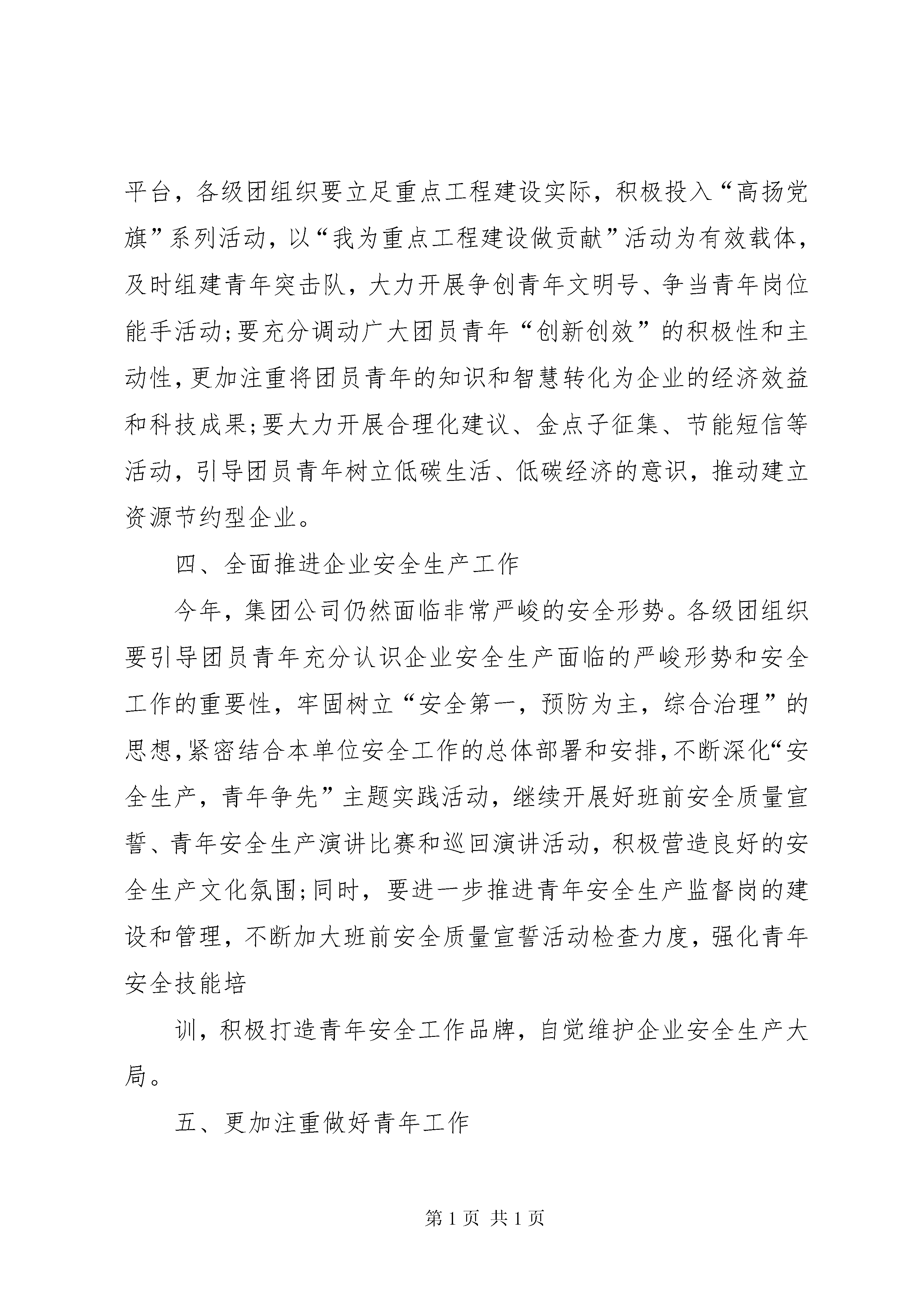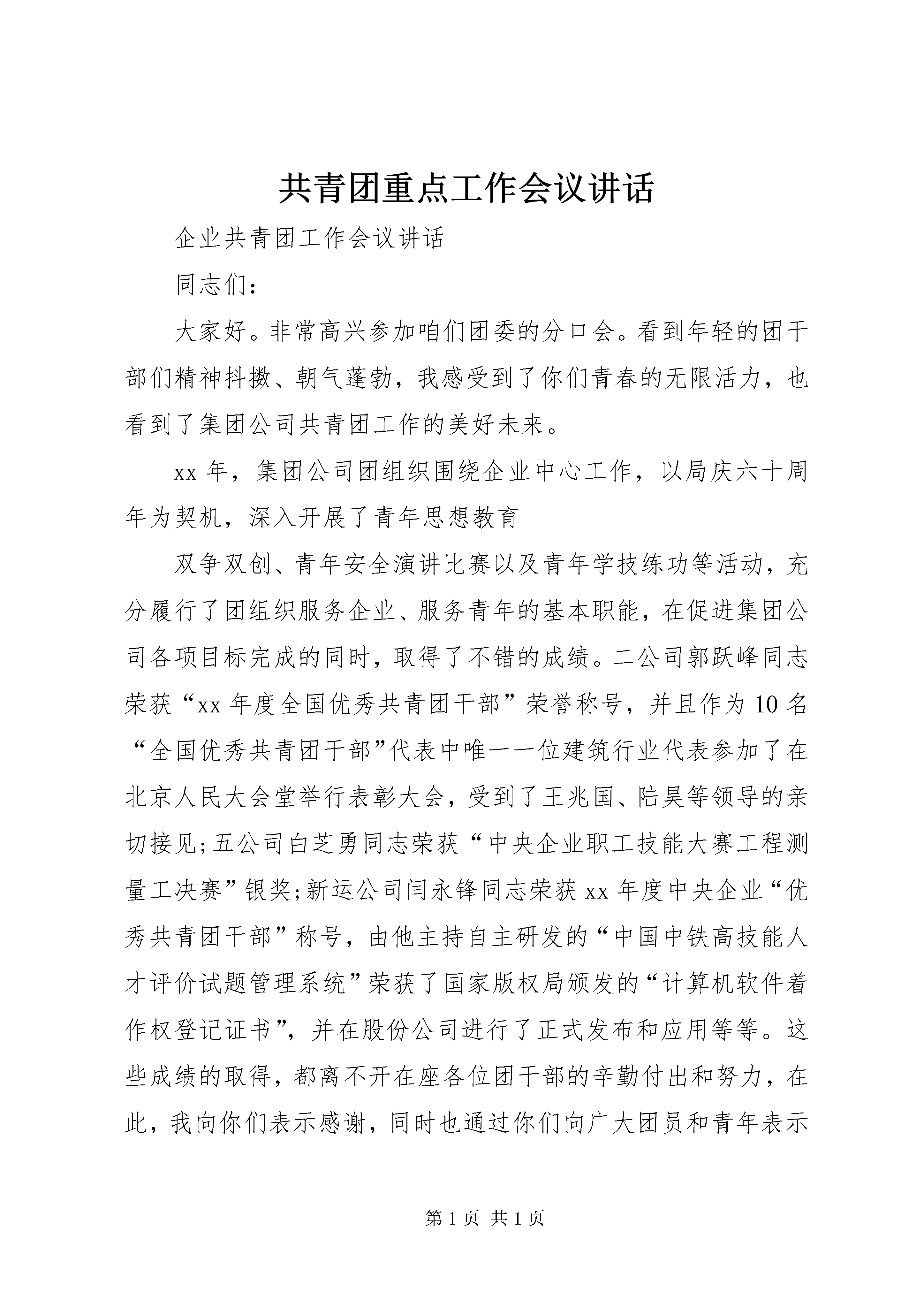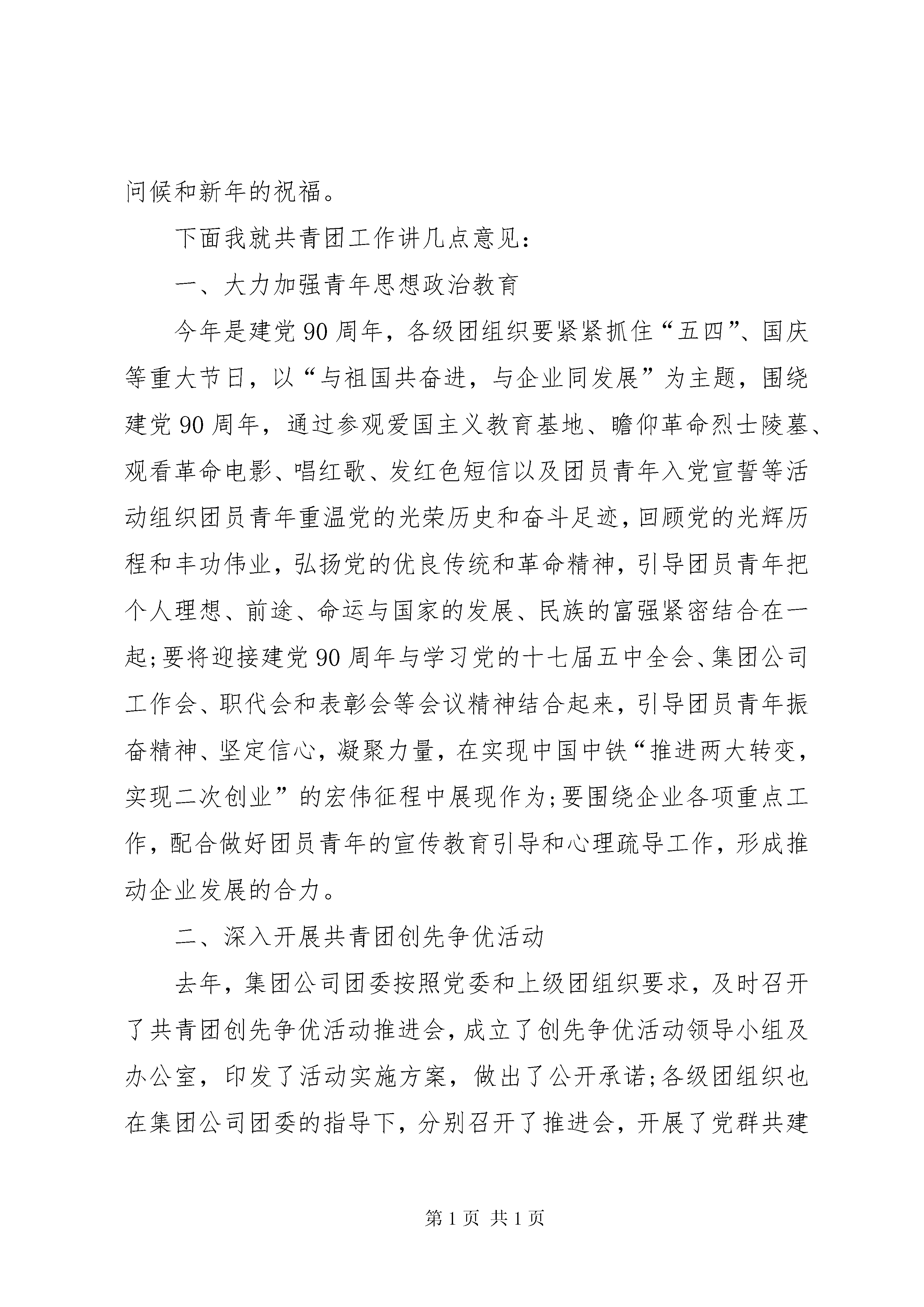 共青团重点工作会议讲话企业共青团工作会议讲话同志们:大家好。非常高兴参加咱们团委的分口会。看到年轻的团干部们精神抖擞、朝气蓬勃,我感受到了你们青春的无限活力,也看到了集团公司共青团工作的美好未来。xx年,集团公司团组织围绕企业中心工作,以局庆六十周年为契机,深入开展了青年思想教育双争双创、青年安全演讲比赛以及青年学技练功等活动,充分履行了团组织服务企业、服务青年的基本职能,在促进集团公司各项目标完成的同时,取得了不错的成绩。二公司郭跃峰同志荣获“xx年度全国优秀共青团干部”荣誉称号,并且作为10名“全国优秀共青团干部”代表中唯一一位建筑行业代表参加了在北京人民大会堂举行表彰大会,受到了王兆国、陆昊等领导的亲切接见;五公司白芝勇同志荣获“中央企业职工技能大赛工程测量工决赛”银奖;新运公司闫永锋同志荣获xx年度中央企业“优秀共青团干部”称号,由他主持自主研发的“中国中铁高技能人才评价试题管理系统”荣获了国家版权局颁发的“计算机软件着作权登记证书”,并在股份公司进行了正式发布和应用等等。这些成绩的取得,都离不开在座各位团干部的辛勤付出和努力,在此,我向你们表示感谢,同时也通过你们向广大团员和青年表示问候和新年的祝福。下面我就共青团工作讲几点意见:一、大力加强青年思想政治教育今年是建党90周年,各级团组织要紧紧抓住“五四”、国庆等重大节日,以“与祖国共奋进,与企业同发展”为主题,围绕建党90周年,通过参观爱国主义教育基地、瞻仰革命烈士陵墓、观看革命电影、唱红歌、发红色短信以及团员青年入党宣誓等活动组织团员青年重温党的光荣历史和奋斗足迹,回顾党的光辉历程和丰功伟业,弘扬党的优良传统和革命精神,引导团员青年把个人理想、前途、命运与国家的发展、民族的富强紧密结合在一起;要将迎接建党90周年与学习党的十七届五中全会、集团公司工作会、职代会和表彰会等会议精神结合起来,引导团员青年振奋精神、坚定信心,凝聚力量,在实现中国中铁“推进两大转变,实现二次创业”的宏伟征程中展现作为;要围绕企业各项重点工作,配合做好团员青年的宣传教育引导和心理疏导工作,形成推动企业发展的合力。二、深入开展共青团创先争优活动去年,集团公司团委按照党委和上级团组织要求,及时召开了共青团创先争优活动推进会,成立了创先争优活动领导小组及办公室,印发了活动实施方案,做出了公开承诺;各级团组织也在集团公司团委的指导下,分别召开了推进会,开展了党群共建活动,做出了公开承诺;在此基础上,集团公司团委还成功承办了“省国资委系统基层团组织创先争优活动推进会”,并做了经验发言。可以说,共青团创先争优活动有效推进,效果显着。今年,各级团组织要继续将创先争优活动作为一项重点工作来抓好抓紧,要结合本职工作岗位和实际,进一步加大团员公开承诺、监督检查、点评评议力度,以“五个好”、“五带头”、“五表率”为目标,努力形成团组织履职尽责创先进、团员团干部立足本职争优秀的良好局面;要向党组织积极争取将党建带团建和团内创先争优活动纳入党组织创先争优活动的总体部署,纳入党组织开展创先争优活动的评价标准和考核表彰体系;要紧密结合党组织开展创先争优活动的安排部署,学习借鉴党组织开展创先争优活动的思路和方法,扎扎实实地推进活动深入开展。同时,各单位团组织负责人要深入基层,坚持靠前指导,及时了解基层开展创先争优活动的进展和成效,帮助基层团组织不断改善工作条件,优化工作环境,拓展工作思路。三、进一步发挥团员青年生力军和突击队作用国家“十二五”发展规划明确指出。要推进国家运输通道建设,基本建成国家快速铁路网和高速公路网,发展高速铁路,加强省际通道和国省干线公路建设,积极发展水运,完善港口和机场布局。今年集团公司职代会确定的目标是企业营业额480亿,新签合同额530亿,广大团员青年面临着更为广阔的成长空间和平台,各级团组织要立足重点工程建设实际,积极投入“高扬党旗”系列活动,以“我为重点工程建设做贡献”活动为有效载体,及时组建青年突击队,大力开展争创青年文明号、争当青年岗位能手活动;要充分调动广大团员青年“创新创效”的积极性和主动性,更加注重将团员青年的知识和智慧转化为企业的经济效益和科技成果;要大力开展合理化建议、金点子征集、节能短信等活动,引导团员青年树立低碳生活、低碳经济的意识,推动建立资源节约型企业。四、全面推进企业安全生产工作今年,集团公司仍然面临非常严峻的安全形势。各级团组织要引导团员青年充分认识企业安全生产面临的严峻形势和安全工作的重要性,牢固树立“安全第一,预防为主,综合治理”的思想,紧密结合本单位安全工作的总体部署和安排,不断深化“安全生产,青年争先”主题实践活动,继续开展好班前安全质量宣誓、青年安全生产演讲比赛和巡回演讲活动,积极营造良好的安全生产文化氛围;同时,要进一步推进青年安