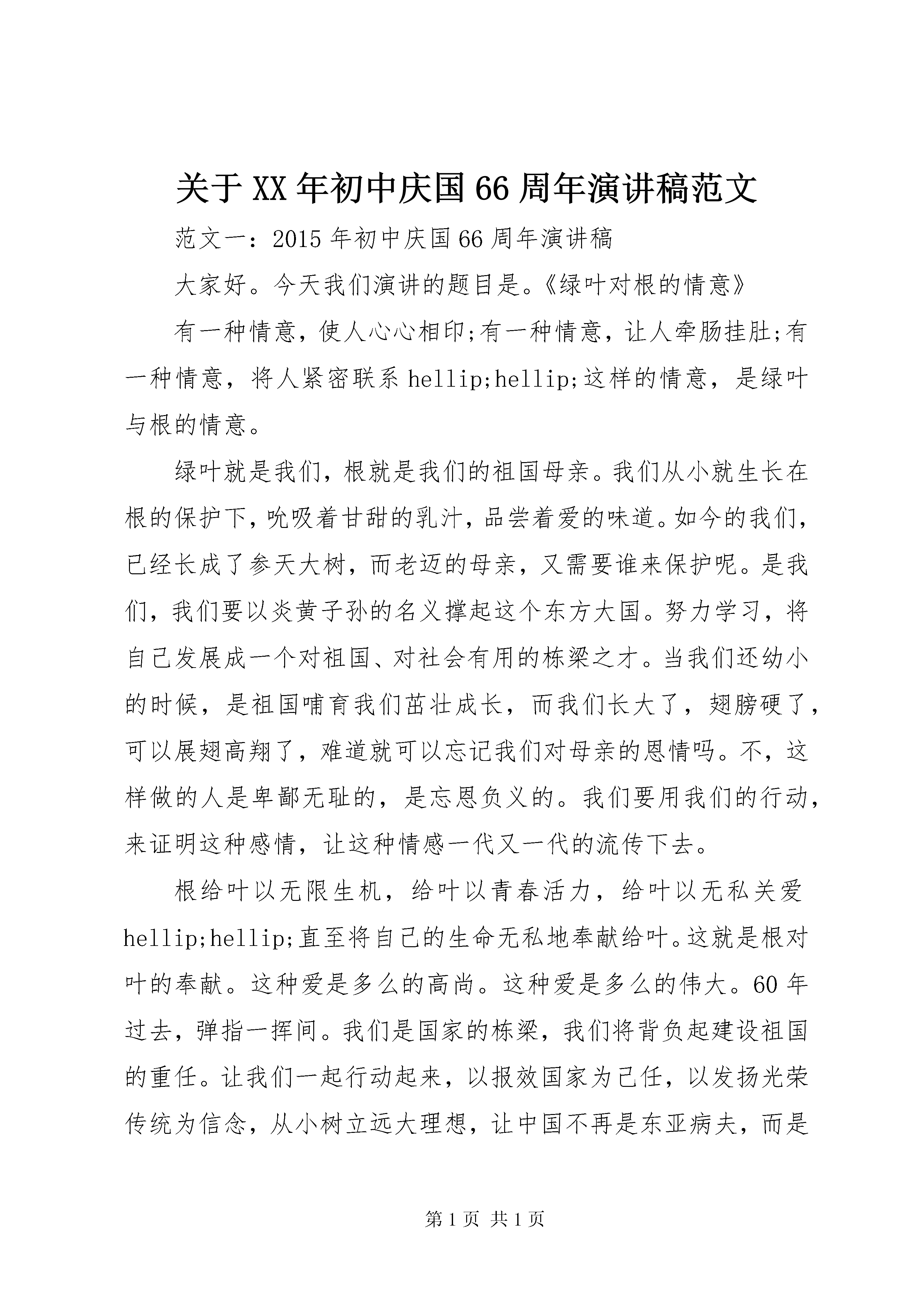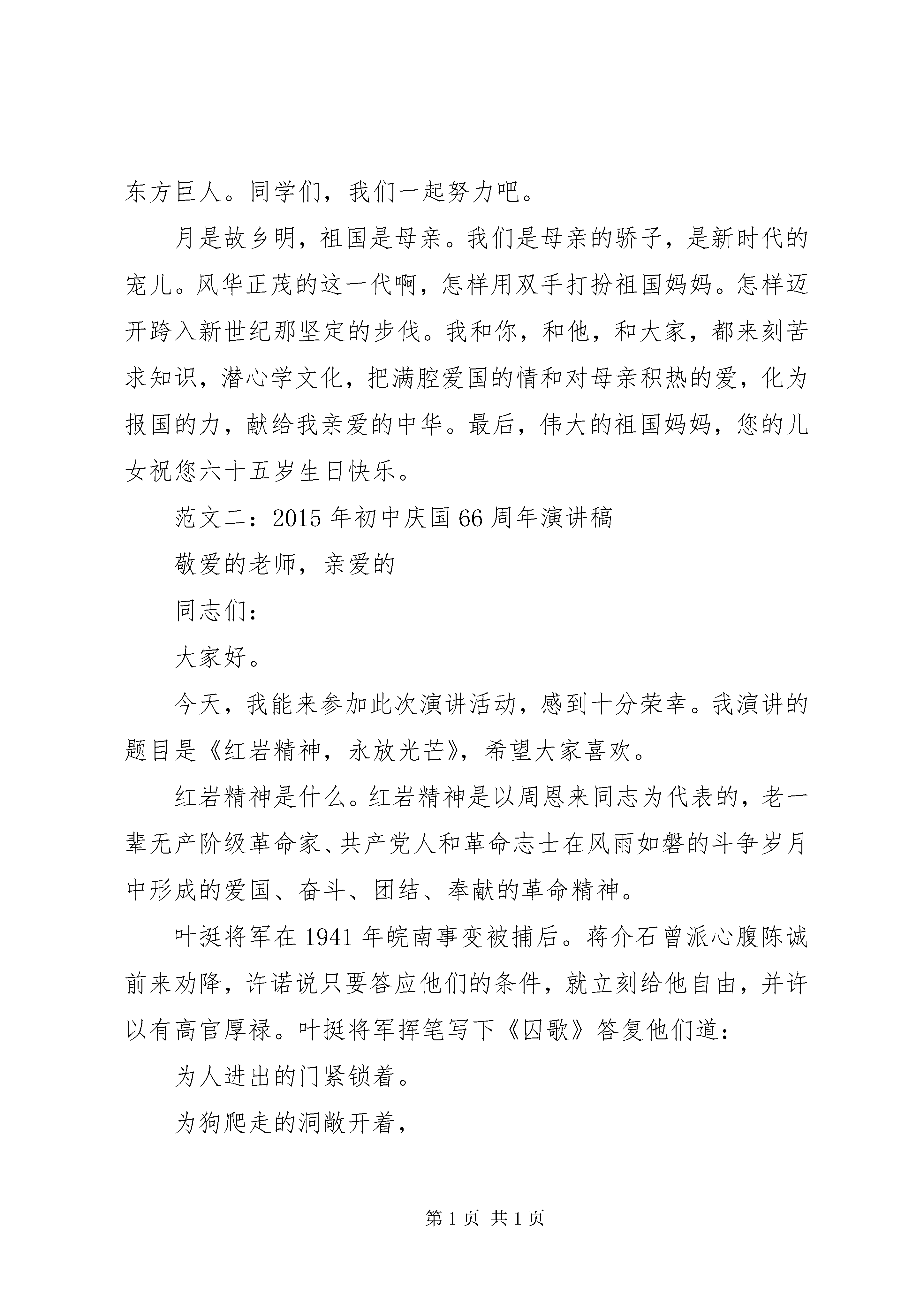 关于XX年初中庆国66周年演讲稿范文范文一:2015年初中庆国66周年演讲稿大家好。今天我们演讲的题目是。《绿叶对根的情意》有一种情意,使人心心相印;有一种情意,让人牵肠挂肚;有一种情意,将人紧密联系hellip;hellip;这样的情意,是绿叶与根的情意。绿叶就是我们,根就是我们的祖国母亲。我们从小就生长在根的保护下,吮吸着甘甜的乳汁,品尝着爱的味道。如今的我们,已经长成了参天大树,而老迈的母亲,又需要谁来保护呢。是我们,我们要以炎黄子孙的名义撑起这个东方大国。努力学习,将自己发展成一个对祖国、对社会有用的栋梁之才。当我们还幼小的时候,是祖国哺育我们茁壮成长,而我们长大了,翅膀硬了,可以展翅高翔了,难道就可以忘记我们对母亲的恩情吗。不,这样做的人是卑鄙无耻的,是忘恩负义的。我们要用我们的行动,来证明这种感情,让这种情感一代又一代的流传下去。根给叶以无限生机,给叶以青春活力,给叶以无私关爱hellip;hellip;直至将自己的生命无私地奉献给叶。这就是根对叶的奉献。这种爱是多么的高尚。这种爱是多么的伟大。60年过去,弹指一挥间。我们是国家的栋梁,我们将背负起建设祖国的重任。让我们一起行动起来,以报效国家为己任,以发扬光荣传统为信念,从小树立远大理想,让中国不再是东亚病夫,而是东方巨人。同学们,我们一起努力吧。月是故乡明,祖国是母亲。我们是母亲的骄子,是新时代的宠儿。风华正茂的这一代啊,怎样用双手打扮祖国妈妈。怎样迈开跨入新世纪那坚定的步伐。我和你,和他,和大家,都来刻苦求知识,潜心学文化,把满腔爱国的情和对母亲积热的爱,化为报国的力,献给我亲爱的中华。最后,伟大的祖国妈妈,您的儿女祝您六十五岁生日快乐。范文二:2015年初中庆国66周年演讲稿敬爱的老师,亲爱的同志们:大家好。今天,我能来参加此次演讲活动,感到十分荣幸。我演讲的题目是《红岩精神,永放光芒》,希望大家喜欢。红岩精神是什么。红岩精神是以周恩来同志为代表的,老一辈无产阶级革命家、共产党人和革命志士在风雨如磐的斗争岁月中形成的爱国、奋斗、团结、奉献的革命精神。叶挺将军在1941年皖南事变被捕后。蒋介石曾派心腹陈诚前来劝降,许诺说只要答应他们的条件,就立刻给他自由,并许以有高官厚禄。叶挺将军挥笔写下《囚歌》答复他们道:为人进出的门紧锁着。为狗爬走的洞敞开着,一个声音高叫着:爬出来吧,给你自由。我渴望自由,但也深知人的躯体哪能从狗的洞子爬出。我只能期待那一天地下的火冲腾,把这活棺材和我一起烧掉,我将在烈火和热血中得到永生。这首诗,后来被关在歌乐山集中营的同志谱成《叶挺囚歌》,广为传唱,鼓舞了人们的斗志。江竹筠同志,这位不管老人还是孩子都尊称为江姐的革命先烈。被特务秘密杀害时才29岁。在亿万中国人民的心中,江姐是革命意志坚强的代表。她的许多名言曾激动了无数人的心上级的姓名、住址,我知道,下级的姓名、住址,我也知道,但这都是我们党的秘密,绝不能告诉你们。严刑拷打算不了什么,竹签子是竹子做的,而共产党员的意志是钢的。江姐,一位柔弱的女性,却有那样坚强的表现,依靠的是什么力量。是一种精神,一种坚贞不屈、追求自由的斗争精神;是一种信仰,一种坚信共产主义必胜的信仰是我们现在学习的红岩精神。当新中国的五星红旗在天安门冉冉升起时,她和渣滓洞的革命战士虽然不知道国旗的图案,仍以憧憬的心情绣了一面代表解放的旗帜尽管她们知道自己已经看不到胜利那一天了。还有许云峰英勇斗敌,舍己为人;刘思扬出身豪门却投身革命;渣滓洞难友团结奋斗,敌人丧胆;白公馆志士奋勇突围,迎来黎明hellip;hellip;当所有一切展现在我们眼前,激动、崇敬、悲愤、感叹hellip;hellip;从他们身上,我们看到了民族的希望,感受到共产党人作为中国脊梁的人格魅力,感受到一种崇高的精神红岩精神。任何社会、任何时代都需要精神力量鼓舞人们前进。红岩精神是老一辈革命家为我们留下的宝贵的精神财富,是社会主义精神文明建设中不可缺少的部分。当非典病魔肆虐的时候,当氯气蔓延的时候,当洪水横行的时候,我们看到的,是人们昂扬的斗志,它让红岩迸发出新的精神力量,它让红岩精神注入了新的时代内涵。起来,用我们的血肉筑起我们新的长城。这是时代的强音,是12亿中国人民发出的铮铮誓言。前进,前进hellip;hellip;