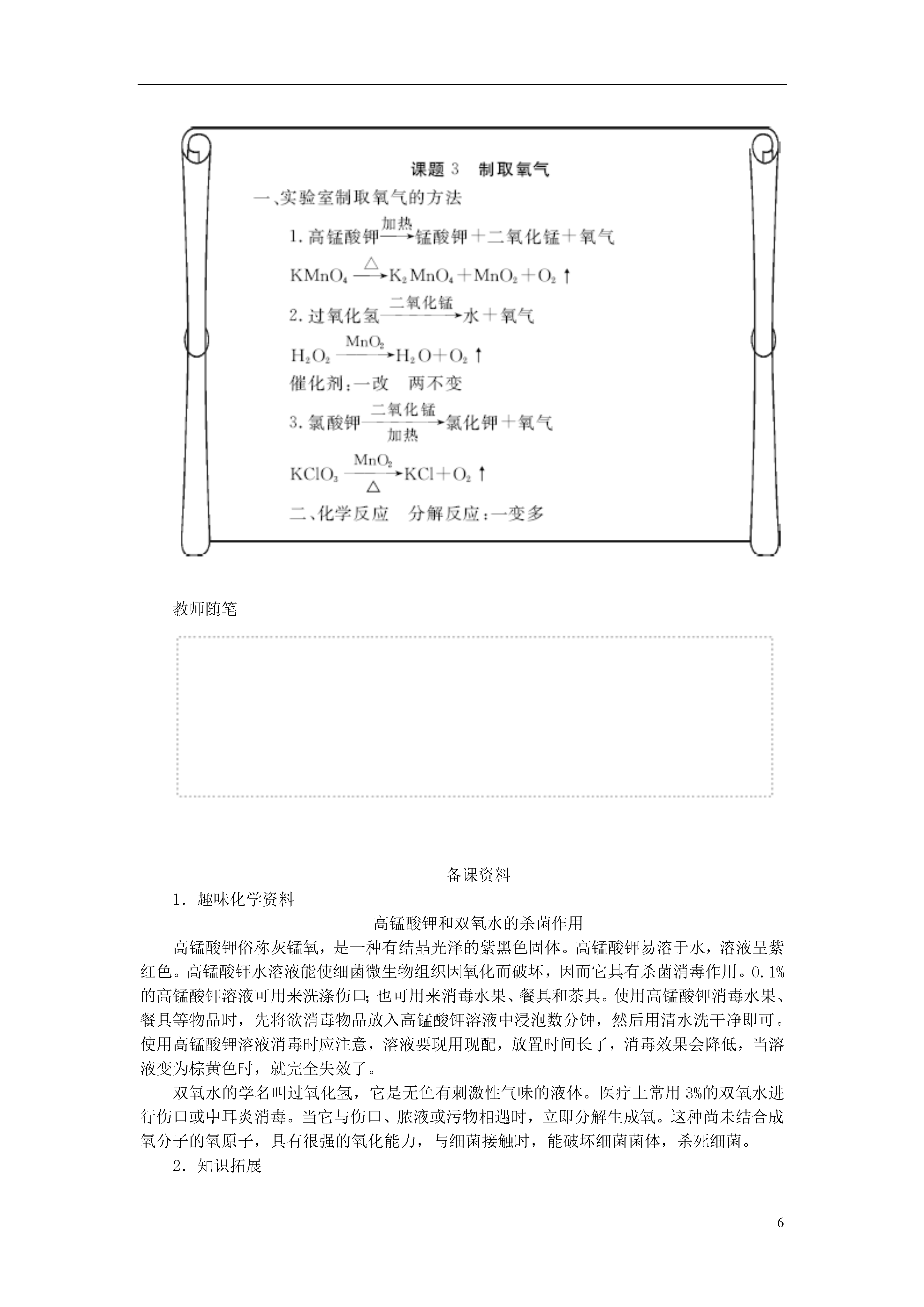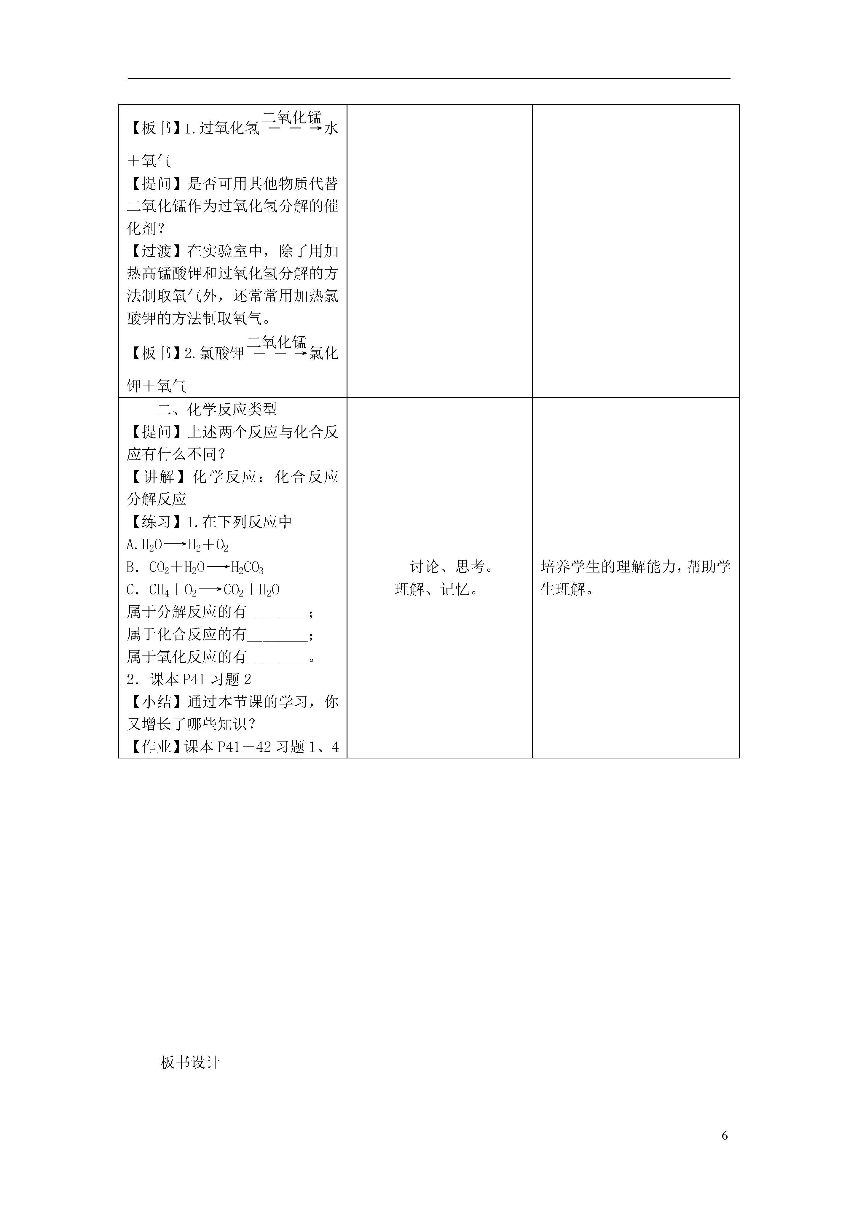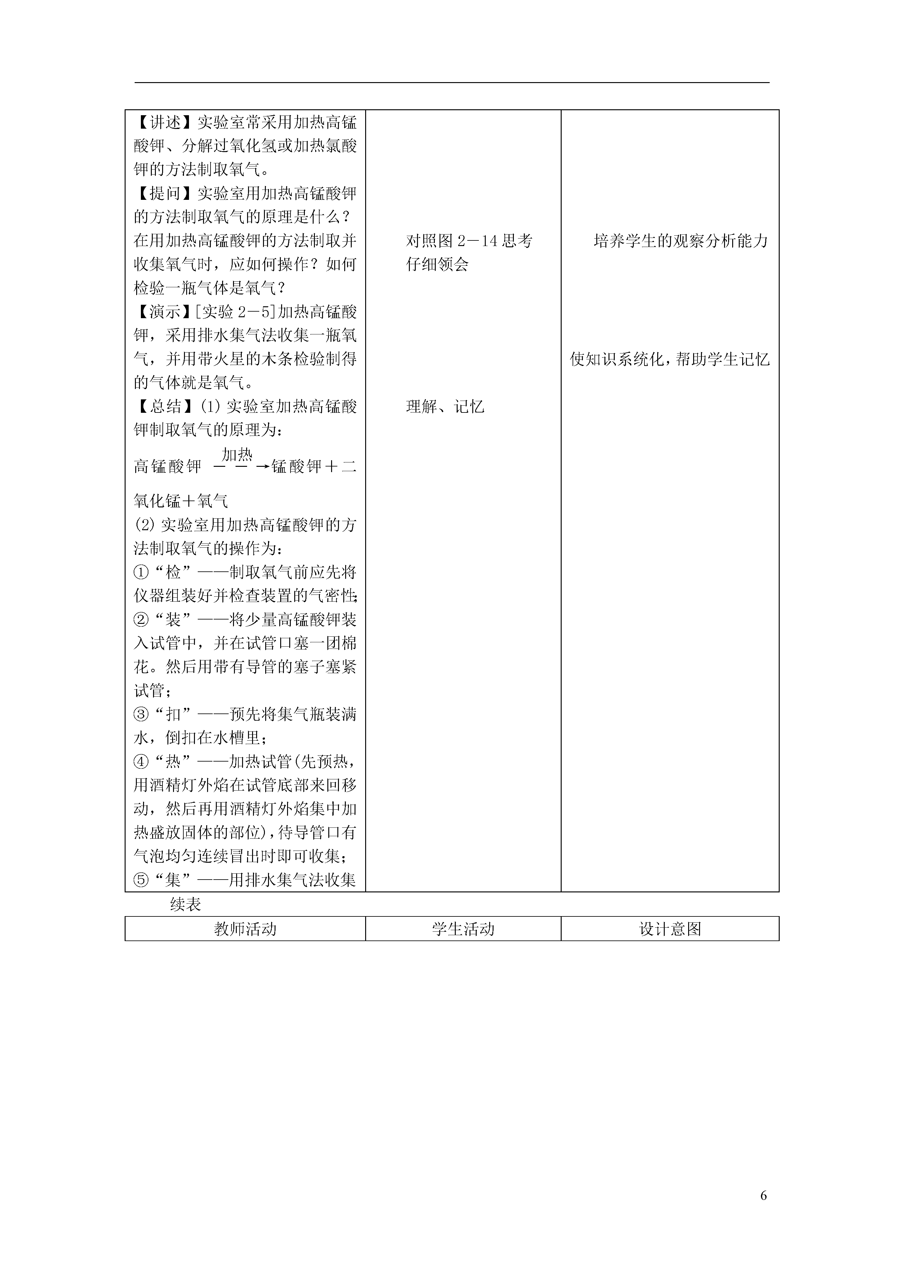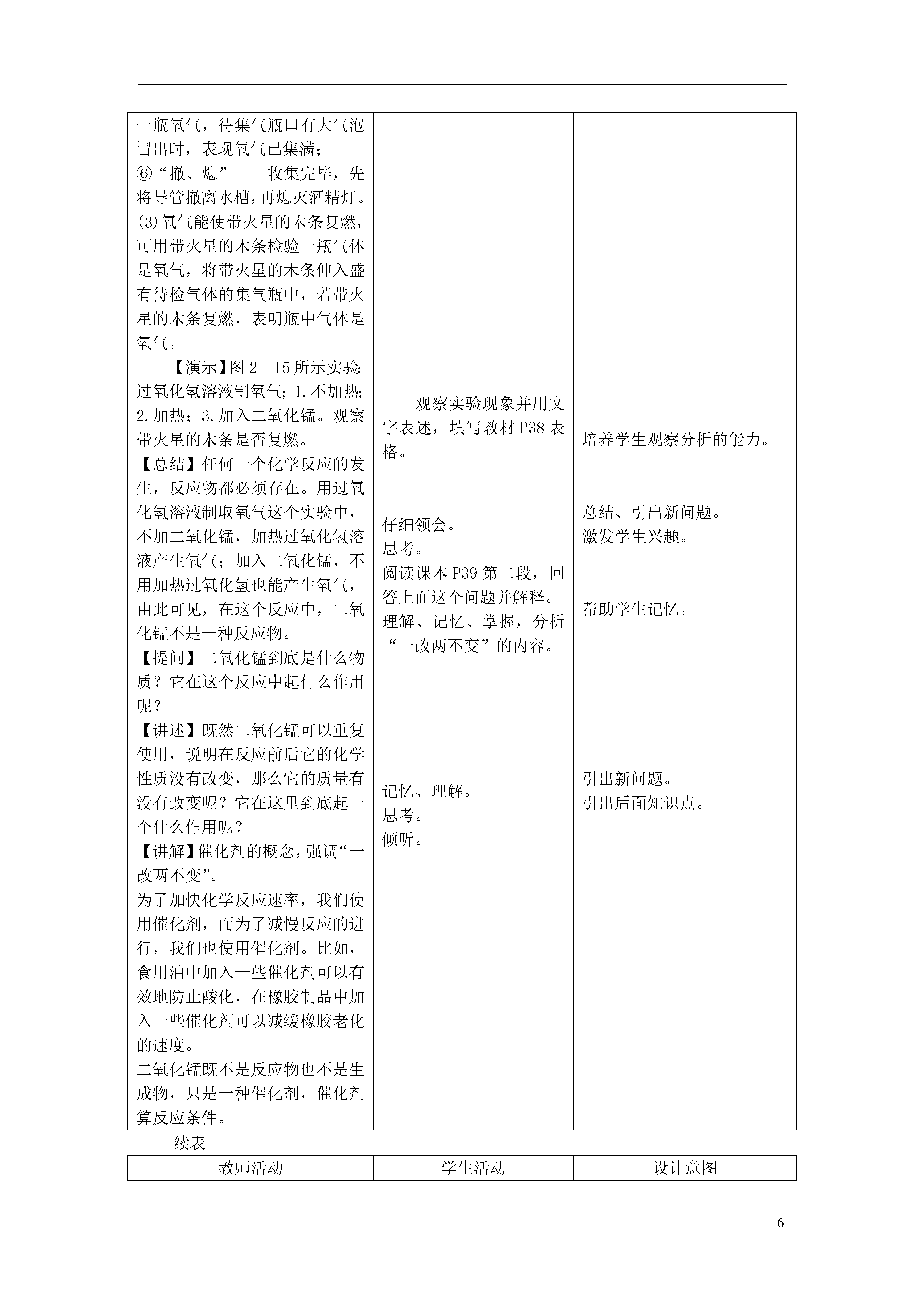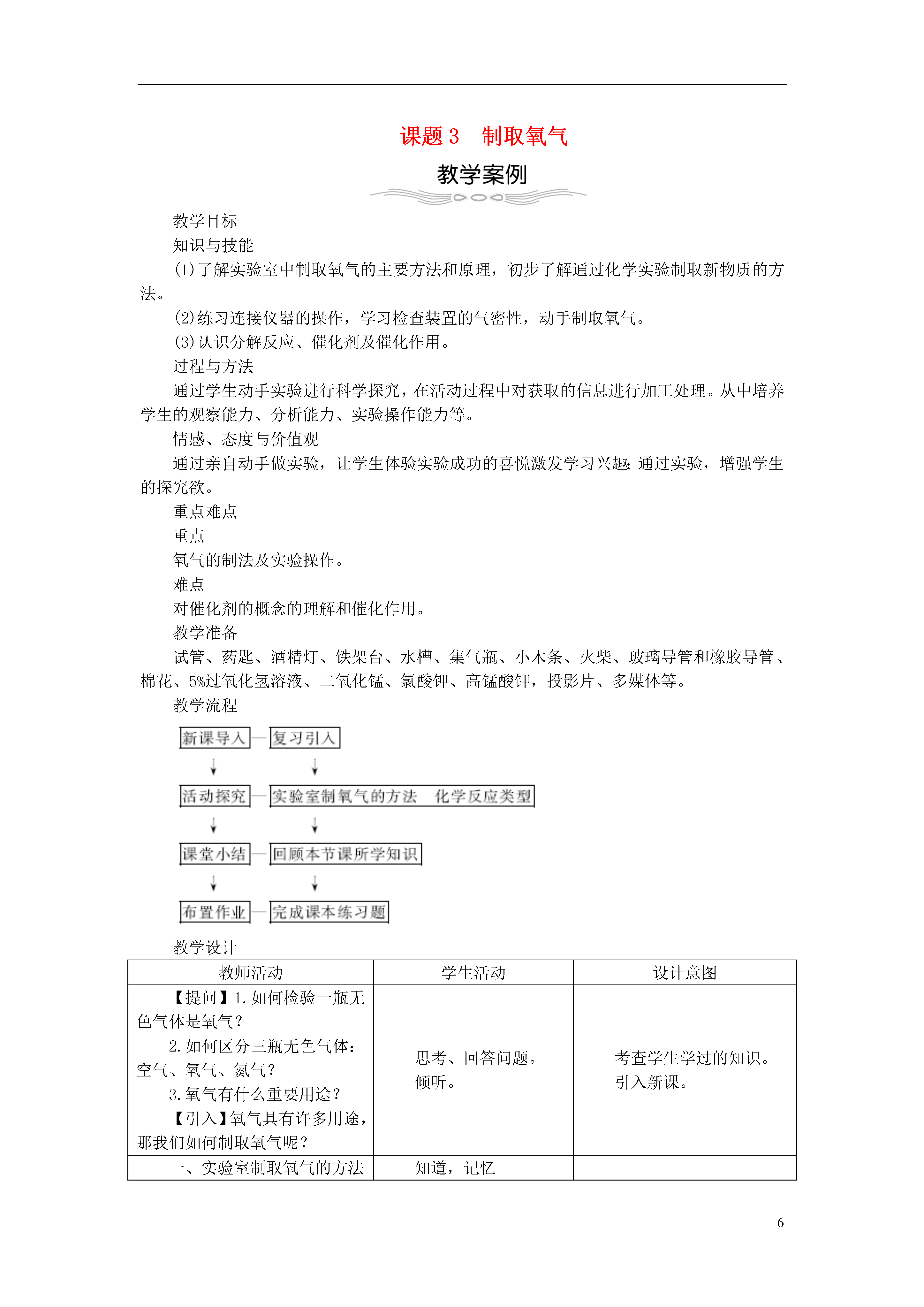 6课题3制取氧气教学目标知识与技能(1)了解实验室中制取氧气的主要方法和原理,初步了解通过化学实验制取新物质的方法。(2)练习连接仪器的操作,学习检查装置的气密性,动手制取氧气。(3)认识分解反应、催化剂及催化作用。过程与方法通过学生动手实验进行科学探究,在活动过程中对获取的信息进行加工处理。从中培养学生的观察能力、分析能力、实验操作能力等。情感、态度与价值观通过亲自动手做实验,让学生体验实验成功的喜悦激发学习兴趣;通过实验,增强学生的探究欲。重点难点重点氧气的制法及实验操作。难点对催化剂的概念的理解和催化作用。教学准备试管、药匙、酒精灯、铁架台、水槽、集气瓶、小木条、火柴、玻璃导管和橡胶导管、棉花、5%过氧化氢溶液、二氧化锰、氯酸钾、高锰酸钾,投影片、多媒体等。教学流程教学设计教师活动学生活动设计意图【提问】1.如何检验一瓶无色气体是氧气?2.如何区分三瓶无色气体:空气、氧气、氮气?3.氧气有什么重要用途?【引入】氧气具有许多用途,那我们如何制取氧气呢?思考、回答问题。倾听。考查学生学过的知识。引入新课。一、实验室制取氧气的方法【讲述】实验室常采用加热高锰酸钾、分解过氧化氢或加热氯酸钾的方法制取氧气。【提问】实验室用加热高锰酸钾的方法制取氧气的原理是什么?在用加热高锰酸钾的方法制取并收集氧气时,应如何操作?如何检验一瓶气体是氧气?【演示】[实验2-5]加热高锰酸钾,采用排水集气法收集一瓶氧气,并用带火星的木条检验制得的气体就是氧气。【总结】(1)实验室加热高锰酸钾制取氧气的原理为:高锰酸钾eq\o(――→,\s\up7(加热))锰酸钾+二氧化锰+氧气(2)实验室用加热高锰酸钾的方法制取氧气的操作为:①“检”——制取氧气前应先将仪器组装好并检查装置的气密性;②“装”——将少量高锰酸钾装入试管中,并在试管口塞一团棉花。然后用带有导管的塞子塞紧试管;③“扣”——预先将集气瓶装满水,倒扣在水槽里;④“热”——加热试管(先预热,用酒精灯外焰在试管底部来回移动,然后再用酒精灯外焰集中加热盛放固体的部位),待导管口有气泡均匀连续冒出时即可收集;⑤“集”——用排水集气法收集知道,记忆对照图2-14思考仔细领会理解、记忆培养学生的观察分析能力使知识系统化,帮助学生记忆续表教师活动学生活动设计意图一瓶氧气,待集气瓶口有大气泡冒出时,表现氧气已集满;⑥“撤、熄”——收集完毕,先将导管撤离水槽,再熄灭酒精灯。(3)氧气能使带火星的木条复燃,可用带火星的木条检验一瓶气体是氧气,将带火星的木条伸入盛有待检气体的集气瓶中,若带火星的木条复燃,表明瓶中气体是氧气。【演示】图2-15所示实验:过氧化氢溶液制氧气;1.不加热;2.加热;3.加入二氧化锰。观察带火星的木条是否复燃。【总结】任何一个化学反应的发生,反应物都必须存在。用过氧化氢溶液制取氧气这个实验中,不加二氧化锰,加热过氧化氢溶液产生氧气;加入二氧化锰,不用加热过氧化氢也能产生氧气,由此可见,在这个反应中,二氧化锰不是一种反应物。【提问】二氧化锰到底是什么物质?它在这个反应中起什么作用呢?【讲述】既然二氧化锰可以重复使用,说明在反应前后它的化学性质没有改变,那么它的质量有没有改变呢?它在这里到底起一个什么作用呢?【讲解】催化剂的概念,强调“一改两不变”。为了加快化学反应速率,我们使用催化剂,而为了减慢反应的进行,我们也使用催化剂。比如,食用油中加入一些催化剂可以有效地防止酸化,在橡胶制品中加入一些催化剂可以减缓橡胶老化的速度。二氧化锰既不是反应物也不是生成物,只是一种催化剂,催化剂算反应条件。观察实验现象并用文字表述,填写教材P38表格。仔细领会。思考。阅读课本P39第二段,回答上面这个问题并解释。理解、记忆、掌握,分析“一改两不变”的内容。记忆、理解。思考。倾听。培养学生观察分析的能力。总结、引出新问题。激发学生兴趣。帮助学生记忆。引出新问题。引出后面知识点。续表教师活动学生活动设计意图【板书】1.过氧化氢eq\o(――→,\s\up7(二氧化锰))水+氧气【提问】是否可用其他物质代替二氧化锰作为过氧化氢分解的催化剂?【过渡】在实验室中,除了用加热高锰酸钾和过氧化氢分解的方法制取氧气外,还常常用加热氯酸钾的方法制取氧气。【板书】2.氯酸钾eq\o(――→,\s\up7(二氧化锰))氯化钾+氧气二、化学反应类型【提问】上述两个反应与化合反应有什么不同?【讲解】化学反应:化合反应分解反应【练习】1.在下列反应