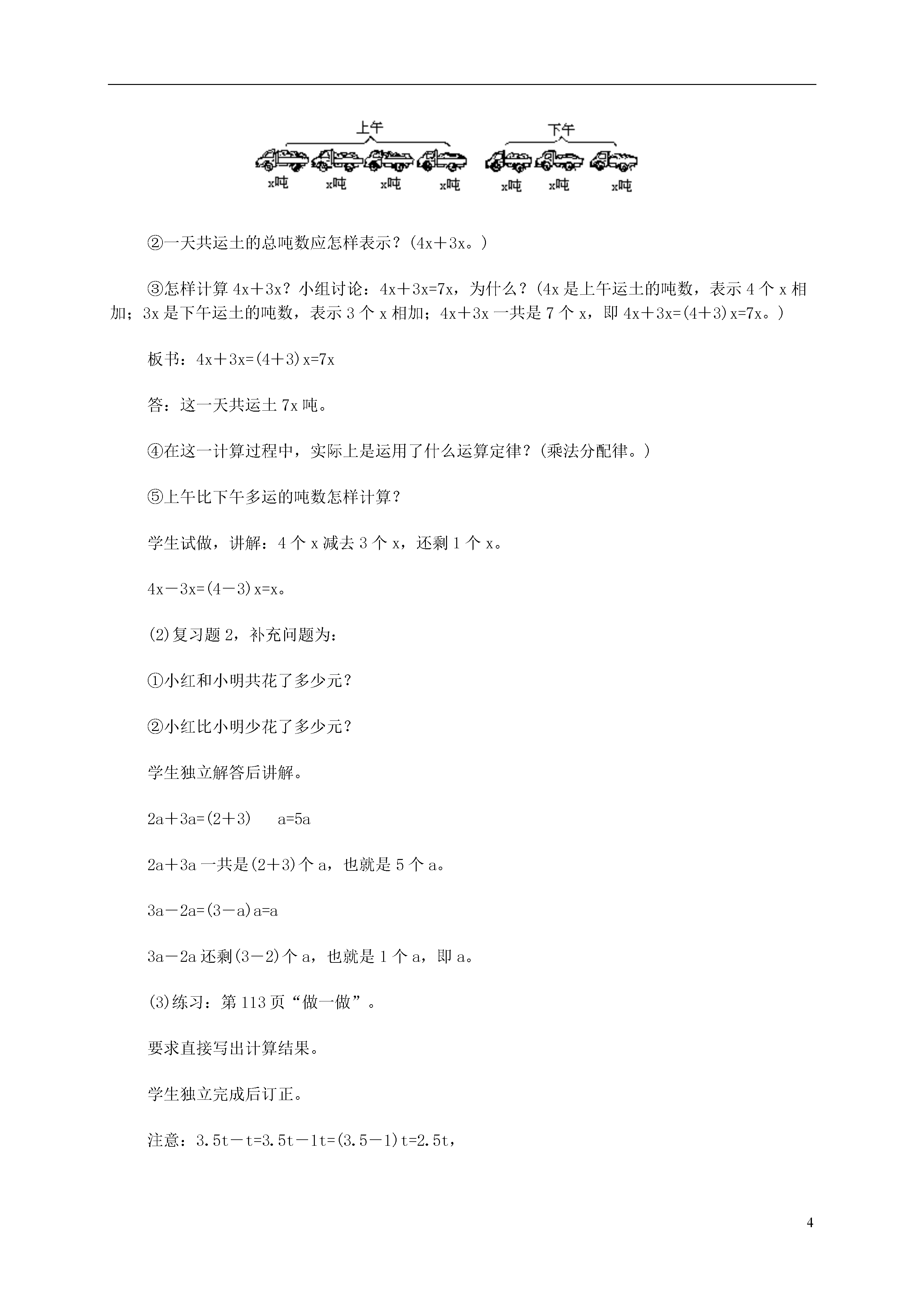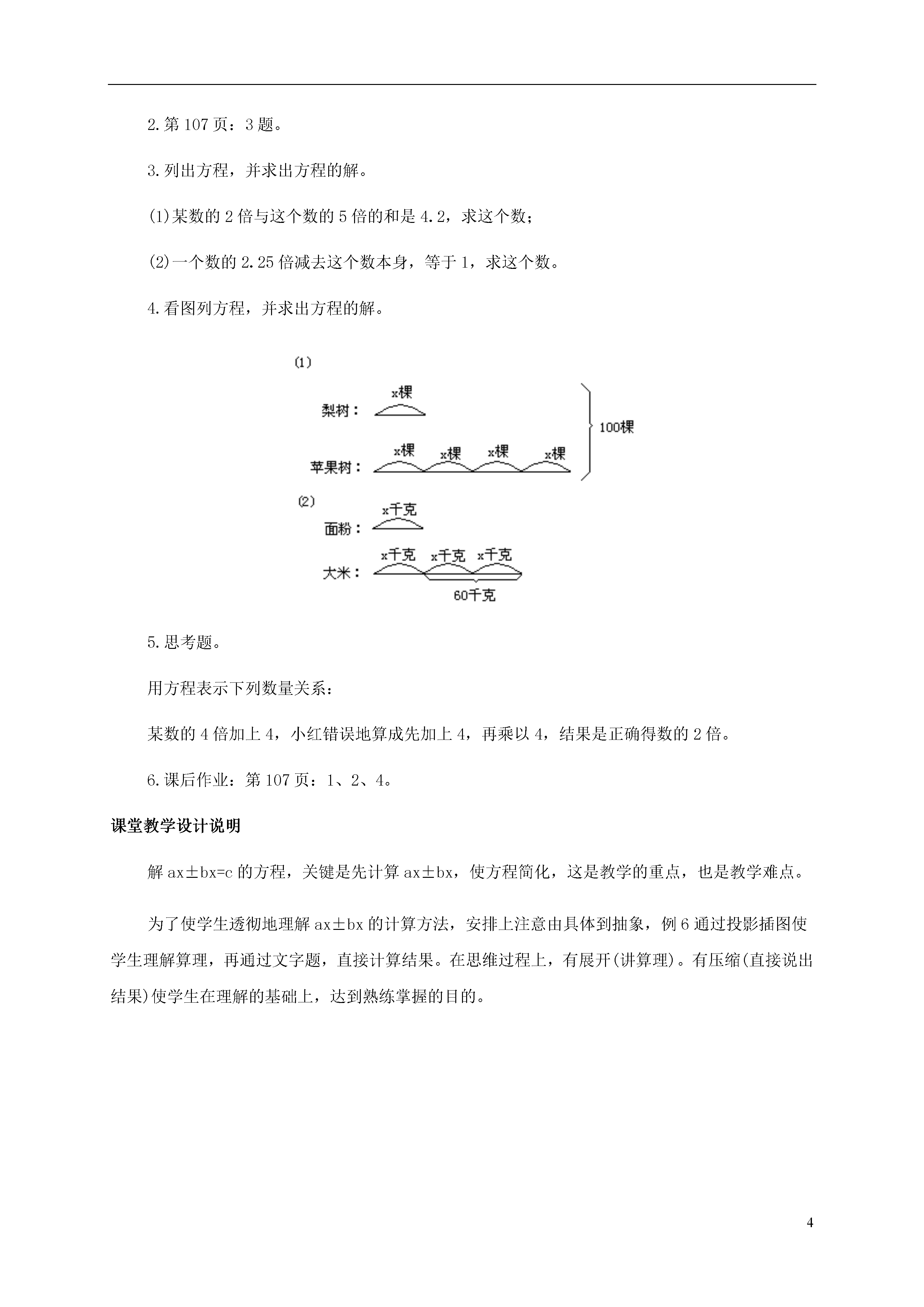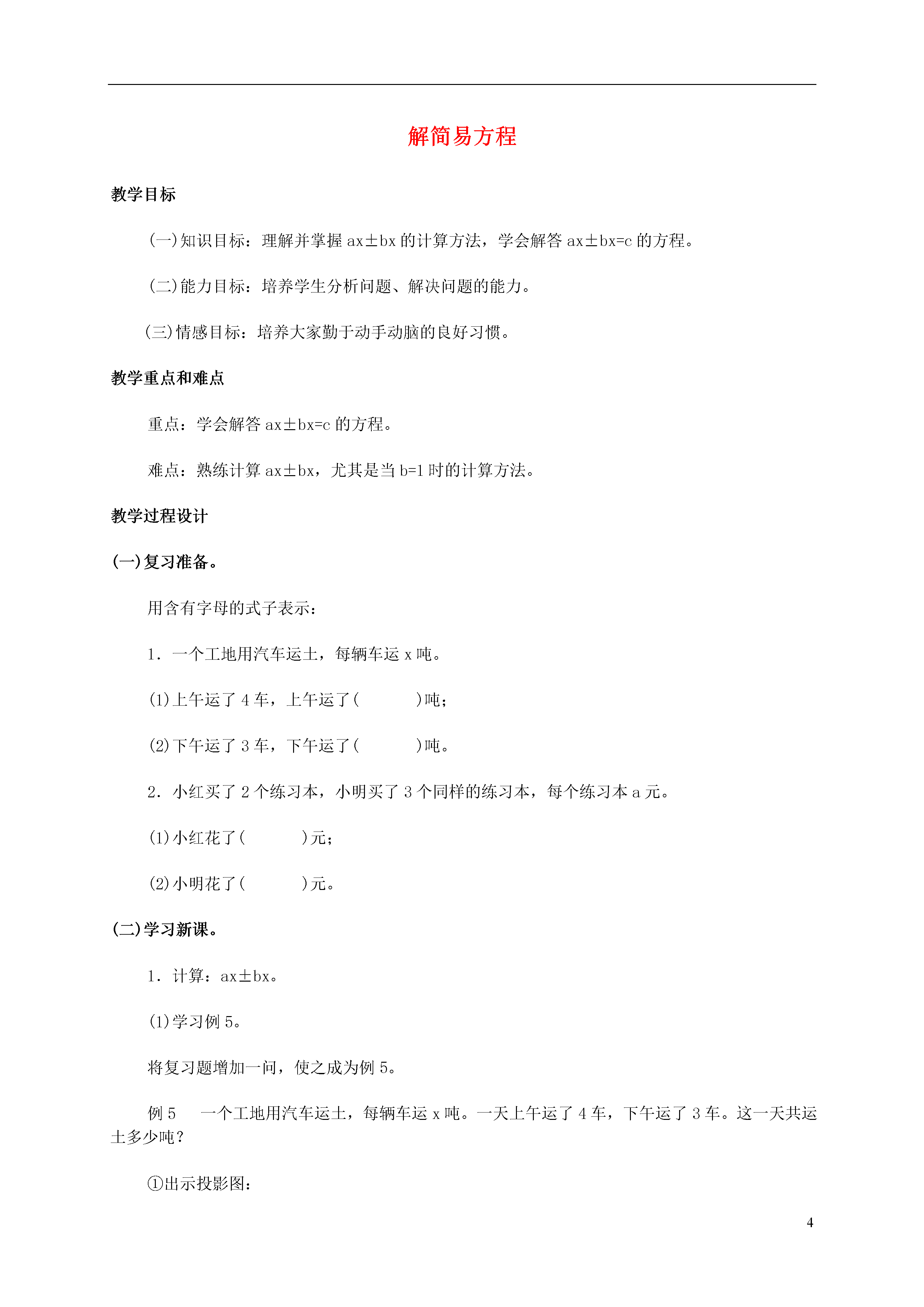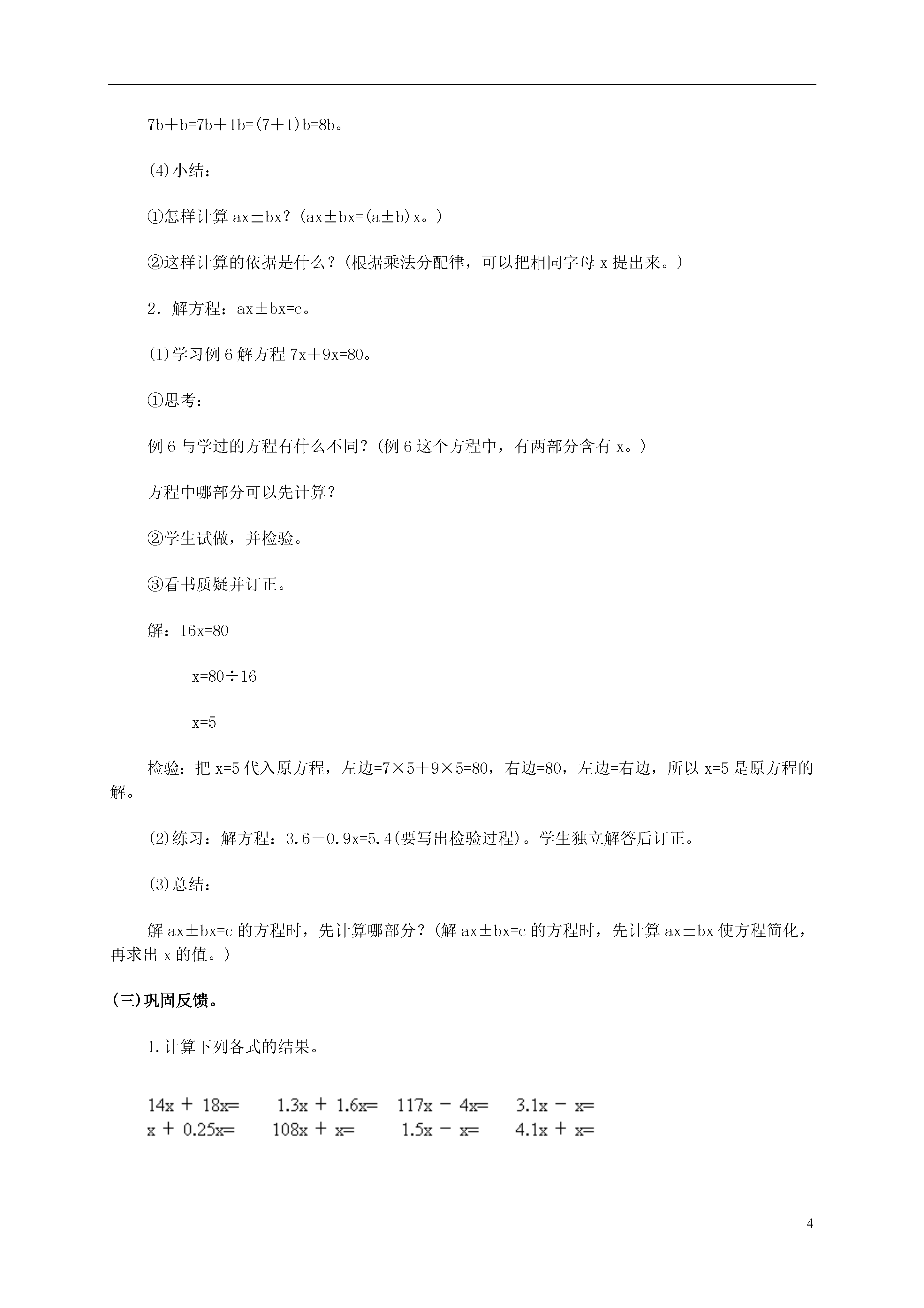 4解简易方程教学目标(一)知识目标:理解并掌握ax±bx的计算方法,学会解答ax±bx=c的方程。(二)能力目标:培养学生分析问题、解决问题的能力。(三)情感目标:培养大家勤于动手动脑的良好习惯。教学重点和难点重点:学会解答ax±bx=c的方程。难点:熟练计算ax±bx,尤其是当b=1时的计算方法。教学过程设计(一)复习准备。用含有字母的式子表示:1.一个工地用汽车运土,每辆车运x吨。(1)上午运了4车,上午运了()吨;(2)下午运了3车,下午运了()吨。2.小红买了2个练习本,小明买了3个同样的练习本,每个练习本a元。(1)小红花了()元;(2)小明花了()元。(二)学习新课。1.计算:ax±bx。(1)学习例5。将复习题增加一问,使之成为例5。例5一个工地用汽车运土,每辆车运x吨。一天上午运了4车,下午运了3车。这一天共运土多少吨?①出示投影图:②一天共运土的总吨数应怎样表示?(4x+3x。)③怎样计算4x+3x?小组讨论:4x+3x=7x,为什么?(4x是上午运土的吨数,表示4个x相加;3x是下午运土的吨数,表示3个x相加;4x+3x一共是7个x,即4x+3x=(4+3)x=7x。)板书:4x+3x=(4+3)x=7x答:这一天共运土7x吨。④在这一计算过程中,实际上是运用了什么运算定律?(乘法分配律。)⑤上午比下午多运的吨数怎样计算?学生试做,讲解:4个x减去3个x,还剩1个x。4x-3x=(4-3)x=x。(2)复习题2,补充问题为:①小红和小明共花了多少元?②小红比小明少花了多少元?学生独立解答后讲解。2a+3a=(2+3)a=5a2a+3a一共是(2+3)个a,也就是5个a。3a-2a=(3-a)a=a3a-2a还剩(3-2)个a,也就是1个a,即a。(3)练习:“做一做”。要求直接写出计算结果。学生独立完成后订正。注意:3.5t-t=3.5t-1t=(3.5-1)t=2.5t,7b+b=7b+1b=(7+1)b=8b。(4)小结:①怎样计算ax±bx?(ax±bx=(a±b)x。)②这样计算的依据是什么?(根据乘法分配律,可以把相同字母x提出来。)2.解方程:ax±bx=c。(1)学习例6解方程7x+9x=80。①思考:例6与学过的方程有什么不同?(例6这个方程中,有两部分含有x。)方程中哪部分可以先计算?②学生试做,并检验。③看书质疑并订正。解:16x=80x=80÷16x=5检验:把x=5代入原方程,左边=7×5+9×5=80,右边=80,左边=右边,所以x=5是原方程的解。(2)练习:解方程:3.6-0.9x=5.4(要写出检验过程)。学生独立解答后订正。(3)总结:解ax±bx=c的方程时,先计算哪部分?(解ax±bx=c的方程时,先计算ax±bx使方程简化,再求出x的值。)(三)巩固反馈。1.计算下列各式的结果。2.:3题。3.列出方程,并求出方程的解。(1)某数的2倍与这个数的5倍的和是4.2,求这个数;(2)一个数的2.25倍减去这个数本身,等于1,求这个数。4.看图列方程,并求出方程的解。5.思考题。用方程表示下列数量关系:某数的4倍加上4,小红错误地算成先加上4,再乘以4,结果是正确得数的2倍。6.课后作业::1、2、4。课堂教学设计说明解ax±bx=c的方程,关键是先计算ax±bx,使方程简化,这是教学的重点,也是教学难点。为了使学生透彻地理解ax±bx的计算方法,安排上注意由具体到抽象,例6通过投影插图使学生理解算理,再通过文字题,直接计算结果。在思维过程上,有展开(讲算理)。有压缩(直接说出结果)使学生在理解的基础上,达到熟练掌握的目的。