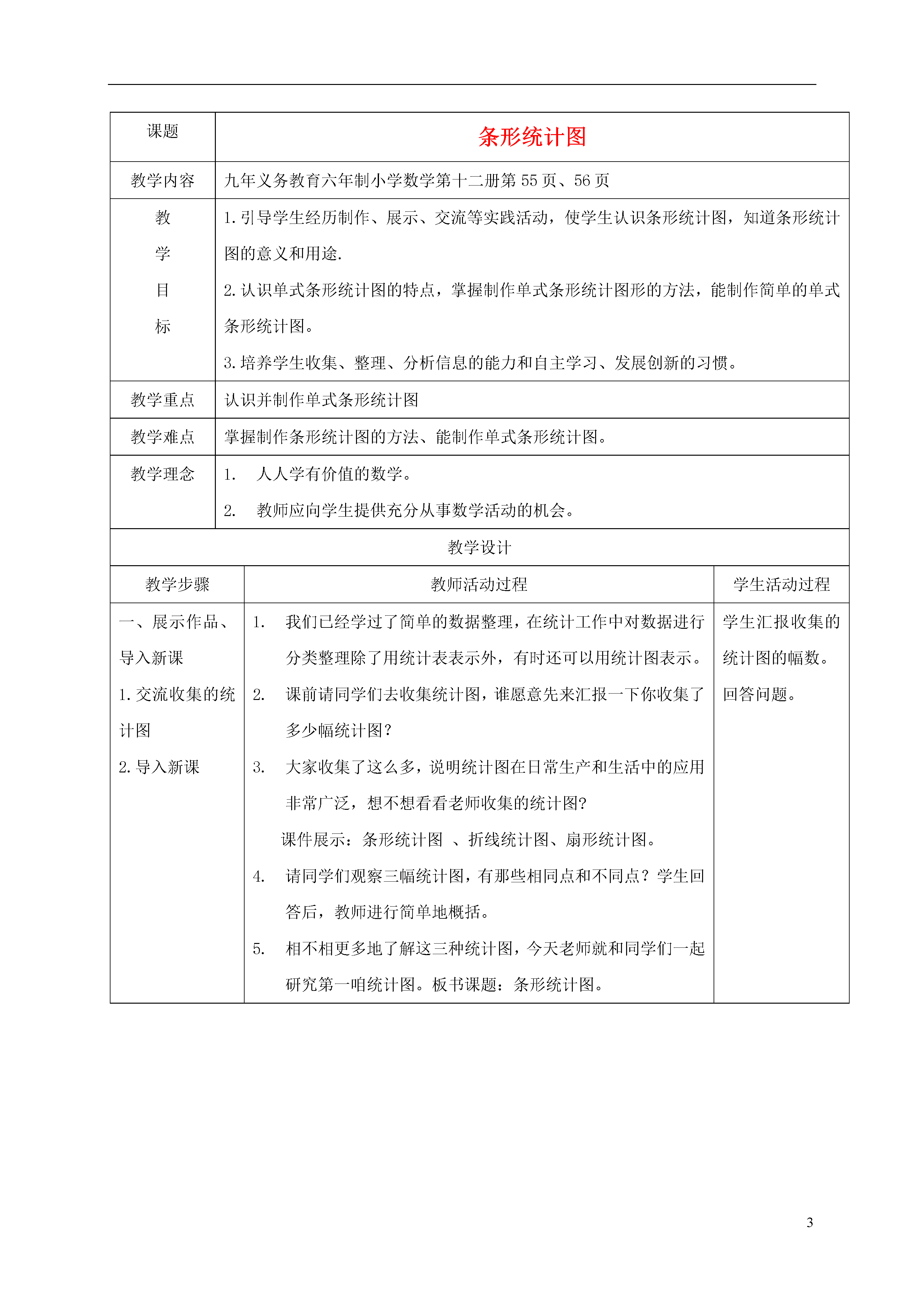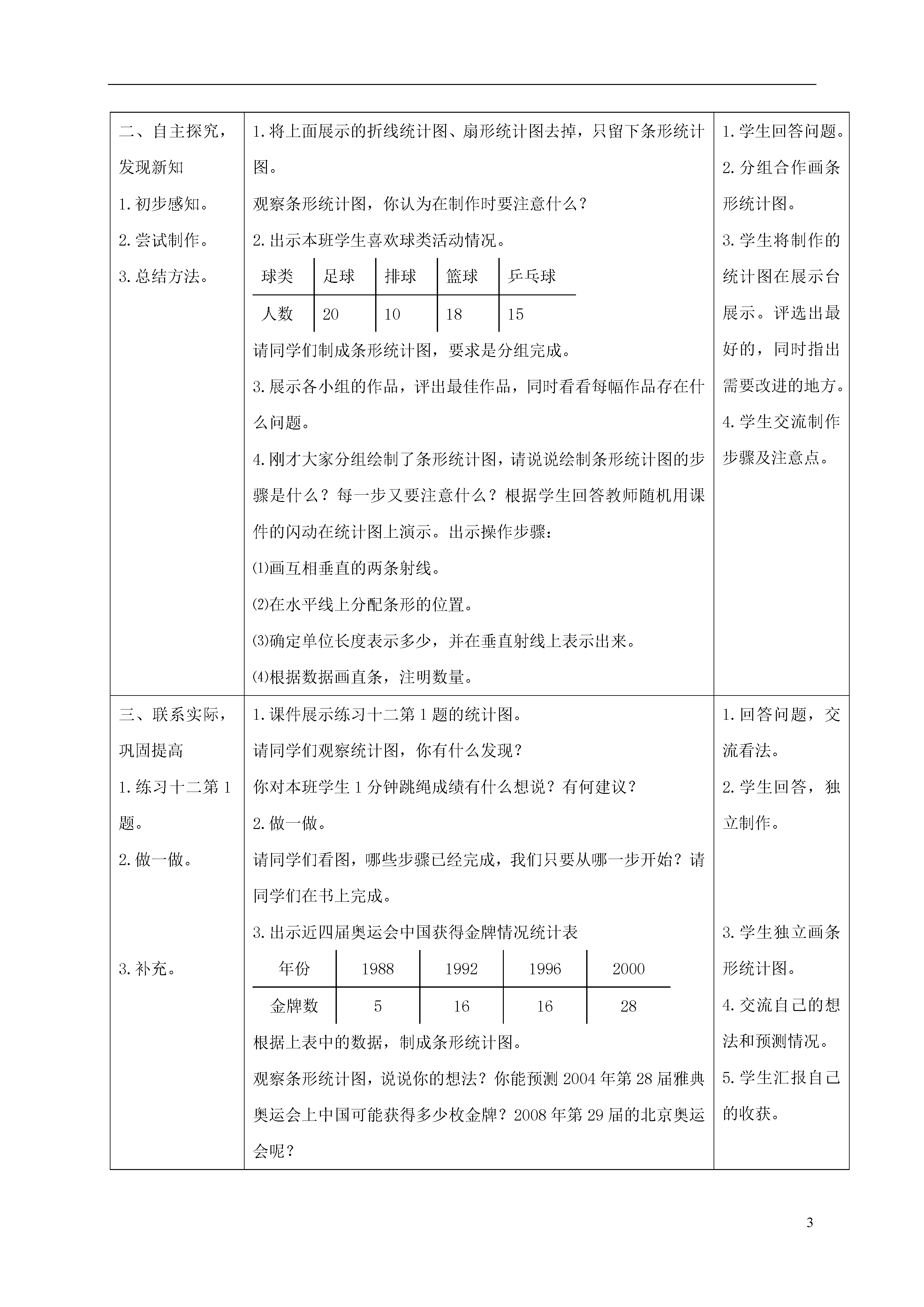 3课题条形统计图教学内容九年义务教育六年制小学数学第十二册、56页教学目标1.引导学生经历制作、展示、交流等实践活动,使学生认识条形统计图,知道条形统计图的意义和用途.2.认识单式条形统计图的特点,掌握制作单式条形统计图形的方法,能制作简单的单式条形统计图。3.培养学生收集、整理、分析信息的能力和自主学习、发展创新的习惯。教学重点认识并制作单式条形统计图教学难点掌握制作条形统计图的方法、能制作单式条形统计图。教学理念人人学有价值的数学。教师应向学生提供充分从事数学活动的机会。教学设计教学步骤教师活动过程学生活动过程一、展示作品、导入新课1.交流收集的统计图2.导入新课我们已经学过了简单的数据整理,在统计工作中对数据进行分类整理除了用统计表表示外,有时还可以用统计图表示。课前请同学们去收集统计图,谁愿意先来汇报一下你收集了多少幅统计图?大家收集了这么多,说明统计图在日常生产和生活中的应用非常广泛,想不想看看老师收集的统计图?课件展示:条形统计图、折线统计图、扇形统计图。请同学们观察三幅统计图,有那些相同点和不同点?学生回答后,教师进行简单地概括。相不相更多地了解这三种统计图,今天老师就和同学们一起研究第一咱统计图。板书课题:条形统计图。学生汇报收集的统计图的幅数。回答问题。二、自主探究,发现新知1.初步感知。2.尝试制作。3.总结方法。1.将上面展示的折线统计图、扇形统计图去掉,只留下条形统计图。观察条形统计图,你认为在制作时要注意什么?2.出示本班学生喜欢球类活动情况。球类足球排球篮球乒乓球人数20101815请同学们制成条形统计图,要求是分组完成。3.展示各小组的作品,评出最佳作品,同时看看每幅作品存在什么问题。4.刚才大家分组绘制了条形统计图,请说说绘制条形统计图的步骤是什么?每一步又要注意什么?根据学生回答教师随机用课件的闪动在统计图上演示。出示操作步骤:⑴画互相垂直的两条射线。⑵在水平线上分配条形的位置。⑶确定单位长度表示多少,并在垂直射线上表示出来。⑷根据数据画直条,注明数量。1.学生回答问题。2.分组合作画条形统计图。3.学生将制作的统计图在展示台展示。评选出最好的,同时指出需要改进的地方。4.学生交流制作步骤及注意点。三、联系实际,巩固提高1.练习十二第1题。2.做一做。3.补充。1.课件展示练习十二第1题的统计图。请同学们观察统计图,你有什么发现?你对本班学生1分钟跳绳成绩有什么想说?有何建议?2.做一做。请同学们看图,哪些步骤已经完成,我们只要从哪一步开始?请同学们在书上完成。3.出示近四届奥运会中国获得金牌情况统计表年份1988199219962000金牌数5161628根据上表中的数据,制成条形统计图。观察条形统计图,说说你的想法?你能预测2004年第28届雅典奥运会上中国可能获得多少枚金牌?2008年第29届的北京奥运会呢?4.本节课我们学习了什么知识?你的收获有哪些?1.回答问题,交流看法。2.学生回答,独立制作。3.学生独立画条形统计图。4.交流自己的想法和预测情况。5.学生汇报自己的收获。