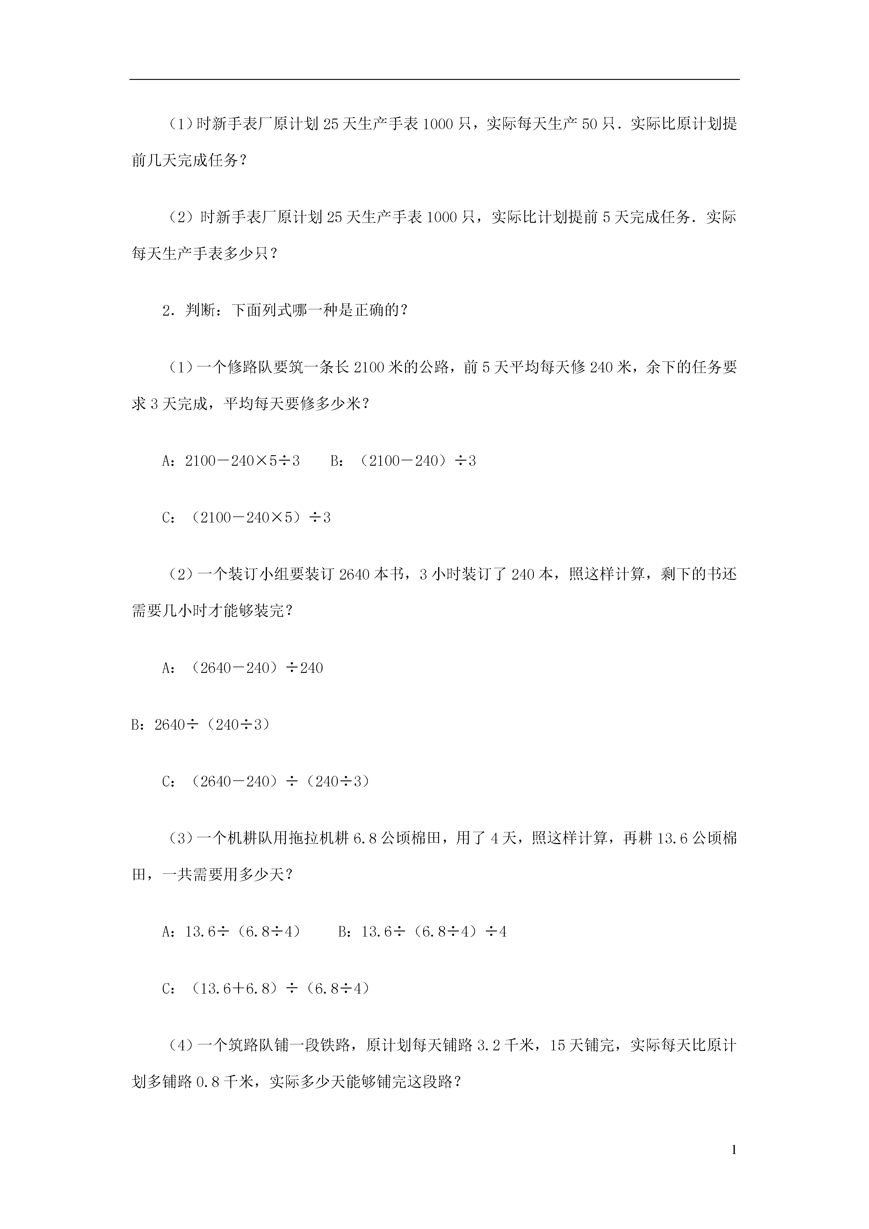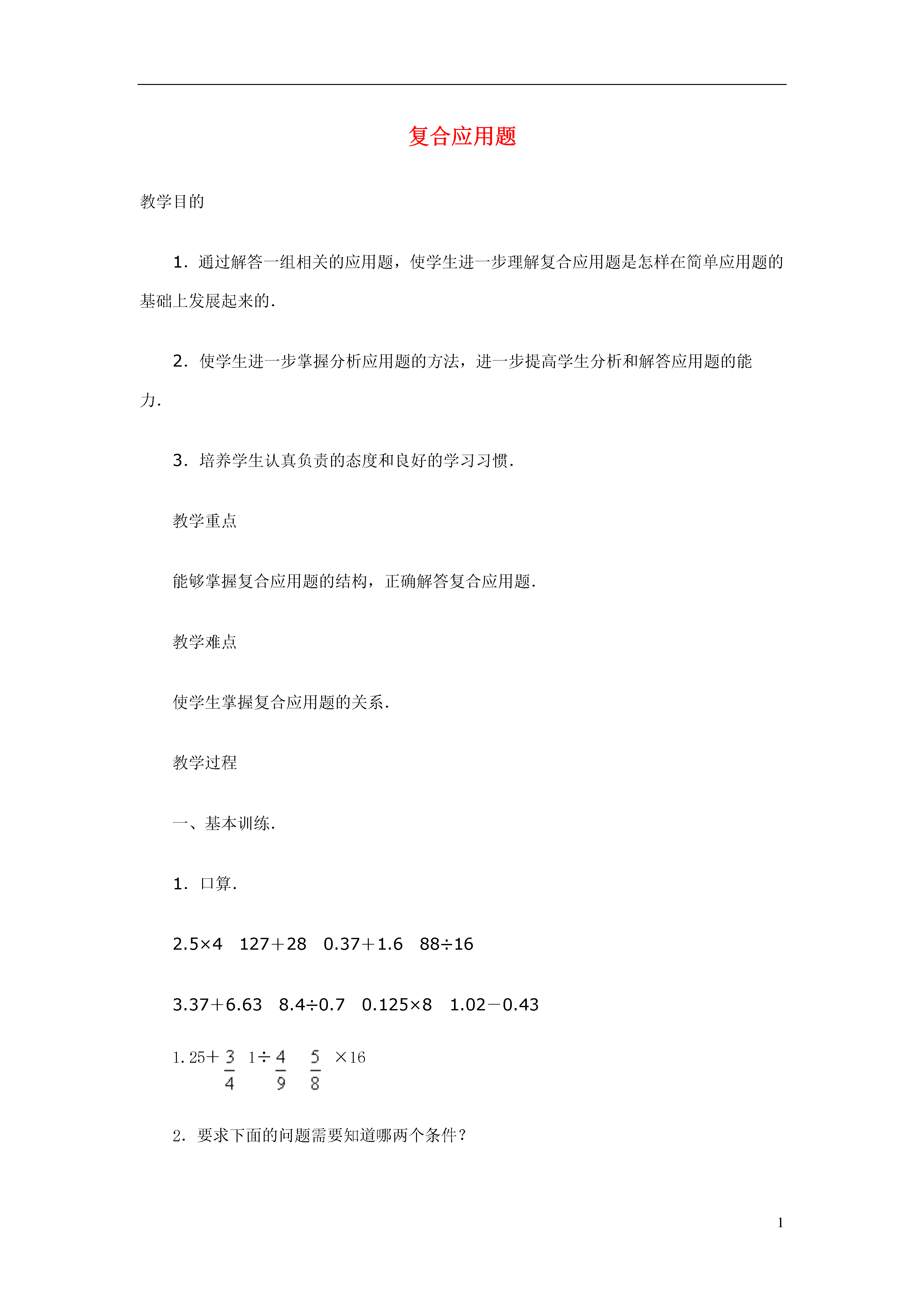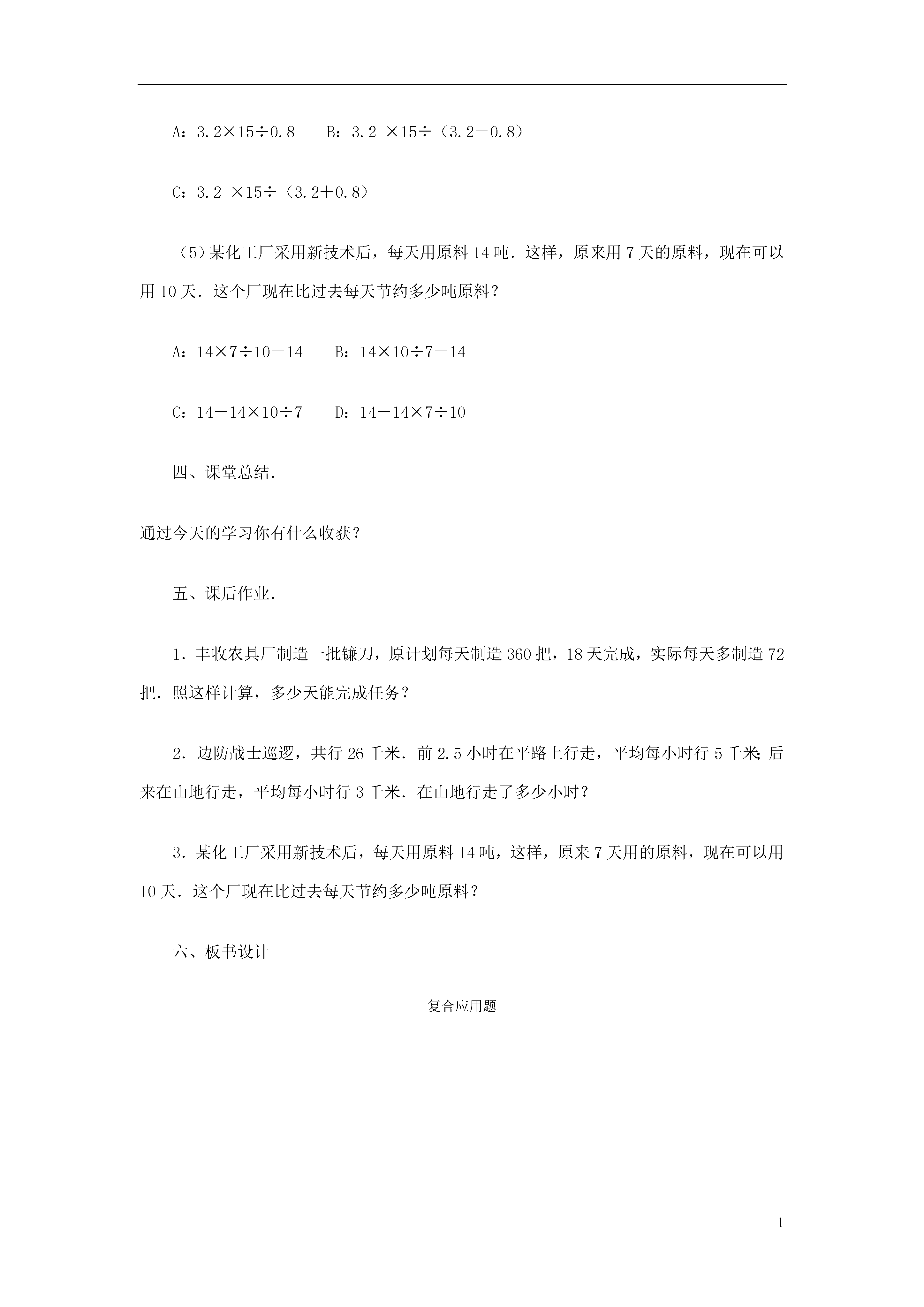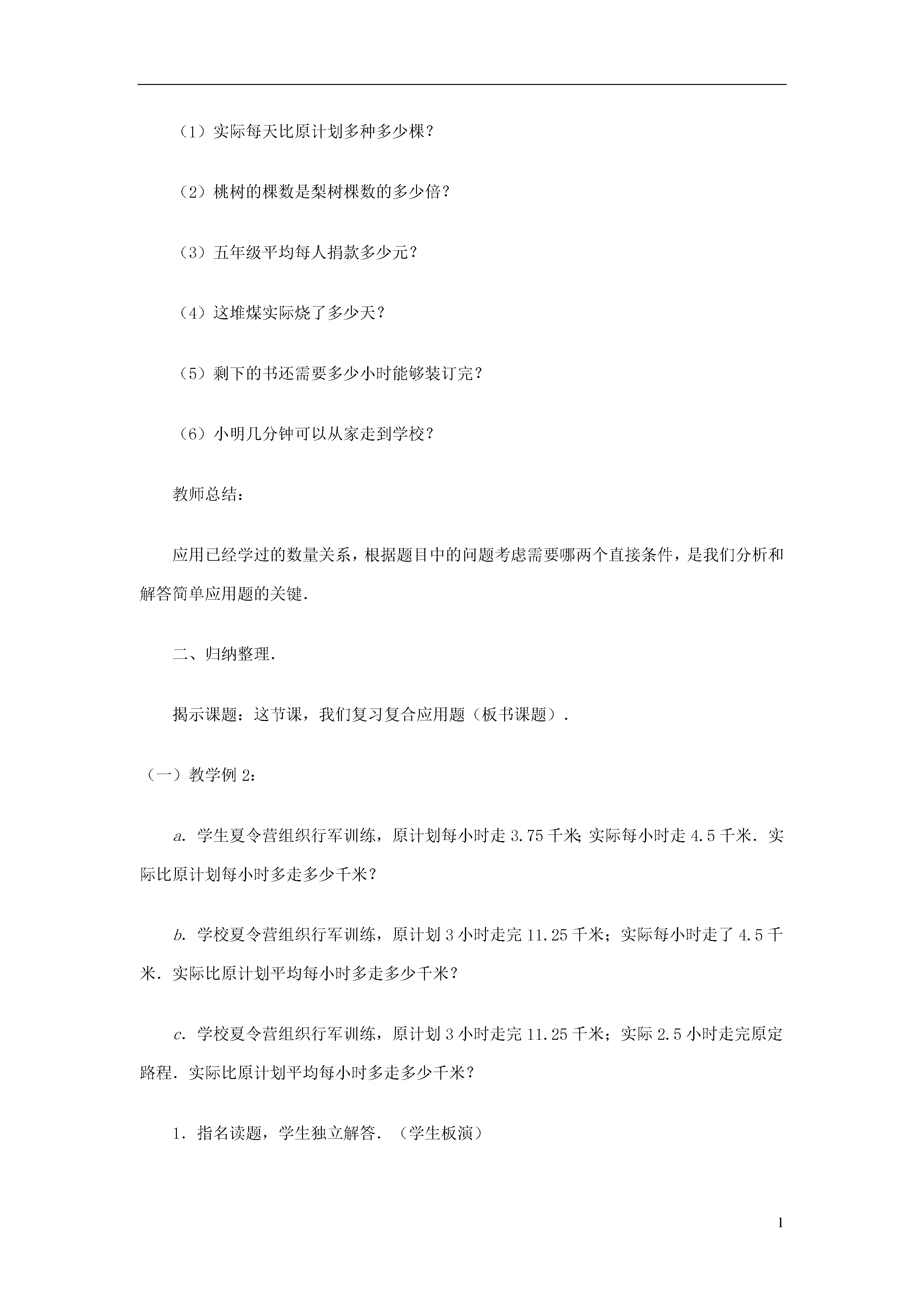 1复合应用题教学目的1.通过解答一组相关的应用题,使学生进一步理解复合应用题是怎样在简单应用题的基础上发展起来的.2.使学生进一步掌握分析应用题的方法,进一步提高学生分析和解答应用题的能力.3.培养学生认真负责的态度和良好的学习习惯.教学重点能够掌握复合应用题的结构,正确解答复合应用题.教学难点使学生掌握复合应用题的关系.教学过程一、基本训练.1.口算.2.5×4127+280.37+1.688÷163.37+6.638.4÷0.70.125×81.02-0.431.25+1÷×162.要求下面的问题需要知道哪两个条件?(1)实际每天比原计划多种多少棵?(2)桃树的棵数是梨树棵数的多少倍?(3)五年级平均每人捐款多少元?(4)这堆煤实际烧了多少天?(5)剩下的书还需要多少小时能够装订完?(6)小明几分钟可以从家走到学校?教师总结:应用已经学过的数量关系,根据题目中的问题考虑需要哪两个直接条件,是我们分析和解答简单应用题的关键.二、归纳整理.揭示课题:这节课,我们复习复合应用题(板书课题).(一)教学例2:a.学生夏令营组织行军训练,原计划每小时走3.75千米;实际每小时走4.5千米.实际比原计划每小时多走多少千米?b.学校夏令营组织行军训练,原计划3小时走完11.25千米;实际每小时走了4.5千米.实际比原计划平均每小时多走多少千米?c.学校夏令营组织行军训练,原计划3小时走完11.25千米;实际2.5小时走完原定路程.实际比原计划平均每小时多走多少千米?1.指名读题,学生独立解答.(学生板演)2.小组讨论:这三道题都有什么联系?这三道题有什么区别?联系:这三道题说的是同一件事,要求的问题也相同,都是求“实际比原计划平均每小时多走多少千米?”要求最后问题都需要先知道原计划每小时走的千米数和实际每小时走的千米数.区别:a、实际每小时走的和原计划每小时走的千米数都是已知的,只需要一步计算;b、实际每小时走的千米数是已知的.原计划每小时走的千米数是未知的,需要两步计算;c、实际每小时走的千米数和原计划每小时走的千米数都是未知的,需要三步计算.3.教师质疑:对于不能一步直接求出结果的应用题,我们应该怎样进行分析呢?请你们以小组为单位试着分析b、c量道例题.4.教师总结:从上面这组题我们可以看出,复合应用题都是由几个简单一步应用题组合而成的.在分析数量关系时我们可以从所求问题出发逐步找出所需要的已知条件,直到所需条件都是题目中的已知的为止.5.检验应用题的方法.我们想知道此题目做的对不对,你有什么好办法吗?(1)按照题意进行计算;(2)把所求得的问题作已知条件,按照题意倒着算,看最后结果是否符合题意.三、巩固反馈.1.解答并且比较下面两道应用题,说说它们之间有什么区别?(1)时新手表厂原计划25天生产手表1000只,实际每天生产50只.实际比原计划提前几天完成任务?(2)时新手表厂原计划25天生产手表1000只,实际比计划提前5天完成任务.实际每天生产手表多少只?2.判断:下面列式哪一种是正确的?(1)一个修路队要筑一条长2100米的公路,前5天平均每天修240米,余下的任务要求3天完成,平均每天要修多少米?A:2100-240×5÷3B:(2100-240)÷3C:(2100-240×5)÷3(2)一个装订小组要装订2640本书,3小时装订了240本,照这样计算,剩下的书还需要几小时才能够装完?A:(2640-240)÷240B:2640÷(240÷3)C:(2640-240)÷(240÷3)(3)一个机耕队用拖拉机耕6.8公顷棉田,用了4天,照这样计算,再耕13.6公顷棉田,一共需要用多少天?A:13.6÷(6.8÷4)B:13.6÷(6.8÷4)÷4C:(13.6+6.8)÷(6.8÷4)(4)一个筑路队铺一段铁路,原计划每天铺路3.2千米,15天铺完,实际每天比原计划多铺路0.8千米,实际多少天能够铺完这段路?A:3.2×15÷0.8B:3.2×15÷(3.2-0.8)C:3.2×15÷(3.2+0.8)(5)某化工厂采用新技术后,每天用原料14吨.这样,原来用7天的原料,现在可以用10天.这个厂现在比过去每天节约多少吨原料?A:14×7÷10-14B:14×10÷7-14C:14-14×10÷7D:14-14×7÷10四、课堂总结.通过今天的学习你有什么收获?五、课后作业.1.丰收农具厂制造一批镰刀,原计划每天制造360把,18天完成,实际每天多制造72把.照这样计算,多少天能完成任务?2.边防战士巡逻,共行26千米.前2.5小时在平路上行走,平均每小时行5千米;后来在山地行走