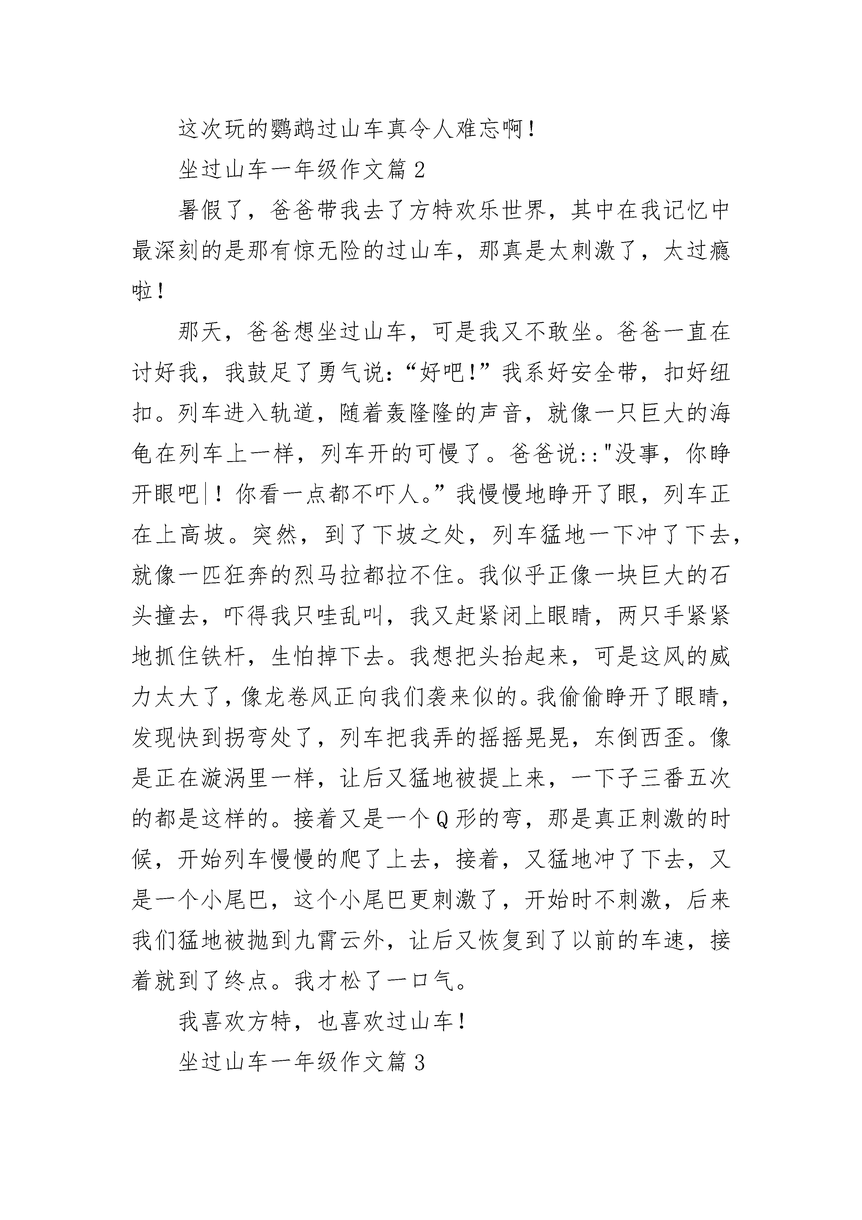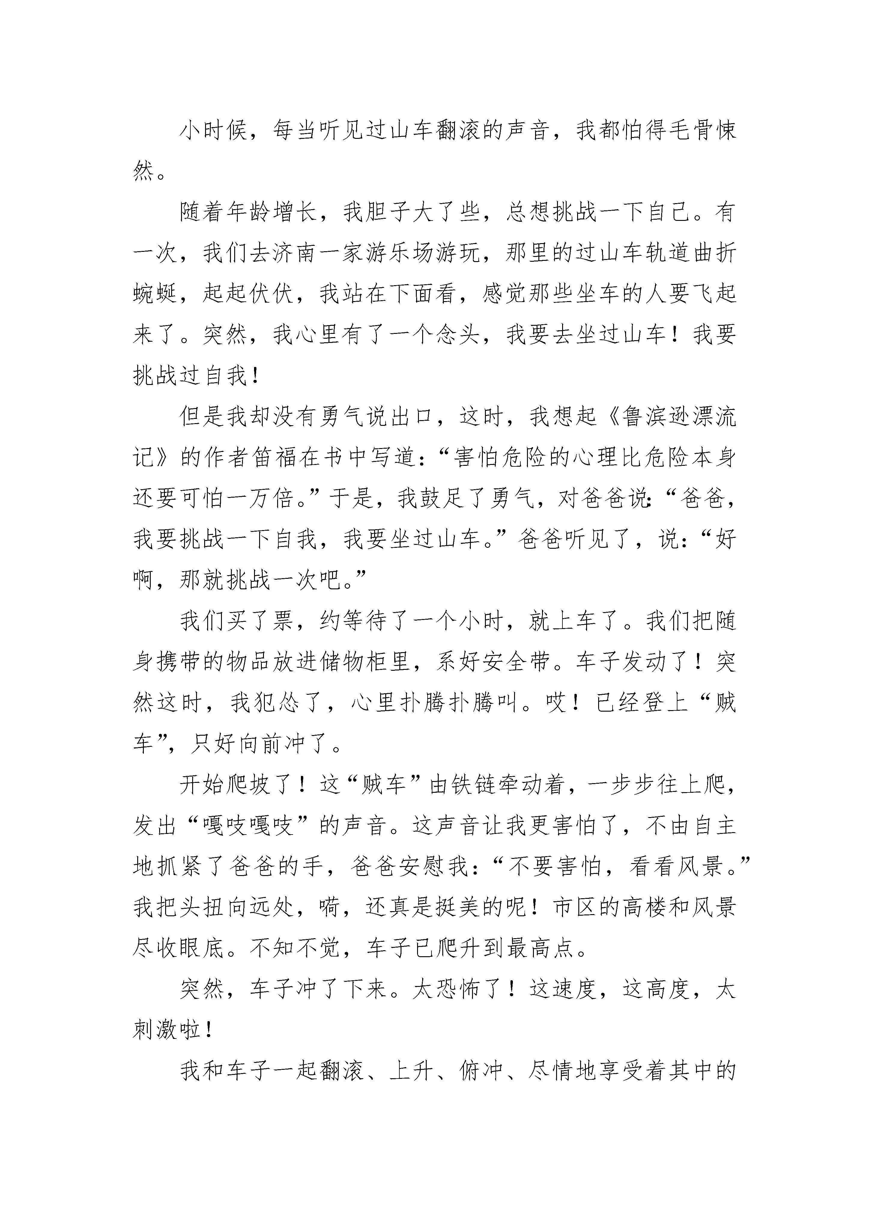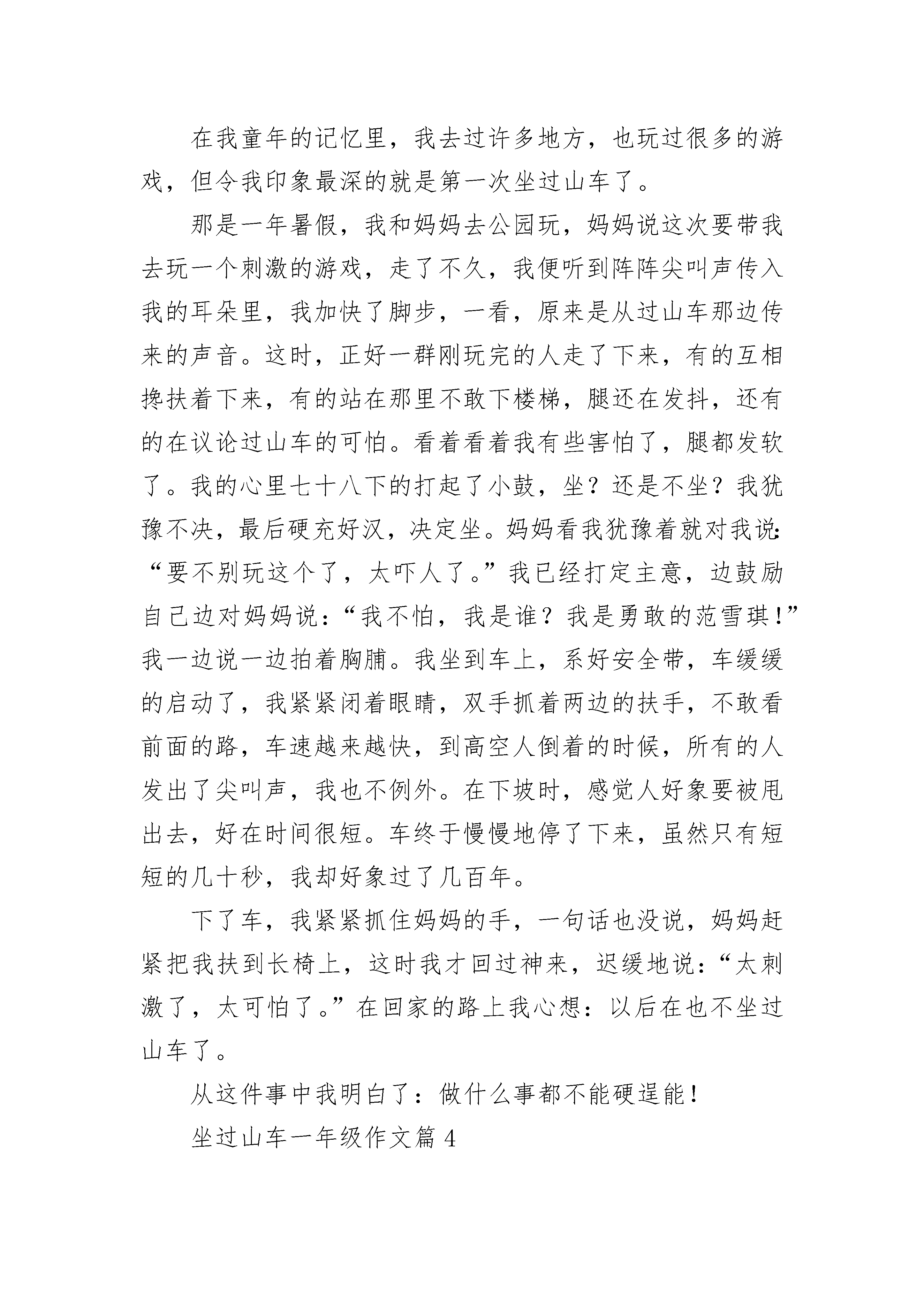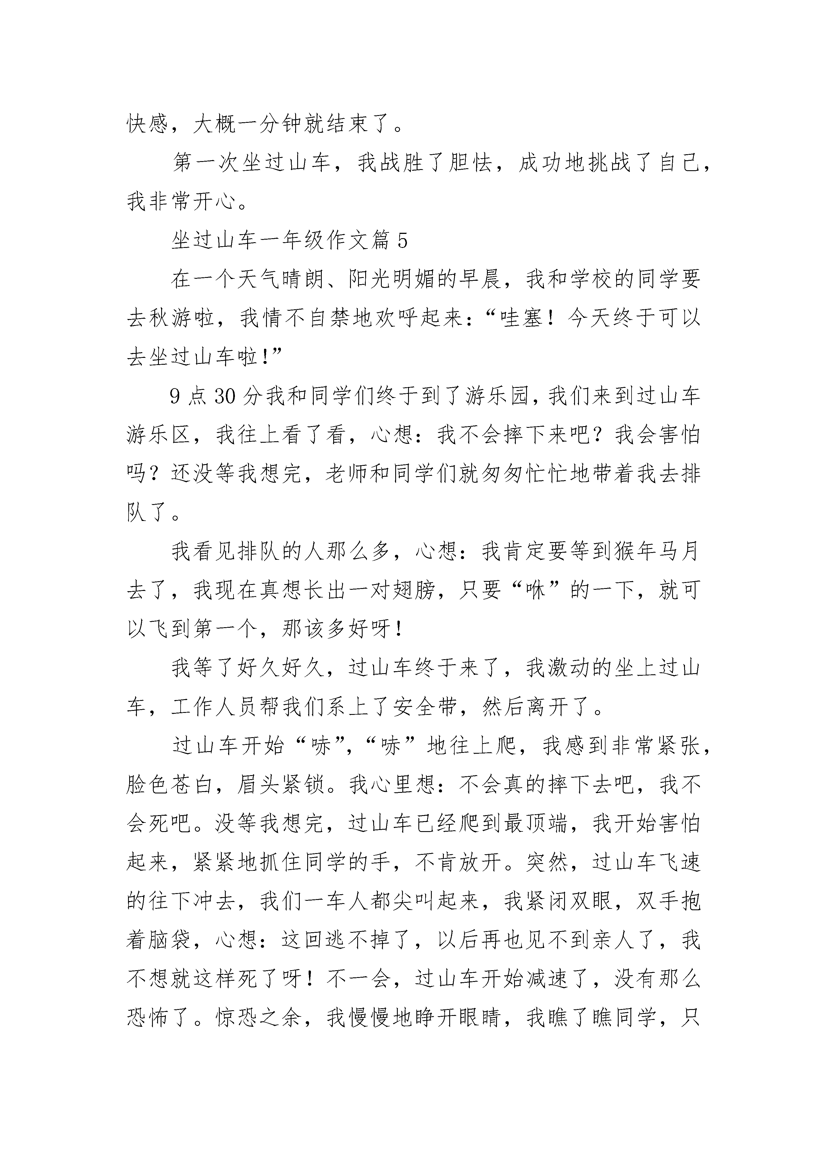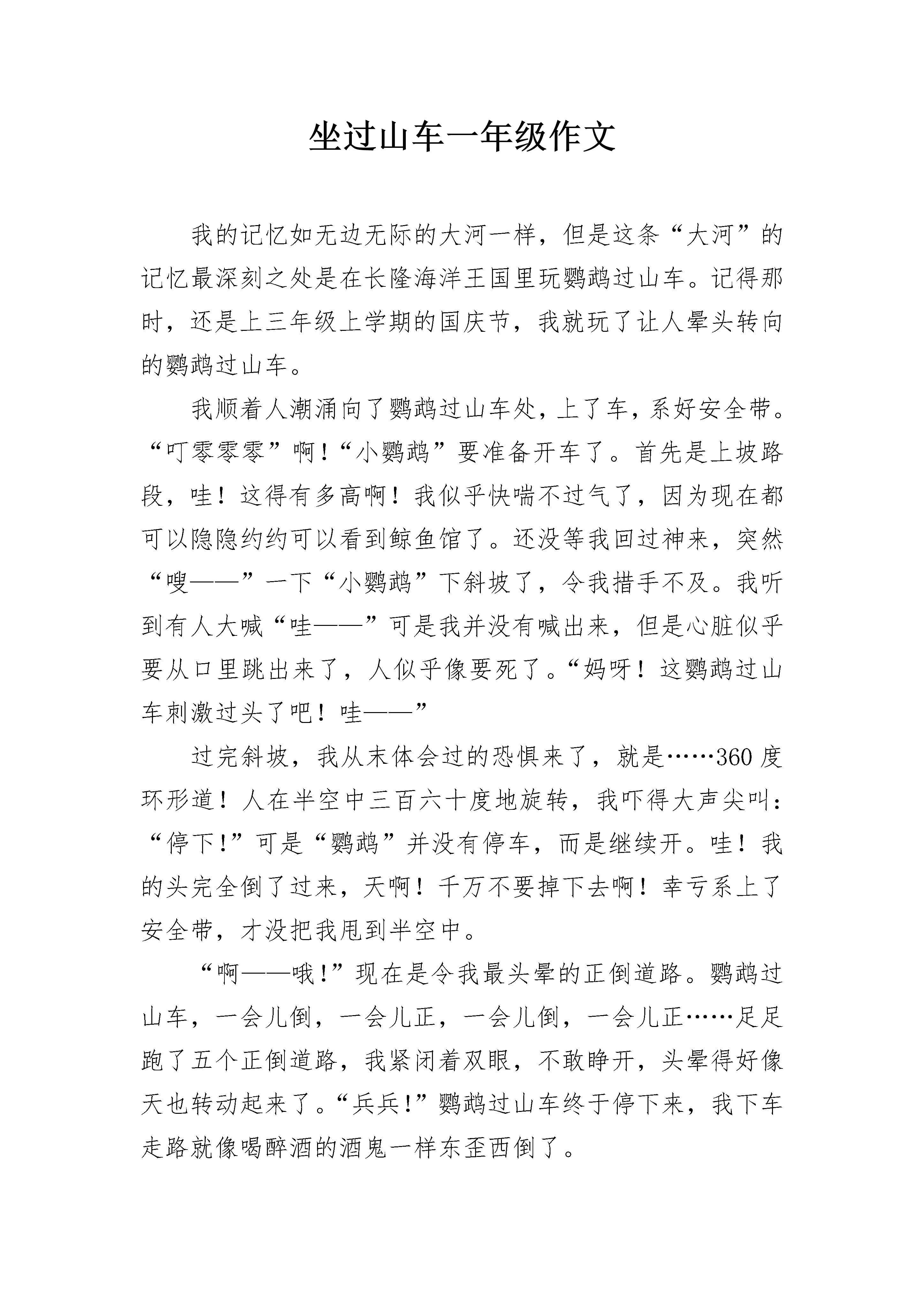 坐过山车一年级作文我的记忆如无边无际的大河一样,但是这条“大河”的记忆最深刻之处是在长隆海洋王国里玩鹦鹉过山车。记得那时,还是上三年级上学期的国庆节,我就玩了让人晕头转向的鹦鹉过山车。我顺着人潮涌向了鹦鹉过山车处,上了车,系好安全带。“叮零零零”啊!“小鹦鹉”要准备开车了。首先是上坡路段,哇!这得有多高啊!我似乎快喘不过气了,因为现在都可以隐隐约约可以看到鲸鱼馆了。还没等我回过神来,突然“嗖——”一下“小鹦鹉”下斜坡了,令我措手不及。我听到有人大喊“哇——”可是我并没有喊出来,但是心脏似乎要从口里跳出来了,人似乎像要死了。“妈呀!这鹦鹉过山车刺激过头了吧!哇——”过完斜坡,我从末体会过的恐惧来了,就是……360度环形道!人在半空中三百六十度地旋转,我吓得大声尖叫:“停下!”可是“鹦鹉”并没有停车,而是继续开。哇!我的头完全倒了过来,天啊!千万不要掉下去啊!幸亏系上了安全带,才没把我甩到半空中。“啊——哦!”现在是令我最头晕的正倒道路。鹦鹉过山车,一会儿倒,一会儿正,一会儿倒,一会儿正……足足跑了五个正倒道路,我紧闭着双眼,不敢睁开,头晕得好像天也转动起来了。“兵兵!”鹦鹉过山车终于停下来,我下车走路就像喝醉酒的酒鬼一样东歪西倒了。这次玩的鹦鹉过山车真令人难忘啊!坐过山车一年级作文篇2暑假了,爸爸带我去了方特欢乐世界,其中在我记忆中最深刻的是那有惊无险的过山车,那真是太刺激了,太过瘾啦!那天,爸爸想坐过山车,可是我又不敢坐。爸爸一直在讨好我,我鼓足了勇气说:“好吧!”我系好安全带,扣好纽扣。列车进入轨道,随着轰隆隆的声音,就像一只巨大的海龟在列车上一样,列车开的可慢了。爸爸说::"没事,你睁开眼吧|!你看一点都不吓人。”我慢慢地睁开了眼,列车正在上高坡。突然,到了下坡之处,列车猛地一下冲了下去,就像一匹狂奔的烈马拉都拉不住。我似乎正像一块巨大的石头撞去,吓得我只哇乱叫,我又赶紧闭上眼睛,两只手紧紧地抓住铁杆,生怕掉下去。我想把头抬起来,可是这风的威力太大了,像龙卷风正向我们袭来似的。我偷偷睁开了眼睛,发现快到拐弯处了,列车把我弄的摇摇晃晃,东倒西歪。像是正在漩涡里一样,让后又猛地被提上来,一下子三番五次的都是这样的。接着又是一个Q形的弯,那是真正刺激的时候,开始列车慢慢的爬了上去,接着,又猛地冲了下去,又是一个小尾巴,这个小尾巴更刺激了,开始时不刺激,后来我们猛地被抛到九霄云外,让后又恢复到了以前的车速,接着就到了终点。我才松了一口气。我喜欢方特,也喜欢过山车!坐过山车一年级作文篇3在我童年的记忆里,我去过许多地方,也玩过很多的游戏,但令我印象最深的就是第一次坐过山车了。那是一年暑假,我和妈妈去公园玩,妈妈说这次要带我去玩一个刺激的游戏,走了不久,我便听到阵阵尖叫声传入我的耳朵里,我加快了脚步,一看,原来是从过山车那边传来的声音。这时,正好一群刚玩完的人走了下来,有的互相搀扶着下来,有的站在那里不敢下楼梯,腿还在发抖,还有的在议论过山车的可怕。看着看着我有些害怕了,腿都发软了。我的心里七十八下的打起了小鼓,坐?还是不坐?我犹豫不决,最后硬充好汉,决定坐。妈妈看我犹豫着就对我说:“要不别玩这个了,太吓人了。”我已经打定主意,边鼓励自己边对妈妈说:“我不怕,我是谁?我是勇敢的范雪琪!”我一边说一边拍着胸脯。我坐到车上,系好安全带,车缓缓的启动了,我紧紧闭着眼睛,双手抓着两边的扶手,不敢看前面的路,车速越来越快,到高空人倒着的时候,所有的人发出了尖叫声,我也不例外。在下坡时,感觉人好象要被甩出去,好在时间很短。车终于慢慢地停了下来,虽然只有短短的几十秒,我却好象过了几百年。下了车,我紧紧抓住妈妈的手,一句话也没说,妈妈赶紧把我扶到长椅上,这时我才回过神来,迟缓地说:“太刺激了,太可怕了。”在回家的路上我心想:以后在也不坐过山车了。从这件事中我明白了:做什么事都不能硬逞能!坐过山车一年级作文篇4小时候,每当听见过山车翻滚的声音,我都怕得毛骨悚然。随着年龄增长,我胆子大了些,总想挑战一下自己。有一次,我们去济南一家游乐场游玩,那里的过山车轨道曲折蜿蜒,起起伏伏,我站在下面看,感觉那些坐车的人要飞起来了。突然,我心里有了一个念头,我要去坐过山车!我要挑战过自我!但是我却没有勇气说出口,这时,我想起《鲁滨逊漂流记》的作者笛福在书中写道:“害怕危险的心理比危险本身还要可怕一万倍。”于是,我鼓足了勇气,对爸爸说:“爸爸,我要挑战一下自我,我要坐过山车。”爸爸听见了,说:“好啊,那就挑战一次吧。”我们买了票,约等待了一个小时,就上车了。我们把随身携带的物品放进储物柜里,系好安全带。车子发动了!突然这时,我犯怂了,心里扑腾扑腾叫。哎!已经登上“贼车”,只好向前冲了。开始爬坡了!这“贼车”由铁链牵动着,一步步往上爬,发出“嘎吱嘎吱”的声音。这声音让