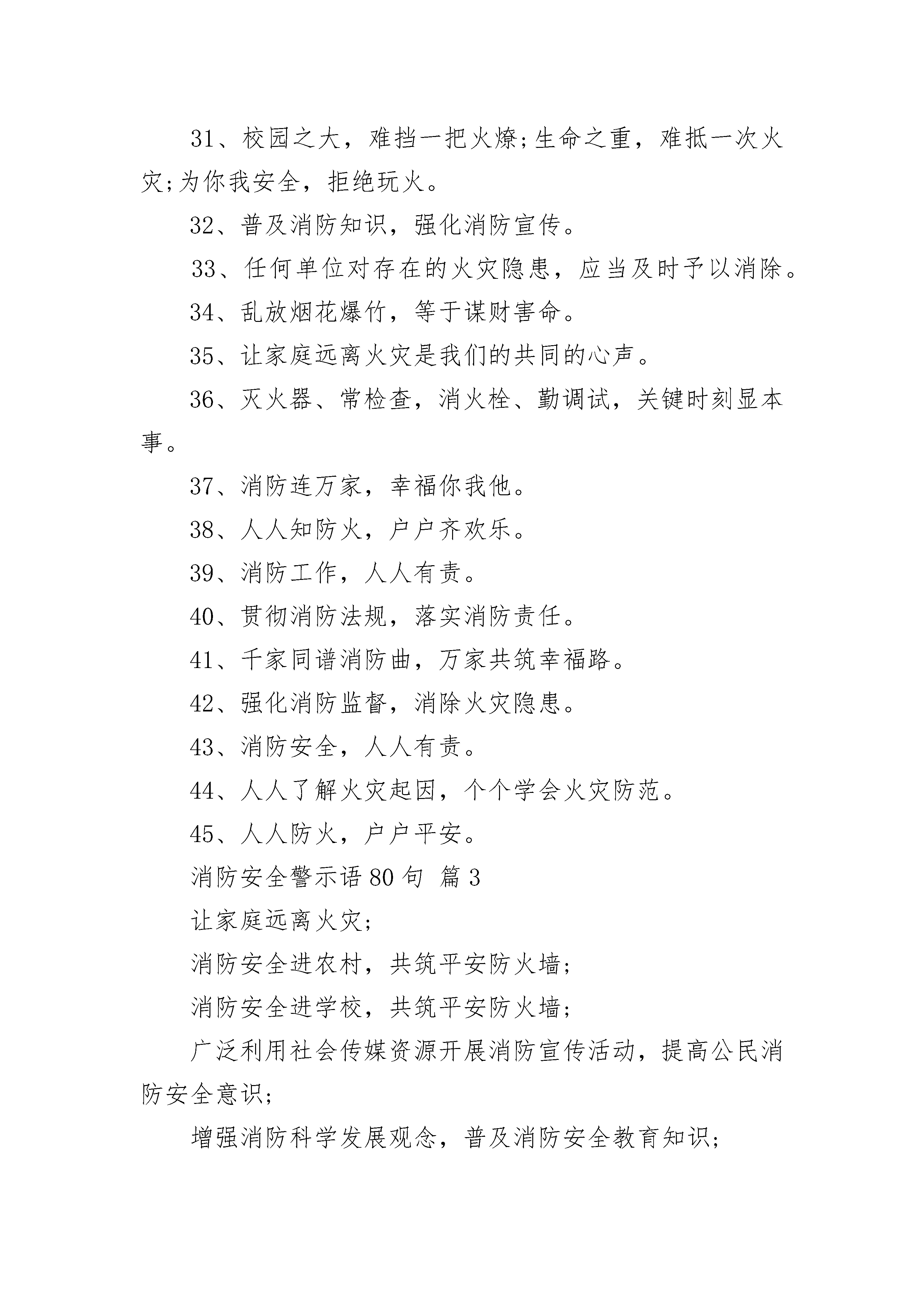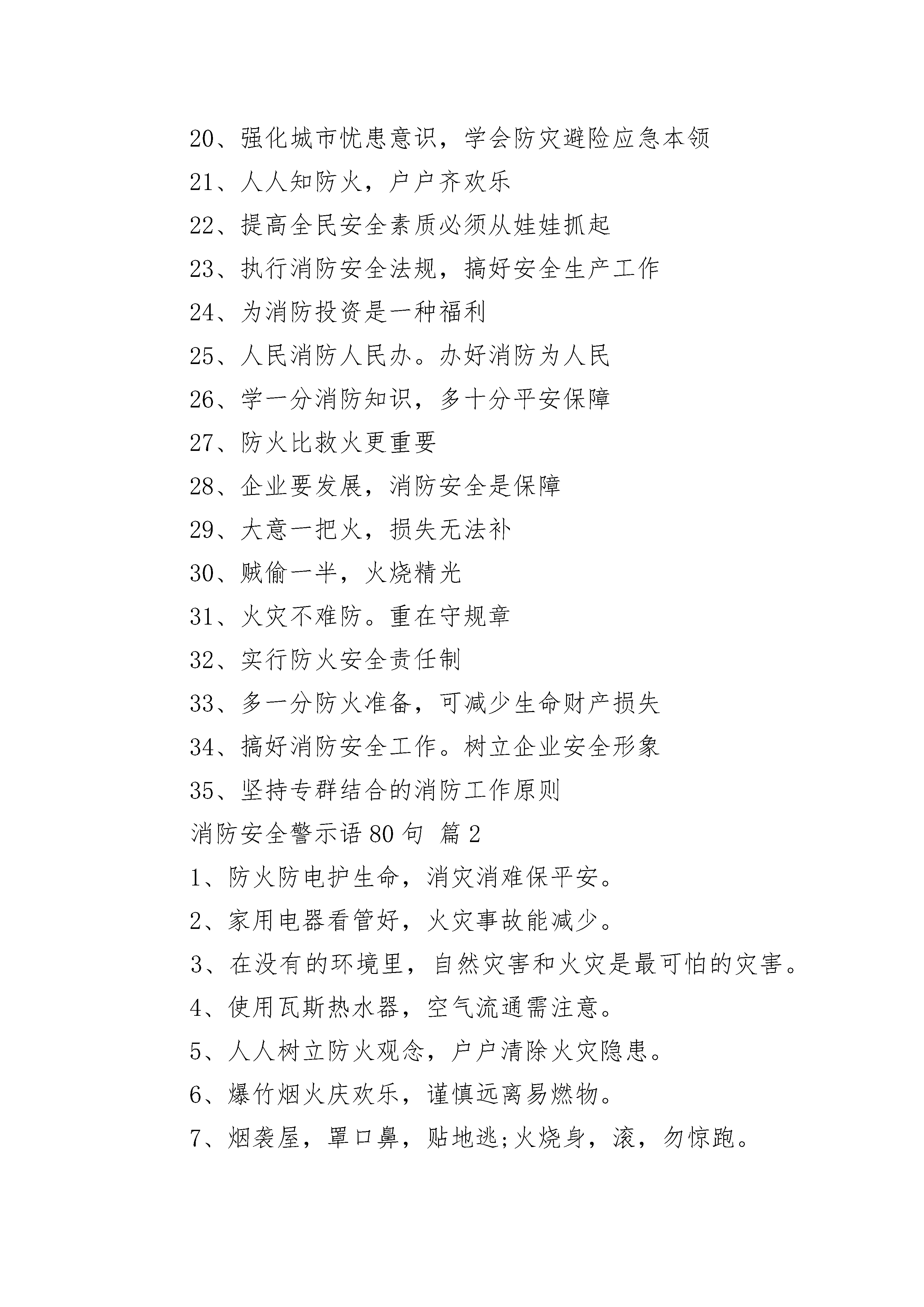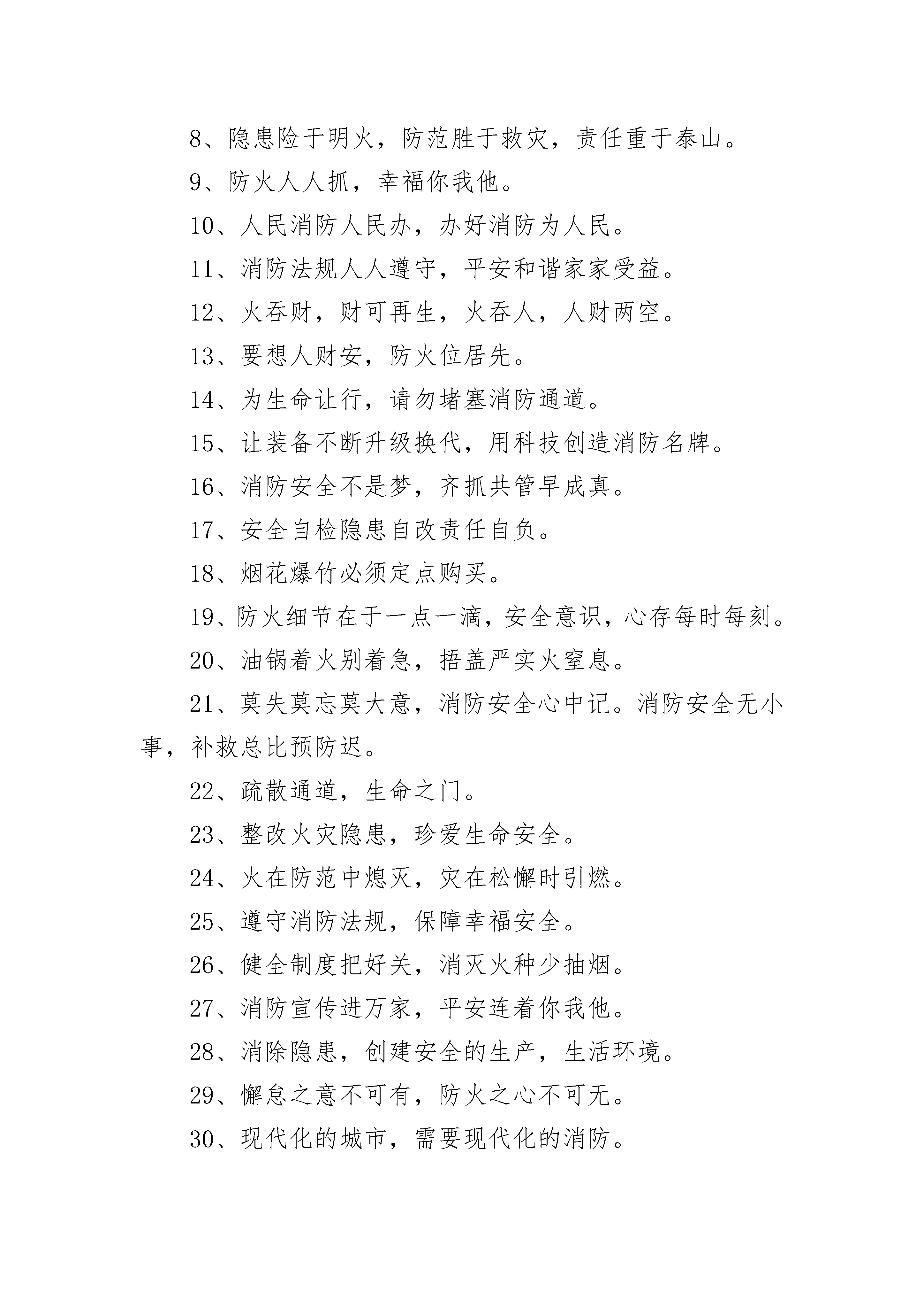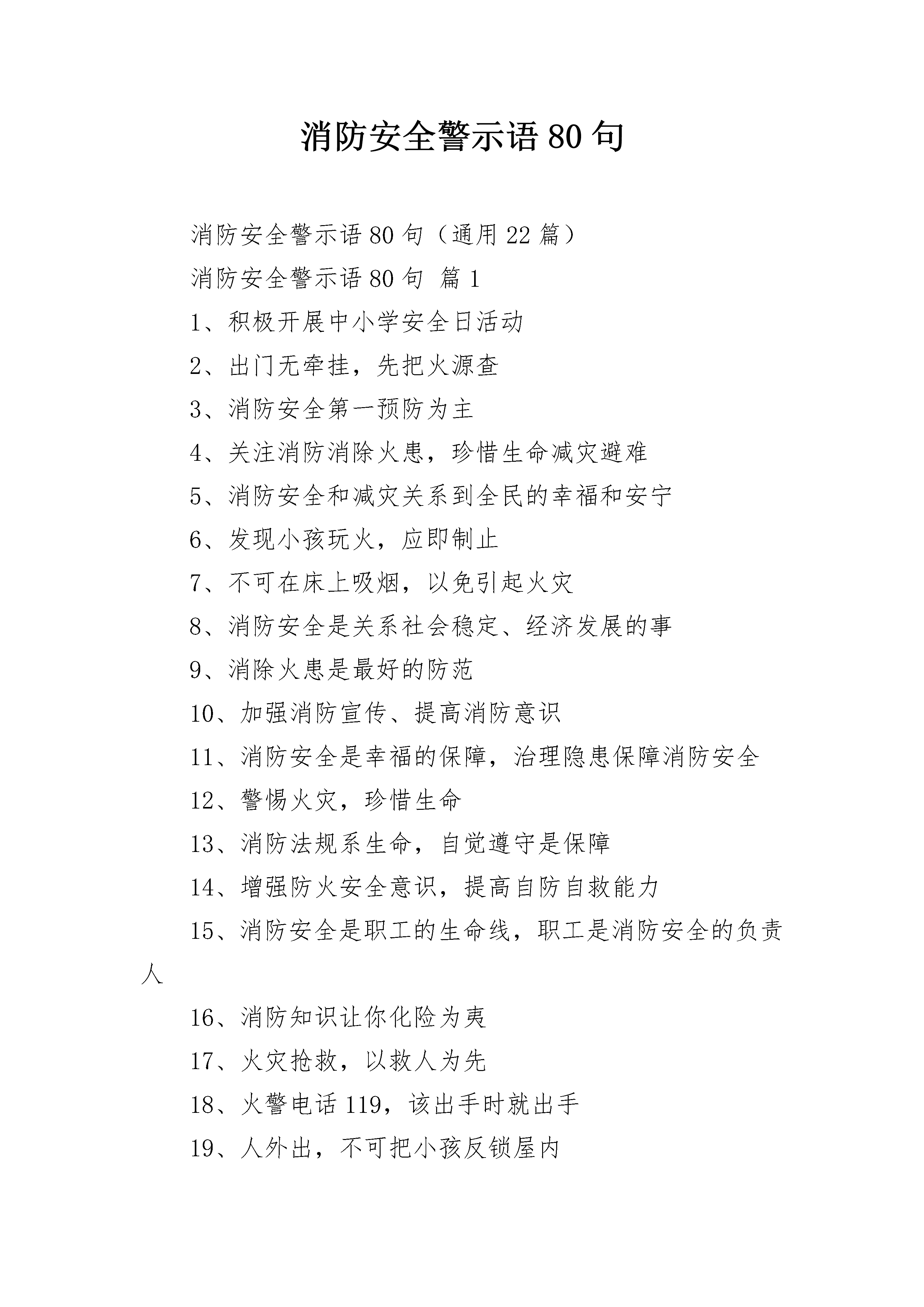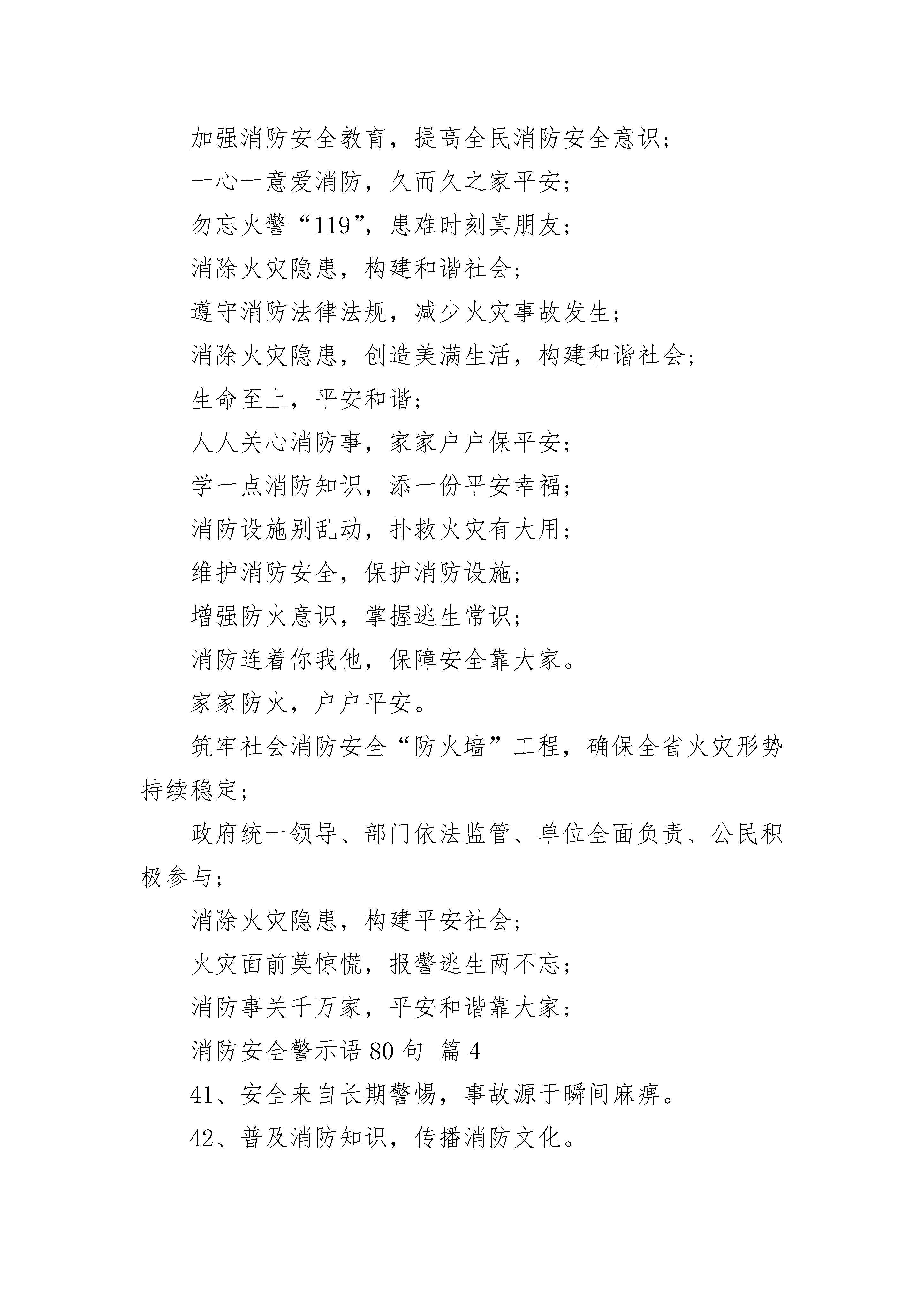 消防安全警示语80句消防安全警示语80句(通用22篇)消防安全警示语80句篇11、积极开展中小学安全日活动2、出门无牵挂,先把火源查3、消防安全第一预防为主4、关注消防消除火患,珍惜生命减灾避难5、消防安全和减灾关系到全民的幸福和安宁6、发现小孩玩火,应即制止7、不可在床上吸烟,以免引起火灾8、消防安全是关系社会稳定、经济发展的事9、消除火患是最好的防范10、加强消防宣传、提高消防意识11、消防安全是幸福的保障,治理隐患保障消防安全12、警惕火灾,珍惜生命13、消防法规系生命,自觉遵守是保障14、增强防火安全意识,提高自防自救能力15、消防安全是职工的生命线,职工是消防安全的负责人16、消防知识让你化险为夷17、火灾抢救,以救人为先18、火警电话119,该出手时就出手19、人外出,不可把小孩反锁屋内20、强化城市忧患意识,学会防灾避险应急本领21、人人知防火,户户齐欢乐22、提高全民安全素质必须从娃娃抓起23、执行消防安全法规,搞好安全生产工作24、为消防投资是一种福利25、人民消防人民办。办好消防为人民26、学一分消防知识,多十分平安保障27、防火比救火更重要28、企业要发展,消防安全是保障29、大意一把火,损失无法补30、贼偷一半,火烧精光31、火灾不难防。重在守规章32、实行防火安全责任制33、多一分防火准备,可减少生命财产损失34、搞好消防安全工作。树立企业安全形象35、坚持专群结合的消防工作原则消防安全警示语80句篇21、防火防电护生命,消灾消难保平安。2、家用电器看管好,火灾事故能减少。3、在没有的环境里,自然灾害和火灾是最可怕的灾害。4、使用瓦斯热水器,空气流通需注意。5、人人树立防火观念,户户清除火灾隐患。6、爆竹烟火庆欢乐,谨慎远离易燃物。7、烟袭屋,罩口鼻,贴地逃;火烧身,滚,勿惊跑。8、隐患险于明火,防范胜于救灾,责任重于泰山。9、防火人人抓,幸福你我他。10、人民消防人民办,办好消防为人民。11、消防法规人人遵守,平安和谐家家受益。12、火吞财,财可再生,火吞人,人财两空。13、要想人财安,防火位居先。14、为生命让行,请勿堵塞消防通道。15、让装备不断升级换代,用科技创造消防名牌。16、消防安全不是梦,齐抓共管早成真。17、安全自检隐患自改责任自负。18、烟花爆竹必须定点购买。19、防火细节在于一点一滴,安全意识,心存每时每刻。20、油锅着火别着急,捂盖严实火窒息。21、莫失莫忘莫大意,消防安全心中记。消防安全无小事,补救总比预防迟。22、疏散通道,生命之门。23、整改火灾隐患,珍爱生命安全。24、火在防范中熄灭,灾在松懈时引燃。25、遵守消防法规,保障幸福安全。26、健全制度把好关,消灭火种少抽烟。27、消防宣传进万家,平安连着你我他。28、消除隐患,创建安全的生产,生活环境。29、懈怠之意不可有,防火之心不可无。30、现代化的城市,需要现代化的消防。31、校园之大,难挡一把火燎;生命之重,难抵一次火灾;为你我安全,拒绝玩火。32、普及消防知识,强化消防宣传。33、任何单位对存在的火灾隐患,应当及时予以消除。34、乱放烟花爆竹,等于谋财害命。35、让家庭远离火灾是我们的共同的心声。36、灭火器、常检查,消火栓、勤调试,关键时刻显本事。37、消防连万家,幸福你我他。38、人人知防火,户户齐欢乐。39、消防工作,人人有责。40、贯彻消防法规,落实消防责任。41、千家同谱消防曲,万家共筑幸福路。42、强化消防监督,消除火灾隐患。43、消防安全,人人有责。44、人人了解火灾起因,个个学会火灾防范。45、人人防火,户户平安。消防安全警示语80句篇3让家庭远离火灾;消防安全进农村,共筑平安防火墙;消防安全进学校,共筑平安防火墙;广泛利用社会传媒资源开展消防宣传活动,提高公民消防安全意识;增强消防科学发展观念,普及消防安全教育知识;加强消防安全教育,提高全民消防安全意识;一心一意爱消防,久而久之家平安;勿忘火警“119”,患难时刻真朋友;消除火灾隐患,构建和谐社会;遵守消防法律法规,减少火灾事故发生;消除火灾隐患,创造美满生活,构建和谐社会;生命至上,平安和谐;人人关心消防事,家家户户保平安;学一点消防知识,添一份平安幸福;消防设施别乱动,扑救火灾有大用;维护消防安全,保护消防设施;增强防火意识,掌握逃生常识;消防连着你我他,保障安全靠大家。家家防火,户户平安。筑牢社会消防安全“防火墙”工程,确保全省火灾形势持续稳定;政府统一领导、部门依法监管、单位全面负责、公民积极参与;消除火灾隐患,构建平安社会;火灾面前莫惊慌,报警逃生两不忘;消防事关千万家,平安和谐靠大家;消防安全警示语80句篇441、安全来自长期警惕,事故源于瞬间麻痹。42、普及消防知识,传播消防文化。43、生命热线,平安音符。44、爆竹烟火危险多,
