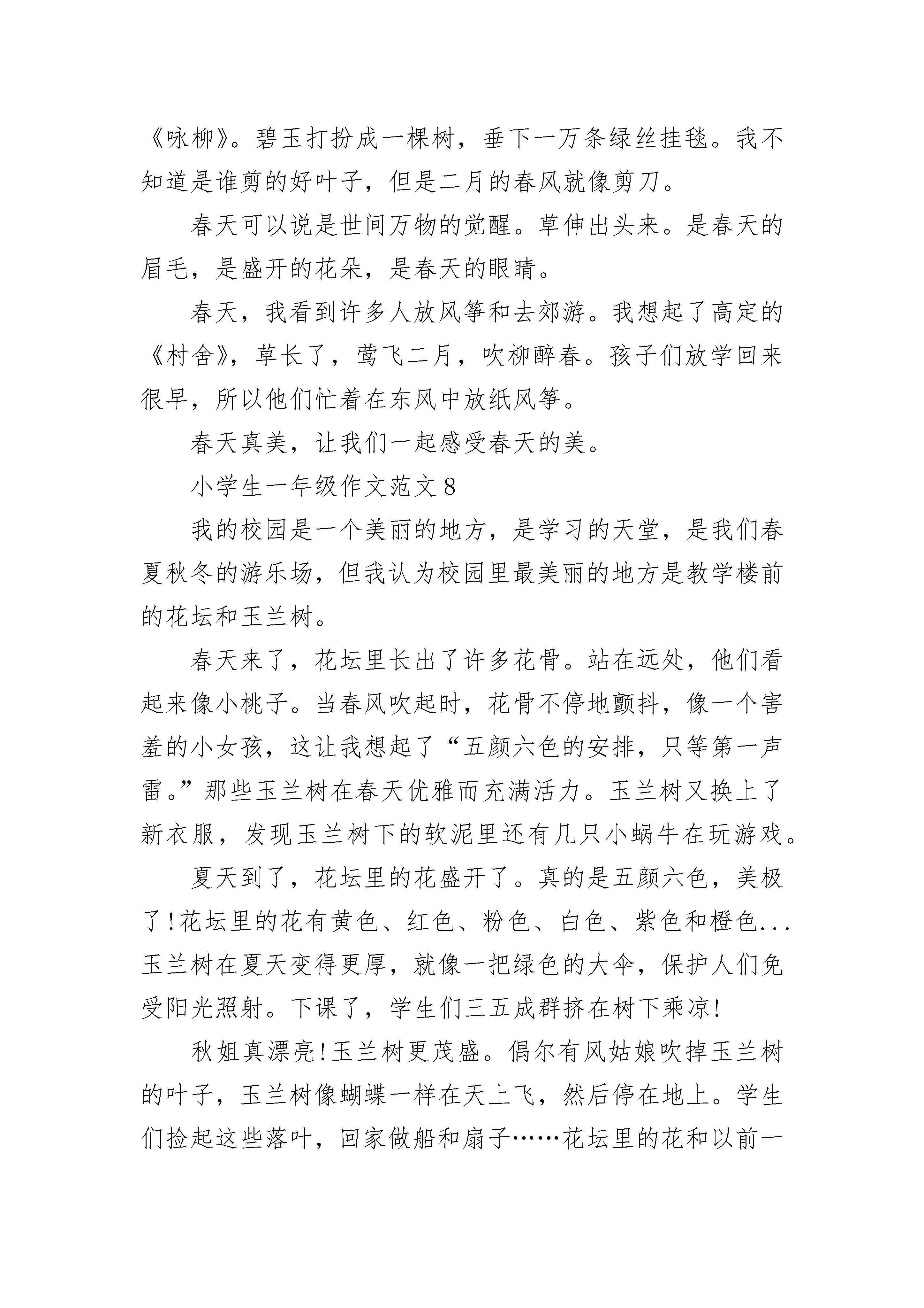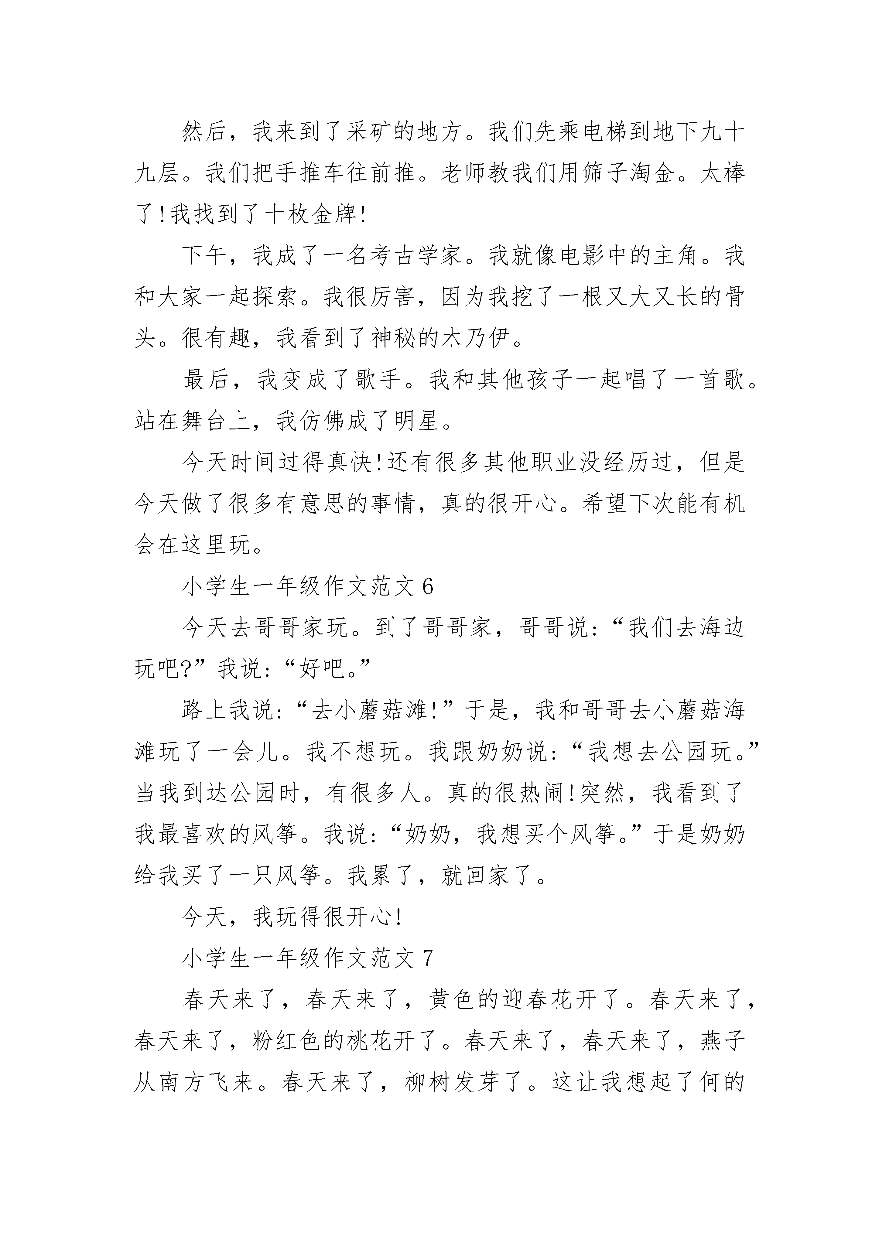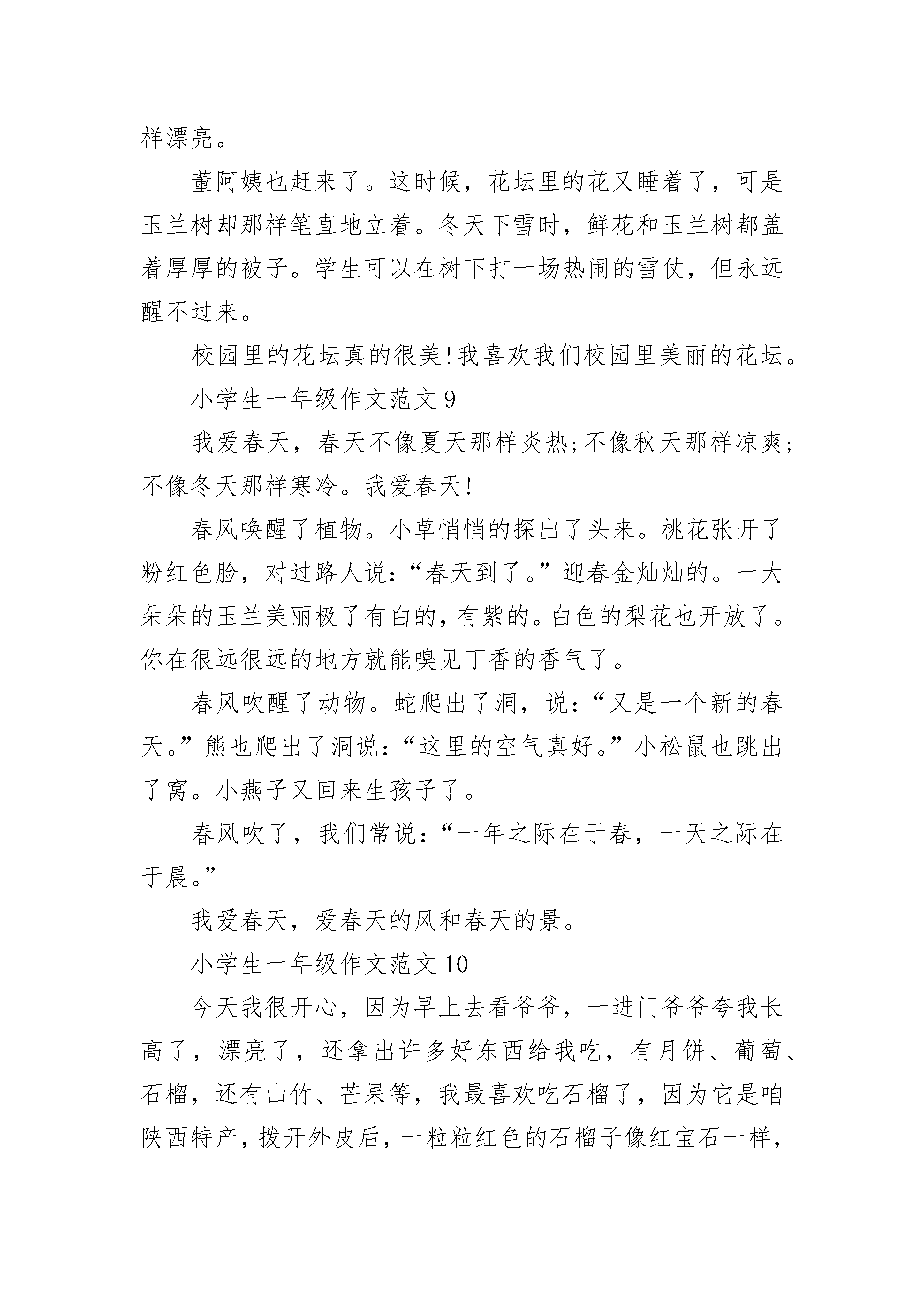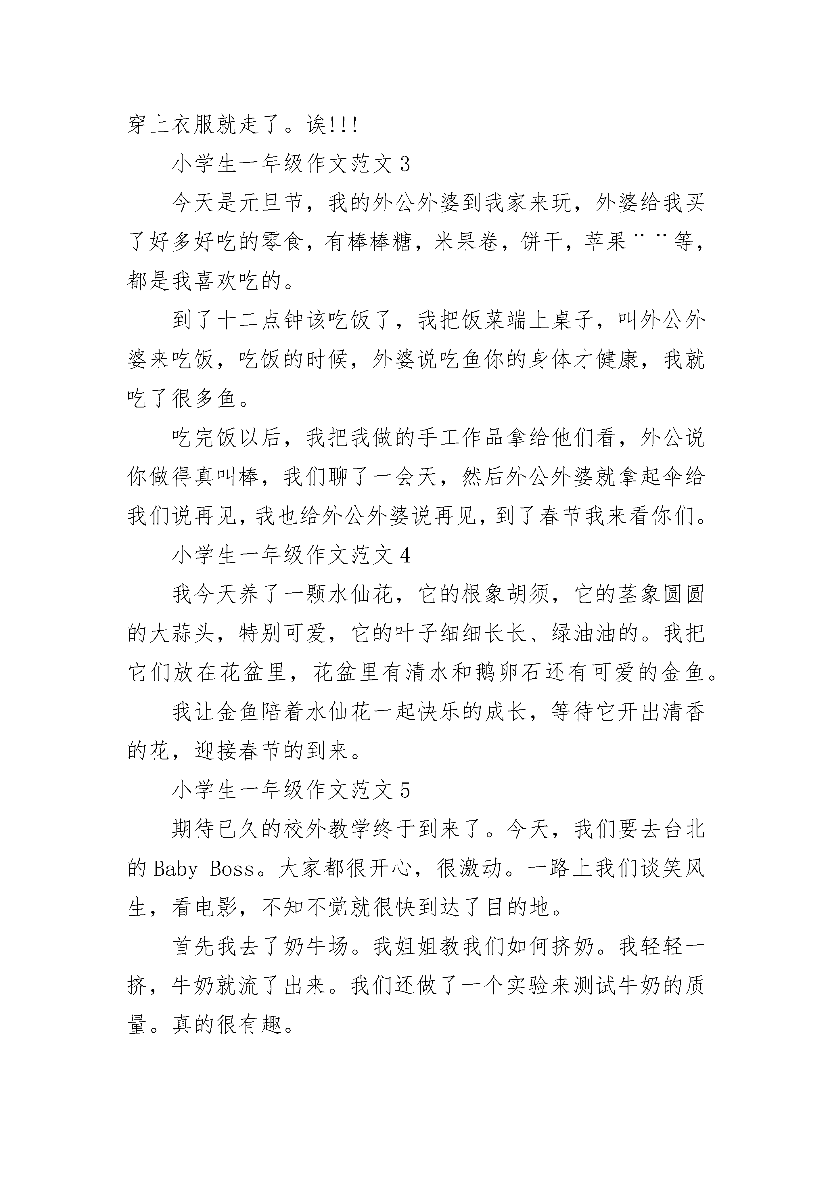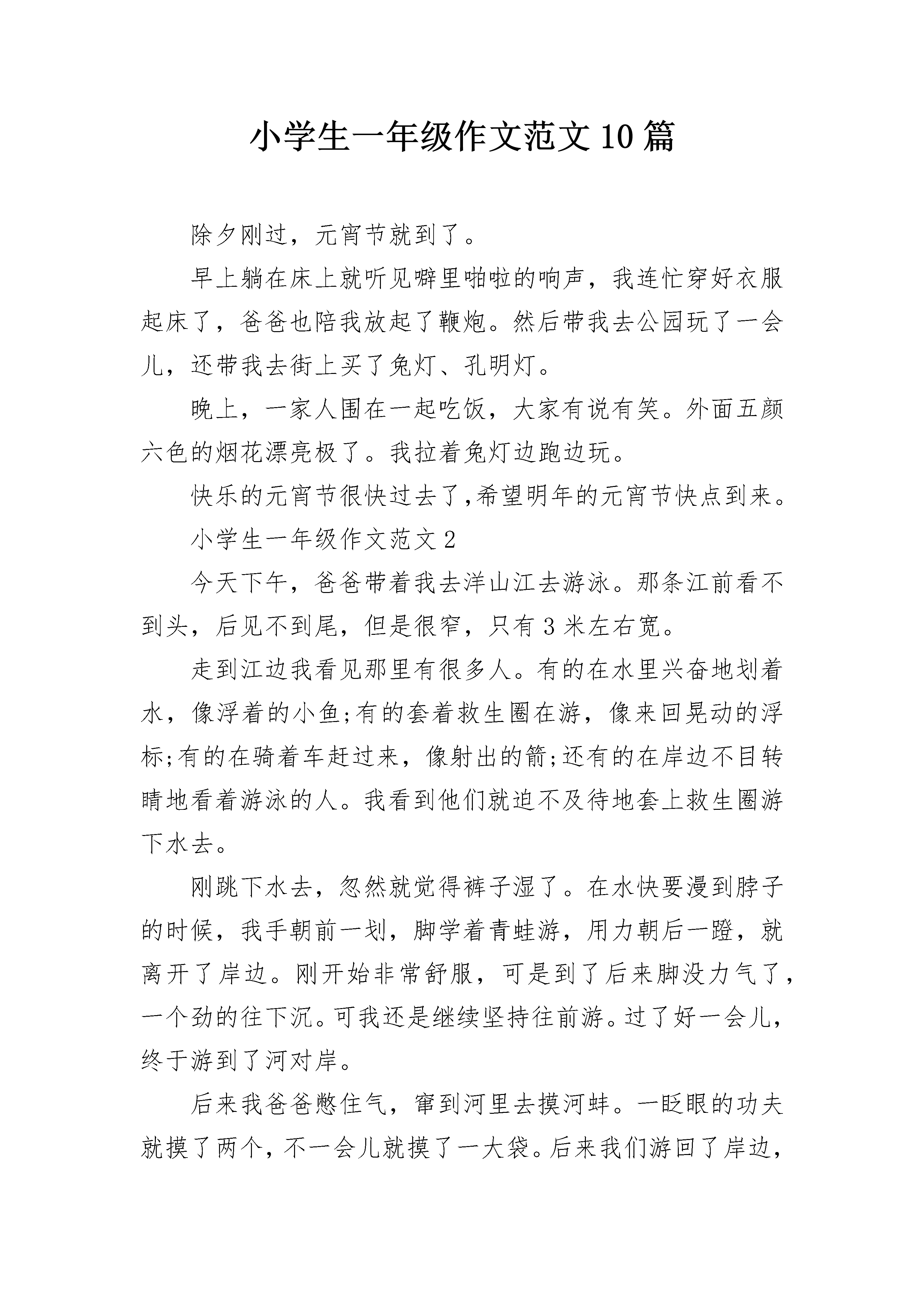 小学生一年级作文范文10篇除夕刚过,元宵节就到了。早上躺在床上就听见噼里啪啦的响声,我连忙穿好衣服起床了,爸爸也陪我放起了鞭炮。然后带我去公园玩了一会儿,还带我去街上买了兔灯、孔明灯。晚上,一家人围在一起吃饭,大家有说有笑。外面五颜六色的烟花漂亮极了。我拉着兔灯边跑边玩。快乐的元宵节很快过去了,希望明年的元宵节快点到来。小学生一年级作文范文2今天下午,爸爸带着我去洋山江去游泳。那条江前看不到头,后见不到尾,但是很窄,只有3米左右宽。走到江边我看见那里有很多人。有的在水里兴奋地划着水,像浮着的小鱼;有的套着救生圈在游,像来回晃动的浮标;有的在骑着车赶过来,像射出的箭;还有的在岸边不目转睛地看着游泳的人。我看到他们就迫不及待地套上救生圈游下水去。刚跳下水去,忽然就觉得裤子湿了。在水快要漫到脖子的时候,我手朝前一划,脚学着青蛙游,用力朝后一蹬,就离开了岸边。刚开始非常舒服,可是到了后来脚没力气了,一个劲的往下沉。可我还是继续坚持往前游。过了好一会儿,终于游到了河对岸。后来我爸爸憋住气,窜到河里去摸河蚌。一眨眼的功夫就摸了两个,不一会儿就摸了一大袋。后来我们游回了岸边,穿上衣服就走了。诶!!!小学生一年级作文范文3今天是元旦节,我的外公外婆到我家来玩,外婆给我买了好多好吃的零食,有棒棒糖,米果卷,饼干,苹果¨¨等,都是我喜欢吃的。到了十二点钟该吃饭了,我把饭菜端上桌子,叫外公外婆来吃饭,吃饭的时候,外婆说吃鱼你的身体才健康,我就吃了很多鱼。吃完饭以后,我把我做的手工作品拿给他们看,外公说你做得真叫棒,我们聊了一会天,然后外公外婆就拿起伞给我们说再见,我也给外公外婆说再见,到了春节我来看你们。小学生一年级作文范文4我今天养了一颗水仙花,它的根象胡须,它的茎象圆圆的大蒜头,特别可爱,它的叶子细细长长、绿油油的。我把它们放在花盆里,花盆里有清水和鹅卵石还有可爱的金鱼。我让金鱼陪着水仙花一起快乐的成长,等待它开出清香的花,迎接春节的到来。小学生一年级作文范文5期待已久的校外教学终于到来了。今天,我们要去台北的BabyBoss。大家都很开心,很激动。一路上我们谈笑风生,看电影,不知不觉就很快到达了目的地。首先我去了奶牛场。我姐姐教我们如何挤奶。我轻轻一挤,牛奶就流了出来。我们还做了一个实验来测试牛奶的质量。真的很有趣。然后,我来到了采矿的地方。我们先乘电梯到地下九十九层。我们把手推车往前推。老师教我们用筛子淘金。太棒了!我找到了十枚金牌!下午,我成了一名考古学家。我就像电影中的主角。我和大家一起探索。我很厉害,因为我挖了一根又大又长的骨头。很有趣,我看到了神秘的木乃伊。最后,我变成了歌手。我和其他孩子一起唱了一首歌。站在舞台上,我仿佛成了明星。今天时间过得真快!还有很多其他职业没经历过,但是今天做了很多有意思的事情,真的很开心。希望下次能有机会在这里玩。小学生一年级作文范文6今天去哥哥家玩。到了哥哥家,哥哥说:“我们去海边玩吧?”我说:“好吧。”路上我说:“去小蘑菇滩!”于是,我和哥哥去小蘑菇海滩玩了一会儿。我不想玩。我跟奶奶说:“我想去公园玩。”当我到达公园时,有很多人。真的很热闹!突然,我看到了我最喜欢的风筝。我说:“奶奶,我想买个风筝。”于是奶奶给我买了一只风筝。我累了,就回家了。今天,我玩得很开心!小学生一年级作文范文7春天来了,春天来了,黄色的迎春花开了。春天来了,春天来了,粉红色的桃花开了。春天来了,春天来了,燕子从南方飞来。春天来了,柳树发芽了。这让我想起了何的《咏柳》。碧玉打扮成一棵树,垂下一万条绿丝挂毯。我不知道是谁剪的好叶子,但是二月的春风就像剪刀。春天可以说是世间万物的觉醒。草伸出头来。是春天的眉毛,是盛开的花朵,是春天的眼睛。春天,我看到许多人放风筝和去郊游。我想起了高定的《村舍》,草长了,莺飞二月,吹柳醉春。孩子们放学回来很早,所以他们忙着在东风中放纸风筝。春天真美,让我们一起感受春天的美。小学生一年级作文范文8我的校园是一个美丽的地方,是学习的天堂,是我们春夏秋冬的游乐场,但我认为校园里最美丽的地方是教学楼前的花坛和玉兰树。春天来了,花坛里长出了许多花骨。站在远处,他们看起来像小桃子。当春风吹起时,花骨不停地颤抖,像一个害羞的小女孩,这让我想起了“五颜六色的安排,只等第一声雷。”那些玉兰树在春天优雅而充满活力。玉兰树又换上了新衣服,发现玉兰树下的软泥里还有几只小蜗牛在玩游戏。夏天到了,花坛里的花盛开了。真的是五颜六色,美极了!花坛里的花有黄色、红色、粉色、白色、紫色和橙色...玉兰树在夏天变得更厚,就像一把绿色的大伞,保护人们免受阳光照射。下课了,学生们三五成群挤在树下乘凉!秋姐真漂亮!玉兰树更茂盛。偶尔有风姑娘吹掉玉兰树的叶子,玉兰树像蝴蝶一样在天上飞,然后停在地上。学生们捡起这些落叶,回家做船和扇子……花坛里